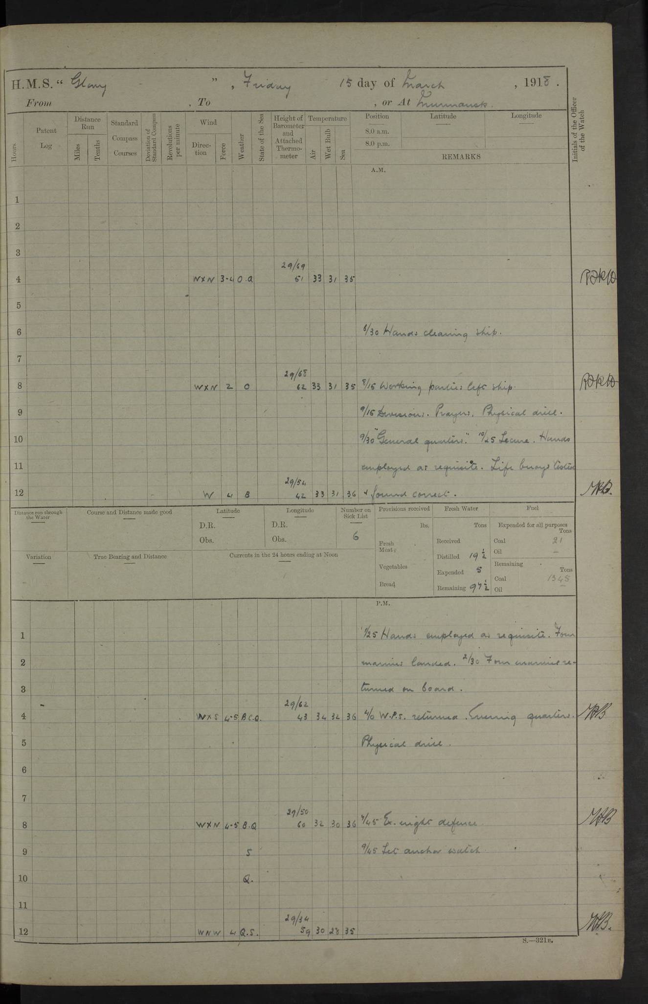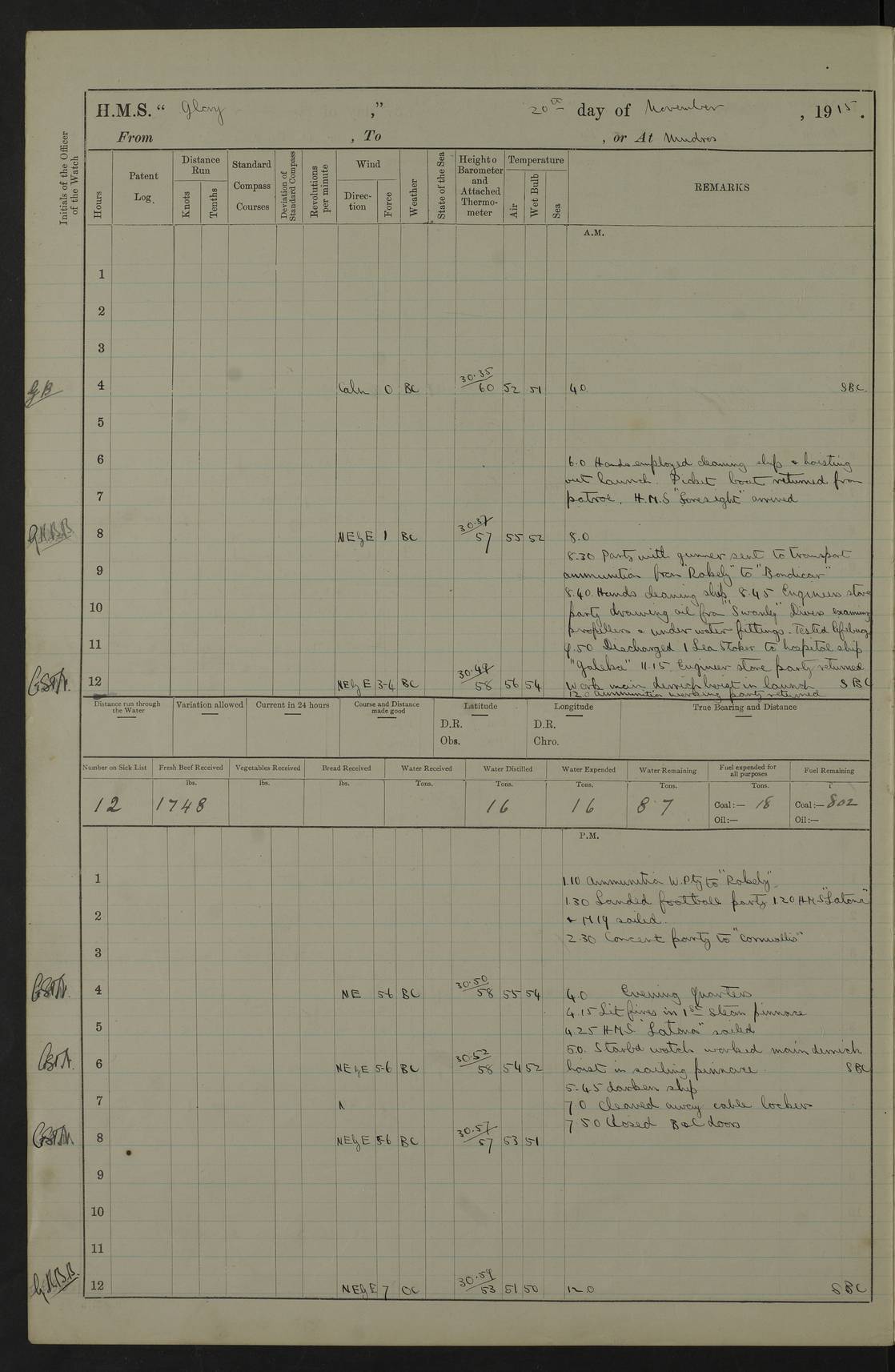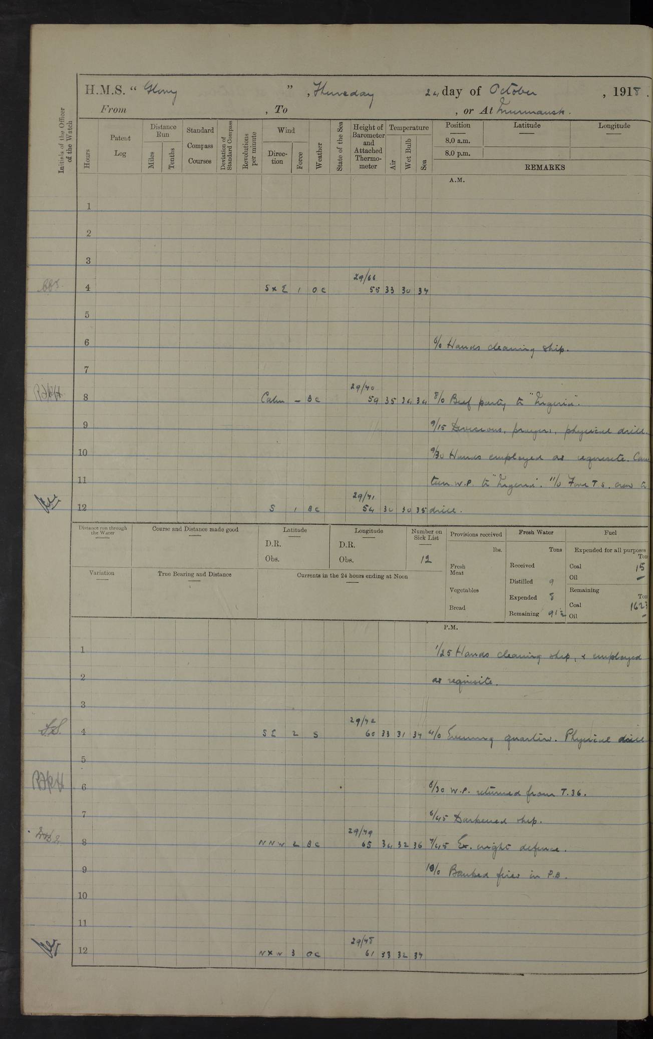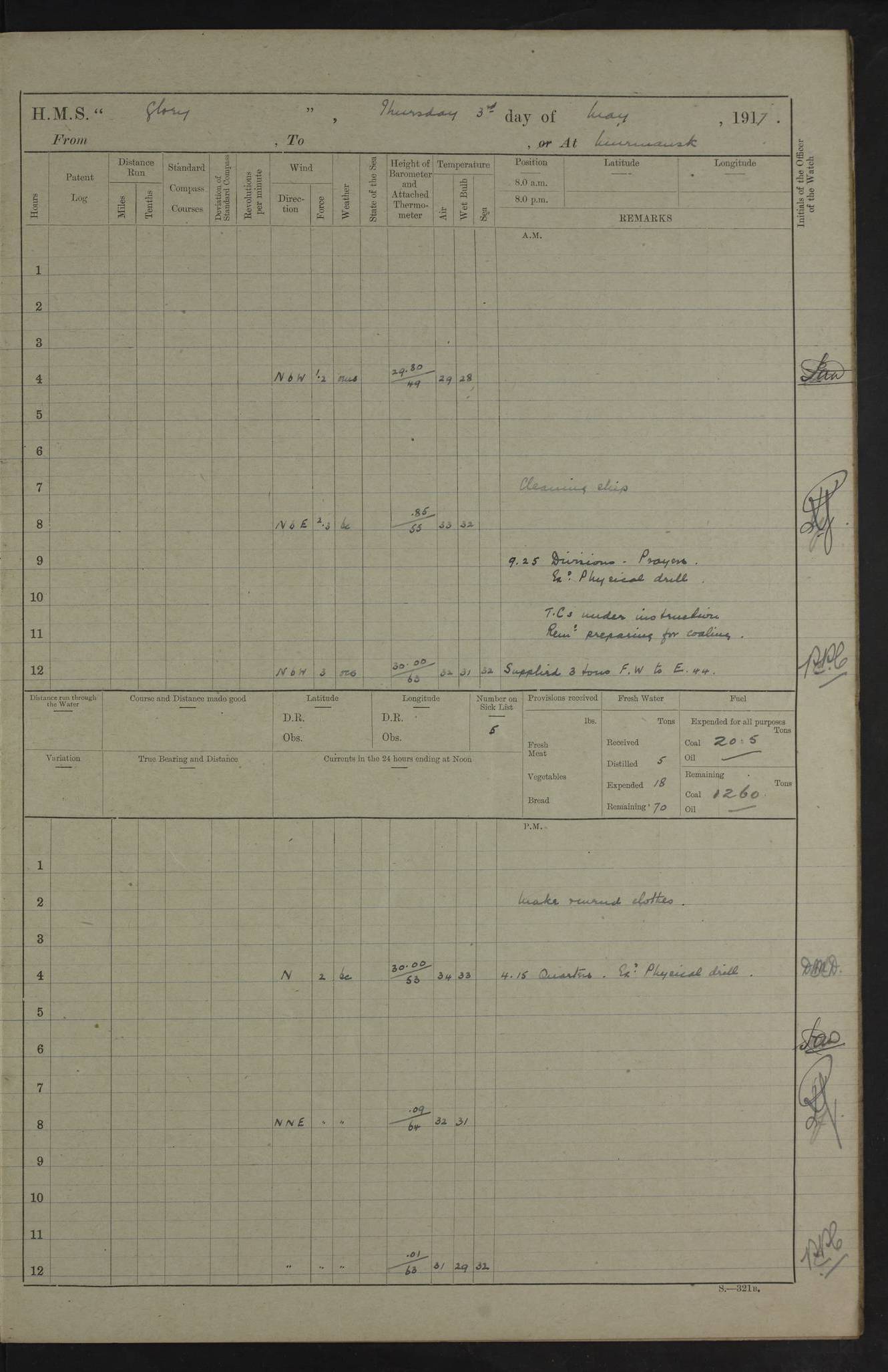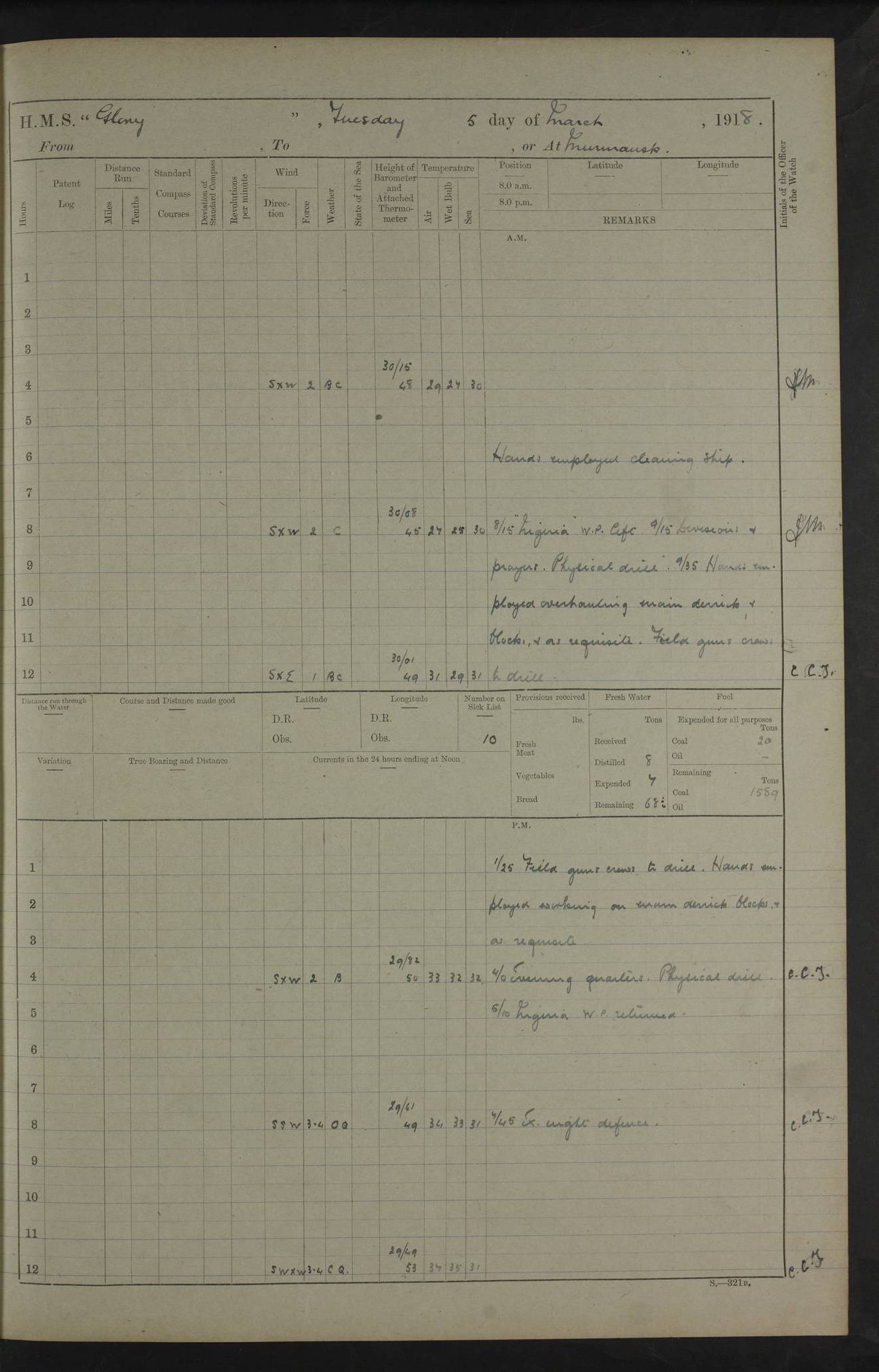 22 June 1915 At sea, Gibraltar to Lemnos Lat 36.1, Long -1.3 4.15am: Sighted land on starboard bow. 10.20am: Stopped port engine for repairs. 11.20am: proceeded with port engine. pm: a/c due to change in deviation. 10.00pm: Cape Tenez Light abeam, 18 miles. 4f73cd61a2fc8ea9030015f6: (https://s3.amazonaws.com:443/oldweather/ADM53-43015/0012_1.jpg) 23 June 1915 At sea, Gibraltar to Lemnos Lat 37.5, Long 4.8 Number on sick list: 4 5.00am: Secured from night defence stations. Placed anti-submarine guns. pm: Life saving appliances served out to men stationed in ? ?at abandon ship. 4f73cd61a2fc8ea9030015f7: (https://s3.amazonaws.com:443/oldweather/ADM53-43015/0013_0.jpg) 24 June 1915 At sea, Gibraltar to Lemnos Lat 37.4, Long 10.8 Position in log clearly bears no resemblance to the location of the ship. Position above is approximate and is based sighting of Zembra Island at 11.55am. 5.00am: Dispersed from night defence stations. Manned anti-submarine guns. am: Sighted two French torpedo boats. am: Torpedo boats passed to ~ No 362, 363. am: Sighted land on starboard beam. 11.55am: Zembra Island abeam, 25 miles. 2.00pm: Sighted Pantellaria S34ºE. 4.45pm: Pantellaria Light House abeam 12 miles. 4f73cd61a2fc8ea9030015f8: (https://s3.amazonaws.com:443/oldweather/ADM53-43015/0013_1.jpg) 25 June 1915 At sea, Gibraltar to Lemnos Lat 35.5, Long 16.7 2.10am: Gozo Light abeam 17 miles. 5.00am: Dispersed from night defence stations. Manned anti-submarine guns. 4f73cd61a2fc8ea9030015f9: (https://s3.amazonaws.com:443/oldweather/ADM53-43015/0014_0.jpg) 26 June 1915 At sea, Gibraltar to Lemnos Lat 35.5, Long 22.6 Number on sick list: 5 5.00am: Dispersed from night defence stations. Manned anti-submarine guns. am: Aired night clothing. am: marines at maxim practice on quarter deck. 2.00pm: Observed land on either bow. 3.00pm: Sighted French patrol destroyer. 4.15pm: Sighted French patrol destroyer. 9.40pm: Milo Peak N63ºW. 10.26pm: Polino Light abeam to port 5.5 miles. 4f73cd62a2fc8ea9030015fa: (https://s3.amazonaws.com:443/oldweather/ADM53-43015/0014_1.jpg) 27 June 1915 At sea and at Lemnos Lat 39.1, Long 24.4 From 0.50 to 3.05am sighting of multiple light houses. 3.50am: a/c to N39ºW and commenced to zig-zag. 5.00am: Dispersed from night defence stations and placed anti-submarine guns and look-outs. am: Lost overboard by accident Hazlewood fender, pat. 311, one in number. 10.30am: Held Divine Service onboard. pm: Met and signalled HMS Minerva on patrol duty. pm: Courses and speeds as requisite while waiting orders to approach Mudros. 3.00pm: Proceeded. 5.16pm: Increased to 90 revs, commenced to zig-zag. Course as requisite for Mudros. 7.00pm: Entered Mudros Bay. 7.47pm: Stopped. Let go port anchor in ‘M3’. 8.30pm: Darkened ship. pm: Manned one 6” and one 12 pdr. 4f73cd62a2fc8ea9030015fb: (https://s3.amazonaws.com:443/oldweather/ADM53-43015/0015_0.jpg) 28 June 1915 Mudros Bay, Lemnos Lat 39.89, Long 25.24 5,00am: HMS Vengeance entered harbour. HMS Vengeance was a pre-dreadnought of the Canopus class, launched in 1899 at Vickers, Barrow, and sold for scrapping in 1921. Details at http://en.wikipedia.org/wiki/HMS_Vengeance_(1899) . am/pm/: hands preparing for coaling and about ship’s work. pm: Collier Wabana secured alongside. 4f73cd62a2fc8ea9030015fc: (https://s3.amazonaws.com:443/oldweather/ADM53-43015/0015_1.jpg) 29 June 1915 Mudros Bay, Lemnos Lat 39.89, Long 25.24 5.15am: Commenced coaling. 2.00pm: Finished coaling. Collier left. 4f73cd62a2fc8ea9030015fd: (https://s3.amazonaws.com:443/oldweather/ADM53-43015/0016_0.jpg) 30 June 1915 Mudros Bay, Lemnos Lat 39.89, Long 25.24 am: Parties away sanding, and with fire engines onshore. am: Boats away disembarking troops. am: French Flagship Patrie sailed. The Patrie was a French pre-dreadnought, launched at La Seyne shipyard in 1903, and stricken in 1921. Details at http://en.wikipedia.org/wiki/French_battleship_Patrie . 6.30pm: Hands to bathe. 4f73cd63a2fc8ea9030015fe: (https://s3.amazonaws.com:443/oldweather/ADM53-43015/0016_1.jpg) 4f73cd63a2fc8ea9030015ff: (https://s3.amazonaws.com:443/oldweather/ADM53-43015/0017_0.jpg) 4f73cd63a2fc8ea903001600: (https://s3.amazonaws.com:443/oldweather/ADM53-43015/0017_1.jpg) 4f73cd63a2fc8ea903001601: (https://s3.amazonaws.com:443/oldweather/ADM53-43015/0018_0.jpg) 4f73cd64a2fc8ea903001602: (https://s3.amazonaws.com:443/oldweather/ADM53-43015/0018_1.jpg) LOGS FOR JULY 1915 From July to October 1915, HMS Glory spent her time at Port Mudros. Certain activities typically took place daily and are not generally noted in the pages below. These activities include: Lighting fires in the picket boat around 4am and drawing the fires in the late evening; Divisions at around 9–9.30am and Evening Quarters at 4pm; Darken ship at around 8.30pm; Daily ‘cleaning ship’, with variations thereof; SBC (for ‘Signal Books Correct’) at the watch changes. 4f73cd64a2fc8ea903001603: (https://s3.amazonaws.com:443/oldweather/ADM53-43016/0000_0.jpg) 4f73cd64a2fc8ea903001604: (https://s3.amazonaws.com:443/oldweather/ADM53-43016/0000_1.jpg) 4f73cd65a2fc8ea903001605: (https://s3.amazonaws.com:443/oldweather/ADM53-43016/0001_0.jpg) 4f73cd65a2fc8ea903001606: (https://s3.amazonaws.com:443/oldweather/ADM53-43016/0001_1.jpg) 1 July 1915 Port Mudros Lat 39.89, Long 25.24 6.30am: Landed working parties preparing boom defence ships. am: Discharged Acting Commander Rayne to Hector. Hector was a kite balloon ship. No further details readily available. 5.00pm: Tug T.10 made fast astern. 7.15pm: HMS Venerable went out. 7.30pm: HMS Chatham went out. HMS Chatham was a ‘Town’ cruiser and lead ship of her class. She was launched in 1911 at Chatham Dockyard and sold in 1926. Details at http://en.wikipedia.org/wiki/HMS_Chatham_(1911) . 4f73cd65a2fc8ea903001607: (https://s3.amazonaws.com:443/oldweather/ADM53-43016/0002_0.jpg) 2 July 1915 Port Mudros Lat 39.89, Long 25.24 5.35am: Landed working parties preparing boom defence ships. am/pm: Boom defence par