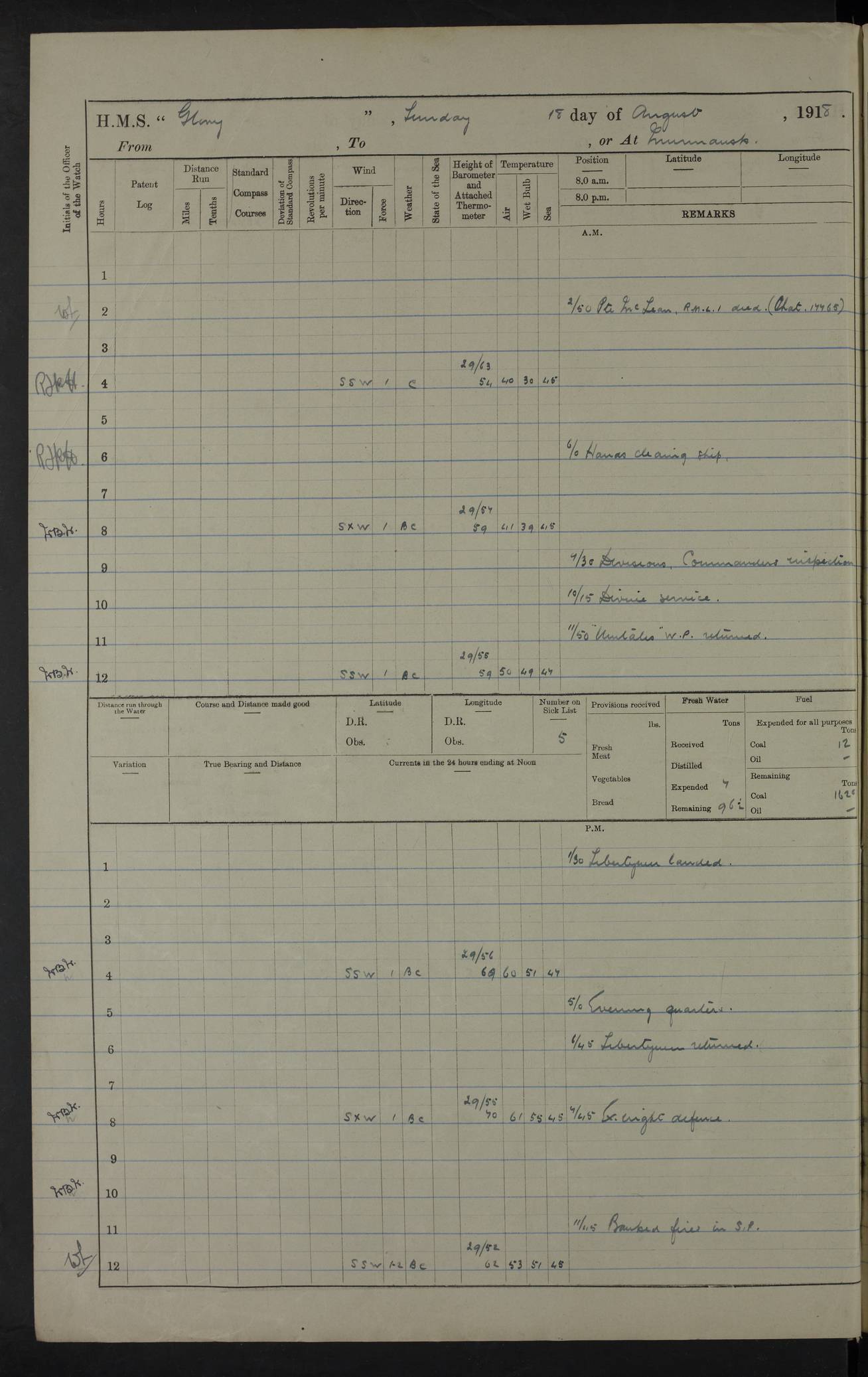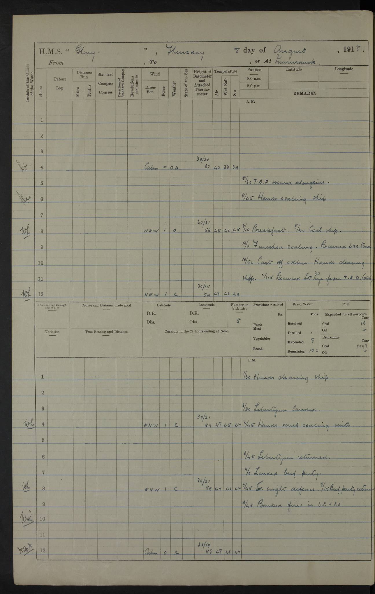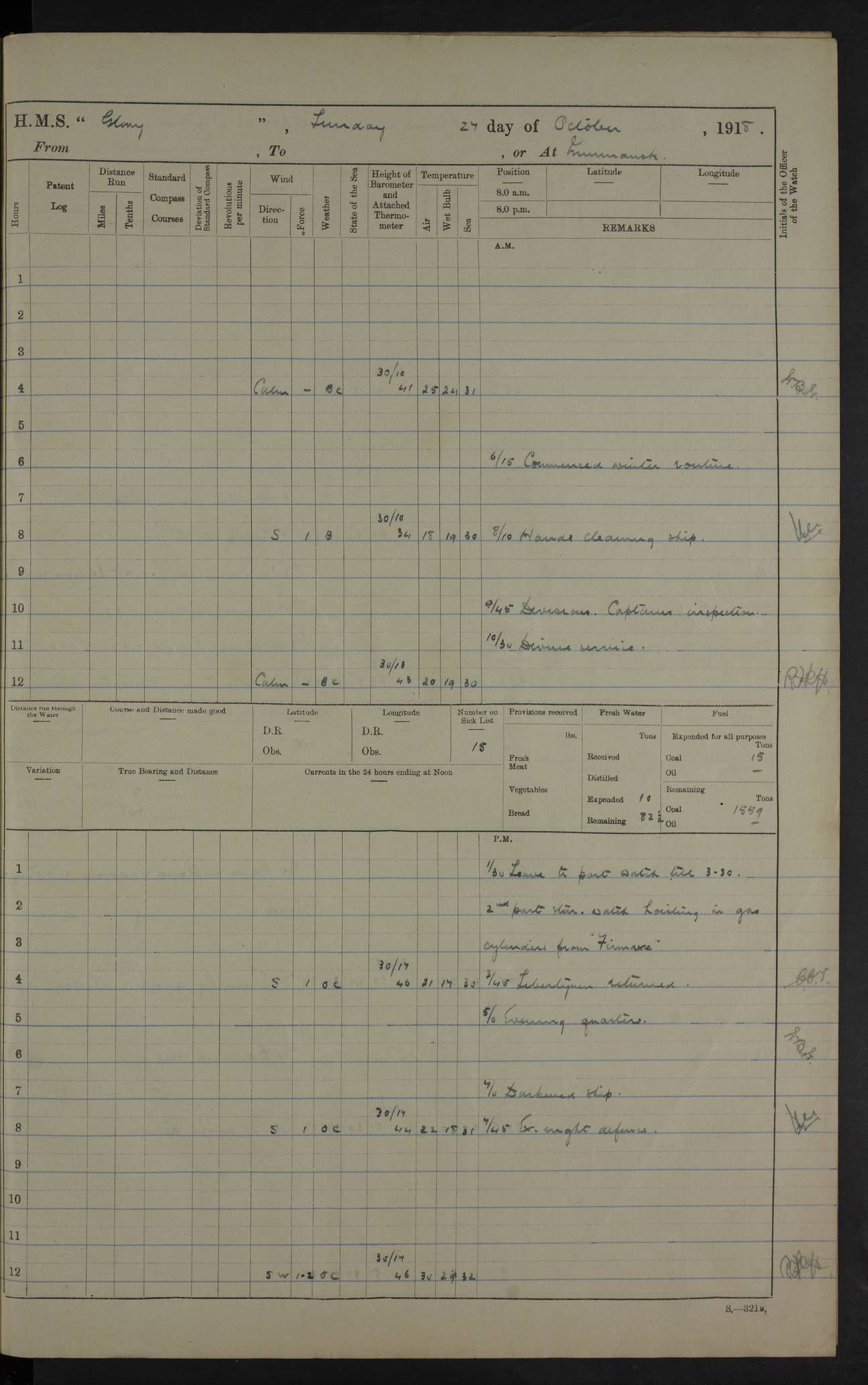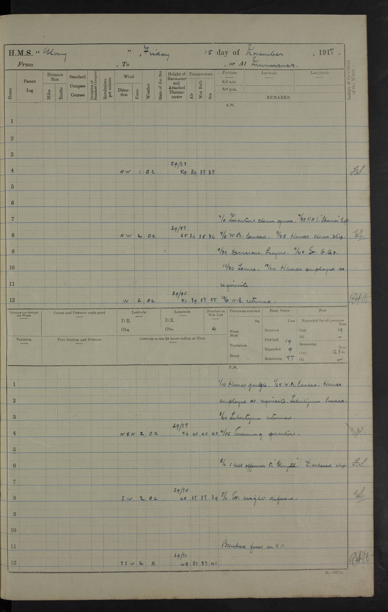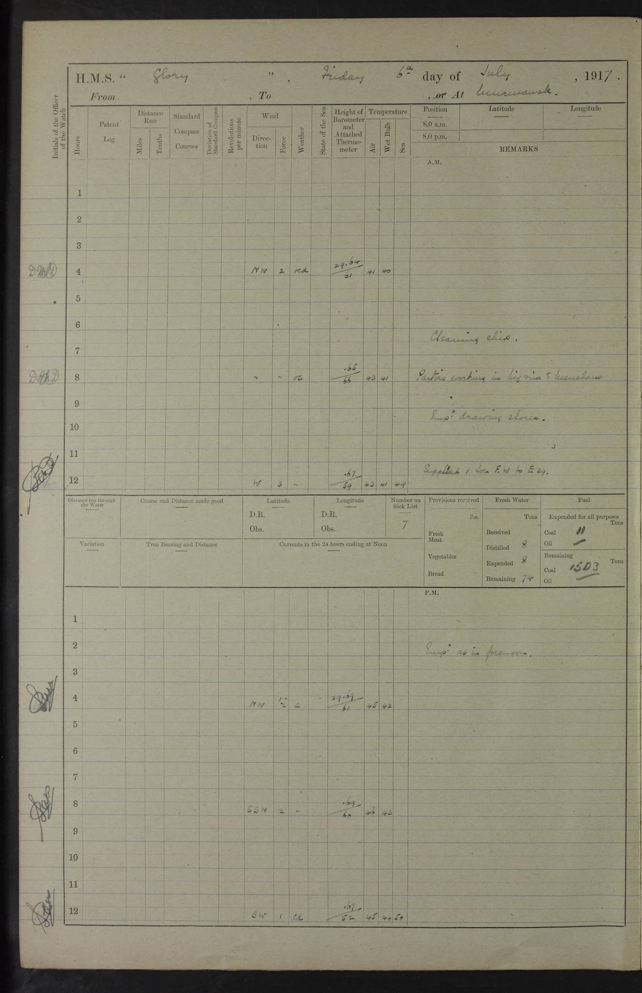 22 June 1915 At sea, Gibraltar to Lemnos Lat 36.1, Long -1.3 4.15am: Sighted land on starboard bow. 10.20am: Stopped port engine for repairs. 11.20am: proceeded with port engine. pm: a/c due to change in deviation. 10.00pm: Cape Tenez Light abeam, 18 miles. 4f73cd61a2fc8ea9030015f6: (https://s3.amazonaws.com:443/oldweather/ADM53-43015/0012_1.jpg) 23 June 1915 At sea, Gibraltar to Lemnos Lat 37.5, Long 4.8 Number on sick list: 4 5.00am: Secured from night defence stations. Placed anti-submarine guns. pm: Life saving appliances served out to men stationed in ? ?at abandon ship. 4f73cd61a2fc8ea9030015f7: (https://s3.amazonaws.com:443/oldweather/ADM53-43015/0013_0.jpg) 24 June 1915 At sea, Gibraltar to Lemnos Lat 37.4, Long 10.8 Position in log clearly bears no resemblance to the location of the ship. Position above is approximate and is based sighting of Zembra Island at 11.55am. 5.00am: Dispersed from night defence stations. Manned anti-submarine guns. am: Sighted two French torpedo boats. am: Torpedo boats passed to ~ No 362, 363. am: Sighted land on starboard beam. 11.55am: Zembra Island abeam, 25 miles. 2.00pm: Sighted Pantellaria S34ºE. 4.45pm: Pantellaria Light House abeam 12 miles. 4f73cd61a2fc8ea9030015f8: (https://s3.amazonaws.com:443/oldweather/ADM53-43015/0013_1.jpg) 25 June 1915 At sea, Gibraltar to Lemnos Lat 35.5, Long 16.7 2.10am: Gozo Light abeam 17 miles. 5.00am: Dispersed from night defence stations. Manned anti-submarine guns. 4f73cd61a2fc8ea9030015f9: (https://s3.amazonaws.com:443/oldweather/ADM53-43015/0014_0.jpg) 26 June 1915 At sea, Gibraltar to Lemnos Lat 35.5, Long 22.6 Number on sick list: 5 5.00am: Dispersed from night defence stations. Manned anti-submarine guns. am: Aired night clothing. am: marines at maxim practice on quarter deck. 2.00pm: Observed land on either bow. 3.00pm: Sighted French patrol destroyer. 4.15pm: Sighted French patrol destroyer. 9.40pm: Milo Peak N63ºW. 10.26pm: Polino Light abeam to port 5.5 miles. 4f73cd62a2fc8ea9030015fa: (https://s3.amazonaws.com:443/oldweather/ADM53-43015/0014_1.jpg) 27 June 1915 At sea and at Lemnos Lat 39.1, Long 24.4 From 0.50 to 3.05am sighting of multiple light houses. 3.50am: a/c to N39ºW and commenced to zig-zag. 5.00am: Dispersed from night defence stations and placed anti-submarine guns and look-outs. am: Lost overboard by accident Hazlewood fender, pat. 311, one in number. 10.30am: Held Divine Service onboard. pm: Met and signalled HMS Minerva on patrol duty. pm: Courses and speeds as requisite while waiting orders to approach Mudros. 3.00pm: Proceeded. 5.16pm: Increased to 90 revs, commenced to zig-zag. Course as requisite for Mudros. 7.00pm: Entered Mudros Bay. 7.47pm: Stopped. Let go port anchor in ‘M3’. 8.30pm: Darkened ship. pm: Manned one 6” and one 12 pdr. 4f73cd62a2fc8ea9030015fb: (https://s3.amazonaws.com:443/oldweather/ADM53-43015/0015_0.jpg) 28 June 1915 Mudros Bay, Lemnos Lat 39.89, Long 25.24 5,00am: HMS Vengeance entered harbour. HMS Vengeance was a pre-dreadnought of the Canopus class, launched in 1899 at Vickers, Barrow, and sold for scrapping in 1921. Details at http://en.wikipedia.org/wiki/HMS_Vengeance_(1899) . am/pm/: hands preparing for coaling and about ship’s work. pm: Collier Wabana secured alongside. 4f73cd62a2fc8ea9030015fc: (https://s3.amazonaws.com:443/oldweather/ADM53-43015/0015_1.jpg) 29 June 1915 Mudros Bay, Lemnos Lat 39.89, Long 25.24 5.15am: Commenced coaling. 2.00pm: Finished coaling. Collier left. 4f73cd62a2fc8ea9030015fd: (https://s3.amazonaws.com:443/oldweather/ADM53-43015/0016_0.jpg) 30 June 1915 Mudros Bay, Lemnos Lat 39.89, Long 25.24 am: Parties away sanding, and with fire engines onshore. am: Boats away disembarking troops. am: French Flagship Patrie sailed. The Patrie was a French pre-dreadnought, launched at La Seyne shipyard in 1903, and stricken in 1921. Details at http://en.wikipedia.org/wiki/French_battleship_Patrie . 6.30pm: Hands to bathe. 4f73cd63a2fc8ea9030015fe: (https://s3.amazonaws.com:443/oldweather/ADM53-43015/0016_1.jpg) 4f73cd63a2fc8ea9030015ff: (https://s3.amazonaws.com:443/oldweather/ADM53-43015/0017_0.jpg) 4f73cd63a2fc8ea903001600: (https://s3.amazonaws.com:443/oldweather/ADM53-43015/0017_1.jpg) 4f73cd63a2fc8ea903001601: (https://s3.amazonaws.com:443/oldweather/ADM53-43015/0018_0.jpg) 4f73cd64a2fc8ea903001602: (https://s3.amazonaws.com:443/oldweather/ADM53-43015/0018_1.jpg) LOGS FOR JULY 1915 From July to October 1915, HMS Glory spent her time at Port Mudros. Certain activities typically took place daily and are not generally noted in the pages below. These activities include: Lighting fires in the picket boat around 4am and drawing the fires in the late evening; Divisions at around 9–9.30am and Evening Quarters at 4pm; Darken ship at around 8.30pm; Daily ‘cleaning ship’, with variations thereof; SBC (for ‘Signal Books Correct’) at the watch changes. 4f73cd64a2fc8ea903001603: (https://s3.amazonaws.com:443/oldweather/ADM53-43016/0000_0.jpg) 4f73cd64a2fc8ea903001604: (https://s3.amazonaws.com:443/oldweather/ADM53-43016/0000_1.jpg) 4f73cd65a2fc8ea903001605: (https://s3.amazonaws.com:443/oldweather/ADM53-43016/0001_0.jpg) 4f73cd65a2fc8ea903001606: (https://s3.amazonaws.com:443/oldweather/ADM53-43016/0001_1.jpg) 1 July 1915 Port Mudros Lat 39.89, Long 25.24 6.30am: Landed working parties preparing boom defence ships. am: Discharged Acting Commander Rayne to Hector. Hector was a kite balloon ship. No further details readily available. 5.00pm: Tug T.10 made fast astern. 7.15pm: HMS Venerable went out. 7.30pm: HMS Chatham went out. HMS Chatham was a ‘Town’ cruiser and lead ship of her class. She was launched in 1911 at Chatham Dockyard and sold in 1926. Details at http://en.wikipedia.org/wiki/HMS_Chatham_(1911) . 4f73cd65a2fc8ea903001607: (https://s3.amazonaws.com:443/oldweather/ADM53-43016/0002_0.jpg) 2 July 1915 Port Mudros Lat 39.89, Long 25.24 5.35am: Landed working parties preparing boom defence ships. am/pm: Boom defence par