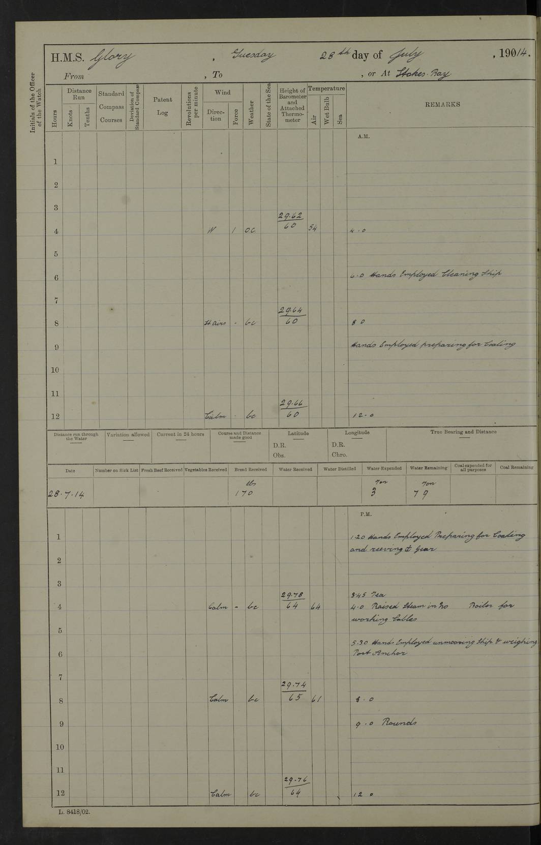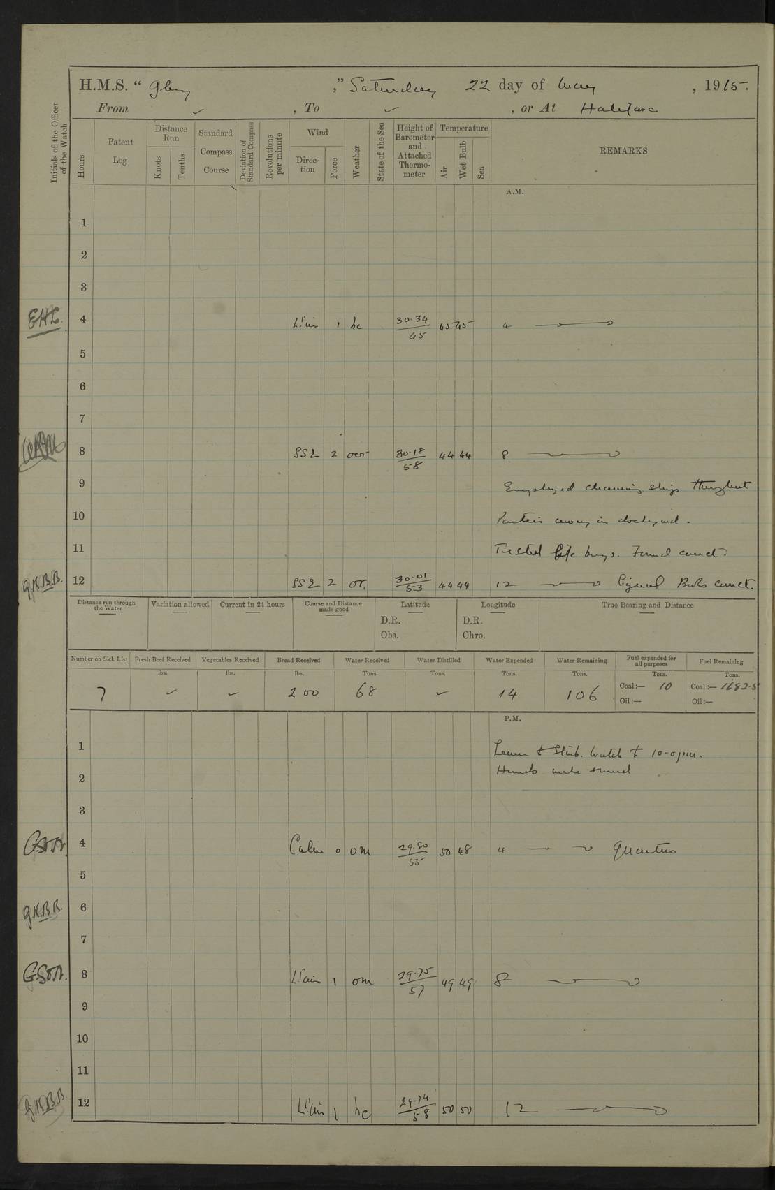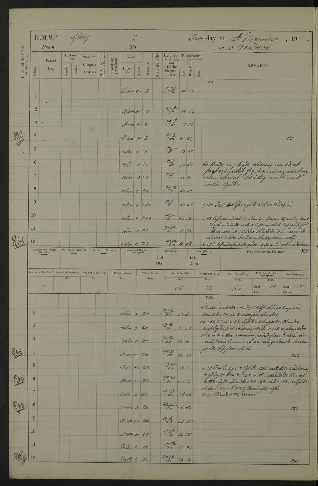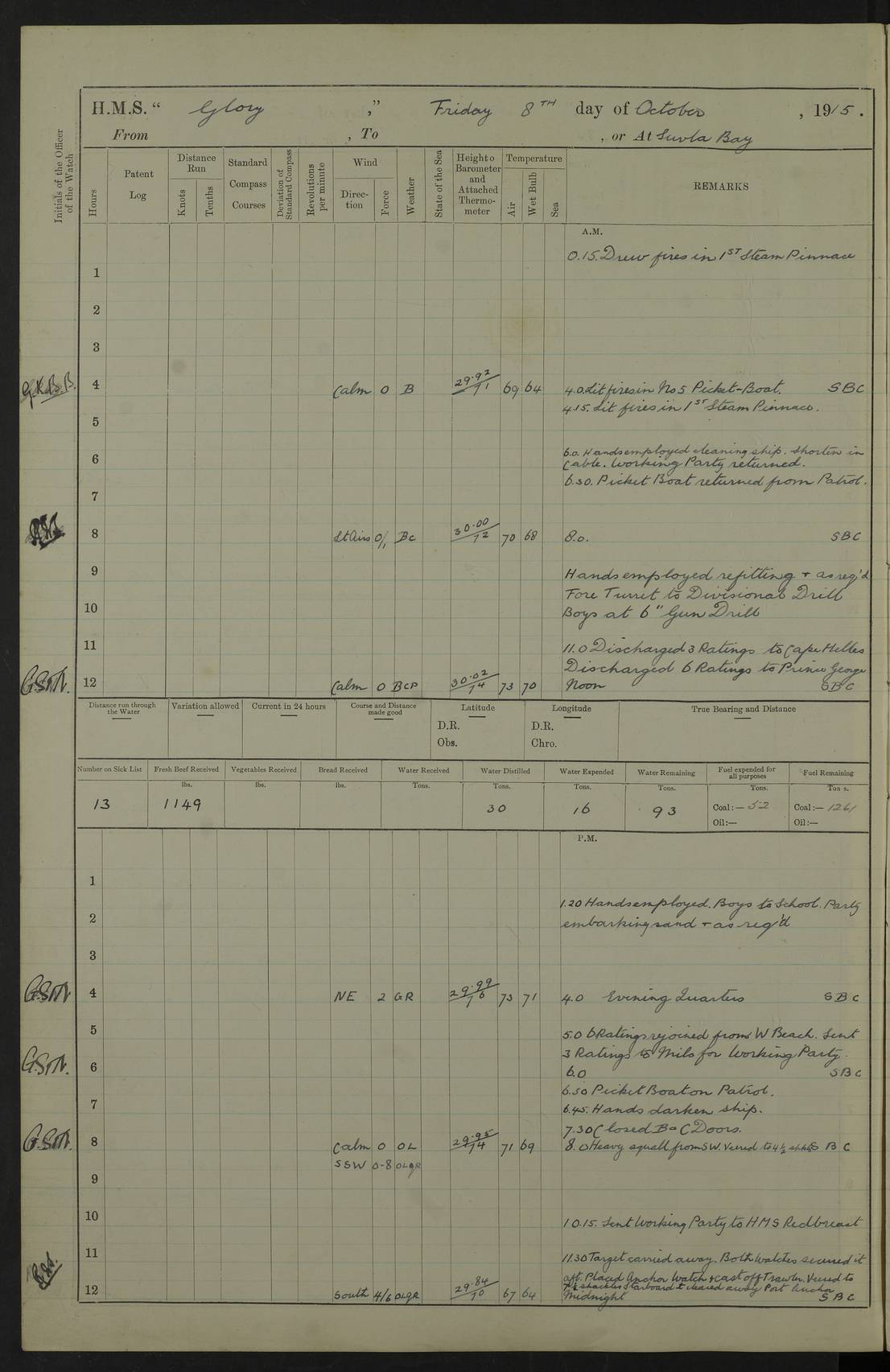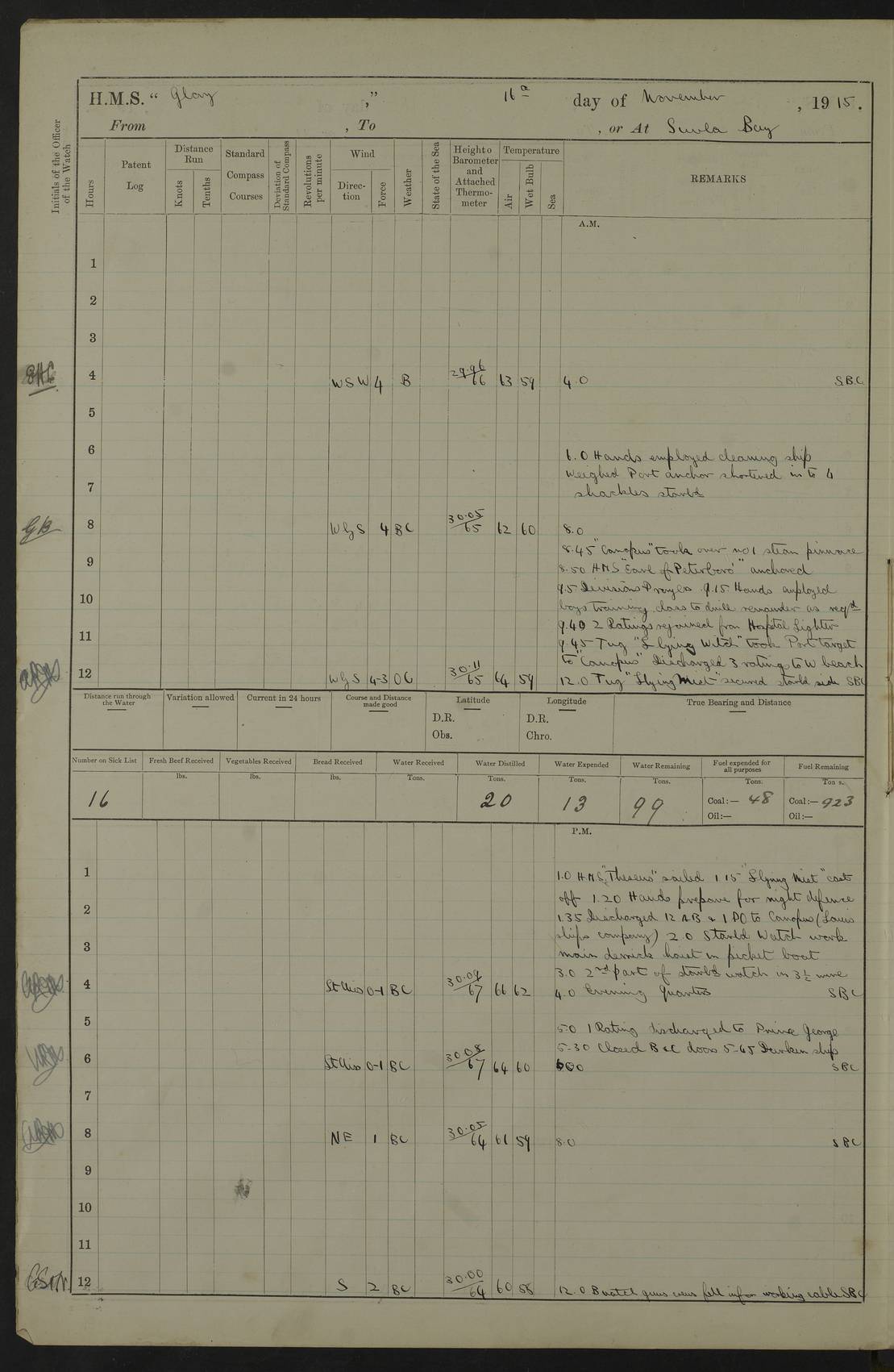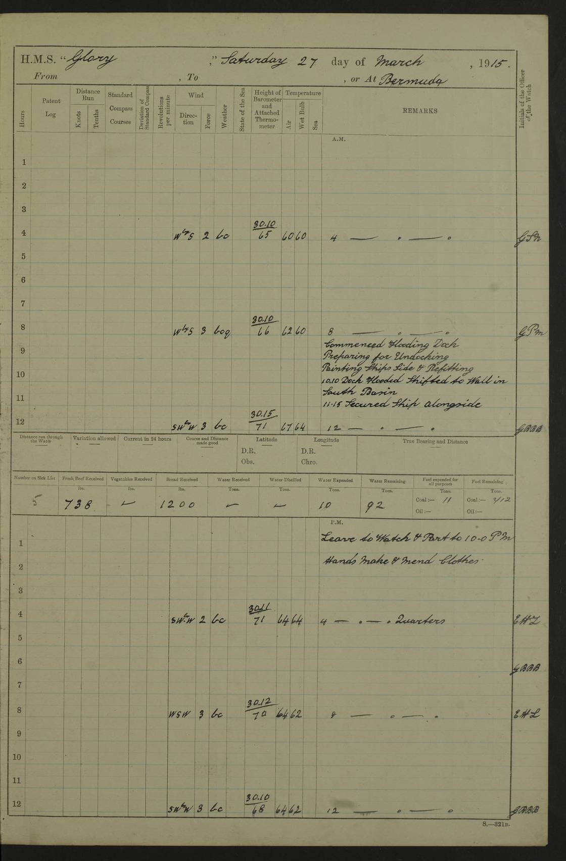 22 June 1915 At sea, Gibraltar to Lemnos Lat 36.1, Long -1.3 4.15am: Sighted land on starboard bow. 10.20am: Stopped port engine for repairs. 11.20am: proceeded with port engine. pm: a/c due to change in deviation. 10.00pm: Cape Tenez Light abeam, 18 miles. 4f73cd61a2fc8ea9030015f6: (https://s3.amazonaws.com:443/oldweather/ADM53-43015/0012_1.jpg) 23 June 1915 At sea, Gibraltar to Lemnos Lat 37.5, Long 4.8 Number on sick list: 4 5.00am: Secured from night defence stations. Placed anti-submarine guns. pm: Life saving appliances served out to men stationed in ? ?at abandon ship. 4f73cd61a2fc8ea9030015f7: (https://s3.amazonaws.com:443/oldweather/ADM53-43015/0013_0.jpg) 24 June 1915 At sea, Gibraltar to Lemnos Lat 37.4, Long 10.8 Position in log clearly bears no resemblance to the location of the ship. Position above is approximate and is based sighting of Zembra Island at 11.55am. 5.00am: Dispersed from night defence stations. Manned anti-submarine guns. am: Sighted two French torpedo boats. am: Torpedo boats passed to ~ No 362, 363. am: Sighted land on starboard beam. 11.55am: Zembra Island abeam, 25 miles. 2.00pm: Sighted Pantellaria S34ºE. 4.45pm: Pantellaria Light House abeam 12 miles. 4f73cd61a2fc8ea9030015f8: (https://s3.amazonaws.com:443/oldweather/ADM53-43015/0013_1.jpg) 25 June 1915 At sea, Gibraltar to Lemnos Lat 35.5, Long 16.7 2.10am: Gozo Light abeam 17 miles. 5.00am: Dispersed from night defence stations. Manned anti-submarine guns. 4f73cd61a2fc8ea9030015f9: (https://s3.amazonaws.com:443/oldweather/ADM53-43015/0014_0.jpg) 26 June 1915 At sea, Gibraltar to Lemnos Lat 35.5, Long 22.6 Number on sick list: 5 5.00am: Dispersed from night defence stations. Manned anti-submarine guns. am: Aired night clothing. am: marines at maxim practice on quarter deck. 2.00pm: Observed land on either bow. 3.00pm: Sighted French patrol destroyer. 4.15pm: Sighted French patrol destroyer. 9.40pm: Milo Peak N63ºW. 10.26pm: Polino Light abeam to port 5.5 miles. 4f73cd62a2fc8ea9030015fa: (https://s3.amazonaws.com:443/oldweather/ADM53-43015/0014_1.jpg) 27 June 1915 At sea and at Lemnos Lat 39.1, Long 24.4 From 0.50 to 3.05am sighting of multiple light houses. 3.50am: a/c to N39ºW and commenced to zig-zag. 5.00am: Dispersed from night defence stations and placed anti-submarine guns and look-outs. am: Lost overboard by accident Hazlewood fender, pat. 311, one in number. 10.30am: Held Divine Service onboard. pm: Met and signalled HMS Minerva on patrol duty. pm: Courses and speeds as requisite while waiting orders to approach Mudros. 3.00pm: Proceeded. 5.16pm: Increased to 90 revs, commenced to zig-zag. Course as requisite for Mudros. 7.00pm: Entered Mudros Bay. 7.47pm: Stopped. Let go port anchor in ‘M3’. 8.30pm: Darkened ship. pm: Manned one 6” and one 12 pdr. 4f73cd62a2fc8ea9030015fb: (https://s3.amazonaws.com:443/oldweather/ADM53-43015/0015_0.jpg) 28 June 1915 Mudros Bay, Lemnos Lat 39.89, Long 25.24 5,00am: HMS Vengeance entered harbour. HMS Vengeance was a pre-dreadnought of the Canopus class, launched in 1899 at Vickers, Barrow, and sold for scrapping in 1921. Details at http://en.wikipedia.org/wiki/HMS_Vengeance_(1899) . am/pm/: hands preparing for coaling and about ship’s work. pm: Collier Wabana secured alongside. 4f73cd62a2fc8ea9030015fc: (https://s3.amazonaws.com:443/oldweather/ADM53-43015/0015_1.jpg) 29 June 1915 Mudros Bay, Lemnos Lat 39.89, Long 25.24 5.15am: Commenced coaling. 2.00pm: Finished coaling. Collier left. 4f73cd62a2fc8ea9030015fd: (https://s3.amazonaws.com:443/oldweather/ADM53-43015/0016_0.jpg) 30 June 1915 Mudros Bay, Lemnos Lat 39.89, Long 25.24 am: Parties away sanding, and with fire engines onshore. am: Boats away disembarking troops. am: French Flagship Patrie sailed. The Patrie was a French pre-dreadnought, launched at La Seyne shipyard in 1903, and stricken in 1921. Details at http://en.wikipedia.org/wiki/French_battleship_Patrie . 6.30pm: Hands to bathe. 4f73cd63a2fc8ea9030015fe: (https://s3.amazonaws.com:443/oldweather/ADM53-43015/0016_1.jpg) 4f73cd63a2fc8ea9030015ff: (https://s3.amazonaws.com:443/oldweather/ADM53-43015/0017_0.jpg) 4f73cd63a2fc8ea903001600: (https://s3.amazonaws.com:443/oldweather/ADM53-43015/0017_1.jpg) 4f73cd63a2fc8ea903001601: (https://s3.amazonaws.com:443/oldweather/ADM53-43015/0018_0.jpg) 4f73cd64a2fc8ea903001602: (https://s3.amazonaws.com:443/oldweather/ADM53-43015/0018_1.jpg) LOGS FOR JULY 1915 From July to October 1915, HMS Glory spent her time at Port Mudros. Certain activities typically took place daily and are not generally noted in the pages below. These activities include: Lighting fires in the picket boat around 4am and drawing the fires in the late evening; Divisions at around 9–9.30am and Evening Quarters at 4pm; Darken ship at around 8.30pm; Daily ‘cleaning ship’, with variations thereof; SBC (for ‘Signal Books Correct’) at the watch changes. 4f73cd64a2fc8ea903001603: (https://s3.amazonaws.com:443/oldweather/ADM53-43016/0000_0.jpg) 4f73cd64a2fc8ea903001604: (https://s3.amazonaws.com:443/oldweather/ADM53-43016/0000_1.jpg) 4f73cd65a2fc8ea903001605: (https://s3.amazonaws.com:443/oldweather/ADM53-43016/0001_0.jpg) 4f73cd65a2fc8ea903001606: (https://s3.amazonaws.com:443/oldweather/ADM53-43016/0001_1.jpg) 1 July 1915 Port Mudros Lat 39.89, Long 25.24 6.30am: Landed working parties preparing boom defence ships. am: Discharged Acting Commander Rayne to Hector. Hector was a kite balloon ship. No further details readily available. 5.00pm: Tug T.10 made fast astern. 7.15pm: HMS Venerable went out. 7.30pm: HMS Chatham went out. HMS Chatham was a ‘Town’ cruiser and lead ship of her class. She was launched in 1911 at Chatham Dockyard and sold in 1926. Details at http://en.wikipedia.org/wiki/HMS_Chatham_(1911) . 4f73cd65a2fc8ea903001607: (https://s3.amazonaws.com:443/oldweather/ADM53-43016/0002_0.jpg) 2 July 1915 Port Mudros Lat 39.89, Long 25.24 5.35am: Landed working parties preparing boom defence ships. am/pm: Boom defence par