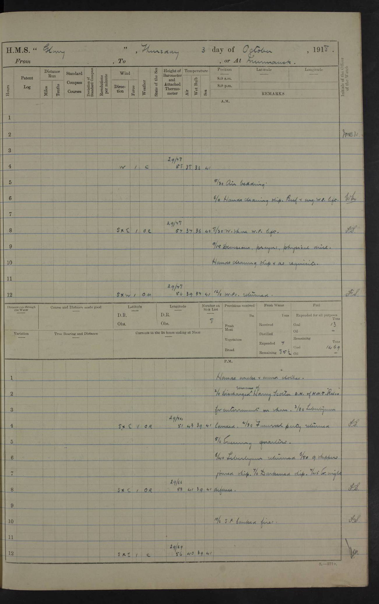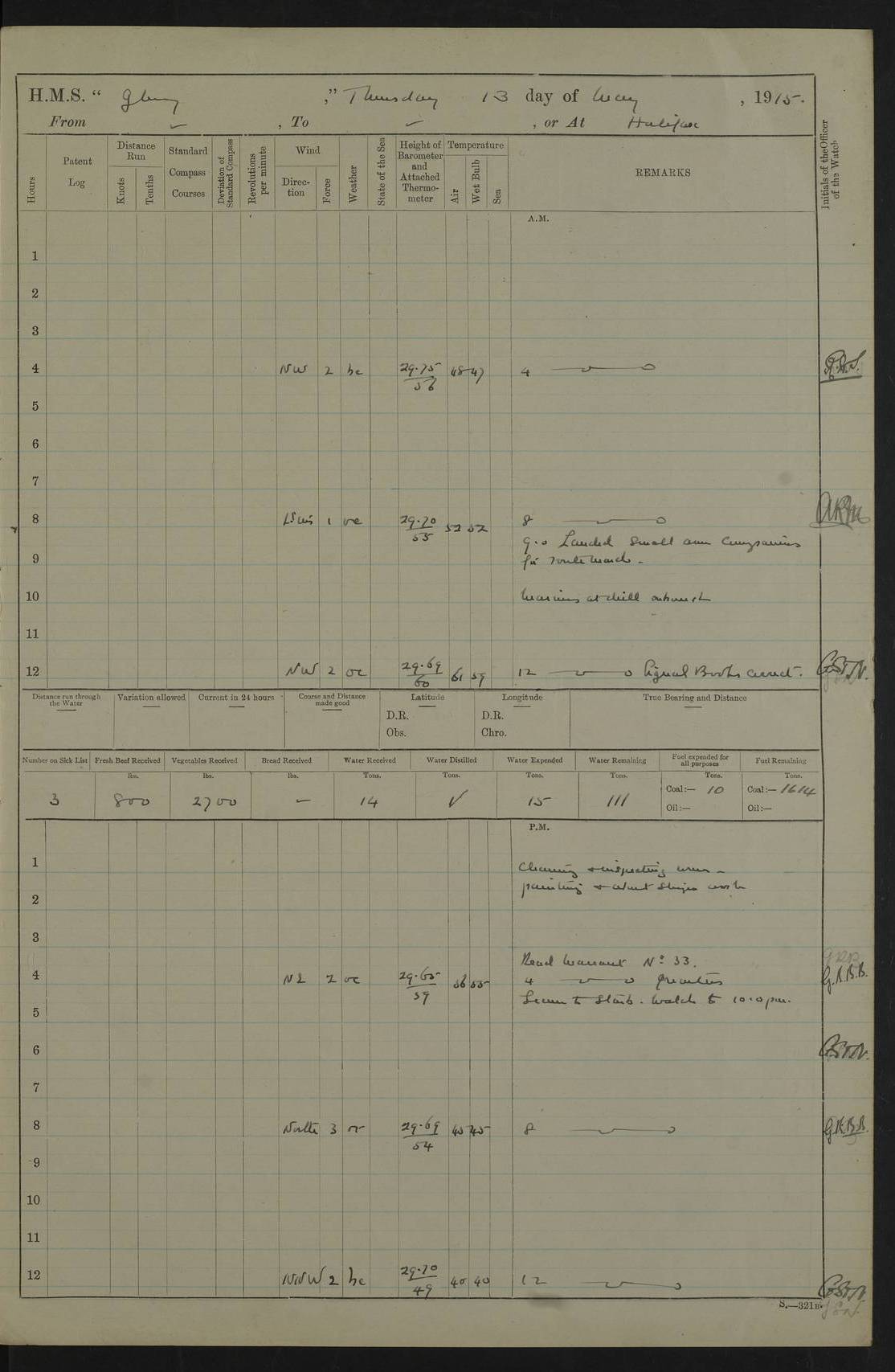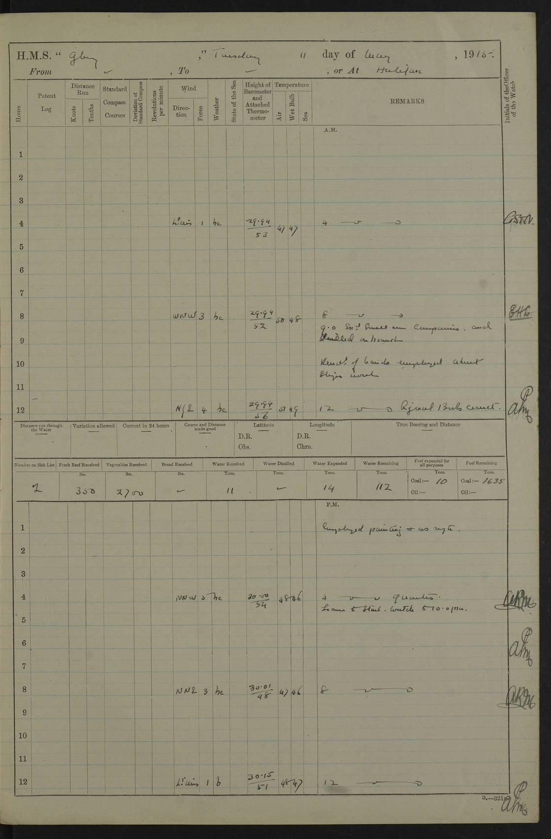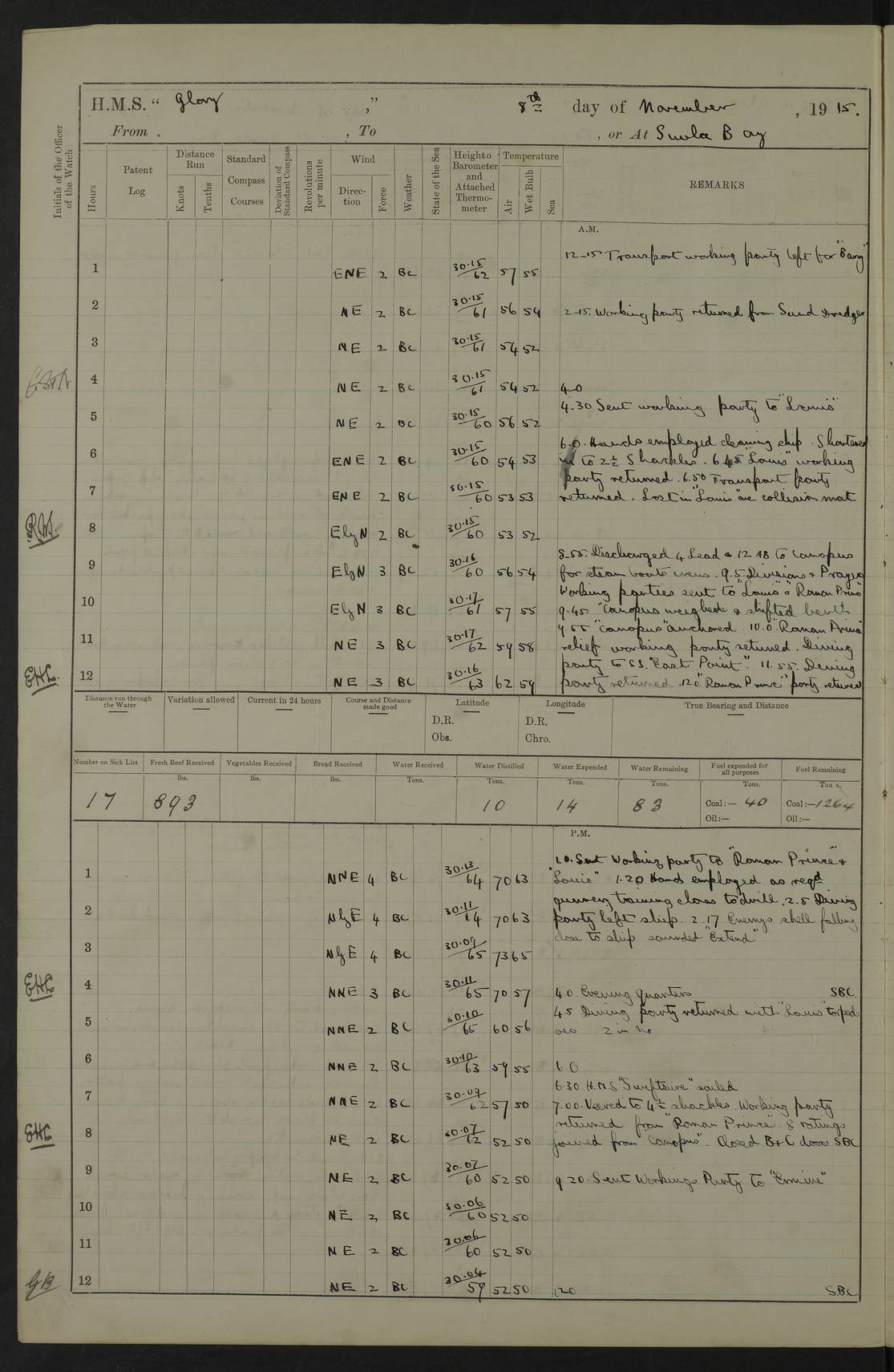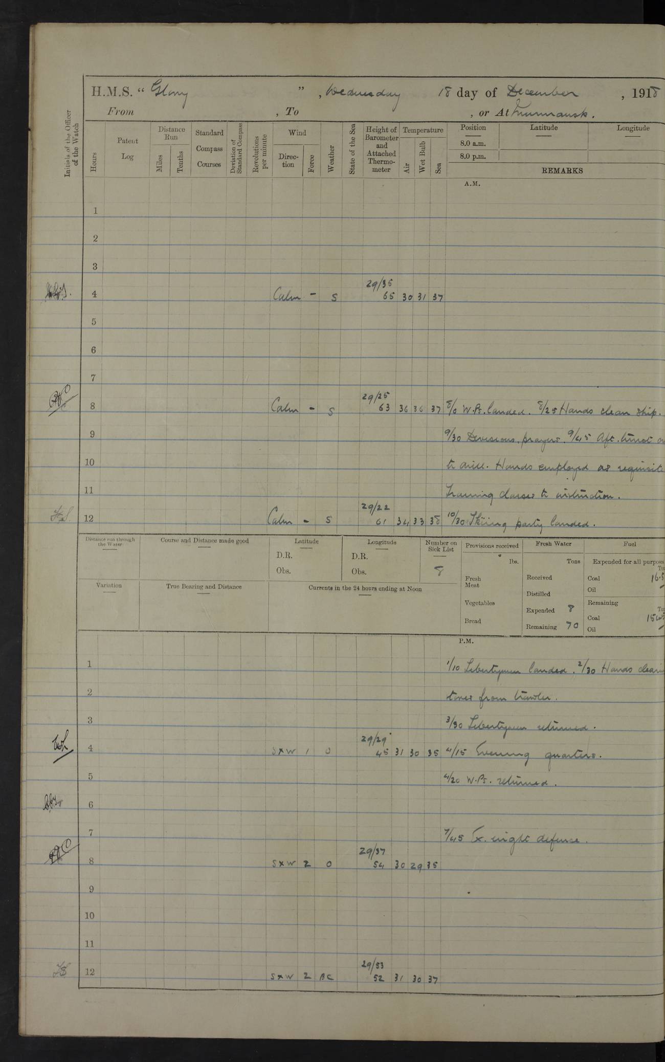 22 June 1915 At sea, Gibraltar to Lemnos Lat 36.1, Long -1.3 4.15am: Sighted land on starboard bow. 10.20am: Stopped port engine for repairs. 11.20am: proceeded with port engine. pm: a/c due to change in deviation. 10.00pm: Cape Tenez Light abeam, 18 miles. 4f73cd61a2fc8ea9030015f6: (https://s3.amazonaws.com:443/oldweather/ADM53-43015/0012_1.jpg) 23 June 1915 At sea, Gibraltar to Lemnos Lat 37.5, Long 4.8 Number on sick list: 4 5.00am: Secured from night defence stations. Placed anti-submarine guns. pm: Life saving appliances served out to men stationed in ? ?at abandon ship. 4f73cd61a2fc8ea9030015f7: (https://s3.amazonaws.com:443/oldweather/ADM53-43015/0013_0.jpg) 24 June 1915 At sea, Gibraltar to Lemnos Lat 37.4, Long 10.8 Position in log clearly bears no resemblance to the location of the ship. Position above is approximate and is based sighting of Zembra Island at 11.55am. 5.00am: Dispersed from night defence stations. Manned anti-submarine guns. am: Sighted two French torpedo boats. am: Torpedo boats passed to ~ No 362, 363. am: Sighted land on starboard beam. 11.55am: Zembra Island abeam, 25 miles. 2.00pm: Sighted Pantellaria S34ºE. 4.45pm: Pantellaria Light House abeam 12 miles. 4f73cd61a2fc8ea9030015f8: (https://s3.amazonaws.com:443/oldweather/ADM53-43015/0013_1.jpg) 25 June 1915 At sea, Gibraltar to Lemnos Lat 35.5, Long 16.7 2.10am: Gozo Light abeam 17 miles. 5.00am: Dispersed from night defence stations. Manned anti-submarine guns. 4f73cd61a2fc8ea9030015f9: (https://s3.amazonaws.com:443/oldweather/ADM53-43015/0014_0.jpg) 26 June 1915 At sea, Gibraltar to Lemnos Lat 35.5, Long 22.6 Number on sick list: 5 5.00am: Dispersed from night defence stations. Manned anti-submarine guns. am: Aired night clothing. am: marines at maxim practice on quarter deck. 2.00pm: Observed land on either bow. 3.00pm: Sighted French patrol destroyer. 4.15pm: Sighted French patrol destroyer. 9.40pm: Milo Peak N63ºW. 10.26pm: Polino Light abeam to port 5.5 miles. 4f73cd62a2fc8ea9030015fa: (https://s3.amazonaws.com:443/oldweather/ADM53-43015/0014_1.jpg) 27 June 1915 At sea and at Lemnos Lat 39.1, Long 24.4 From 0.50 to 3.05am sighting of multiple light houses. 3.50am: a/c to N39ºW and commenced to zig-zag. 5.00am: Dispersed from night defence stations and placed anti-submarine guns and look-outs. am: Lost overboard by accident Hazlewood fender, pat. 311, one in number. 10.30am: Held Divine Service onboard. pm: Met and signalled HMS Minerva on patrol duty. pm: Courses and speeds as requisite while waiting orders to approach Mudros. 3.00pm: Proceeded. 5.16pm: Increased to 90 revs, commenced to zig-zag. Course as requisite for Mudros. 7.00pm: Entered Mudros Bay. 7.47pm: Stopped. Let go port anchor in ‘M3’. 8.30pm: Darkened ship. pm: Manned one 6” and one 12 pdr. 4f73cd62a2fc8ea9030015fb: (https://s3.amazonaws.com:443/oldweather/ADM53-43015/0015_0.jpg) 28 June 1915 Mudros Bay, Lemnos Lat 39.89, Long 25.24 5,00am: HMS Vengeance entered harbour. HMS Vengeance was a pre-dreadnought of the Canopus class, launched in 1899 at Vickers, Barrow, and sold for scrapping in 1921. Details at http://en.wikipedia.org/wiki/HMS_Vengeance_(1899) . am/pm/: hands preparing for coaling and about ship’s work. pm: Collier Wabana secured alongside. 4f73cd62a2fc8ea9030015fc: (https://s3.amazonaws.com:443/oldweather/ADM53-43015/0015_1.jpg) 29 June 1915 Mudros Bay, Lemnos Lat 39.89, Long 25.24 5.15am: Commenced coaling. 2.00pm: Finished coaling. Collier left. 4f73cd62a2fc8ea9030015fd: (https://s3.amazonaws.com:443/oldweather/ADM53-43015/0016_0.jpg) 30 June 1915 Mudros Bay, Lemnos Lat 39.89, Long 25.24 am: Parties away sanding, and with fire engines onshore. am: Boats away disembarking troops. am: French Flagship Patrie sailed. The Patrie was a French pre-dreadnought, launched at La Seyne shipyard in 1903, and stricken in 1921. Details at http://en.wikipedia.org/wiki/French_battleship_Patrie . 6.30pm: Hands to bathe. 4f73cd63a2fc8ea9030015fe: (https://s3.amazonaws.com:443/oldweather/ADM53-43015/0016_1.jpg) 4f73cd63a2fc8ea9030015ff: (https://s3.amazonaws.com:443/oldweather/ADM53-43015/0017_0.jpg) 4f73cd63a2fc8ea903001600: (https://s3.amazonaws.com:443/oldweather/ADM53-43015/0017_1.jpg) 4f73cd63a2fc8ea903001601: (https://s3.amazonaws.com:443/oldweather/ADM53-43015/0018_0.jpg) 4f73cd64a2fc8ea903001602: (https://s3.amazonaws.com:443/oldweather/ADM53-43015/0018_1.jpg) LOGS FOR JULY 1915 From July to October 1915, HMS Glory spent her time at Port Mudros. Certain activities typically took place daily and are not generally noted in the pages below. These activities include: Lighting fires in the picket boat around 4am and drawing the fires in the late evening; Divisions at around 9–9.30am and Evening Quarters at 4pm; Darken ship at around 8.30pm; Daily ‘cleaning ship’, with variations thereof; SBC (for ‘Signal Books Correct’) at the watch changes. 4f73cd64a2fc8ea903001603: (https://s3.amazonaws.com:443/oldweather/ADM53-43016/0000_0.jpg) 4f73cd64a2fc8ea903001604: (https://s3.amazonaws.com:443/oldweather/ADM53-43016/0000_1.jpg) 4f73cd65a2fc8ea903001605: (https://s3.amazonaws.com:443/oldweather/ADM53-43016/0001_0.jpg) 4f73cd65a2fc8ea903001606: (https://s3.amazonaws.com:443/oldweather/ADM53-43016/0001_1.jpg) 1 July 1915 Port Mudros Lat 39.89, Long 25.24 6.30am: Landed working parties preparing boom defence ships. am: Discharged Acting Commander Rayne to Hector. Hector was a kite balloon ship. No further details readily available. 5.00pm: Tug T.10 made fast astern. 7.15pm: HMS Venerable went out. 7.30pm: HMS Chatham went out. HMS Chatham was a ‘Town’ cruiser and lead ship of her class. She was launched in 1911 at Chatham Dockyard and sold in 1926. Details at http://en.wikipedia.org/wiki/HMS_Chatham_(1911) . 4f73cd65a2fc8ea903001607: (https://s3.amazonaws.com:443/oldweather/ADM53-43016/0002_0.jpg) 2 July 1915 Port Mudros Lat 39.89, Long 25.24 5.35am: Landed working parties preparing boom defence ships. am/pm: Boom defence par