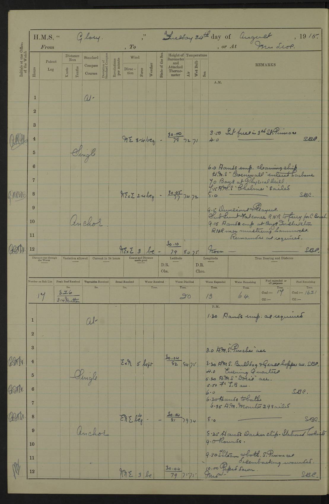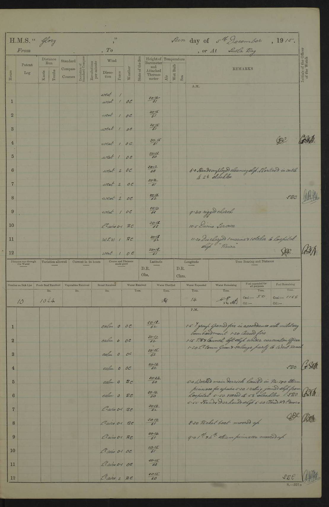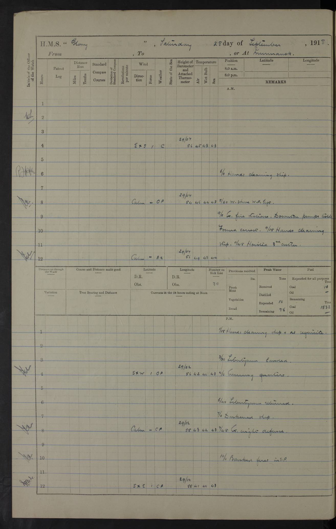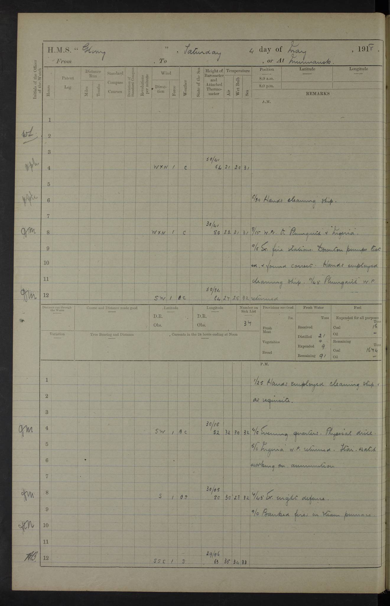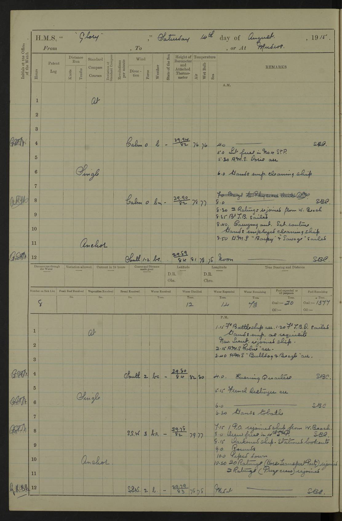 22 June 1915 At sea, Gibraltar to Lemnos Lat 36.1, Long -1.3 4.15am: Sighted land on starboard bow. 10.20am: Stopped port engine for repairs. 11.20am: proceeded with port engine. pm: a/c due to change in deviation. 10.00pm: Cape Tenez Light abeam, 18 miles. 4f73cd61a2fc8ea9030015f6: (https://s3.amazonaws.com:443/oldweather/ADM53-43015/0012_1.jpg) 23 June 1915 At sea, Gibraltar to Lemnos Lat 37.5, Long 4.8 Number on sick list: 4 5.00am: Secured from night defence stations. Placed anti-submarine guns. pm: Life saving appliances served out to men stationed in ? ?at abandon ship. 4f73cd61a2fc8ea9030015f7: (https://s3.amazonaws.com:443/oldweather/ADM53-43015/0013_0.jpg) 24 June 1915 At sea, Gibraltar to Lemnos Lat 37.4, Long 10.8 Position in log clearly bears no resemblance to the location of the ship. Position above is approximate and is based sighting of Zembra Island at 11.55am. 5.00am: Dispersed from night defence stations. Manned anti-submarine guns. am: Sighted two French torpedo boats. am: Torpedo boats passed to ~ No 362, 363. am: Sighted land on starboard beam. 11.55am: Zembra Island abeam, 25 miles. 2.00pm: Sighted Pantellaria S34ºE. 4.45pm: Pantellaria Light House abeam 12 miles. 4f73cd61a2fc8ea9030015f8: (https://s3.amazonaws.com:443/oldweather/ADM53-43015/0013_1.jpg) 25 June 1915 At sea, Gibraltar to Lemnos Lat 35.5, Long 16.7 2.10am: Gozo Light abeam 17 miles. 5.00am: Dispersed from night defence stations. Manned anti-submarine guns. 4f73cd61a2fc8ea9030015f9: (https://s3.amazonaws.com:443/oldweather/ADM53-43015/0014_0.jpg) 26 June 1915 At sea, Gibraltar to Lemnos Lat 35.5, Long 22.6 Number on sick list: 5 5.00am: Dispersed from night defence stations. Manned anti-submarine guns. am: Aired night clothing. am: marines at maxim practice on quarter deck. 2.00pm: Observed land on either bow. 3.00pm: Sighted French patrol destroyer. 4.15pm: Sighted French patrol destroyer. 9.40pm: Milo Peak N63ºW. 10.26pm: Polino Light abeam to port 5.5 miles. 4f73cd62a2fc8ea9030015fa: (https://s3.amazonaws.com:443/oldweather/ADM53-43015/0014_1.jpg) 27 June 1915 At sea and at Lemnos Lat 39.1, Long 24.4 From 0.50 to 3.05am sighting of multiple light houses. 3.50am: a/c to N39ºW and commenced to zig-zag. 5.00am: Dispersed from night defence stations and placed anti-submarine guns and look-outs. am: Lost overboard by accident Hazlewood fender, pat. 311, one in number. 10.30am: Held Divine Service onboard. pm: Met and signalled HMS Minerva on patrol duty. pm: Courses and speeds as requisite while waiting orders to approach Mudros. 3.00pm: Proceeded. 5.16pm: Increased to 90 revs, commenced to zig-zag. Course as requisite for Mudros. 7.00pm: Entered Mudros Bay. 7.47pm: Stopped. Let go port anchor in ‘M3’. 8.30pm: Darkened ship. pm: Manned one 6” and one 12 pdr. 4f73cd62a2fc8ea9030015fb: (https://s3.amazonaws.com:443/oldweather/ADM53-43015/0015_0.jpg) 28 June 1915 Mudros Bay, Lemnos Lat 39.89, Long 25.24 5,00am: HMS Vengeance entered harbour. HMS Vengeance was a pre-dreadnought of the Canopus class, launched in 1899 at Vickers, Barrow, and sold for scrapping in 1921. Details at http://en.wikipedia.org/wiki/HMS_Vengeance_(1899) . am/pm/: hands preparing for coaling and about ship’s work. pm: Collier Wabana secured alongside. 4f73cd62a2fc8ea9030015fc: (https://s3.amazonaws.com:443/oldweather/ADM53-43015/0015_1.jpg) 29 June 1915 Mudros Bay, Lemnos Lat 39.89, Long 25.24 5.15am: Commenced coaling. 2.00pm: Finished coaling. Collier left. 4f73cd62a2fc8ea9030015fd: (https://s3.amazonaws.com:443/oldweather/ADM53-43015/0016_0.jpg) 30 June 1915 Mudros Bay, Lemnos Lat 39.89, Long 25.24 am: Parties away sanding, and with fire engines onshore. am: Boats away disembarking troops. am: French Flagship Patrie sailed. The Patrie was a French pre-dreadnought, launched at La Seyne shipyard in 1903, and stricken in 1921. Details at http://en.wikipedia.org/wiki/French_battleship_Patrie . 6.30pm: Hands to bathe. 4f73cd63a2fc8ea9030015fe: (https://s3.amazonaws.com:443/oldweather/ADM53-43015/0016_1.jpg) 4f73cd63a2fc8ea9030015ff: (https://s3.amazonaws.com:443/oldweather/ADM53-43015/0017_0.jpg) 4f73cd63a2fc8ea903001600: (https://s3.amazonaws.com:443/oldweather/ADM53-43015/0017_1.jpg) 4f73cd63a2fc8ea903001601: (https://s3.amazonaws.com:443/oldweather/ADM53-43015/0018_0.jpg) 4f73cd64a2fc8ea903001602: (https://s3.amazonaws.com:443/oldweather/ADM53-43015/0018_1.jpg) LOGS FOR JULY 1915 From July to October 1915, HMS Glory spent her time at Port Mudros. Certain activities typically took place daily and are not generally noted in the pages below. These activities include: Lighting fires in the picket boat around 4am and drawing the fires in the late evening; Divisions at around 9–9.30am and Evening Quarters at 4pm; Darken ship at around 8.30pm; Daily ‘cleaning ship’, with variations thereof; SBC (for ‘Signal Books Correct’) at the watch changes. 4f73cd64a2fc8ea903001603: (https://s3.amazonaws.com:443/oldweather/ADM53-43016/0000_0.jpg) 4f73cd64a2fc8ea903001604: (https://s3.amazonaws.com:443/oldweather/ADM53-43016/0000_1.jpg) 4f73cd65a2fc8ea903001605: (https://s3.amazonaws.com:443/oldweather/ADM53-43016/0001_0.jpg) 4f73cd65a2fc8ea903001606: (https://s3.amazonaws.com:443/oldweather/ADM53-43016/0001_1.jpg) 1 July 1915 Port Mudros Lat 39.89, Long 25.24 6.30am: Landed working parties preparing boom defence ships. am: Discharged Acting Commander Rayne to Hector. Hector was a kite balloon ship. No further details readily available. 5.00pm: Tug T.10 made fast astern. 7.15pm: HMS Venerable went out. 7.30pm: HMS Chatham went out. HMS Chatham was a ‘Town’ cruiser and lead ship of her class. She was launched in 1911 at Chatham Dockyard and sold in 1926. Details at http://en.wikipedia.org/wiki/HMS_Chatham_(1911) . 4f73cd65a2fc8ea903001607: (https://s3.amazonaws.com:443/oldweather/ADM53-43016/0002_0.jpg) 2 July 1915 Port Mudros Lat 39.89, Long 25.24 5.35am: Landed working parties preparing boom defence ships. am/pm: Boom defence par