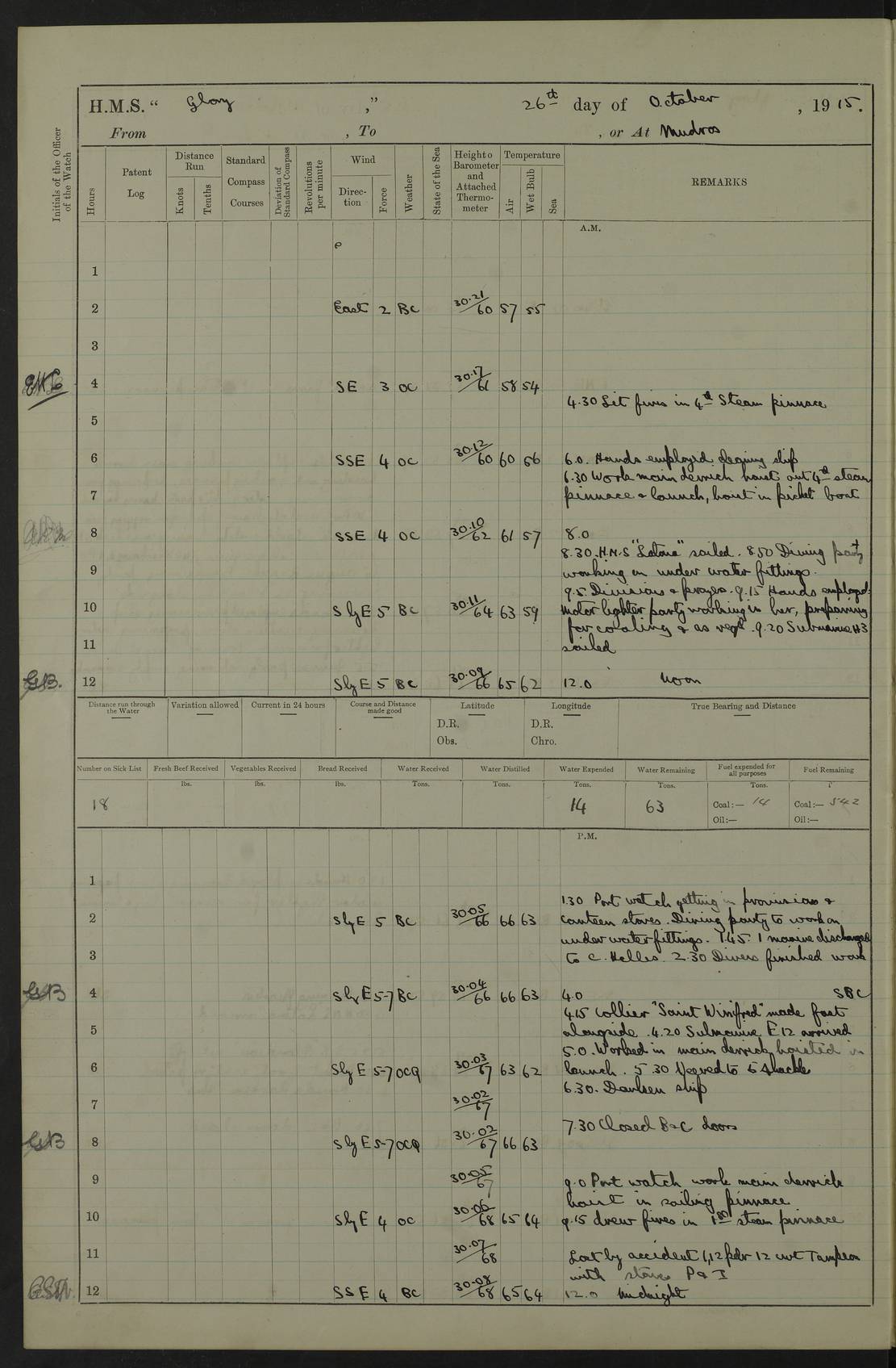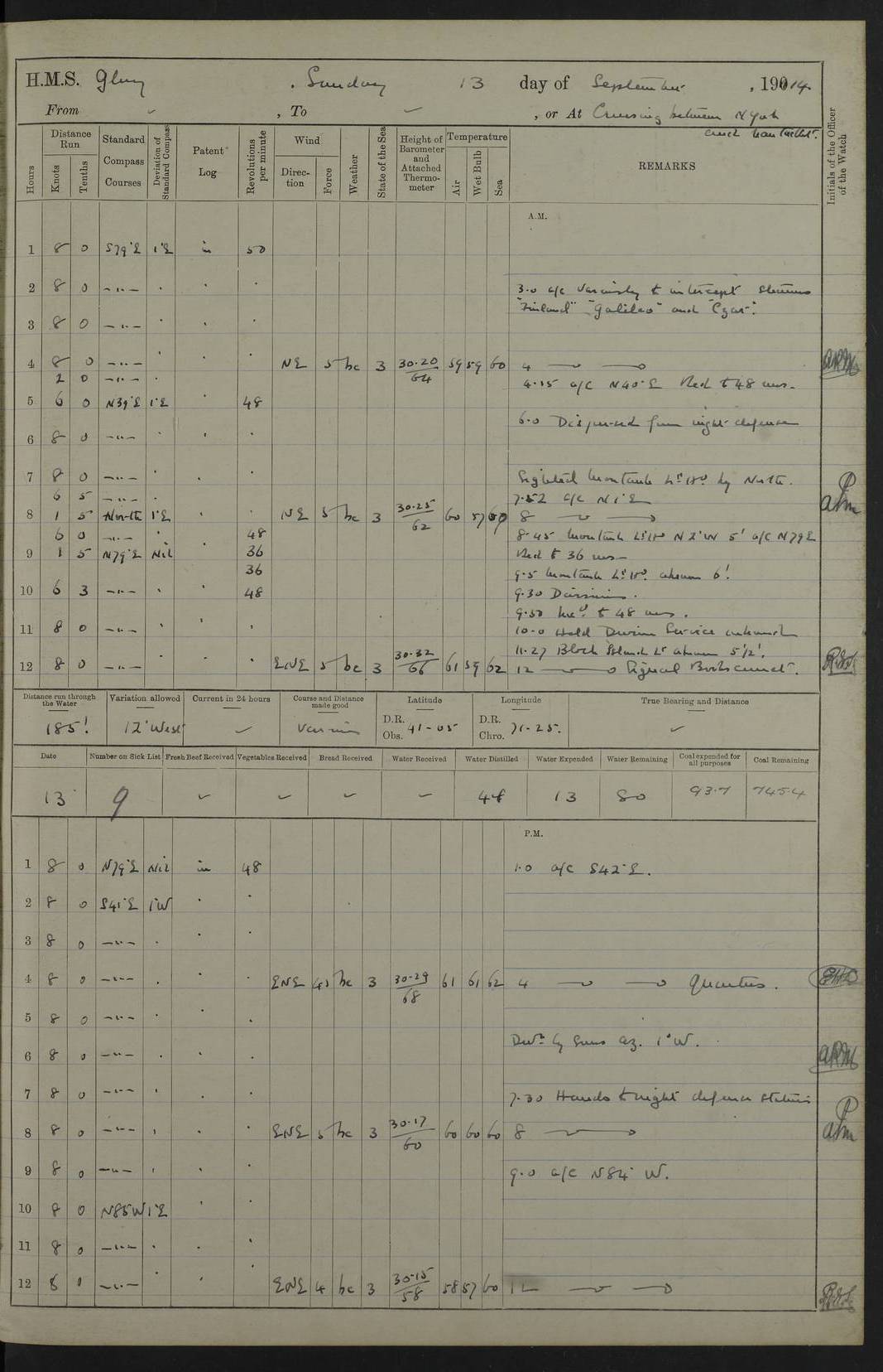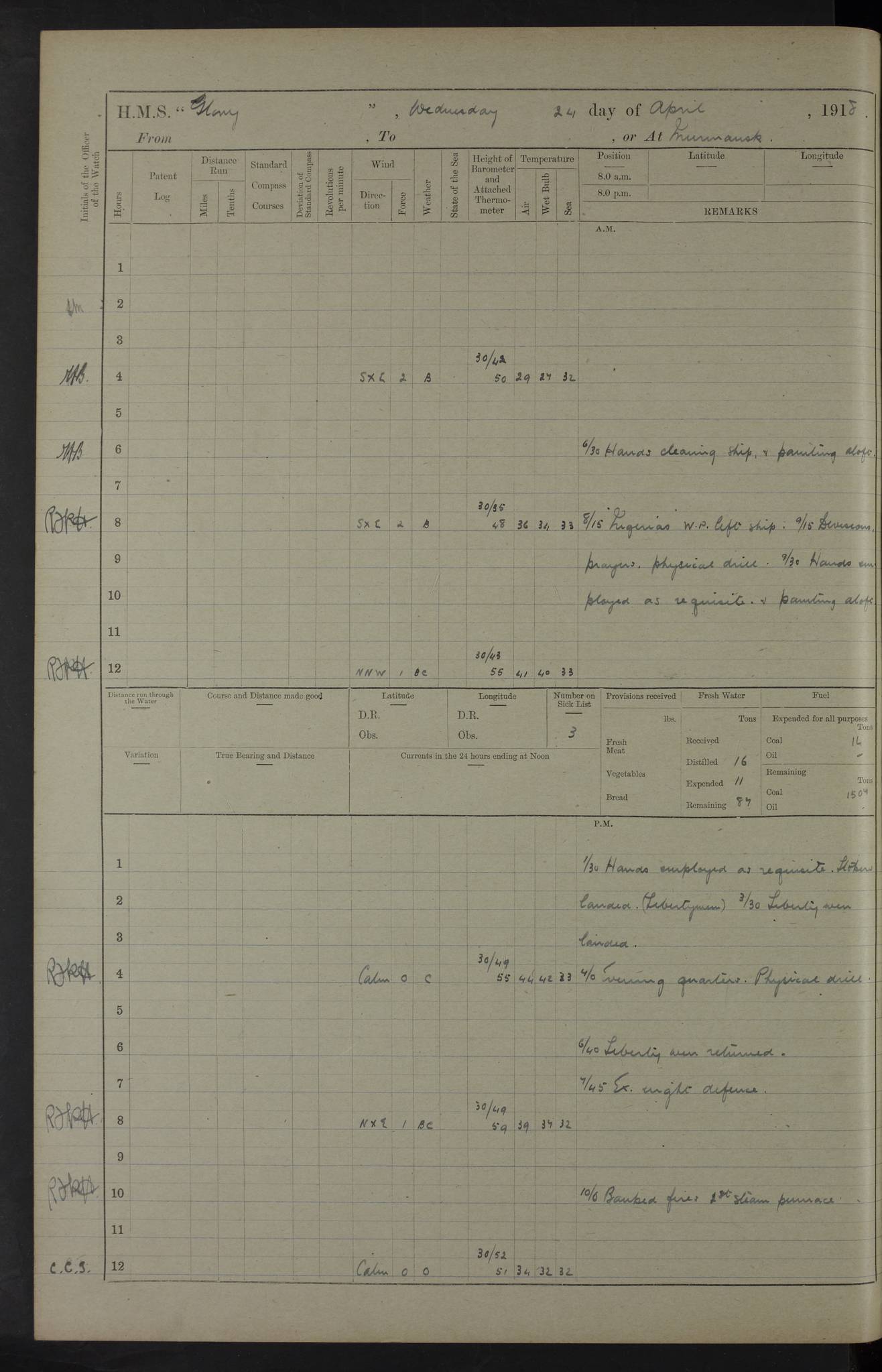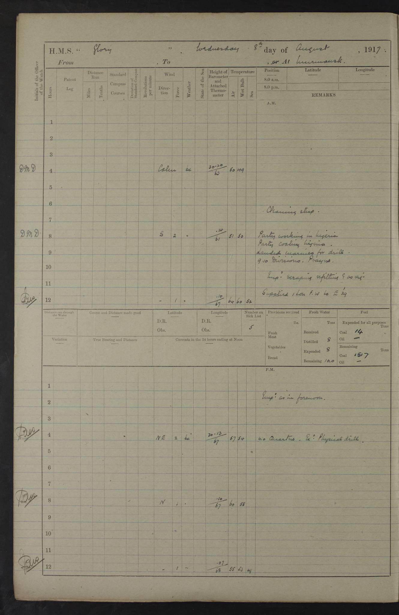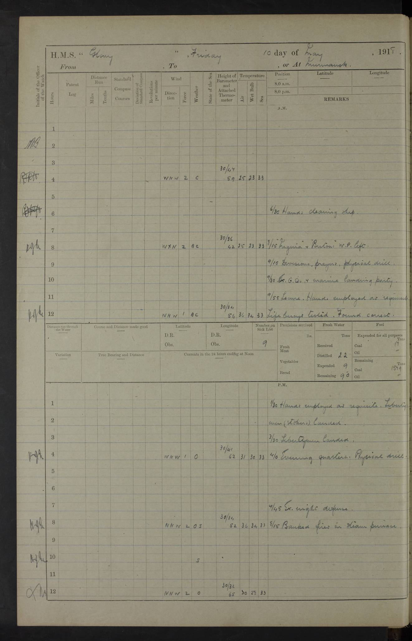 22 June 1915 At sea, Gibraltar to Lemnos Lat 36.1, Long -1.3 4.15am: Sighted land on starboard bow. 10.20am: Stopped port engine for repairs. 11.20am: proceeded with port engine. pm: a/c due to change in deviation. 10.00pm: Cape Tenez Light abeam, 18 miles. 4f73cd61a2fc8ea9030015f6: (https://s3.amazonaws.com:443/oldweather/ADM53-43015/0012_1.jpg) 23 June 1915 At sea, Gibraltar to Lemnos Lat 37.5, Long 4.8 Number on sick list: 4 5.00am: Secured from night defence stations. Placed anti-submarine guns. pm: Life saving appliances served out to men stationed in ? ?at abandon ship. 4f73cd61a2fc8ea9030015f7: (https://s3.amazonaws.com:443/oldweather/ADM53-43015/0013_0.jpg) 24 June 1915 At sea, Gibraltar to Lemnos Lat 37.4, Long 10.8 Position in log clearly bears no resemblance to the location of the ship. Position above is approximate and is based sighting of Zembra Island at 11.55am. 5.00am: Dispersed from night defence stations. Manned anti-submarine guns. am: Sighted two French torpedo boats. am: Torpedo boats passed to ~ No 362, 363. am: Sighted land on starboard beam. 11.55am: Zembra Island abeam, 25 miles. 2.00pm: Sighted Pantellaria S34ºE. 4.45pm: Pantellaria Light House abeam 12 miles. 4f73cd61a2fc8ea9030015f8: (https://s3.amazonaws.com:443/oldweather/ADM53-43015/0013_1.jpg) 25 June 1915 At sea, Gibraltar to Lemnos Lat 35.5, Long 16.7 2.10am: Gozo Light abeam 17 miles. 5.00am: Dispersed from night defence stations. Manned anti-submarine guns. 4f73cd61a2fc8ea9030015f9: (https://s3.amazonaws.com:443/oldweather/ADM53-43015/0014_0.jpg) 26 June 1915 At sea, Gibraltar to Lemnos Lat 35.5, Long 22.6 Number on sick list: 5 5.00am: Dispersed from night defence stations. Manned anti-submarine guns. am: Aired night clothing. am: marines at maxim practice on quarter deck. 2.00pm: Observed land on either bow. 3.00pm: Sighted French patrol destroyer. 4.15pm: Sighted French patrol destroyer. 9.40pm: Milo Peak N63ºW. 10.26pm: Polino Light abeam to port 5.5 miles. 4f73cd62a2fc8ea9030015fa: (https://s3.amazonaws.com:443/oldweather/ADM53-43015/0014_1.jpg) 27 June 1915 At sea and at Lemnos Lat 39.1, Long 24.4 From 0.50 to 3.05am sighting of multiple light houses. 3.50am: a/c to N39ºW and commenced to zig-zag. 5.00am: Dispersed from night defence stations and placed anti-submarine guns and look-outs. am: Lost overboard by accident Hazlewood fender, pat. 311, one in number. 10.30am: Held Divine Service onboard. pm: Met and signalled HMS Minerva on patrol duty. pm: Courses and speeds as requisite while waiting orders to approach Mudros. 3.00pm: Proceeded. 5.16pm: Increased to 90 revs, commenced to zig-zag. Course as requisite for Mudros. 7.00pm: Entered Mudros Bay. 7.47pm: Stopped. Let go port anchor in ‘M3’. 8.30pm: Darkened ship. pm: Manned one 6” and one 12 pdr. 4f73cd62a2fc8ea9030015fb: (https://s3.amazonaws.com:443/oldweather/ADM53-43015/0015_0.jpg) 28 June 1915 Mudros Bay, Lemnos Lat 39.89, Long 25.24 5,00am: HMS Vengeance entered harbour. HMS Vengeance was a pre-dreadnought of the Canopus class, launched in 1899 at Vickers, Barrow, and sold for scrapping in 1921. Details at http://en.wikipedia.org/wiki/HMS_Vengeance_(1899) . am/pm/: hands preparing for coaling and about ship’s work. pm: Collier Wabana secured alongside. 4f73cd62a2fc8ea9030015fc: (https://s3.amazonaws.com:443/oldweather/ADM53-43015/0015_1.jpg) 29 June 1915 Mudros Bay, Lemnos Lat 39.89, Long 25.24 5.15am: Commenced coaling. 2.00pm: Finished coaling. Collier left. 4f73cd62a2fc8ea9030015fd: (https://s3.amazonaws.com:443/oldweather/ADM53-43015/0016_0.jpg) 30 June 1915 Mudros Bay, Lemnos Lat 39.89, Long 25.24 am: Parties away sanding, and with fire engines onshore. am: Boats away disembarking troops. am: French Flagship Patrie sailed. The Patrie was a French pre-dreadnought, launched at La Seyne shipyard in 1903, and stricken in 1921. Details at http://en.wikipedia.org/wiki/French_battleship_Patrie . 6.30pm: Hands to bathe. 4f73cd63a2fc8ea9030015fe: (https://s3.amazonaws.com:443/oldweather/ADM53-43015/0016_1.jpg) 4f73cd63a2fc8ea9030015ff: (https://s3.amazonaws.com:443/oldweather/ADM53-43015/0017_0.jpg) 4f73cd63a2fc8ea903001600: (https://s3.amazonaws.com:443/oldweather/ADM53-43015/0017_1.jpg) 4f73cd63a2fc8ea903001601: (https://s3.amazonaws.com:443/oldweather/ADM53-43015/0018_0.jpg) 4f73cd64a2fc8ea903001602: (https://s3.amazonaws.com:443/oldweather/ADM53-43015/0018_1.jpg) LOGS FOR JULY 1915 From July to October 1915, HMS Glory spent her time at Port Mudros. Certain activities typically took place daily and are not generally noted in the pages below. These activities include: Lighting fires in the picket boat around 4am and drawing the fires in the late evening; Divisions at around 9–9.30am and Evening Quarters at 4pm; Darken ship at around 8.30pm; Daily ‘cleaning ship’, with variations thereof; SBC (for ‘Signal Books Correct’) at the watch changes. 4f73cd64a2fc8ea903001603: (https://s3.amazonaws.com:443/oldweather/ADM53-43016/0000_0.jpg) 4f73cd64a2fc8ea903001604: (https://s3.amazonaws.com:443/oldweather/ADM53-43016/0000_1.jpg) 4f73cd65a2fc8ea903001605: (https://s3.amazonaws.com:443/oldweather/ADM53-43016/0001_0.jpg) 4f73cd65a2fc8ea903001606: (https://s3.amazonaws.com:443/oldweather/ADM53-43016/0001_1.jpg) 1 July 1915 Port Mudros Lat 39.89, Long 25.24 6.30am: Landed working parties preparing boom defence ships. am: Discharged Acting Commander Rayne to Hector. Hector was a kite balloon ship. No further details readily available. 5.00pm: Tug T.10 made fast astern. 7.15pm: HMS Venerable went out. 7.30pm: HMS Chatham went out. HMS Chatham was a ‘Town’ cruiser and lead ship of her class. She was launched in 1911 at Chatham Dockyard and sold in 1926. Details at http://en.wikipedia.org/wiki/HMS_Chatham_(1911) . 4f73cd65a2fc8ea903001607: (https://s3.amazonaws.com:443/oldweather/ADM53-43016/0002_0.jpg) 2 July 1915 Port Mudros Lat 39.89, Long 25.24 5.35am: Landed working parties preparing boom defence ships. am/pm: Boom defence par