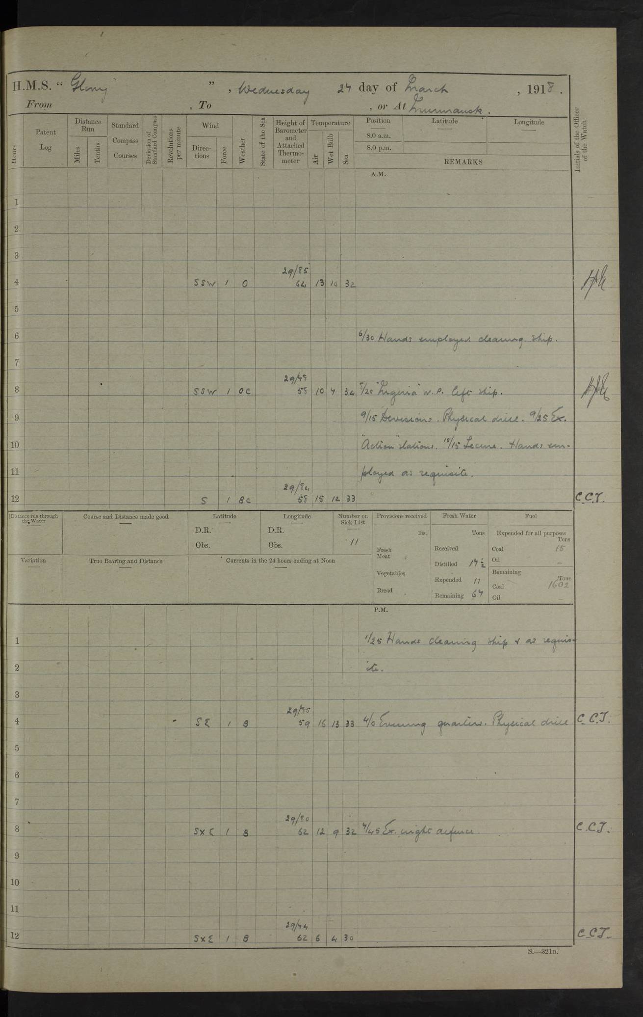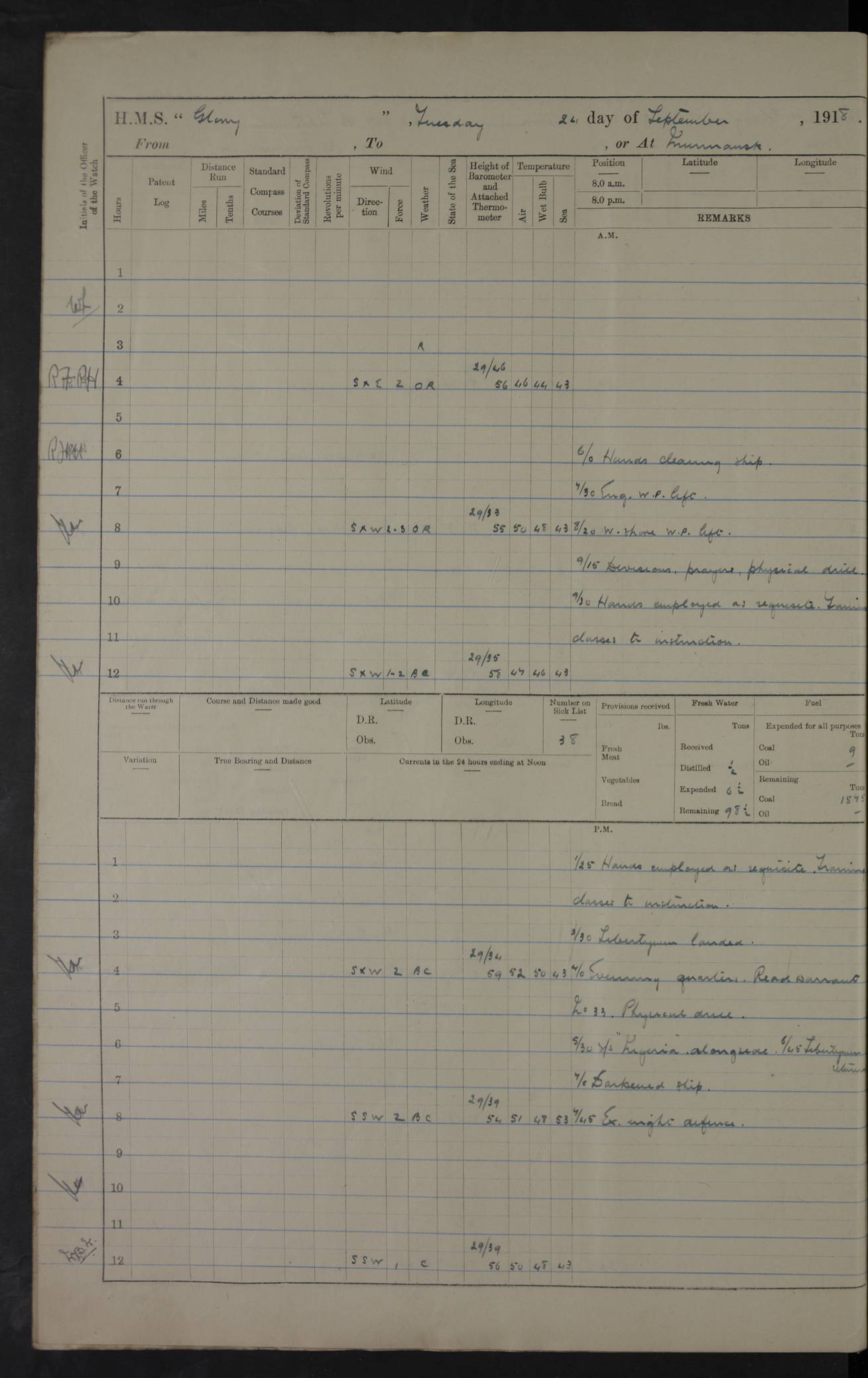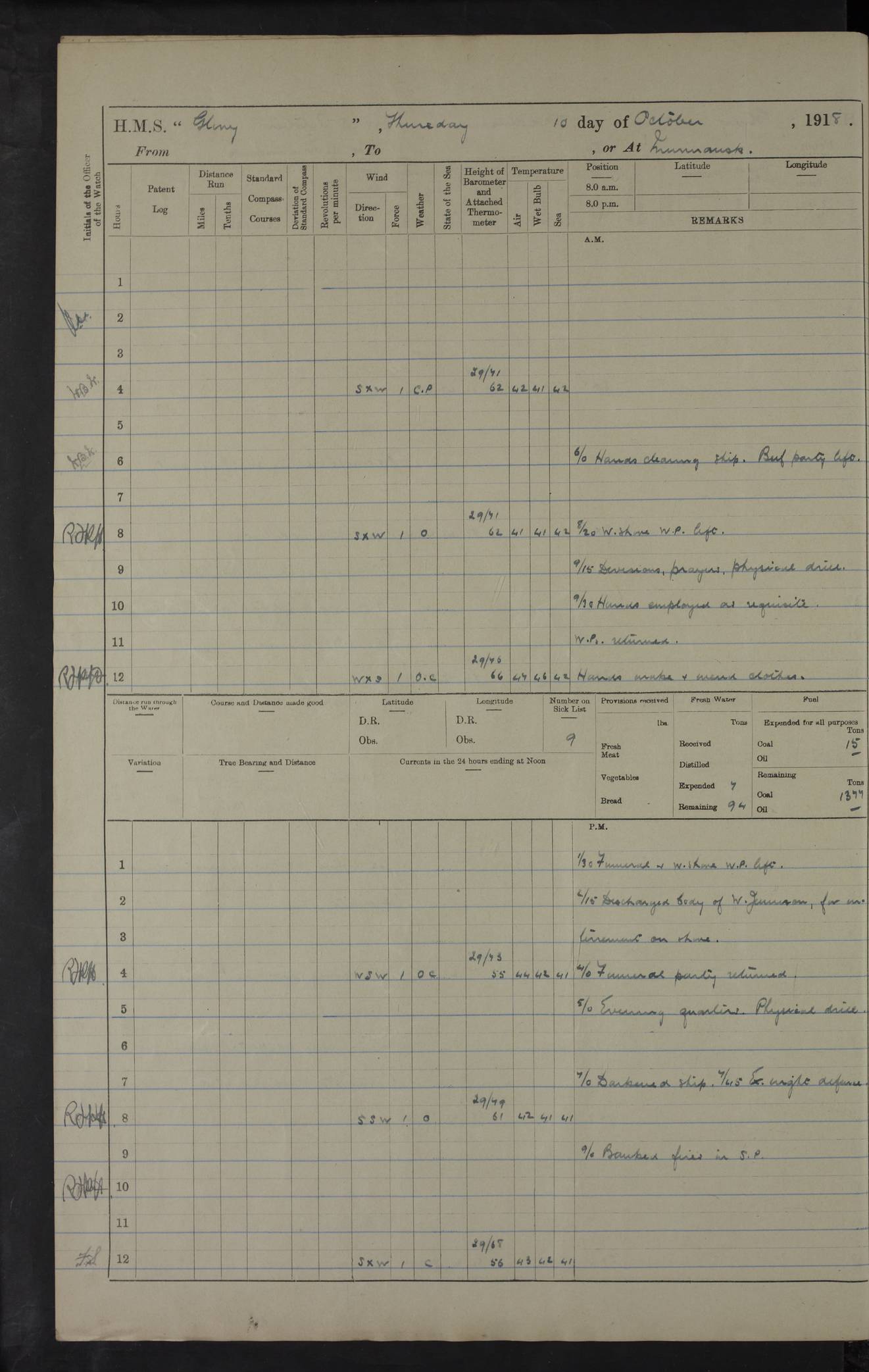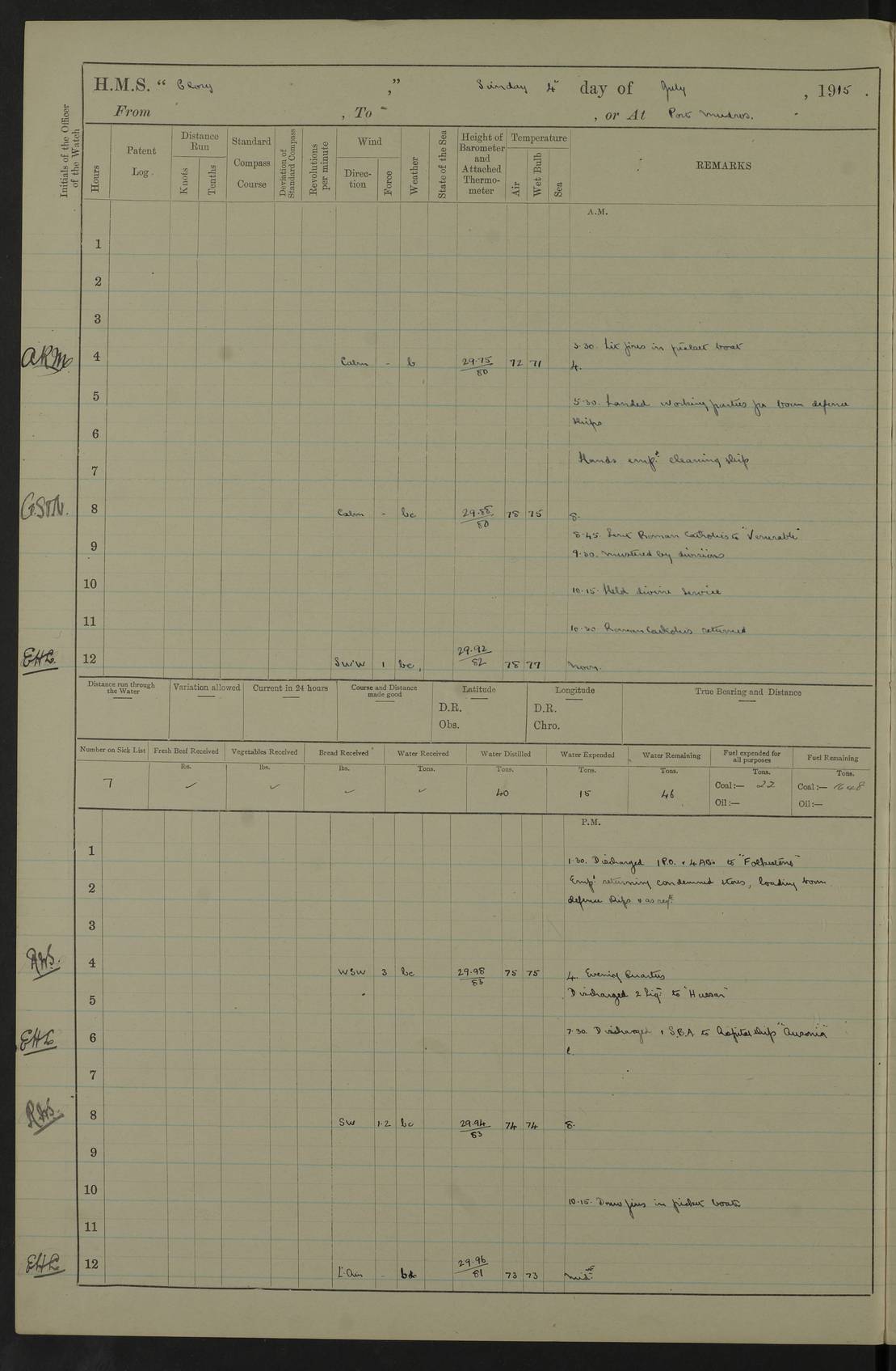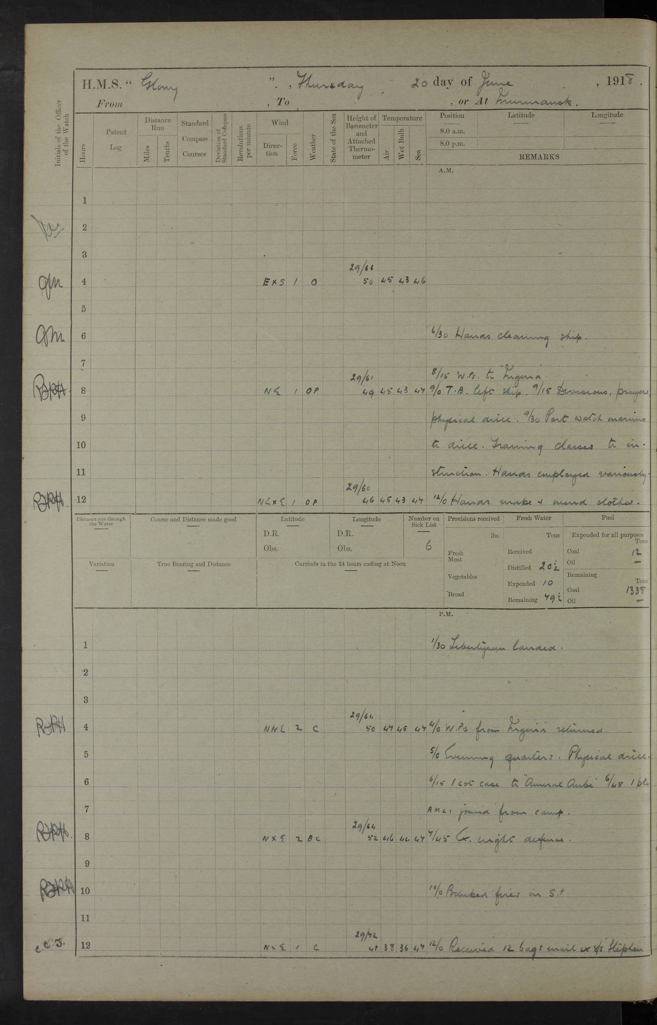 22 June 1915 At sea, Gibraltar to Lemnos Lat 36.1, Long -1.3 4.15am: Sighted land on starboard bow. 10.20am: Stopped port engine for repairs. 11.20am: proceeded with port engine. pm: a/c due to change in deviation. 10.00pm: Cape Tenez Light abeam, 18 miles. 4f73cd61a2fc8ea9030015f6: (https://s3.amazonaws.com:443/oldweather/ADM53-43015/0012_1.jpg) 23 June 1915 At sea, Gibraltar to Lemnos Lat 37.5, Long 4.8 Number on sick list: 4 5.00am: Secured from night defence stations. Placed anti-submarine guns. pm: Life saving appliances served out to men stationed in ? ?at abandon ship. 4f73cd61a2fc8ea9030015f7: (https://s3.amazonaws.com:443/oldweather/ADM53-43015/0013_0.jpg) 24 June 1915 At sea, Gibraltar to Lemnos Lat 37.4, Long 10.8 Position in log clearly bears no resemblance to the location of the ship. Position above is approximate and is based sighting of Zembra Island at 11.55am. 5.00am: Dispersed from night defence stations. Manned anti-submarine guns. am: Sighted two French torpedo boats. am: Torpedo boats passed to ~ No 362, 363. am: Sighted land on starboard beam. 11.55am: Zembra Island abeam, 25 miles. 2.00pm: Sighted Pantellaria S34ºE. 4.45pm: Pantellaria Light House abeam 12 miles. 4f73cd61a2fc8ea9030015f8: (https://s3.amazonaws.com:443/oldweather/ADM53-43015/0013_1.jpg) 25 June 1915 At sea, Gibraltar to Lemnos Lat 35.5, Long 16.7 2.10am: Gozo Light abeam 17 miles. 5.00am: Dispersed from night defence stations. Manned anti-submarine guns. 4f73cd61a2fc8ea9030015f9: (https://s3.amazonaws.com:443/oldweather/ADM53-43015/0014_0.jpg) 26 June 1915 At sea, Gibraltar to Lemnos Lat 35.5, Long 22.6 Number on sick list: 5 5.00am: Dispersed from night defence stations. Manned anti-submarine guns. am: Aired night clothing. am: marines at maxim practice on quarter deck. 2.00pm: Observed land on either bow. 3.00pm: Sighted French patrol destroyer. 4.15pm: Sighted French patrol destroyer. 9.40pm: Milo Peak N63ºW. 10.26pm: Polino Light abeam to port 5.5 miles. 4f73cd62a2fc8ea9030015fa: (https://s3.amazonaws.com:443/oldweather/ADM53-43015/0014_1.jpg) 27 June 1915 At sea and at Lemnos Lat 39.1, Long 24.4 From 0.50 to 3.05am sighting of multiple light houses. 3.50am: a/c to N39ºW and commenced to zig-zag. 5.00am: Dispersed from night defence stations and placed anti-submarine guns and look-outs. am: Lost overboard by accident Hazlewood fender, pat. 311, one in number. 10.30am: Held Divine Service onboard. pm: Met and signalled HMS Minerva on patrol duty. pm: Courses and speeds as requisite while waiting orders to approach Mudros. 3.00pm: Proceeded. 5.16pm: Increased to 90 revs, commenced to zig-zag. Course as requisite for Mudros. 7.00pm: Entered Mudros Bay. 7.47pm: Stopped. Let go port anchor in ‘M3’. 8.30pm: Darkened ship. pm: Manned one 6” and one 12 pdr. 4f73cd62a2fc8ea9030015fb: (https://s3.amazonaws.com:443/oldweather/ADM53-43015/0015_0.jpg) 28 June 1915 Mudros Bay, Lemnos Lat 39.89, Long 25.24 5,00am: HMS Vengeance entered harbour. HMS Vengeance was a pre-dreadnought of the Canopus class, launched in 1899 at Vickers, Barrow, and sold for scrapping in 1921. Details at http://en.wikipedia.org/wiki/HMS_Vengeance_(1899) . am/pm/: hands preparing for coaling and about ship’s work. pm: Collier Wabana secured alongside. 4f73cd62a2fc8ea9030015fc: (https://s3.amazonaws.com:443/oldweather/ADM53-43015/0015_1.jpg) 29 June 1915 Mudros Bay, Lemnos Lat 39.89, Long 25.24 5.15am: Commenced coaling. 2.00pm: Finished coaling. Collier left. 4f73cd62a2fc8ea9030015fd: (https://s3.amazonaws.com:443/oldweather/ADM53-43015/0016_0.jpg) 30 June 1915 Mudros Bay, Lemnos Lat 39.89, Long 25.24 am: Parties away sanding, and with fire engines onshore. am: Boats away disembarking troops. am: French Flagship Patrie sailed. The Patrie was a French pre-dreadnought, launched at La Seyne shipyard in 1903, and stricken in 1921. Details at http://en.wikipedia.org/wiki/French_battleship_Patrie . 6.30pm: Hands to bathe. 4f73cd63a2fc8ea9030015fe: (https://s3.amazonaws.com:443/oldweather/ADM53-43015/0016_1.jpg) 4f73cd63a2fc8ea9030015ff: (https://s3.amazonaws.com:443/oldweather/ADM53-43015/0017_0.jpg) 4f73cd63a2fc8ea903001600: (https://s3.amazonaws.com:443/oldweather/ADM53-43015/0017_1.jpg) 4f73cd63a2fc8ea903001601: (https://s3.amazonaws.com:443/oldweather/ADM53-43015/0018_0.jpg) 4f73cd64a2fc8ea903001602: (https://s3.amazonaws.com:443/oldweather/ADM53-43015/0018_1.jpg) LOGS FOR JULY 1915 From July to October 1915, HMS Glory spent her time at Port Mudros. Certain activities typically took place daily and are not generally noted in the pages below. These activities include: Lighting fires in the picket boat around 4am and drawing the fires in the late evening; Divisions at around 9–9.30am and Evening Quarters at 4pm; Darken ship at around 8.30pm; Daily ‘cleaning ship’, with variations thereof; SBC (for ‘Signal Books Correct’) at the watch changes. 4f73cd64a2fc8ea903001603: (https://s3.amazonaws.com:443/oldweather/ADM53-43016/0000_0.jpg) 4f73cd64a2fc8ea903001604: (https://s3.amazonaws.com:443/oldweather/ADM53-43016/0000_1.jpg) 4f73cd65a2fc8ea903001605: (https://s3.amazonaws.com:443/oldweather/ADM53-43016/0001_0.jpg) 4f73cd65a2fc8ea903001606: (https://s3.amazonaws.com:443/oldweather/ADM53-43016/0001_1.jpg) 1 July 1915 Port Mudros Lat 39.89, Long 25.24 6.30am: Landed working parties preparing boom defence ships. am: Discharged Acting Commander Rayne to Hector. Hector was a kite balloon ship. No further details readily available. 5.00pm: Tug T.10 made fast astern. 7.15pm: HMS Venerable went out. 7.30pm: HMS Chatham went out. HMS Chatham was a ‘Town’ cruiser and lead ship of her class. She was launched in 1911 at Chatham Dockyard and sold in 1926. Details at http://en.wikipedia.org/wiki/HMS_Chatham_(1911) . 4f73cd65a2fc8ea903001607: (https://s3.amazonaws.com:443/oldweather/ADM53-43016/0002_0.jpg) 2 July 1915 Port Mudros Lat 39.89, Long 25.24 5.35am: Landed working parties preparing boom defence ships. am/pm: Boom defence par