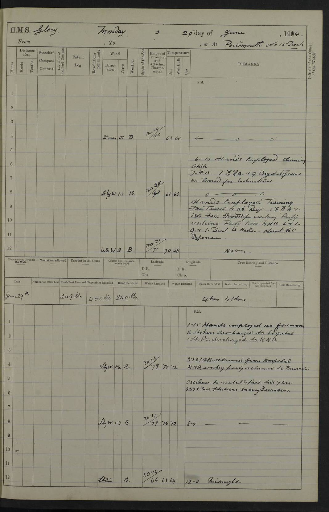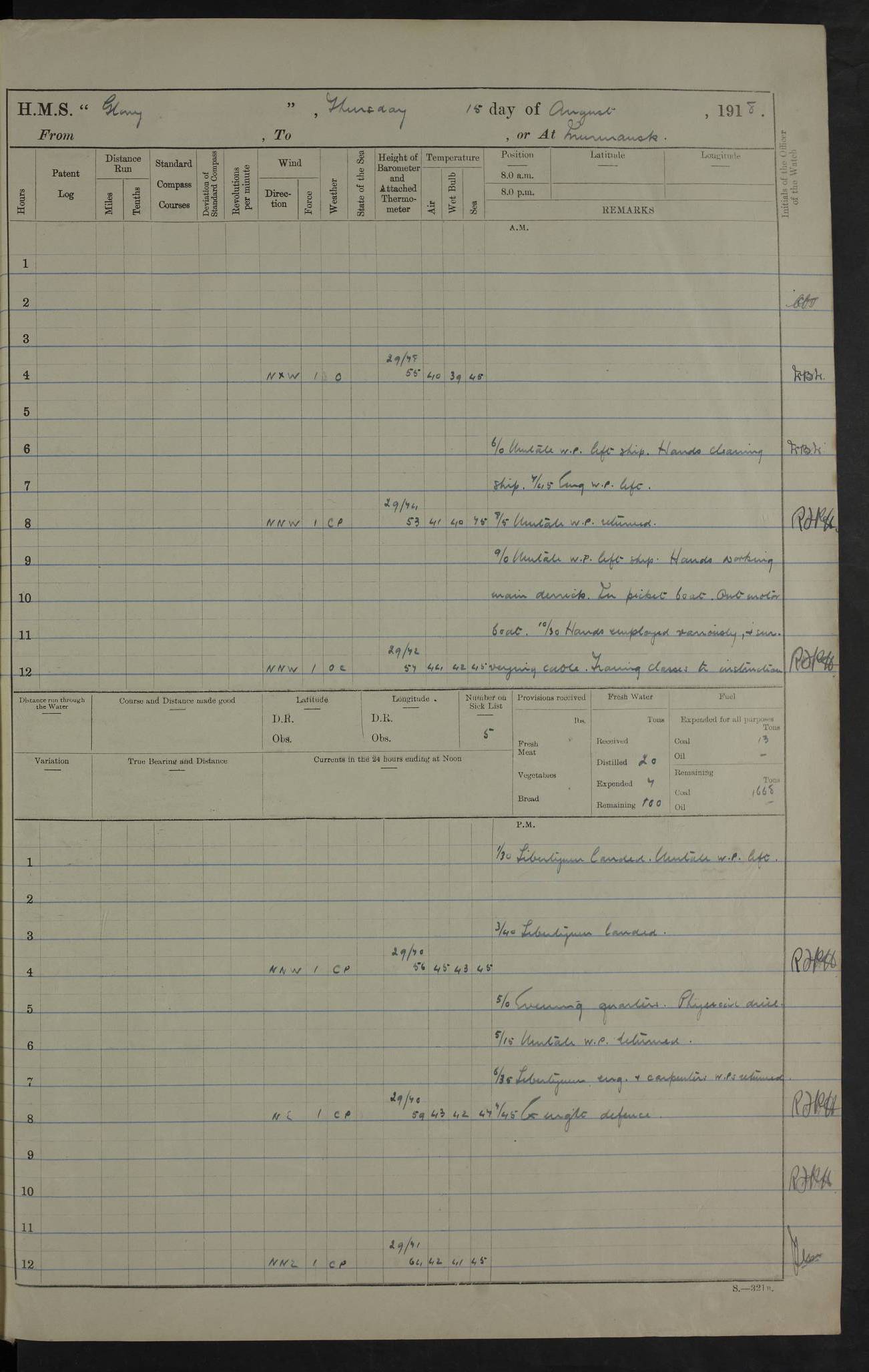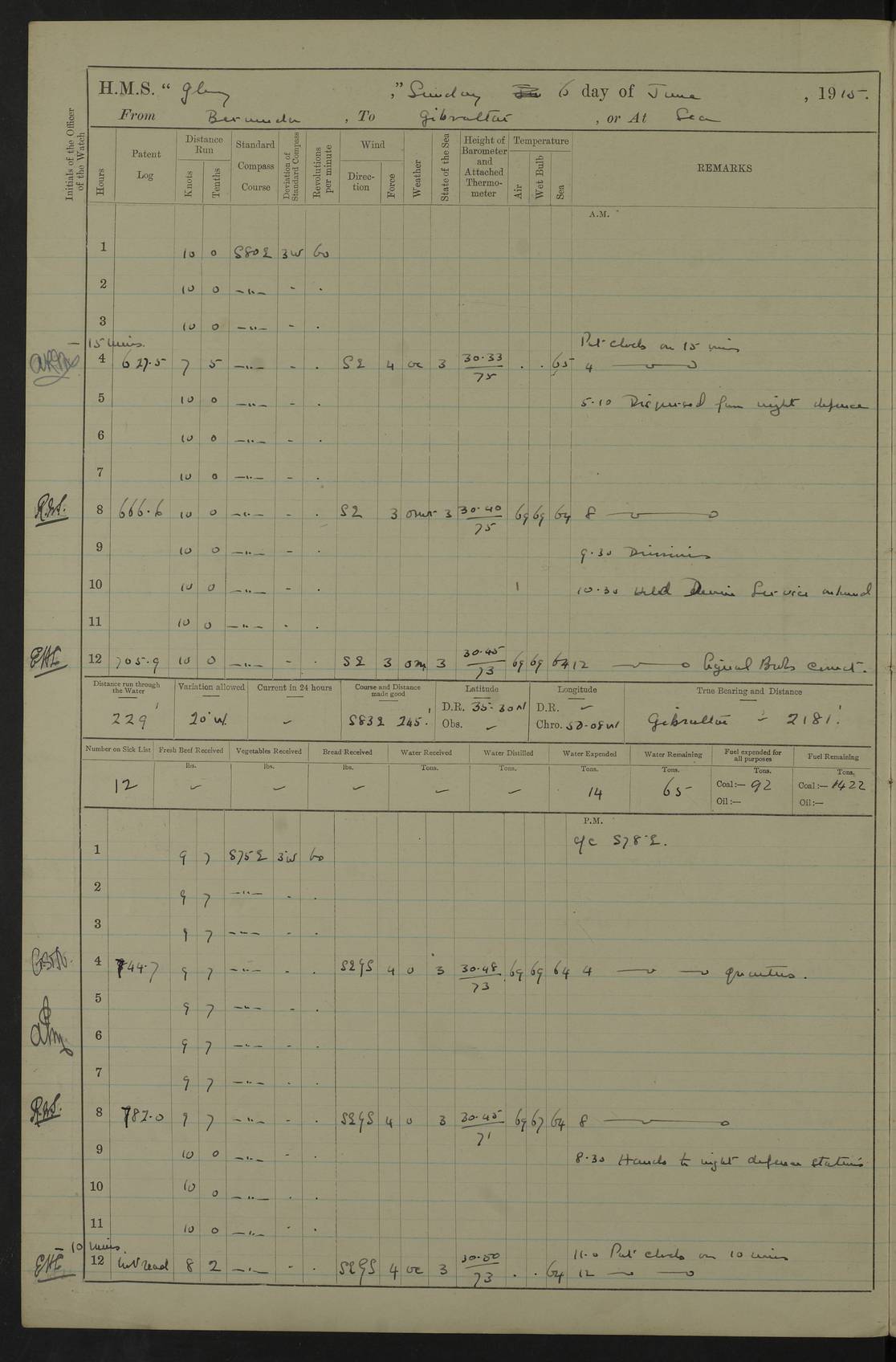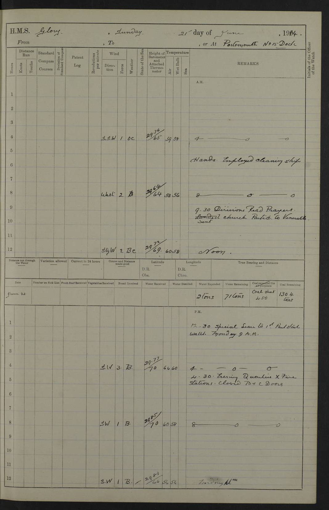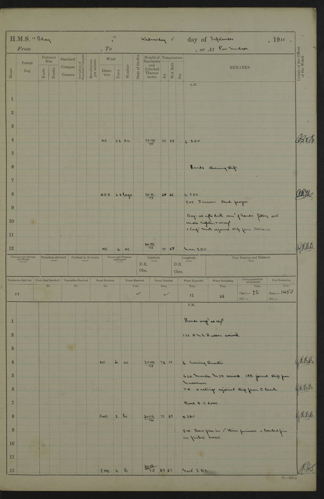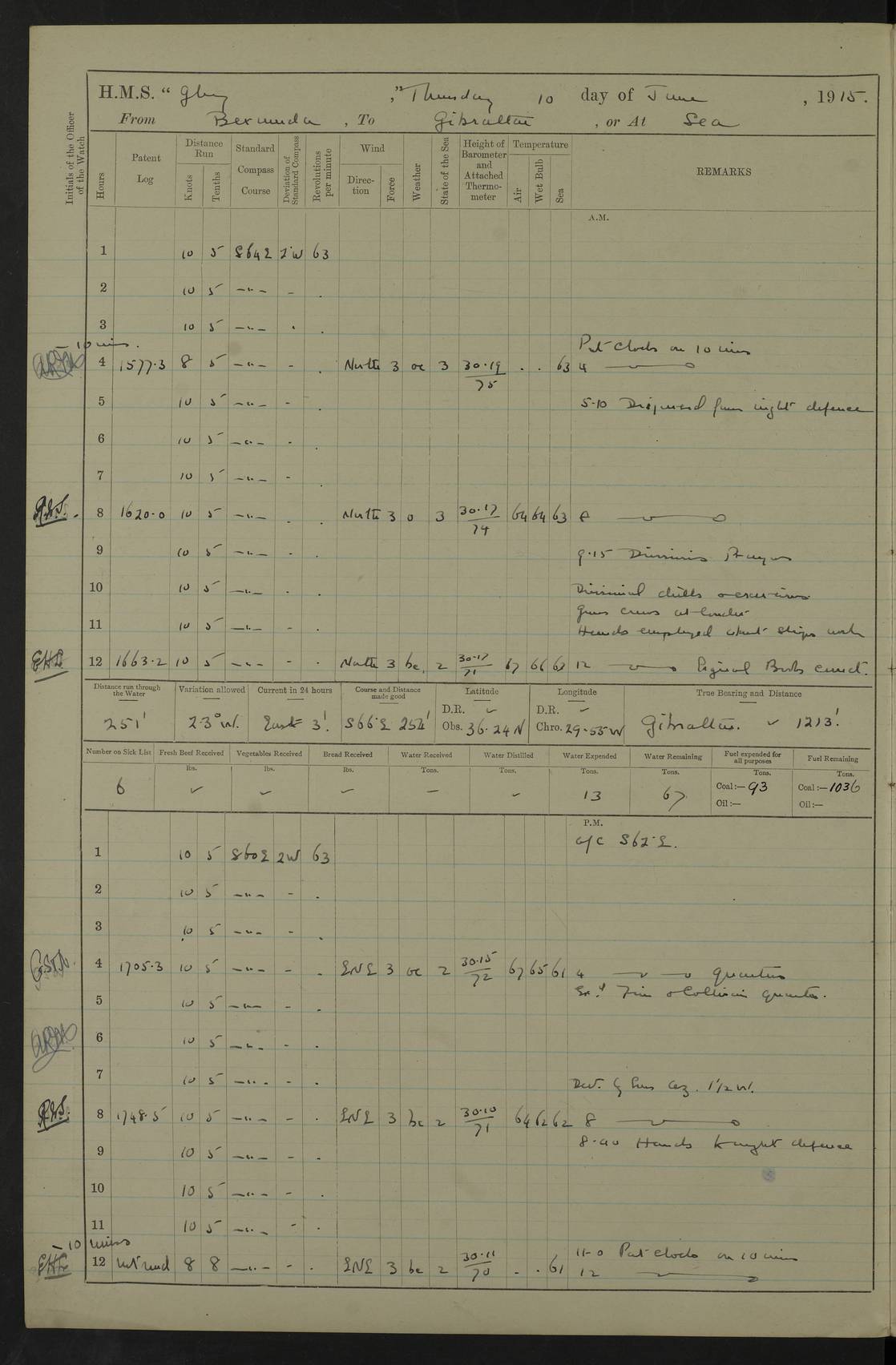 22 June 1915 At sea, Gibraltar to Lemnos Lat 36.1, Long -1.3 4.15am: Sighted land on starboard bow. 10.20am: Stopped port engine for repairs. 11.20am: proceeded with port engine. pm: a/c due to change in deviation. 10.00pm: Cape Tenez Light abeam, 18 miles. 4f73cd61a2fc8ea9030015f6: (https://s3.amazonaws.com:443/oldweather/ADM53-43015/0012_1.jpg) 23 June 1915 At sea, Gibraltar to Lemnos Lat 37.5, Long 4.8 Number on sick list: 4 5.00am: Secured from night defence stations. Placed anti-submarine guns. pm: Life saving appliances served out to men stationed in ? ?at abandon ship. 4f73cd61a2fc8ea9030015f7: (https://s3.amazonaws.com:443/oldweather/ADM53-43015/0013_0.jpg) 24 June 1915 At sea, Gibraltar to Lemnos Lat 37.4, Long 10.8 Position in log clearly bears no resemblance to the location of the ship. Position above is approximate and is based sighting of Zembra Island at 11.55am. 5.00am: Dispersed from night defence stations. Manned anti-submarine guns. am: Sighted two French torpedo boats. am: Torpedo boats passed to ~ No 362, 363. am: Sighted land on starboard beam. 11.55am: Zembra Island abeam, 25 miles. 2.00pm: Sighted Pantellaria S34ºE. 4.45pm: Pantellaria Light House abeam 12 miles. 4f73cd61a2fc8ea9030015f8: (https://s3.amazonaws.com:443/oldweather/ADM53-43015/0013_1.jpg) 25 June 1915 At sea, Gibraltar to Lemnos Lat 35.5, Long 16.7 2.10am: Gozo Light abeam 17 miles. 5.00am: Dispersed from night defence stations. Manned anti-submarine guns. 4f73cd61a2fc8ea9030015f9: (https://s3.amazonaws.com:443/oldweather/ADM53-43015/0014_0.jpg) 26 June 1915 At sea, Gibraltar to Lemnos Lat 35.5, Long 22.6 Number on sick list: 5 5.00am: Dispersed from night defence stations. Manned anti-submarine guns. am: Aired night clothing. am: marines at maxim practice on quarter deck. 2.00pm: Observed land on either bow. 3.00pm: Sighted French patrol destroyer. 4.15pm: Sighted French patrol destroyer. 9.40pm: Milo Peak N63ºW. 10.26pm: Polino Light abeam to port 5.5 miles. 4f73cd62a2fc8ea9030015fa: (https://s3.amazonaws.com:443/oldweather/ADM53-43015/0014_1.jpg) 27 June 1915 At sea and at Lemnos Lat 39.1, Long 24.4 From 0.50 to 3.05am sighting of multiple light houses. 3.50am: a/c to N39ºW and commenced to zig-zag. 5.00am: Dispersed from night defence stations and placed anti-submarine guns and look-outs. am: Lost overboard by accident Hazlewood fender, pat. 311, one in number. 10.30am: Held Divine Service onboard. pm: Met and signalled HMS Minerva on patrol duty. pm: Courses and speeds as requisite while waiting orders to approach Mudros. 3.00pm: Proceeded. 5.16pm: Increased to 90 revs, commenced to zig-zag. Course as requisite for Mudros. 7.00pm: Entered Mudros Bay. 7.47pm: Stopped. Let go port anchor in ‘M3’. 8.30pm: Darkened ship. pm: Manned one 6” and one 12 pdr. 4f73cd62a2fc8ea9030015fb: (https://s3.amazonaws.com:443/oldweather/ADM53-43015/0015_0.jpg) 28 June 1915 Mudros Bay, Lemnos Lat 39.89, Long 25.24 5,00am: HMS Vengeance entered harbour. HMS Vengeance was a pre-dreadnought of the Canopus class, launched in 1899 at Vickers, Barrow, and sold for scrapping in 1921. Details at http://en.wikipedia.org/wiki/HMS_Vengeance_(1899) . am/pm/: hands preparing for coaling and about ship’s work. pm: Collier Wabana secured alongside. 4f73cd62a2fc8ea9030015fc: (https://s3.amazonaws.com:443/oldweather/ADM53-43015/0015_1.jpg) 29 June 1915 Mudros Bay, Lemnos Lat 39.89, Long 25.24 5.15am: Commenced coaling. 2.00pm: Finished coaling. Collier left. 4f73cd62a2fc8ea9030015fd: (https://s3.amazonaws.com:443/oldweather/ADM53-43015/0016_0.jpg) 30 June 1915 Mudros Bay, Lemnos Lat 39.89, Long 25.24 am: Parties away sanding, and with fire engines onshore. am: Boats away disembarking troops. am: French Flagship Patrie sailed. The Patrie was a French pre-dreadnought, launched at La Seyne shipyard in 1903, and stricken in 1921. Details at http://en.wikipedia.org/wiki/French_battleship_Patrie . 6.30pm: Hands to bathe. 4f73cd63a2fc8ea9030015fe: (https://s3.amazonaws.com:443/oldweather/ADM53-43015/0016_1.jpg) 4f73cd63a2fc8ea9030015ff: (https://s3.amazonaws.com:443/oldweather/ADM53-43015/0017_0.jpg) 4f73cd63a2fc8ea903001600: (https://s3.amazonaws.com:443/oldweather/ADM53-43015/0017_1.jpg) 4f73cd63a2fc8ea903001601: (https://s3.amazonaws.com:443/oldweather/ADM53-43015/0018_0.jpg) 4f73cd64a2fc8ea903001602: (https://s3.amazonaws.com:443/oldweather/ADM53-43015/0018_1.jpg) LOGS FOR JULY 1915 From July to October 1915, HMS Glory spent her time at Port Mudros. Certain activities typically took place daily and are not generally noted in the pages below. These activities include: Lighting fires in the picket boat around 4am and drawing the fires in the late evening; Divisions at around 9–9.30am and Evening Quarters at 4pm; Darken ship at around 8.30pm; Daily ‘cleaning ship’, with variations thereof; SBC (for ‘Signal Books Correct’) at the watch changes. 4f73cd64a2fc8ea903001603: (https://s3.amazonaws.com:443/oldweather/ADM53-43016/0000_0.jpg) 4f73cd64a2fc8ea903001604: (https://s3.amazonaws.com:443/oldweather/ADM53-43016/0000_1.jpg) 4f73cd65a2fc8ea903001605: (https://s3.amazonaws.com:443/oldweather/ADM53-43016/0001_0.jpg) 4f73cd65a2fc8ea903001606: (https://s3.amazonaws.com:443/oldweather/ADM53-43016/0001_1.jpg) 1 July 1915 Port Mudros Lat 39.89, Long 25.24 6.30am: Landed working parties preparing boom defence ships. am: Discharged Acting Commander Rayne to Hector. Hector was a kite balloon ship. No further details readily available. 5.00pm: Tug T.10 made fast astern. 7.15pm: HMS Venerable went out. 7.30pm: HMS Chatham went out. HMS Chatham was a ‘Town’ cruiser and lead ship of her class. She was launched in 1911 at Chatham Dockyard and sold in 1926. Details at http://en.wikipedia.org/wiki/HMS_Chatham_(1911) . 4f73cd65a2fc8ea903001607: (https://s3.amazonaws.com:443/oldweather/ADM53-43016/0002_0.jpg) 2 July 1915 Port Mudros Lat 39.89, Long 25.24 5.35am: Landed working parties preparing boom defence ships. am/pm: Boom defence par