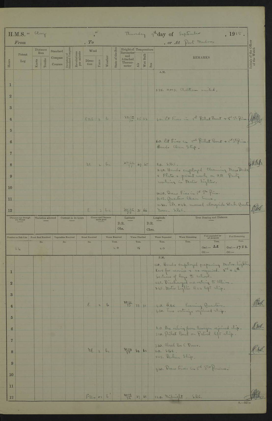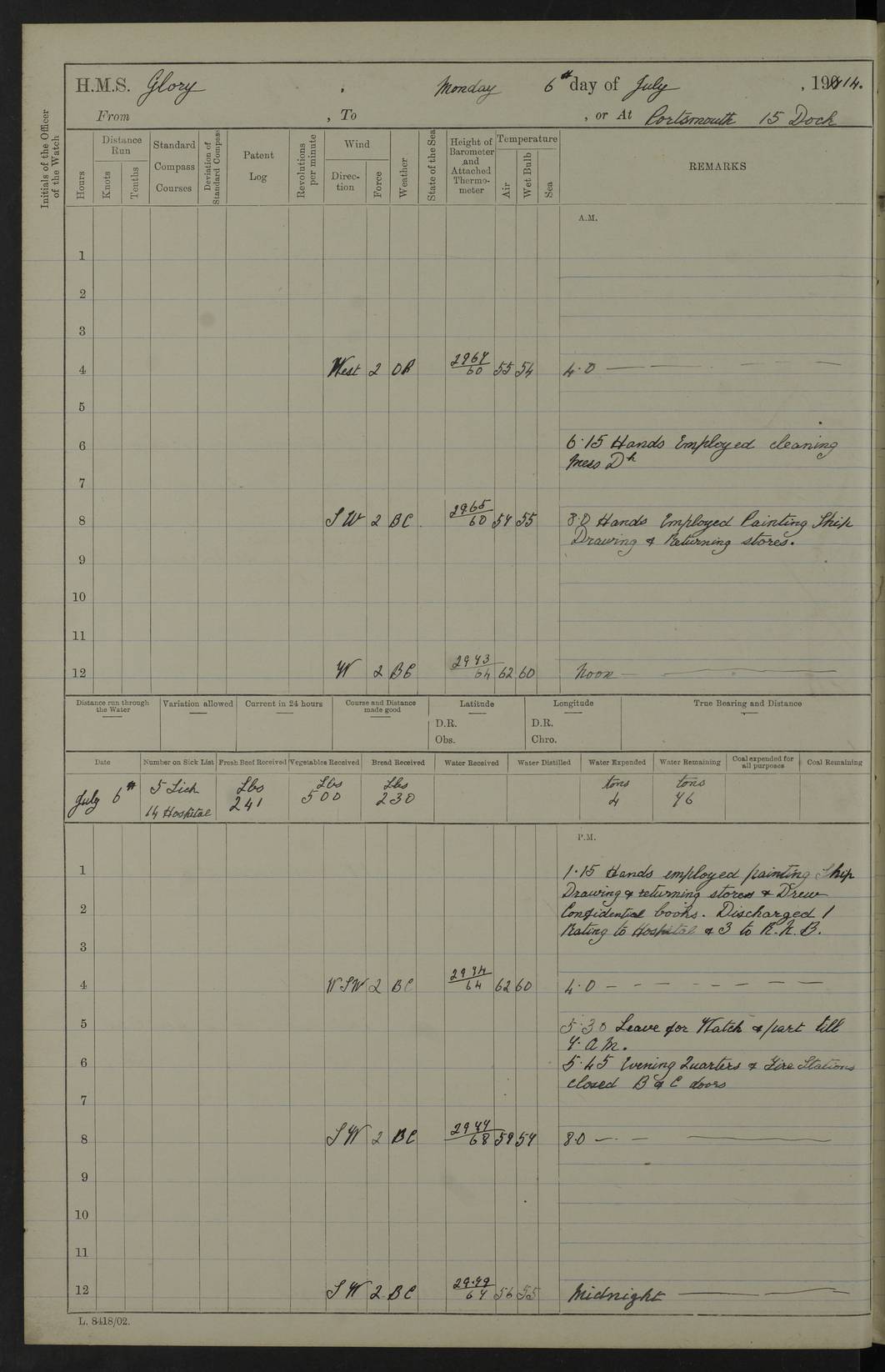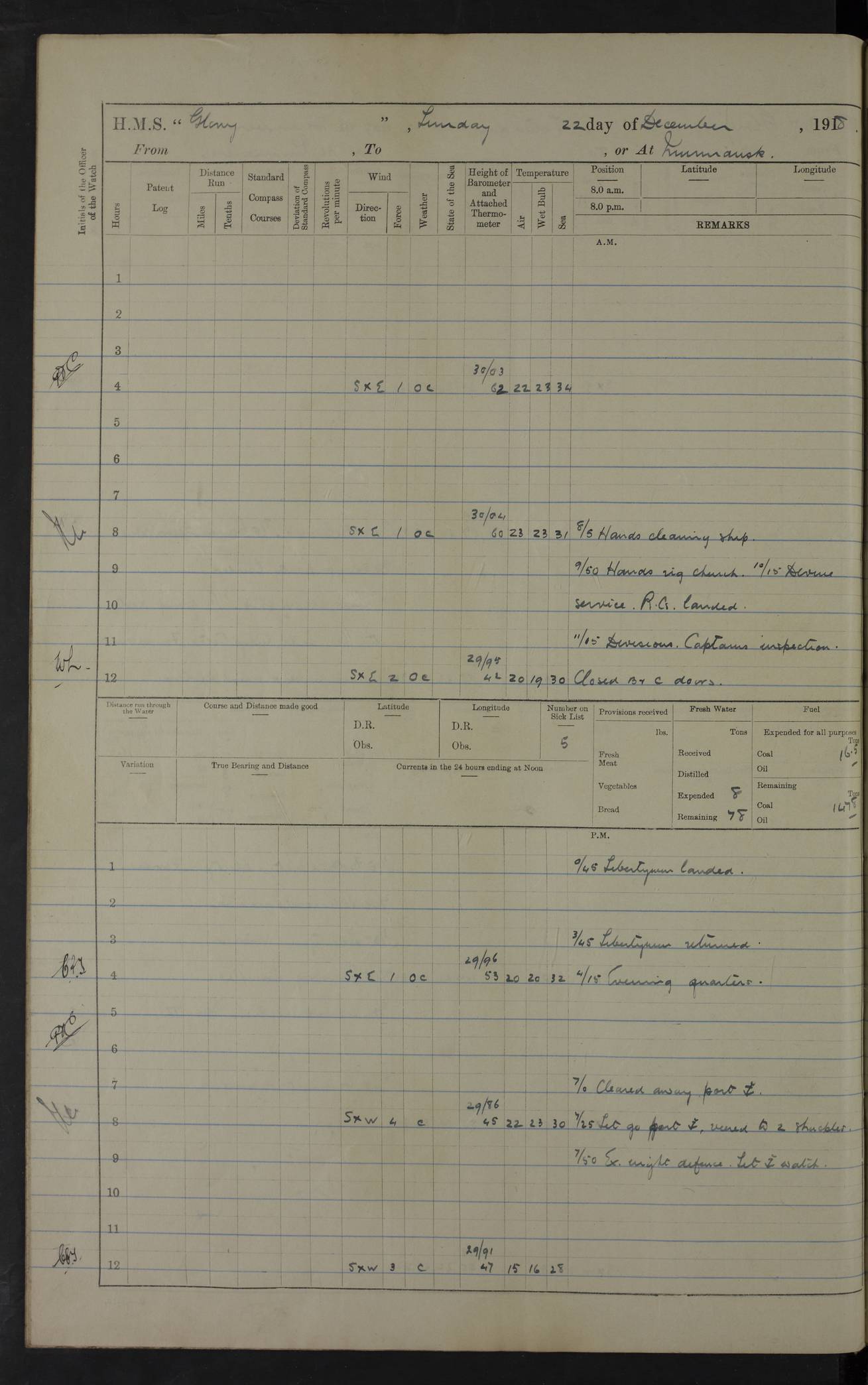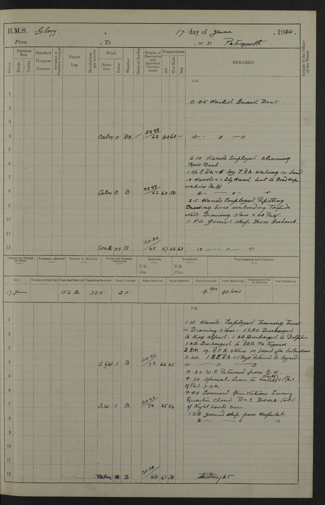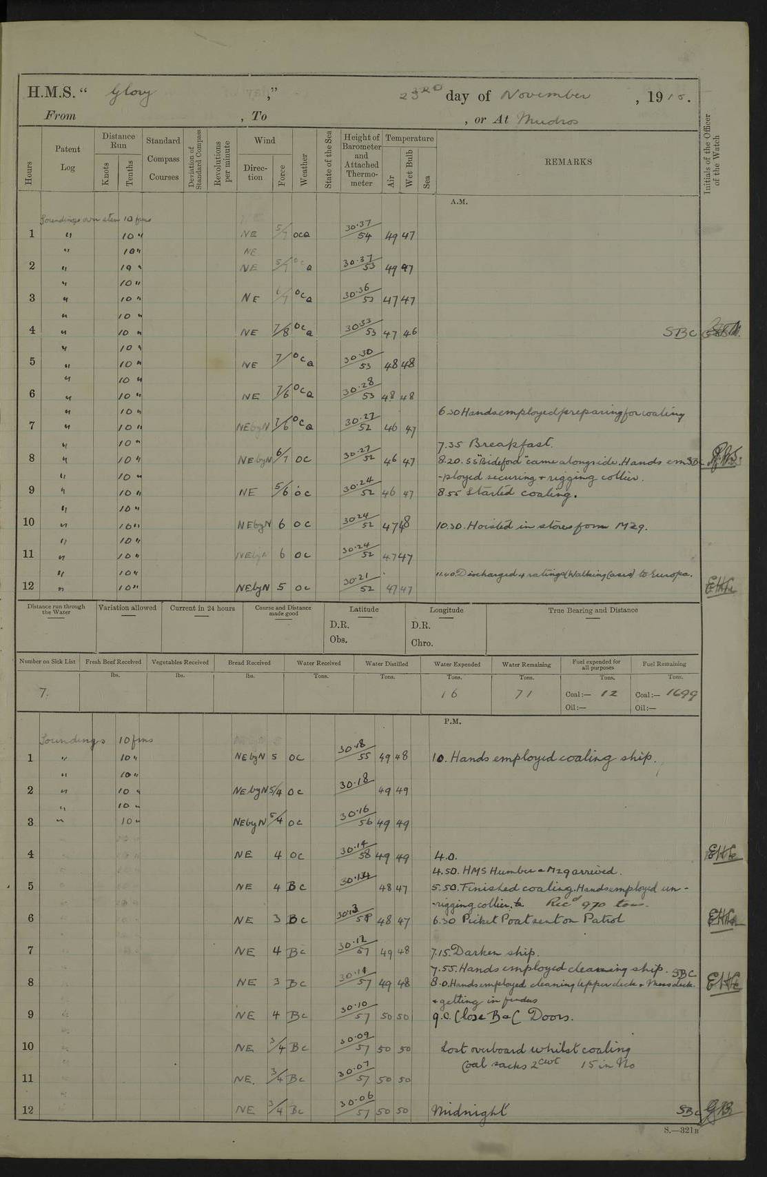 22 June 1915 At sea, Gibraltar to Lemnos Lat 36.1, Long -1.3 4.15am: Sighted land on starboard bow. 10.20am: Stopped port engine for repairs. 11.20am: proceeded with port engine. pm: a/c due to change in deviation. 10.00pm: Cape Tenez Light abeam, 18 miles. 4f73cd61a2fc8ea9030015f6: (https://s3.amazonaws.com:443/oldweather/ADM53-43015/0012_1.jpg) 23 June 1915 At sea, Gibraltar to Lemnos Lat 37.5, Long 4.8 Number on sick list: 4 5.00am: Secured from night defence stations. Placed anti-submarine guns. pm: Life saving appliances served out to men stationed in ? ?at abandon ship. 4f73cd61a2fc8ea9030015f7: (https://s3.amazonaws.com:443/oldweather/ADM53-43015/0013_0.jpg) 24 June 1915 At sea, Gibraltar to Lemnos Lat 37.4, Long 10.8 Position in log clearly bears no resemblance to the location of the ship. Position above is approximate and is based sighting of Zembra Island at 11.55am. 5.00am: Dispersed from night defence stations. Manned anti-submarine guns. am: Sighted two French torpedo boats. am: Torpedo boats passed to ~ No 362, 363. am: Sighted land on starboard beam. 11.55am: Zembra Island abeam, 25 miles. 2.00pm: Sighted Pantellaria S34ºE. 4.45pm: Pantellaria Light House abeam 12 miles. 4f73cd61a2fc8ea9030015f8: (https://s3.amazonaws.com:443/oldweather/ADM53-43015/0013_1.jpg) 25 June 1915 At sea, Gibraltar to Lemnos Lat 35.5, Long 16.7 2.10am: Gozo Light abeam 17 miles. 5.00am: Dispersed from night defence stations. Manned anti-submarine guns. 4f73cd61a2fc8ea9030015f9: (https://s3.amazonaws.com:443/oldweather/ADM53-43015/0014_0.jpg) 26 June 1915 At sea, Gibraltar to Lemnos Lat 35.5, Long 22.6 Number on sick list: 5 5.00am: Dispersed from night defence stations. Manned anti-submarine guns. am: Aired night clothing. am: marines at maxim practice on quarter deck. 2.00pm: Observed land on either bow. 3.00pm: Sighted French patrol destroyer. 4.15pm: Sighted French patrol destroyer. 9.40pm: Milo Peak N63ºW. 10.26pm: Polino Light abeam to port 5.5 miles. 4f73cd62a2fc8ea9030015fa: (https://s3.amazonaws.com:443/oldweather/ADM53-43015/0014_1.jpg) 27 June 1915 At sea and at Lemnos Lat 39.1, Long 24.4 From 0.50 to 3.05am sighting of multiple light houses. 3.50am: a/c to N39ºW and commenced to zig-zag. 5.00am: Dispersed from night defence stations and placed anti-submarine guns and look-outs. am: Lost overboard by accident Hazlewood fender, pat. 311, one in number. 10.30am: Held Divine Service onboard. pm: Met and signalled HMS Minerva on patrol duty. pm: Courses and speeds as requisite while waiting orders to approach Mudros. 3.00pm: Proceeded. 5.16pm: Increased to 90 revs, commenced to zig-zag. Course as requisite for Mudros. 7.00pm: Entered Mudros Bay. 7.47pm: Stopped. Let go port anchor in ‘M3’. 8.30pm: Darkened ship. pm: Manned one 6” and one 12 pdr. 4f73cd62a2fc8ea9030015fb: (https://s3.amazonaws.com:443/oldweather/ADM53-43015/0015_0.jpg) 28 June 1915 Mudros Bay, Lemnos Lat 39.89, Long 25.24 5,00am: HMS Vengeance entered harbour. HMS Vengeance was a pre-dreadnought of the Canopus class, launched in 1899 at Vickers, Barrow, and sold for scrapping in 1921. Details at http://en.wikipedia.org/wiki/HMS_Vengeance_(1899) . am/pm/: hands preparing for coaling and about ship’s work. pm: Collier Wabana secured alongside. 4f73cd62a2fc8ea9030015fc: (https://s3.amazonaws.com:443/oldweather/ADM53-43015/0015_1.jpg) 29 June 1915 Mudros Bay, Lemnos Lat 39.89, Long 25.24 5.15am: Commenced coaling. 2.00pm: Finished coaling. Collier left. 4f73cd62a2fc8ea9030015fd: (https://s3.amazonaws.com:443/oldweather/ADM53-43015/0016_0.jpg) 30 June 1915 Mudros Bay, Lemnos Lat 39.89, Long 25.24 am: Parties away sanding, and with fire engines onshore. am: Boats away disembarking troops. am: French Flagship Patrie sailed. The Patrie was a French pre-dreadnought, launched at La Seyne shipyard in 1903, and stricken in 1921. Details at http://en.wikipedia.org/wiki/French_battleship_Patrie . 6.30pm: Hands to bathe. 4f73cd63a2fc8ea9030015fe: (https://s3.amazonaws.com:443/oldweather/ADM53-43015/0016_1.jpg) 4f73cd63a2fc8ea9030015ff: (https://s3.amazonaws.com:443/oldweather/ADM53-43015/0017_0.jpg) 4f73cd63a2fc8ea903001600: (https://s3.amazonaws.com:443/oldweather/ADM53-43015/0017_1.jpg) 4f73cd63a2fc8ea903001601: (https://s3.amazonaws.com:443/oldweather/ADM53-43015/0018_0.jpg) 4f73cd64a2fc8ea903001602: (https://s3.amazonaws.com:443/oldweather/ADM53-43015/0018_1.jpg) LOGS FOR JULY 1915 From July to October 1915, HMS Glory spent her time at Port Mudros. Certain activities typically took place daily and are not generally noted in the pages below. These activities include: Lighting fires in the picket boat around 4am and drawing the fires in the late evening; Divisions at around 9–9.30am and Evening Quarters at 4pm; Darken ship at around 8.30pm; Daily ‘cleaning ship’, with variations thereof; SBC (for ‘Signal Books Correct’) at the watch changes. 4f73cd64a2fc8ea903001603: (https://s3.amazonaws.com:443/oldweather/ADM53-43016/0000_0.jpg) 4f73cd64a2fc8ea903001604: (https://s3.amazonaws.com:443/oldweather/ADM53-43016/0000_1.jpg) 4f73cd65a2fc8ea903001605: (https://s3.amazonaws.com:443/oldweather/ADM53-43016/0001_0.jpg) 4f73cd65a2fc8ea903001606: (https://s3.amazonaws.com:443/oldweather/ADM53-43016/0001_1.jpg) 1 July 1915 Port Mudros Lat 39.89, Long 25.24 6.30am: Landed working parties preparing boom defence ships. am: Discharged Acting Commander Rayne to Hector. Hector was a kite balloon ship. No further details readily available. 5.00pm: Tug T.10 made fast astern. 7.15pm: HMS Venerable went out. 7.30pm: HMS Chatham went out. HMS Chatham was a ‘Town’ cruiser and lead ship of her class. She was launched in 1911 at Chatham Dockyard and sold in 1926. Details at http://en.wikipedia.org/wiki/HMS_Chatham_(1911) . 4f73cd65a2fc8ea903001607: (https://s3.amazonaws.com:443/oldweather/ADM53-43016/0002_0.jpg) 2 July 1915 Port Mudros Lat 39.89, Long 25.24 5.35am: Landed working parties preparing boom defence ships. am/pm: Boom defence par