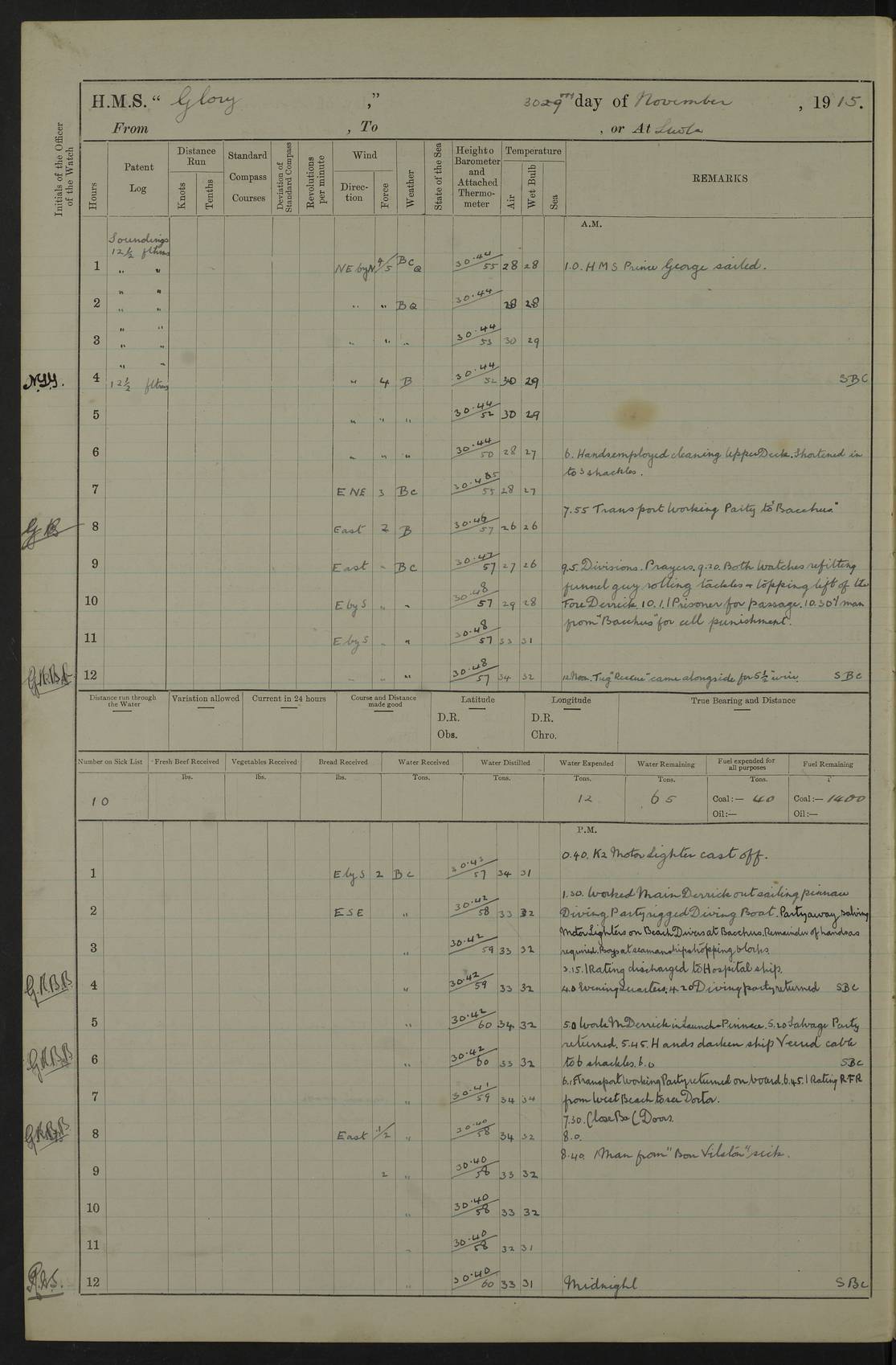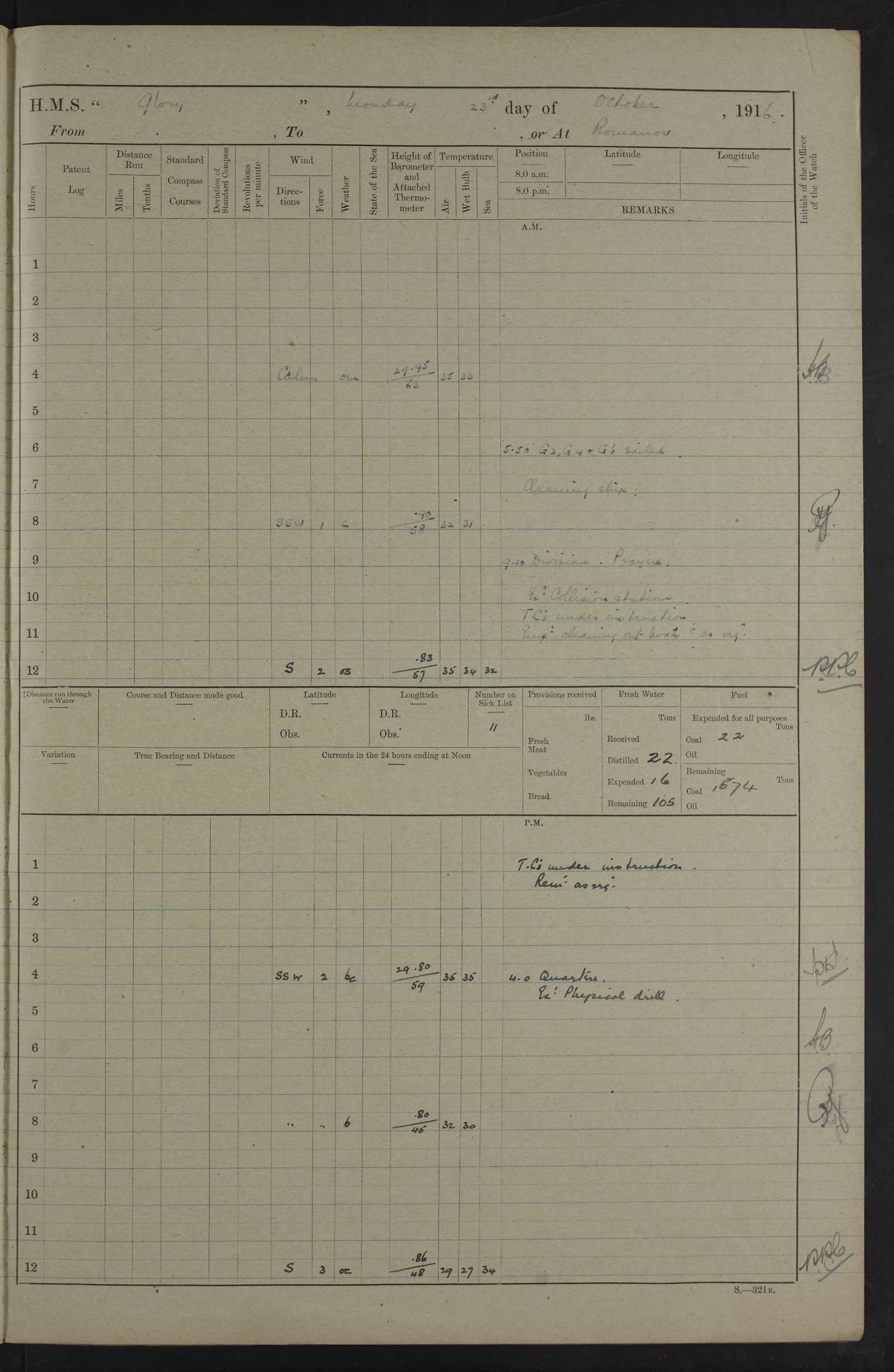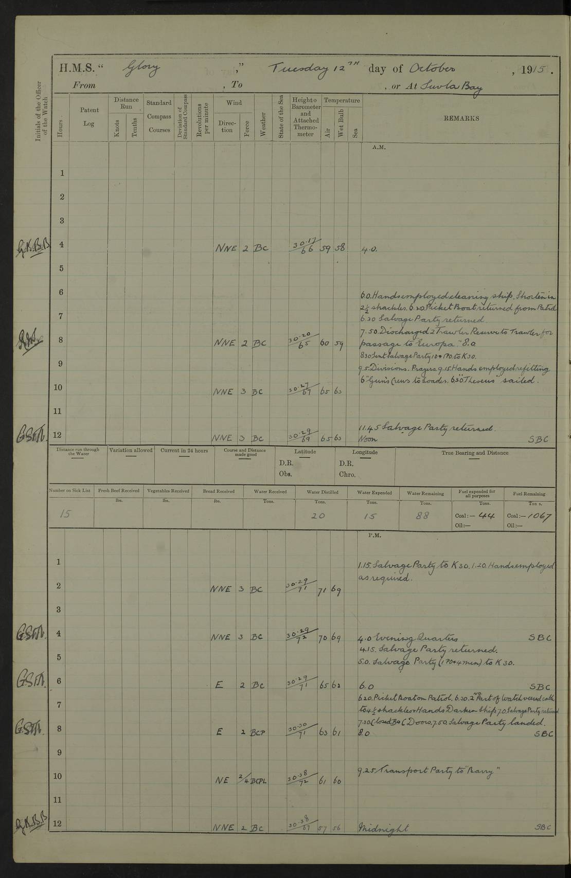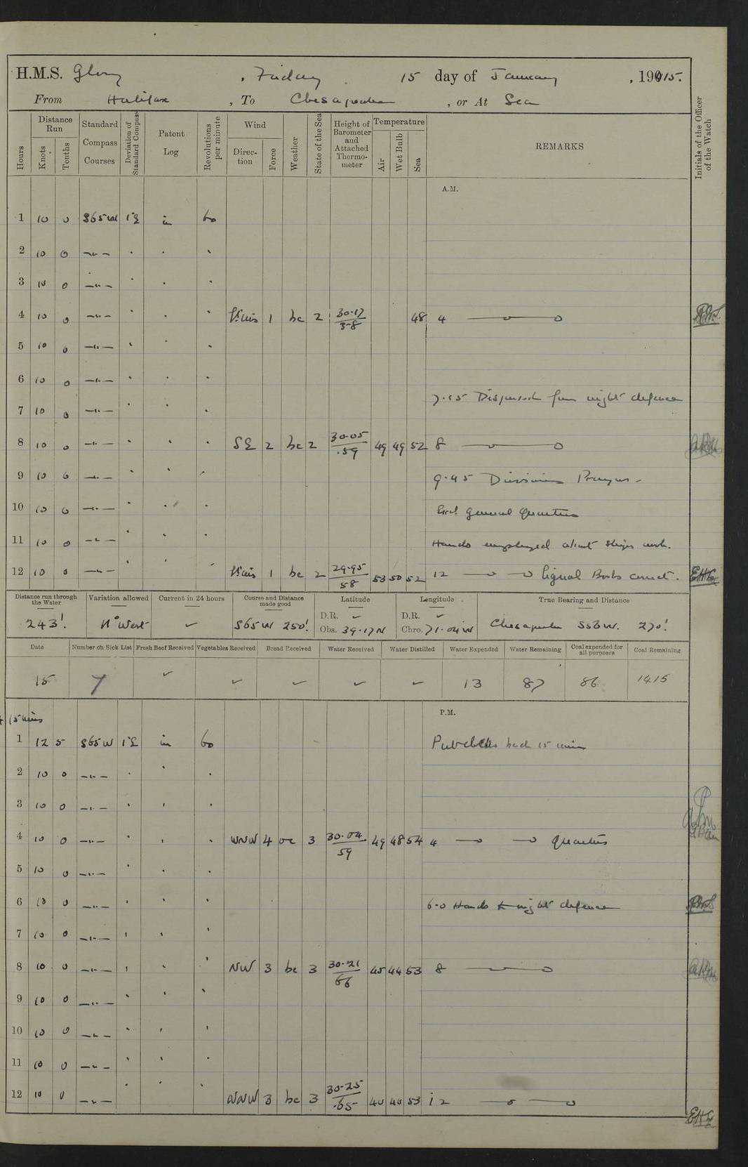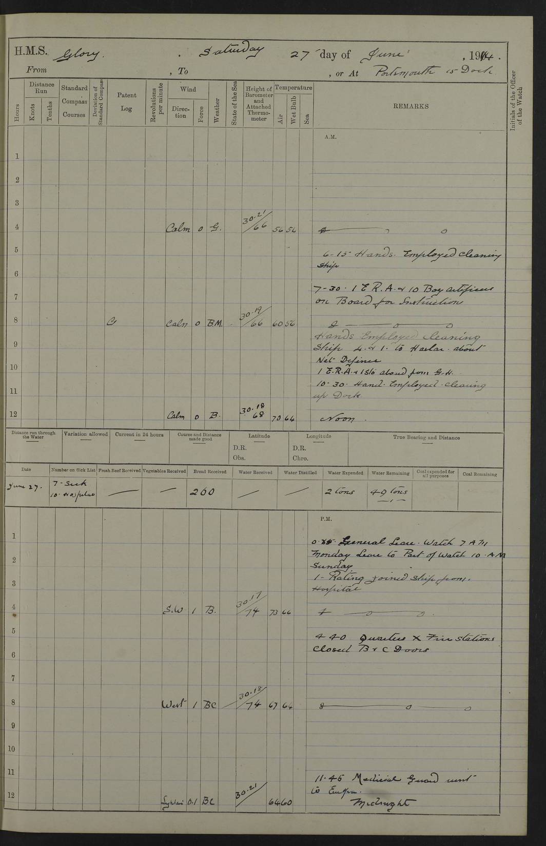 22 June 1915 At sea, Gibraltar to Lemnos Lat 36.1, Long -1.3 4.15am: Sighted land on starboard bow. 10.20am: Stopped port engine for repairs. 11.20am: proceeded with port engine. pm: a/c due to change in deviation. 10.00pm: Cape Tenez Light abeam, 18 miles. 4f73cd61a2fc8ea9030015f6: (https://s3.amazonaws.com:443/oldweather/ADM53-43015/0012_1.jpg) 23 June 1915 At sea, Gibraltar to Lemnos Lat 37.5, Long 4.8 Number on sick list: 4 5.00am: Secured from night defence stations. Placed anti-submarine guns. pm: Life saving appliances served out to men stationed in ? ?at abandon ship. 4f73cd61a2fc8ea9030015f7: (https://s3.amazonaws.com:443/oldweather/ADM53-43015/0013_0.jpg) 24 June 1915 At sea, Gibraltar to Lemnos Lat 37.4, Long 10.8 Position in log clearly bears no resemblance to the location of the ship. Position above is approximate and is based sighting of Zembra Island at 11.55am. 5.00am: Dispersed from night defence stations. Manned anti-submarine guns. am: Sighted two French torpedo boats. am: Torpedo boats passed to ~ No 362, 363. am: Sighted land on starboard beam. 11.55am: Zembra Island abeam, 25 miles. 2.00pm: Sighted Pantellaria S34ºE. 4.45pm: Pantellaria Light House abeam 12 miles. 4f73cd61a2fc8ea9030015f8: (https://s3.amazonaws.com:443/oldweather/ADM53-43015/0013_1.jpg) 25 June 1915 At sea, Gibraltar to Lemnos Lat 35.5, Long 16.7 2.10am: Gozo Light abeam 17 miles. 5.00am: Dispersed from night defence stations. Manned anti-submarine guns. 4f73cd61a2fc8ea9030015f9: (https://s3.amazonaws.com:443/oldweather/ADM53-43015/0014_0.jpg) 26 June 1915 At sea, Gibraltar to Lemnos Lat 35.5, Long 22.6 Number on sick list: 5 5.00am: Dispersed from night defence stations. Manned anti-submarine guns. am: Aired night clothing. am: marines at maxim practice on quarter deck. 2.00pm: Observed land on either bow. 3.00pm: Sighted French patrol destroyer. 4.15pm: Sighted French patrol destroyer. 9.40pm: Milo Peak N63ºW. 10.26pm: Polino Light abeam to port 5.5 miles. 4f73cd62a2fc8ea9030015fa: (https://s3.amazonaws.com:443/oldweather/ADM53-43015/0014_1.jpg) 27 June 1915 At sea and at Lemnos Lat 39.1, Long 24.4 From 0.50 to 3.05am sighting of multiple light houses. 3.50am: a/c to N39ºW and commenced to zig-zag. 5.00am: Dispersed from night defence stations and placed anti-submarine guns and look-outs. am: Lost overboard by accident Hazlewood fender, pat. 311, one in number. 10.30am: Held Divine Service onboard. pm: Met and signalled HMS Minerva on patrol duty. pm: Courses and speeds as requisite while waiting orders to approach Mudros. 3.00pm: Proceeded. 5.16pm: Increased to 90 revs, commenced to zig-zag. Course as requisite for Mudros. 7.00pm: Entered Mudros Bay. 7.47pm: Stopped. Let go port anchor in ‘M3’. 8.30pm: Darkened ship. pm: Manned one 6” and one 12 pdr. 4f73cd62a2fc8ea9030015fb: (https://s3.amazonaws.com:443/oldweather/ADM53-43015/0015_0.jpg) 28 June 1915 Mudros Bay, Lemnos Lat 39.89, Long 25.24 5,00am: HMS Vengeance entered harbour. HMS Vengeance was a pre-dreadnought of the Canopus class, launched in 1899 at Vickers, Barrow, and sold for scrapping in 1921. Details at http://en.wikipedia.org/wiki/HMS_Vengeance_(1899) . am/pm/: hands preparing for coaling and about ship’s work. pm: Collier Wabana secured alongside. 4f73cd62a2fc8ea9030015fc: (https://s3.amazonaws.com:443/oldweather/ADM53-43015/0015_1.jpg) 29 June 1915 Mudros Bay, Lemnos Lat 39.89, Long 25.24 5.15am: Commenced coaling. 2.00pm: Finished coaling. Collier left. 4f73cd62a2fc8ea9030015fd: (https://s3.amazonaws.com:443/oldweather/ADM53-43015/0016_0.jpg) 30 June 1915 Mudros Bay, Lemnos Lat 39.89, Long 25.24 am: Parties away sanding, and with fire engines onshore. am: Boats away disembarking troops. am: French Flagship Patrie sailed. The Patrie was a French pre-dreadnought, launched at La Seyne shipyard in 1903, and stricken in 1921. Details at http://en.wikipedia.org/wiki/French_battleship_Patrie . 6.30pm: Hands to bathe. 4f73cd63a2fc8ea9030015fe: (https://s3.amazonaws.com:443/oldweather/ADM53-43015/0016_1.jpg) 4f73cd63a2fc8ea9030015ff: (https://s3.amazonaws.com:443/oldweather/ADM53-43015/0017_0.jpg) 4f73cd63a2fc8ea903001600: (https://s3.amazonaws.com:443/oldweather/ADM53-43015/0017_1.jpg) 4f73cd63a2fc8ea903001601: (https://s3.amazonaws.com:443/oldweather/ADM53-43015/0018_0.jpg) 4f73cd64a2fc8ea903001602: (https://s3.amazonaws.com:443/oldweather/ADM53-43015/0018_1.jpg) LOGS FOR JULY 1915 From July to October 1915, HMS Glory spent her time at Port Mudros. Certain activities typically took place daily and are not generally noted in the pages below. These activities include: Lighting fires in the picket boat around 4am and drawing the fires in the late evening; Divisions at around 9–9.30am and Evening Quarters at 4pm; Darken ship at around 8.30pm; Daily ‘cleaning ship’, with variations thereof; SBC (for ‘Signal Books Correct’) at the watch changes. 4f73cd64a2fc8ea903001603: (https://s3.amazonaws.com:443/oldweather/ADM53-43016/0000_0.jpg) 4f73cd64a2fc8ea903001604: (https://s3.amazonaws.com:443/oldweather/ADM53-43016/0000_1.jpg) 4f73cd65a2fc8ea903001605: (https://s3.amazonaws.com:443/oldweather/ADM53-43016/0001_0.jpg) 4f73cd65a2fc8ea903001606: (https://s3.amazonaws.com:443/oldweather/ADM53-43016/0001_1.jpg) 1 July 1915 Port Mudros Lat 39.89, Long 25.24 6.30am: Landed working parties preparing boom defence ships. am: Discharged Acting Commander Rayne to Hector. Hector was a kite balloon ship. No further details readily available. 5.00pm: Tug T.10 made fast astern. 7.15pm: HMS Venerable went out. 7.30pm: HMS Chatham went out. HMS Chatham was a ‘Town’ cruiser and lead ship of her class. She was launched in 1911 at Chatham Dockyard and sold in 1926. Details at http://en.wikipedia.org/wiki/HMS_Chatham_(1911) . 4f73cd65a2fc8ea903001607: (https://s3.amazonaws.com:443/oldweather/ADM53-43016/0002_0.jpg) 2 July 1915 Port Mudros Lat 39.89, Long 25.24 5.35am: Landed working parties preparing boom defence ships. am/pm: Boom defence par