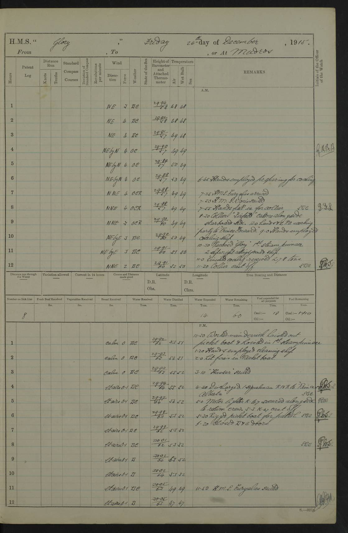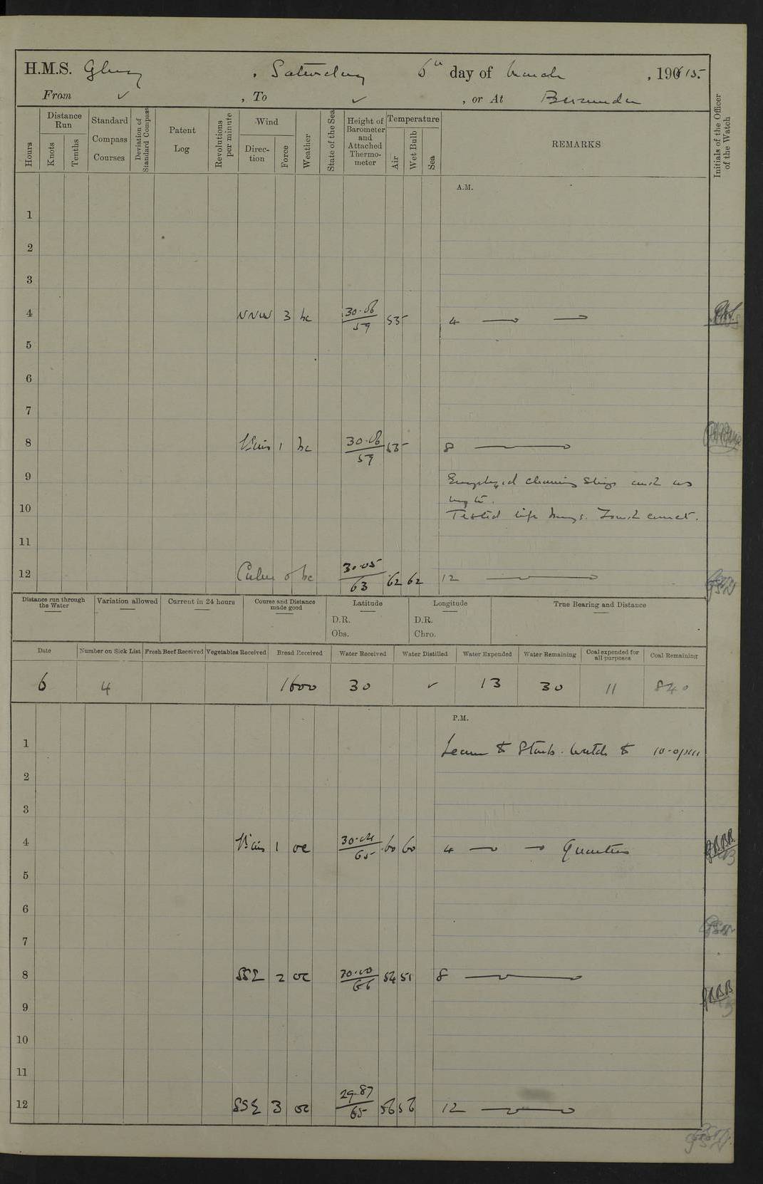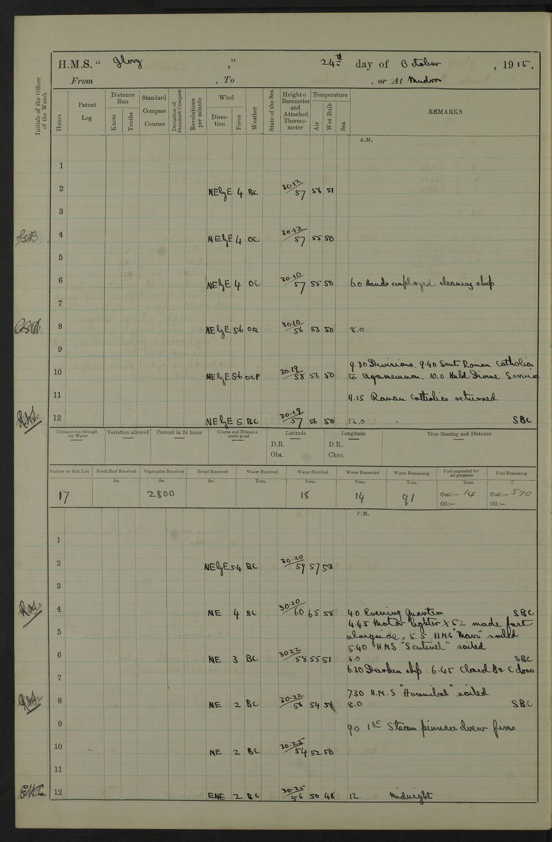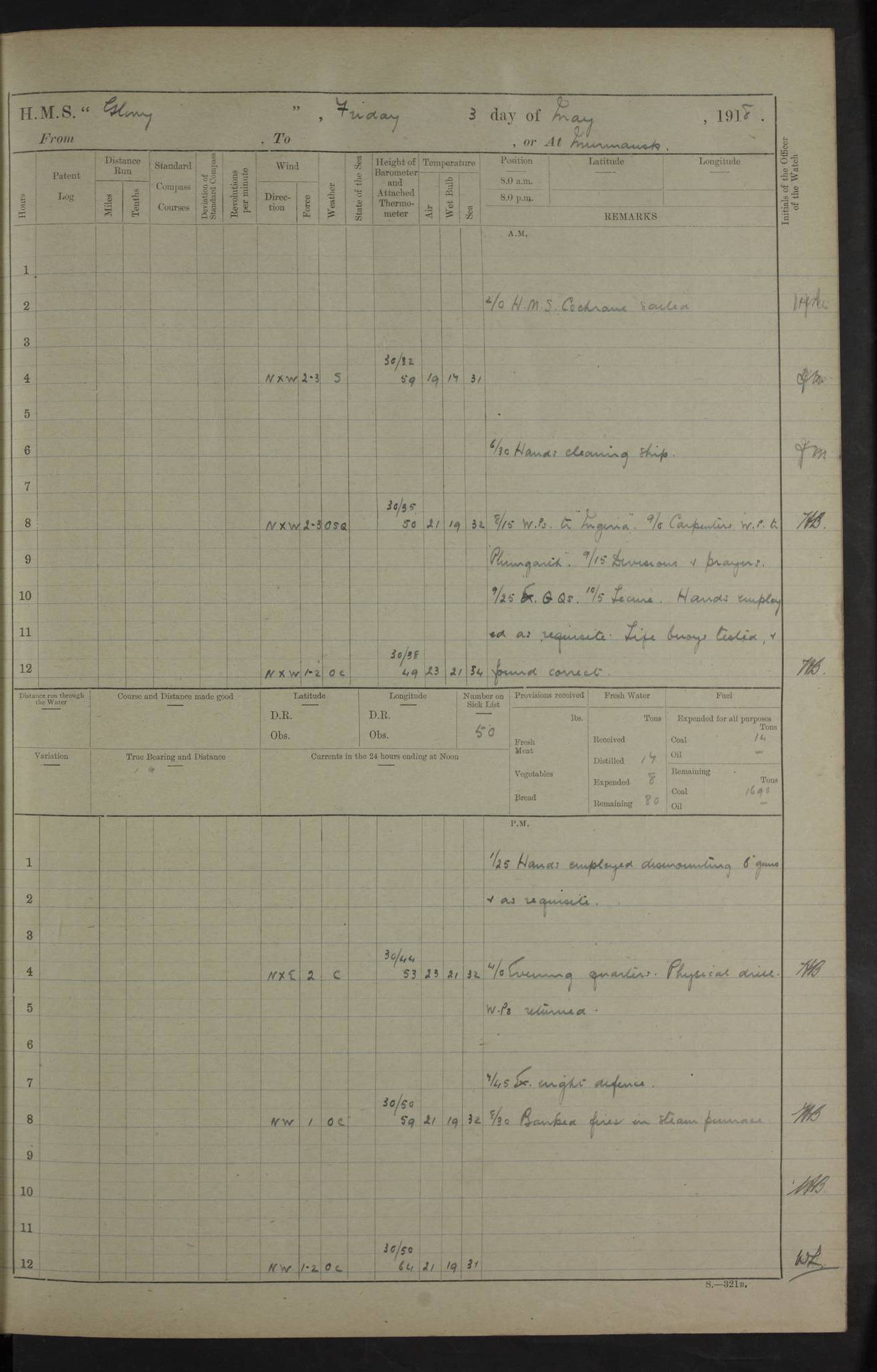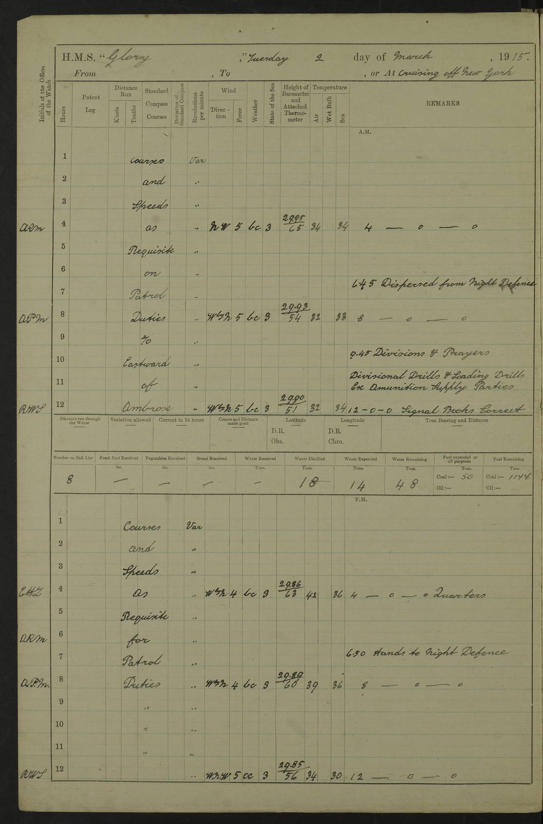 22 June 1915 At sea, Gibraltar to Lemnos Lat 36.1, Long -1.3 4.15am: Sighted land on starboard bow. 10.20am: Stopped port engine for repairs. 11.20am: proceeded with port engine. pm: a/c due to change in deviation. 10.00pm: Cape Tenez Light abeam, 18 miles. 4f73cd61a2fc8ea9030015f6: (https://s3.amazonaws.com:443/oldweather/ADM53-43015/0012_1.jpg) 23 June 1915 At sea, Gibraltar to Lemnos Lat 37.5, Long 4.8 Number on sick list: 4 5.00am: Secured from night defence stations. Placed anti-submarine guns. pm: Life saving appliances served out to men stationed in ? ?at abandon ship. 4f73cd61a2fc8ea9030015f7: (https://s3.amazonaws.com:443/oldweather/ADM53-43015/0013_0.jpg) 24 June 1915 At sea, Gibraltar to Lemnos Lat 37.4, Long 10.8 Position in log clearly bears no resemblance to the location of the ship. Position above is approximate and is based sighting of Zembra Island at 11.55am. 5.00am: Dispersed from night defence stations. Manned anti-submarine guns. am: Sighted two French torpedo boats. am: Torpedo boats passed to ~ No 362, 363. am: Sighted land on starboard beam. 11.55am: Zembra Island abeam, 25 miles. 2.00pm: Sighted Pantellaria S34ºE. 4.45pm: Pantellaria Light House abeam 12 miles. 4f73cd61a2fc8ea9030015f8: (https://s3.amazonaws.com:443/oldweather/ADM53-43015/0013_1.jpg) 25 June 1915 At sea, Gibraltar to Lemnos Lat 35.5, Long 16.7 2.10am: Gozo Light abeam 17 miles. 5.00am: Dispersed from night defence stations. Manned anti-submarine guns. 4f73cd61a2fc8ea9030015f9: (https://s3.amazonaws.com:443/oldweather/ADM53-43015/0014_0.jpg) 26 June 1915 At sea, Gibraltar to Lemnos Lat 35.5, Long 22.6 Number on sick list: 5 5.00am: Dispersed from night defence stations. Manned anti-submarine guns. am: Aired night clothing. am: marines at maxim practice on quarter deck. 2.00pm: Observed land on either bow. 3.00pm: Sighted French patrol destroyer. 4.15pm: Sighted French patrol destroyer. 9.40pm: Milo Peak N63ºW. 10.26pm: Polino Light abeam to port 5.5 miles. 4f73cd62a2fc8ea9030015fa: (https://s3.amazonaws.com:443/oldweather/ADM53-43015/0014_1.jpg) 27 June 1915 At sea and at Lemnos Lat 39.1, Long 24.4 From 0.50 to 3.05am sighting of multiple light houses. 3.50am: a/c to N39ºW and commenced to zig-zag. 5.00am: Dispersed from night defence stations and placed anti-submarine guns and look-outs. am: Lost overboard by accident Hazlewood fender, pat. 311, one in number. 10.30am: Held Divine Service onboard. pm: Met and signalled HMS Minerva on patrol duty. pm: Courses and speeds as requisite while waiting orders to approach Mudros. 3.00pm: Proceeded. 5.16pm: Increased to 90 revs, commenced to zig-zag. Course as requisite for Mudros. 7.00pm: Entered Mudros Bay. 7.47pm: Stopped. Let go port anchor in ‘M3’. 8.30pm: Darkened ship. pm: Manned one 6” and one 12 pdr. 4f73cd62a2fc8ea9030015fb: (https://s3.amazonaws.com:443/oldweather/ADM53-43015/0015_0.jpg) 28 June 1915 Mudros Bay, Lemnos Lat 39.89, Long 25.24 5,00am: HMS Vengeance entered harbour. HMS Vengeance was a pre-dreadnought of the Canopus class, launched in 1899 at Vickers, Barrow, and sold for scrapping in 1921. Details at http://en.wikipedia.org/wiki/HMS_Vengeance_(1899) . am/pm/: hands preparing for coaling and about ship’s work. pm: Collier Wabana secured alongside. 4f73cd62a2fc8ea9030015fc: (https://s3.amazonaws.com:443/oldweather/ADM53-43015/0015_1.jpg) 29 June 1915 Mudros Bay, Lemnos Lat 39.89, Long 25.24 5.15am: Commenced coaling. 2.00pm: Finished coaling. Collier left. 4f73cd62a2fc8ea9030015fd: (https://s3.amazonaws.com:443/oldweather/ADM53-43015/0016_0.jpg) 30 June 1915 Mudros Bay, Lemnos Lat 39.89, Long 25.24 am: Parties away sanding, and with fire engines onshore. am: Boats away disembarking troops. am: French Flagship Patrie sailed. The Patrie was a French pre-dreadnought, launched at La Seyne shipyard in 1903, and stricken in 1921. Details at http://en.wikipedia.org/wiki/French_battleship_Patrie . 6.30pm: Hands to bathe. 4f73cd63a2fc8ea9030015fe: (https://s3.amazonaws.com:443/oldweather/ADM53-43015/0016_1.jpg) 4f73cd63a2fc8ea9030015ff: (https://s3.amazonaws.com:443/oldweather/ADM53-43015/0017_0.jpg) 4f73cd63a2fc8ea903001600: (https://s3.amazonaws.com:443/oldweather/ADM53-43015/0017_1.jpg) 4f73cd63a2fc8ea903001601: (https://s3.amazonaws.com:443/oldweather/ADM53-43015/0018_0.jpg) 4f73cd64a2fc8ea903001602: (https://s3.amazonaws.com:443/oldweather/ADM53-43015/0018_1.jpg) LOGS FOR JULY 1915 From July to October 1915, HMS Glory spent her time at Port Mudros. Certain activities typically took place daily and are not generally noted in the pages below. These activities include: Lighting fires in the picket boat around 4am and drawing the fires in the late evening; Divisions at around 9–9.30am and Evening Quarters at 4pm; Darken ship at around 8.30pm; Daily ‘cleaning ship’, with variations thereof; SBC (for ‘Signal Books Correct’) at the watch changes. 4f73cd64a2fc8ea903001603: (https://s3.amazonaws.com:443/oldweather/ADM53-43016/0000_0.jpg) 4f73cd64a2fc8ea903001604: (https://s3.amazonaws.com:443/oldweather/ADM53-43016/0000_1.jpg) 4f73cd65a2fc8ea903001605: (https://s3.amazonaws.com:443/oldweather/ADM53-43016/0001_0.jpg) 4f73cd65a2fc8ea903001606: (https://s3.amazonaws.com:443/oldweather/ADM53-43016/0001_1.jpg) 1 July 1915 Port Mudros Lat 39.89, Long 25.24 6.30am: Landed working parties preparing boom defence ships. am: Discharged Acting Commander Rayne to Hector. Hector was a kite balloon ship. No further details readily available. 5.00pm: Tug T.10 made fast astern. 7.15pm: HMS Venerable went out. 7.30pm: HMS Chatham went out. HMS Chatham was a ‘Town’ cruiser and lead ship of her class. She was launched in 1911 at Chatham Dockyard and sold in 1926. Details at http://en.wikipedia.org/wiki/HMS_Chatham_(1911) . 4f73cd65a2fc8ea903001607: (https://s3.amazonaws.com:443/oldweather/ADM53-43016/0002_0.jpg) 2 July 1915 Port Mudros Lat 39.89, Long 25.24 5.35am: Landed working parties preparing boom defence ships. am/pm: Boom defence par