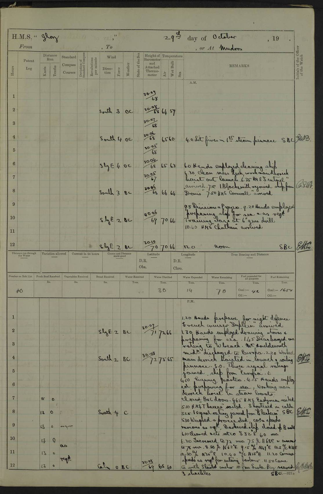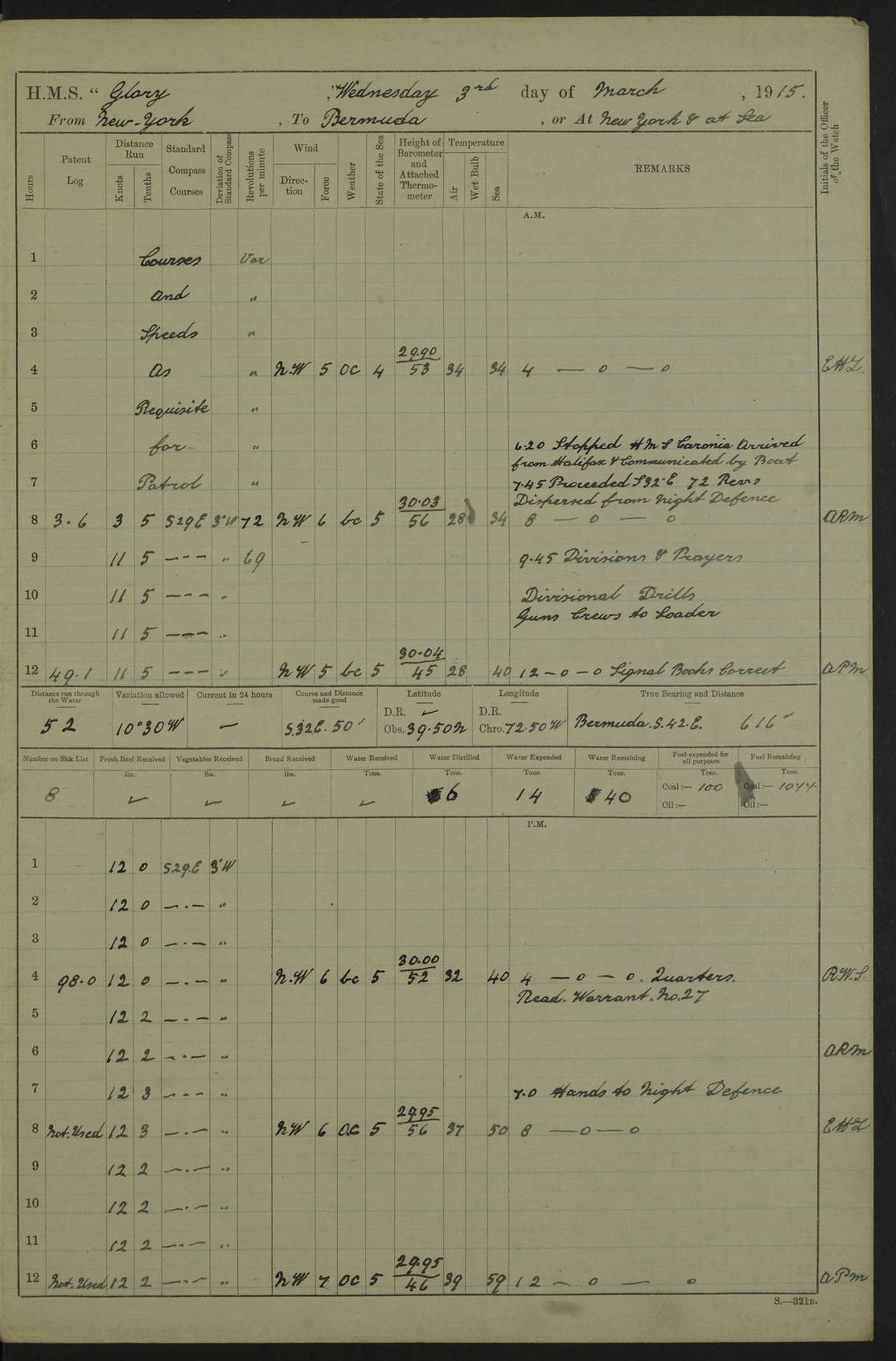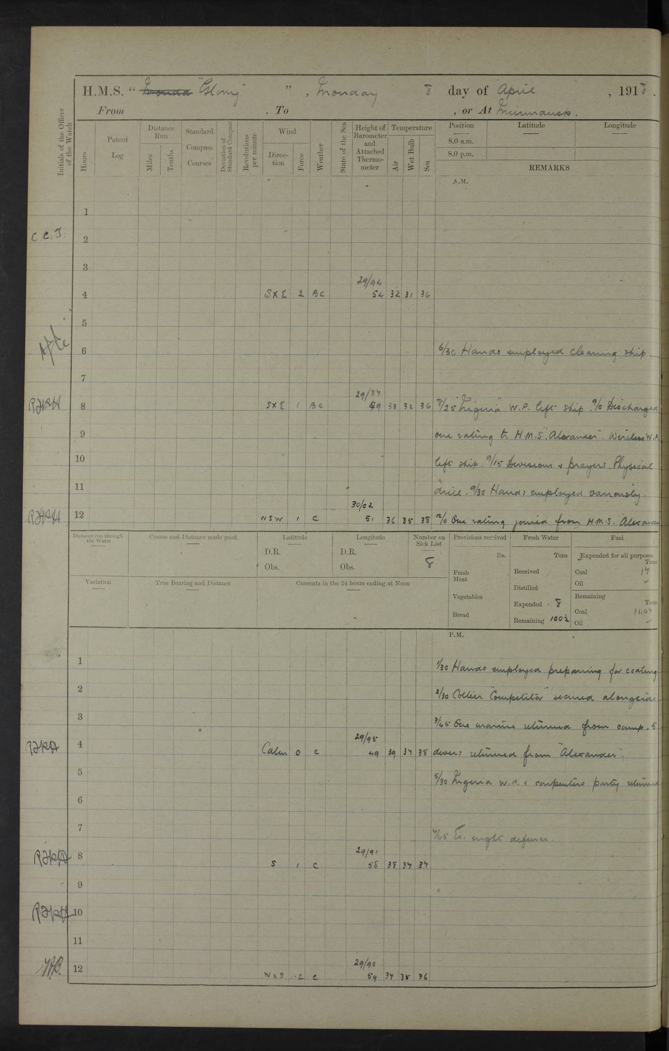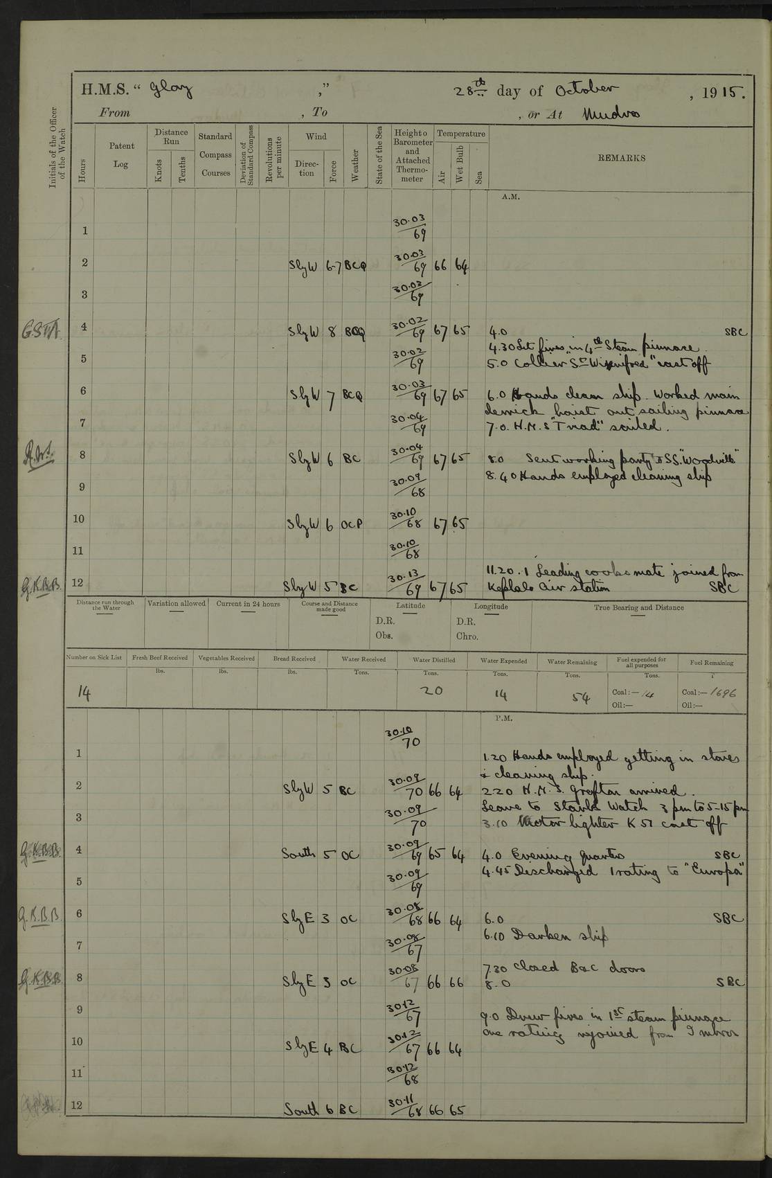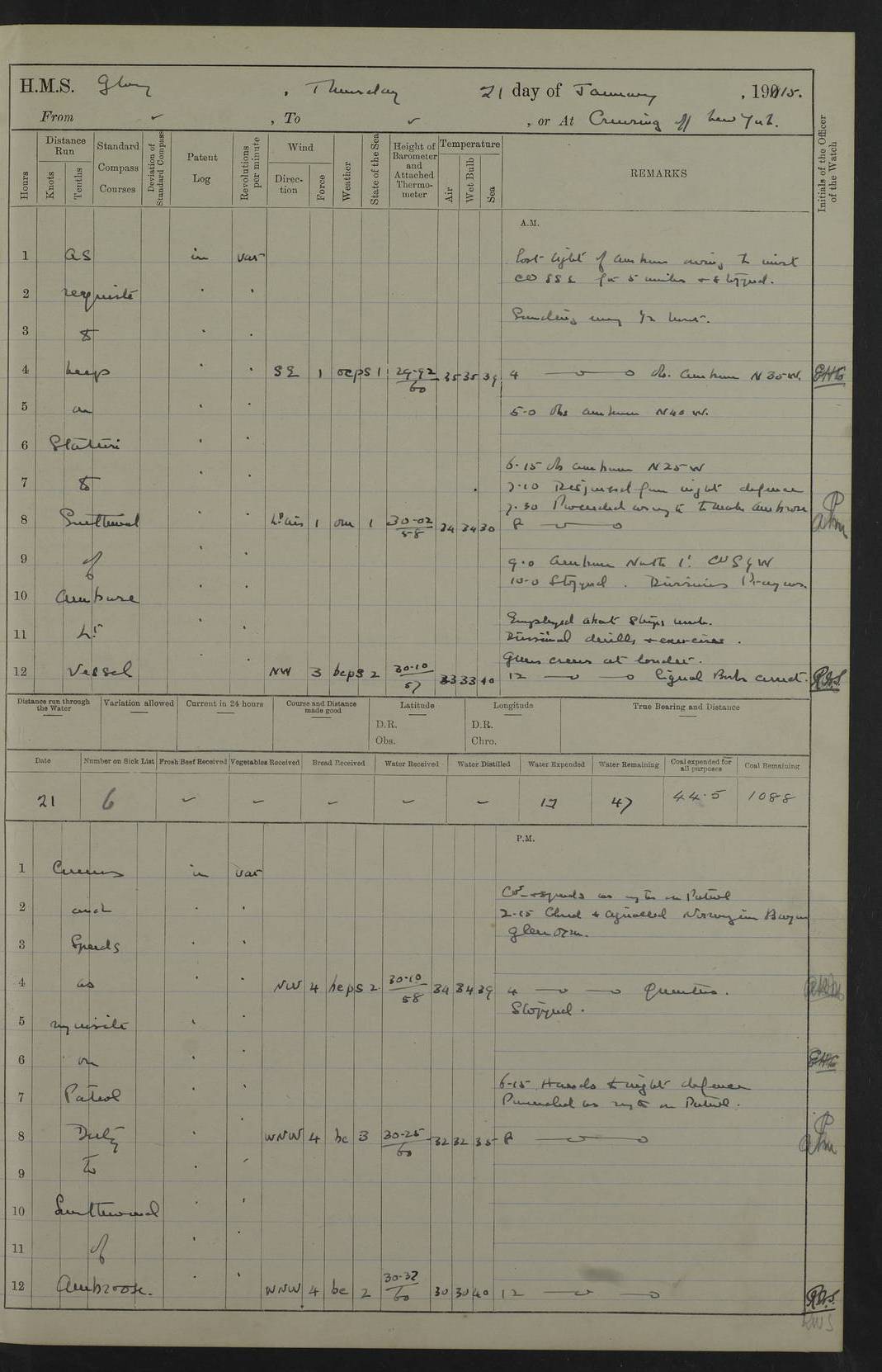 22 June 1915 At sea, Gibraltar to Lemnos Lat 36.1, Long -1.3 4.15am: Sighted land on starboard bow. 10.20am: Stopped port engine for repairs. 11.20am: proceeded with port engine. pm: a/c due to change in deviation. 10.00pm: Cape Tenez Light abeam, 18 miles. 4f73cd61a2fc8ea9030015f6: (https://s3.amazonaws.com:443/oldweather/ADM53-43015/0012_1.jpg) 23 June 1915 At sea, Gibraltar to Lemnos Lat 37.5, Long 4.8 Number on sick list: 4 5.00am: Secured from night defence stations. Placed anti-submarine guns. pm: Life saving appliances served out to men stationed in ? ?at abandon ship. 4f73cd61a2fc8ea9030015f7: (https://s3.amazonaws.com:443/oldweather/ADM53-43015/0013_0.jpg) 24 June 1915 At sea, Gibraltar to Lemnos Lat 37.4, Long 10.8 Position in log clearly bears no resemblance to the location of the ship. Position above is approximate and is based sighting of Zembra Island at 11.55am. 5.00am: Dispersed from night defence stations. Manned anti-submarine guns. am: Sighted two French torpedo boats. am: Torpedo boats passed to ~ No 362, 363. am: Sighted land on starboard beam. 11.55am: Zembra Island abeam, 25 miles. 2.00pm: Sighted Pantellaria S34ºE. 4.45pm: Pantellaria Light House abeam 12 miles. 4f73cd61a2fc8ea9030015f8: (https://s3.amazonaws.com:443/oldweather/ADM53-43015/0013_1.jpg) 25 June 1915 At sea, Gibraltar to Lemnos Lat 35.5, Long 16.7 2.10am: Gozo Light abeam 17 miles. 5.00am: Dispersed from night defence stations. Manned anti-submarine guns. 4f73cd61a2fc8ea9030015f9: (https://s3.amazonaws.com:443/oldweather/ADM53-43015/0014_0.jpg) 26 June 1915 At sea, Gibraltar to Lemnos Lat 35.5, Long 22.6 Number on sick list: 5 5.00am: Dispersed from night defence stations. Manned anti-submarine guns. am: Aired night clothing. am: marines at maxim practice on quarter deck. 2.00pm: Observed land on either bow. 3.00pm: Sighted French patrol destroyer. 4.15pm: Sighted French patrol destroyer. 9.40pm: Milo Peak N63ºW. 10.26pm: Polino Light abeam to port 5.5 miles. 4f73cd62a2fc8ea9030015fa: (https://s3.amazonaws.com:443/oldweather/ADM53-43015/0014_1.jpg) 27 June 1915 At sea and at Lemnos Lat 39.1, Long 24.4 From 0.50 to 3.05am sighting of multiple light houses. 3.50am: a/c to N39ºW and commenced to zig-zag. 5.00am: Dispersed from night defence stations and placed anti-submarine guns and look-outs. am: Lost overboard by accident Hazlewood fender, pat. 311, one in number. 10.30am: Held Divine Service onboard. pm: Met and signalled HMS Minerva on patrol duty. pm: Courses and speeds as requisite while waiting orders to approach Mudros. 3.00pm: Proceeded. 5.16pm: Increased to 90 revs, commenced to zig-zag. Course as requisite for Mudros. 7.00pm: Entered Mudros Bay. 7.47pm: Stopped. Let go port anchor in ‘M3’. 8.30pm: Darkened ship. pm: Manned one 6” and one 12 pdr. 4f73cd62a2fc8ea9030015fb: (https://s3.amazonaws.com:443/oldweather/ADM53-43015/0015_0.jpg) 28 June 1915 Mudros Bay, Lemnos Lat 39.89, Long 25.24 5,00am: HMS Vengeance entered harbour. HMS Vengeance was a pre-dreadnought of the Canopus class, launched in 1899 at Vickers, Barrow, and sold for scrapping in 1921. Details at http://en.wikipedia.org/wiki/HMS_Vengeance_(1899) . am/pm/: hands preparing for coaling and about ship’s work. pm: Collier Wabana secured alongside. 4f73cd62a2fc8ea9030015fc: (https://s3.amazonaws.com:443/oldweather/ADM53-43015/0015_1.jpg) 29 June 1915 Mudros Bay, Lemnos Lat 39.89, Long 25.24 5.15am: Commenced coaling. 2.00pm: Finished coaling. Collier left. 4f73cd62a2fc8ea9030015fd: (https://s3.amazonaws.com:443/oldweather/ADM53-43015/0016_0.jpg) 30 June 1915 Mudros Bay, Lemnos Lat 39.89, Long 25.24 am: Parties away sanding, and with fire engines onshore. am: Boats away disembarking troops. am: French Flagship Patrie sailed. The Patrie was a French pre-dreadnought, launched at La Seyne shipyard in 1903, and stricken in 1921. Details at http://en.wikipedia.org/wiki/French_battleship_Patrie . 6.30pm: Hands to bathe. 4f73cd63a2fc8ea9030015fe: (https://s3.amazonaws.com:443/oldweather/ADM53-43015/0016_1.jpg) 4f73cd63a2fc8ea9030015ff: (https://s3.amazonaws.com:443/oldweather/ADM53-43015/0017_0.jpg) 4f73cd63a2fc8ea903001600: (https://s3.amazonaws.com:443/oldweather/ADM53-43015/0017_1.jpg) 4f73cd63a2fc8ea903001601: (https://s3.amazonaws.com:443/oldweather/ADM53-43015/0018_0.jpg) 4f73cd64a2fc8ea903001602: (https://s3.amazonaws.com:443/oldweather/ADM53-43015/0018_1.jpg) LOGS FOR JULY 1915 From July to October 1915, HMS Glory spent her time at Port Mudros. Certain activities typically took place daily and are not generally noted in the pages below. These activities include: Lighting fires in the picket boat around 4am and drawing the fires in the late evening; Divisions at around 9–9.30am and Evening Quarters at 4pm; Darken ship at around 8.30pm; Daily ‘cleaning ship’, with variations thereof; SBC (for ‘Signal Books Correct’) at the watch changes. 4f73cd64a2fc8ea903001603: (https://s3.amazonaws.com:443/oldweather/ADM53-43016/0000_0.jpg) 4f73cd64a2fc8ea903001604: (https://s3.amazonaws.com:443/oldweather/ADM53-43016/0000_1.jpg) 4f73cd65a2fc8ea903001605: (https://s3.amazonaws.com:443/oldweather/ADM53-43016/0001_0.jpg) 4f73cd65a2fc8ea903001606: (https://s3.amazonaws.com:443/oldweather/ADM53-43016/0001_1.jpg) 1 July 1915 Port Mudros Lat 39.89, Long 25.24 6.30am: Landed working parties preparing boom defence ships. am: Discharged Acting Commander Rayne to Hector. Hector was a kite balloon ship. No further details readily available. 5.00pm: Tug T.10 made fast astern. 7.15pm: HMS Venerable went out. 7.30pm: HMS Chatham went out. HMS Chatham was a ‘Town’ cruiser and lead ship of her class. She was launched in 1911 at Chatham Dockyard and sold in 1926. Details at http://en.wikipedia.org/wiki/HMS_Chatham_(1911) . 4f73cd65a2fc8ea903001607: (https://s3.amazonaws.com:443/oldweather/ADM53-43016/0002_0.jpg) 2 July 1915 Port Mudros Lat 39.89, Long 25.24 5.35am: Landed working parties preparing boom defence ships. am/pm: Boom defence par