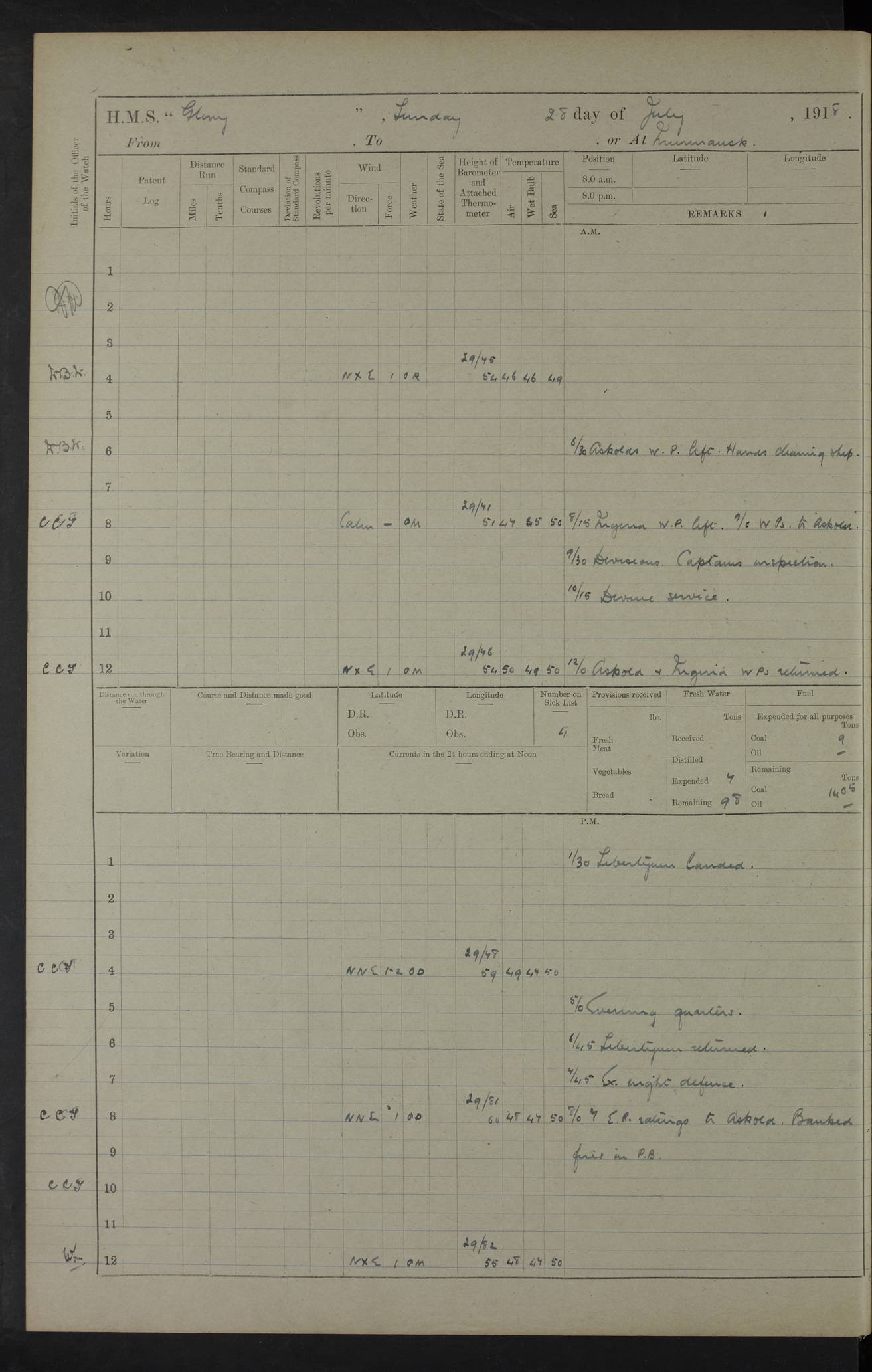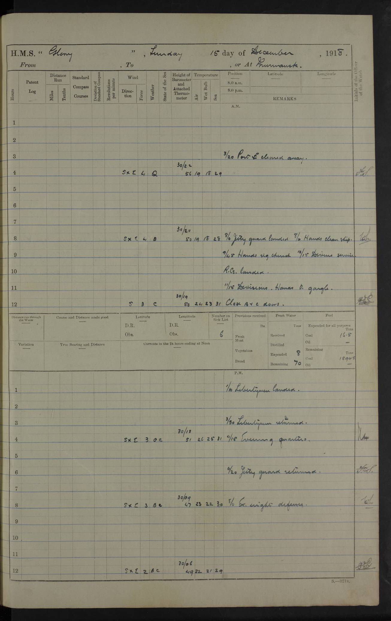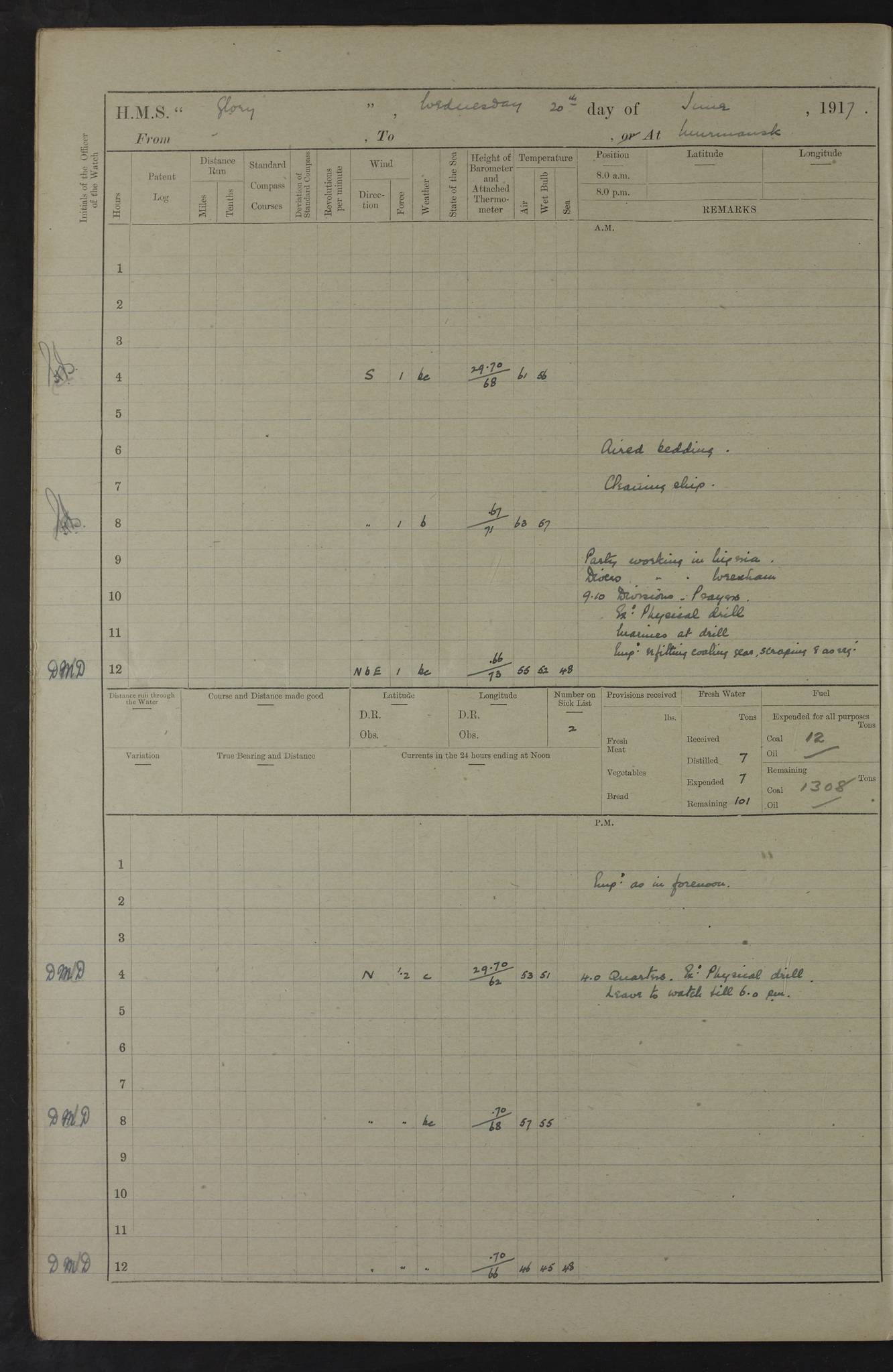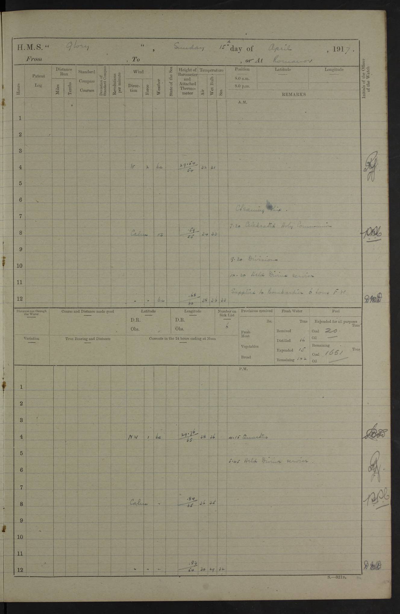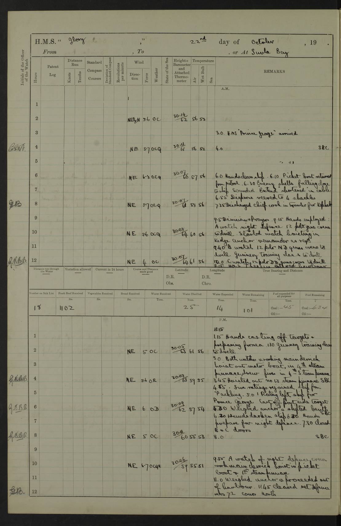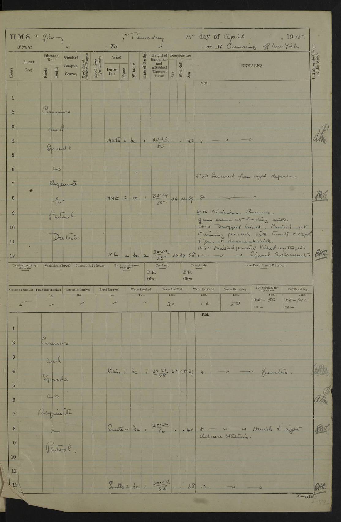 22 June 1915 At sea, Gibraltar to Lemnos Lat 36.1, Long -1.3 4.15am: Sighted land on starboard bow. 10.20am: Stopped port engine for repairs. 11.20am: proceeded with port engine. pm: a/c due to change in deviation. 10.00pm: Cape Tenez Light abeam, 18 miles. 4f73cd61a2fc8ea9030015f6: (https://s3.amazonaws.com:443/oldweather/ADM53-43015/0012_1.jpg) 23 June 1915 At sea, Gibraltar to Lemnos Lat 37.5, Long 4.8 Number on sick list: 4 5.00am: Secured from night defence stations. Placed anti-submarine guns. pm: Life saving appliances served out to men stationed in ? ?at abandon ship. 4f73cd61a2fc8ea9030015f7: (https://s3.amazonaws.com:443/oldweather/ADM53-43015/0013_0.jpg) 24 June 1915 At sea, Gibraltar to Lemnos Lat 37.4, Long 10.8 Position in log clearly bears no resemblance to the location of the ship. Position above is approximate and is based sighting of Zembra Island at 11.55am. 5.00am: Dispersed from night defence stations. Manned anti-submarine guns. am: Sighted two French torpedo boats. am: Torpedo boats passed to ~ No 362, 363. am: Sighted land on starboard beam. 11.55am: Zembra Island abeam, 25 miles. 2.00pm: Sighted Pantellaria S34ºE. 4.45pm: Pantellaria Light House abeam 12 miles. 4f73cd61a2fc8ea9030015f8: (https://s3.amazonaws.com:443/oldweather/ADM53-43015/0013_1.jpg) 25 June 1915 At sea, Gibraltar to Lemnos Lat 35.5, Long 16.7 2.10am: Gozo Light abeam 17 miles. 5.00am: Dispersed from night defence stations. Manned anti-submarine guns. 4f73cd61a2fc8ea9030015f9: (https://s3.amazonaws.com:443/oldweather/ADM53-43015/0014_0.jpg) 26 June 1915 At sea, Gibraltar to Lemnos Lat 35.5, Long 22.6 Number on sick list: 5 5.00am: Dispersed from night defence stations. Manned anti-submarine guns. am: Aired night clothing. am: marines at maxim practice on quarter deck. 2.00pm: Observed land on either bow. 3.00pm: Sighted French patrol destroyer. 4.15pm: Sighted French patrol destroyer. 9.40pm: Milo Peak N63ºW. 10.26pm: Polino Light abeam to port 5.5 miles. 4f73cd62a2fc8ea9030015fa: (https://s3.amazonaws.com:443/oldweather/ADM53-43015/0014_1.jpg) 27 June 1915 At sea and at Lemnos Lat 39.1, Long 24.4 From 0.50 to 3.05am sighting of multiple light houses. 3.50am: a/c to N39ºW and commenced to zig-zag. 5.00am: Dispersed from night defence stations and placed anti-submarine guns and look-outs. am: Lost overboard by accident Hazlewood fender, pat. 311, one in number. 10.30am: Held Divine Service onboard. pm: Met and signalled HMS Minerva on patrol duty. pm: Courses and speeds as requisite while waiting orders to approach Mudros. 3.00pm: Proceeded. 5.16pm: Increased to 90 revs, commenced to zig-zag. Course as requisite for Mudros. 7.00pm: Entered Mudros Bay. 7.47pm: Stopped. Let go port anchor in ‘M3’. 8.30pm: Darkened ship. pm: Manned one 6” and one 12 pdr. 4f73cd62a2fc8ea9030015fb: (https://s3.amazonaws.com:443/oldweather/ADM53-43015/0015_0.jpg) 28 June 1915 Mudros Bay, Lemnos Lat 39.89, Long 25.24 5,00am: HMS Vengeance entered harbour. HMS Vengeance was a pre-dreadnought of the Canopus class, launched in 1899 at Vickers, Barrow, and sold for scrapping in 1921. Details at http://en.wikipedia.org/wiki/HMS_Vengeance_(1899) . am/pm/: hands preparing for coaling and about ship’s work. pm: Collier Wabana secured alongside. 4f73cd62a2fc8ea9030015fc: (https://s3.amazonaws.com:443/oldweather/ADM53-43015/0015_1.jpg) 29 June 1915 Mudros Bay, Lemnos Lat 39.89, Long 25.24 5.15am: Commenced coaling. 2.00pm: Finished coaling. Collier left. 4f73cd62a2fc8ea9030015fd: (https://s3.amazonaws.com:443/oldweather/ADM53-43015/0016_0.jpg) 30 June 1915 Mudros Bay, Lemnos Lat 39.89, Long 25.24 am: Parties away sanding, and with fire engines onshore. am: Boats away disembarking troops. am: French Flagship Patrie sailed. The Patrie was a French pre-dreadnought, launched at La Seyne shipyard in 1903, and stricken in 1921. Details at http://en.wikipedia.org/wiki/French_battleship_Patrie . 6.30pm: Hands to bathe. 4f73cd63a2fc8ea9030015fe: (https://s3.amazonaws.com:443/oldweather/ADM53-43015/0016_1.jpg) 4f73cd63a2fc8ea9030015ff: (https://s3.amazonaws.com:443/oldweather/ADM53-43015/0017_0.jpg) 4f73cd63a2fc8ea903001600: (https://s3.amazonaws.com:443/oldweather/ADM53-43015/0017_1.jpg) 4f73cd63a2fc8ea903001601: (https://s3.amazonaws.com:443/oldweather/ADM53-43015/0018_0.jpg) 4f73cd64a2fc8ea903001602: (https://s3.amazonaws.com:443/oldweather/ADM53-43015/0018_1.jpg) LOGS FOR JULY 1915 From July to October 1915, HMS Glory spent her time at Port Mudros. Certain activities typically took place daily and are not generally noted in the pages below. These activities include: Lighting fires in the picket boat around 4am and drawing the fires in the late evening; Divisions at around 9–9.30am and Evening Quarters at 4pm; Darken ship at around 8.30pm; Daily ‘cleaning ship’, with variations thereof; SBC (for ‘Signal Books Correct’) at the watch changes. 4f73cd64a2fc8ea903001603: (https://s3.amazonaws.com:443/oldweather/ADM53-43016/0000_0.jpg) 4f73cd64a2fc8ea903001604: (https://s3.amazonaws.com:443/oldweather/ADM53-43016/0000_1.jpg) 4f73cd65a2fc8ea903001605: (https://s3.amazonaws.com:443/oldweather/ADM53-43016/0001_0.jpg) 4f73cd65a2fc8ea903001606: (https://s3.amazonaws.com:443/oldweather/ADM53-43016/0001_1.jpg) 1 July 1915 Port Mudros Lat 39.89, Long 25.24 6.30am: Landed working parties preparing boom defence ships. am: Discharged Acting Commander Rayne to Hector. Hector was a kite balloon ship. No further details readily available. 5.00pm: Tug T.10 made fast astern. 7.15pm: HMS Venerable went out. 7.30pm: HMS Chatham went out. HMS Chatham was a ‘Town’ cruiser and lead ship of her class. She was launched in 1911 at Chatham Dockyard and sold in 1926. Details at http://en.wikipedia.org/wiki/HMS_Chatham_(1911) . 4f73cd65a2fc8ea903001607: (https://s3.amazonaws.com:443/oldweather/ADM53-43016/0002_0.jpg) 2 July 1915 Port Mudros Lat 39.89, Long 25.24 5.35am: Landed working parties preparing boom defence ships. am/pm: Boom defence par