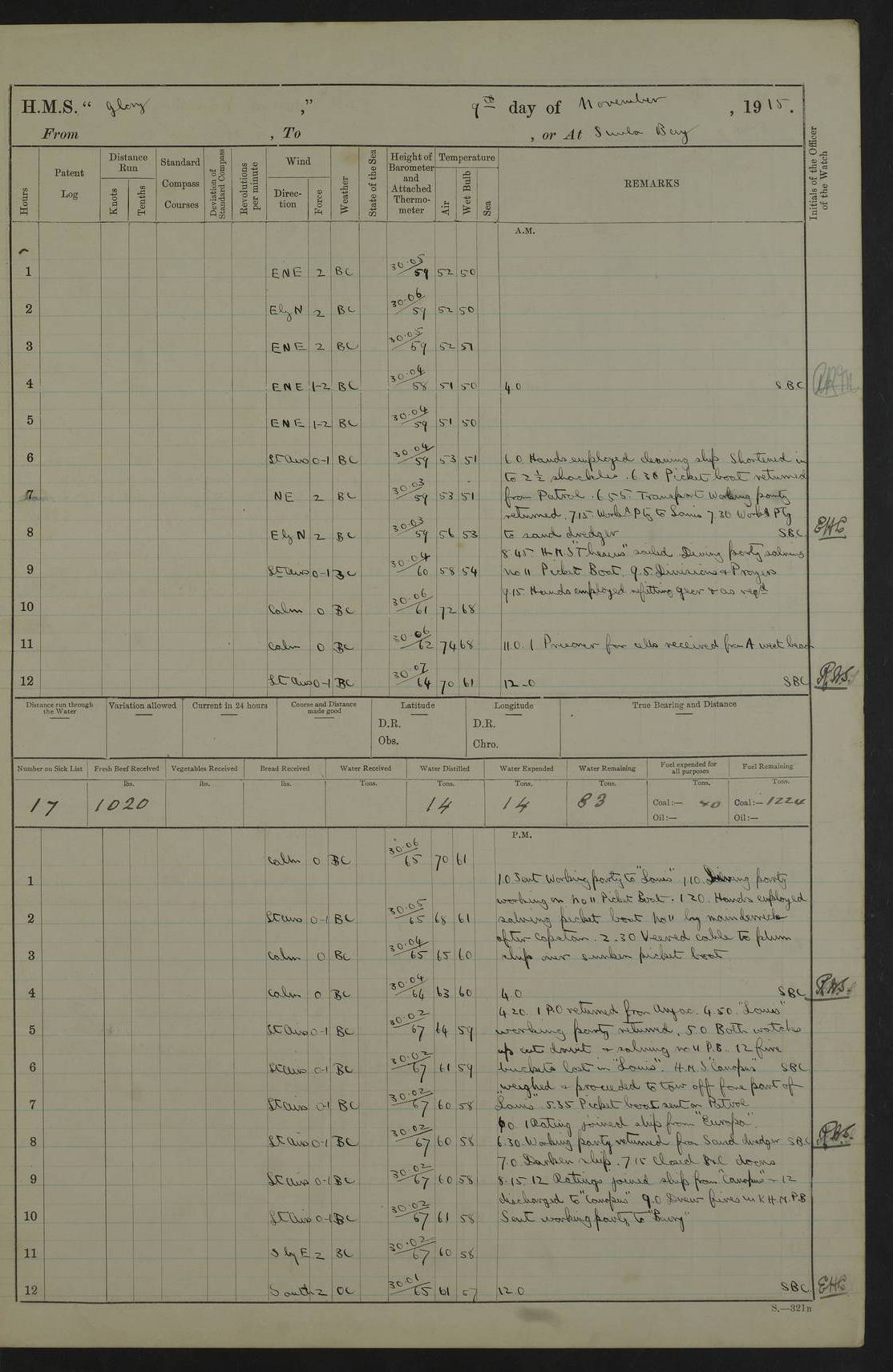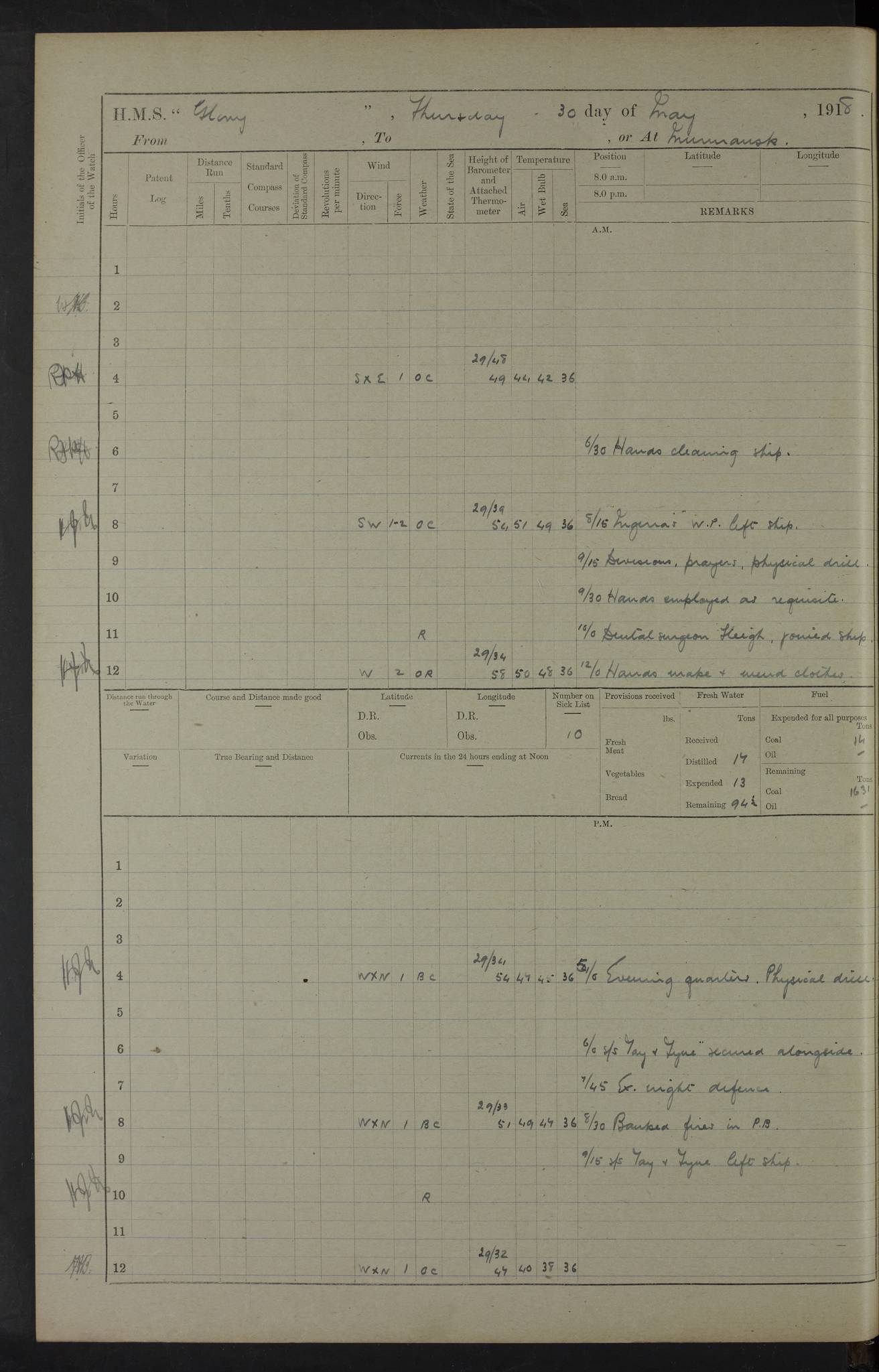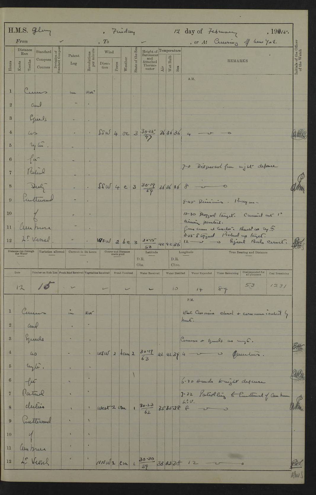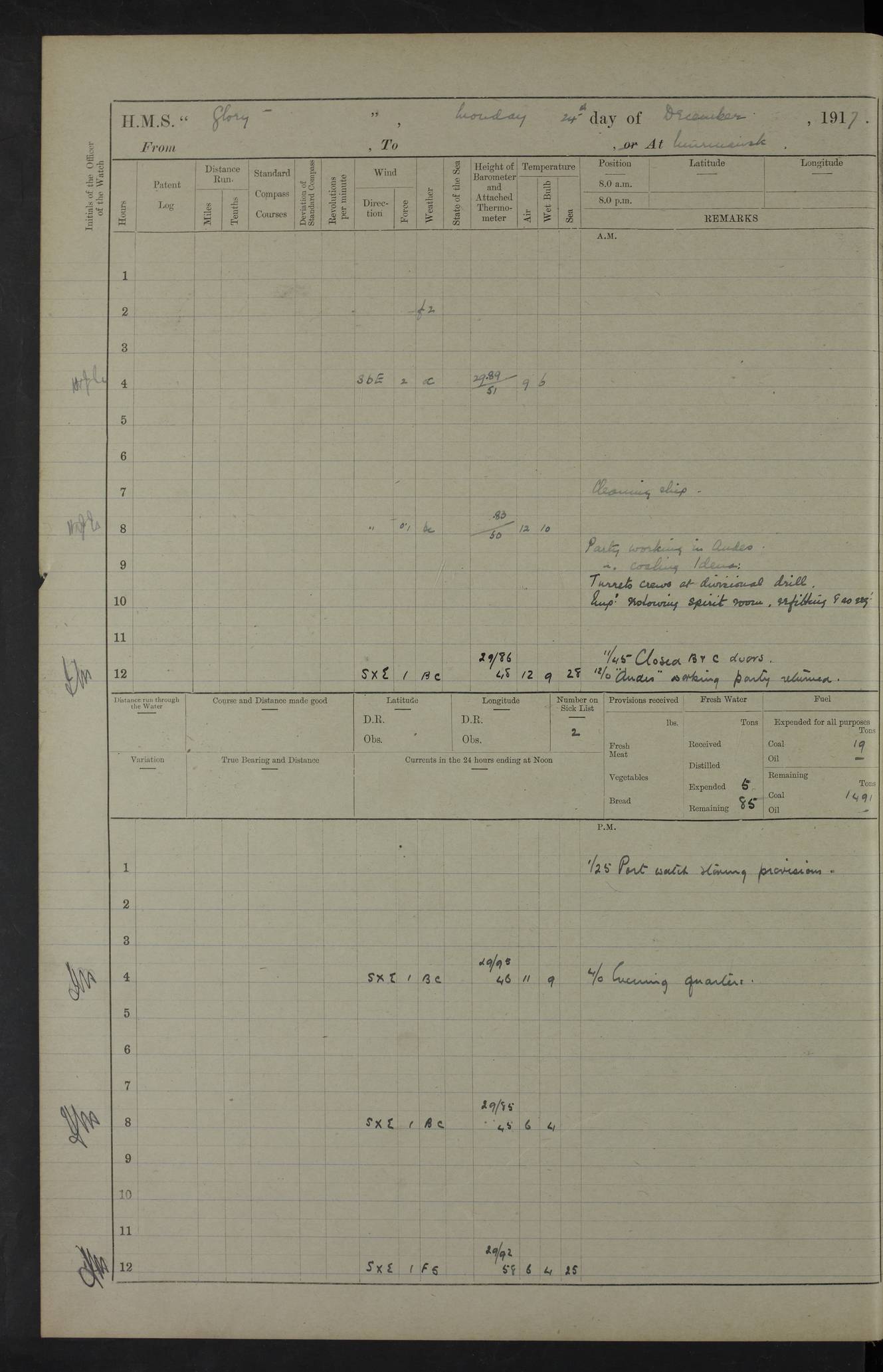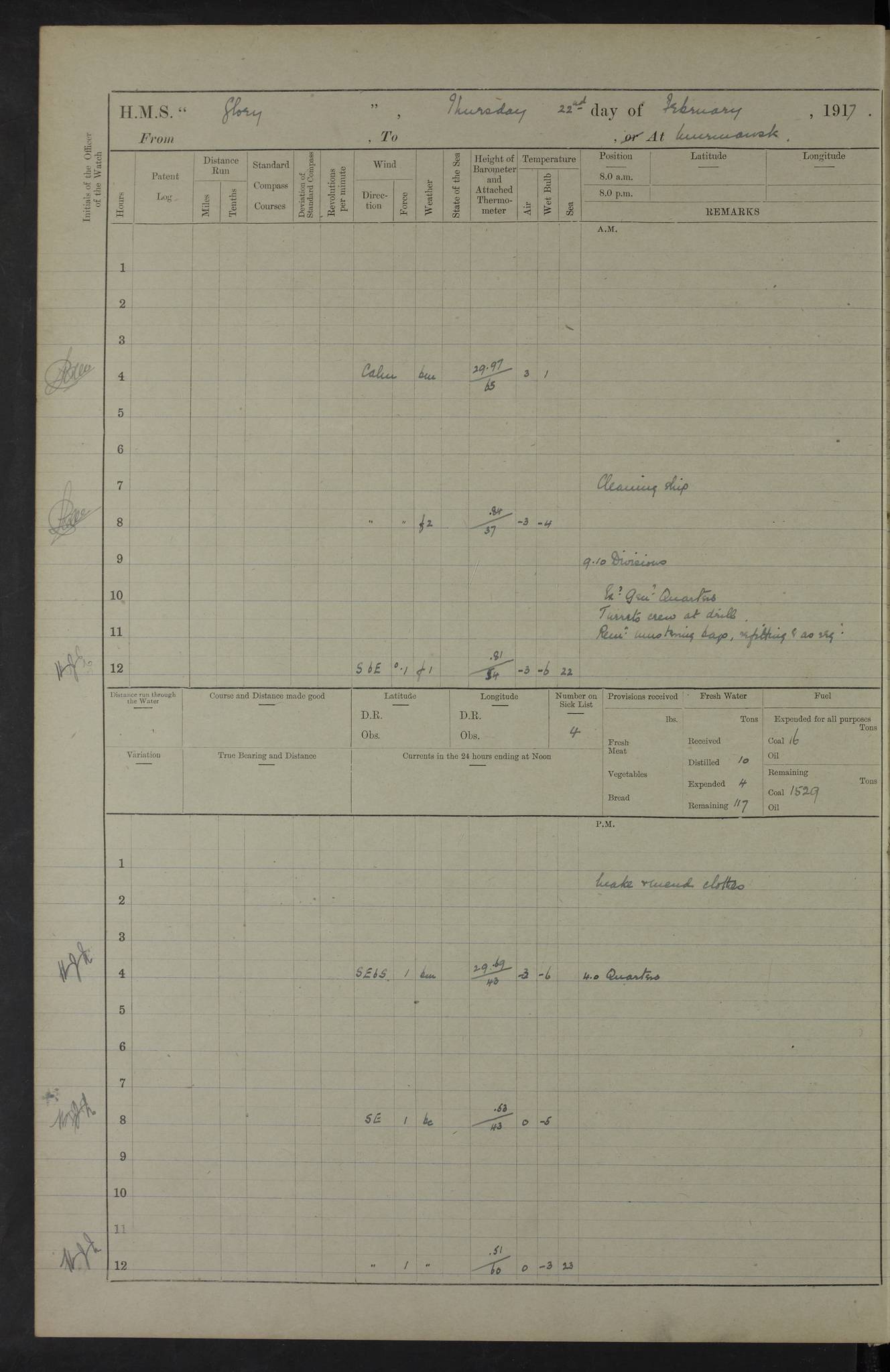 22 June 1915 At sea, Gibraltar to Lemnos Lat 36.1, Long -1.3 4.15am: Sighted land on starboard bow. 10.20am: Stopped port engine for repairs. 11.20am: proceeded with port engine. pm: a/c due to change in deviation. 10.00pm: Cape Tenez Light abeam, 18 miles. 4f73cd61a2fc8ea9030015f6: (https://s3.amazonaws.com:443/oldweather/ADM53-43015/0012_1.jpg) 23 June 1915 At sea, Gibraltar to Lemnos Lat 37.5, Long 4.8 Number on sick list: 4 5.00am: Secured from night defence stations. Placed anti-submarine guns. pm: Life saving appliances served out to men stationed in ? ?at abandon ship. 4f73cd61a2fc8ea9030015f7: (https://s3.amazonaws.com:443/oldweather/ADM53-43015/0013_0.jpg) 24 June 1915 At sea, Gibraltar to Lemnos Lat 37.4, Long 10.8 Position in log clearly bears no resemblance to the location of the ship. Position above is approximate and is based sighting of Zembra Island at 11.55am. 5.00am: Dispersed from night defence stations. Manned anti-submarine guns. am: Sighted two French torpedo boats. am: Torpedo boats passed to ~ No 362, 363. am: Sighted land on starboard beam. 11.55am: Zembra Island abeam, 25 miles. 2.00pm: Sighted Pantellaria S34ºE. 4.45pm: Pantellaria Light House abeam 12 miles. 4f73cd61a2fc8ea9030015f8: (https://s3.amazonaws.com:443/oldweather/ADM53-43015/0013_1.jpg) 25 June 1915 At sea, Gibraltar to Lemnos Lat 35.5, Long 16.7 2.10am: Gozo Light abeam 17 miles. 5.00am: Dispersed from night defence stations. Manned anti-submarine guns. 4f73cd61a2fc8ea9030015f9: (https://s3.amazonaws.com:443/oldweather/ADM53-43015/0014_0.jpg) 26 June 1915 At sea, Gibraltar to Lemnos Lat 35.5, Long 22.6 Number on sick list: 5 5.00am: Dispersed from night defence stations. Manned anti-submarine guns. am: Aired night clothing. am: marines at maxim practice on quarter deck. 2.00pm: Observed land on either bow. 3.00pm: Sighted French patrol destroyer. 4.15pm: Sighted French patrol destroyer. 9.40pm: Milo Peak N63ºW. 10.26pm: Polino Light abeam to port 5.5 miles. 4f73cd62a2fc8ea9030015fa: (https://s3.amazonaws.com:443/oldweather/ADM53-43015/0014_1.jpg) 27 June 1915 At sea and at Lemnos Lat 39.1, Long 24.4 From 0.50 to 3.05am sighting of multiple light houses. 3.50am: a/c to N39ºW and commenced to zig-zag. 5.00am: Dispersed from night defence stations and placed anti-submarine guns and look-outs. am: Lost overboard by accident Hazlewood fender, pat. 311, one in number. 10.30am: Held Divine Service onboard. pm: Met and signalled HMS Minerva on patrol duty. pm: Courses and speeds as requisite while waiting orders to approach Mudros. 3.00pm: Proceeded. 5.16pm: Increased to 90 revs, commenced to zig-zag. Course as requisite for Mudros. 7.00pm: Entered Mudros Bay. 7.47pm: Stopped. Let go port anchor in ‘M3’. 8.30pm: Darkened ship. pm: Manned one 6” and one 12 pdr. 4f73cd62a2fc8ea9030015fb: (https://s3.amazonaws.com:443/oldweather/ADM53-43015/0015_0.jpg) 28 June 1915 Mudros Bay, Lemnos Lat 39.89, Long 25.24 5,00am: HMS Vengeance entered harbour. HMS Vengeance was a pre-dreadnought of the Canopus class, launched in 1899 at Vickers, Barrow, and sold for scrapping in 1921. Details at http://en.wikipedia.org/wiki/HMS_Vengeance_(1899) . am/pm/: hands preparing for coaling and about ship’s work. pm: Collier Wabana secured alongside. 4f73cd62a2fc8ea9030015fc: (https://s3.amazonaws.com:443/oldweather/ADM53-43015/0015_1.jpg) 29 June 1915 Mudros Bay, Lemnos Lat 39.89, Long 25.24 5.15am: Commenced coaling. 2.00pm: Finished coaling. Collier left. 4f73cd62a2fc8ea9030015fd: (https://s3.amazonaws.com:443/oldweather/ADM53-43015/0016_0.jpg) 30 June 1915 Mudros Bay, Lemnos Lat 39.89, Long 25.24 am: Parties away sanding, and with fire engines onshore. am: Boats away disembarking troops. am: French Flagship Patrie sailed. The Patrie was a French pre-dreadnought, launched at La Seyne shipyard in 1903, and stricken in 1921. Details at http://en.wikipedia.org/wiki/French_battleship_Patrie . 6.30pm: Hands to bathe. 4f73cd63a2fc8ea9030015fe: (https://s3.amazonaws.com:443/oldweather/ADM53-43015/0016_1.jpg) 4f73cd63a2fc8ea9030015ff: (https://s3.amazonaws.com:443/oldweather/ADM53-43015/0017_0.jpg) 4f73cd63a2fc8ea903001600: (https://s3.amazonaws.com:443/oldweather/ADM53-43015/0017_1.jpg) 4f73cd63a2fc8ea903001601: (https://s3.amazonaws.com:443/oldweather/ADM53-43015/0018_0.jpg) 4f73cd64a2fc8ea903001602: (https://s3.amazonaws.com:443/oldweather/ADM53-43015/0018_1.jpg) LOGS FOR JULY 1915 From July to October 1915, HMS Glory spent her time at Port Mudros. Certain activities typically took place daily and are not generally noted in the pages below. These activities include: Lighting fires in the picket boat around 4am and drawing the fires in the late evening; Divisions at around 9–9.30am and Evening Quarters at 4pm; Darken ship at around 8.30pm; Daily ‘cleaning ship’, with variations thereof; SBC (for ‘Signal Books Correct’) at the watch changes. 4f73cd64a2fc8ea903001603: (https://s3.amazonaws.com:443/oldweather/ADM53-43016/0000_0.jpg) 4f73cd64a2fc8ea903001604: (https://s3.amazonaws.com:443/oldweather/ADM53-43016/0000_1.jpg) 4f73cd65a2fc8ea903001605: (https://s3.amazonaws.com:443/oldweather/ADM53-43016/0001_0.jpg) 4f73cd65a2fc8ea903001606: (https://s3.amazonaws.com:443/oldweather/ADM53-43016/0001_1.jpg) 1 July 1915 Port Mudros Lat 39.89, Long 25.24 6.30am: Landed working parties preparing boom defence ships. am: Discharged Acting Commander Rayne to Hector. Hector was a kite balloon ship. No further details readily available. 5.00pm: Tug T.10 made fast astern. 7.15pm: HMS Venerable went out. 7.30pm: HMS Chatham went out. HMS Chatham was a ‘Town’ cruiser and lead ship of her class. She was launched in 1911 at Chatham Dockyard and sold in 1926. Details at http://en.wikipedia.org/wiki/HMS_Chatham_(1911) . 4f73cd65a2fc8ea903001607: (https://s3.amazonaws.com:443/oldweather/ADM53-43016/0002_0.jpg) 2 July 1915 Port Mudros Lat 39.89, Long 25.24 5.35am: Landed working parties preparing boom defence ships. am/pm: Boom defence par
