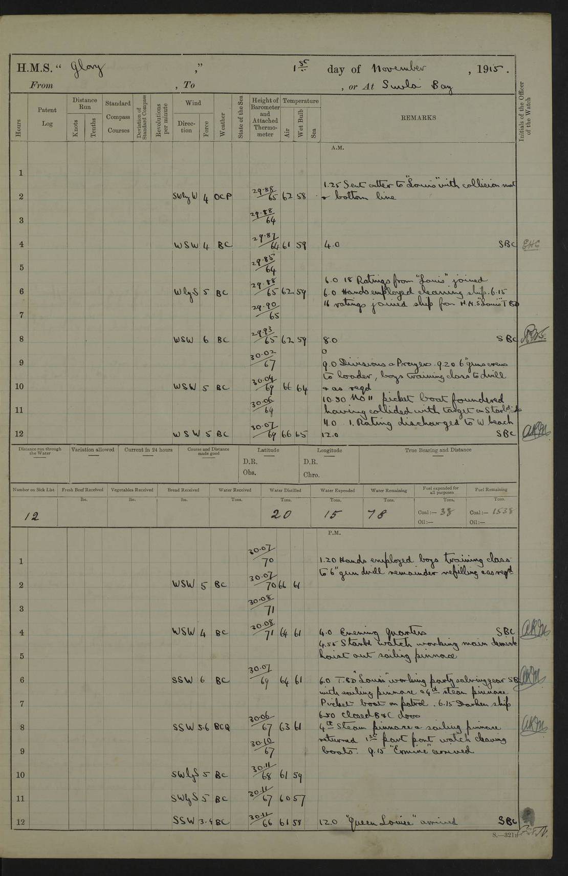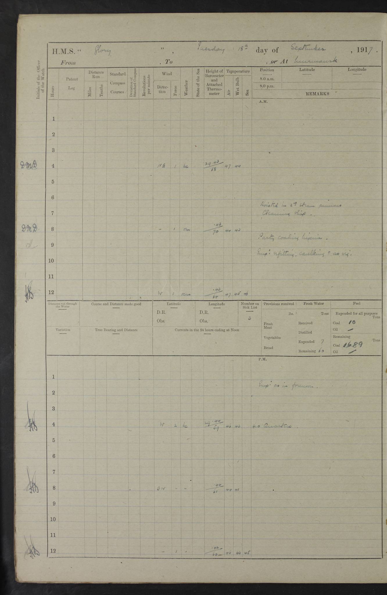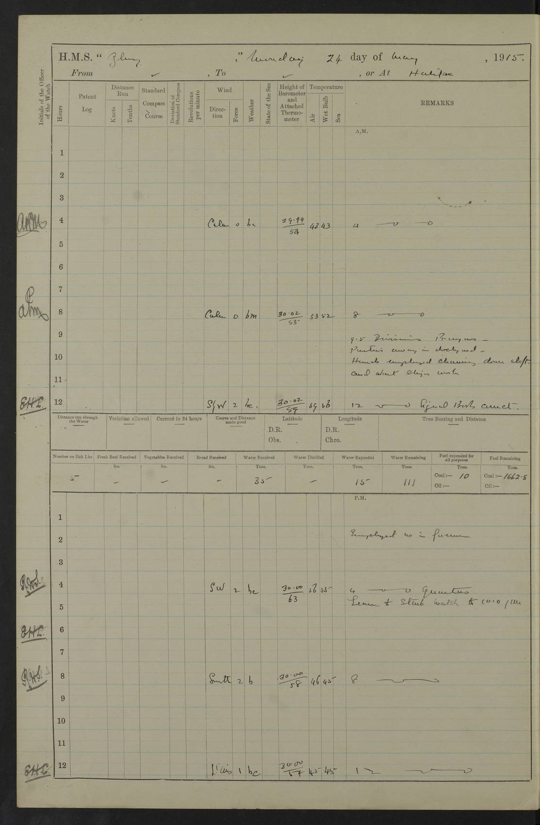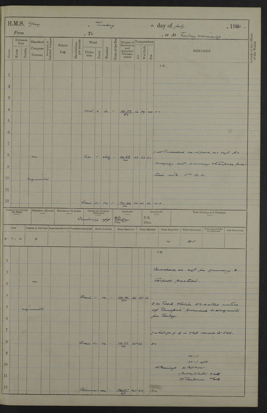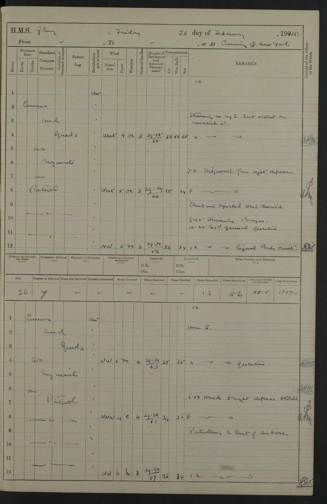 22 June 1915 At sea, Gibraltar to Lemnos Lat 36.1, Long -1.3 4.15am: Sighted land on starboard bow. 10.20am: Stopped port engine for repairs. 11.20am: proceeded with port engine. pm: a/c due to change in deviation. 10.00pm: Cape Tenez Light abeam, 18 miles. 4f73cd61a2fc8ea9030015f6: (https://s3.amazonaws.com:443/oldweather/ADM53-43015/0012_1.jpg) 23 June 1915 At sea, Gibraltar to Lemnos Lat 37.5, Long 4.8 Number on sick list: 4 5.00am: Secured from night defence stations. Placed anti-submarine guns. pm: Life saving appliances served out to men stationed in ? ?at abandon ship. 4f73cd61a2fc8ea9030015f7: (https://s3.amazonaws.com:443/oldweather/ADM53-43015/0013_0.jpg) 24 June 1915 At sea, Gibraltar to Lemnos Lat 37.4, Long 10.8 Position in log clearly bears no resemblance to the location of the ship. Position above is approximate and is based sighting of Zembra Island at 11.55am. 5.00am: Dispersed from night defence stations. Manned anti-submarine guns. am: Sighted two French torpedo boats. am: Torpedo boats passed to ~ No 362, 363. am: Sighted land on starboard beam. 11.55am: Zembra Island abeam, 25 miles. 2.00pm: Sighted Pantellaria S34ºE. 4.45pm: Pantellaria Light House abeam 12 miles. 4f73cd61a2fc8ea9030015f8: (https://s3.amazonaws.com:443/oldweather/ADM53-43015/0013_1.jpg) 25 June 1915 At sea, Gibraltar to Lemnos Lat 35.5, Long 16.7 2.10am: Gozo Light abeam 17 miles. 5.00am: Dispersed from night defence stations. Manned anti-submarine guns. 4f73cd61a2fc8ea9030015f9: (https://s3.amazonaws.com:443/oldweather/ADM53-43015/0014_0.jpg) 26 June 1915 At sea, Gibraltar to Lemnos Lat 35.5, Long 22.6 Number on sick list: 5 5.00am: Dispersed from night defence stations. Manned anti-submarine guns. am: Aired night clothing. am: marines at maxim practice on quarter deck. 2.00pm: Observed land on either bow. 3.00pm: Sighted French patrol destroyer. 4.15pm: Sighted French patrol destroyer. 9.40pm: Milo Peak N63ºW. 10.26pm: Polino Light abeam to port 5.5 miles. 4f73cd62a2fc8ea9030015fa: (https://s3.amazonaws.com:443/oldweather/ADM53-43015/0014_1.jpg) 27 June 1915 At sea and at Lemnos Lat 39.1, Long 24.4 From 0.50 to 3.05am sighting of multiple light houses. 3.50am: a/c to N39ºW and commenced to zig-zag. 5.00am: Dispersed from night defence stations and placed anti-submarine guns and look-outs. am: Lost overboard by accident Hazlewood fender, pat. 311, one in number. 10.30am: Held Divine Service onboard. pm: Met and signalled HMS Minerva on patrol duty. pm: Courses and speeds as requisite while waiting orders to approach Mudros. 3.00pm: Proceeded. 5.16pm: Increased to 90 revs, commenced to zig-zag. Course as requisite for Mudros. 7.00pm: Entered Mudros Bay. 7.47pm: Stopped. Let go port anchor in ‘M3’. 8.30pm: Darkened ship. pm: Manned one 6” and one 12 pdr. 4f73cd62a2fc8ea9030015fb: (https://s3.amazonaws.com:443/oldweather/ADM53-43015/0015_0.jpg) 28 June 1915 Mudros Bay, Lemnos Lat 39.89, Long 25.24 5,00am: HMS Vengeance entered harbour. HMS Vengeance was a pre-dreadnought of the Canopus class, launched in 1899 at Vickers, Barrow, and sold for scrapping in 1921. Details at http://en.wikipedia.org/wiki/HMS_Vengeance_(1899) . am/pm/: hands preparing for coaling and about ship’s work. pm: Collier Wabana secured alongside. 4f73cd62a2fc8ea9030015fc: (https://s3.amazonaws.com:443/oldweather/ADM53-43015/0015_1.jpg) 29 June 1915 Mudros Bay, Lemnos Lat 39.89, Long 25.24 5.15am: Commenced coaling. 2.00pm: Finished coaling. Collier left. 4f73cd62a2fc8ea9030015fd: (https://s3.amazonaws.com:443/oldweather/ADM53-43015/0016_0.jpg) 30 June 1915 Mudros Bay, Lemnos Lat 39.89, Long 25.24 am: Parties away sanding, and with fire engines onshore. am: Boats away disembarking troops. am: French Flagship Patrie sailed. The Patrie was a French pre-dreadnought, launched at La Seyne shipyard in 1903, and stricken in 1921. Details at http://en.wikipedia.org/wiki/French_battleship_Patrie . 6.30pm: Hands to bathe. 4f73cd63a2fc8ea9030015fe: (https://s3.amazonaws.com:443/oldweather/ADM53-43015/0016_1.jpg) 4f73cd63a2fc8ea9030015ff: (https://s3.amazonaws.com:443/oldweather/ADM53-43015/0017_0.jpg) 4f73cd63a2fc8ea903001600: (https://s3.amazonaws.com:443/oldweather/ADM53-43015/0017_1.jpg) 4f73cd63a2fc8ea903001601: (https://s3.amazonaws.com:443/oldweather/ADM53-43015/0018_0.jpg) 4f73cd64a2fc8ea903001602: (https://s3.amazonaws.com:443/oldweather/ADM53-43015/0018_1.jpg) LOGS FOR JULY 1915 From July to October 1915, HMS Glory spent her time at Port Mudros. Certain activities typically took place daily and are not generally noted in the pages below. These activities include: Lighting fires in the picket boat around 4am and drawing the fires in the late evening; Divisions at around 9–9.30am and Evening Quarters at 4pm; Darken ship at around 8.30pm; Daily ‘cleaning ship’, with variations thereof; SBC (for ‘Signal Books Correct’) at the watch changes. 4f73cd64a2fc8ea903001603: (https://s3.amazonaws.com:443/oldweather/ADM53-43016/0000_0.jpg) 4f73cd64a2fc8ea903001604: (https://s3.amazonaws.com:443/oldweather/ADM53-43016/0000_1.jpg) 4f73cd65a2fc8ea903001605: (https://s3.amazonaws.com:443/oldweather/ADM53-43016/0001_0.jpg) 4f73cd65a2fc8ea903001606: (https://s3.amazonaws.com:443/oldweather/ADM53-43016/0001_1.jpg) 1 July 1915 Port Mudros Lat 39.89, Long 25.24 6.30am: Landed working parties preparing boom defence ships. am: Discharged Acting Commander Rayne to Hector. Hector was a kite balloon ship. No further details readily available. 5.00pm: Tug T.10 made fast astern. 7.15pm: HMS Venerable went out. 7.30pm: HMS Chatham went out. HMS Chatham was a ‘Town’ cruiser and lead ship of her class. She was launched in 1911 at Chatham Dockyard and sold in 1926. Details at http://en.wikipedia.org/wiki/HMS_Chatham_(1911) . 4f73cd65a2fc8ea903001607: (https://s3.amazonaws.com:443/oldweather/ADM53-43016/0002_0.jpg) 2 July 1915 Port Mudros Lat 39.89, Long 25.24 5.35am: Landed working parties preparing boom defence ships. am/pm: Boom defence par