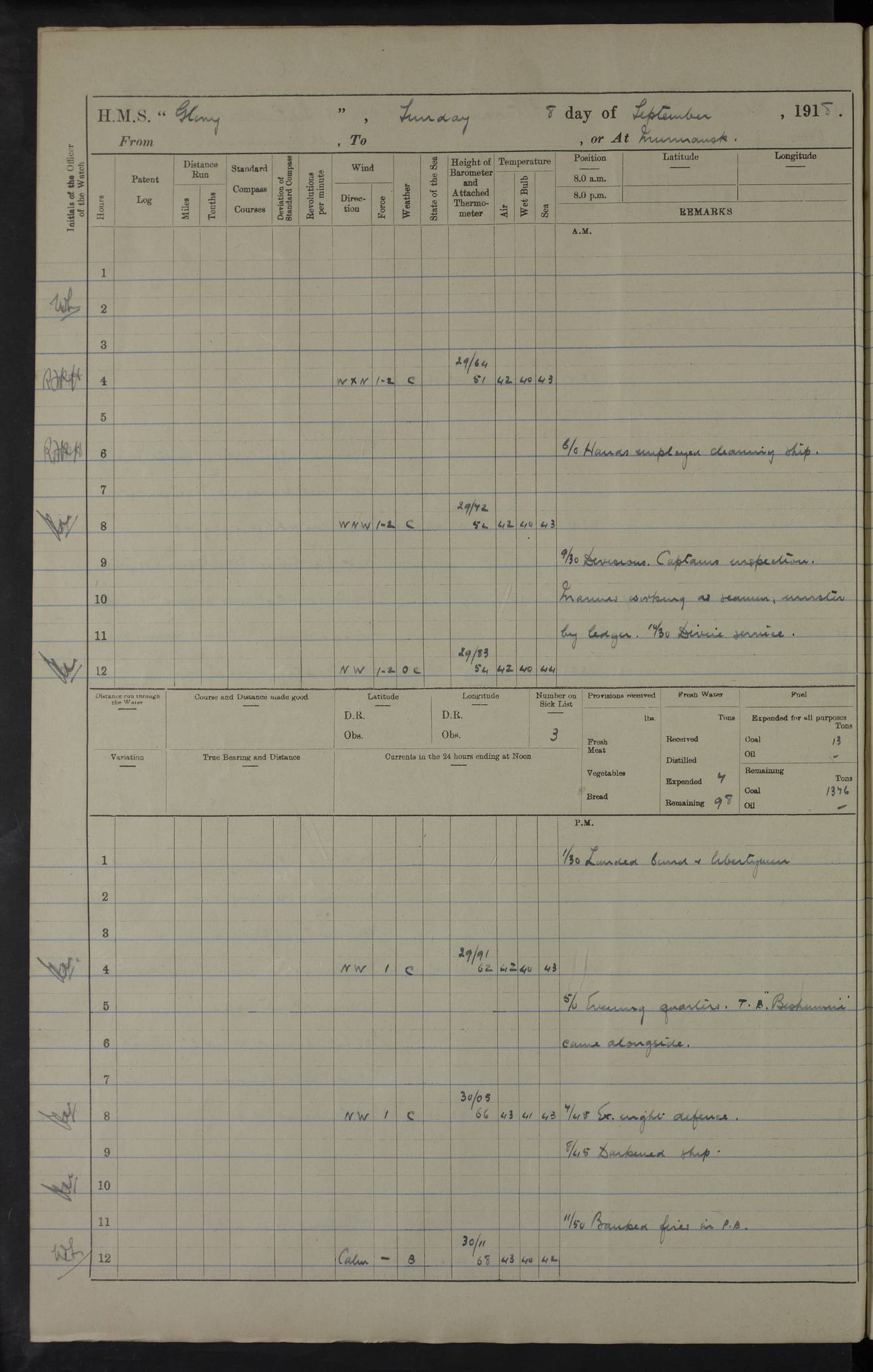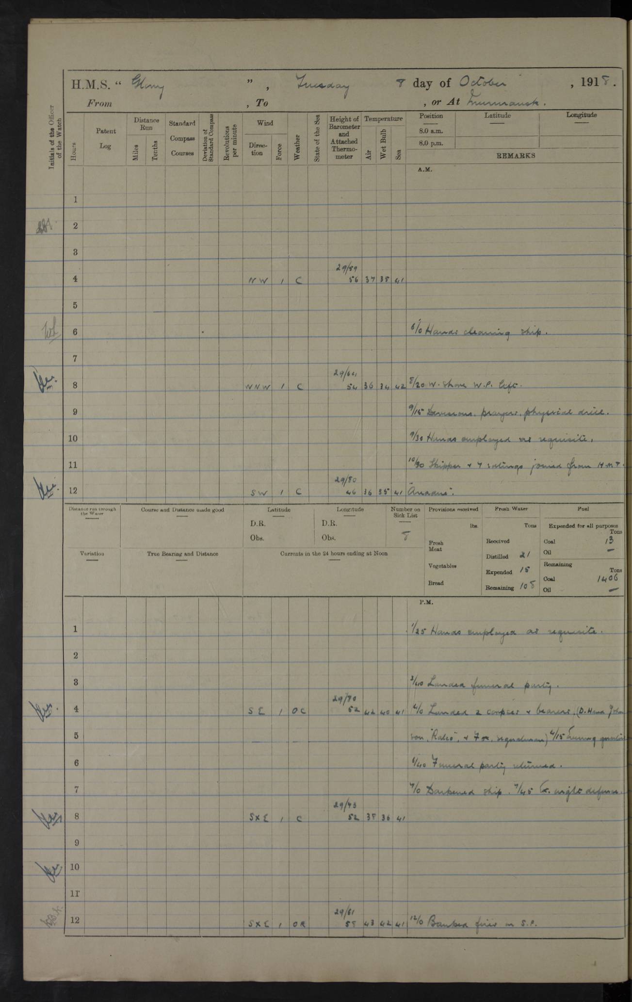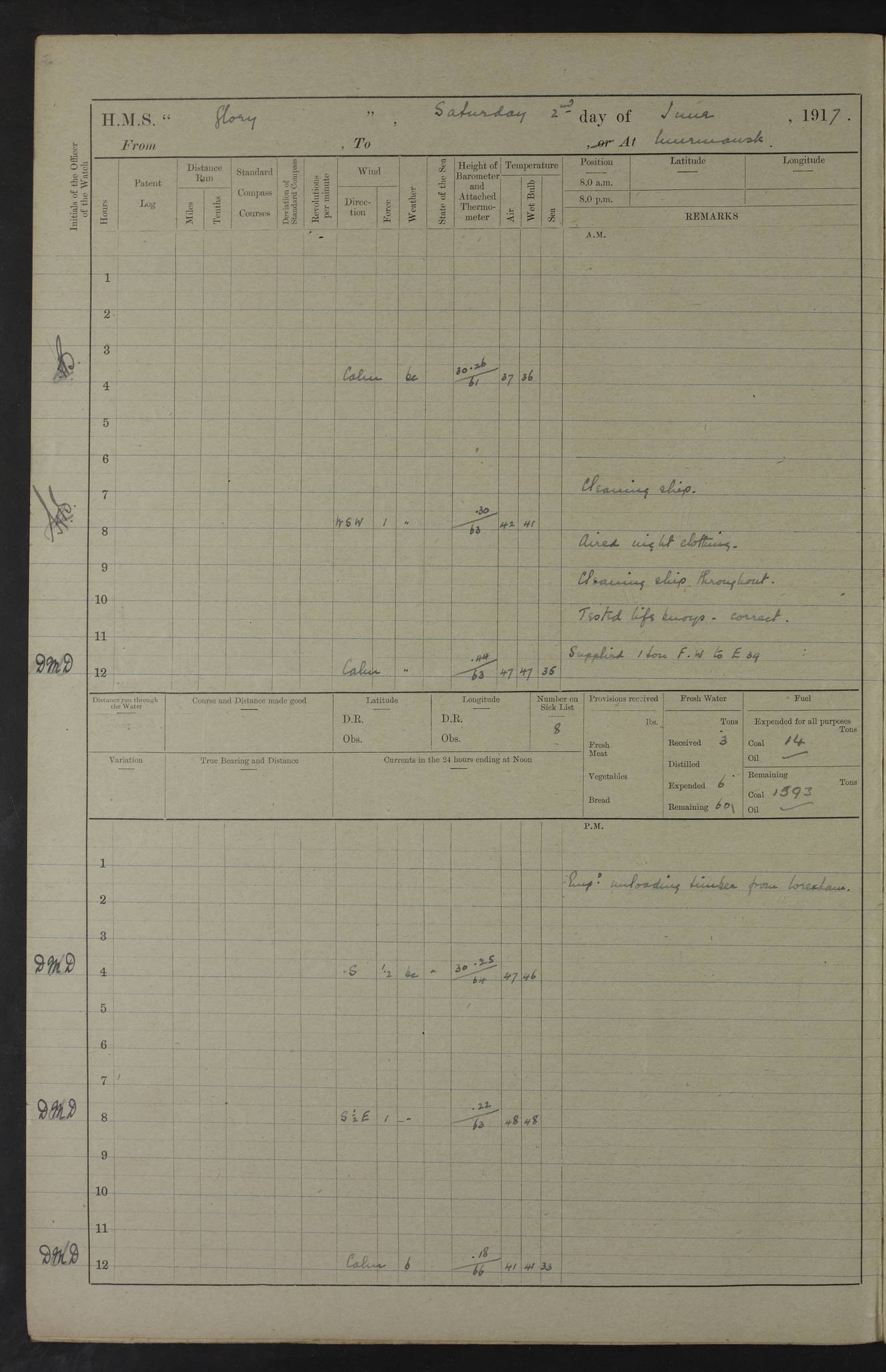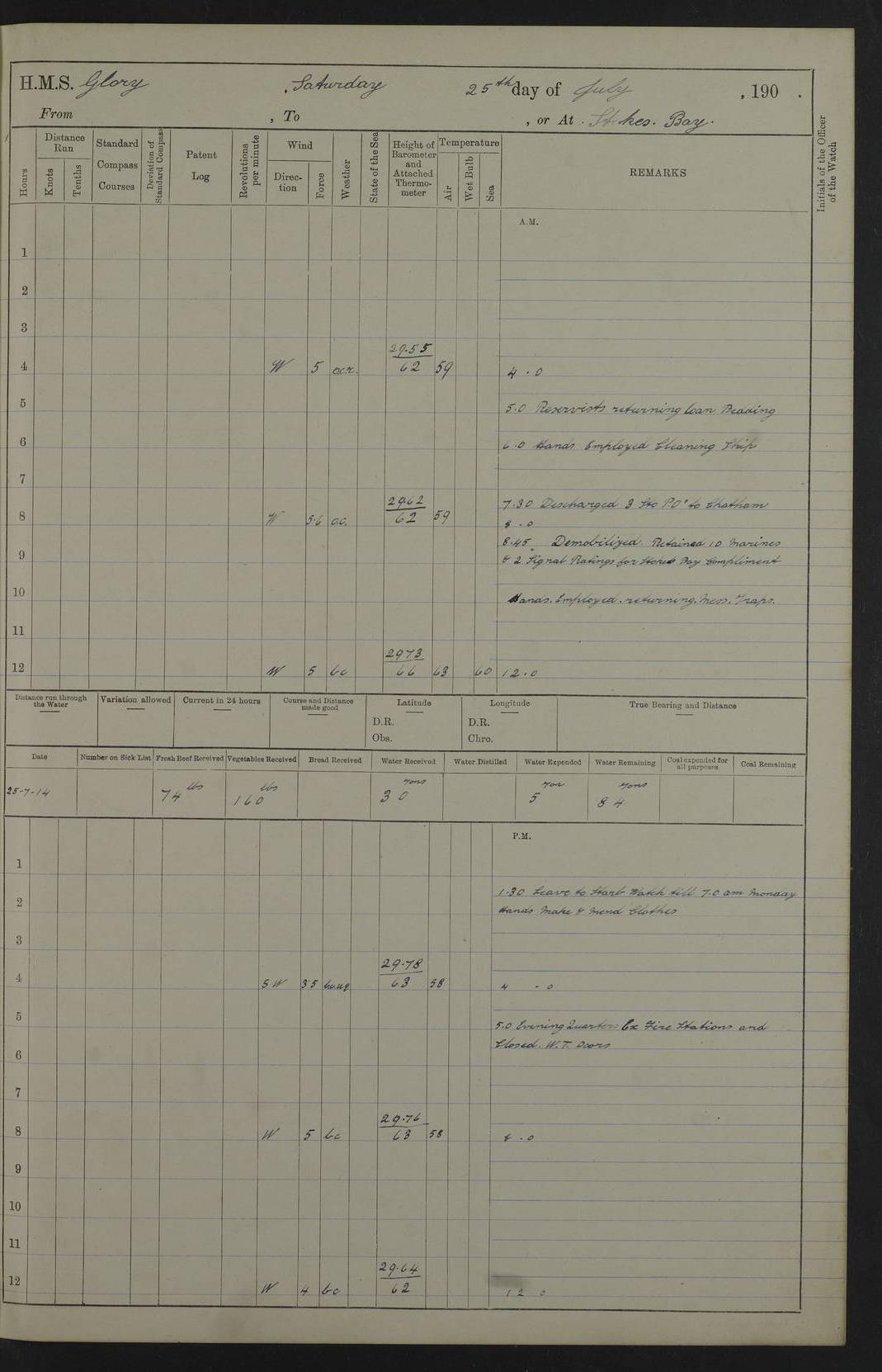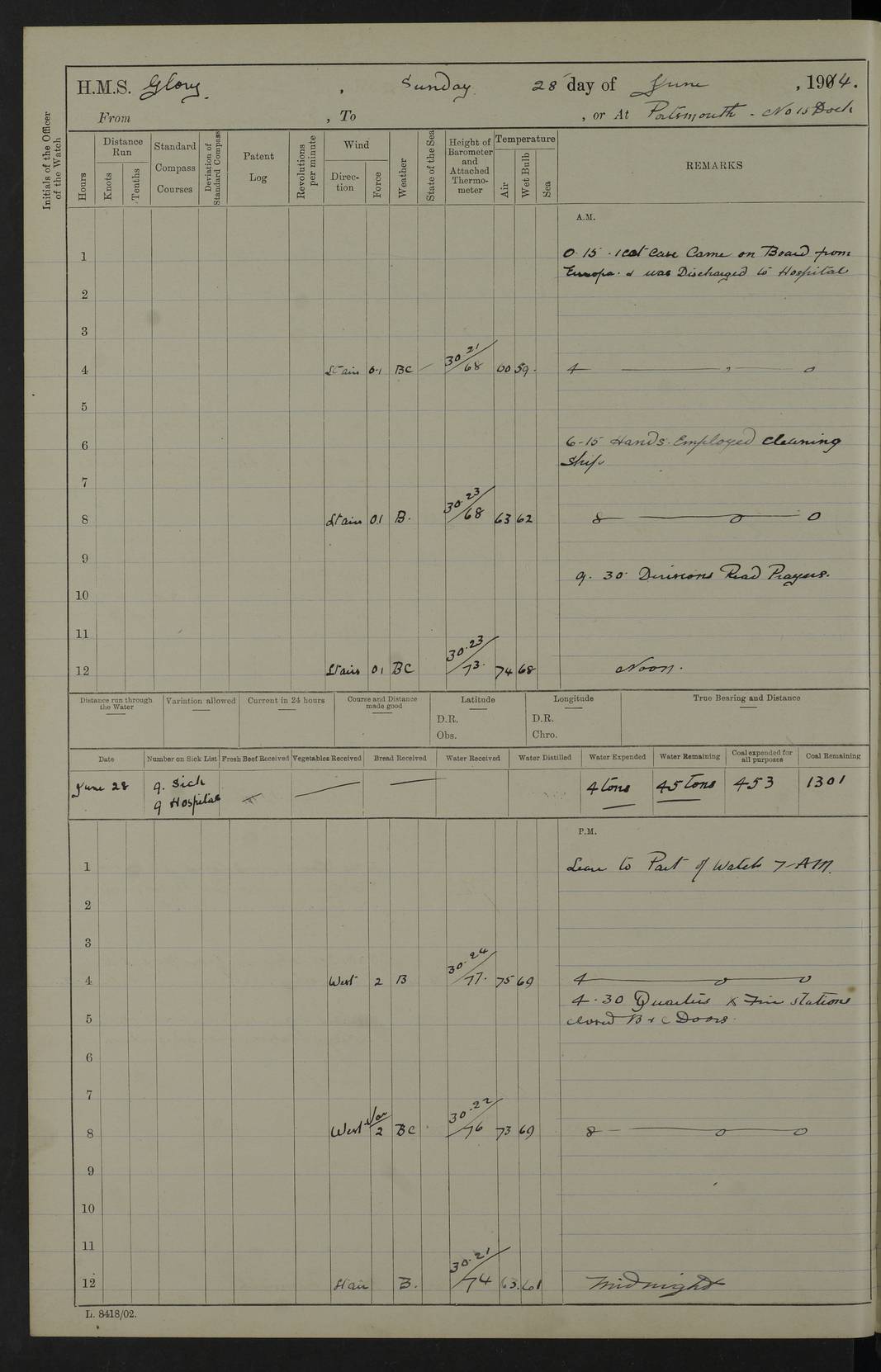 22 June 1915 At sea, Gibraltar to Lemnos Lat 36.1, Long -1.3 4.15am: Sighted land on starboard bow. 10.20am: Stopped port engine for repairs. 11.20am: proceeded with port engine. pm: a/c due to change in deviation. 10.00pm: Cape Tenez Light abeam, 18 miles. 4f73cd61a2fc8ea9030015f6: (https://s3.amazonaws.com:443/oldweather/ADM53-43015/0012_1.jpg) 23 June 1915 At sea, Gibraltar to Lemnos Lat 37.5, Long 4.8 Number on sick list: 4 5.00am: Secured from night defence stations. Placed anti-submarine guns. pm: Life saving appliances served out to men stationed in ? ?at abandon ship. 4f73cd61a2fc8ea9030015f7: (https://s3.amazonaws.com:443/oldweather/ADM53-43015/0013_0.jpg) 24 June 1915 At sea, Gibraltar to Lemnos Lat 37.4, Long 10.8 Position in log clearly bears no resemblance to the location of the ship. Position above is approximate and is based sighting of Zembra Island at 11.55am. 5.00am: Dispersed from night defence stations. Manned anti-submarine guns. am: Sighted two French torpedo boats. am: Torpedo boats passed to ~ No 362, 363. am: Sighted land on starboard beam. 11.55am: Zembra Island abeam, 25 miles. 2.00pm: Sighted Pantellaria S34ºE. 4.45pm: Pantellaria Light House abeam 12 miles. 4f73cd61a2fc8ea9030015f8: (https://s3.amazonaws.com:443/oldweather/ADM53-43015/0013_1.jpg) 25 June 1915 At sea, Gibraltar to Lemnos Lat 35.5, Long 16.7 2.10am: Gozo Light abeam 17 miles. 5.00am: Dispersed from night defence stations. Manned anti-submarine guns. 4f73cd61a2fc8ea9030015f9: (https://s3.amazonaws.com:443/oldweather/ADM53-43015/0014_0.jpg) 26 June 1915 At sea, Gibraltar to Lemnos Lat 35.5, Long 22.6 Number on sick list: 5 5.00am: Dispersed from night defence stations. Manned anti-submarine guns. am: Aired night clothing. am: marines at maxim practice on quarter deck. 2.00pm: Observed land on either bow. 3.00pm: Sighted French patrol destroyer. 4.15pm: Sighted French patrol destroyer. 9.40pm: Milo Peak N63ºW. 10.26pm: Polino Light abeam to port 5.5 miles. 4f73cd62a2fc8ea9030015fa: (https://s3.amazonaws.com:443/oldweather/ADM53-43015/0014_1.jpg) 27 June 1915 At sea and at Lemnos Lat 39.1, Long 24.4 From 0.50 to 3.05am sighting of multiple light houses. 3.50am: a/c to N39ºW and commenced to zig-zag. 5.00am: Dispersed from night defence stations and placed anti-submarine guns and look-outs. am: Lost overboard by accident Hazlewood fender, pat. 311, one in number. 10.30am: Held Divine Service onboard. pm: Met and signalled HMS Minerva on patrol duty. pm: Courses and speeds as requisite while waiting orders to approach Mudros. 3.00pm: Proceeded. 5.16pm: Increased to 90 revs, commenced to zig-zag. Course as requisite for Mudros. 7.00pm: Entered Mudros Bay. 7.47pm: Stopped. Let go port anchor in ‘M3’. 8.30pm: Darkened ship. pm: Manned one 6” and one 12 pdr. 4f73cd62a2fc8ea9030015fb: (https://s3.amazonaws.com:443/oldweather/ADM53-43015/0015_0.jpg) 28 June 1915 Mudros Bay, Lemnos Lat 39.89, Long 25.24 5,00am: HMS Vengeance entered harbour. HMS Vengeance was a pre-dreadnought of the Canopus class, launched in 1899 at Vickers, Barrow, and sold for scrapping in 1921. Details at http://en.wikipedia.org/wiki/HMS_Vengeance_(1899) . am/pm/: hands preparing for coaling and about ship’s work. pm: Collier Wabana secured alongside. 4f73cd62a2fc8ea9030015fc: (https://s3.amazonaws.com:443/oldweather/ADM53-43015/0015_1.jpg) 29 June 1915 Mudros Bay, Lemnos Lat 39.89, Long 25.24 5.15am: Commenced coaling. 2.00pm: Finished coaling. Collier left. 4f73cd62a2fc8ea9030015fd: (https://s3.amazonaws.com:443/oldweather/ADM53-43015/0016_0.jpg) 30 June 1915 Mudros Bay, Lemnos Lat 39.89, Long 25.24 am: Parties away sanding, and with fire engines onshore. am: Boats away disembarking troops. am: French Flagship Patrie sailed. The Patrie was a French pre-dreadnought, launched at La Seyne shipyard in 1903, and stricken in 1921. Details at http://en.wikipedia.org/wiki/French_battleship_Patrie . 6.30pm: Hands to bathe. 4f73cd63a2fc8ea9030015fe: (https://s3.amazonaws.com:443/oldweather/ADM53-43015/0016_1.jpg) 4f73cd63a2fc8ea9030015ff: (https://s3.amazonaws.com:443/oldweather/ADM53-43015/0017_0.jpg) 4f73cd63a2fc8ea903001600: (https://s3.amazonaws.com:443/oldweather/ADM53-43015/0017_1.jpg) 4f73cd63a2fc8ea903001601: (https://s3.amazonaws.com:443/oldweather/ADM53-43015/0018_0.jpg) 4f73cd64a2fc8ea903001602: (https://s3.amazonaws.com:443/oldweather/ADM53-43015/0018_1.jpg) LOGS FOR JULY 1915 From July to October 1915, HMS Glory spent her time at Port Mudros. Certain activities typically took place daily and are not generally noted in the pages below. These activities include: Lighting fires in the picket boat around 4am and drawing the fires in the late evening; Divisions at around 9–9.30am and Evening Quarters at 4pm; Darken ship at around 8.30pm; Daily ‘cleaning ship’, with variations thereof; SBC (for ‘Signal Books Correct’) at the watch changes. 4f73cd64a2fc8ea903001603: (https://s3.amazonaws.com:443/oldweather/ADM53-43016/0000_0.jpg) 4f73cd64a2fc8ea903001604: (https://s3.amazonaws.com:443/oldweather/ADM53-43016/0000_1.jpg) 4f73cd65a2fc8ea903001605: (https://s3.amazonaws.com:443/oldweather/ADM53-43016/0001_0.jpg) 4f73cd65a2fc8ea903001606: (https://s3.amazonaws.com:443/oldweather/ADM53-43016/0001_1.jpg) 1 July 1915 Port Mudros Lat 39.89, Long 25.24 6.30am: Landed working parties preparing boom defence ships. am: Discharged Acting Commander Rayne to Hector. Hector was a kite balloon ship. No further details readily available. 5.00pm: Tug T.10 made fast astern. 7.15pm: HMS Venerable went out. 7.30pm: HMS Chatham went out. HMS Chatham was a ‘Town’ cruiser and lead ship of her class. She was launched in 1911 at Chatham Dockyard and sold in 1926. Details at http://en.wikipedia.org/wiki/HMS_Chatham_(1911) . 4f73cd65a2fc8ea903001607: (https://s3.amazonaws.com:443/oldweather/ADM53-43016/0002_0.jpg) 2 July 1915 Port Mudros Lat 39.89, Long 25.24 5.35am: Landed working parties preparing boom defence ships. am/pm: Boom defence par