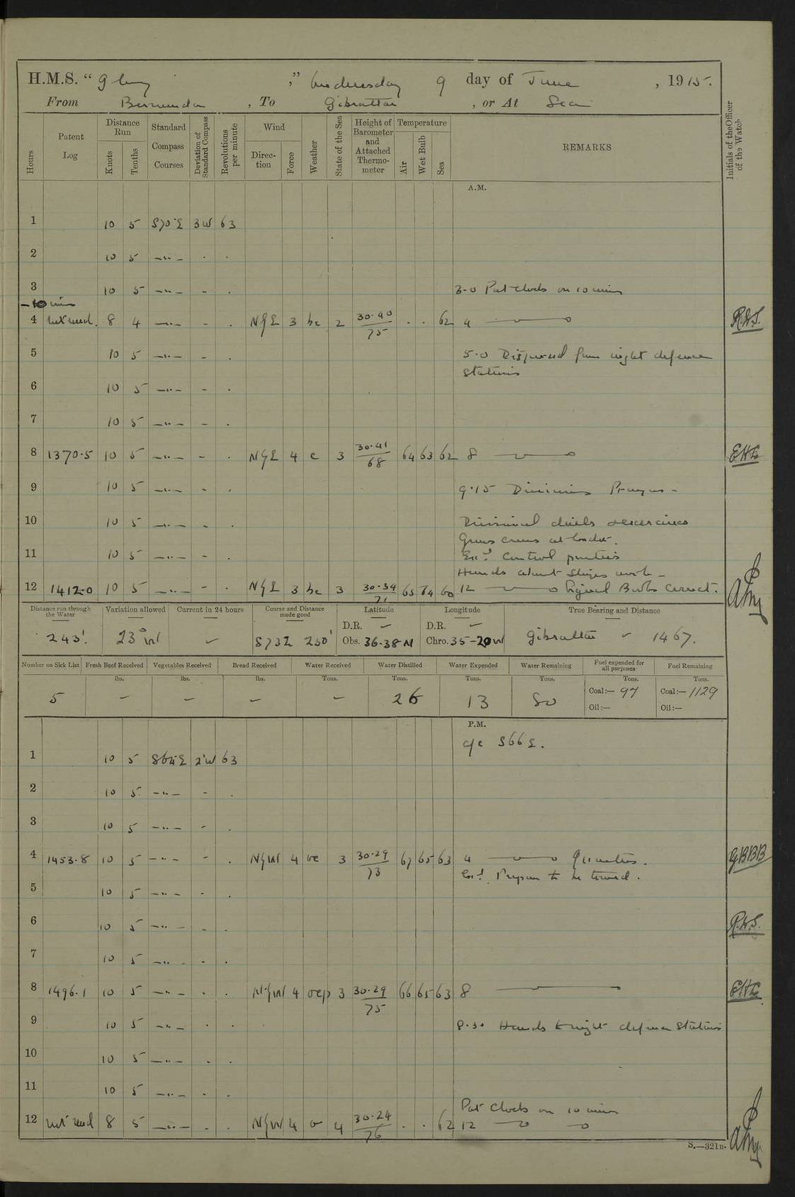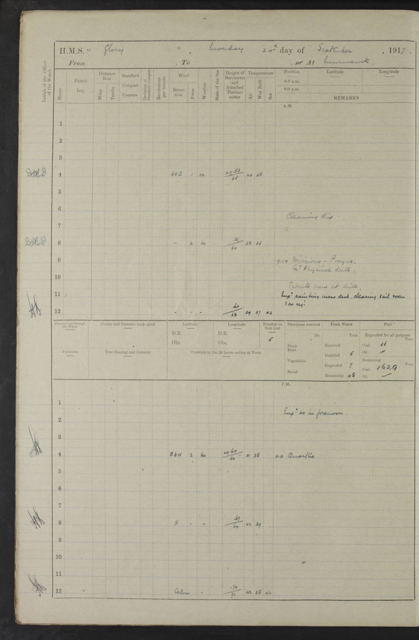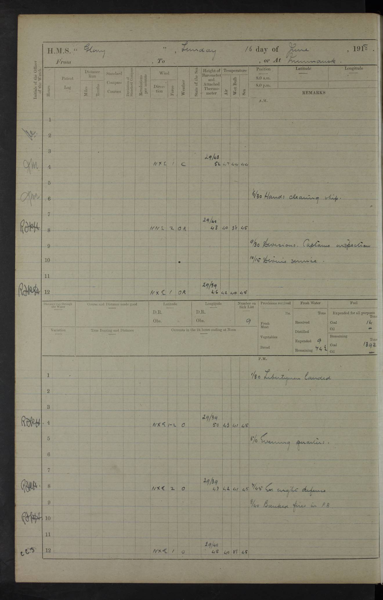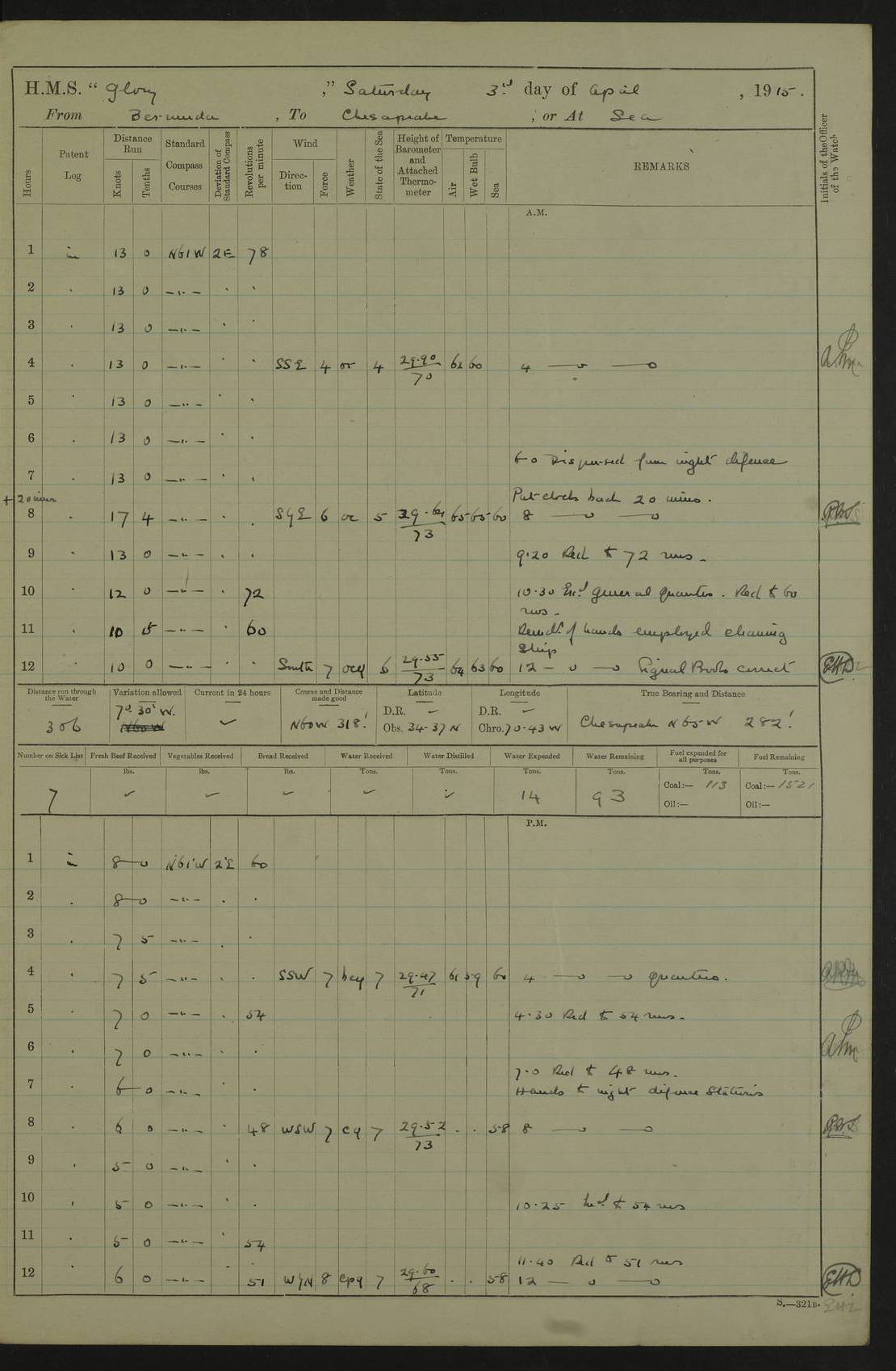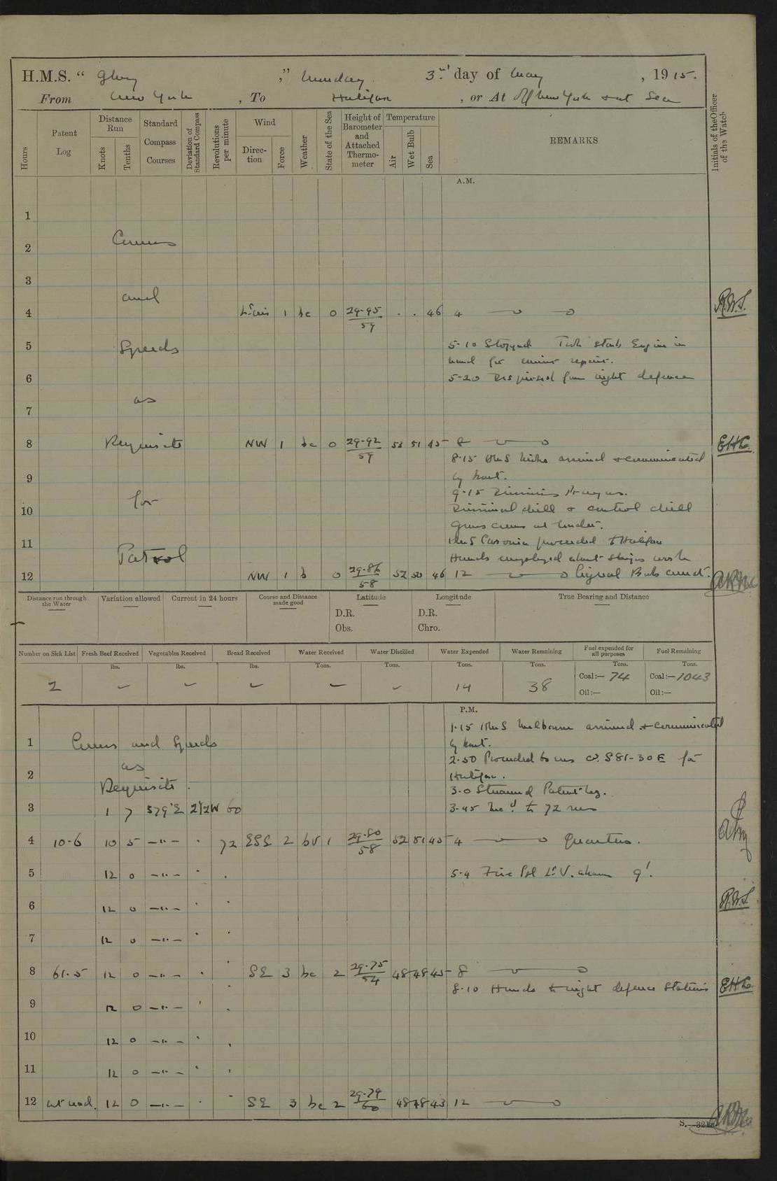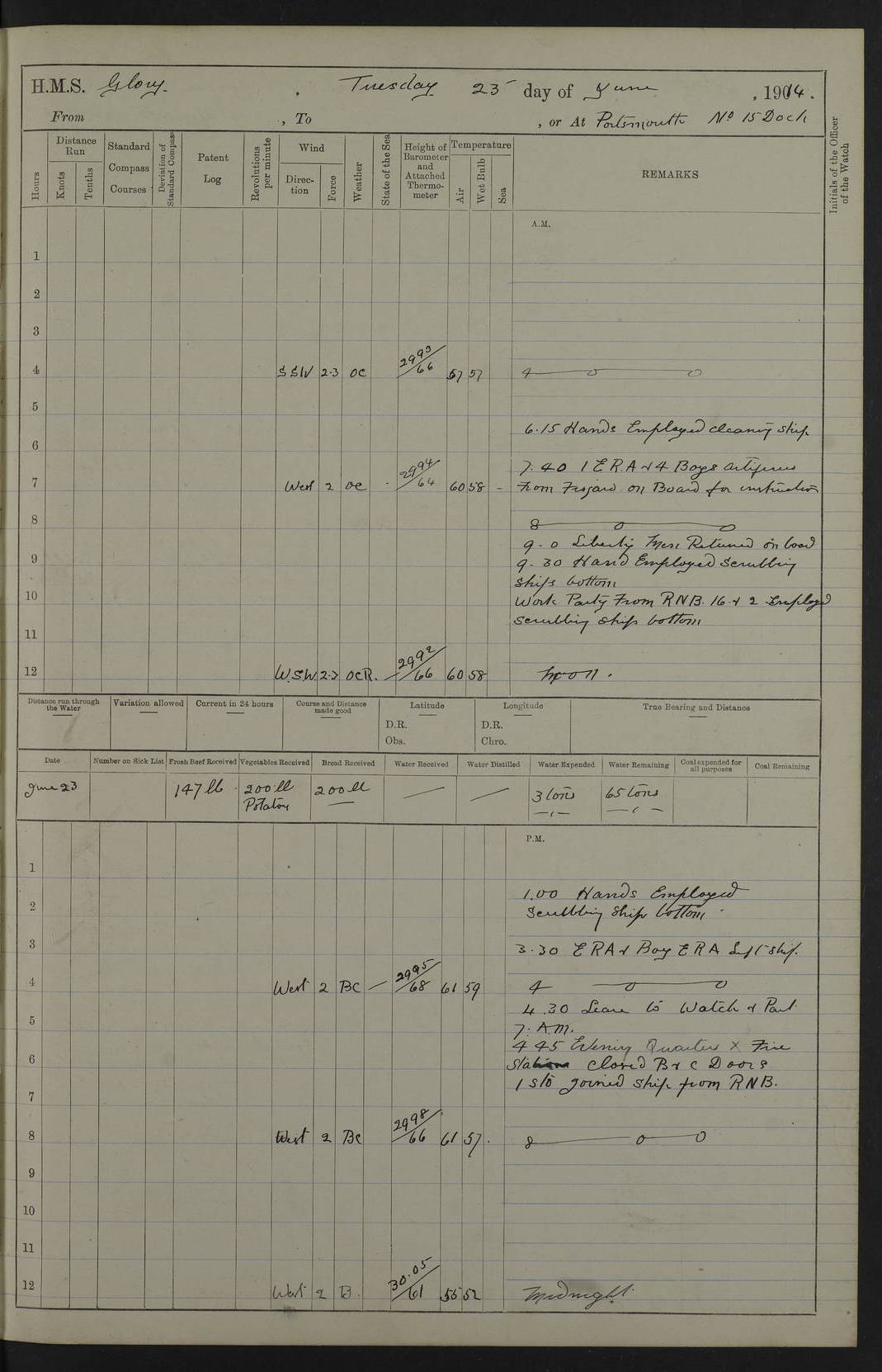 22 June 1915 At sea, Gibraltar to Lemnos Lat 36.1, Long -1.3 4.15am: Sighted land on starboard bow. 10.20am: Stopped port engine for repairs. 11.20am: proceeded with port engine. pm: a/c due to change in deviation. 10.00pm: Cape Tenez Light abeam, 18 miles. 4f73cd61a2fc8ea9030015f6: (https://s3.amazonaws.com:443/oldweather/ADM53-43015/0012_1.jpg) 23 June 1915 At sea, Gibraltar to Lemnos Lat 37.5, Long 4.8 Number on sick list: 4 5.00am: Secured from night defence stations. Placed anti-submarine guns. pm: Life saving appliances served out to men stationed in ? ?at abandon ship. 4f73cd61a2fc8ea9030015f7: (https://s3.amazonaws.com:443/oldweather/ADM53-43015/0013_0.jpg) 24 June 1915 At sea, Gibraltar to Lemnos Lat 37.4, Long 10.8 Position in log clearly bears no resemblance to the location of the ship. Position above is approximate and is based sighting of Zembra Island at 11.55am. 5.00am: Dispersed from night defence stations. Manned anti-submarine guns. am: Sighted two French torpedo boats. am: Torpedo boats passed to ~ No 362, 363. am: Sighted land on starboard beam. 11.55am: Zembra Island abeam, 25 miles. 2.00pm: Sighted Pantellaria S34ºE. 4.45pm: Pantellaria Light House abeam 12 miles. 4f73cd61a2fc8ea9030015f8: (https://s3.amazonaws.com:443/oldweather/ADM53-43015/0013_1.jpg) 25 June 1915 At sea, Gibraltar to Lemnos Lat 35.5, Long 16.7 2.10am: Gozo Light abeam 17 miles. 5.00am: Dispersed from night defence stations. Manned anti-submarine guns. 4f73cd61a2fc8ea9030015f9: (https://s3.amazonaws.com:443/oldweather/ADM53-43015/0014_0.jpg) 26 June 1915 At sea, Gibraltar to Lemnos Lat 35.5, Long 22.6 Number on sick list: 5 5.00am: Dispersed from night defence stations. Manned anti-submarine guns. am: Aired night clothing. am: marines at maxim practice on quarter deck. 2.00pm: Observed land on either bow. 3.00pm: Sighted French patrol destroyer. 4.15pm: Sighted French patrol destroyer. 9.40pm: Milo Peak N63ºW. 10.26pm: Polino Light abeam to port 5.5 miles. 4f73cd62a2fc8ea9030015fa: (https://s3.amazonaws.com:443/oldweather/ADM53-43015/0014_1.jpg) 27 June 1915 At sea and at Lemnos Lat 39.1, Long 24.4 From 0.50 to 3.05am sighting of multiple light houses. 3.50am: a/c to N39ºW and commenced to zig-zag. 5.00am: Dispersed from night defence stations and placed anti-submarine guns and look-outs. am: Lost overboard by accident Hazlewood fender, pat. 311, one in number. 10.30am: Held Divine Service onboard. pm: Met and signalled HMS Minerva on patrol duty. pm: Courses and speeds as requisite while waiting orders to approach Mudros. 3.00pm: Proceeded. 5.16pm: Increased to 90 revs, commenced to zig-zag. Course as requisite for Mudros. 7.00pm: Entered Mudros Bay. 7.47pm: Stopped. Let go port anchor in ‘M3’. 8.30pm: Darkened ship. pm: Manned one 6” and one 12 pdr. 4f73cd62a2fc8ea9030015fb: (https://s3.amazonaws.com:443/oldweather/ADM53-43015/0015_0.jpg) 28 June 1915 Mudros Bay, Lemnos Lat 39.89, Long 25.24 5,00am: HMS Vengeance entered harbour. HMS Vengeance was a pre-dreadnought of the Canopus class, launched in 1899 at Vickers, Barrow, and sold for scrapping in 1921. Details at http://en.wikipedia.org/wiki/HMS_Vengeance_(1899) . am/pm/: hands preparing for coaling and about ship’s work. pm: Collier Wabana secured alongside. 4f73cd62a2fc8ea9030015fc: (https://s3.amazonaws.com:443/oldweather/ADM53-43015/0015_1.jpg) 29 June 1915 Mudros Bay, Lemnos Lat 39.89, Long 25.24 5.15am: Commenced coaling. 2.00pm: Finished coaling. Collier left. 4f73cd62a2fc8ea9030015fd: (https://s3.amazonaws.com:443/oldweather/ADM53-43015/0016_0.jpg) 30 June 1915 Mudros Bay, Lemnos Lat 39.89, Long 25.24 am: Parties away sanding, and with fire engines onshore. am: Boats away disembarking troops. am: French Flagship Patrie sailed. The Patrie was a French pre-dreadnought, launched at La Seyne shipyard in 1903, and stricken in 1921. Details at http://en.wikipedia.org/wiki/French_battleship_Patrie . 6.30pm: Hands to bathe. 4f73cd63a2fc8ea9030015fe: (https://s3.amazonaws.com:443/oldweather/ADM53-43015/0016_1.jpg) 4f73cd63a2fc8ea9030015ff: (https://s3.amazonaws.com:443/oldweather/ADM53-43015/0017_0.jpg) 4f73cd63a2fc8ea903001600: (https://s3.amazonaws.com:443/oldweather/ADM53-43015/0017_1.jpg) 4f73cd63a2fc8ea903001601: (https://s3.amazonaws.com:443/oldweather/ADM53-43015/0018_0.jpg) 4f73cd64a2fc8ea903001602: (https://s3.amazonaws.com:443/oldweather/ADM53-43015/0018_1.jpg) LOGS FOR JULY 1915 From July to October 1915, HMS Glory spent her time at Port Mudros. Certain activities typically took place daily and are not generally noted in the pages below. These activities include: Lighting fires in the picket boat around 4am and drawing the fires in the late evening; Divisions at around 9–9.30am and Evening Quarters at 4pm; Darken ship at around 8.30pm; Daily ‘cleaning ship’, with variations thereof; SBC (for ‘Signal Books Correct’) at the watch changes. 4f73cd64a2fc8ea903001603: (https://s3.amazonaws.com:443/oldweather/ADM53-43016/0000_0.jpg) 4f73cd64a2fc8ea903001604: (https://s3.amazonaws.com:443/oldweather/ADM53-43016/0000_1.jpg) 4f73cd65a2fc8ea903001605: (https://s3.amazonaws.com:443/oldweather/ADM53-43016/0001_0.jpg) 4f73cd65a2fc8ea903001606: (https://s3.amazonaws.com:443/oldweather/ADM53-43016/0001_1.jpg) 1 July 1915 Port Mudros Lat 39.89, Long 25.24 6.30am: Landed working parties preparing boom defence ships. am: Discharged Acting Commander Rayne to Hector. Hector was a kite balloon ship. No further details readily available. 5.00pm: Tug T.10 made fast astern. 7.15pm: HMS Venerable went out. 7.30pm: HMS Chatham went out. HMS Chatham was a ‘Town’ cruiser and lead ship of her class. She was launched in 1911 at Chatham Dockyard and sold in 1926. Details at http://en.wikipedia.org/wiki/HMS_Chatham_(1911) . 4f73cd65a2fc8ea903001607: (https://s3.amazonaws.com:443/oldweather/ADM53-43016/0002_0.jpg) 2 July 1915 Port Mudros Lat 39.89, Long 25.24 5.35am: Landed working parties preparing boom defence ships. am/pm: Boom defence par