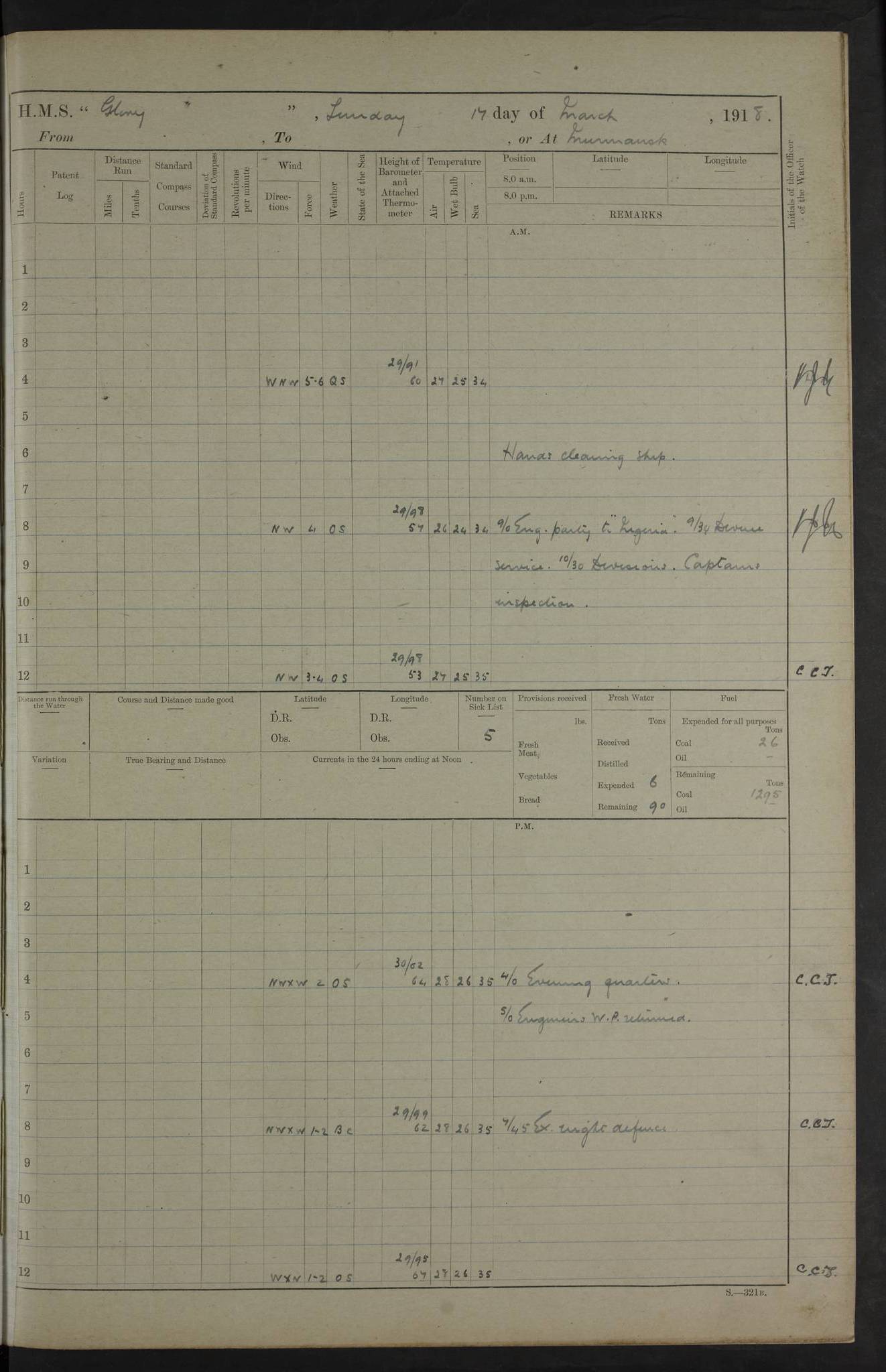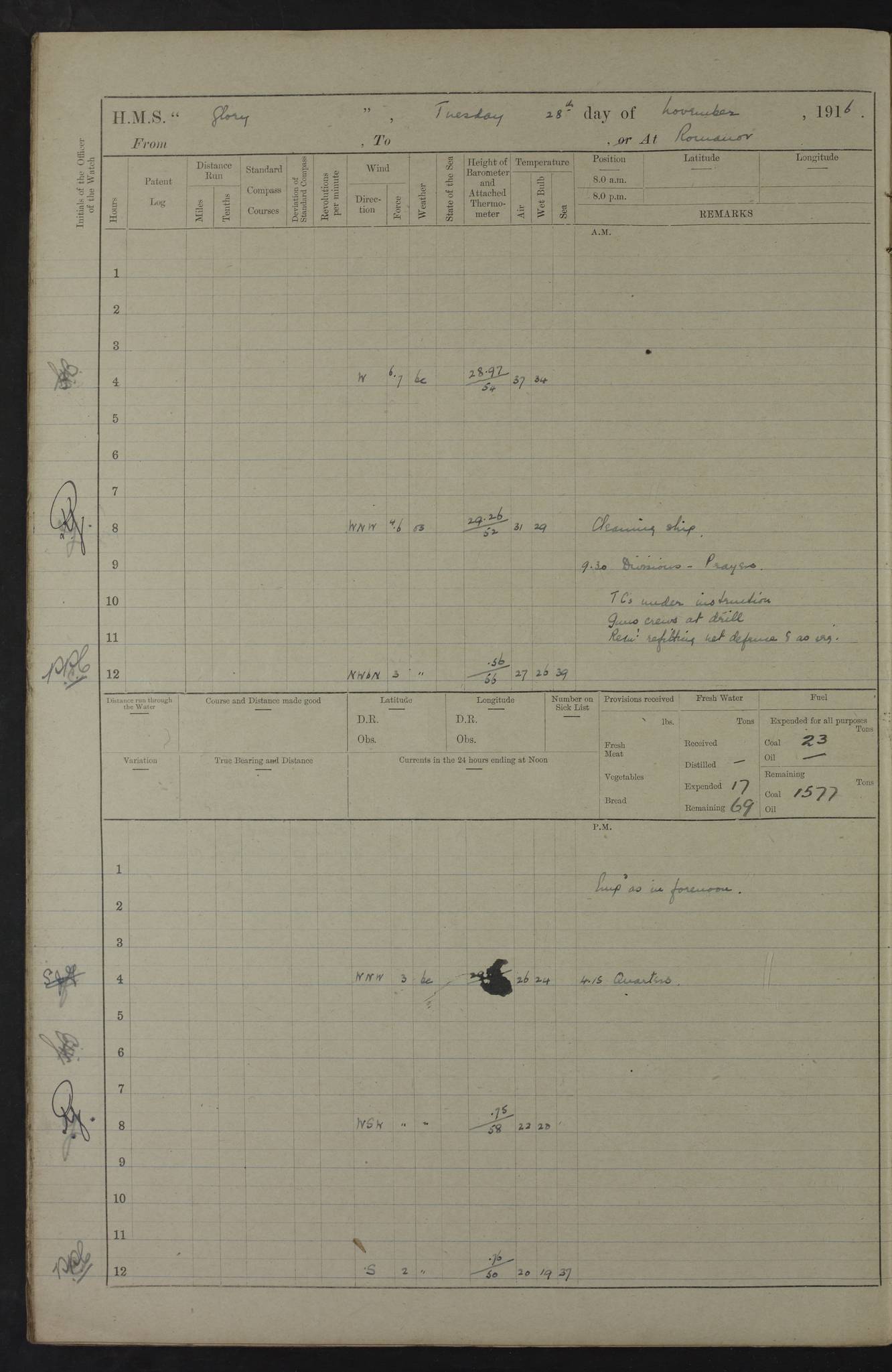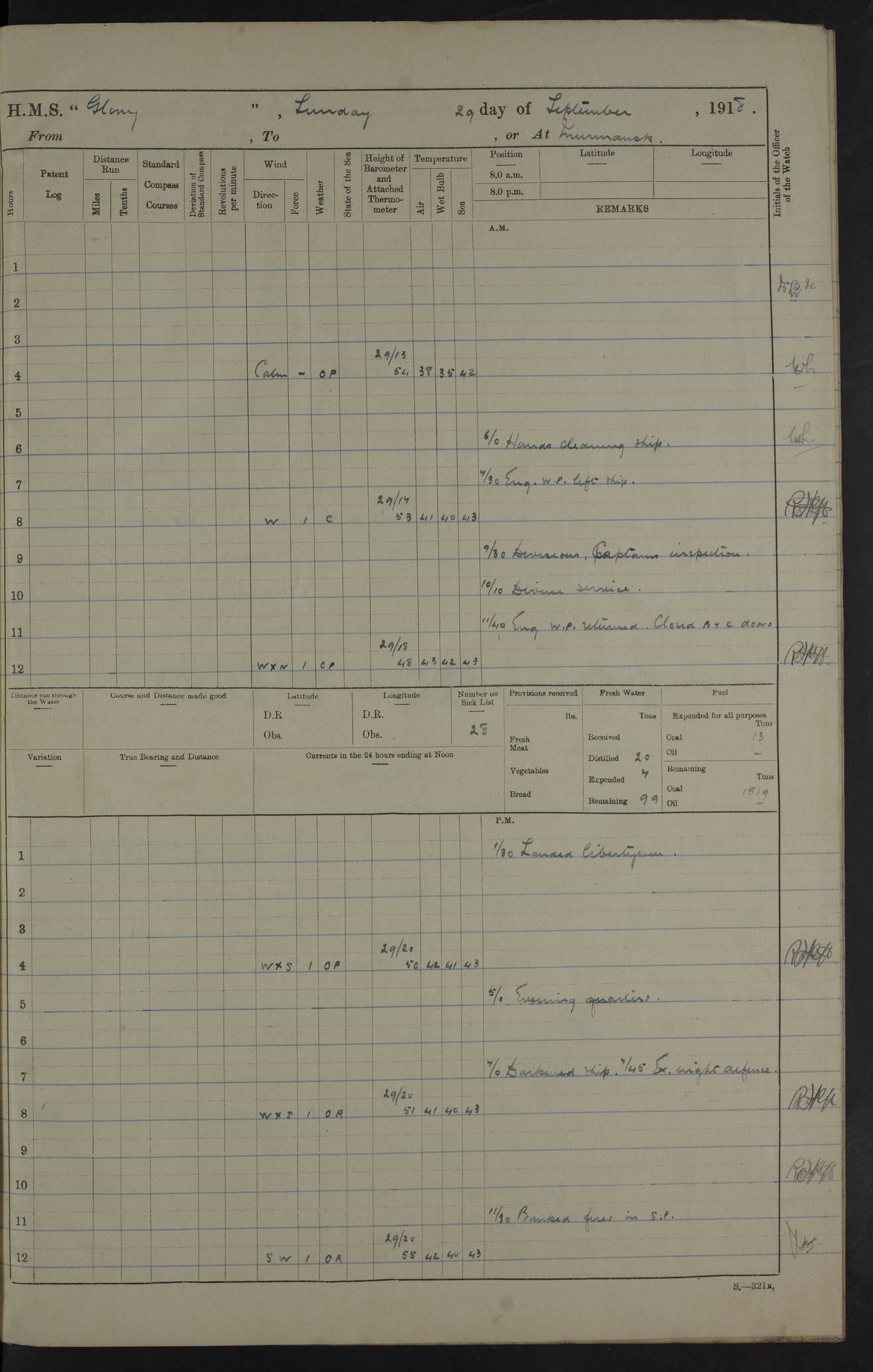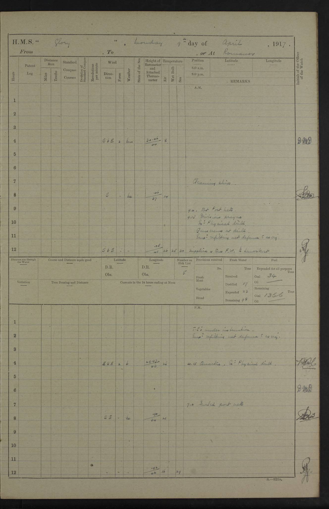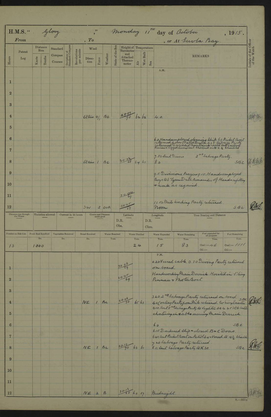 22 June 1915 At sea, Gibraltar to Lemnos Lat 36.1, Long -1.3 4.15am: Sighted land on starboard bow. 10.20am: Stopped port engine for repairs. 11.20am: proceeded with port engine. pm: a/c due to change in deviation. 10.00pm: Cape Tenez Light abeam, 18 miles. 4f73cd61a2fc8ea9030015f6: (https://s3.amazonaws.com:443/oldweather/ADM53-43015/0012_1.jpg) 23 June 1915 At sea, Gibraltar to Lemnos Lat 37.5, Long 4.8 Number on sick list: 4 5.00am: Secured from night defence stations. Placed anti-submarine guns. pm: Life saving appliances served out to men stationed in ? ?at abandon ship. 4f73cd61a2fc8ea9030015f7: (https://s3.amazonaws.com:443/oldweather/ADM53-43015/0013_0.jpg) 24 June 1915 At sea, Gibraltar to Lemnos Lat 37.4, Long 10.8 Position in log clearly bears no resemblance to the location of the ship. Position above is approximate and is based sighting of Zembra Island at 11.55am. 5.00am: Dispersed from night defence stations. Manned anti-submarine guns. am: Sighted two French torpedo boats. am: Torpedo boats passed to ~ No 362, 363. am: Sighted land on starboard beam. 11.55am: Zembra Island abeam, 25 miles. 2.00pm: Sighted Pantellaria S34ºE. 4.45pm: Pantellaria Light House abeam 12 miles. 4f73cd61a2fc8ea9030015f8: (https://s3.amazonaws.com:443/oldweather/ADM53-43015/0013_1.jpg) 25 June 1915 At sea, Gibraltar to Lemnos Lat 35.5, Long 16.7 2.10am: Gozo Light abeam 17 miles. 5.00am: Dispersed from night defence stations. Manned anti-submarine guns. 4f73cd61a2fc8ea9030015f9: (https://s3.amazonaws.com:443/oldweather/ADM53-43015/0014_0.jpg) 26 June 1915 At sea, Gibraltar to Lemnos Lat 35.5, Long 22.6 Number on sick list: 5 5.00am: Dispersed from night defence stations. Manned anti-submarine guns. am: Aired night clothing. am: marines at maxim practice on quarter deck. 2.00pm: Observed land on either bow. 3.00pm: Sighted French patrol destroyer. 4.15pm: Sighted French patrol destroyer. 9.40pm: Milo Peak N63ºW. 10.26pm: Polino Light abeam to port 5.5 miles. 4f73cd62a2fc8ea9030015fa: (https://s3.amazonaws.com:443/oldweather/ADM53-43015/0014_1.jpg) 27 June 1915 At sea and at Lemnos Lat 39.1, Long 24.4 From 0.50 to 3.05am sighting of multiple light houses. 3.50am: a/c to N39ºW and commenced to zig-zag. 5.00am: Dispersed from night defence stations and placed anti-submarine guns and look-outs. am: Lost overboard by accident Hazlewood fender, pat. 311, one in number. 10.30am: Held Divine Service onboard. pm: Met and signalled HMS Minerva on patrol duty. pm: Courses and speeds as requisite while waiting orders to approach Mudros. 3.00pm: Proceeded. 5.16pm: Increased to 90 revs, commenced to zig-zag. Course as requisite for Mudros. 7.00pm: Entered Mudros Bay. 7.47pm: Stopped. Let go port anchor in ‘M3’. 8.30pm: Darkened ship. pm: Manned one 6” and one 12 pdr. 4f73cd62a2fc8ea9030015fb: (https://s3.amazonaws.com:443/oldweather/ADM53-43015/0015_0.jpg) 28 June 1915 Mudros Bay, Lemnos Lat 39.89, Long 25.24 5,00am: HMS Vengeance entered harbour. HMS Vengeance was a pre-dreadnought of the Canopus class, launched in 1899 at Vickers, Barrow, and sold for scrapping in 1921. Details at http://en.wikipedia.org/wiki/HMS_Vengeance_(1899) . am/pm/: hands preparing for coaling and about ship’s work. pm: Collier Wabana secured alongside. 4f73cd62a2fc8ea9030015fc: (https://s3.amazonaws.com:443/oldweather/ADM53-43015/0015_1.jpg) 29 June 1915 Mudros Bay, Lemnos Lat 39.89, Long 25.24 5.15am: Commenced coaling. 2.00pm: Finished coaling. Collier left. 4f73cd62a2fc8ea9030015fd: (https://s3.amazonaws.com:443/oldweather/ADM53-43015/0016_0.jpg) 30 June 1915 Mudros Bay, Lemnos Lat 39.89, Long 25.24 am: Parties away sanding, and with fire engines onshore. am: Boats away disembarking troops. am: French Flagship Patrie sailed. The Patrie was a French pre-dreadnought, launched at La Seyne shipyard in 1903, and stricken in 1921. Details at http://en.wikipedia.org/wiki/French_battleship_Patrie . 6.30pm: Hands to bathe. 4f73cd63a2fc8ea9030015fe: (https://s3.amazonaws.com:443/oldweather/ADM53-43015/0016_1.jpg) 4f73cd63a2fc8ea9030015ff: (https://s3.amazonaws.com:443/oldweather/ADM53-43015/0017_0.jpg) 4f73cd63a2fc8ea903001600: (https://s3.amazonaws.com:443/oldweather/ADM53-43015/0017_1.jpg) 4f73cd63a2fc8ea903001601: (https://s3.amazonaws.com:443/oldweather/ADM53-43015/0018_0.jpg) 4f73cd64a2fc8ea903001602: (https://s3.amazonaws.com:443/oldweather/ADM53-43015/0018_1.jpg) LOGS FOR JULY 1915 From July to October 1915, HMS Glory spent her time at Port Mudros. Certain activities typically took place daily and are not generally noted in the pages below. These activities include: Lighting fires in the picket boat around 4am and drawing the fires in the late evening; Divisions at around 9–9.30am and Evening Quarters at 4pm; Darken ship at around 8.30pm; Daily ‘cleaning ship’, with variations thereof; SBC (for ‘Signal Books Correct’) at the watch changes. 4f73cd64a2fc8ea903001603: (https://s3.amazonaws.com:443/oldweather/ADM53-43016/0000_0.jpg) 4f73cd64a2fc8ea903001604: (https://s3.amazonaws.com:443/oldweather/ADM53-43016/0000_1.jpg) 4f73cd65a2fc8ea903001605: (https://s3.amazonaws.com:443/oldweather/ADM53-43016/0001_0.jpg) 4f73cd65a2fc8ea903001606: (https://s3.amazonaws.com:443/oldweather/ADM53-43016/0001_1.jpg) 1 July 1915 Port Mudros Lat 39.89, Long 25.24 6.30am: Landed working parties preparing boom defence ships. am: Discharged Acting Commander Rayne to Hector. Hector was a kite balloon ship. No further details readily available. 5.00pm: Tug T.10 made fast astern. 7.15pm: HMS Venerable went out. 7.30pm: HMS Chatham went out. HMS Chatham was a ‘Town’ cruiser and lead ship of her class. She was launched in 1911 at Chatham Dockyard and sold in 1926. Details at http://en.wikipedia.org/wiki/HMS_Chatham_(1911) . 4f73cd65a2fc8ea903001607: (https://s3.amazonaws.com:443/oldweather/ADM53-43016/0002_0.jpg) 2 July 1915 Port Mudros Lat 39.89, Long 25.24 5.35am: Landed working parties preparing boom defence ships. am/pm: Boom defence par