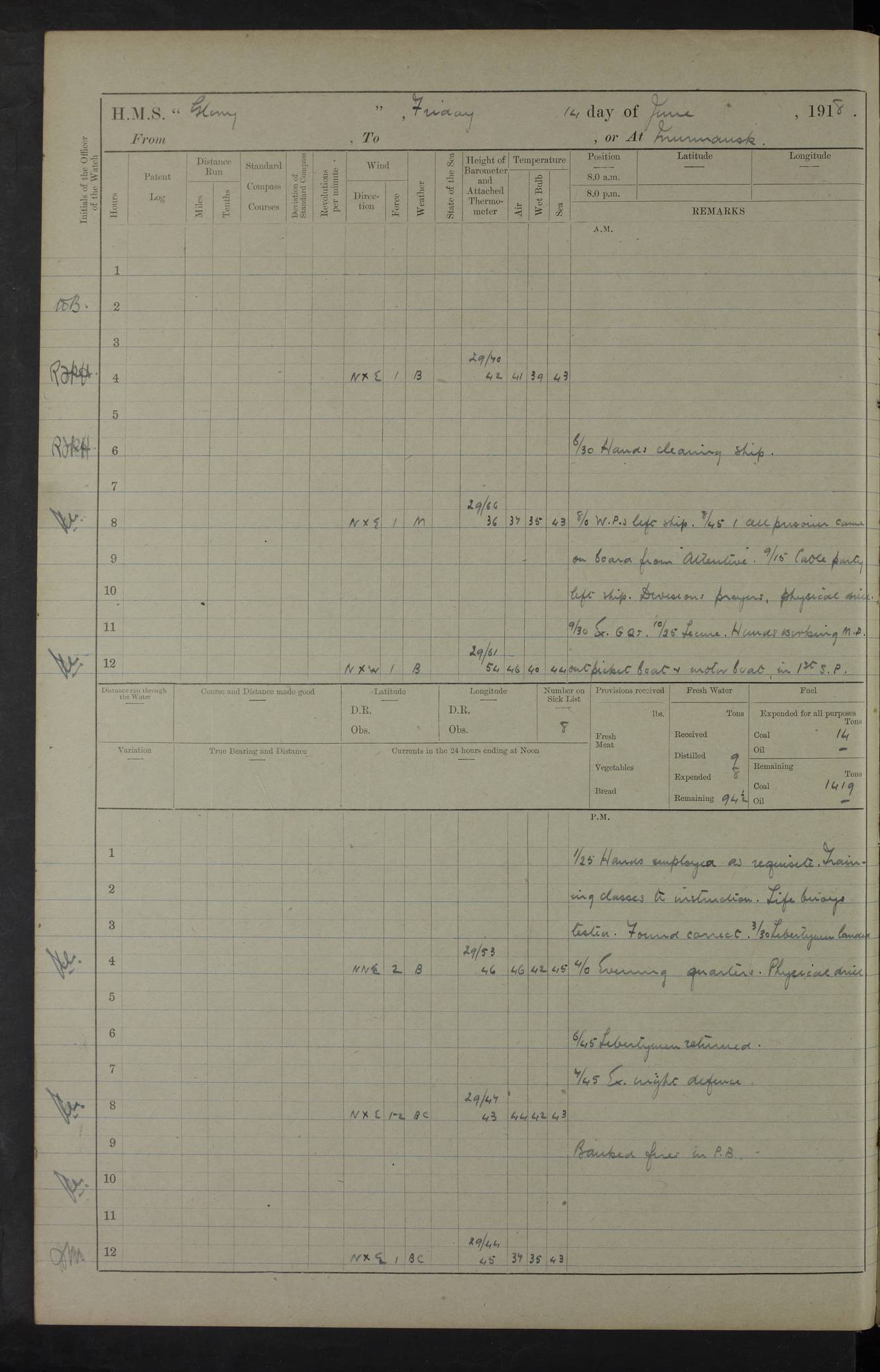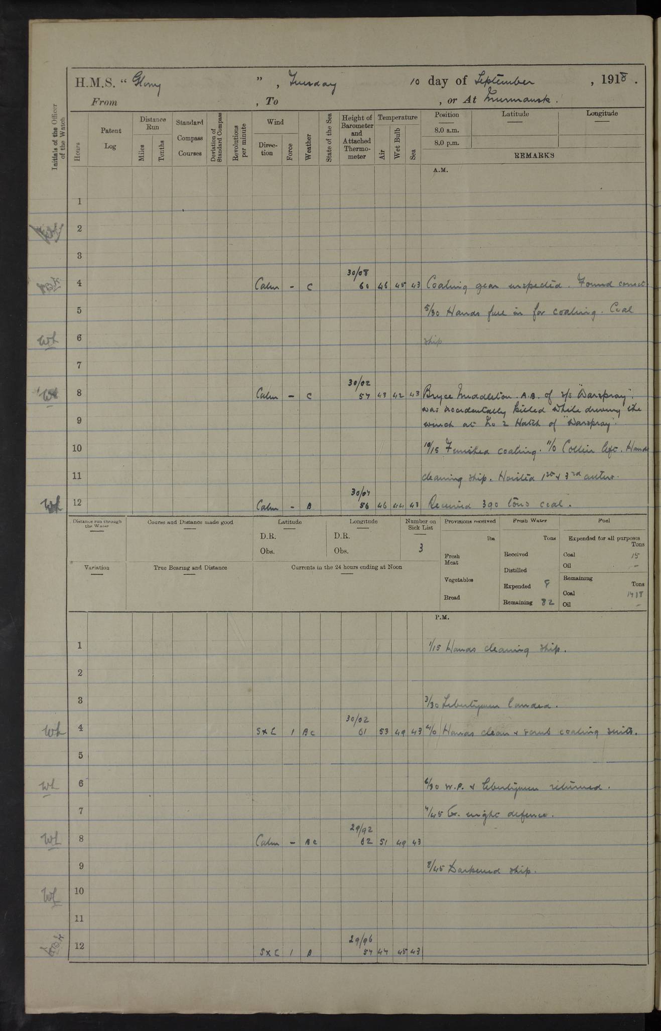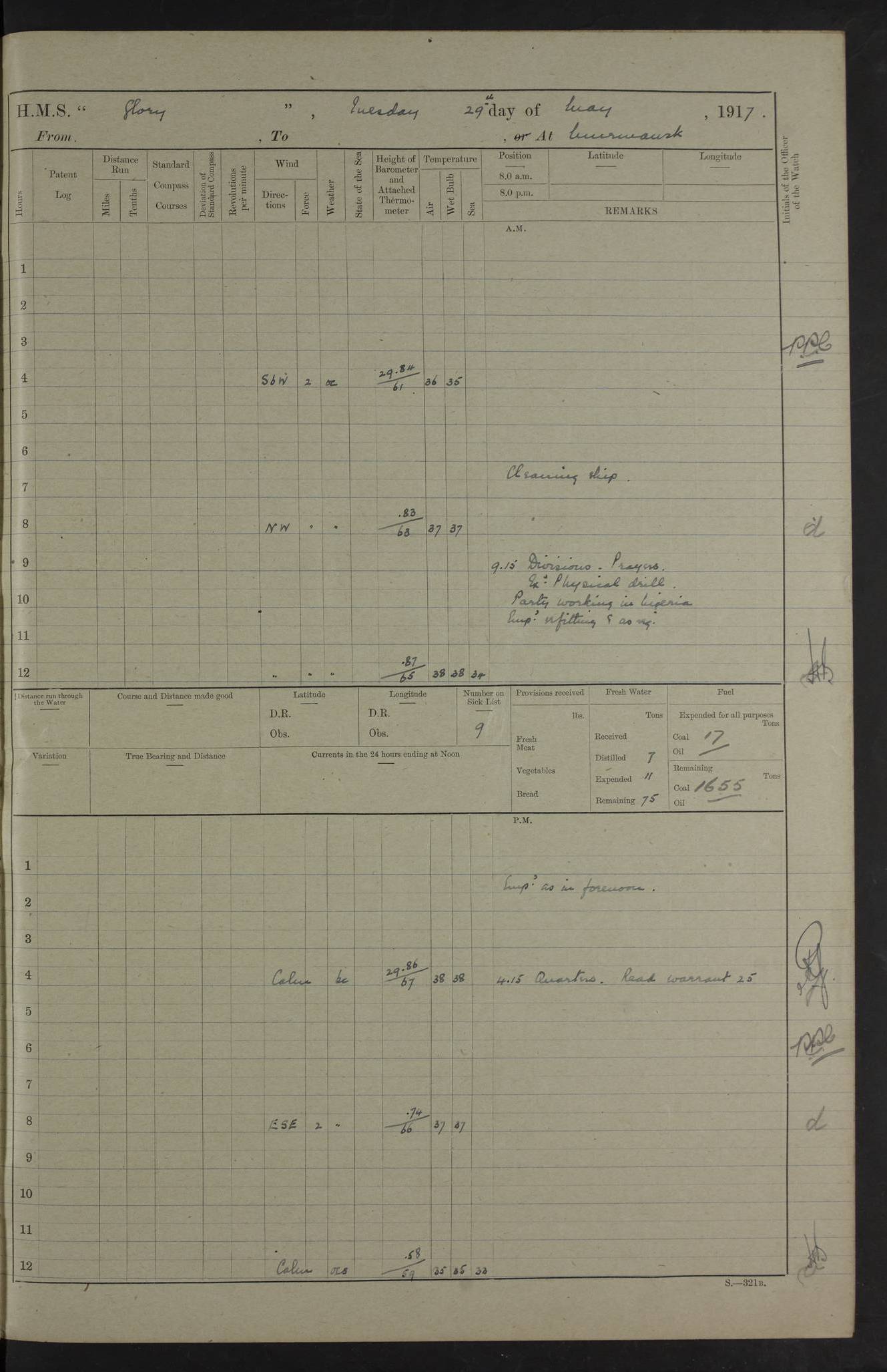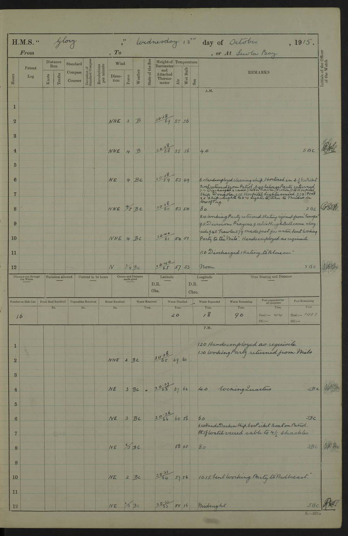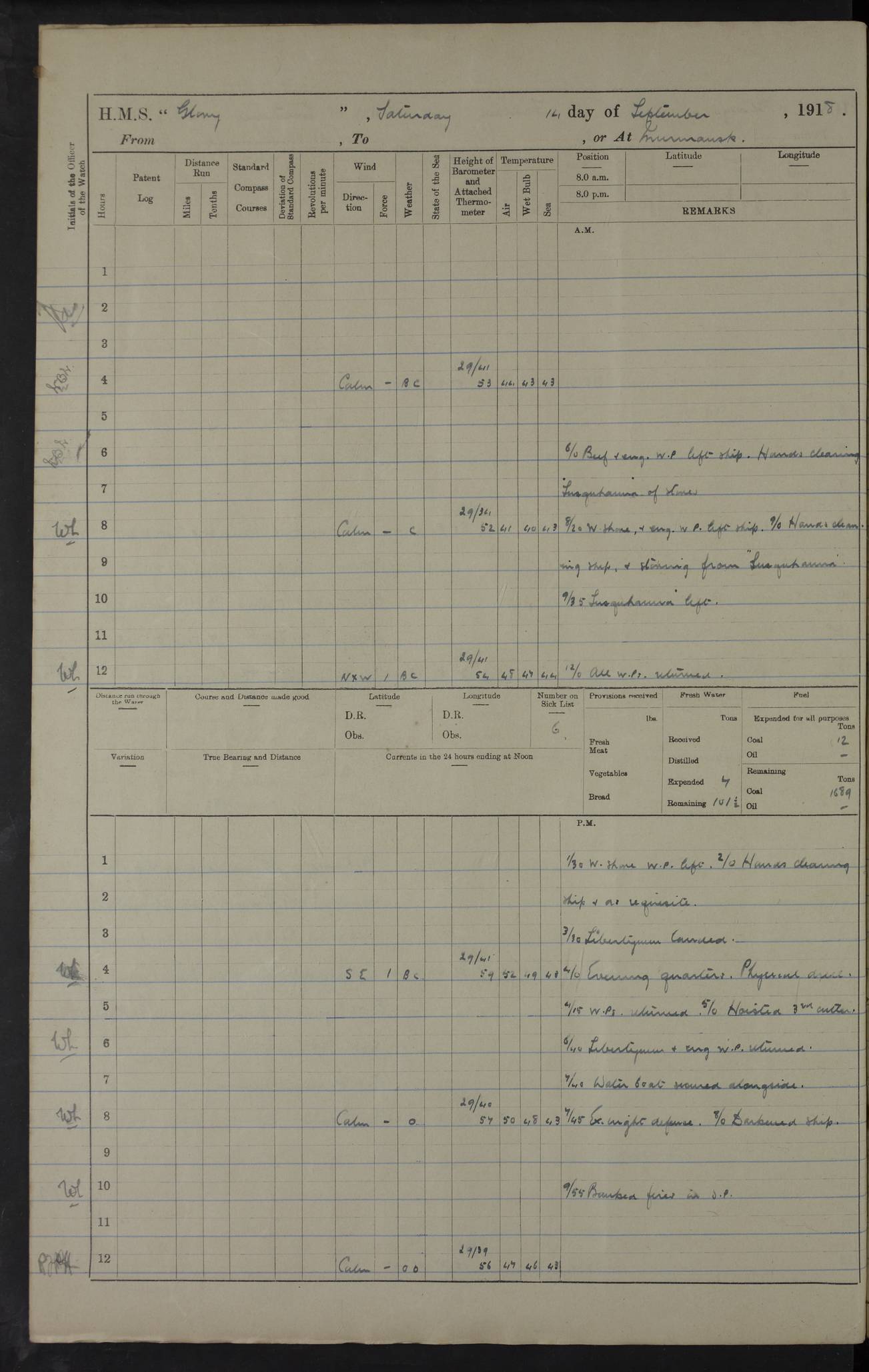 22 June 1915 At sea, Gibraltar to Lemnos Lat 36.1, Long -1.3 4.15am: Sighted land on starboard bow. 10.20am: Stopped port engine for repairs. 11.20am: proceeded with port engine. pm: a/c due to change in deviation. 10.00pm: Cape Tenez Light abeam, 18 miles. 4f73cd61a2fc8ea9030015f6: (https://s3.amazonaws.com:443/oldweather/ADM53-43015/0012_1.jpg) 23 June 1915 At sea, Gibraltar to Lemnos Lat 37.5, Long 4.8 Number on sick list: 4 5.00am: Secured from night defence stations. Placed anti-submarine guns. pm: Life saving appliances served out to men stationed in ? ?at abandon ship. 4f73cd61a2fc8ea9030015f7: (https://s3.amazonaws.com:443/oldweather/ADM53-43015/0013_0.jpg) 24 June 1915 At sea, Gibraltar to Lemnos Lat 37.4, Long 10.8 Position in log clearly bears no resemblance to the location of the ship. Position above is approximate and is based sighting of Zembra Island at 11.55am. 5.00am: Dispersed from night defence stations. Manned anti-submarine guns. am: Sighted two French torpedo boats. am: Torpedo boats passed to ~ No 362, 363. am: Sighted land on starboard beam. 11.55am: Zembra Island abeam, 25 miles. 2.00pm: Sighted Pantellaria S34ºE. 4.45pm: Pantellaria Light House abeam 12 miles. 4f73cd61a2fc8ea9030015f8: (https://s3.amazonaws.com:443/oldweather/ADM53-43015/0013_1.jpg) 25 June 1915 At sea, Gibraltar to Lemnos Lat 35.5, Long 16.7 2.10am: Gozo Light abeam 17 miles. 5.00am: Dispersed from night defence stations. Manned anti-submarine guns. 4f73cd61a2fc8ea9030015f9: (https://s3.amazonaws.com:443/oldweather/ADM53-43015/0014_0.jpg) 26 June 1915 At sea, Gibraltar to Lemnos Lat 35.5, Long 22.6 Number on sick list: 5 5.00am: Dispersed from night defence stations. Manned anti-submarine guns. am: Aired night clothing. am: marines at maxim practice on quarter deck. 2.00pm: Observed land on either bow. 3.00pm: Sighted French patrol destroyer. 4.15pm: Sighted French patrol destroyer. 9.40pm: Milo Peak N63ºW. 10.26pm: Polino Light abeam to port 5.5 miles. 4f73cd62a2fc8ea9030015fa: (https://s3.amazonaws.com:443/oldweather/ADM53-43015/0014_1.jpg) 27 June 1915 At sea and at Lemnos Lat 39.1, Long 24.4 From 0.50 to 3.05am sighting of multiple light houses. 3.50am: a/c to N39ºW and commenced to zig-zag. 5.00am: Dispersed from night defence stations and placed anti-submarine guns and look-outs. am: Lost overboard by accident Hazlewood fender, pat. 311, one in number. 10.30am: Held Divine Service onboard. pm: Met and signalled HMS Minerva on patrol duty. pm: Courses and speeds as requisite while waiting orders to approach Mudros. 3.00pm: Proceeded. 5.16pm: Increased to 90 revs, commenced to zig-zag. Course as requisite for Mudros. 7.00pm: Entered Mudros Bay. 7.47pm: Stopped. Let go port anchor in ‘M3’. 8.30pm: Darkened ship. pm: Manned one 6” and one 12 pdr. 4f73cd62a2fc8ea9030015fb: (https://s3.amazonaws.com:443/oldweather/ADM53-43015/0015_0.jpg) 28 June 1915 Mudros Bay, Lemnos Lat 39.89, Long 25.24 5,00am: HMS Vengeance entered harbour. HMS Vengeance was a pre-dreadnought of the Canopus class, launched in 1899 at Vickers, Barrow, and sold for scrapping in 1921. Details at http://en.wikipedia.org/wiki/HMS_Vengeance_(1899) . am/pm/: hands preparing for coaling and about ship’s work. pm: Collier Wabana secured alongside. 4f73cd62a2fc8ea9030015fc: (https://s3.amazonaws.com:443/oldweather/ADM53-43015/0015_1.jpg) 29 June 1915 Mudros Bay, Lemnos Lat 39.89, Long 25.24 5.15am: Commenced coaling. 2.00pm: Finished coaling. Collier left. 4f73cd62a2fc8ea9030015fd: (https://s3.amazonaws.com:443/oldweather/ADM53-43015/0016_0.jpg) 30 June 1915 Mudros Bay, Lemnos Lat 39.89, Long 25.24 am: Parties away sanding, and with fire engines onshore. am: Boats away disembarking troops. am: French Flagship Patrie sailed. The Patrie was a French pre-dreadnought, launched at La Seyne shipyard in 1903, and stricken in 1921. Details at http://en.wikipedia.org/wiki/French_battleship_Patrie . 6.30pm: Hands to bathe. 4f73cd63a2fc8ea9030015fe: (https://s3.amazonaws.com:443/oldweather/ADM53-43015/0016_1.jpg) 4f73cd63a2fc8ea9030015ff: (https://s3.amazonaws.com:443/oldweather/ADM53-43015/0017_0.jpg) 4f73cd63a2fc8ea903001600: (https://s3.amazonaws.com:443/oldweather/ADM53-43015/0017_1.jpg) 4f73cd63a2fc8ea903001601: (https://s3.amazonaws.com:443/oldweather/ADM53-43015/0018_0.jpg) 4f73cd64a2fc8ea903001602: (https://s3.amazonaws.com:443/oldweather/ADM53-43015/0018_1.jpg) LOGS FOR JULY 1915 From July to October 1915, HMS Glory spent her time at Port Mudros. Certain activities typically took place daily and are not generally noted in the pages below. These activities include: Lighting fires in the picket boat around 4am and drawing the fires in the late evening; Divisions at around 9–9.30am and Evening Quarters at 4pm; Darken ship at around 8.30pm; Daily ‘cleaning ship’, with variations thereof; SBC (for ‘Signal Books Correct’) at the watch changes. 4f73cd64a2fc8ea903001603: (https://s3.amazonaws.com:443/oldweather/ADM53-43016/0000_0.jpg) 4f73cd64a2fc8ea903001604: (https://s3.amazonaws.com:443/oldweather/ADM53-43016/0000_1.jpg) 4f73cd65a2fc8ea903001605: (https://s3.amazonaws.com:443/oldweather/ADM53-43016/0001_0.jpg) 4f73cd65a2fc8ea903001606: (https://s3.amazonaws.com:443/oldweather/ADM53-43016/0001_1.jpg) 1 July 1915 Port Mudros Lat 39.89, Long 25.24 6.30am: Landed working parties preparing boom defence ships. am: Discharged Acting Commander Rayne to Hector. Hector was a kite balloon ship. No further details readily available. 5.00pm: Tug T.10 made fast astern. 7.15pm: HMS Venerable went out. 7.30pm: HMS Chatham went out. HMS Chatham was a ‘Town’ cruiser and lead ship of her class. She was launched in 1911 at Chatham Dockyard and sold in 1926. Details at http://en.wikipedia.org/wiki/HMS_Chatham_(1911) . 4f73cd65a2fc8ea903001607: (https://s3.amazonaws.com:443/oldweather/ADM53-43016/0002_0.jpg) 2 July 1915 Port Mudros Lat 39.89, Long 25.24 5.35am: Landed working parties preparing boom defence ships. am/pm: Boom defence par