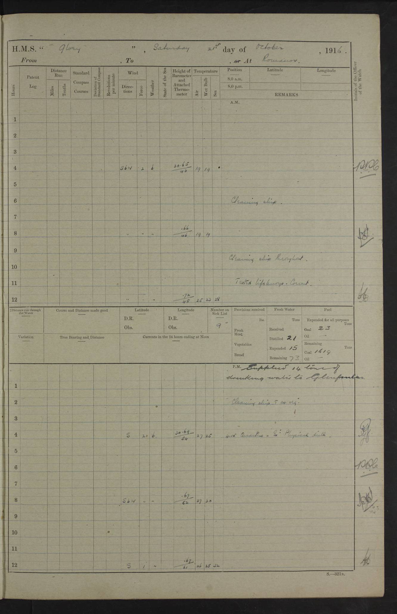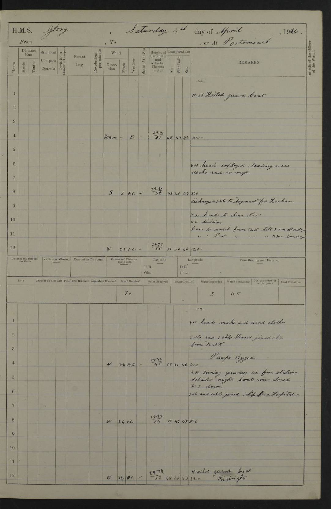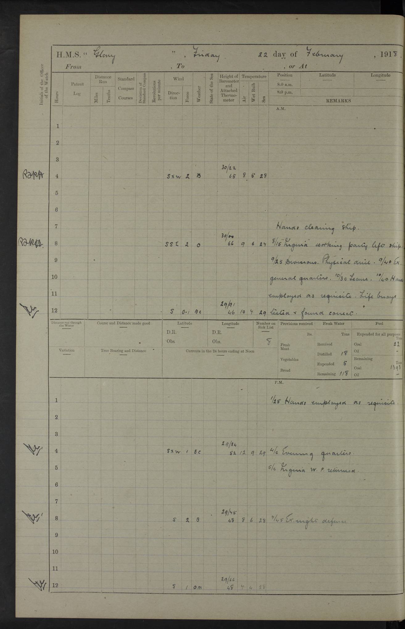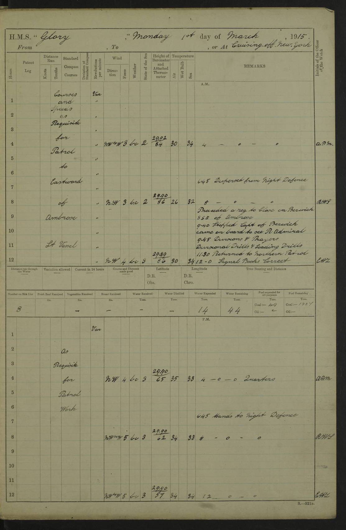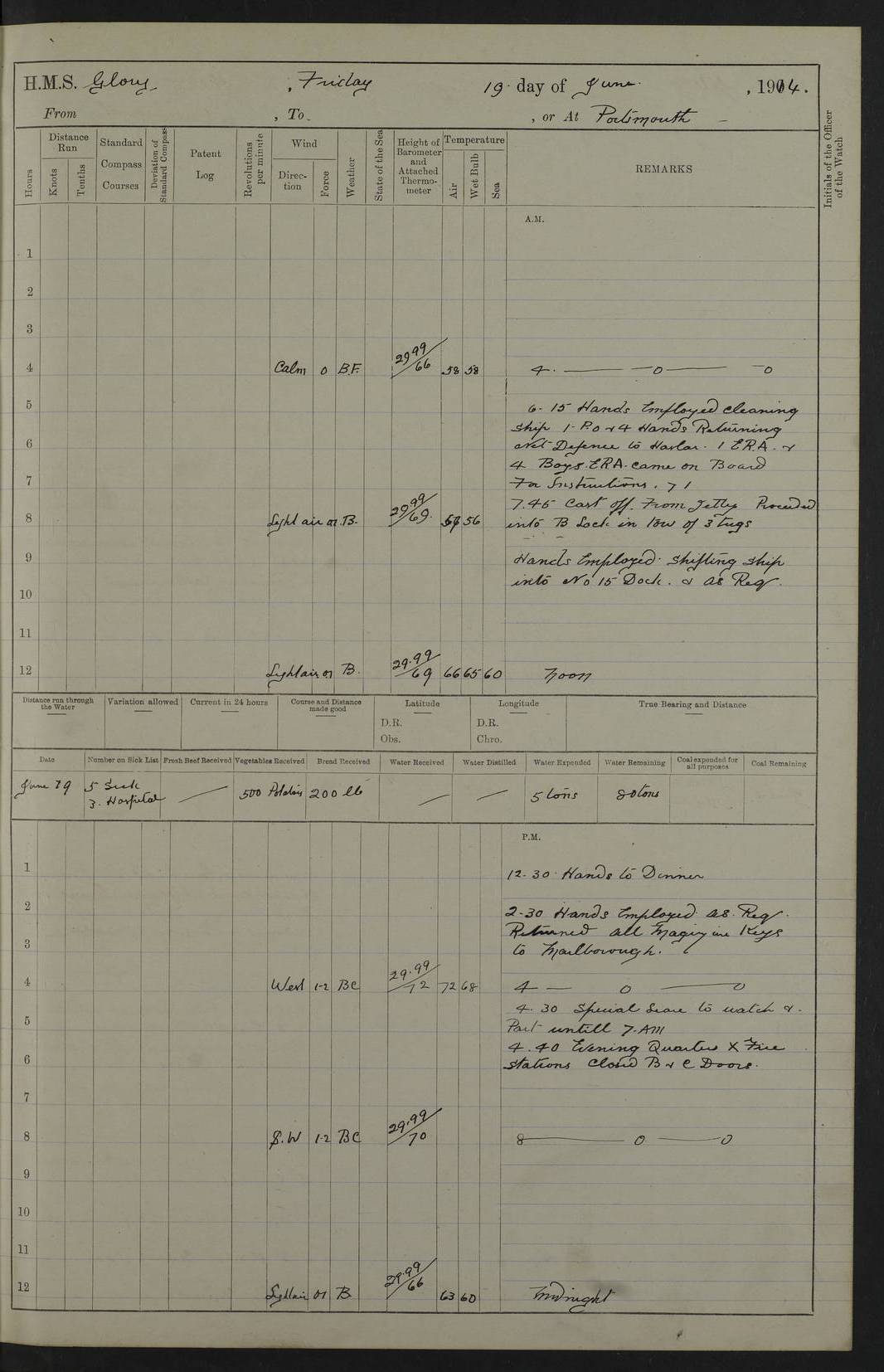 22 June 1915 At sea, Gibraltar to Lemnos Lat 36.1, Long -1.3 4.15am: Sighted land on starboard bow. 10.20am: Stopped port engine for repairs. 11.20am: proceeded with port engine. pm: a/c due to change in deviation. 10.00pm: Cape Tenez Light abeam, 18 miles. 4f73cd61a2fc8ea9030015f6: (https://s3.amazonaws.com:443/oldweather/ADM53-43015/0012_1.jpg) 23 June 1915 At sea, Gibraltar to Lemnos Lat 37.5, Long 4.8 Number on sick list: 4 5.00am: Secured from night defence stations. Placed anti-submarine guns. pm: Life saving appliances served out to men stationed in ? ?at abandon ship. 4f73cd61a2fc8ea9030015f7: (https://s3.amazonaws.com:443/oldweather/ADM53-43015/0013_0.jpg) 24 June 1915 At sea, Gibraltar to Lemnos Lat 37.4, Long 10.8 Position in log clearly bears no resemblance to the location of the ship. Position above is approximate and is based sighting of Zembra Island at 11.55am. 5.00am: Dispersed from night defence stations. Manned anti-submarine guns. am: Sighted two French torpedo boats. am: Torpedo boats passed to ~ No 362, 363. am: Sighted land on starboard beam. 11.55am: Zembra Island abeam, 25 miles. 2.00pm: Sighted Pantellaria S34ºE. 4.45pm: Pantellaria Light House abeam 12 miles. 4f73cd61a2fc8ea9030015f8: (https://s3.amazonaws.com:443/oldweather/ADM53-43015/0013_1.jpg) 25 June 1915 At sea, Gibraltar to Lemnos Lat 35.5, Long 16.7 2.10am: Gozo Light abeam 17 miles. 5.00am: Dispersed from night defence stations. Manned anti-submarine guns. 4f73cd61a2fc8ea9030015f9: (https://s3.amazonaws.com:443/oldweather/ADM53-43015/0014_0.jpg) 26 June 1915 At sea, Gibraltar to Lemnos Lat 35.5, Long 22.6 Number on sick list: 5 5.00am: Dispersed from night defence stations. Manned anti-submarine guns. am: Aired night clothing. am: marines at maxim practice on quarter deck. 2.00pm: Observed land on either bow. 3.00pm: Sighted French patrol destroyer. 4.15pm: Sighted French patrol destroyer. 9.40pm: Milo Peak N63ºW. 10.26pm: Polino Light abeam to port 5.5 miles. 4f73cd62a2fc8ea9030015fa: (https://s3.amazonaws.com:443/oldweather/ADM53-43015/0014_1.jpg) 27 June 1915 At sea and at Lemnos Lat 39.1, Long 24.4 From 0.50 to 3.05am sighting of multiple light houses. 3.50am: a/c to N39ºW and commenced to zig-zag. 5.00am: Dispersed from night defence stations and placed anti-submarine guns and look-outs. am: Lost overboard by accident Hazlewood fender, pat. 311, one in number. 10.30am: Held Divine Service onboard. pm: Met and signalled HMS Minerva on patrol duty. pm: Courses and speeds as requisite while waiting orders to approach Mudros. 3.00pm: Proceeded. 5.16pm: Increased to 90 revs, commenced to zig-zag. Course as requisite for Mudros. 7.00pm: Entered Mudros Bay. 7.47pm: Stopped. Let go port anchor in ‘M3’. 8.30pm: Darkened ship. pm: Manned one 6” and one 12 pdr. 4f73cd62a2fc8ea9030015fb: (https://s3.amazonaws.com:443/oldweather/ADM53-43015/0015_0.jpg) 28 June 1915 Mudros Bay, Lemnos Lat 39.89, Long 25.24 5,00am: HMS Vengeance entered harbour. HMS Vengeance was a pre-dreadnought of the Canopus class, launched in 1899 at Vickers, Barrow, and sold for scrapping in 1921. Details at http://en.wikipedia.org/wiki/HMS_Vengeance_(1899) . am/pm/: hands preparing for coaling and about ship’s work. pm: Collier Wabana secured alongside. 4f73cd62a2fc8ea9030015fc: (https://s3.amazonaws.com:443/oldweather/ADM53-43015/0015_1.jpg) 29 June 1915 Mudros Bay, Lemnos Lat 39.89, Long 25.24 5.15am: Commenced coaling. 2.00pm: Finished coaling. Collier left. 4f73cd62a2fc8ea9030015fd: (https://s3.amazonaws.com:443/oldweather/ADM53-43015/0016_0.jpg) 30 June 1915 Mudros Bay, Lemnos Lat 39.89, Long 25.24 am: Parties away sanding, and with fire engines onshore. am: Boats away disembarking troops. am: French Flagship Patrie sailed. The Patrie was a French pre-dreadnought, launched at La Seyne shipyard in 1903, and stricken in 1921. Details at http://en.wikipedia.org/wiki/French_battleship_Patrie . 6.30pm: Hands to bathe. 4f73cd63a2fc8ea9030015fe: (https://s3.amazonaws.com:443/oldweather/ADM53-43015/0016_1.jpg) 4f73cd63a2fc8ea9030015ff: (https://s3.amazonaws.com:443/oldweather/ADM53-43015/0017_0.jpg) 4f73cd63a2fc8ea903001600: (https://s3.amazonaws.com:443/oldweather/ADM53-43015/0017_1.jpg) 4f73cd63a2fc8ea903001601: (https://s3.amazonaws.com:443/oldweather/ADM53-43015/0018_0.jpg) 4f73cd64a2fc8ea903001602: (https://s3.amazonaws.com:443/oldweather/ADM53-43015/0018_1.jpg) LOGS FOR JULY 1915 From July to October 1915, HMS Glory spent her time at Port Mudros. Certain activities typically took place daily and are not generally noted in the pages below. These activities include: Lighting fires in the picket boat around 4am and drawing the fires in the late evening; Divisions at around 9–9.30am and Evening Quarters at 4pm; Darken ship at around 8.30pm; Daily ‘cleaning ship’, with variations thereof; SBC (for ‘Signal Books Correct’) at the watch changes. 4f73cd64a2fc8ea903001603: (https://s3.amazonaws.com:443/oldweather/ADM53-43016/0000_0.jpg) 4f73cd64a2fc8ea903001604: (https://s3.amazonaws.com:443/oldweather/ADM53-43016/0000_1.jpg) 4f73cd65a2fc8ea903001605: (https://s3.amazonaws.com:443/oldweather/ADM53-43016/0001_0.jpg) 4f73cd65a2fc8ea903001606: (https://s3.amazonaws.com:443/oldweather/ADM53-43016/0001_1.jpg) 1 July 1915 Port Mudros Lat 39.89, Long 25.24 6.30am: Landed working parties preparing boom defence ships. am: Discharged Acting Commander Rayne to Hector. Hector was a kite balloon ship. No further details readily available. 5.00pm: Tug T.10 made fast astern. 7.15pm: HMS Venerable went out. 7.30pm: HMS Chatham went out. HMS Chatham was a ‘Town’ cruiser and lead ship of her class. She was launched in 1911 at Chatham Dockyard and sold in 1926. Details at http://en.wikipedia.org/wiki/HMS_Chatham_(1911) . 4f73cd65a2fc8ea903001607: (https://s3.amazonaws.com:443/oldweather/ADM53-43016/0002_0.jpg) 2 July 1915 Port Mudros Lat 39.89, Long 25.24 5.35am: Landed working parties preparing boom defence ships. am/pm: Boom defence par