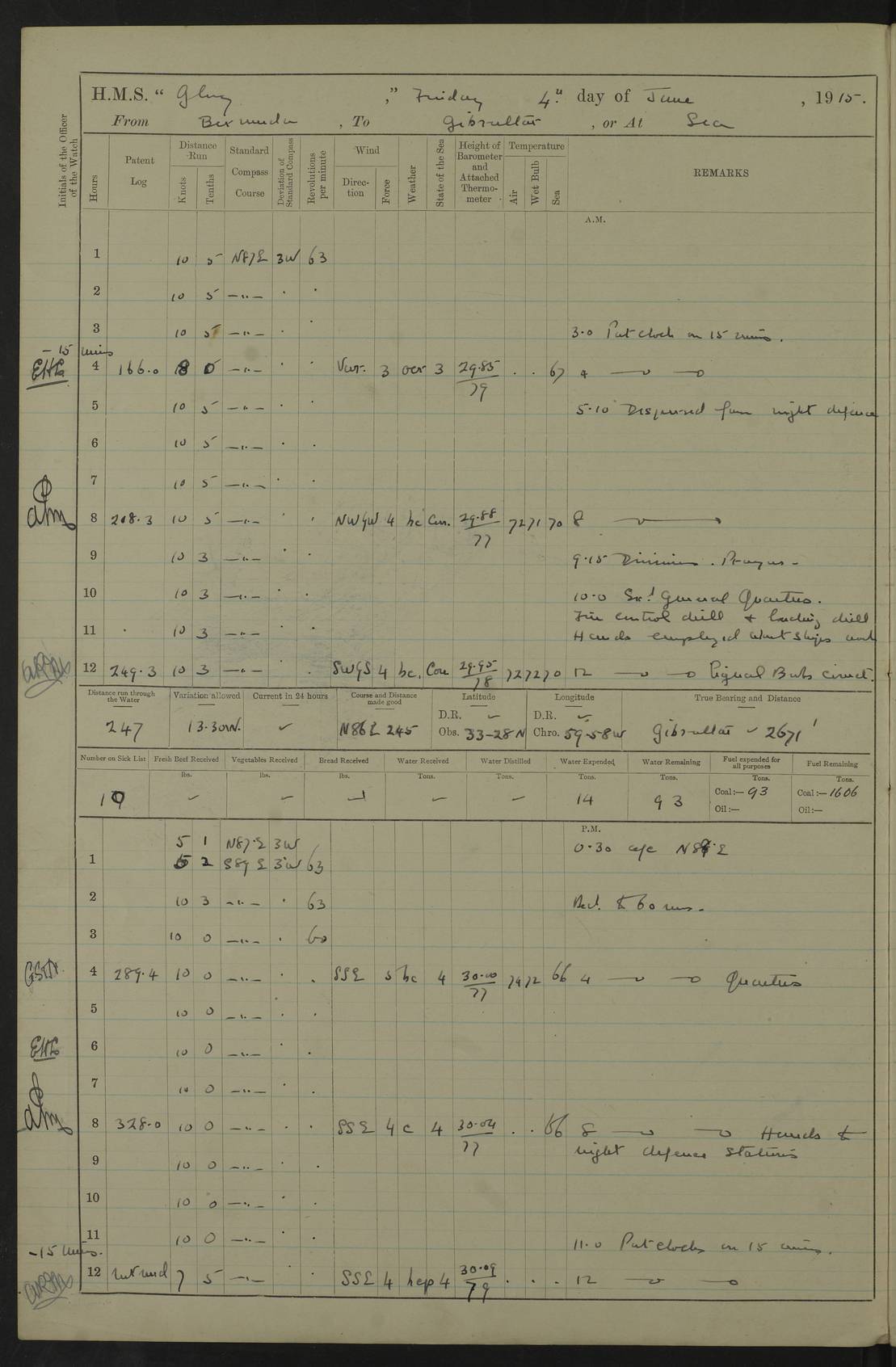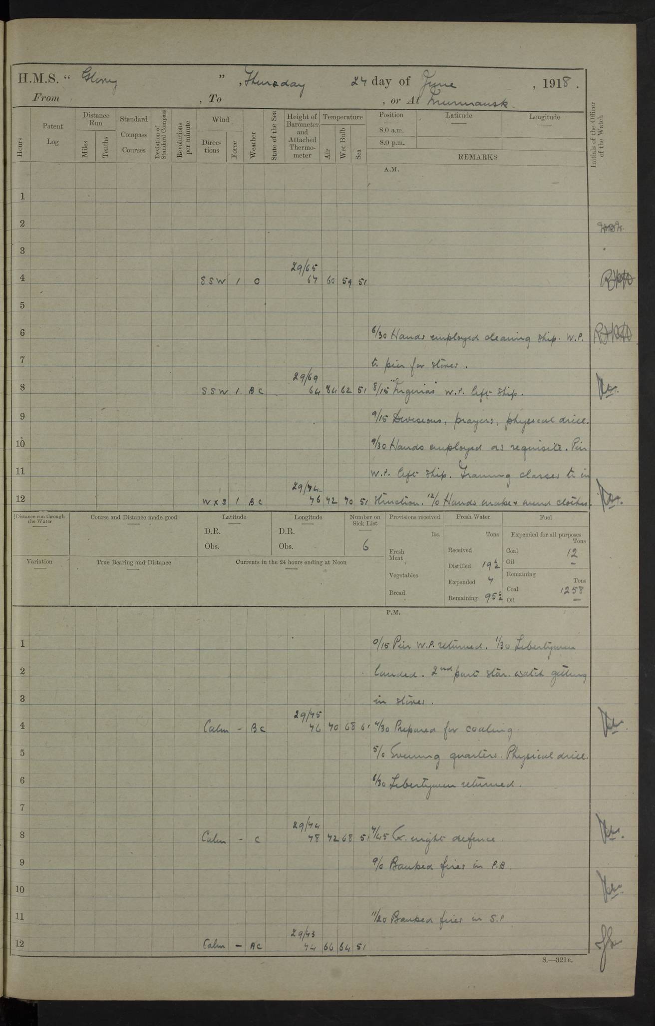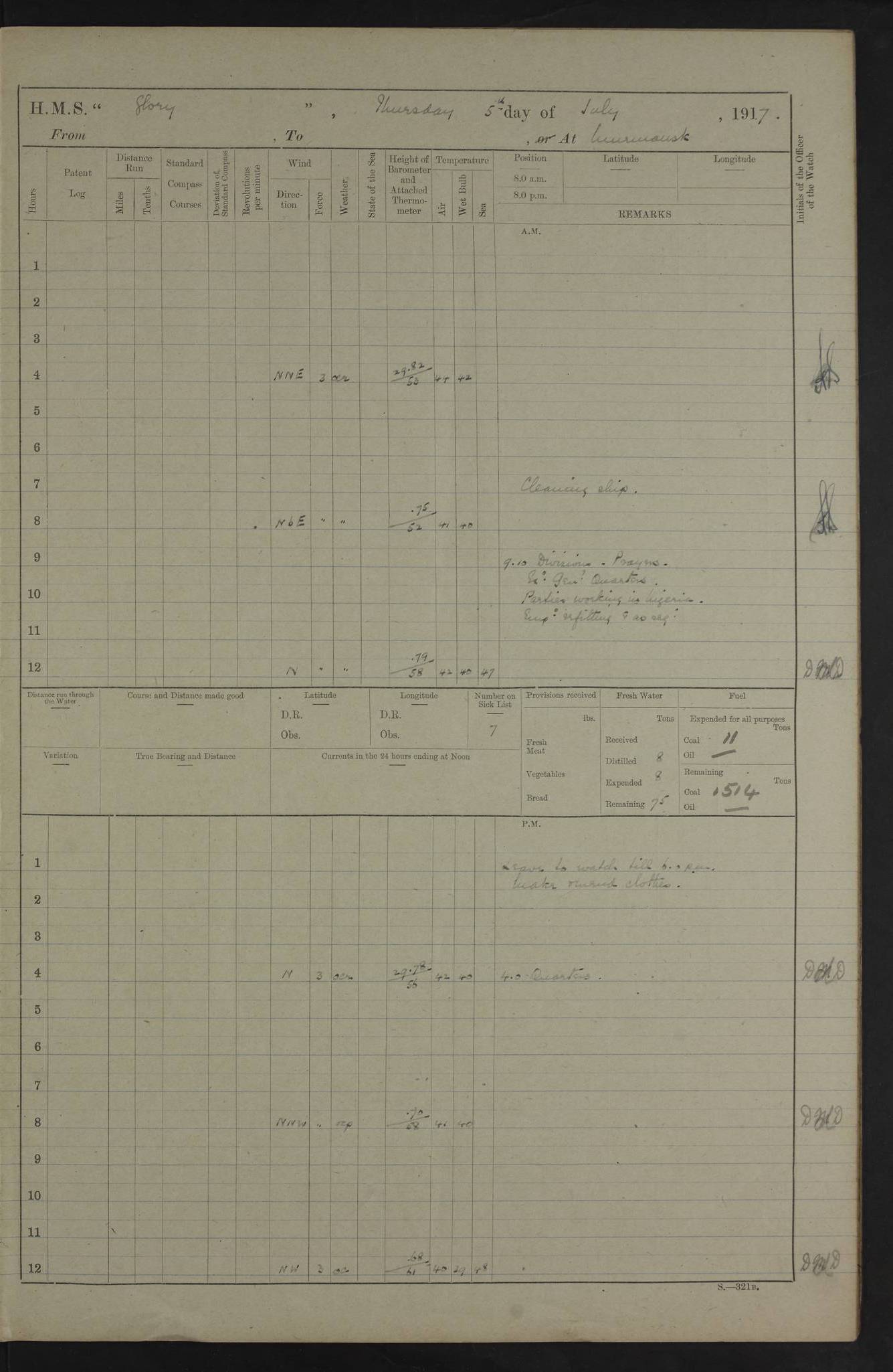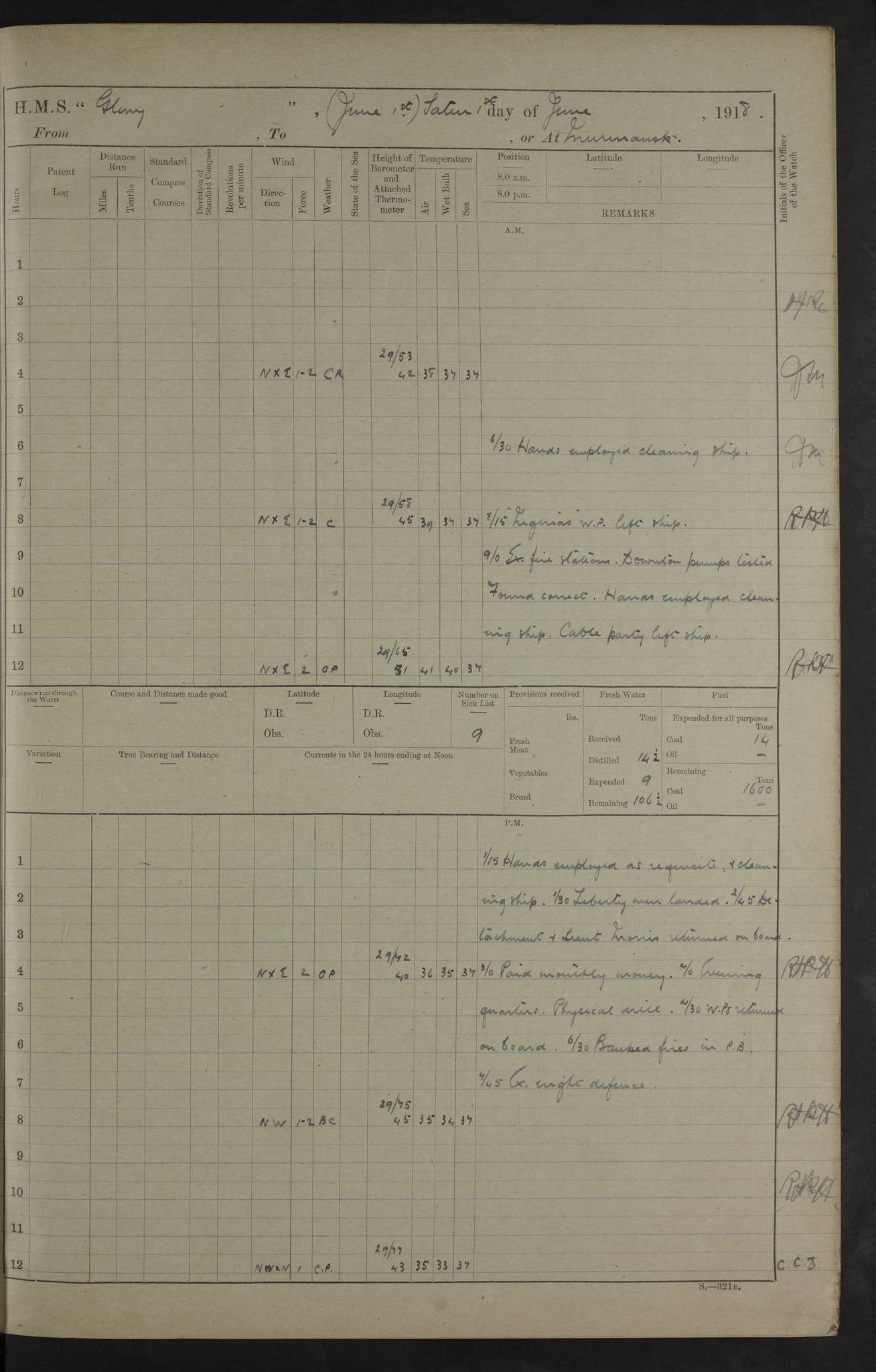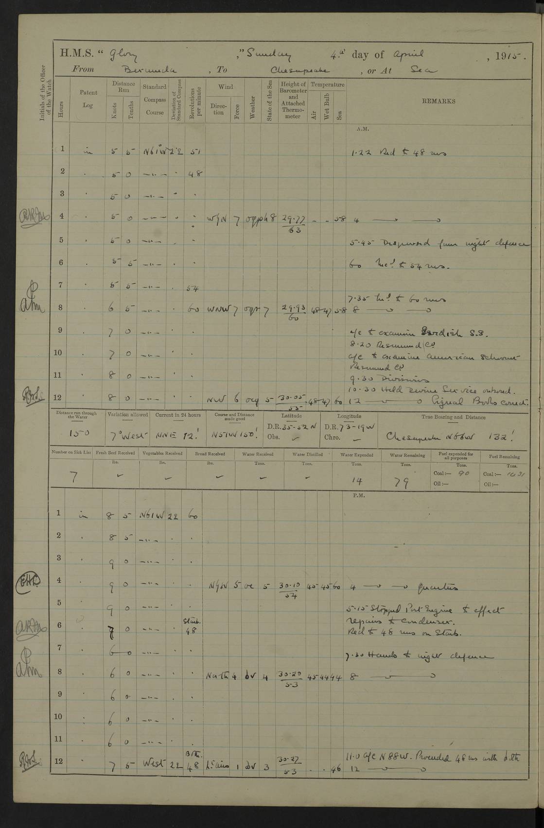 22 June 1915 At sea, Gibraltar to Lemnos Lat 36.1, Long -1.3 4.15am: Sighted land on starboard bow. 10.20am: Stopped port engine for repairs. 11.20am: proceeded with port engine. pm: a/c due to change in deviation. 10.00pm: Cape Tenez Light abeam, 18 miles. 4f73cd61a2fc8ea9030015f6: (https://s3.amazonaws.com:443/oldweather/ADM53-43015/0012_1.jpg) 23 June 1915 At sea, Gibraltar to Lemnos Lat 37.5, Long 4.8 Number on sick list: 4 5.00am: Secured from night defence stations. Placed anti-submarine guns. pm: Life saving appliances served out to men stationed in ? ?at abandon ship. 4f73cd61a2fc8ea9030015f7: (https://s3.amazonaws.com:443/oldweather/ADM53-43015/0013_0.jpg) 24 June 1915 At sea, Gibraltar to Lemnos Lat 37.4, Long 10.8 Position in log clearly bears no resemblance to the location of the ship. Position above is approximate and is based sighting of Zembra Island at 11.55am. 5.00am: Dispersed from night defence stations. Manned anti-submarine guns. am: Sighted two French torpedo boats. am: Torpedo boats passed to ~ No 362, 363. am: Sighted land on starboard beam. 11.55am: Zembra Island abeam, 25 miles. 2.00pm: Sighted Pantellaria S34ºE. 4.45pm: Pantellaria Light House abeam 12 miles. 4f73cd61a2fc8ea9030015f8: (https://s3.amazonaws.com:443/oldweather/ADM53-43015/0013_1.jpg) 25 June 1915 At sea, Gibraltar to Lemnos Lat 35.5, Long 16.7 2.10am: Gozo Light abeam 17 miles. 5.00am: Dispersed from night defence stations. Manned anti-submarine guns. 4f73cd61a2fc8ea9030015f9: (https://s3.amazonaws.com:443/oldweather/ADM53-43015/0014_0.jpg) 26 June 1915 At sea, Gibraltar to Lemnos Lat 35.5, Long 22.6 Number on sick list: 5 5.00am: Dispersed from night defence stations. Manned anti-submarine guns. am: Aired night clothing. am: marines at maxim practice on quarter deck. 2.00pm: Observed land on either bow. 3.00pm: Sighted French patrol destroyer. 4.15pm: Sighted French patrol destroyer. 9.40pm: Milo Peak N63ºW. 10.26pm: Polino Light abeam to port 5.5 miles. 4f73cd62a2fc8ea9030015fa: (https://s3.amazonaws.com:443/oldweather/ADM53-43015/0014_1.jpg) 27 June 1915 At sea and at Lemnos Lat 39.1, Long 24.4 From 0.50 to 3.05am sighting of multiple light houses. 3.50am: a/c to N39ºW and commenced to zig-zag. 5.00am: Dispersed from night defence stations and placed anti-submarine guns and look-outs. am: Lost overboard by accident Hazlewood fender, pat. 311, one in number. 10.30am: Held Divine Service onboard. pm: Met and signalled HMS Minerva on patrol duty. pm: Courses and speeds as requisite while waiting orders to approach Mudros. 3.00pm: Proceeded. 5.16pm: Increased to 90 revs, commenced to zig-zag. Course as requisite for Mudros. 7.00pm: Entered Mudros Bay. 7.47pm: Stopped. Let go port anchor in ‘M3’. 8.30pm: Darkened ship. pm: Manned one 6” and one 12 pdr. 4f73cd62a2fc8ea9030015fb: (https://s3.amazonaws.com:443/oldweather/ADM53-43015/0015_0.jpg) 28 June 1915 Mudros Bay, Lemnos Lat 39.89, Long 25.24 5,00am: HMS Vengeance entered harbour. HMS Vengeance was a pre-dreadnought of the Canopus class, launched in 1899 at Vickers, Barrow, and sold for scrapping in 1921. Details at http://en.wikipedia.org/wiki/HMS_Vengeance_(1899) . am/pm/: hands preparing for coaling and about ship’s work. pm: Collier Wabana secured alongside. 4f73cd62a2fc8ea9030015fc: (https://s3.amazonaws.com:443/oldweather/ADM53-43015/0015_1.jpg) 29 June 1915 Mudros Bay, Lemnos Lat 39.89, Long 25.24 5.15am: Commenced coaling. 2.00pm: Finished coaling. Collier left. 4f73cd62a2fc8ea9030015fd: (https://s3.amazonaws.com:443/oldweather/ADM53-43015/0016_0.jpg) 30 June 1915 Mudros Bay, Lemnos Lat 39.89, Long 25.24 am: Parties away sanding, and with fire engines onshore. am: Boats away disembarking troops. am: French Flagship Patrie sailed. The Patrie was a French pre-dreadnought, launched at La Seyne shipyard in 1903, and stricken in 1921. Details at http://en.wikipedia.org/wiki/French_battleship_Patrie . 6.30pm: Hands to bathe. 4f73cd63a2fc8ea9030015fe: (https://s3.amazonaws.com:443/oldweather/ADM53-43015/0016_1.jpg) 4f73cd63a2fc8ea9030015ff: (https://s3.amazonaws.com:443/oldweather/ADM53-43015/0017_0.jpg) 4f73cd63a2fc8ea903001600: (https://s3.amazonaws.com:443/oldweather/ADM53-43015/0017_1.jpg) 4f73cd63a2fc8ea903001601: (https://s3.amazonaws.com:443/oldweather/ADM53-43015/0018_0.jpg) 4f73cd64a2fc8ea903001602: (https://s3.amazonaws.com:443/oldweather/ADM53-43015/0018_1.jpg) LOGS FOR JULY 1915 From July to October 1915, HMS Glory spent her time at Port Mudros. Certain activities typically took place daily and are not generally noted in the pages below. These activities include: Lighting fires in the picket boat around 4am and drawing the fires in the late evening; Divisions at around 9–9.30am and Evening Quarters at 4pm; Darken ship at around 8.30pm; Daily ‘cleaning ship’, with variations thereof; SBC (for ‘Signal Books Correct’) at the watch changes. 4f73cd64a2fc8ea903001603: (https://s3.amazonaws.com:443/oldweather/ADM53-43016/0000_0.jpg) 4f73cd64a2fc8ea903001604: (https://s3.amazonaws.com:443/oldweather/ADM53-43016/0000_1.jpg) 4f73cd65a2fc8ea903001605: (https://s3.amazonaws.com:443/oldweather/ADM53-43016/0001_0.jpg) 4f73cd65a2fc8ea903001606: (https://s3.amazonaws.com:443/oldweather/ADM53-43016/0001_1.jpg) 1 July 1915 Port Mudros Lat 39.89, Long 25.24 6.30am: Landed working parties preparing boom defence ships. am: Discharged Acting Commander Rayne to Hector. Hector was a kite balloon ship. No further details readily available. 5.00pm: Tug T.10 made fast astern. 7.15pm: HMS Venerable went out. 7.30pm: HMS Chatham went out. HMS Chatham was a ‘Town’ cruiser and lead ship of her class. She was launched in 1911 at Chatham Dockyard and sold in 1926. Details at http://en.wikipedia.org/wiki/HMS_Chatham_(1911) . 4f73cd65a2fc8ea903001607: (https://s3.amazonaws.com:443/oldweather/ADM53-43016/0002_0.jpg) 2 July 1915 Port Mudros Lat 39.89, Long 25.24 5.35am: Landed working parties preparing boom defence ships. am/pm: Boom defence par