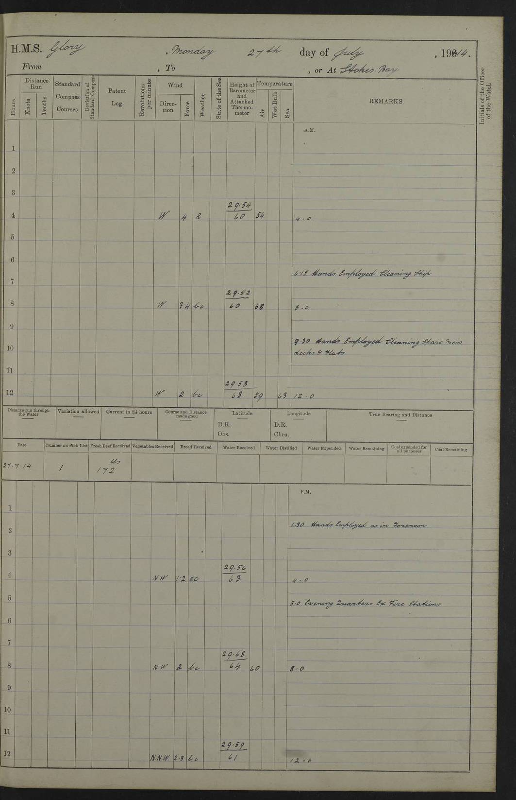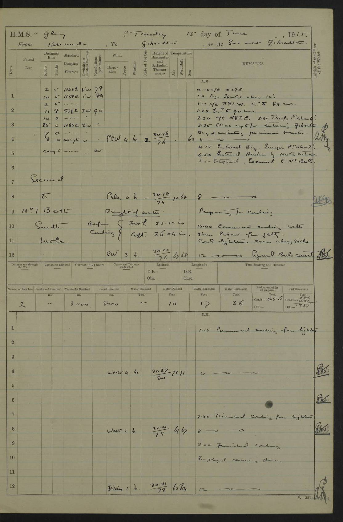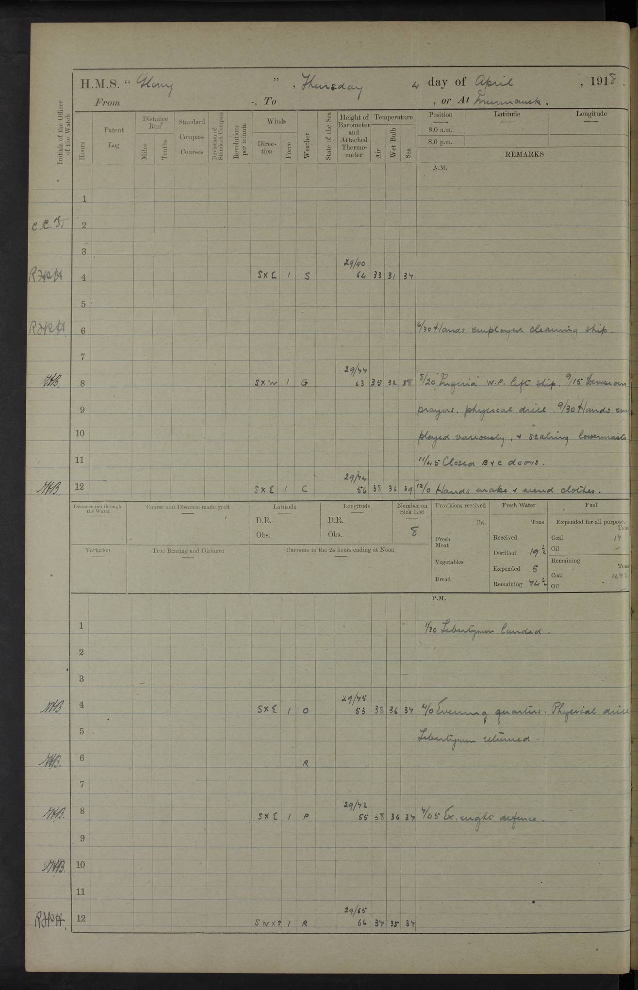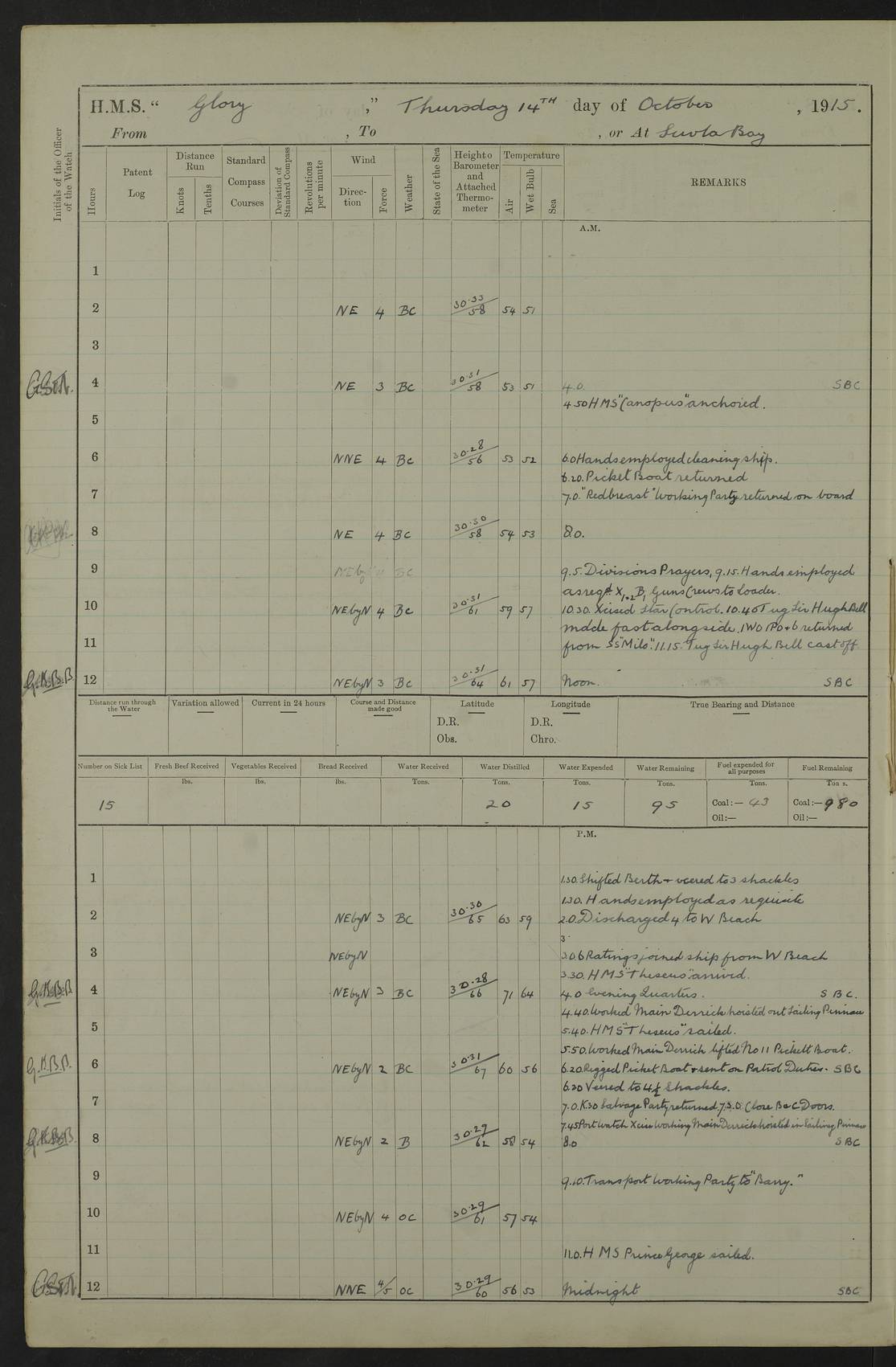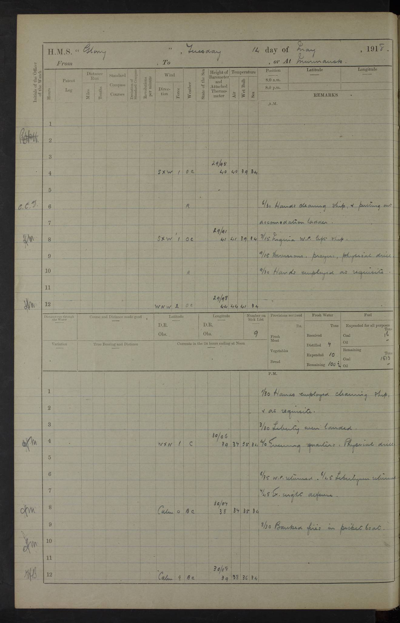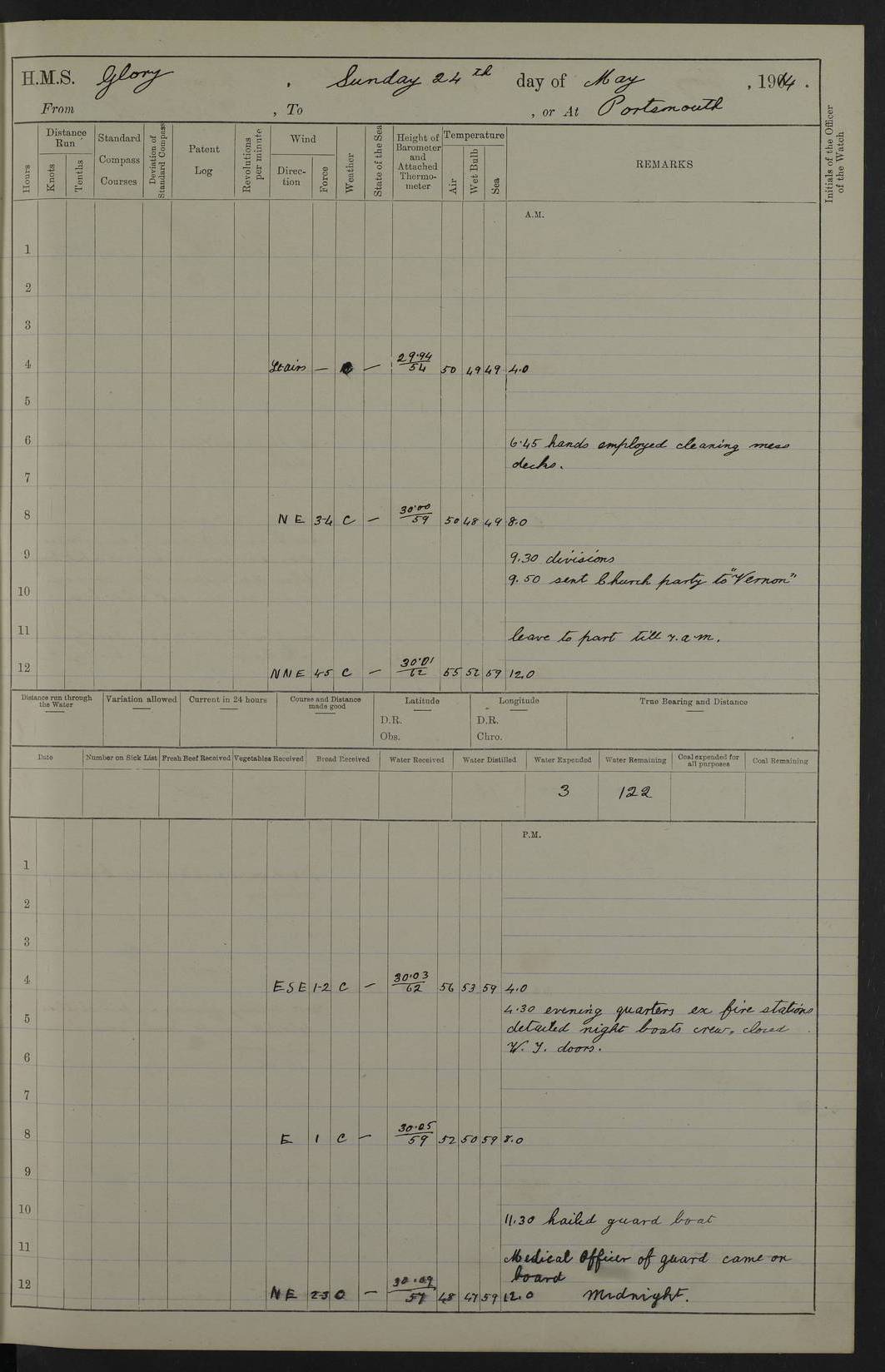 22 June 1915 At sea, Gibraltar to Lemnos Lat 36.1, Long -1.3 4.15am: Sighted land on starboard bow. 10.20am: Stopped port engine for repairs. 11.20am: proceeded with port engine. pm: a/c due to change in deviation. 10.00pm: Cape Tenez Light abeam, 18 miles. 4f73cd61a2fc8ea9030015f6: (https://s3.amazonaws.com:443/oldweather/ADM53-43015/0012_1.jpg) 23 June 1915 At sea, Gibraltar to Lemnos Lat 37.5, Long 4.8 Number on sick list: 4 5.00am: Secured from night defence stations. Placed anti-submarine guns. pm: Life saving appliances served out to men stationed in ? ?at abandon ship. 4f73cd61a2fc8ea9030015f7: (https://s3.amazonaws.com:443/oldweather/ADM53-43015/0013_0.jpg) 24 June 1915 At sea, Gibraltar to Lemnos Lat 37.4, Long 10.8 Position in log clearly bears no resemblance to the location of the ship. Position above is approximate and is based sighting of Zembra Island at 11.55am. 5.00am: Dispersed from night defence stations. Manned anti-submarine guns. am: Sighted two French torpedo boats. am: Torpedo boats passed to ~ No 362, 363. am: Sighted land on starboard beam. 11.55am: Zembra Island abeam, 25 miles. 2.00pm: Sighted Pantellaria S34ºE. 4.45pm: Pantellaria Light House abeam 12 miles. 4f73cd61a2fc8ea9030015f8: (https://s3.amazonaws.com:443/oldweather/ADM53-43015/0013_1.jpg) 25 June 1915 At sea, Gibraltar to Lemnos Lat 35.5, Long 16.7 2.10am: Gozo Light abeam 17 miles. 5.00am: Dispersed from night defence stations. Manned anti-submarine guns. 4f73cd61a2fc8ea9030015f9: (https://s3.amazonaws.com:443/oldweather/ADM53-43015/0014_0.jpg) 26 June 1915 At sea, Gibraltar to Lemnos Lat 35.5, Long 22.6 Number on sick list: 5 5.00am: Dispersed from night defence stations. Manned anti-submarine guns. am: Aired night clothing. am: marines at maxim practice on quarter deck. 2.00pm: Observed land on either bow. 3.00pm: Sighted French patrol destroyer. 4.15pm: Sighted French patrol destroyer. 9.40pm: Milo Peak N63ºW. 10.26pm: Polino Light abeam to port 5.5 miles. 4f73cd62a2fc8ea9030015fa: (https://s3.amazonaws.com:443/oldweather/ADM53-43015/0014_1.jpg) 27 June 1915 At sea and at Lemnos Lat 39.1, Long 24.4 From 0.50 to 3.05am sighting of multiple light houses. 3.50am: a/c to N39ºW and commenced to zig-zag. 5.00am: Dispersed from night defence stations and placed anti-submarine guns and look-outs. am: Lost overboard by accident Hazlewood fender, pat. 311, one in number. 10.30am: Held Divine Service onboard. pm: Met and signalled HMS Minerva on patrol duty. pm: Courses and speeds as requisite while waiting orders to approach Mudros. 3.00pm: Proceeded. 5.16pm: Increased to 90 revs, commenced to zig-zag. Course as requisite for Mudros. 7.00pm: Entered Mudros Bay. 7.47pm: Stopped. Let go port anchor in ‘M3’. 8.30pm: Darkened ship. pm: Manned one 6” and one 12 pdr. 4f73cd62a2fc8ea9030015fb: (https://s3.amazonaws.com:443/oldweather/ADM53-43015/0015_0.jpg) 28 June 1915 Mudros Bay, Lemnos Lat 39.89, Long 25.24 5,00am: HMS Vengeance entered harbour. HMS Vengeance was a pre-dreadnought of the Canopus class, launched in 1899 at Vickers, Barrow, and sold for scrapping in 1921. Details at http://en.wikipedia.org/wiki/HMS_Vengeance_(1899) . am/pm/: hands preparing for coaling and about ship’s work. pm: Collier Wabana secured alongside. 4f73cd62a2fc8ea9030015fc: (https://s3.amazonaws.com:443/oldweather/ADM53-43015/0015_1.jpg) 29 June 1915 Mudros Bay, Lemnos Lat 39.89, Long 25.24 5.15am: Commenced coaling. 2.00pm: Finished coaling. Collier left. 4f73cd62a2fc8ea9030015fd: (https://s3.amazonaws.com:443/oldweather/ADM53-43015/0016_0.jpg) 30 June 1915 Mudros Bay, Lemnos Lat 39.89, Long 25.24 am: Parties away sanding, and with fire engines onshore. am: Boats away disembarking troops. am: French Flagship Patrie sailed. The Patrie was a French pre-dreadnought, launched at La Seyne shipyard in 1903, and stricken in 1921. Details at http://en.wikipedia.org/wiki/French_battleship_Patrie . 6.30pm: Hands to bathe. 4f73cd63a2fc8ea9030015fe: (https://s3.amazonaws.com:443/oldweather/ADM53-43015/0016_1.jpg) 4f73cd63a2fc8ea9030015ff: (https://s3.amazonaws.com:443/oldweather/ADM53-43015/0017_0.jpg) 4f73cd63a2fc8ea903001600: (https://s3.amazonaws.com:443/oldweather/ADM53-43015/0017_1.jpg) 4f73cd63a2fc8ea903001601: (https://s3.amazonaws.com:443/oldweather/ADM53-43015/0018_0.jpg) 4f73cd64a2fc8ea903001602: (https://s3.amazonaws.com:443/oldweather/ADM53-43015/0018_1.jpg) LOGS FOR JULY 1915 From July to October 1915, HMS Glory spent her time at Port Mudros. Certain activities typically took place daily and are not generally noted in the pages below. These activities include: Lighting fires in the picket boat around 4am and drawing the fires in the late evening; Divisions at around 9–9.30am and Evening Quarters at 4pm; Darken ship at around 8.30pm; Daily ‘cleaning ship’, with variations thereof; SBC (for ‘Signal Books Correct’) at the watch changes. 4f73cd64a2fc8ea903001603: (https://s3.amazonaws.com:443/oldweather/ADM53-43016/0000_0.jpg) 4f73cd64a2fc8ea903001604: (https://s3.amazonaws.com:443/oldweather/ADM53-43016/0000_1.jpg) 4f73cd65a2fc8ea903001605: (https://s3.amazonaws.com:443/oldweather/ADM53-43016/0001_0.jpg) 4f73cd65a2fc8ea903001606: (https://s3.amazonaws.com:443/oldweather/ADM53-43016/0001_1.jpg) 1 July 1915 Port Mudros Lat 39.89, Long 25.24 6.30am: Landed working parties preparing boom defence ships. am: Discharged Acting Commander Rayne to Hector. Hector was a kite balloon ship. No further details readily available. 5.00pm: Tug T.10 made fast astern. 7.15pm: HMS Venerable went out. 7.30pm: HMS Chatham went out. HMS Chatham was a ‘Town’ cruiser and lead ship of her class. She was launched in 1911 at Chatham Dockyard and sold in 1926. Details at http://en.wikipedia.org/wiki/HMS_Chatham_(1911) . 4f73cd65a2fc8ea903001607: (https://s3.amazonaws.com:443/oldweather/ADM53-43016/0002_0.jpg) 2 July 1915 Port Mudros Lat 39.89, Long 25.24 5.35am: Landed working parties preparing boom defence ships. am/pm: Boom defence par