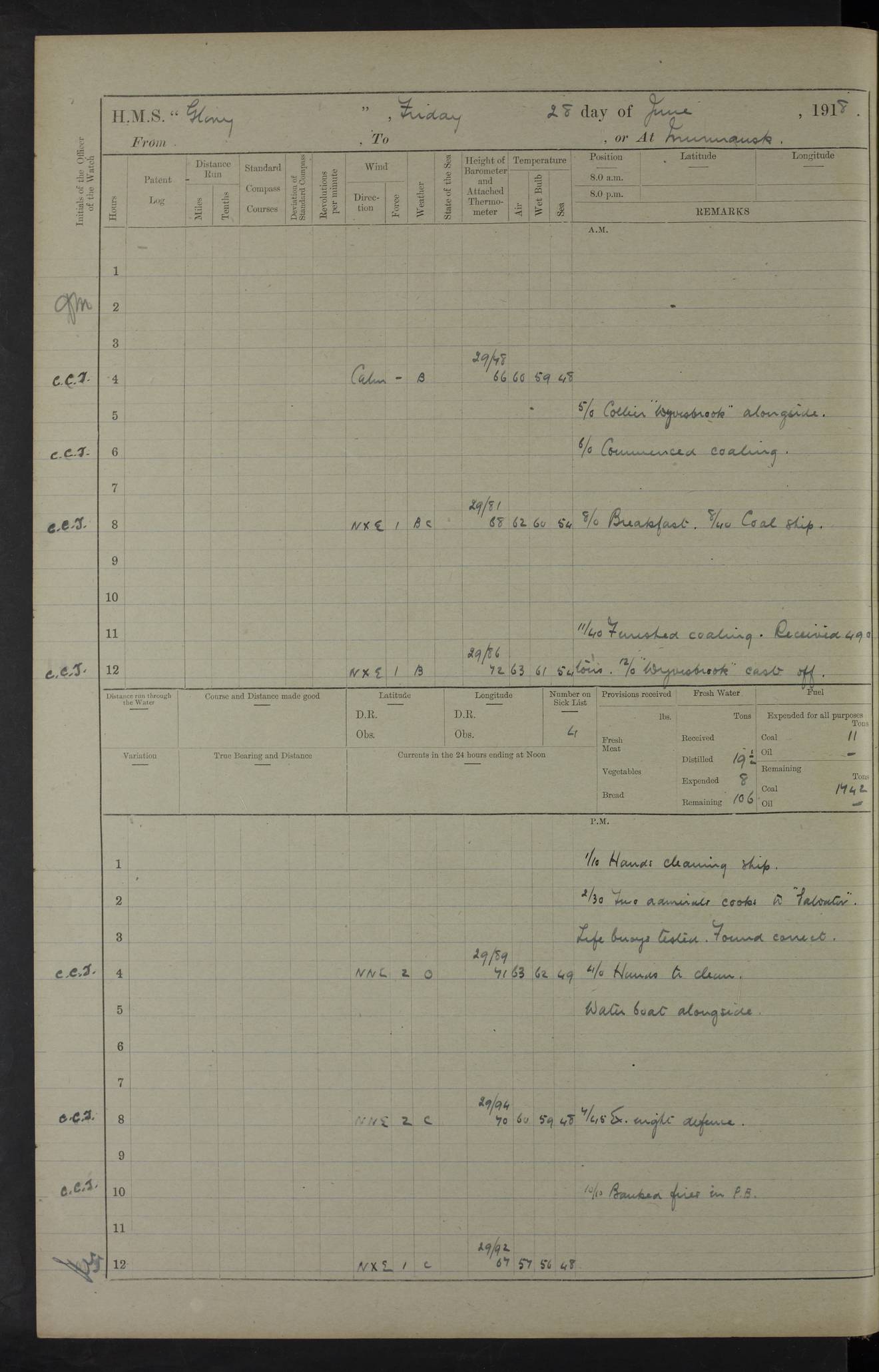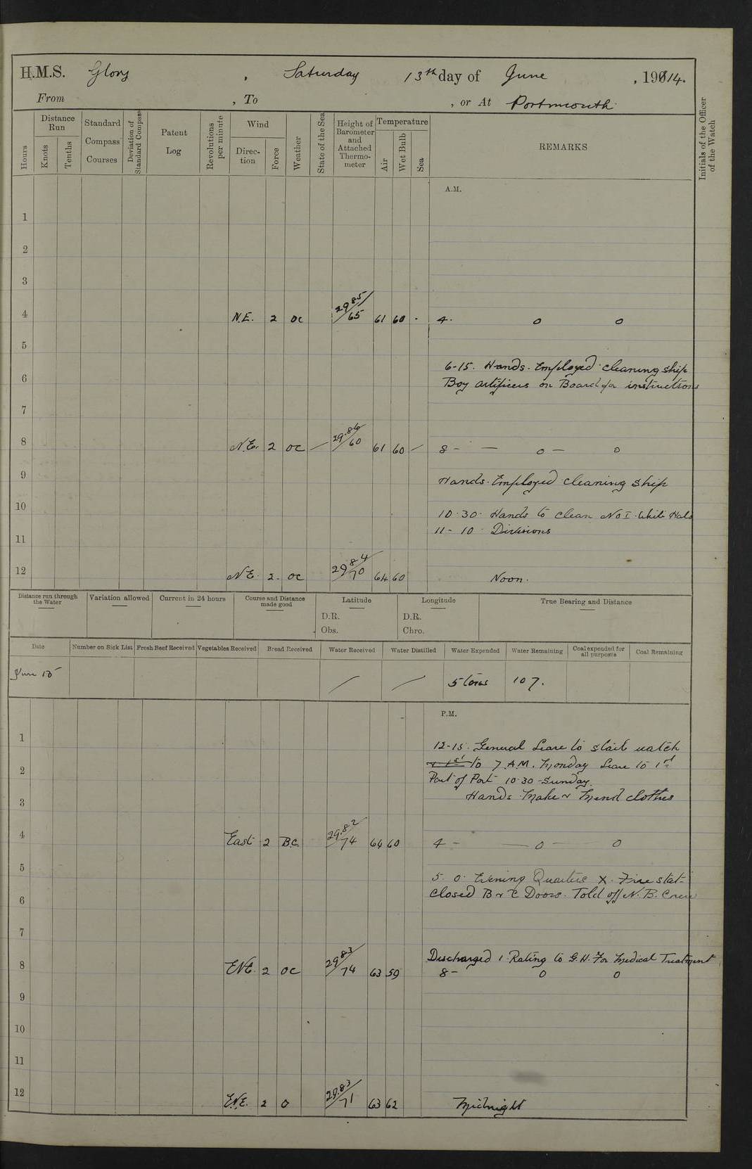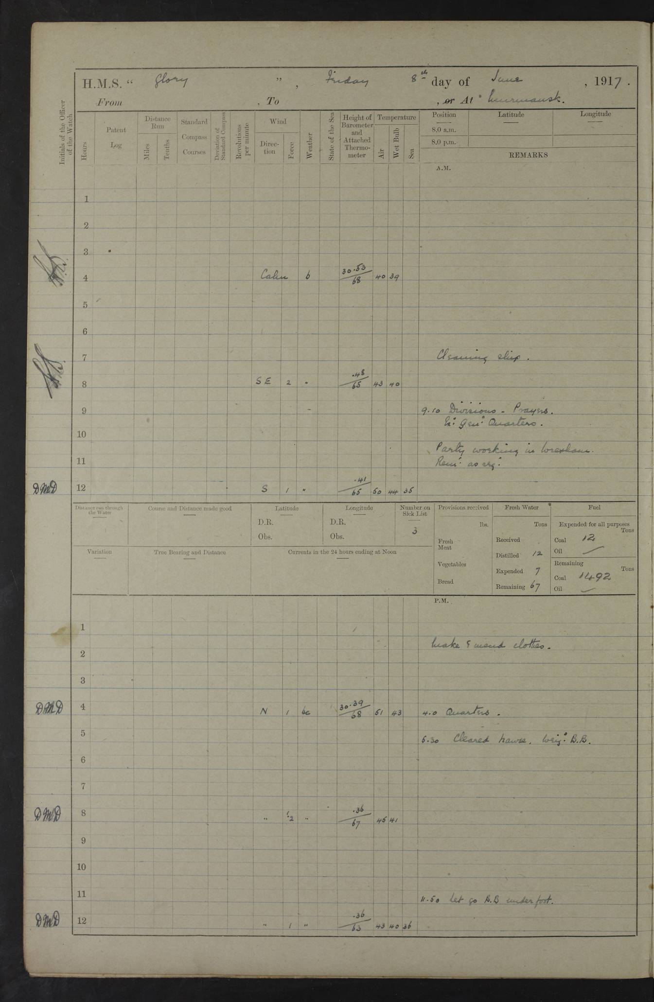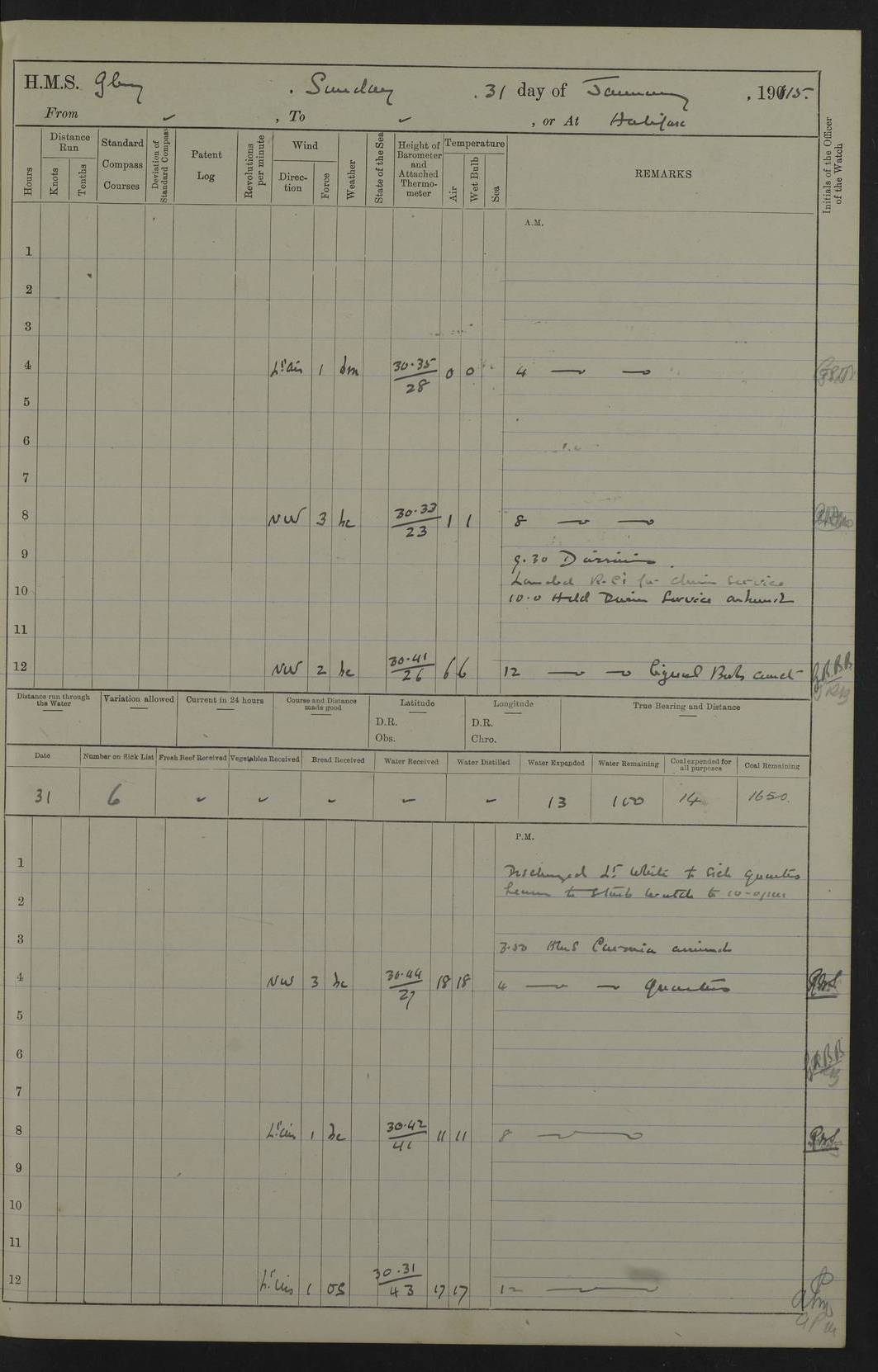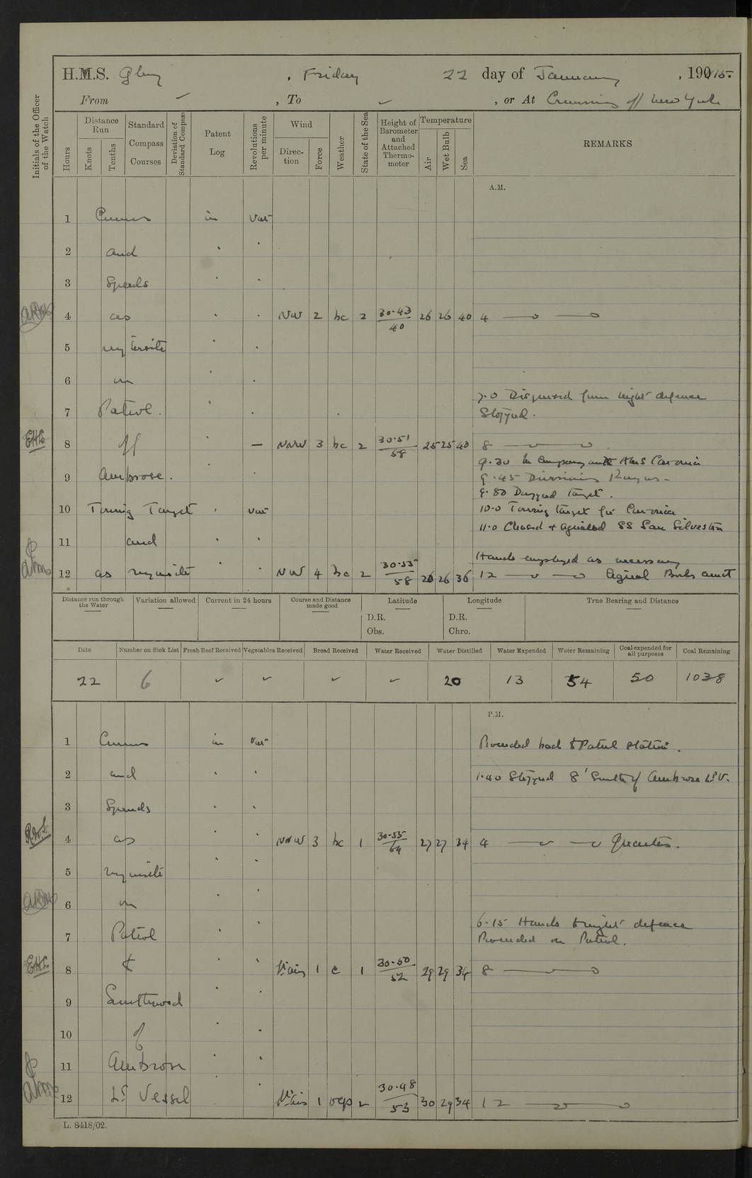 22 June 1915 At sea, Gibraltar to Lemnos Lat 36.1, Long -1.3 4.15am: Sighted land on starboard bow. 10.20am: Stopped port engine for repairs. 11.20am: proceeded with port engine. pm: a/c due to change in deviation. 10.00pm: Cape Tenez Light abeam, 18 miles. 4f73cd61a2fc8ea9030015f6: (https://s3.amazonaws.com:443/oldweather/ADM53-43015/0012_1.jpg) 23 June 1915 At sea, Gibraltar to Lemnos Lat 37.5, Long 4.8 Number on sick list: 4 5.00am: Secured from night defence stations. Placed anti-submarine guns. pm: Life saving appliances served out to men stationed in ? ?at abandon ship. 4f73cd61a2fc8ea9030015f7: (https://s3.amazonaws.com:443/oldweather/ADM53-43015/0013_0.jpg) 24 June 1915 At sea, Gibraltar to Lemnos Lat 37.4, Long 10.8 Position in log clearly bears no resemblance to the location of the ship. Position above is approximate and is based sighting of Zembra Island at 11.55am. 5.00am: Dispersed from night defence stations. Manned anti-submarine guns. am: Sighted two French torpedo boats. am: Torpedo boats passed to ~ No 362, 363. am: Sighted land on starboard beam. 11.55am: Zembra Island abeam, 25 miles. 2.00pm: Sighted Pantellaria S34ºE. 4.45pm: Pantellaria Light House abeam 12 miles. 4f73cd61a2fc8ea9030015f8: (https://s3.amazonaws.com:443/oldweather/ADM53-43015/0013_1.jpg) 25 June 1915 At sea, Gibraltar to Lemnos Lat 35.5, Long 16.7 2.10am: Gozo Light abeam 17 miles. 5.00am: Dispersed from night defence stations. Manned anti-submarine guns. 4f73cd61a2fc8ea9030015f9: (https://s3.amazonaws.com:443/oldweather/ADM53-43015/0014_0.jpg) 26 June 1915 At sea, Gibraltar to Lemnos Lat 35.5, Long 22.6 Number on sick list: 5 5.00am: Dispersed from night defence stations. Manned anti-submarine guns. am: Aired night clothing. am: marines at maxim practice on quarter deck. 2.00pm: Observed land on either bow. 3.00pm: Sighted French patrol destroyer. 4.15pm: Sighted French patrol destroyer. 9.40pm: Milo Peak N63ºW. 10.26pm: Polino Light abeam to port 5.5 miles. 4f73cd62a2fc8ea9030015fa: (https://s3.amazonaws.com:443/oldweather/ADM53-43015/0014_1.jpg) 27 June 1915 At sea and at Lemnos Lat 39.1, Long 24.4 From 0.50 to 3.05am sighting of multiple light houses. 3.50am: a/c to N39ºW and commenced to zig-zag. 5.00am: Dispersed from night defence stations and placed anti-submarine guns and look-outs. am: Lost overboard by accident Hazlewood fender, pat. 311, one in number. 10.30am: Held Divine Service onboard. pm: Met and signalled HMS Minerva on patrol duty. pm: Courses and speeds as requisite while waiting orders to approach Mudros. 3.00pm: Proceeded. 5.16pm: Increased to 90 revs, commenced to zig-zag. Course as requisite for Mudros. 7.00pm: Entered Mudros Bay. 7.47pm: Stopped. Let go port anchor in ‘M3’. 8.30pm: Darkened ship. pm: Manned one 6” and one 12 pdr. 4f73cd62a2fc8ea9030015fb: (https://s3.amazonaws.com:443/oldweather/ADM53-43015/0015_0.jpg) 28 June 1915 Mudros Bay, Lemnos Lat 39.89, Long 25.24 5,00am: HMS Vengeance entered harbour. HMS Vengeance was a pre-dreadnought of the Canopus class, launched in 1899 at Vickers, Barrow, and sold for scrapping in 1921. Details at http://en.wikipedia.org/wiki/HMS_Vengeance_(1899) . am/pm/: hands preparing for coaling and about ship’s work. pm: Collier Wabana secured alongside. 4f73cd62a2fc8ea9030015fc: (https://s3.amazonaws.com:443/oldweather/ADM53-43015/0015_1.jpg) 29 June 1915 Mudros Bay, Lemnos Lat 39.89, Long 25.24 5.15am: Commenced coaling. 2.00pm: Finished coaling. Collier left. 4f73cd62a2fc8ea9030015fd: (https://s3.amazonaws.com:443/oldweather/ADM53-43015/0016_0.jpg) 30 June 1915 Mudros Bay, Lemnos Lat 39.89, Long 25.24 am: Parties away sanding, and with fire engines onshore. am: Boats away disembarking troops. am: French Flagship Patrie sailed. The Patrie was a French pre-dreadnought, launched at La Seyne shipyard in 1903, and stricken in 1921. Details at http://en.wikipedia.org/wiki/French_battleship_Patrie . 6.30pm: Hands to bathe. 4f73cd63a2fc8ea9030015fe: (https://s3.amazonaws.com:443/oldweather/ADM53-43015/0016_1.jpg) 4f73cd63a2fc8ea9030015ff: (https://s3.amazonaws.com:443/oldweather/ADM53-43015/0017_0.jpg) 4f73cd63a2fc8ea903001600: (https://s3.amazonaws.com:443/oldweather/ADM53-43015/0017_1.jpg) 4f73cd63a2fc8ea903001601: (https://s3.amazonaws.com:443/oldweather/ADM53-43015/0018_0.jpg) 4f73cd64a2fc8ea903001602: (https://s3.amazonaws.com:443/oldweather/ADM53-43015/0018_1.jpg) LOGS FOR JULY 1915 From July to October 1915, HMS Glory spent her time at Port Mudros. Certain activities typically took place daily and are not generally noted in the pages below. These activities include: Lighting fires in the picket boat around 4am and drawing the fires in the late evening; Divisions at around 9–9.30am and Evening Quarters at 4pm; Darken ship at around 8.30pm; Daily ‘cleaning ship’, with variations thereof; SBC (for ‘Signal Books Correct’) at the watch changes. 4f73cd64a2fc8ea903001603: (https://s3.amazonaws.com:443/oldweather/ADM53-43016/0000_0.jpg) 4f73cd64a2fc8ea903001604: (https://s3.amazonaws.com:443/oldweather/ADM53-43016/0000_1.jpg) 4f73cd65a2fc8ea903001605: (https://s3.amazonaws.com:443/oldweather/ADM53-43016/0001_0.jpg) 4f73cd65a2fc8ea903001606: (https://s3.amazonaws.com:443/oldweather/ADM53-43016/0001_1.jpg) 1 July 1915 Port Mudros Lat 39.89, Long 25.24 6.30am: Landed working parties preparing boom defence ships. am: Discharged Acting Commander Rayne to Hector. Hector was a kite balloon ship. No further details readily available. 5.00pm: Tug T.10 made fast astern. 7.15pm: HMS Venerable went out. 7.30pm: HMS Chatham went out. HMS Chatham was a ‘Town’ cruiser and lead ship of her class. She was launched in 1911 at Chatham Dockyard and sold in 1926. Details at http://en.wikipedia.org/wiki/HMS_Chatham_(1911) . 4f73cd65a2fc8ea903001607: (https://s3.amazonaws.com:443/oldweather/ADM53-43016/0002_0.jpg) 2 July 1915 Port Mudros Lat 39.89, Long 25.24 5.35am: Landed working parties preparing boom defence ships. am/pm: Boom defence par