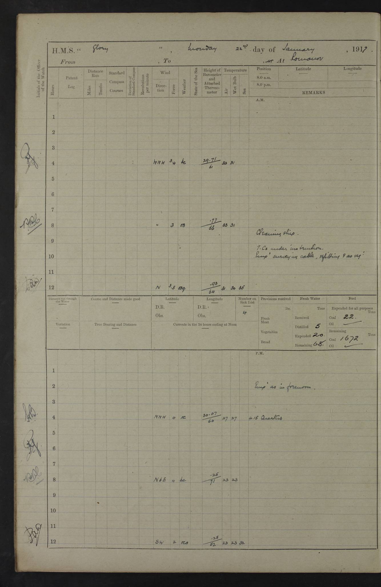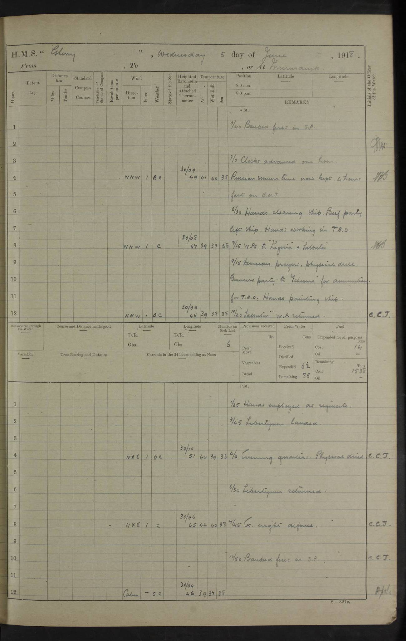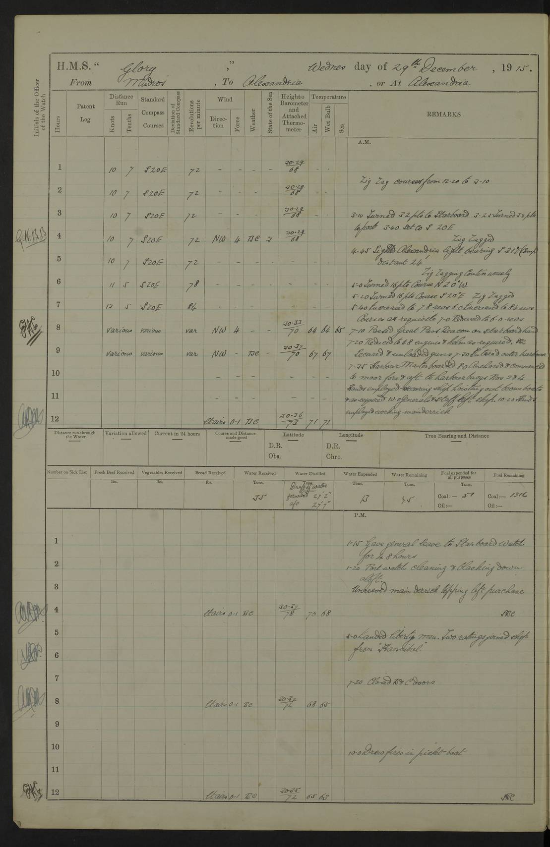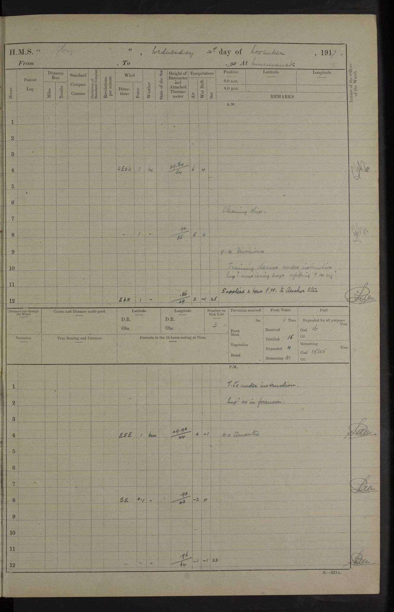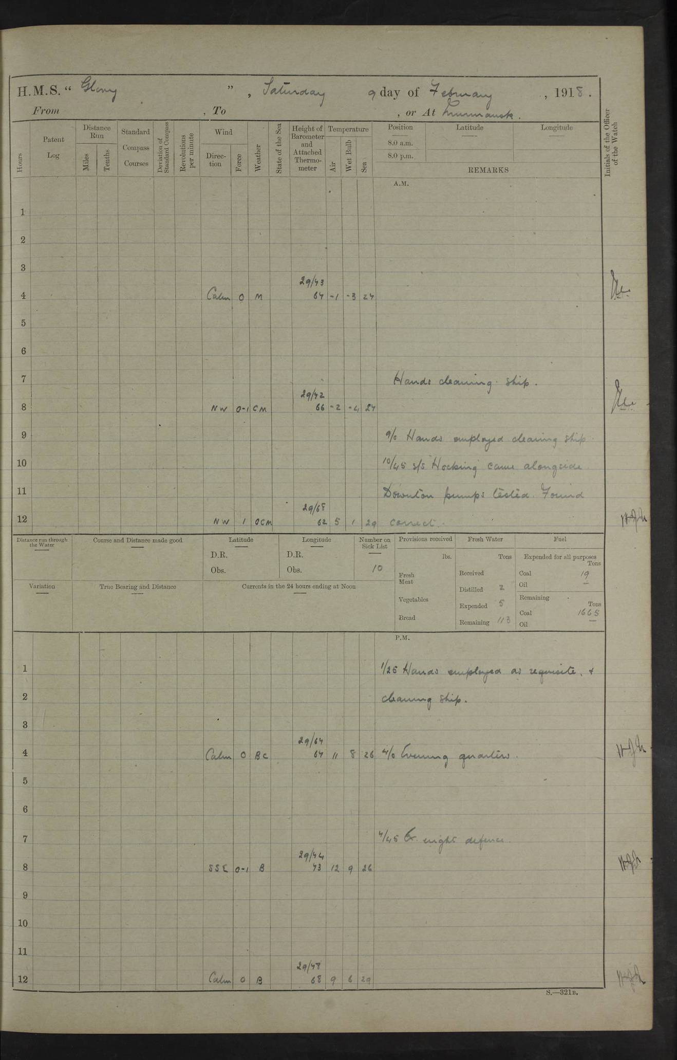 22 June 1915 At sea, Gibraltar to Lemnos Lat 36.1, Long -1.3 4.15am: Sighted land on starboard bow. 10.20am: Stopped port engine for repairs. 11.20am: proceeded with port engine. pm: a/c due to change in deviation. 10.00pm: Cape Tenez Light abeam, 18 miles. 4f73cd61a2fc8ea9030015f6: (https://s3.amazonaws.com:443/oldweather/ADM53-43015/0012_1.jpg) 23 June 1915 At sea, Gibraltar to Lemnos Lat 37.5, Long 4.8 Number on sick list: 4 5.00am: Secured from night defence stations. Placed anti-submarine guns. pm: Life saving appliances served out to men stationed in ? ?at abandon ship. 4f73cd61a2fc8ea9030015f7: (https://s3.amazonaws.com:443/oldweather/ADM53-43015/0013_0.jpg) 24 June 1915 At sea, Gibraltar to Lemnos Lat 37.4, Long 10.8 Position in log clearly bears no resemblance to the location of the ship. Position above is approximate and is based sighting of Zembra Island at 11.55am. 5.00am: Dispersed from night defence stations. Manned anti-submarine guns. am: Sighted two French torpedo boats. am: Torpedo boats passed to ~ No 362, 363. am: Sighted land on starboard beam. 11.55am: Zembra Island abeam, 25 miles. 2.00pm: Sighted Pantellaria S34ºE. 4.45pm: Pantellaria Light House abeam 12 miles. 4f73cd61a2fc8ea9030015f8: (https://s3.amazonaws.com:443/oldweather/ADM53-43015/0013_1.jpg) 25 June 1915 At sea, Gibraltar to Lemnos Lat 35.5, Long 16.7 2.10am: Gozo Light abeam 17 miles. 5.00am: Dispersed from night defence stations. Manned anti-submarine guns. 4f73cd61a2fc8ea9030015f9: (https://s3.amazonaws.com:443/oldweather/ADM53-43015/0014_0.jpg) 26 June 1915 At sea, Gibraltar to Lemnos Lat 35.5, Long 22.6 Number on sick list: 5 5.00am: Dispersed from night defence stations. Manned anti-submarine guns. am: Aired night clothing. am: marines at maxim practice on quarter deck. 2.00pm: Observed land on either bow. 3.00pm: Sighted French patrol destroyer. 4.15pm: Sighted French patrol destroyer. 9.40pm: Milo Peak N63ºW. 10.26pm: Polino Light abeam to port 5.5 miles. 4f73cd62a2fc8ea9030015fa: (https://s3.amazonaws.com:443/oldweather/ADM53-43015/0014_1.jpg) 27 June 1915 At sea and at Lemnos Lat 39.1, Long 24.4 From 0.50 to 3.05am sighting of multiple light houses. 3.50am: a/c to N39ºW and commenced to zig-zag. 5.00am: Dispersed from night defence stations and placed anti-submarine guns and look-outs. am: Lost overboard by accident Hazlewood fender, pat. 311, one in number. 10.30am: Held Divine Service onboard. pm: Met and signalled HMS Minerva on patrol duty. pm: Courses and speeds as requisite while waiting orders to approach Mudros. 3.00pm: Proceeded. 5.16pm: Increased to 90 revs, commenced to zig-zag. Course as requisite for Mudros. 7.00pm: Entered Mudros Bay. 7.47pm: Stopped. Let go port anchor in ‘M3’. 8.30pm: Darkened ship. pm: Manned one 6” and one 12 pdr. 4f73cd62a2fc8ea9030015fb: (https://s3.amazonaws.com:443/oldweather/ADM53-43015/0015_0.jpg) 28 June 1915 Mudros Bay, Lemnos Lat 39.89, Long 25.24 5,00am: HMS Vengeance entered harbour. HMS Vengeance was a pre-dreadnought of the Canopus class, launched in 1899 at Vickers, Barrow, and sold for scrapping in 1921. Details at http://en.wikipedia.org/wiki/HMS_Vengeance_(1899) . am/pm/: hands preparing for coaling and about ship’s work. pm: Collier Wabana secured alongside. 4f73cd62a2fc8ea9030015fc: (https://s3.amazonaws.com:443/oldweather/ADM53-43015/0015_1.jpg) 29 June 1915 Mudros Bay, Lemnos Lat 39.89, Long 25.24 5.15am: Commenced coaling. 2.00pm: Finished coaling. Collier left. 4f73cd62a2fc8ea9030015fd: (https://s3.amazonaws.com:443/oldweather/ADM53-43015/0016_0.jpg) 30 June 1915 Mudros Bay, Lemnos Lat 39.89, Long 25.24 am: Parties away sanding, and with fire engines onshore. am: Boats away disembarking troops. am: French Flagship Patrie sailed. The Patrie was a French pre-dreadnought, launched at La Seyne shipyard in 1903, and stricken in 1921. Details at http://en.wikipedia.org/wiki/French_battleship_Patrie . 6.30pm: Hands to bathe. 4f73cd63a2fc8ea9030015fe: (https://s3.amazonaws.com:443/oldweather/ADM53-43015/0016_1.jpg) 4f73cd63a2fc8ea9030015ff: (https://s3.amazonaws.com:443/oldweather/ADM53-43015/0017_0.jpg) 4f73cd63a2fc8ea903001600: (https://s3.amazonaws.com:443/oldweather/ADM53-43015/0017_1.jpg) 4f73cd63a2fc8ea903001601: (https://s3.amazonaws.com:443/oldweather/ADM53-43015/0018_0.jpg) 4f73cd64a2fc8ea903001602: (https://s3.amazonaws.com:443/oldweather/ADM53-43015/0018_1.jpg) LOGS FOR JULY 1915 From July to October 1915, HMS Glory spent her time at Port Mudros. Certain activities typically took place daily and are not generally noted in the pages below. These activities include: Lighting fires in the picket boat around 4am and drawing the fires in the late evening; Divisions at around 9–9.30am and Evening Quarters at 4pm; Darken ship at around 8.30pm; Daily ‘cleaning ship’, with variations thereof; SBC (for ‘Signal Books Correct’) at the watch changes. 4f73cd64a2fc8ea903001603: (https://s3.amazonaws.com:443/oldweather/ADM53-43016/0000_0.jpg) 4f73cd64a2fc8ea903001604: (https://s3.amazonaws.com:443/oldweather/ADM53-43016/0000_1.jpg) 4f73cd65a2fc8ea903001605: (https://s3.amazonaws.com:443/oldweather/ADM53-43016/0001_0.jpg) 4f73cd65a2fc8ea903001606: (https://s3.amazonaws.com:443/oldweather/ADM53-43016/0001_1.jpg) 1 July 1915 Port Mudros Lat 39.89, Long 25.24 6.30am: Landed working parties preparing boom defence ships. am: Discharged Acting Commander Rayne to Hector. Hector was a kite balloon ship. No further details readily available. 5.00pm: Tug T.10 made fast astern. 7.15pm: HMS Venerable went out. 7.30pm: HMS Chatham went out. HMS Chatham was a ‘Town’ cruiser and lead ship of her class. She was launched in 1911 at Chatham Dockyard and sold in 1926. Details at http://en.wikipedia.org/wiki/HMS_Chatham_(1911) . 4f73cd65a2fc8ea903001607: (https://s3.amazonaws.com:443/oldweather/ADM53-43016/0002_0.jpg) 2 July 1915 Port Mudros Lat 39.89, Long 25.24 5.35am: Landed working parties preparing boom defence ships. am/pm: Boom defence par