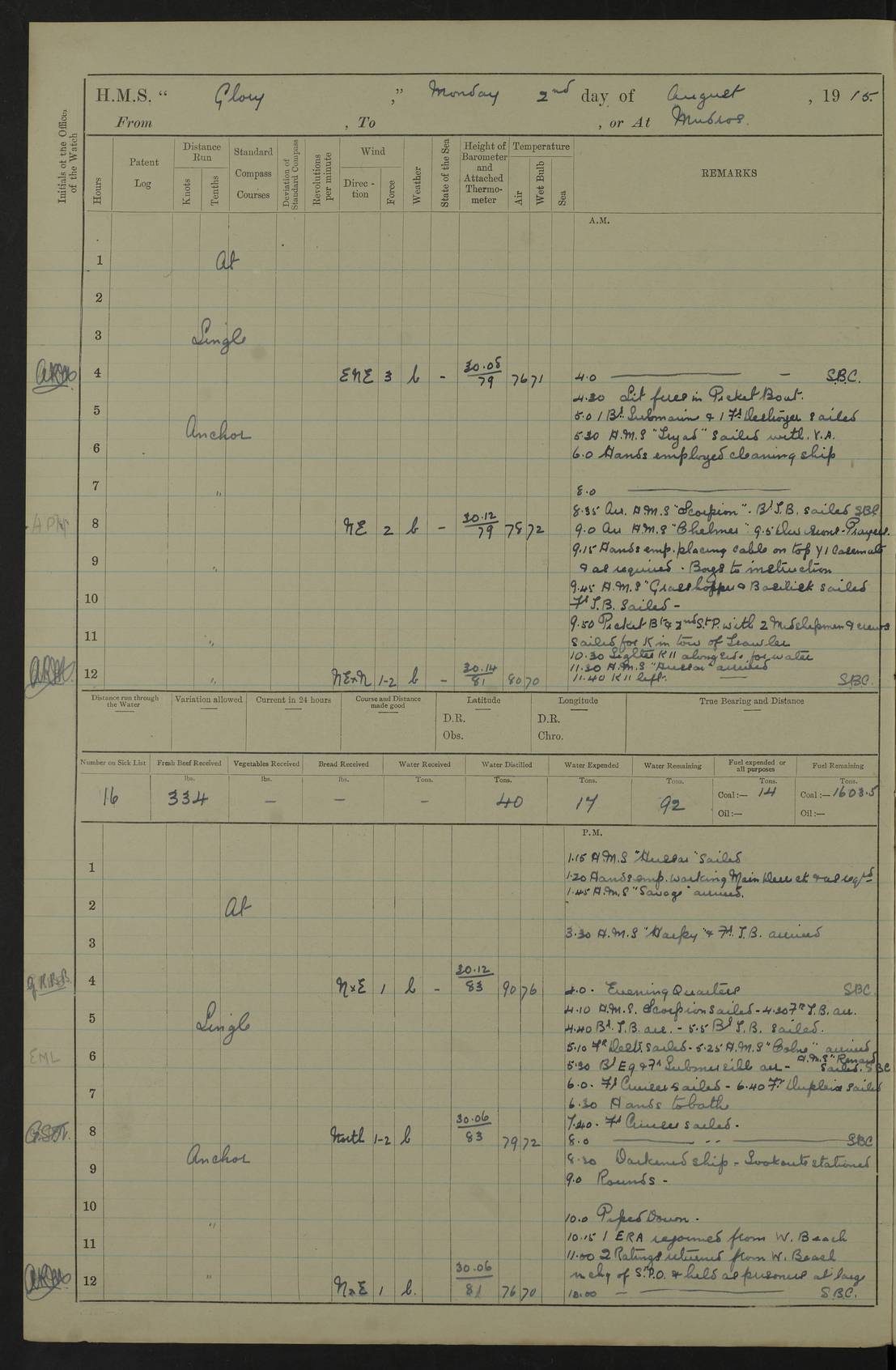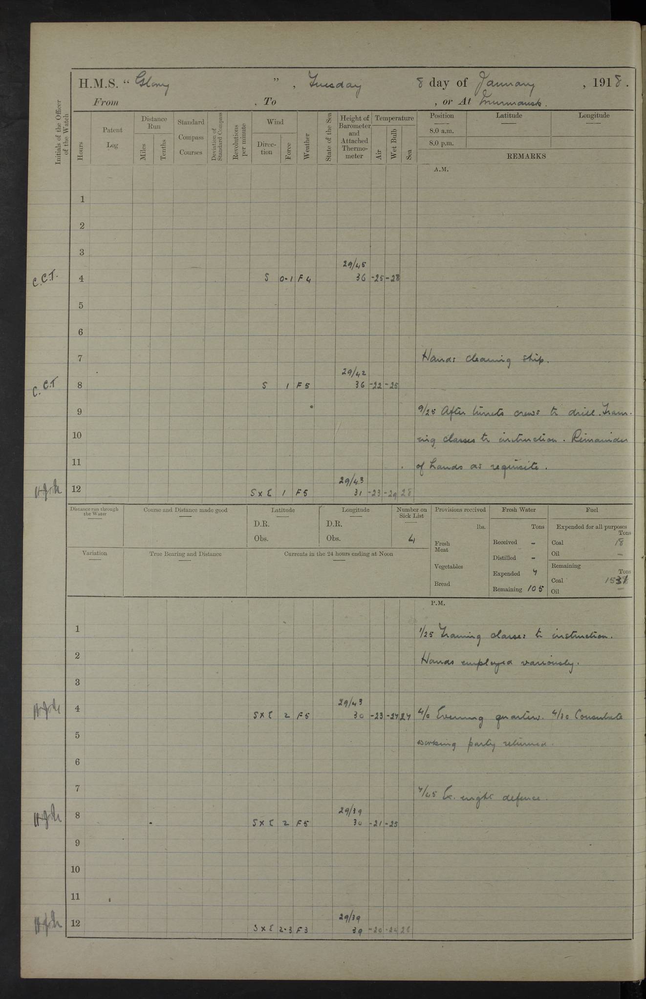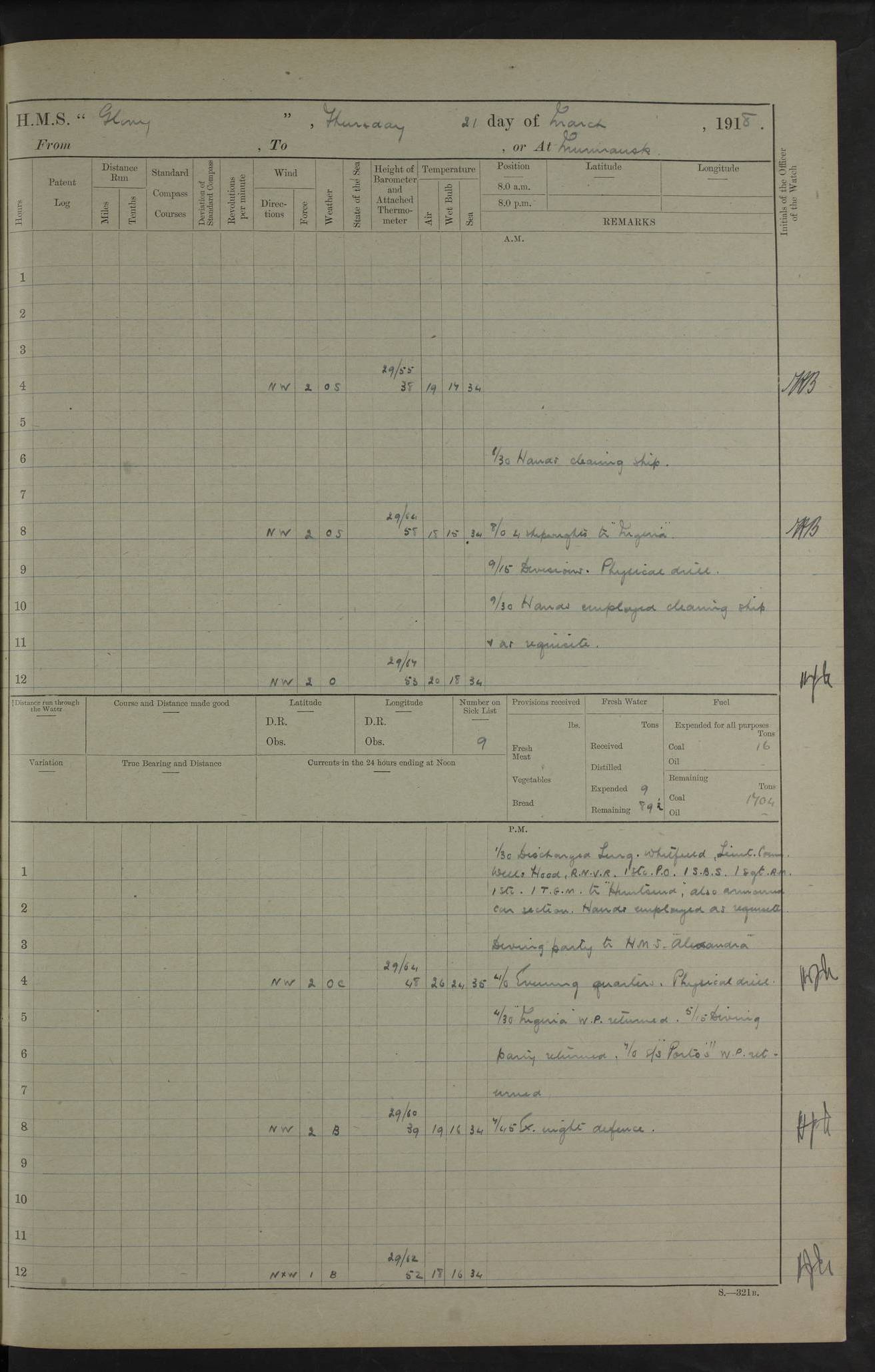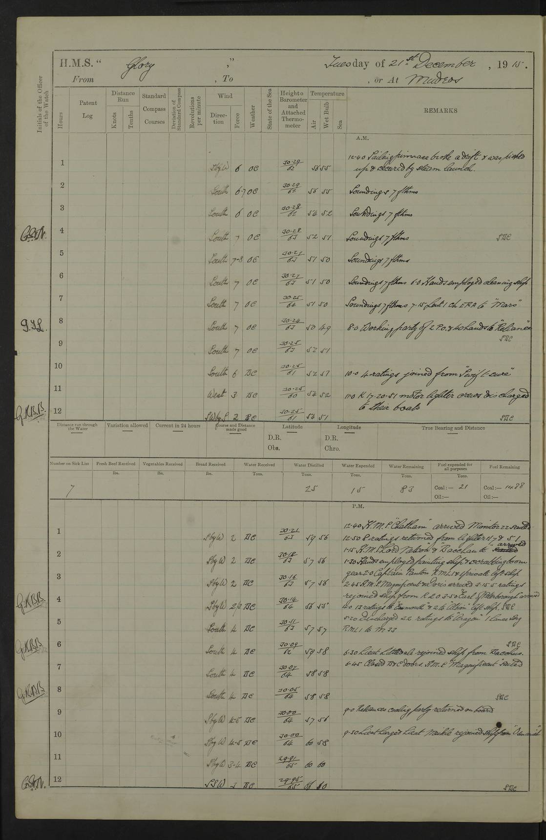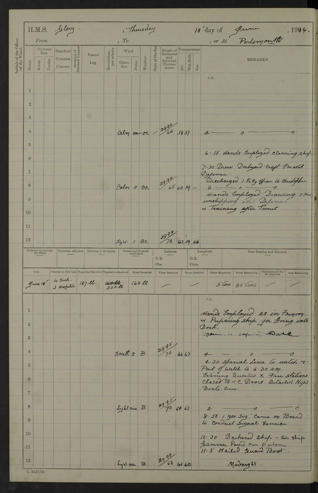 22 June 1915 At sea, Gibraltar to Lemnos Lat 36.1, Long -1.3 4.15am: Sighted land on starboard bow. 10.20am: Stopped port engine for repairs. 11.20am: proceeded with port engine. pm: a/c due to change in deviation. 10.00pm: Cape Tenez Light abeam, 18 miles. 4f73cd61a2fc8ea9030015f6: (https://s3.amazonaws.com:443/oldweather/ADM53-43015/0012_1.jpg) 23 June 1915 At sea, Gibraltar to Lemnos Lat 37.5, Long 4.8 Number on sick list: 4 5.00am: Secured from night defence stations. Placed anti-submarine guns. pm: Life saving appliances served out to men stationed in ? ?at abandon ship. 4f73cd61a2fc8ea9030015f7: (https://s3.amazonaws.com:443/oldweather/ADM53-43015/0013_0.jpg) 24 June 1915 At sea, Gibraltar to Lemnos Lat 37.4, Long 10.8 Position in log clearly bears no resemblance to the location of the ship. Position above is approximate and is based sighting of Zembra Island at 11.55am. 5.00am: Dispersed from night defence stations. Manned anti-submarine guns. am: Sighted two French torpedo boats. am: Torpedo boats passed to ~ No 362, 363. am: Sighted land on starboard beam. 11.55am: Zembra Island abeam, 25 miles. 2.00pm: Sighted Pantellaria S34ºE. 4.45pm: Pantellaria Light House abeam 12 miles. 4f73cd61a2fc8ea9030015f8: (https://s3.amazonaws.com:443/oldweather/ADM53-43015/0013_1.jpg) 25 June 1915 At sea, Gibraltar to Lemnos Lat 35.5, Long 16.7 2.10am: Gozo Light abeam 17 miles. 5.00am: Dispersed from night defence stations. Manned anti-submarine guns. 4f73cd61a2fc8ea9030015f9: (https://s3.amazonaws.com:443/oldweather/ADM53-43015/0014_0.jpg) 26 June 1915 At sea, Gibraltar to Lemnos Lat 35.5, Long 22.6 Number on sick list: 5 5.00am: Dispersed from night defence stations. Manned anti-submarine guns. am: Aired night clothing. am: marines at maxim practice on quarter deck. 2.00pm: Observed land on either bow. 3.00pm: Sighted French patrol destroyer. 4.15pm: Sighted French patrol destroyer. 9.40pm: Milo Peak N63ºW. 10.26pm: Polino Light abeam to port 5.5 miles. 4f73cd62a2fc8ea9030015fa: (https://s3.amazonaws.com:443/oldweather/ADM53-43015/0014_1.jpg) 27 June 1915 At sea and at Lemnos Lat 39.1, Long 24.4 From 0.50 to 3.05am sighting of multiple light houses. 3.50am: a/c to N39ºW and commenced to zig-zag. 5.00am: Dispersed from night defence stations and placed anti-submarine guns and look-outs. am: Lost overboard by accident Hazlewood fender, pat. 311, one in number. 10.30am: Held Divine Service onboard. pm: Met and signalled HMS Minerva on patrol duty. pm: Courses and speeds as requisite while waiting orders to approach Mudros. 3.00pm: Proceeded. 5.16pm: Increased to 90 revs, commenced to zig-zag. Course as requisite for Mudros. 7.00pm: Entered Mudros Bay. 7.47pm: Stopped. Let go port anchor in ‘M3’. 8.30pm: Darkened ship. pm: Manned one 6” and one 12 pdr. 4f73cd62a2fc8ea9030015fb: (https://s3.amazonaws.com:443/oldweather/ADM53-43015/0015_0.jpg) 28 June 1915 Mudros Bay, Lemnos Lat 39.89, Long 25.24 5,00am: HMS Vengeance entered harbour. HMS Vengeance was a pre-dreadnought of the Canopus class, launched in 1899 at Vickers, Barrow, and sold for scrapping in 1921. Details at http://en.wikipedia.org/wiki/HMS_Vengeance_(1899) . am/pm/: hands preparing for coaling and about ship’s work. pm: Collier Wabana secured alongside. 4f73cd62a2fc8ea9030015fc: (https://s3.amazonaws.com:443/oldweather/ADM53-43015/0015_1.jpg) 29 June 1915 Mudros Bay, Lemnos Lat 39.89, Long 25.24 5.15am: Commenced coaling. 2.00pm: Finished coaling. Collier left. 4f73cd62a2fc8ea9030015fd: (https://s3.amazonaws.com:443/oldweather/ADM53-43015/0016_0.jpg) 30 June 1915 Mudros Bay, Lemnos Lat 39.89, Long 25.24 am: Parties away sanding, and with fire engines onshore. am: Boats away disembarking troops. am: French Flagship Patrie sailed. The Patrie was a French pre-dreadnought, launched at La Seyne shipyard in 1903, and stricken in 1921. Details at http://en.wikipedia.org/wiki/French_battleship_Patrie . 6.30pm: Hands to bathe. 4f73cd63a2fc8ea9030015fe: (https://s3.amazonaws.com:443/oldweather/ADM53-43015/0016_1.jpg) 4f73cd63a2fc8ea9030015ff: (https://s3.amazonaws.com:443/oldweather/ADM53-43015/0017_0.jpg) 4f73cd63a2fc8ea903001600: (https://s3.amazonaws.com:443/oldweather/ADM53-43015/0017_1.jpg) 4f73cd63a2fc8ea903001601: (https://s3.amazonaws.com:443/oldweather/ADM53-43015/0018_0.jpg) 4f73cd64a2fc8ea903001602: (https://s3.amazonaws.com:443/oldweather/ADM53-43015/0018_1.jpg) LOGS FOR JULY 1915 From July to October 1915, HMS Glory spent her time at Port Mudros. Certain activities typically took place daily and are not generally noted in the pages below. These activities include: Lighting fires in the picket boat around 4am and drawing the fires in the late evening; Divisions at around 9–9.30am and Evening Quarters at 4pm; Darken ship at around 8.30pm; Daily ‘cleaning ship’, with variations thereof; SBC (for ‘Signal Books Correct’) at the watch changes. 4f73cd64a2fc8ea903001603: (https://s3.amazonaws.com:443/oldweather/ADM53-43016/0000_0.jpg) 4f73cd64a2fc8ea903001604: (https://s3.amazonaws.com:443/oldweather/ADM53-43016/0000_1.jpg) 4f73cd65a2fc8ea903001605: (https://s3.amazonaws.com:443/oldweather/ADM53-43016/0001_0.jpg) 4f73cd65a2fc8ea903001606: (https://s3.amazonaws.com:443/oldweather/ADM53-43016/0001_1.jpg) 1 July 1915 Port Mudros Lat 39.89, Long 25.24 6.30am: Landed working parties preparing boom defence ships. am: Discharged Acting Commander Rayne to Hector. Hector was a kite balloon ship. No further details readily available. 5.00pm: Tug T.10 made fast astern. 7.15pm: HMS Venerable went out. 7.30pm: HMS Chatham went out. HMS Chatham was a ‘Town’ cruiser and lead ship of her class. She was launched in 1911 at Chatham Dockyard and sold in 1926. Details at http://en.wikipedia.org/wiki/HMS_Chatham_(1911) . 4f73cd65a2fc8ea903001607: (https://s3.amazonaws.com:443/oldweather/ADM53-43016/0002_0.jpg) 2 July 1915 Port Mudros Lat 39.89, Long 25.24 5.35am: Landed working parties preparing boom defence ships. am/pm: Boom defence par
