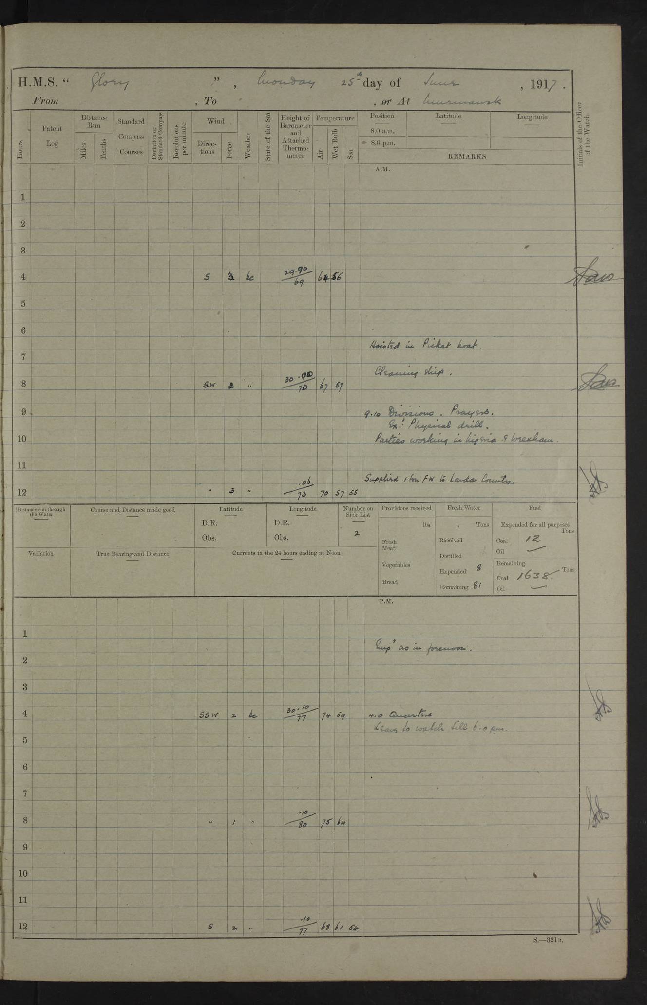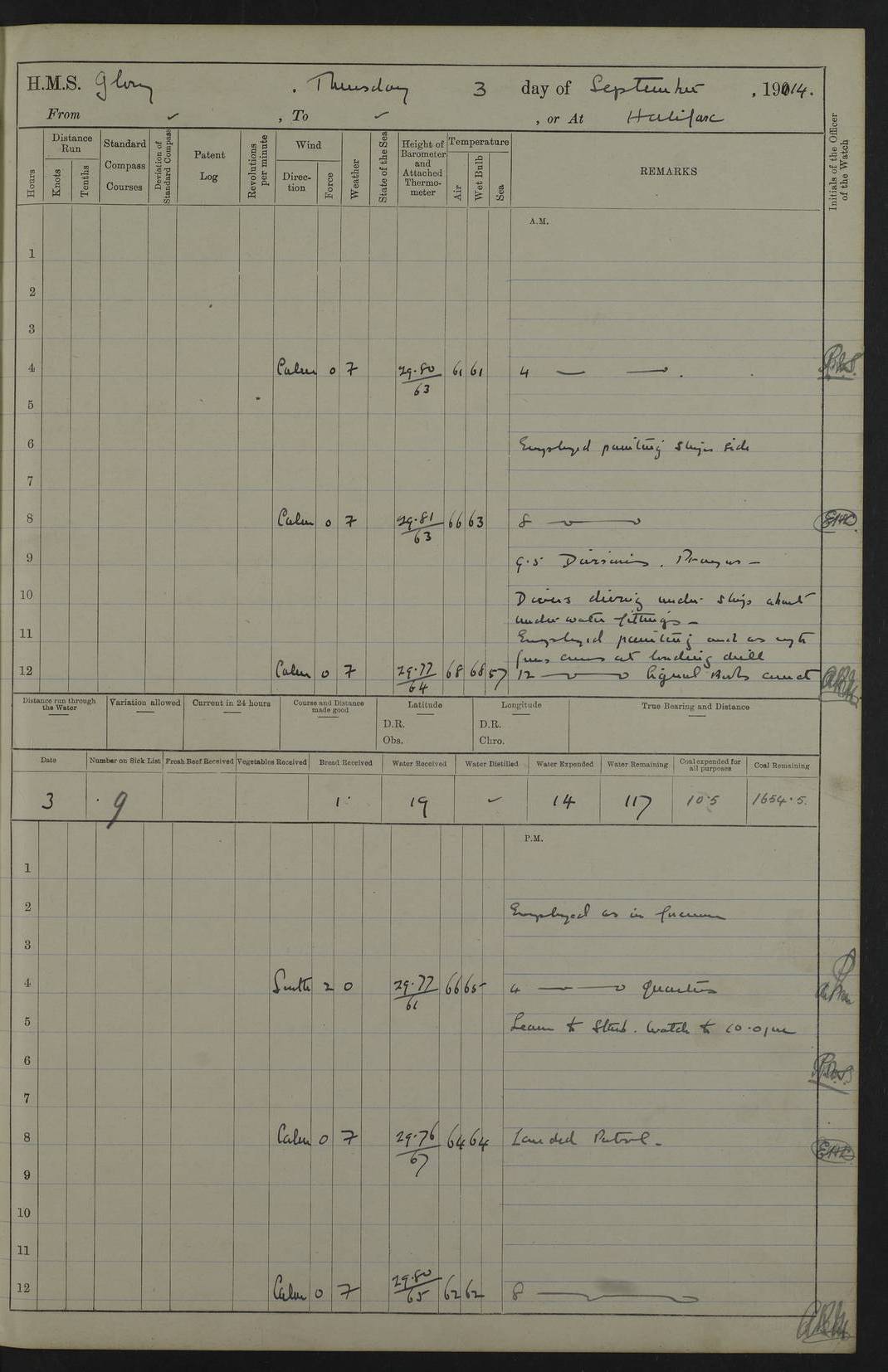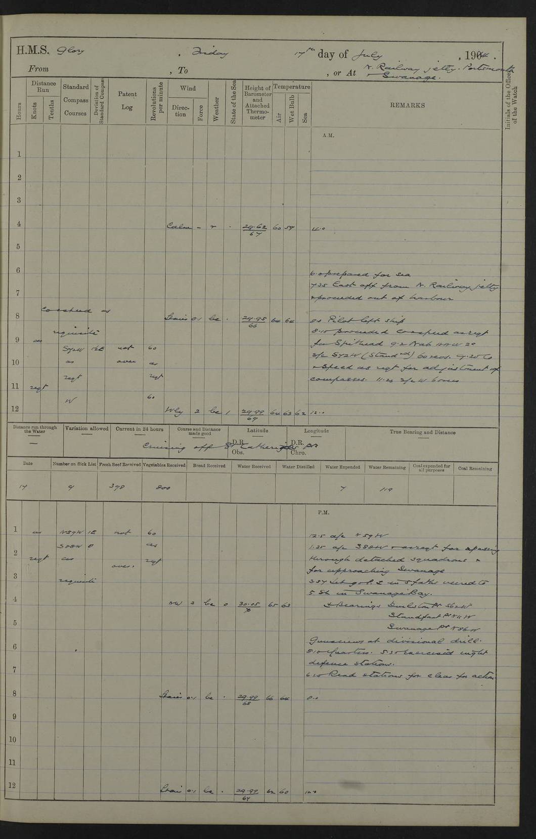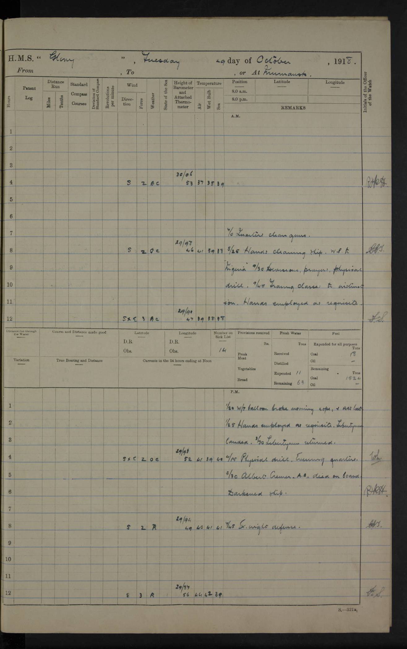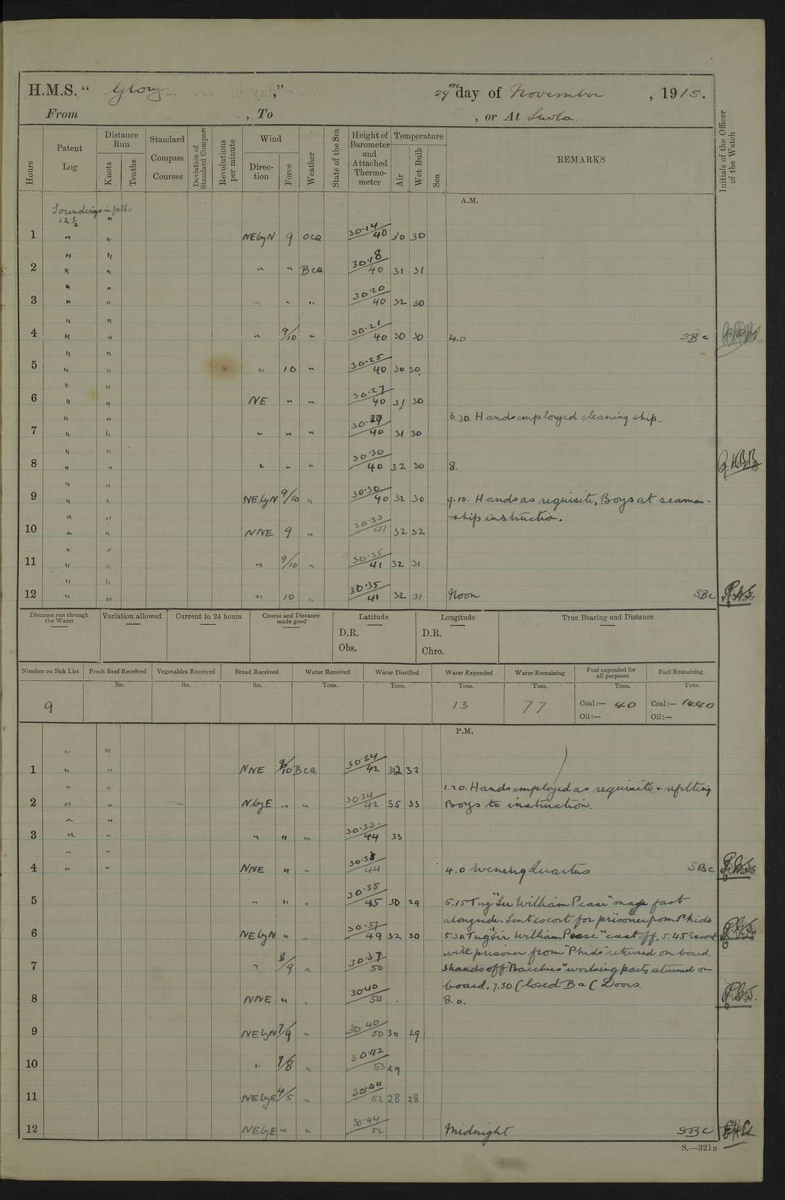 22 June 1915 At sea, Gibraltar to Lemnos Lat 36.1, Long -1.3 4.15am: Sighted land on starboard bow. 10.20am: Stopped port engine for repairs. 11.20am: proceeded with port engine. pm: a/c due to change in deviation. 10.00pm: Cape Tenez Light abeam, 18 miles. 4f73cd61a2fc8ea9030015f6: (https://s3.amazonaws.com:443/oldweather/ADM53-43015/0012_1.jpg) 23 June 1915 At sea, Gibraltar to Lemnos Lat 37.5, Long 4.8 Number on sick list: 4 5.00am: Secured from night defence stations. Placed anti-submarine guns. pm: Life saving appliances served out to men stationed in ? ?at abandon ship. 4f73cd61a2fc8ea9030015f7: (https://s3.amazonaws.com:443/oldweather/ADM53-43015/0013_0.jpg) 24 June 1915 At sea, Gibraltar to Lemnos Lat 37.4, Long 10.8 Position in log clearly bears no resemblance to the location of the ship. Position above is approximate and is based sighting of Zembra Island at 11.55am. 5.00am: Dispersed from night defence stations. Manned anti-submarine guns. am: Sighted two French torpedo boats. am: Torpedo boats passed to ~ No 362, 363. am: Sighted land on starboard beam. 11.55am: Zembra Island abeam, 25 miles. 2.00pm: Sighted Pantellaria S34ºE. 4.45pm: Pantellaria Light House abeam 12 miles. 4f73cd61a2fc8ea9030015f8: (https://s3.amazonaws.com:443/oldweather/ADM53-43015/0013_1.jpg) 25 June 1915 At sea, Gibraltar to Lemnos Lat 35.5, Long 16.7 2.10am: Gozo Light abeam 17 miles. 5.00am: Dispersed from night defence stations. Manned anti-submarine guns. 4f73cd61a2fc8ea9030015f9: (https://s3.amazonaws.com:443/oldweather/ADM53-43015/0014_0.jpg) 26 June 1915 At sea, Gibraltar to Lemnos Lat 35.5, Long 22.6 Number on sick list: 5 5.00am: Dispersed from night defence stations. Manned anti-submarine guns. am: Aired night clothing. am: marines at maxim practice on quarter deck. 2.00pm: Observed land on either bow. 3.00pm: Sighted French patrol destroyer. 4.15pm: Sighted French patrol destroyer. 9.40pm: Milo Peak N63ºW. 10.26pm: Polino Light abeam to port 5.5 miles. 4f73cd62a2fc8ea9030015fa: (https://s3.amazonaws.com:443/oldweather/ADM53-43015/0014_1.jpg) 27 June 1915 At sea and at Lemnos Lat 39.1, Long 24.4 From 0.50 to 3.05am sighting of multiple light houses. 3.50am: a/c to N39ºW and commenced to zig-zag. 5.00am: Dispersed from night defence stations and placed anti-submarine guns and look-outs. am: Lost overboard by accident Hazlewood fender, pat. 311, one in number. 10.30am: Held Divine Service onboard. pm: Met and signalled HMS Minerva on patrol duty. pm: Courses and speeds as requisite while waiting orders to approach Mudros. 3.00pm: Proceeded. 5.16pm: Increased to 90 revs, commenced to zig-zag. Course as requisite for Mudros. 7.00pm: Entered Mudros Bay. 7.47pm: Stopped. Let go port anchor in ‘M3’. 8.30pm: Darkened ship. pm: Manned one 6” and one 12 pdr. 4f73cd62a2fc8ea9030015fb: (https://s3.amazonaws.com:443/oldweather/ADM53-43015/0015_0.jpg) 28 June 1915 Mudros Bay, Lemnos Lat 39.89, Long 25.24 5,00am: HMS Vengeance entered harbour. HMS Vengeance was a pre-dreadnought of the Canopus class, launched in 1899 at Vickers, Barrow, and sold for scrapping in 1921. Details at http://en.wikipedia.org/wiki/HMS_Vengeance_(1899) . am/pm/: hands preparing for coaling and about ship’s work. pm: Collier Wabana secured alongside. 4f73cd62a2fc8ea9030015fc: (https://s3.amazonaws.com:443/oldweather/ADM53-43015/0015_1.jpg) 29 June 1915 Mudros Bay, Lemnos Lat 39.89, Long 25.24 5.15am: Commenced coaling. 2.00pm: Finished coaling. Collier left. 4f73cd62a2fc8ea9030015fd: (https://s3.amazonaws.com:443/oldweather/ADM53-43015/0016_0.jpg) 30 June 1915 Mudros Bay, Lemnos Lat 39.89, Long 25.24 am: Parties away sanding, and with fire engines onshore. am: Boats away disembarking troops. am: French Flagship Patrie sailed. The Patrie was a French pre-dreadnought, launched at La Seyne shipyard in 1903, and stricken in 1921. Details at http://en.wikipedia.org/wiki/French_battleship_Patrie . 6.30pm: Hands to bathe. 4f73cd63a2fc8ea9030015fe: (https://s3.amazonaws.com:443/oldweather/ADM53-43015/0016_1.jpg) 4f73cd63a2fc8ea9030015ff: (https://s3.amazonaws.com:443/oldweather/ADM53-43015/0017_0.jpg) 4f73cd63a2fc8ea903001600: (https://s3.amazonaws.com:443/oldweather/ADM53-43015/0017_1.jpg) 4f73cd63a2fc8ea903001601: (https://s3.amazonaws.com:443/oldweather/ADM53-43015/0018_0.jpg) 4f73cd64a2fc8ea903001602: (https://s3.amazonaws.com:443/oldweather/ADM53-43015/0018_1.jpg) LOGS FOR JULY 1915 From July to October 1915, HMS Glory spent her time at Port Mudros. Certain activities typically took place daily and are not generally noted in the pages below. These activities include: Lighting fires in the picket boat around 4am and drawing the fires in the late evening; Divisions at around 9–9.30am and Evening Quarters at 4pm; Darken ship at around 8.30pm; Daily ‘cleaning ship’, with variations thereof; SBC (for ‘Signal Books Correct’) at the watch changes. 4f73cd64a2fc8ea903001603: (https://s3.amazonaws.com:443/oldweather/ADM53-43016/0000_0.jpg) 4f73cd64a2fc8ea903001604: (https://s3.amazonaws.com:443/oldweather/ADM53-43016/0000_1.jpg) 4f73cd65a2fc8ea903001605: (https://s3.amazonaws.com:443/oldweather/ADM53-43016/0001_0.jpg) 4f73cd65a2fc8ea903001606: (https://s3.amazonaws.com:443/oldweather/ADM53-43016/0001_1.jpg) 1 July 1915 Port Mudros Lat 39.89, Long 25.24 6.30am: Landed working parties preparing boom defence ships. am: Discharged Acting Commander Rayne to Hector. Hector was a kite balloon ship. No further details readily available. 5.00pm: Tug T.10 made fast astern. 7.15pm: HMS Venerable went out. 7.30pm: HMS Chatham went out. HMS Chatham was a ‘Town’ cruiser and lead ship of her class. She was launched in 1911 at Chatham Dockyard and sold in 1926. Details at http://en.wikipedia.org/wiki/HMS_Chatham_(1911) . 4f73cd65a2fc8ea903001607: (https://s3.amazonaws.com:443/oldweather/ADM53-43016/0002_0.jpg) 2 July 1915 Port Mudros Lat 39.89, Long 25.24 5.35am: Landed working parties preparing boom defence ships. am/pm: Boom defence par