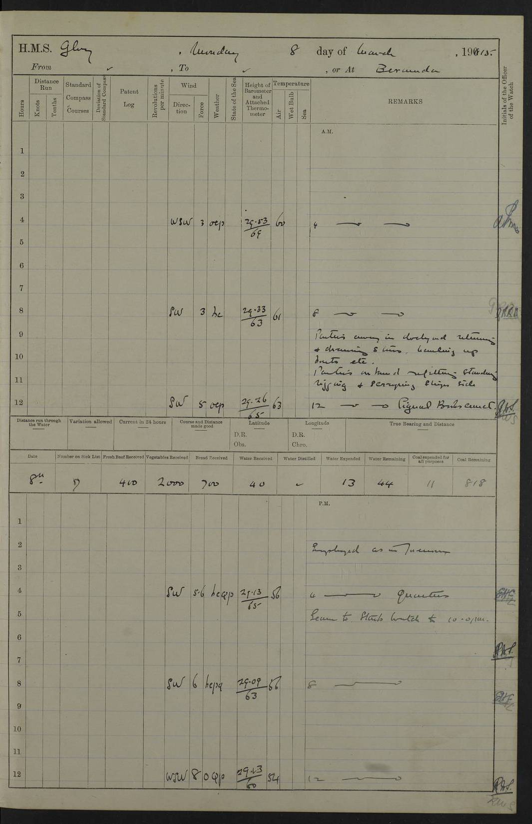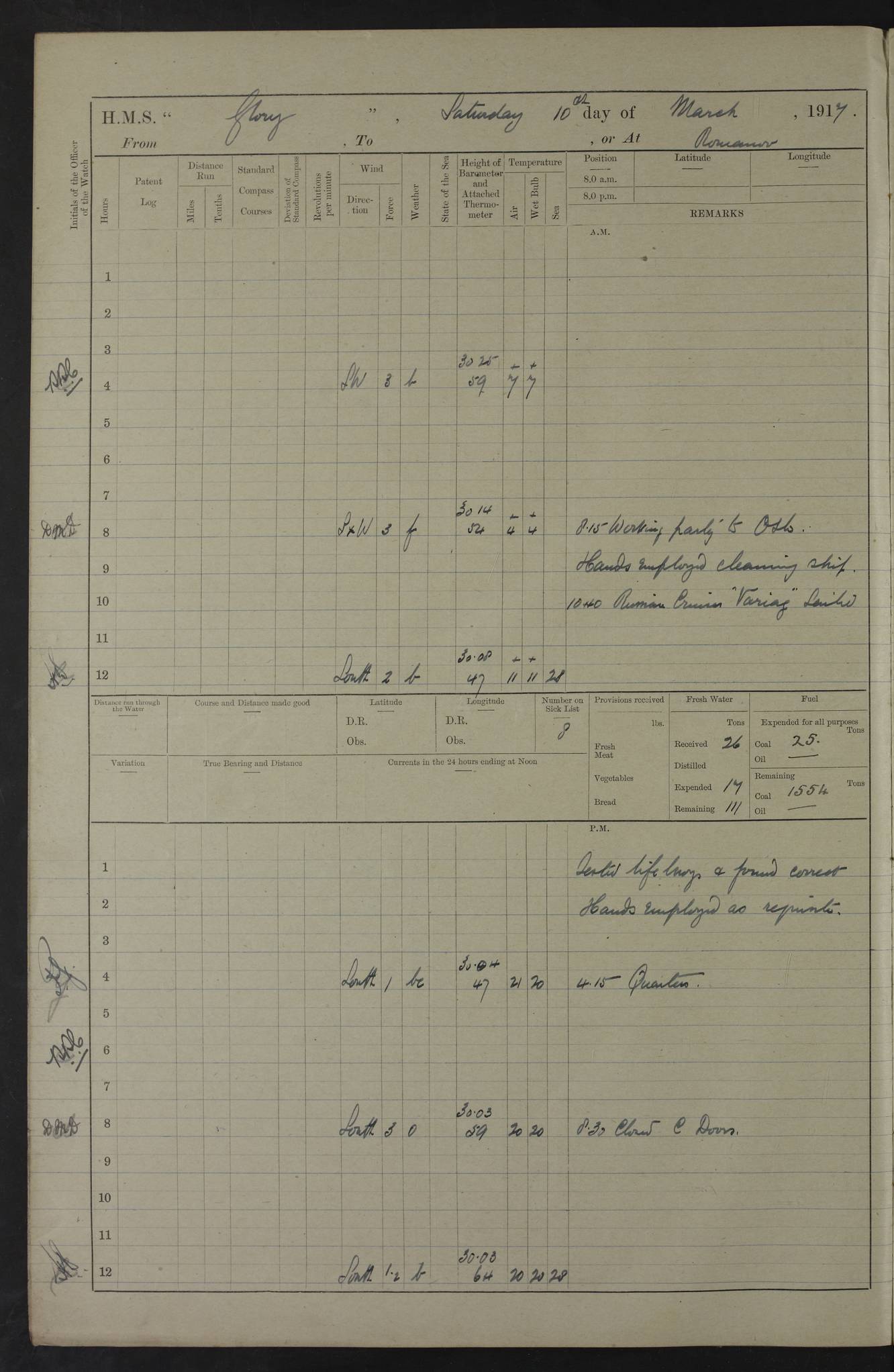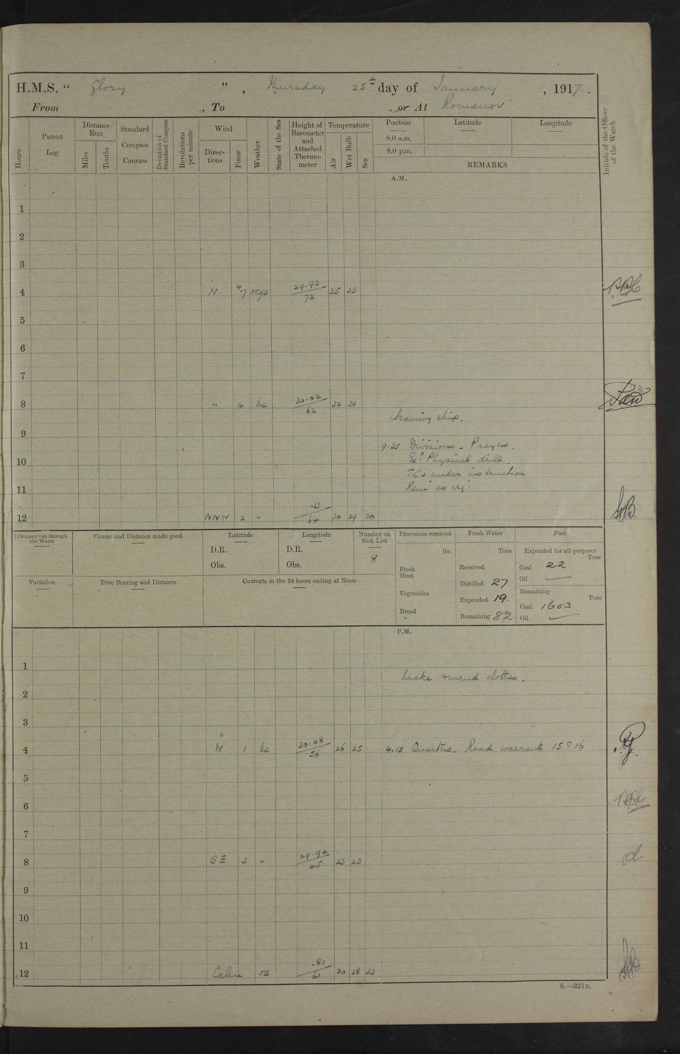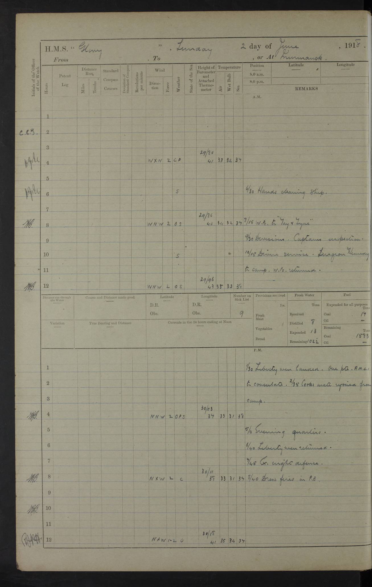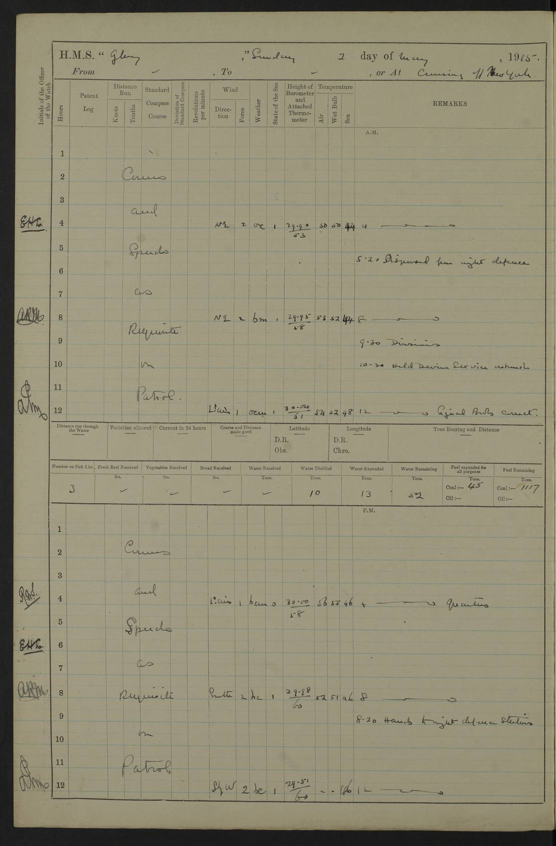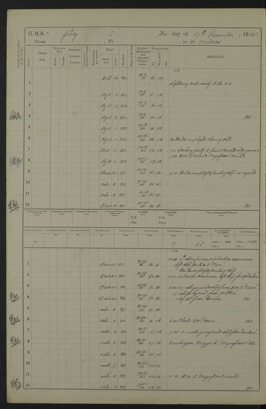 22 June 1915 At sea, Gibraltar to Lemnos Lat 36.1, Long -1.3 4.15am: Sighted land on starboard bow. 10.20am: Stopped port engine for repairs. 11.20am: proceeded with port engine. pm: a/c due to change in deviation. 10.00pm: Cape Tenez Light abeam, 18 miles. 4f73cd61a2fc8ea9030015f6: (https://s3.amazonaws.com:443/oldweather/ADM53-43015/0012_1.jpg) 23 June 1915 At sea, Gibraltar to Lemnos Lat 37.5, Long 4.8 Number on sick list: 4 5.00am: Secured from night defence stations. Placed anti-submarine guns. pm: Life saving appliances served out to men stationed in ? ?at abandon ship. 4f73cd61a2fc8ea9030015f7: (https://s3.amazonaws.com:443/oldweather/ADM53-43015/0013_0.jpg) 24 June 1915 At sea, Gibraltar to Lemnos Lat 37.4, Long 10.8 Position in log clearly bears no resemblance to the location of the ship. Position above is approximate and is based sighting of Zembra Island at 11.55am. 5.00am: Dispersed from night defence stations. Manned anti-submarine guns. am: Sighted two French torpedo boats. am: Torpedo boats passed to ~ No 362, 363. am: Sighted land on starboard beam. 11.55am: Zembra Island abeam, 25 miles. 2.00pm: Sighted Pantellaria S34ºE. 4.45pm: Pantellaria Light House abeam 12 miles. 4f73cd61a2fc8ea9030015f8: (https://s3.amazonaws.com:443/oldweather/ADM53-43015/0013_1.jpg) 25 June 1915 At sea, Gibraltar to Lemnos Lat 35.5, Long 16.7 2.10am: Gozo Light abeam 17 miles. 5.00am: Dispersed from night defence stations. Manned anti-submarine guns. 4f73cd61a2fc8ea9030015f9: (https://s3.amazonaws.com:443/oldweather/ADM53-43015/0014_0.jpg) 26 June 1915 At sea, Gibraltar to Lemnos Lat 35.5, Long 22.6 Number on sick list: 5 5.00am: Dispersed from night defence stations. Manned anti-submarine guns. am: Aired night clothing. am: marines at maxim practice on quarter deck. 2.00pm: Observed land on either bow. 3.00pm: Sighted French patrol destroyer. 4.15pm: Sighted French patrol destroyer. 9.40pm: Milo Peak N63ºW. 10.26pm: Polino Light abeam to port 5.5 miles. 4f73cd62a2fc8ea9030015fa: (https://s3.amazonaws.com:443/oldweather/ADM53-43015/0014_1.jpg) 27 June 1915 At sea and at Lemnos Lat 39.1, Long 24.4 From 0.50 to 3.05am sighting of multiple light houses. 3.50am: a/c to N39ºW and commenced to zig-zag. 5.00am: Dispersed from night defence stations and placed anti-submarine guns and look-outs. am: Lost overboard by accident Hazlewood fender, pat. 311, one in number. 10.30am: Held Divine Service onboard. pm: Met and signalled HMS Minerva on patrol duty. pm: Courses and speeds as requisite while waiting orders to approach Mudros. 3.00pm: Proceeded. 5.16pm: Increased to 90 revs, commenced to zig-zag. Course as requisite for Mudros. 7.00pm: Entered Mudros Bay. 7.47pm: Stopped. Let go port anchor in ‘M3’. 8.30pm: Darkened ship. pm: Manned one 6” and one 12 pdr. 4f73cd62a2fc8ea9030015fb: (https://s3.amazonaws.com:443/oldweather/ADM53-43015/0015_0.jpg) 28 June 1915 Mudros Bay, Lemnos Lat 39.89, Long 25.24 5,00am: HMS Vengeance entered harbour. HMS Vengeance was a pre-dreadnought of the Canopus class, launched in 1899 at Vickers, Barrow, and sold for scrapping in 1921. Details at http://en.wikipedia.org/wiki/HMS_Vengeance_(1899) . am/pm/: hands preparing for coaling and about ship’s work. pm: Collier Wabana secured alongside. 4f73cd62a2fc8ea9030015fc: (https://s3.amazonaws.com:443/oldweather/ADM53-43015/0015_1.jpg) 29 June 1915 Mudros Bay, Lemnos Lat 39.89, Long 25.24 5.15am: Commenced coaling. 2.00pm: Finished coaling. Collier left. 4f73cd62a2fc8ea9030015fd: (https://s3.amazonaws.com:443/oldweather/ADM53-43015/0016_0.jpg) 30 June 1915 Mudros Bay, Lemnos Lat 39.89, Long 25.24 am: Parties away sanding, and with fire engines onshore. am: Boats away disembarking troops. am: French Flagship Patrie sailed. The Patrie was a French pre-dreadnought, launched at La Seyne shipyard in 1903, and stricken in 1921. Details at http://en.wikipedia.org/wiki/French_battleship_Patrie . 6.30pm: Hands to bathe. 4f73cd63a2fc8ea9030015fe: (https://s3.amazonaws.com:443/oldweather/ADM53-43015/0016_1.jpg) 4f73cd63a2fc8ea9030015ff: (https://s3.amazonaws.com:443/oldweather/ADM53-43015/0017_0.jpg) 4f73cd63a2fc8ea903001600: (https://s3.amazonaws.com:443/oldweather/ADM53-43015/0017_1.jpg) 4f73cd63a2fc8ea903001601: (https://s3.amazonaws.com:443/oldweather/ADM53-43015/0018_0.jpg) 4f73cd64a2fc8ea903001602: (https://s3.amazonaws.com:443/oldweather/ADM53-43015/0018_1.jpg) LOGS FOR JULY 1915 From July to October 1915, HMS Glory spent her time at Port Mudros. Certain activities typically took place daily and are not generally noted in the pages below. These activities include: Lighting fires in the picket boat around 4am and drawing the fires in the late evening; Divisions at around 9–9.30am and Evening Quarters at 4pm; Darken ship at around 8.30pm; Daily ‘cleaning ship’, with variations thereof; SBC (for ‘Signal Books Correct’) at the watch changes. 4f73cd64a2fc8ea903001603: (https://s3.amazonaws.com:443/oldweather/ADM53-43016/0000_0.jpg) 4f73cd64a2fc8ea903001604: (https://s3.amazonaws.com:443/oldweather/ADM53-43016/0000_1.jpg) 4f73cd65a2fc8ea903001605: (https://s3.amazonaws.com:443/oldweather/ADM53-43016/0001_0.jpg) 4f73cd65a2fc8ea903001606: (https://s3.amazonaws.com:443/oldweather/ADM53-43016/0001_1.jpg) 1 July 1915 Port Mudros Lat 39.89, Long 25.24 6.30am: Landed working parties preparing boom defence ships. am: Discharged Acting Commander Rayne to Hector. Hector was a kite balloon ship. No further details readily available. 5.00pm: Tug T.10 made fast astern. 7.15pm: HMS Venerable went out. 7.30pm: HMS Chatham went out. HMS Chatham was a ‘Town’ cruiser and lead ship of her class. She was launched in 1911 at Chatham Dockyard and sold in 1926. Details at http://en.wikipedia.org/wiki/HMS_Chatham_(1911) . 4f73cd65a2fc8ea903001607: (https://s3.amazonaws.com:443/oldweather/ADM53-43016/0002_0.jpg) 2 July 1915 Port Mudros Lat 39.89, Long 25.24 5.35am: Landed working parties preparing boom defence ships. am/pm: Boom defence par