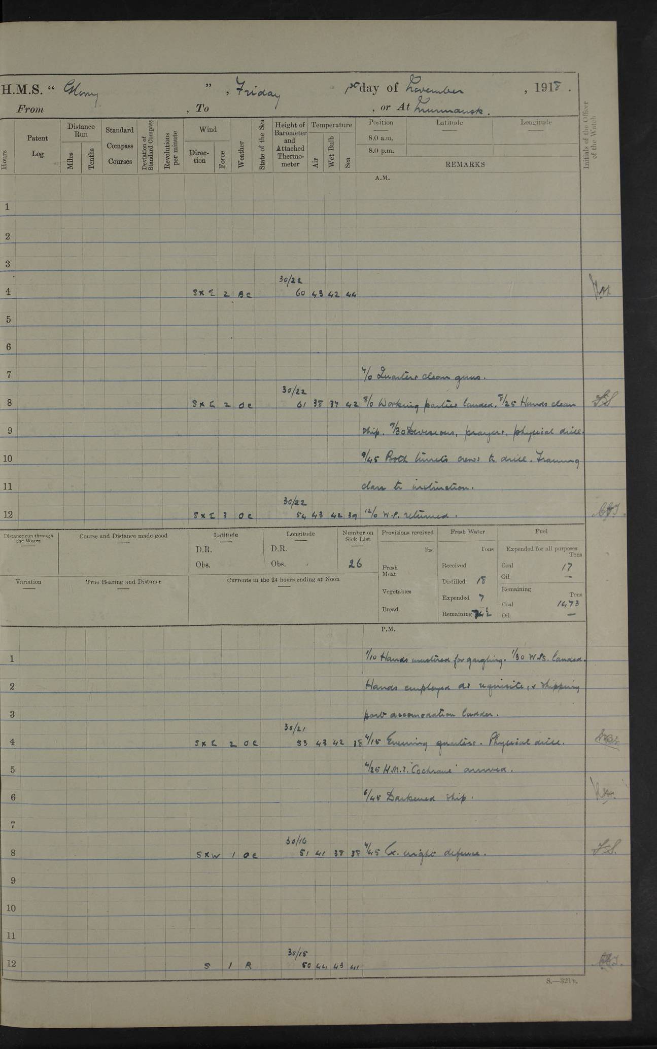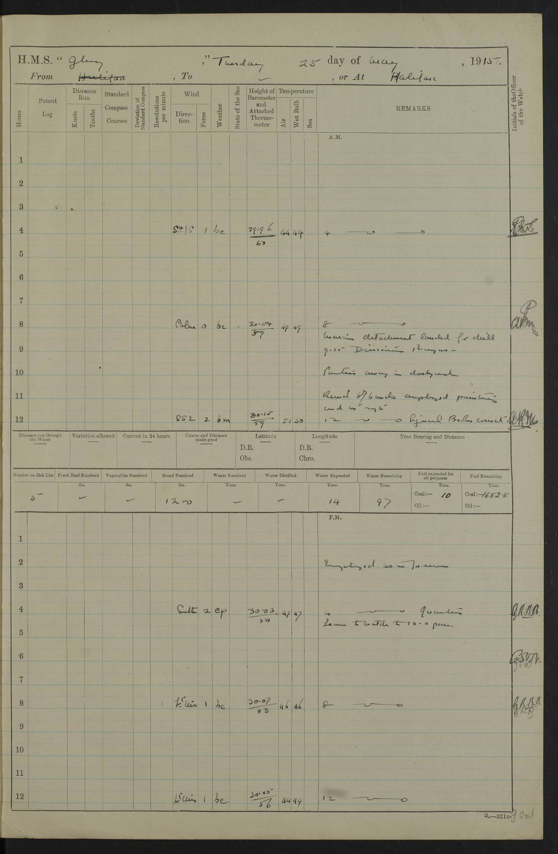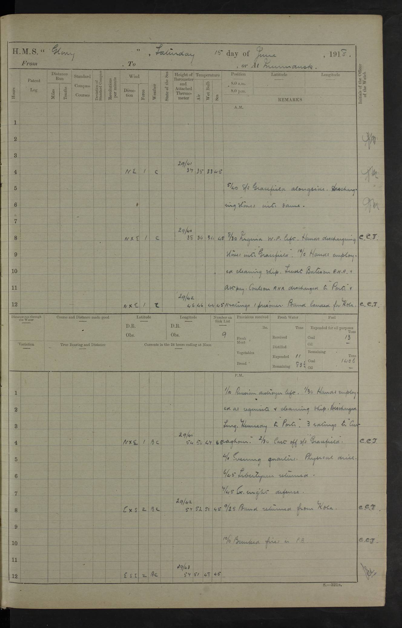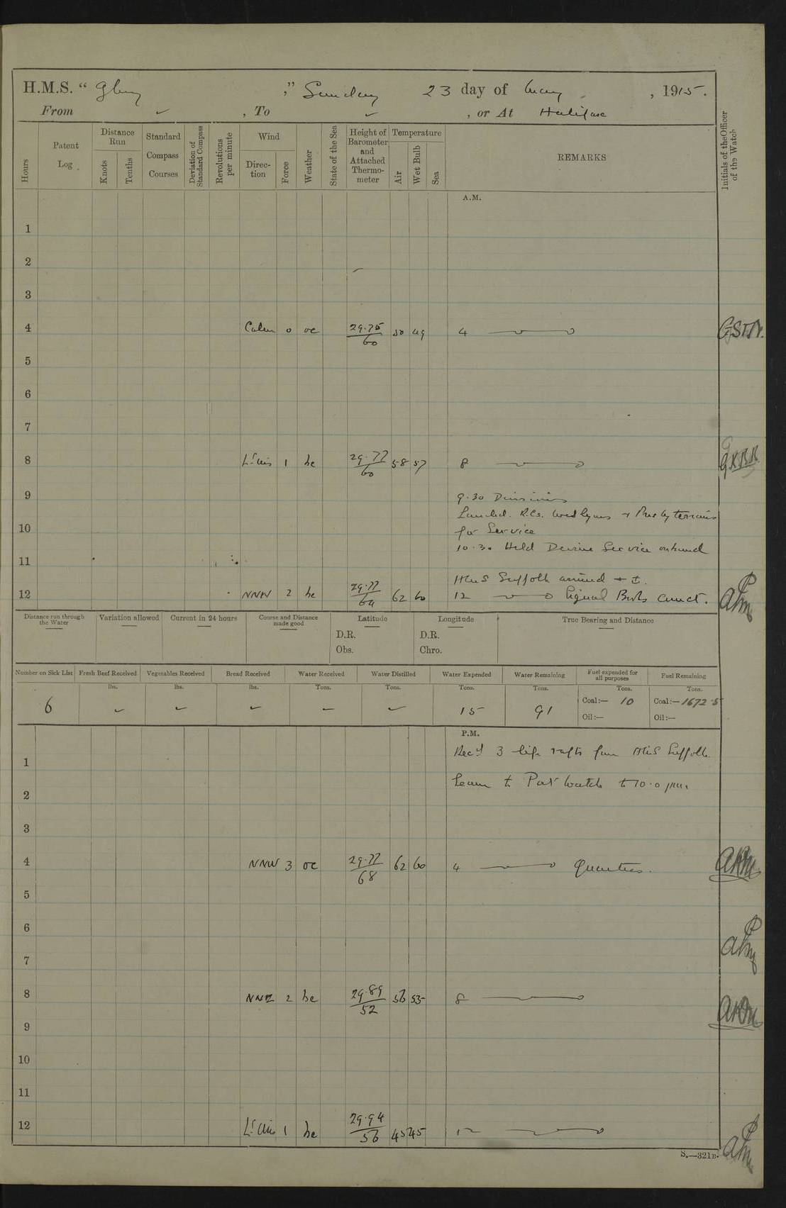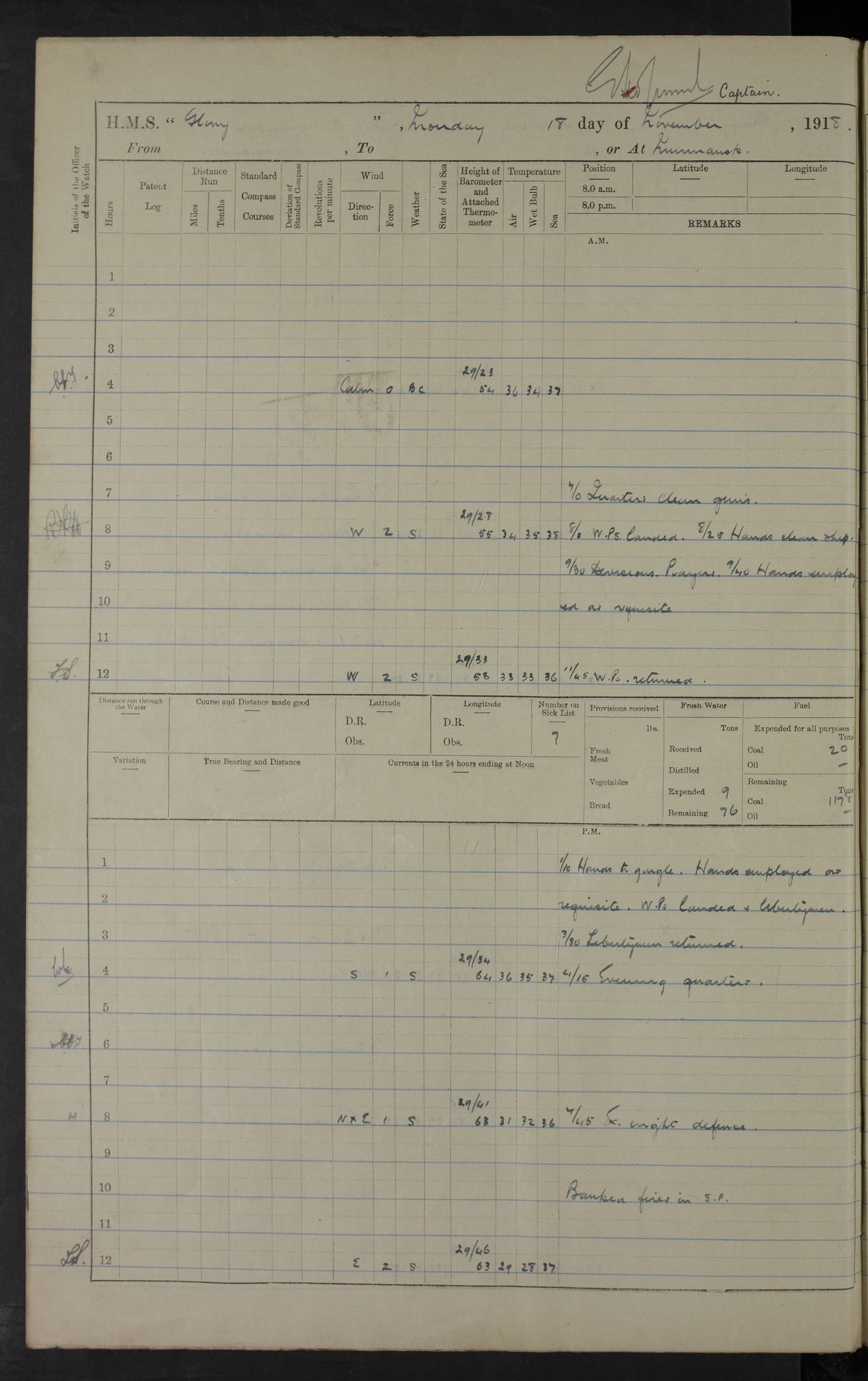 22 June 1915 At sea, Gibraltar to Lemnos Lat 36.1, Long -1.3 4.15am: Sighted land on starboard bow. 10.20am: Stopped port engine for repairs. 11.20am: proceeded with port engine. pm: a/c due to change in deviation. 10.00pm: Cape Tenez Light abeam, 18 miles. 4f73cd61a2fc8ea9030015f6: (https://s3.amazonaws.com:443/oldweather/ADM53-43015/0012_1.jpg) 23 June 1915 At sea, Gibraltar to Lemnos Lat 37.5, Long 4.8 Number on sick list: 4 5.00am: Secured from night defence stations. Placed anti-submarine guns. pm: Life saving appliances served out to men stationed in ? ?at abandon ship. 4f73cd61a2fc8ea9030015f7: (https://s3.amazonaws.com:443/oldweather/ADM53-43015/0013_0.jpg) 24 June 1915 At sea, Gibraltar to Lemnos Lat 37.4, Long 10.8 Position in log clearly bears no resemblance to the location of the ship. Position above is approximate and is based sighting of Zembra Island at 11.55am. 5.00am: Dispersed from night defence stations. Manned anti-submarine guns. am: Sighted two French torpedo boats. am: Torpedo boats passed to ~ No 362, 363. am: Sighted land on starboard beam. 11.55am: Zembra Island abeam, 25 miles. 2.00pm: Sighted Pantellaria S34ºE. 4.45pm: Pantellaria Light House abeam 12 miles. 4f73cd61a2fc8ea9030015f8: (https://s3.amazonaws.com:443/oldweather/ADM53-43015/0013_1.jpg) 25 June 1915 At sea, Gibraltar to Lemnos Lat 35.5, Long 16.7 2.10am: Gozo Light abeam 17 miles. 5.00am: Dispersed from night defence stations. Manned anti-submarine guns. 4f73cd61a2fc8ea9030015f9: (https://s3.amazonaws.com:443/oldweather/ADM53-43015/0014_0.jpg) 26 June 1915 At sea, Gibraltar to Lemnos Lat 35.5, Long 22.6 Number on sick list: 5 5.00am: Dispersed from night defence stations. Manned anti-submarine guns. am: Aired night clothing. am: marines at maxim practice on quarter deck. 2.00pm: Observed land on either bow. 3.00pm: Sighted French patrol destroyer. 4.15pm: Sighted French patrol destroyer. 9.40pm: Milo Peak N63ºW. 10.26pm: Polino Light abeam to port 5.5 miles. 4f73cd62a2fc8ea9030015fa: (https://s3.amazonaws.com:443/oldweather/ADM53-43015/0014_1.jpg) 27 June 1915 At sea and at Lemnos Lat 39.1, Long 24.4 From 0.50 to 3.05am sighting of multiple light houses. 3.50am: a/c to N39ºW and commenced to zig-zag. 5.00am: Dispersed from night defence stations and placed anti-submarine guns and look-outs. am: Lost overboard by accident Hazlewood fender, pat. 311, one in number. 10.30am: Held Divine Service onboard. pm: Met and signalled HMS Minerva on patrol duty. pm: Courses and speeds as requisite while waiting orders to approach Mudros. 3.00pm: Proceeded. 5.16pm: Increased to 90 revs, commenced to zig-zag. Course as requisite for Mudros. 7.00pm: Entered Mudros Bay. 7.47pm: Stopped. Let go port anchor in ‘M3’. 8.30pm: Darkened ship. pm: Manned one 6” and one 12 pdr. 4f73cd62a2fc8ea9030015fb: (https://s3.amazonaws.com:443/oldweather/ADM53-43015/0015_0.jpg) 28 June 1915 Mudros Bay, Lemnos Lat 39.89, Long 25.24 5,00am: HMS Vengeance entered harbour. HMS Vengeance was a pre-dreadnought of the Canopus class, launched in 1899 at Vickers, Barrow, and sold for scrapping in 1921. Details at http://en.wikipedia.org/wiki/HMS_Vengeance_(1899) . am/pm/: hands preparing for coaling and about ship’s work. pm: Collier Wabana secured alongside. 4f73cd62a2fc8ea9030015fc: (https://s3.amazonaws.com:443/oldweather/ADM53-43015/0015_1.jpg) 29 June 1915 Mudros Bay, Lemnos Lat 39.89, Long 25.24 5.15am: Commenced coaling. 2.00pm: Finished coaling. Collier left. 4f73cd62a2fc8ea9030015fd: (https://s3.amazonaws.com:443/oldweather/ADM53-43015/0016_0.jpg) 30 June 1915 Mudros Bay, Lemnos Lat 39.89, Long 25.24 am: Parties away sanding, and with fire engines onshore. am: Boats away disembarking troops. am: French Flagship Patrie sailed. The Patrie was a French pre-dreadnought, launched at La Seyne shipyard in 1903, and stricken in 1921. Details at http://en.wikipedia.org/wiki/French_battleship_Patrie . 6.30pm: Hands to bathe. 4f73cd63a2fc8ea9030015fe: (https://s3.amazonaws.com:443/oldweather/ADM53-43015/0016_1.jpg) 4f73cd63a2fc8ea9030015ff: (https://s3.amazonaws.com:443/oldweather/ADM53-43015/0017_0.jpg) 4f73cd63a2fc8ea903001600: (https://s3.amazonaws.com:443/oldweather/ADM53-43015/0017_1.jpg) 4f73cd63a2fc8ea903001601: (https://s3.amazonaws.com:443/oldweather/ADM53-43015/0018_0.jpg) 4f73cd64a2fc8ea903001602: (https://s3.amazonaws.com:443/oldweather/ADM53-43015/0018_1.jpg) LOGS FOR JULY 1915 From July to October 1915, HMS Glory spent her time at Port Mudros. Certain activities typically took place daily and are not generally noted in the pages below. These activities include: Lighting fires in the picket boat around 4am and drawing the fires in the late evening; Divisions at around 9–9.30am and Evening Quarters at 4pm; Darken ship at around 8.30pm; Daily ‘cleaning ship’, with variations thereof; SBC (for ‘Signal Books Correct’) at the watch changes. 4f73cd64a2fc8ea903001603: (https://s3.amazonaws.com:443/oldweather/ADM53-43016/0000_0.jpg) 4f73cd64a2fc8ea903001604: (https://s3.amazonaws.com:443/oldweather/ADM53-43016/0000_1.jpg) 4f73cd65a2fc8ea903001605: (https://s3.amazonaws.com:443/oldweather/ADM53-43016/0001_0.jpg) 4f73cd65a2fc8ea903001606: (https://s3.amazonaws.com:443/oldweather/ADM53-43016/0001_1.jpg) 1 July 1915 Port Mudros Lat 39.89, Long 25.24 6.30am: Landed working parties preparing boom defence ships. am: Discharged Acting Commander Rayne to Hector. Hector was a kite balloon ship. No further details readily available. 5.00pm: Tug T.10 made fast astern. 7.15pm: HMS Venerable went out. 7.30pm: HMS Chatham went out. HMS Chatham was a ‘Town’ cruiser and lead ship of her class. She was launched in 1911 at Chatham Dockyard and sold in 1926. Details at http://en.wikipedia.org/wiki/HMS_Chatham_(1911) . 4f73cd65a2fc8ea903001607: (https://s3.amazonaws.com:443/oldweather/ADM53-43016/0002_0.jpg) 2 July 1915 Port Mudros Lat 39.89, Long 25.24 5.35am: Landed working parties preparing boom defence ships. am/pm: Boom defence par