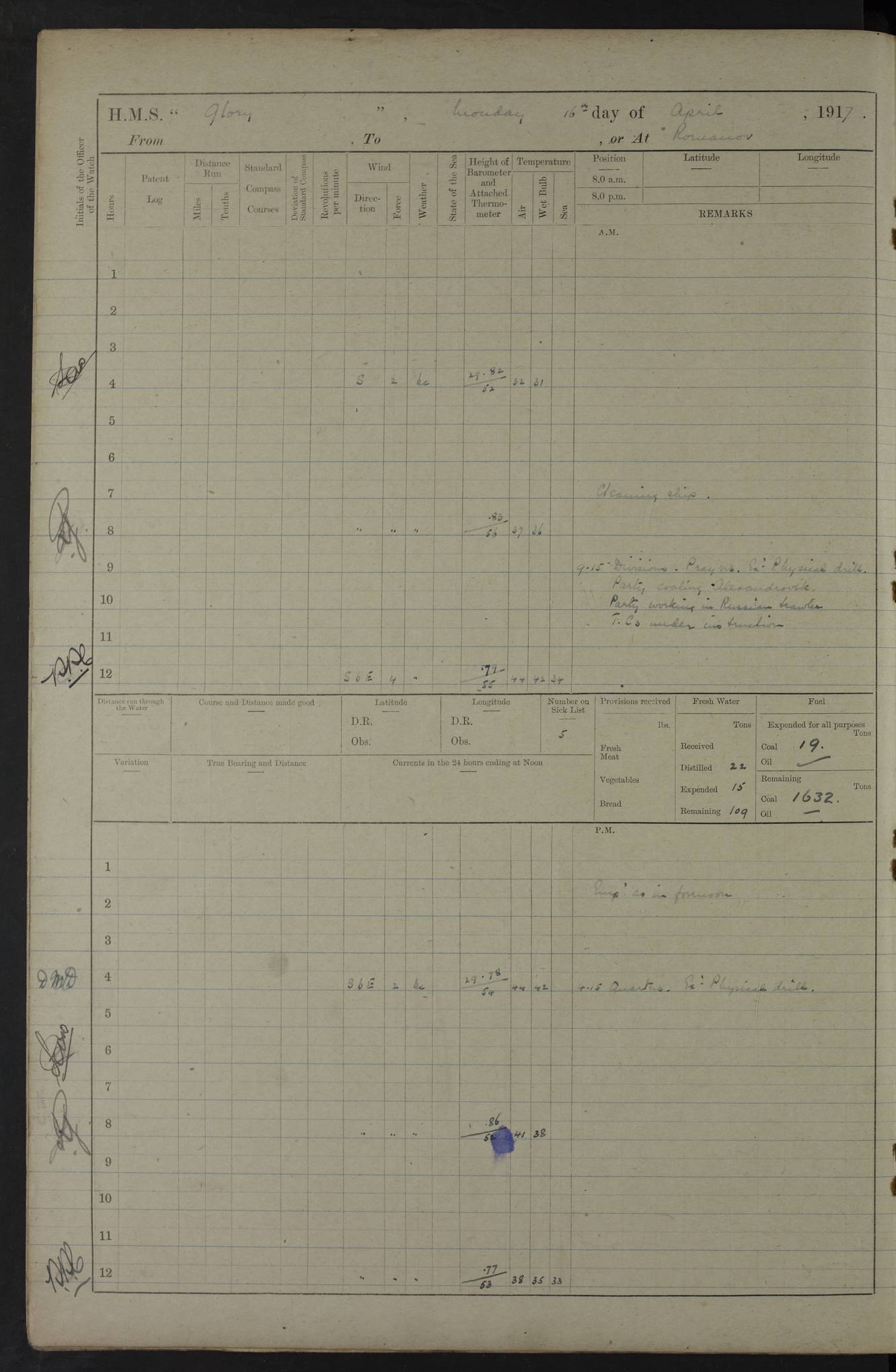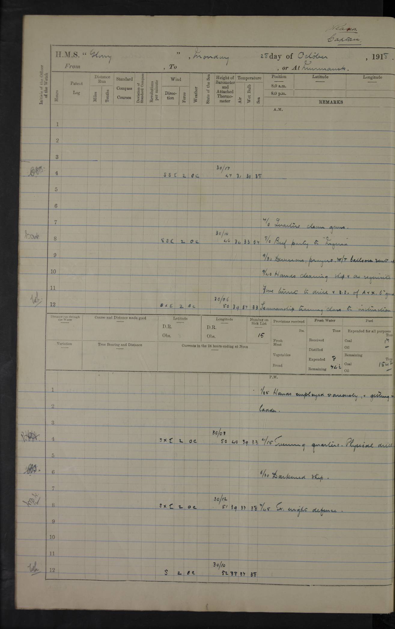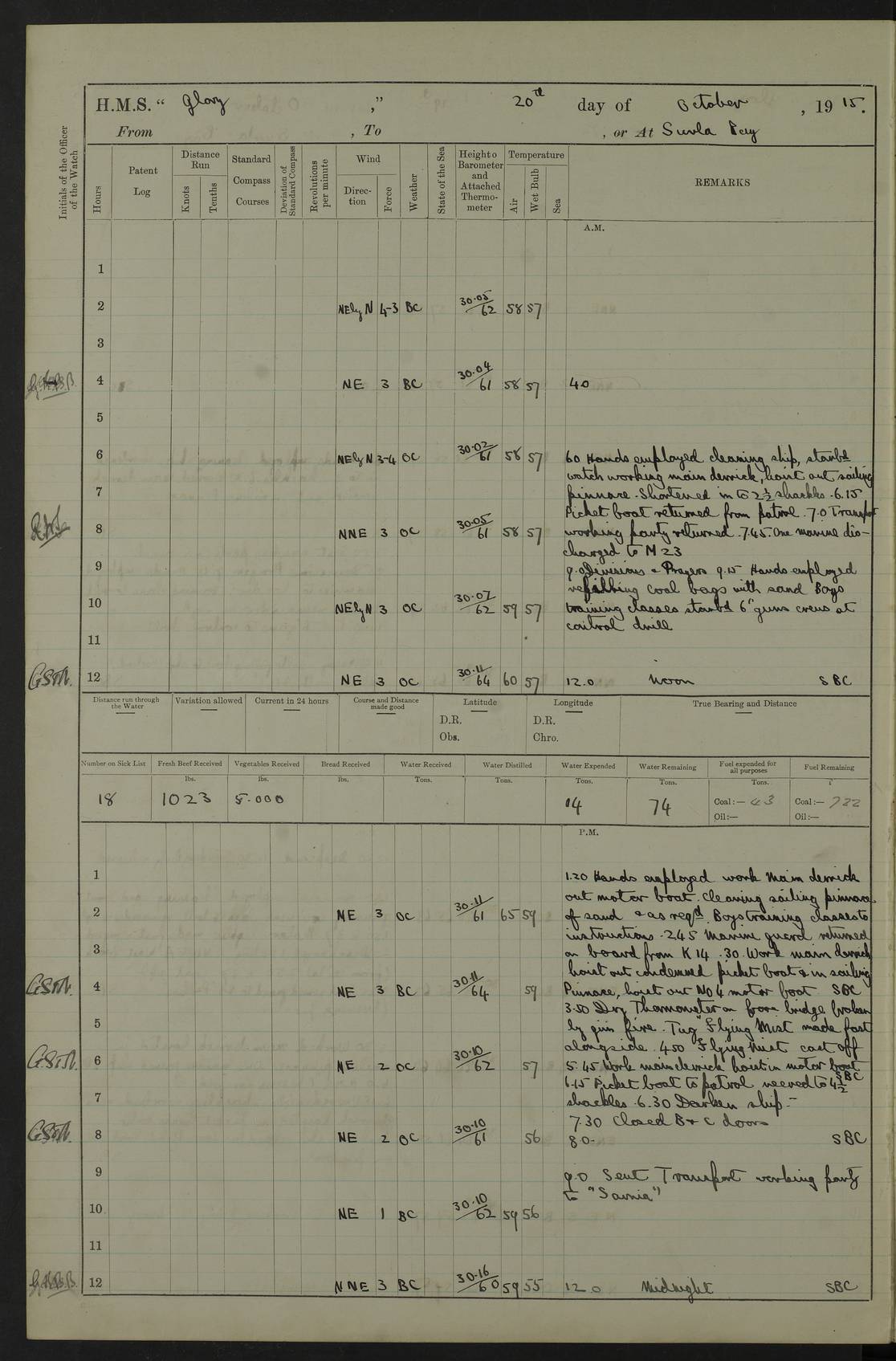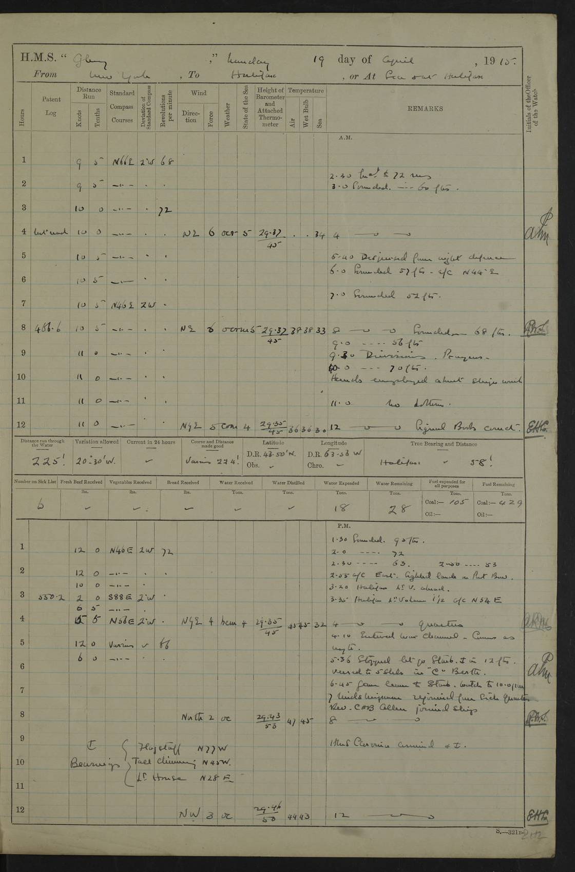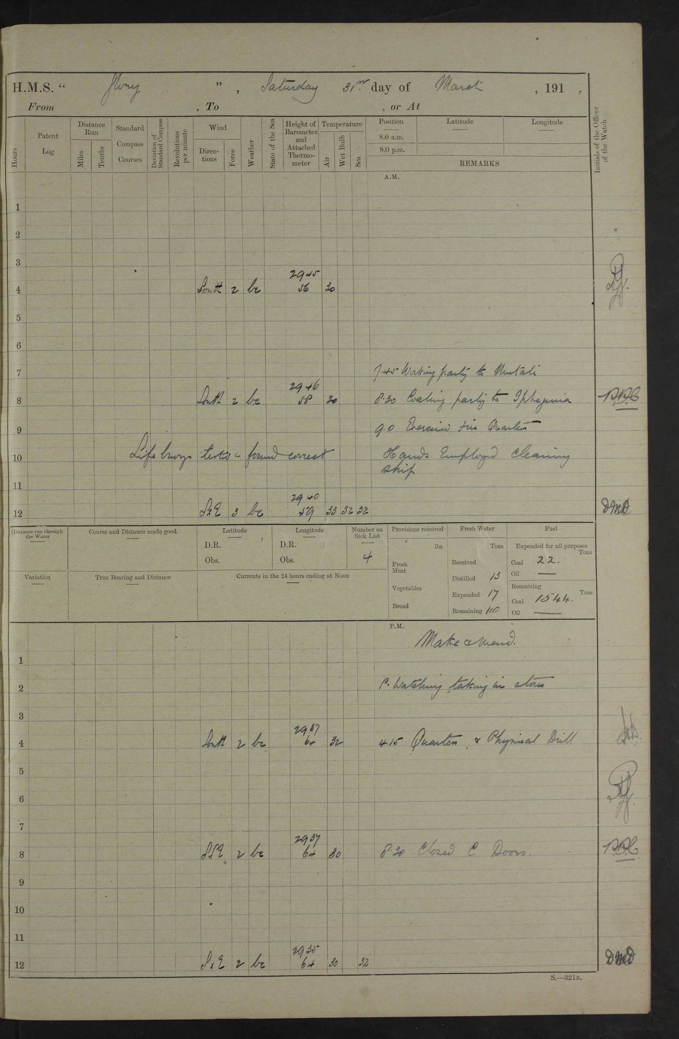 22 June 1915 At sea, Gibraltar to Lemnos Lat 36.1, Long -1.3 4.15am: Sighted land on starboard bow. 10.20am: Stopped port engine for repairs. 11.20am: proceeded with port engine. pm: a/c due to change in deviation. 10.00pm: Cape Tenez Light abeam, 18 miles. 4f73cd61a2fc8ea9030015f6: (https://s3.amazonaws.com:443/oldweather/ADM53-43015/0012_1.jpg) 23 June 1915 At sea, Gibraltar to Lemnos Lat 37.5, Long 4.8 Number on sick list: 4 5.00am: Secured from night defence stations. Placed anti-submarine guns. pm: Life saving appliances served out to men stationed in ? ?at abandon ship. 4f73cd61a2fc8ea9030015f7: (https://s3.amazonaws.com:443/oldweather/ADM53-43015/0013_0.jpg) 24 June 1915 At sea, Gibraltar to Lemnos Lat 37.4, Long 10.8 Position in log clearly bears no resemblance to the location of the ship. Position above is approximate and is based sighting of Zembra Island at 11.55am. 5.00am: Dispersed from night defence stations. Manned anti-submarine guns. am: Sighted two French torpedo boats. am: Torpedo boats passed to ~ No 362, 363. am: Sighted land on starboard beam. 11.55am: Zembra Island abeam, 25 miles. 2.00pm: Sighted Pantellaria S34ºE. 4.45pm: Pantellaria Light House abeam 12 miles. 4f73cd61a2fc8ea9030015f8: (https://s3.amazonaws.com:443/oldweather/ADM53-43015/0013_1.jpg) 25 June 1915 At sea, Gibraltar to Lemnos Lat 35.5, Long 16.7 2.10am: Gozo Light abeam 17 miles. 5.00am: Dispersed from night defence stations. Manned anti-submarine guns. 4f73cd61a2fc8ea9030015f9: (https://s3.amazonaws.com:443/oldweather/ADM53-43015/0014_0.jpg) 26 June 1915 At sea, Gibraltar to Lemnos Lat 35.5, Long 22.6 Number on sick list: 5 5.00am: Dispersed from night defence stations. Manned anti-submarine guns. am: Aired night clothing. am: marines at maxim practice on quarter deck. 2.00pm: Observed land on either bow. 3.00pm: Sighted French patrol destroyer. 4.15pm: Sighted French patrol destroyer. 9.40pm: Milo Peak N63ºW. 10.26pm: Polino Light abeam to port 5.5 miles. 4f73cd62a2fc8ea9030015fa: (https://s3.amazonaws.com:443/oldweather/ADM53-43015/0014_1.jpg) 27 June 1915 At sea and at Lemnos Lat 39.1, Long 24.4 From 0.50 to 3.05am sighting of multiple light houses. 3.50am: a/c to N39ºW and commenced to zig-zag. 5.00am: Dispersed from night defence stations and placed anti-submarine guns and look-outs. am: Lost overboard by accident Hazlewood fender, pat. 311, one in number. 10.30am: Held Divine Service onboard. pm: Met and signalled HMS Minerva on patrol duty. pm: Courses and speeds as requisite while waiting orders to approach Mudros. 3.00pm: Proceeded. 5.16pm: Increased to 90 revs, commenced to zig-zag. Course as requisite for Mudros. 7.00pm: Entered Mudros Bay. 7.47pm: Stopped. Let go port anchor in ‘M3’. 8.30pm: Darkened ship. pm: Manned one 6” and one 12 pdr. 4f73cd62a2fc8ea9030015fb: (https://s3.amazonaws.com:443/oldweather/ADM53-43015/0015_0.jpg) 28 June 1915 Mudros Bay, Lemnos Lat 39.89, Long 25.24 5,00am: HMS Vengeance entered harbour. HMS Vengeance was a pre-dreadnought of the Canopus class, launched in 1899 at Vickers, Barrow, and sold for scrapping in 1921. Details at http://en.wikipedia.org/wiki/HMS_Vengeance_(1899) . am/pm/: hands preparing for coaling and about ship’s work. pm: Collier Wabana secured alongside. 4f73cd62a2fc8ea9030015fc: (https://s3.amazonaws.com:443/oldweather/ADM53-43015/0015_1.jpg) 29 June 1915 Mudros Bay, Lemnos Lat 39.89, Long 25.24 5.15am: Commenced coaling. 2.00pm: Finished coaling. Collier left. 4f73cd62a2fc8ea9030015fd: (https://s3.amazonaws.com:443/oldweather/ADM53-43015/0016_0.jpg) 30 June 1915 Mudros Bay, Lemnos Lat 39.89, Long 25.24 am: Parties away sanding, and with fire engines onshore. am: Boats away disembarking troops. am: French Flagship Patrie sailed. The Patrie was a French pre-dreadnought, launched at La Seyne shipyard in 1903, and stricken in 1921. Details at http://en.wikipedia.org/wiki/French_battleship_Patrie . 6.30pm: Hands to bathe. 4f73cd63a2fc8ea9030015fe: (https://s3.amazonaws.com:443/oldweather/ADM53-43015/0016_1.jpg) 4f73cd63a2fc8ea9030015ff: (https://s3.amazonaws.com:443/oldweather/ADM53-43015/0017_0.jpg) 4f73cd63a2fc8ea903001600: (https://s3.amazonaws.com:443/oldweather/ADM53-43015/0017_1.jpg) 4f73cd63a2fc8ea903001601: (https://s3.amazonaws.com:443/oldweather/ADM53-43015/0018_0.jpg) 4f73cd64a2fc8ea903001602: (https://s3.amazonaws.com:443/oldweather/ADM53-43015/0018_1.jpg) LOGS FOR JULY 1915 From July to October 1915, HMS Glory spent her time at Port Mudros. Certain activities typically took place daily and are not generally noted in the pages below. These activities include: Lighting fires in the picket boat around 4am and drawing the fires in the late evening; Divisions at around 9–9.30am and Evening Quarters at 4pm; Darken ship at around 8.30pm; Daily ‘cleaning ship’, with variations thereof; SBC (for ‘Signal Books Correct’) at the watch changes. 4f73cd64a2fc8ea903001603: (https://s3.amazonaws.com:443/oldweather/ADM53-43016/0000_0.jpg) 4f73cd64a2fc8ea903001604: (https://s3.amazonaws.com:443/oldweather/ADM53-43016/0000_1.jpg) 4f73cd65a2fc8ea903001605: (https://s3.amazonaws.com:443/oldweather/ADM53-43016/0001_0.jpg) 4f73cd65a2fc8ea903001606: (https://s3.amazonaws.com:443/oldweather/ADM53-43016/0001_1.jpg) 1 July 1915 Port Mudros Lat 39.89, Long 25.24 6.30am: Landed working parties preparing boom defence ships. am: Discharged Acting Commander Rayne to Hector. Hector was a kite balloon ship. No further details readily available. 5.00pm: Tug T.10 made fast astern. 7.15pm: HMS Venerable went out. 7.30pm: HMS Chatham went out. HMS Chatham was a ‘Town’ cruiser and lead ship of her class. She was launched in 1911 at Chatham Dockyard and sold in 1926. Details at http://en.wikipedia.org/wiki/HMS_Chatham_(1911) . 4f73cd65a2fc8ea903001607: (https://s3.amazonaws.com:443/oldweather/ADM53-43016/0002_0.jpg) 2 July 1915 Port Mudros Lat 39.89, Long 25.24 5.35am: Landed working parties preparing boom defence ships. am/pm: Boom defence par