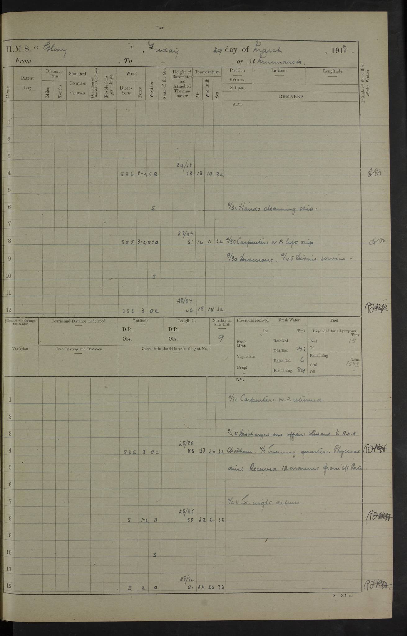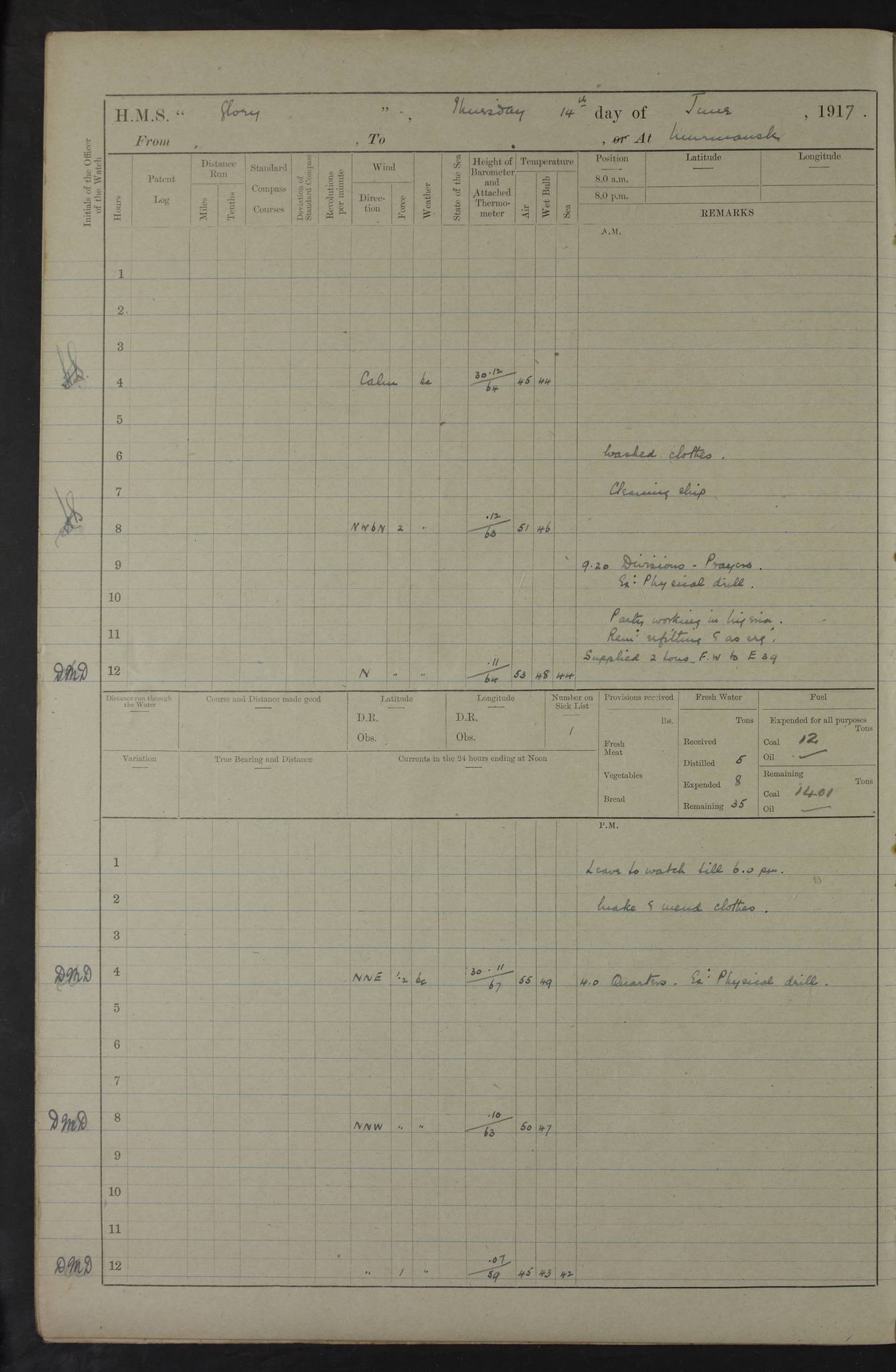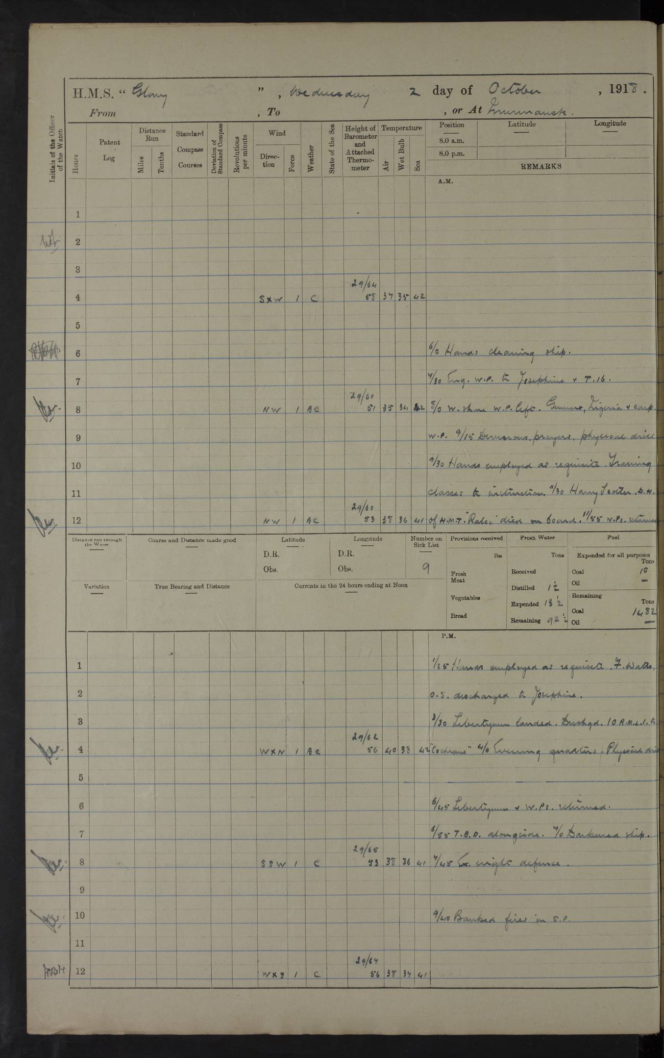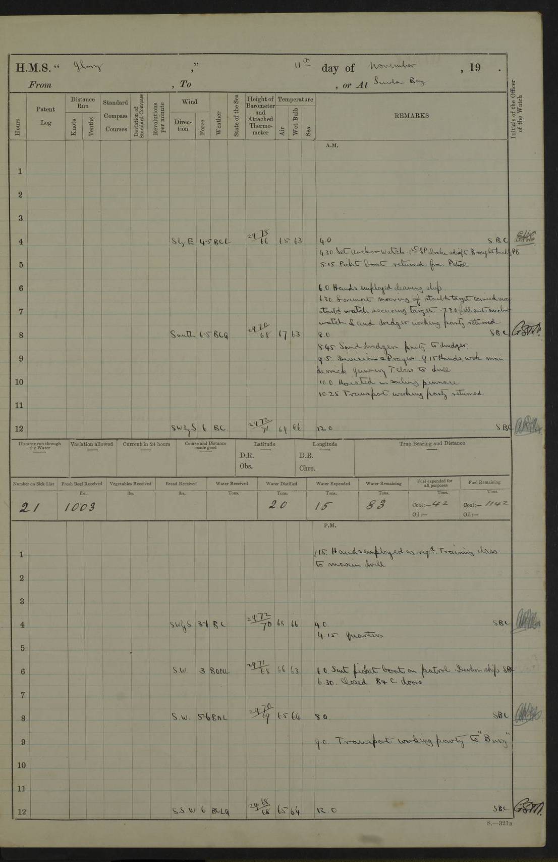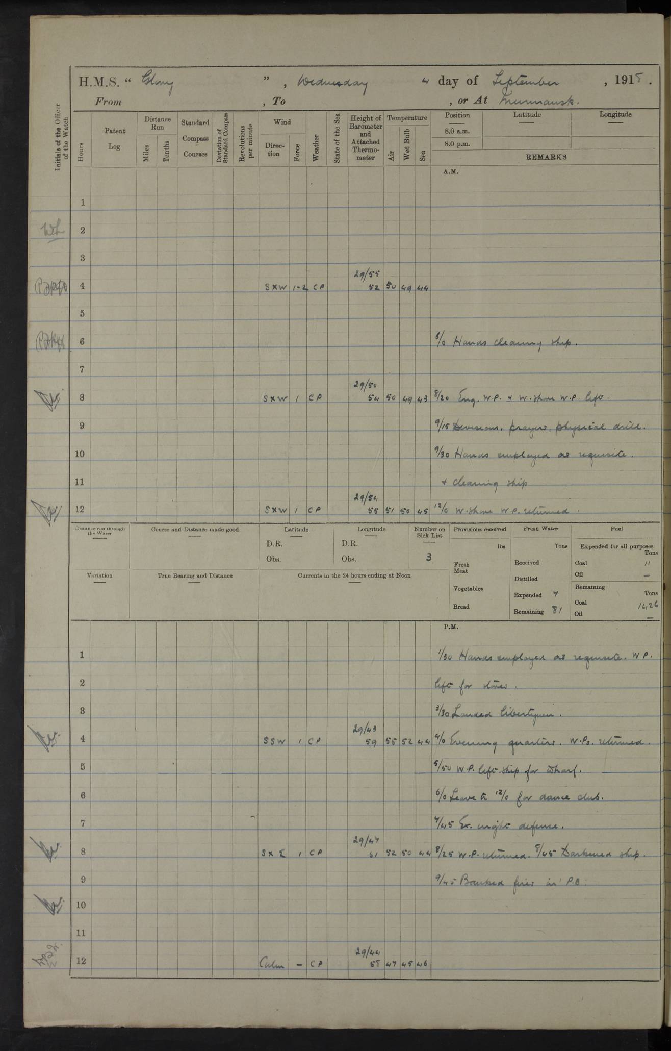 22 June 1915 At sea, Gibraltar to Lemnos Lat 36.1, Long -1.3 4.15am: Sighted land on starboard bow. 10.20am: Stopped port engine for repairs. 11.20am: proceeded with port engine. pm: a/c due to change in deviation. 10.00pm: Cape Tenez Light abeam, 18 miles. 4f73cd61a2fc8ea9030015f6: (https://s3.amazonaws.com:443/oldweather/ADM53-43015/0012_1.jpg) 23 June 1915 At sea, Gibraltar to Lemnos Lat 37.5, Long 4.8 Number on sick list: 4 5.00am: Secured from night defence stations. Placed anti-submarine guns. pm: Life saving appliances served out to men stationed in ? ?at abandon ship. 4f73cd61a2fc8ea9030015f7: (https://s3.amazonaws.com:443/oldweather/ADM53-43015/0013_0.jpg) 24 June 1915 At sea, Gibraltar to Lemnos Lat 37.4, Long 10.8 Position in log clearly bears no resemblance to the location of the ship. Position above is approximate and is based sighting of Zembra Island at 11.55am. 5.00am: Dispersed from night defence stations. Manned anti-submarine guns. am: Sighted two French torpedo boats. am: Torpedo boats passed to ~ No 362, 363. am: Sighted land on starboard beam. 11.55am: Zembra Island abeam, 25 miles. 2.00pm: Sighted Pantellaria S34ºE. 4.45pm: Pantellaria Light House abeam 12 miles. 4f73cd61a2fc8ea9030015f8: (https://s3.amazonaws.com:443/oldweather/ADM53-43015/0013_1.jpg) 25 June 1915 At sea, Gibraltar to Lemnos Lat 35.5, Long 16.7 2.10am: Gozo Light abeam 17 miles. 5.00am: Dispersed from night defence stations. Manned anti-submarine guns. 4f73cd61a2fc8ea9030015f9: (https://s3.amazonaws.com:443/oldweather/ADM53-43015/0014_0.jpg) 26 June 1915 At sea, Gibraltar to Lemnos Lat 35.5, Long 22.6 Number on sick list: 5 5.00am: Dispersed from night defence stations. Manned anti-submarine guns. am: Aired night clothing. am: marines at maxim practice on quarter deck. 2.00pm: Observed land on either bow. 3.00pm: Sighted French patrol destroyer. 4.15pm: Sighted French patrol destroyer. 9.40pm: Milo Peak N63ºW. 10.26pm: Polino Light abeam to port 5.5 miles. 4f73cd62a2fc8ea9030015fa: (https://s3.amazonaws.com:443/oldweather/ADM53-43015/0014_1.jpg) 27 June 1915 At sea and at Lemnos Lat 39.1, Long 24.4 From 0.50 to 3.05am sighting of multiple light houses. 3.50am: a/c to N39ºW and commenced to zig-zag. 5.00am: Dispersed from night defence stations and placed anti-submarine guns and look-outs. am: Lost overboard by accident Hazlewood fender, pat. 311, one in number. 10.30am: Held Divine Service onboard. pm: Met and signalled HMS Minerva on patrol duty. pm: Courses and speeds as requisite while waiting orders to approach Mudros. 3.00pm: Proceeded. 5.16pm: Increased to 90 revs, commenced to zig-zag. Course as requisite for Mudros. 7.00pm: Entered Mudros Bay. 7.47pm: Stopped. Let go port anchor in ‘M3’. 8.30pm: Darkened ship. pm: Manned one 6” and one 12 pdr. 4f73cd62a2fc8ea9030015fb: (https://s3.amazonaws.com:443/oldweather/ADM53-43015/0015_0.jpg) 28 June 1915 Mudros Bay, Lemnos Lat 39.89, Long 25.24 5,00am: HMS Vengeance entered harbour. HMS Vengeance was a pre-dreadnought of the Canopus class, launched in 1899 at Vickers, Barrow, and sold for scrapping in 1921. Details at http://en.wikipedia.org/wiki/HMS_Vengeance_(1899) . am/pm/: hands preparing for coaling and about ship’s work. pm: Collier Wabana secured alongside. 4f73cd62a2fc8ea9030015fc: (https://s3.amazonaws.com:443/oldweather/ADM53-43015/0015_1.jpg) 29 June 1915 Mudros Bay, Lemnos Lat 39.89, Long 25.24 5.15am: Commenced coaling. 2.00pm: Finished coaling. Collier left. 4f73cd62a2fc8ea9030015fd: (https://s3.amazonaws.com:443/oldweather/ADM53-43015/0016_0.jpg) 30 June 1915 Mudros Bay, Lemnos Lat 39.89, Long 25.24 am: Parties away sanding, and with fire engines onshore. am: Boats away disembarking troops. am: French Flagship Patrie sailed. The Patrie was a French pre-dreadnought, launched at La Seyne shipyard in 1903, and stricken in 1921. Details at http://en.wikipedia.org/wiki/French_battleship_Patrie . 6.30pm: Hands to bathe. 4f73cd63a2fc8ea9030015fe: (https://s3.amazonaws.com:443/oldweather/ADM53-43015/0016_1.jpg) 4f73cd63a2fc8ea9030015ff: (https://s3.amazonaws.com:443/oldweather/ADM53-43015/0017_0.jpg) 4f73cd63a2fc8ea903001600: (https://s3.amazonaws.com:443/oldweather/ADM53-43015/0017_1.jpg) 4f73cd63a2fc8ea903001601: (https://s3.amazonaws.com:443/oldweather/ADM53-43015/0018_0.jpg) 4f73cd64a2fc8ea903001602: (https://s3.amazonaws.com:443/oldweather/ADM53-43015/0018_1.jpg) LOGS FOR JULY 1915 From July to October 1915, HMS Glory spent her time at Port Mudros. Certain activities typically took place daily and are not generally noted in the pages below. These activities include: Lighting fires in the picket boat around 4am and drawing the fires in the late evening; Divisions at around 9–9.30am and Evening Quarters at 4pm; Darken ship at around 8.30pm; Daily ‘cleaning ship’, with variations thereof; SBC (for ‘Signal Books Correct’) at the watch changes. 4f73cd64a2fc8ea903001603: (https://s3.amazonaws.com:443/oldweather/ADM53-43016/0000_0.jpg) 4f73cd64a2fc8ea903001604: (https://s3.amazonaws.com:443/oldweather/ADM53-43016/0000_1.jpg) 4f73cd65a2fc8ea903001605: (https://s3.amazonaws.com:443/oldweather/ADM53-43016/0001_0.jpg) 4f73cd65a2fc8ea903001606: (https://s3.amazonaws.com:443/oldweather/ADM53-43016/0001_1.jpg) 1 July 1915 Port Mudros Lat 39.89, Long 25.24 6.30am: Landed working parties preparing boom defence ships. am: Discharged Acting Commander Rayne to Hector. Hector was a kite balloon ship. No further details readily available. 5.00pm: Tug T.10 made fast astern. 7.15pm: HMS Venerable went out. 7.30pm: HMS Chatham went out. HMS Chatham was a ‘Town’ cruiser and lead ship of her class. She was launched in 1911 at Chatham Dockyard and sold in 1926. Details at http://en.wikipedia.org/wiki/HMS_Chatham_(1911) . 4f73cd65a2fc8ea903001607: (https://s3.amazonaws.com:443/oldweather/ADM53-43016/0002_0.jpg) 2 July 1915 Port Mudros Lat 39.89, Long 25.24 5.35am: Landed working parties preparing boom defence ships. am/pm: Boom defence par