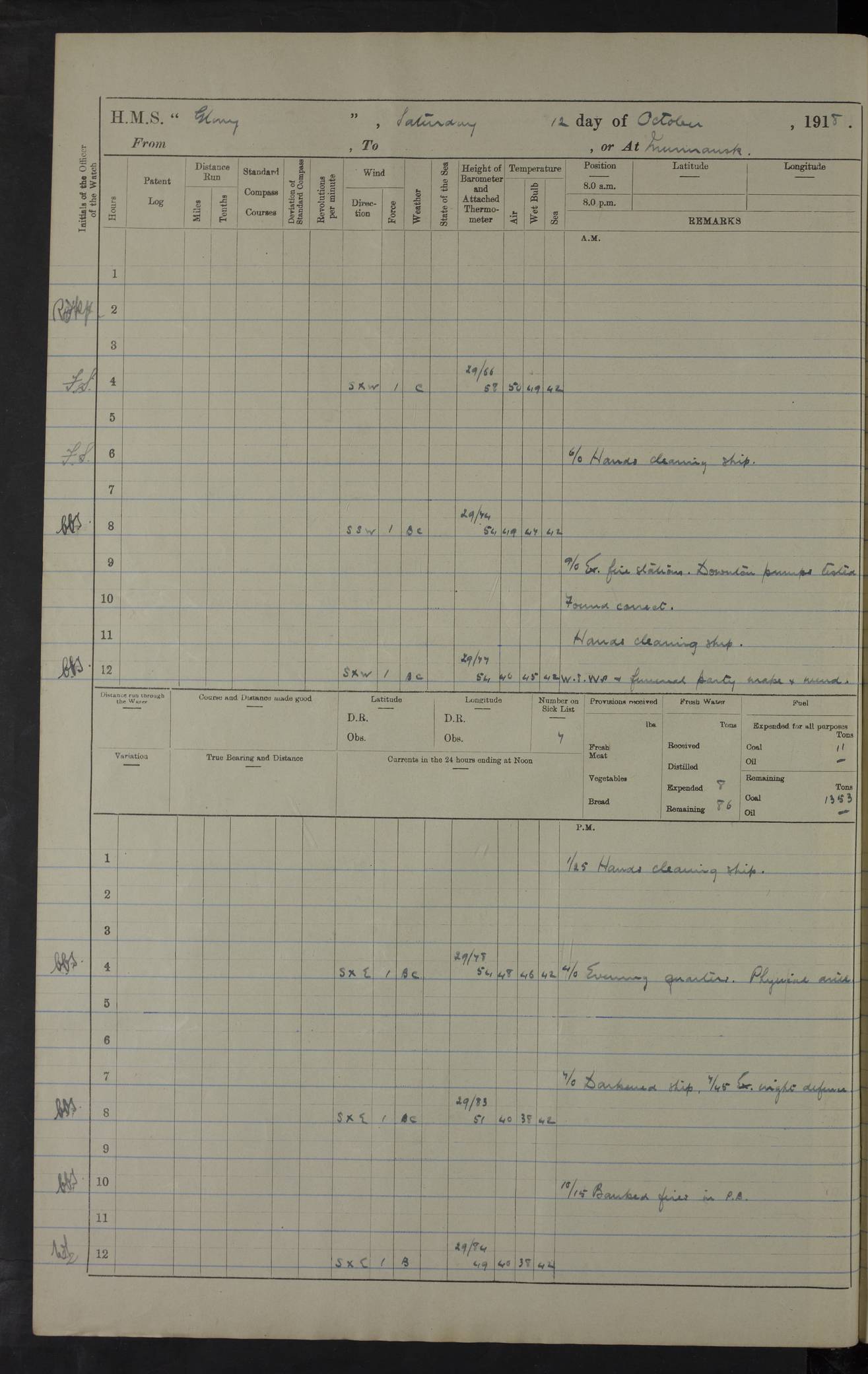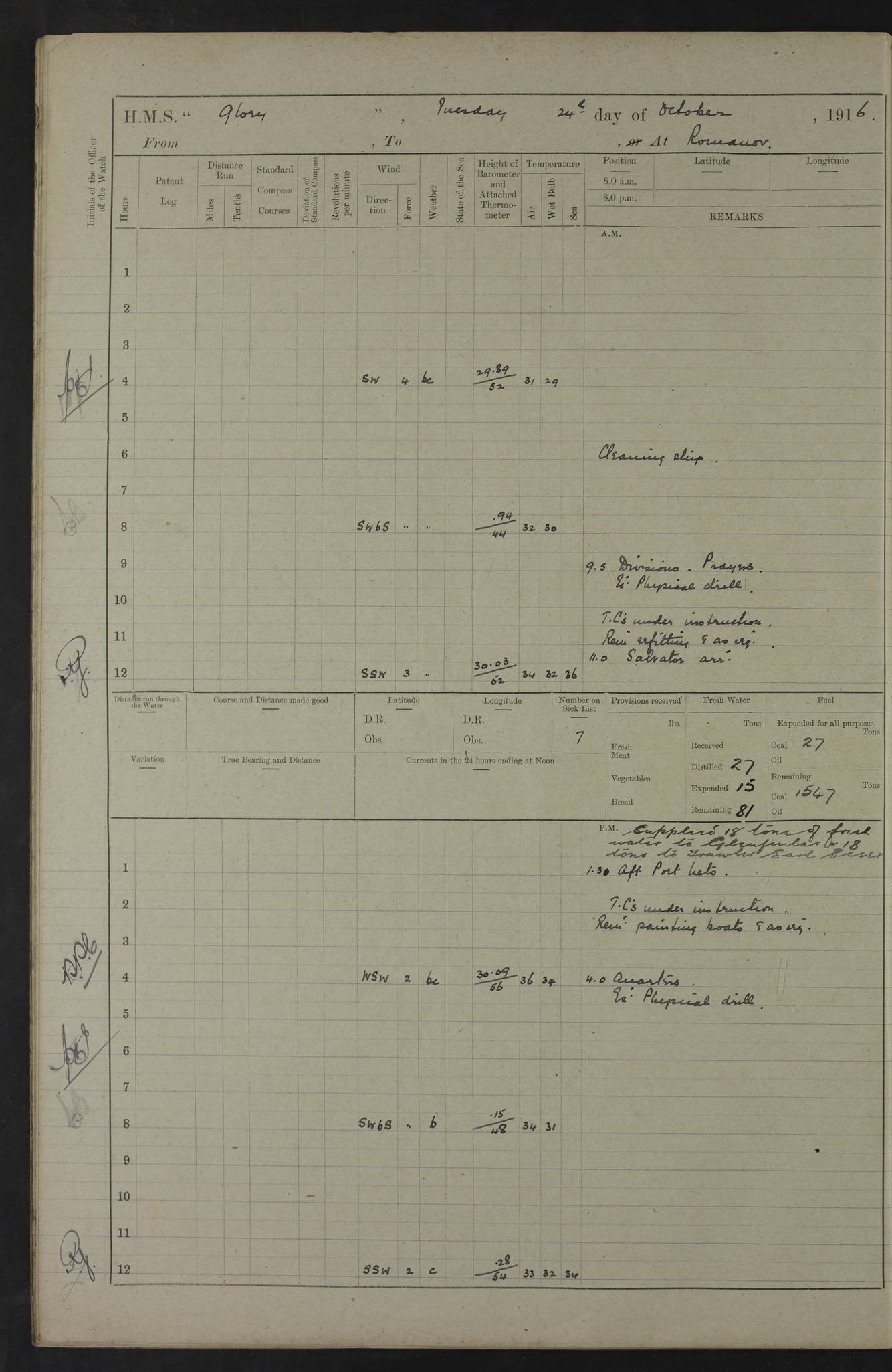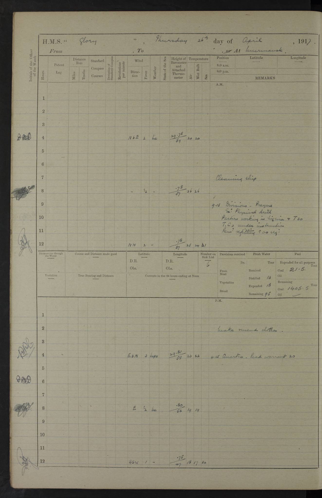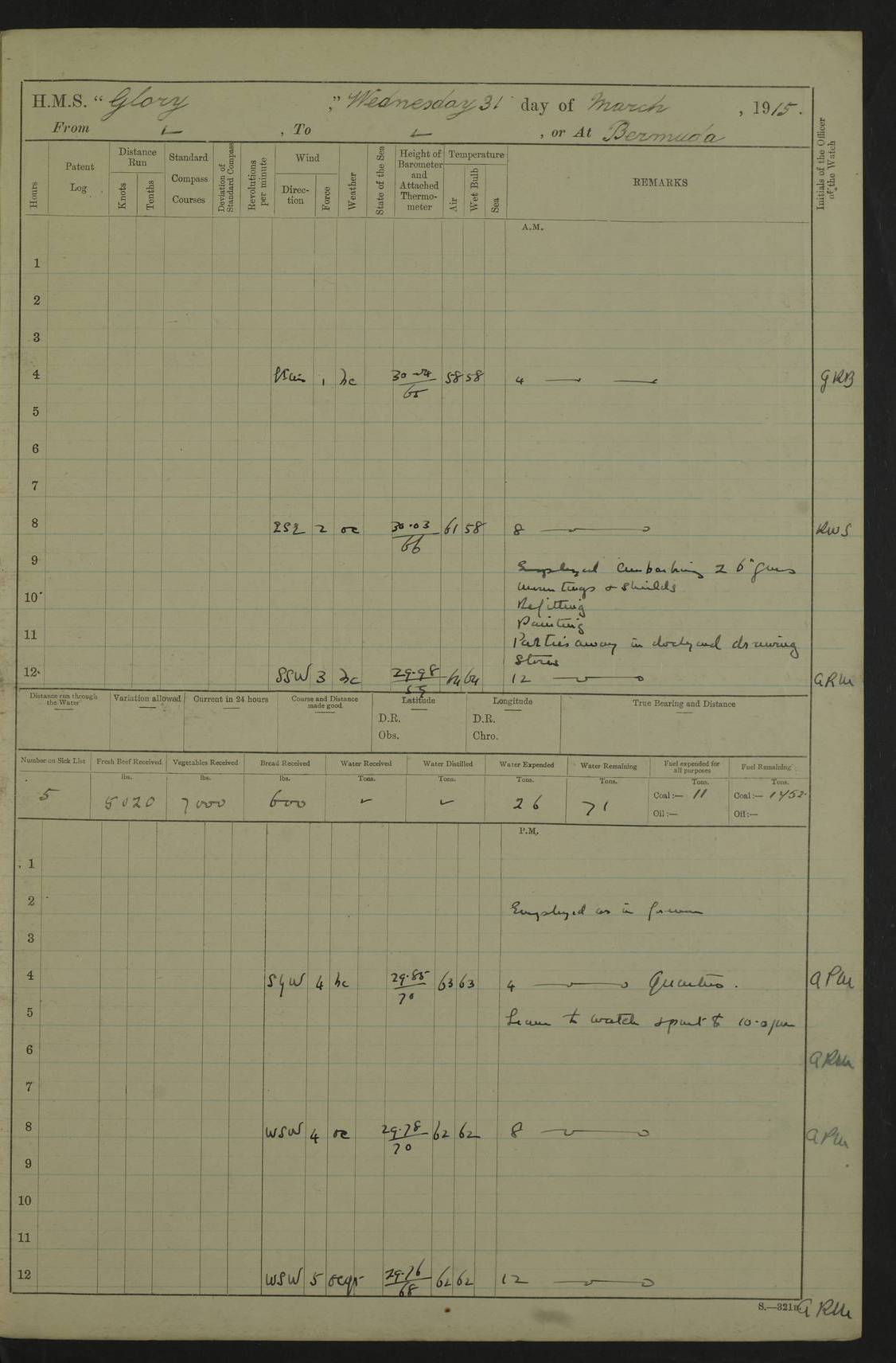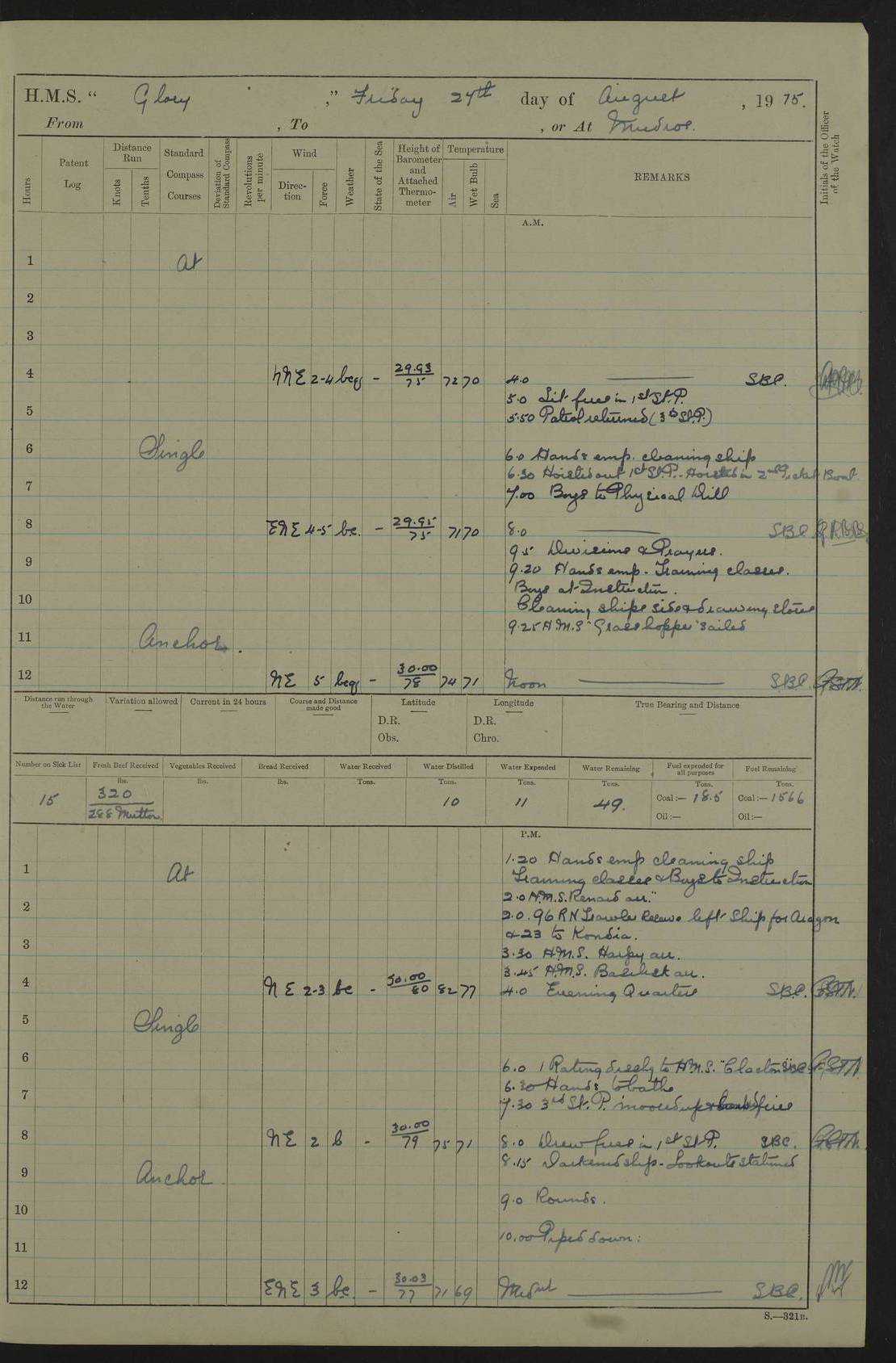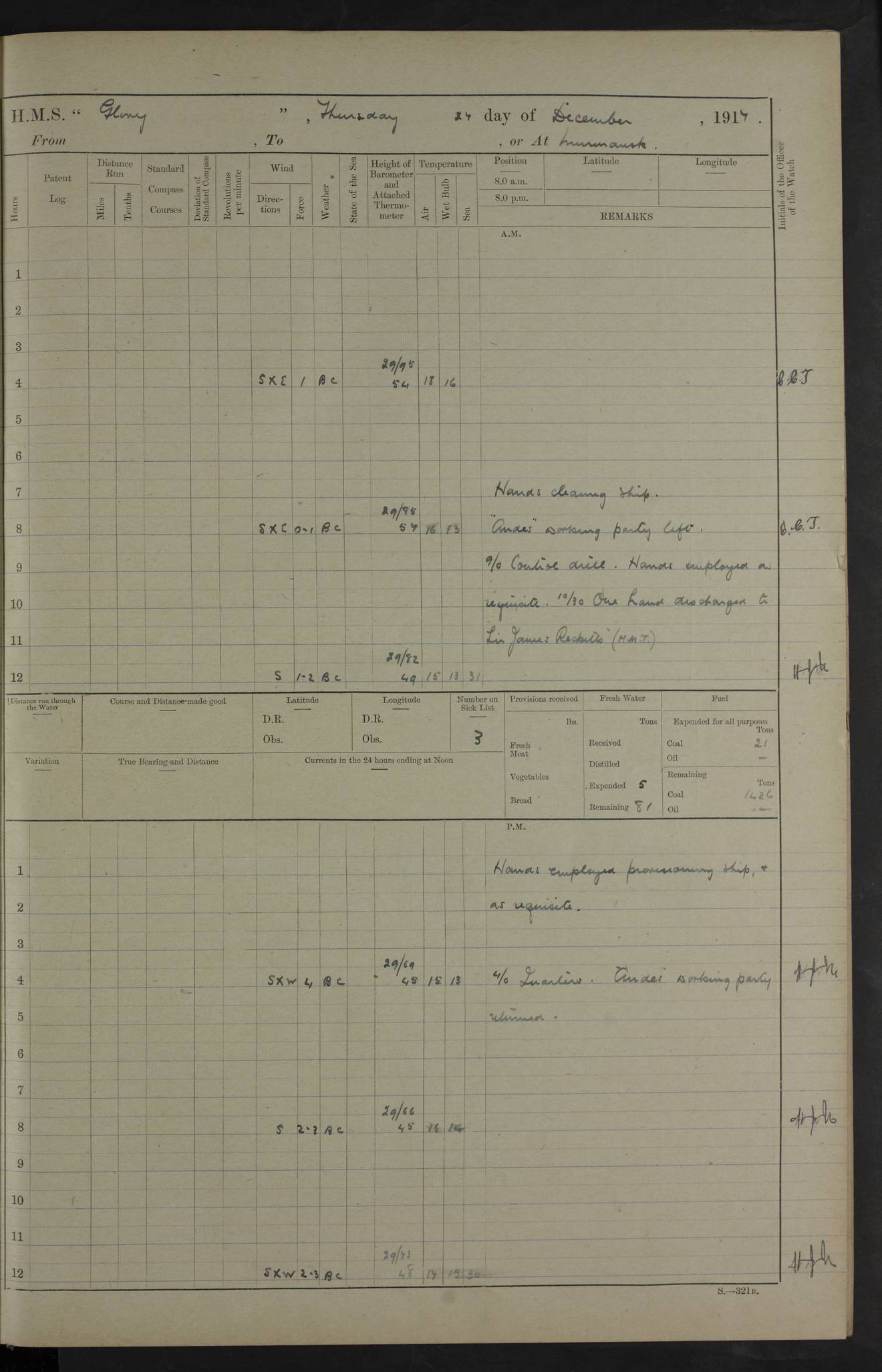 22 June 1915 At sea, Gibraltar to Lemnos Lat 36.1, Long -1.3 4.15am: Sighted land on starboard bow. 10.20am: Stopped port engine for repairs. 11.20am: proceeded with port engine. pm: a/c due to change in deviation. 10.00pm: Cape Tenez Light abeam, 18 miles. 4f73cd61a2fc8ea9030015f6: (https://s3.amazonaws.com:443/oldweather/ADM53-43015/0012_1.jpg) 23 June 1915 At sea, Gibraltar to Lemnos Lat 37.5, Long 4.8 Number on sick list: 4 5.00am: Secured from night defence stations. Placed anti-submarine guns. pm: Life saving appliances served out to men stationed in ? ?at abandon ship. 4f73cd61a2fc8ea9030015f7: (https://s3.amazonaws.com:443/oldweather/ADM53-43015/0013_0.jpg) 24 June 1915 At sea, Gibraltar to Lemnos Lat 37.4, Long 10.8 Position in log clearly bears no resemblance to the location of the ship. Position above is approximate and is based sighting of Zembra Island at 11.55am. 5.00am: Dispersed from night defence stations. Manned anti-submarine guns. am: Sighted two French torpedo boats. am: Torpedo boats passed to ~ No 362, 363. am: Sighted land on starboard beam. 11.55am: Zembra Island abeam, 25 miles. 2.00pm: Sighted Pantellaria S34ºE. 4.45pm: Pantellaria Light House abeam 12 miles. 4f73cd61a2fc8ea9030015f8: (https://s3.amazonaws.com:443/oldweather/ADM53-43015/0013_1.jpg) 25 June 1915 At sea, Gibraltar to Lemnos Lat 35.5, Long 16.7 2.10am: Gozo Light abeam 17 miles. 5.00am: Dispersed from night defence stations. Manned anti-submarine guns. 4f73cd61a2fc8ea9030015f9: (https://s3.amazonaws.com:443/oldweather/ADM53-43015/0014_0.jpg) 26 June 1915 At sea, Gibraltar to Lemnos Lat 35.5, Long 22.6 Number on sick list: 5 5.00am: Dispersed from night defence stations. Manned anti-submarine guns. am: Aired night clothing. am: marines at maxim practice on quarter deck. 2.00pm: Observed land on either bow. 3.00pm: Sighted French patrol destroyer. 4.15pm: Sighted French patrol destroyer. 9.40pm: Milo Peak N63ºW. 10.26pm: Polino Light abeam to port 5.5 miles. 4f73cd62a2fc8ea9030015fa: (https://s3.amazonaws.com:443/oldweather/ADM53-43015/0014_1.jpg) 27 June 1915 At sea and at Lemnos Lat 39.1, Long 24.4 From 0.50 to 3.05am sighting of multiple light houses. 3.50am: a/c to N39ºW and commenced to zig-zag. 5.00am: Dispersed from night defence stations and placed anti-submarine guns and look-outs. am: Lost overboard by accident Hazlewood fender, pat. 311, one in number. 10.30am: Held Divine Service onboard. pm: Met and signalled HMS Minerva on patrol duty. pm: Courses and speeds as requisite while waiting orders to approach Mudros. 3.00pm: Proceeded. 5.16pm: Increased to 90 revs, commenced to zig-zag. Course as requisite for Mudros. 7.00pm: Entered Mudros Bay. 7.47pm: Stopped. Let go port anchor in ‘M3’. 8.30pm: Darkened ship. pm: Manned one 6” and one 12 pdr. 4f73cd62a2fc8ea9030015fb: (https://s3.amazonaws.com:443/oldweather/ADM53-43015/0015_0.jpg) 28 June 1915 Mudros Bay, Lemnos Lat 39.89, Long 25.24 5,00am: HMS Vengeance entered harbour. HMS Vengeance was a pre-dreadnought of the Canopus class, launched in 1899 at Vickers, Barrow, and sold for scrapping in 1921. Details at http://en.wikipedia.org/wiki/HMS_Vengeance_(1899) . am/pm/: hands preparing for coaling and about ship’s work. pm: Collier Wabana secured alongside. 4f73cd62a2fc8ea9030015fc: (https://s3.amazonaws.com:443/oldweather/ADM53-43015/0015_1.jpg) 29 June 1915 Mudros Bay, Lemnos Lat 39.89, Long 25.24 5.15am: Commenced coaling. 2.00pm: Finished coaling. Collier left. 4f73cd62a2fc8ea9030015fd: (https://s3.amazonaws.com:443/oldweather/ADM53-43015/0016_0.jpg) 30 June 1915 Mudros Bay, Lemnos Lat 39.89, Long 25.24 am: Parties away sanding, and with fire engines onshore. am: Boats away disembarking troops. am: French Flagship Patrie sailed. The Patrie was a French pre-dreadnought, launched at La Seyne shipyard in 1903, and stricken in 1921. Details at http://en.wikipedia.org/wiki/French_battleship_Patrie . 6.30pm: Hands to bathe. 4f73cd63a2fc8ea9030015fe: (https://s3.amazonaws.com:443/oldweather/ADM53-43015/0016_1.jpg) 4f73cd63a2fc8ea9030015ff: (https://s3.amazonaws.com:443/oldweather/ADM53-43015/0017_0.jpg) 4f73cd63a2fc8ea903001600: (https://s3.amazonaws.com:443/oldweather/ADM53-43015/0017_1.jpg) 4f73cd63a2fc8ea903001601: (https://s3.amazonaws.com:443/oldweather/ADM53-43015/0018_0.jpg) 4f73cd64a2fc8ea903001602: (https://s3.amazonaws.com:443/oldweather/ADM53-43015/0018_1.jpg) LOGS FOR JULY 1915 From July to October 1915, HMS Glory spent her time at Port Mudros. Certain activities typically took place daily and are not generally noted in the pages below. These activities include: Lighting fires in the picket boat around 4am and drawing the fires in the late evening; Divisions at around 9–9.30am and Evening Quarters at 4pm; Darken ship at around 8.30pm; Daily ‘cleaning ship’, with variations thereof; SBC (for ‘Signal Books Correct’) at the watch changes. 4f73cd64a2fc8ea903001603: (https://s3.amazonaws.com:443/oldweather/ADM53-43016/0000_0.jpg) 4f73cd64a2fc8ea903001604: (https://s3.amazonaws.com:443/oldweather/ADM53-43016/0000_1.jpg) 4f73cd65a2fc8ea903001605: (https://s3.amazonaws.com:443/oldweather/ADM53-43016/0001_0.jpg) 4f73cd65a2fc8ea903001606: (https://s3.amazonaws.com:443/oldweather/ADM53-43016/0001_1.jpg) 1 July 1915 Port Mudros Lat 39.89, Long 25.24 6.30am: Landed working parties preparing boom defence ships. am: Discharged Acting Commander Rayne to Hector. Hector was a kite balloon ship. No further details readily available. 5.00pm: Tug T.10 made fast astern. 7.15pm: HMS Venerable went out. 7.30pm: HMS Chatham went out. HMS Chatham was a ‘Town’ cruiser and lead ship of her class. She was launched in 1911 at Chatham Dockyard and sold in 1926. Details at http://en.wikipedia.org/wiki/HMS_Chatham_(1911) . 4f73cd65a2fc8ea903001607: (https://s3.amazonaws.com:443/oldweather/ADM53-43016/0002_0.jpg) 2 July 1915 Port Mudros Lat 39.89, Long 25.24 5.35am: Landed working parties preparing boom defence ships. am/pm: Boom defence par