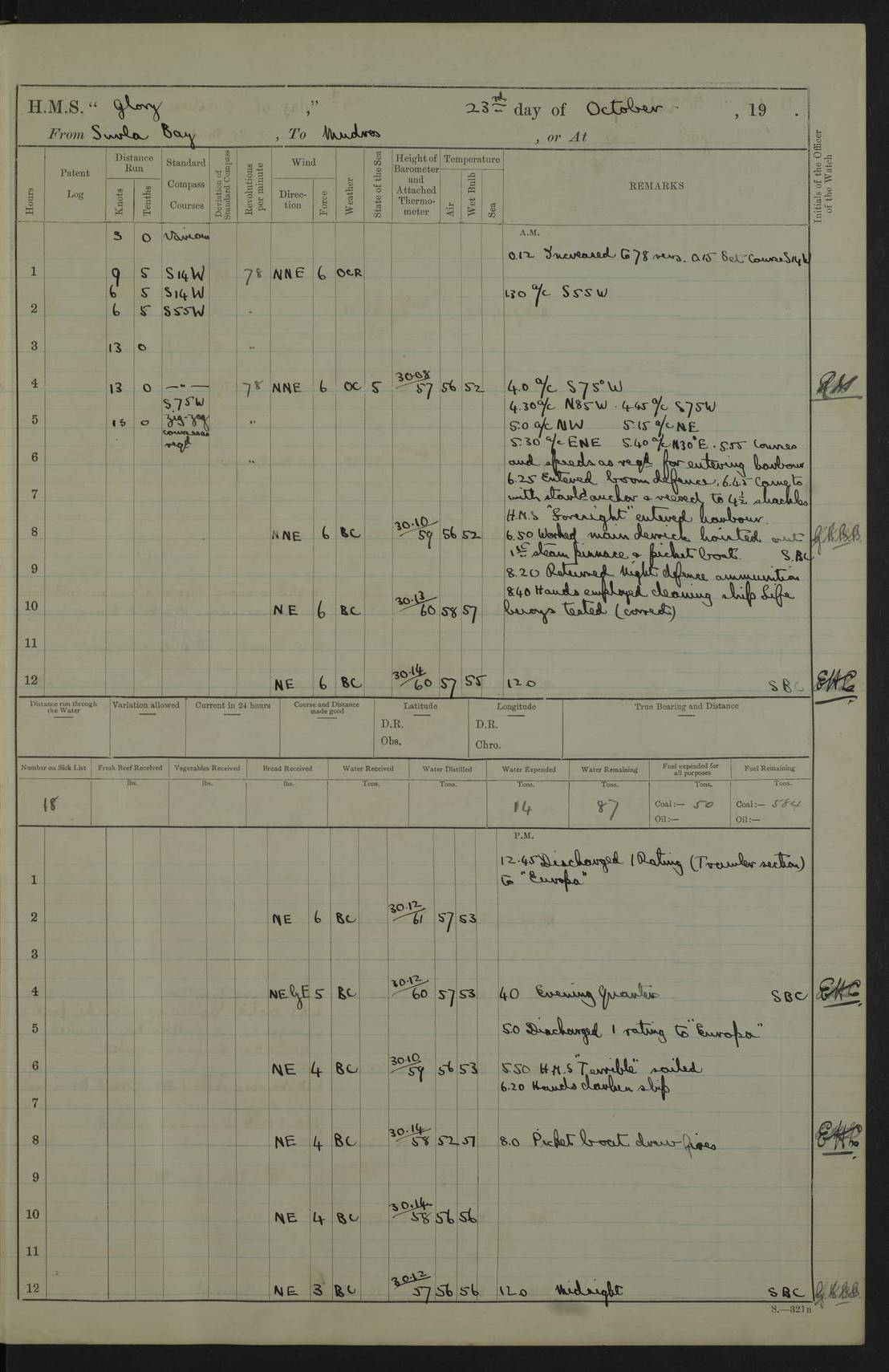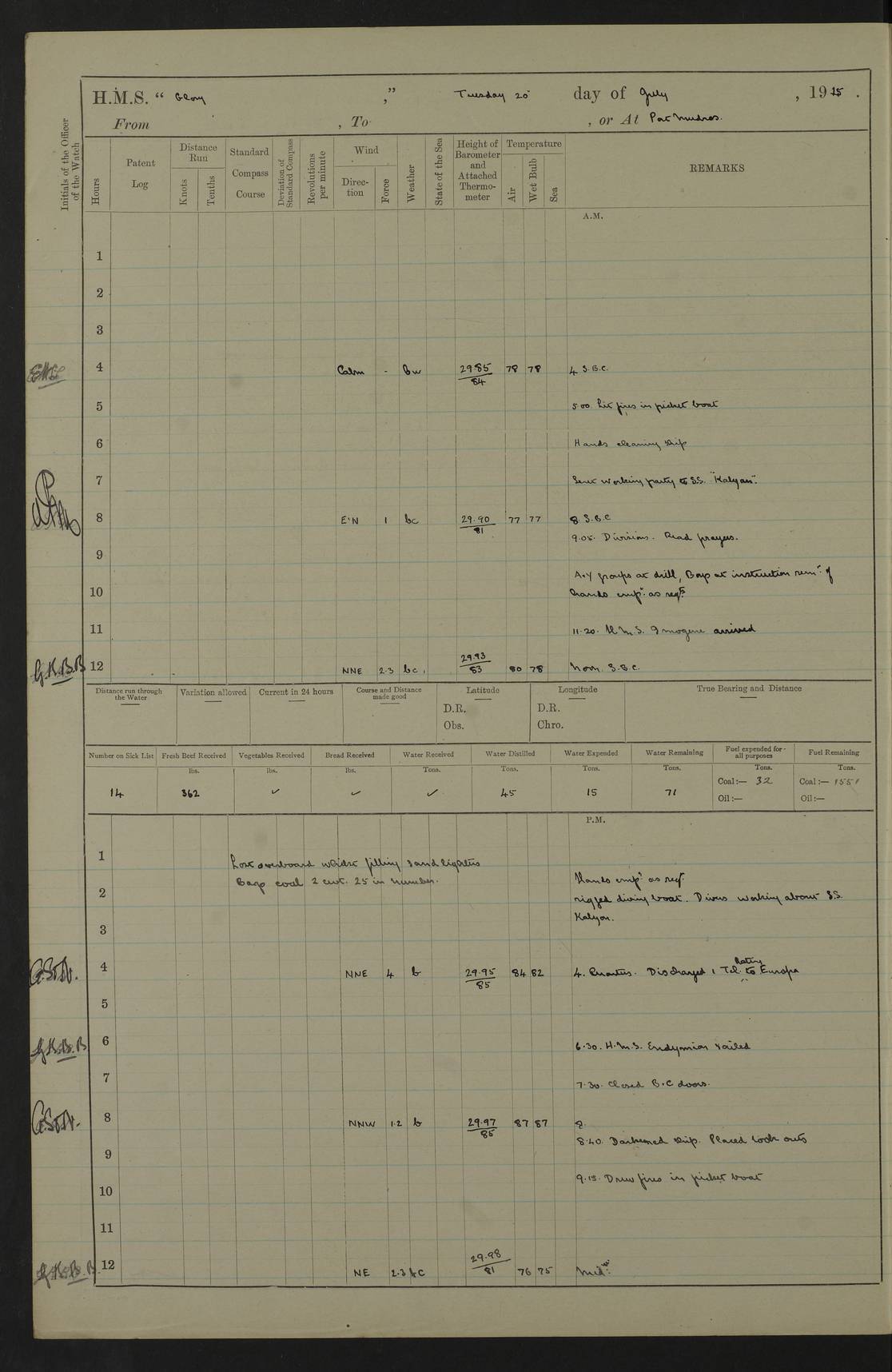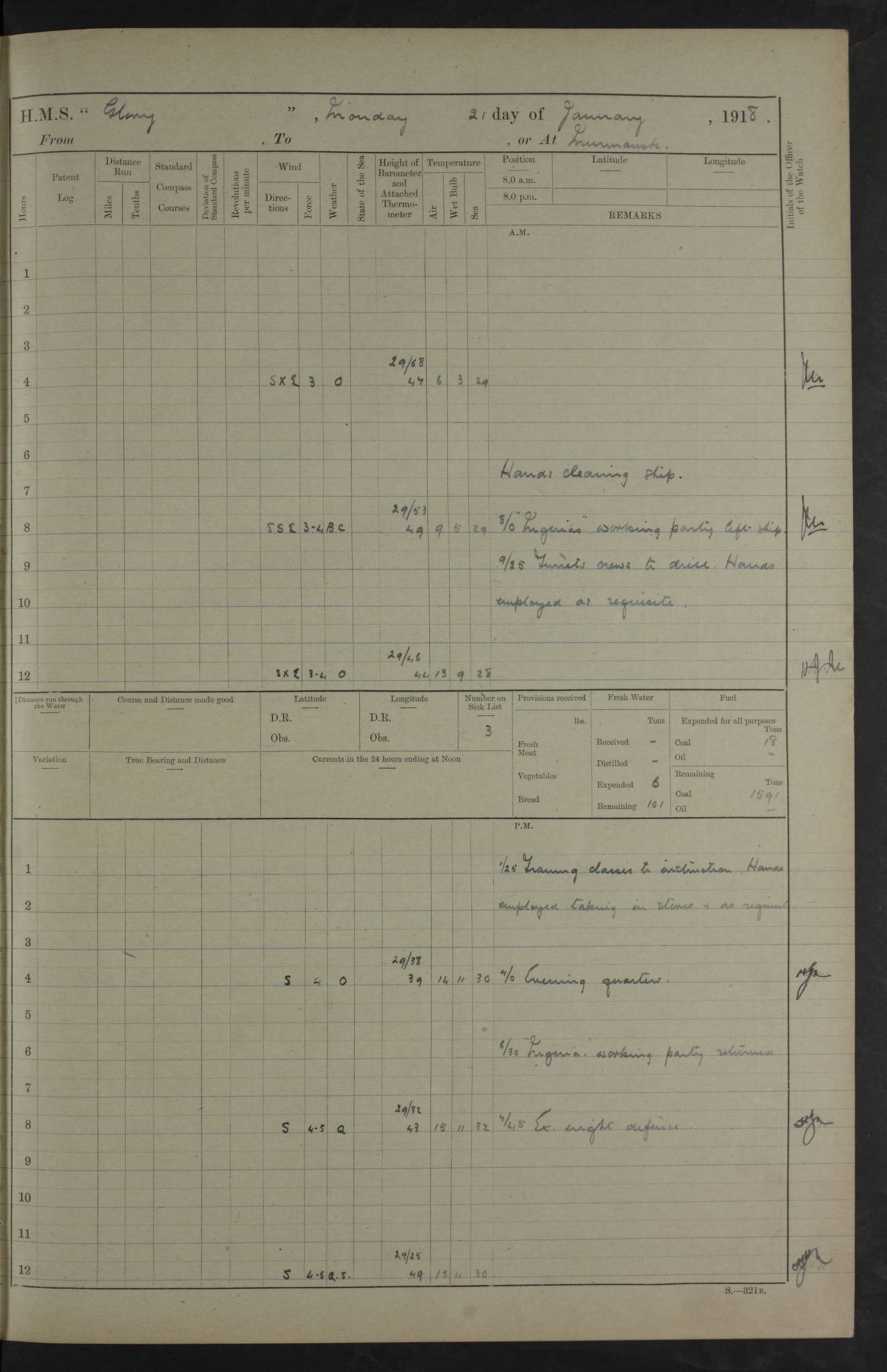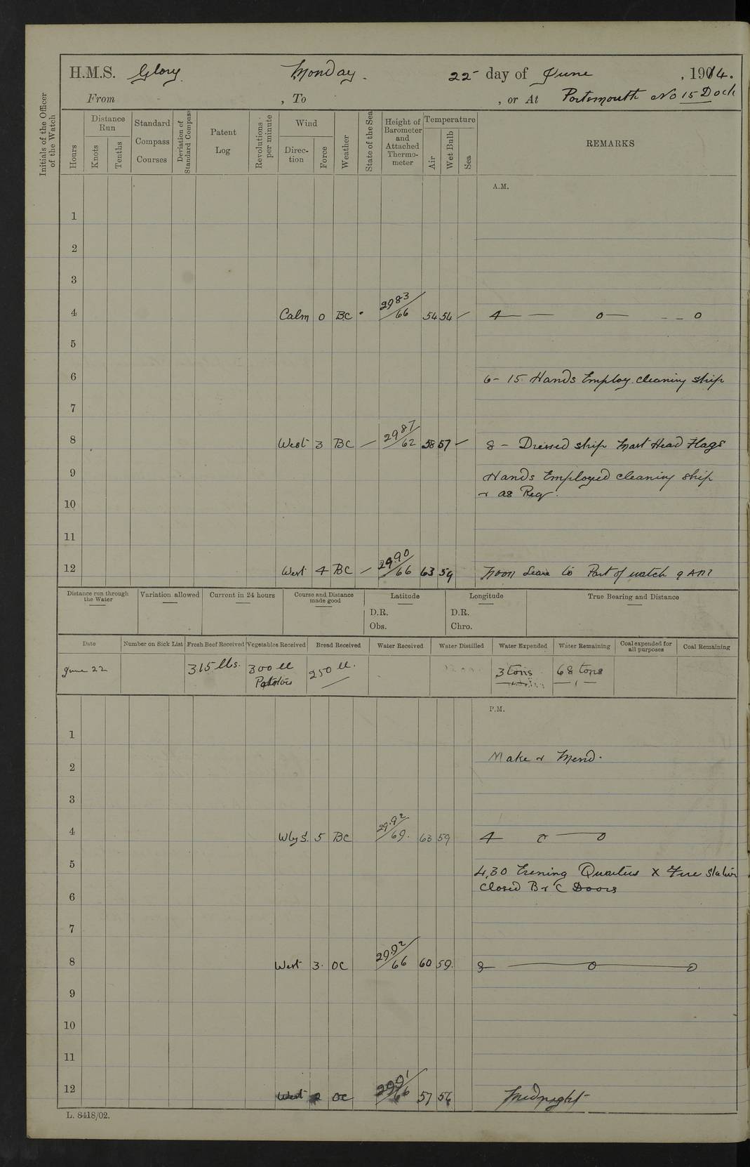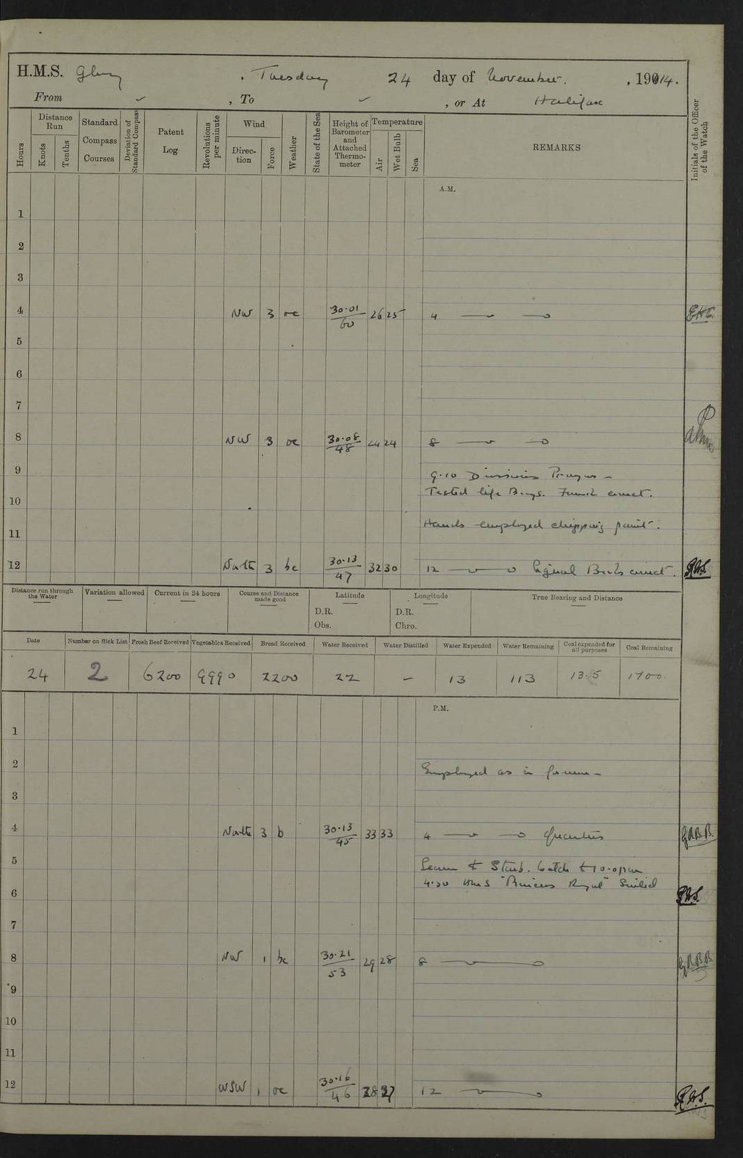 22 June 1915 At sea, Gibraltar to Lemnos Lat 36.1, Long -1.3 4.15am: Sighted land on starboard bow. 10.20am: Stopped port engine for repairs. 11.20am: proceeded with port engine. pm: a/c due to change in deviation. 10.00pm: Cape Tenez Light abeam, 18 miles. 4f73cd61a2fc8ea9030015f6: (https://s3.amazonaws.com:443/oldweather/ADM53-43015/0012_1.jpg) 23 June 1915 At sea, Gibraltar to Lemnos Lat 37.5, Long 4.8 Number on sick list: 4 5.00am: Secured from night defence stations. Placed anti-submarine guns. pm: Life saving appliances served out to men stationed in ? ?at abandon ship. 4f73cd61a2fc8ea9030015f7: (https://s3.amazonaws.com:443/oldweather/ADM53-43015/0013_0.jpg) 24 June 1915 At sea, Gibraltar to Lemnos Lat 37.4, Long 10.8 Position in log clearly bears no resemblance to the location of the ship. Position above is approximate and is based sighting of Zembra Island at 11.55am. 5.00am: Dispersed from night defence stations. Manned anti-submarine guns. am: Sighted two French torpedo boats. am: Torpedo boats passed to ~ No 362, 363. am: Sighted land on starboard beam. 11.55am: Zembra Island abeam, 25 miles. 2.00pm: Sighted Pantellaria S34ºE. 4.45pm: Pantellaria Light House abeam 12 miles. 4f73cd61a2fc8ea9030015f8: (https://s3.amazonaws.com:443/oldweather/ADM53-43015/0013_1.jpg) 25 June 1915 At sea, Gibraltar to Lemnos Lat 35.5, Long 16.7 2.10am: Gozo Light abeam 17 miles. 5.00am: Dispersed from night defence stations. Manned anti-submarine guns. 4f73cd61a2fc8ea9030015f9: (https://s3.amazonaws.com:443/oldweather/ADM53-43015/0014_0.jpg) 26 June 1915 At sea, Gibraltar to Lemnos Lat 35.5, Long 22.6 Number on sick list: 5 5.00am: Dispersed from night defence stations. Manned anti-submarine guns. am: Aired night clothing. am: marines at maxim practice on quarter deck. 2.00pm: Observed land on either bow. 3.00pm: Sighted French patrol destroyer. 4.15pm: Sighted French patrol destroyer. 9.40pm: Milo Peak N63ºW. 10.26pm: Polino Light abeam to port 5.5 miles. 4f73cd62a2fc8ea9030015fa: (https://s3.amazonaws.com:443/oldweather/ADM53-43015/0014_1.jpg) 27 June 1915 At sea and at Lemnos Lat 39.1, Long 24.4 From 0.50 to 3.05am sighting of multiple light houses. 3.50am: a/c to N39ºW and commenced to zig-zag. 5.00am: Dispersed from night defence stations and placed anti-submarine guns and look-outs. am: Lost overboard by accident Hazlewood fender, pat. 311, one in number. 10.30am: Held Divine Service onboard. pm: Met and signalled HMS Minerva on patrol duty. pm: Courses and speeds as requisite while waiting orders to approach Mudros. 3.00pm: Proceeded. 5.16pm: Increased to 90 revs, commenced to zig-zag. Course as requisite for Mudros. 7.00pm: Entered Mudros Bay. 7.47pm: Stopped. Let go port anchor in ‘M3’. 8.30pm: Darkened ship. pm: Manned one 6” and one 12 pdr. 4f73cd62a2fc8ea9030015fb: (https://s3.amazonaws.com:443/oldweather/ADM53-43015/0015_0.jpg) 28 June 1915 Mudros Bay, Lemnos Lat 39.89, Long 25.24 5,00am: HMS Vengeance entered harbour. HMS Vengeance was a pre-dreadnought of the Canopus class, launched in 1899 at Vickers, Barrow, and sold for scrapping in 1921. Details at http://en.wikipedia.org/wiki/HMS_Vengeance_(1899) . am/pm/: hands preparing for coaling and about ship’s work. pm: Collier Wabana secured alongside. 4f73cd62a2fc8ea9030015fc: (https://s3.amazonaws.com:443/oldweather/ADM53-43015/0015_1.jpg) 29 June 1915 Mudros Bay, Lemnos Lat 39.89, Long 25.24 5.15am: Commenced coaling. 2.00pm: Finished coaling. Collier left. 4f73cd62a2fc8ea9030015fd: (https://s3.amazonaws.com:443/oldweather/ADM53-43015/0016_0.jpg) 30 June 1915 Mudros Bay, Lemnos Lat 39.89, Long 25.24 am: Parties away sanding, and with fire engines onshore. am: Boats away disembarking troops. am: French Flagship Patrie sailed. The Patrie was a French pre-dreadnought, launched at La Seyne shipyard in 1903, and stricken in 1921. Details at http://en.wikipedia.org/wiki/French_battleship_Patrie . 6.30pm: Hands to bathe. 4f73cd63a2fc8ea9030015fe: (https://s3.amazonaws.com:443/oldweather/ADM53-43015/0016_1.jpg) 4f73cd63a2fc8ea9030015ff: (https://s3.amazonaws.com:443/oldweather/ADM53-43015/0017_0.jpg) 4f73cd63a2fc8ea903001600: (https://s3.amazonaws.com:443/oldweather/ADM53-43015/0017_1.jpg) 4f73cd63a2fc8ea903001601: (https://s3.amazonaws.com:443/oldweather/ADM53-43015/0018_0.jpg) 4f73cd64a2fc8ea903001602: (https://s3.amazonaws.com:443/oldweather/ADM53-43015/0018_1.jpg) LOGS FOR JULY 1915 From July to October 1915, HMS Glory spent her time at Port Mudros. Certain activities typically took place daily and are not generally noted in the pages below. These activities include: Lighting fires in the picket boat around 4am and drawing the fires in the late evening; Divisions at around 9–9.30am and Evening Quarters at 4pm; Darken ship at around 8.30pm; Daily ‘cleaning ship’, with variations thereof; SBC (for ‘Signal Books Correct’) at the watch changes. 4f73cd64a2fc8ea903001603: (https://s3.amazonaws.com:443/oldweather/ADM53-43016/0000_0.jpg) 4f73cd64a2fc8ea903001604: (https://s3.amazonaws.com:443/oldweather/ADM53-43016/0000_1.jpg) 4f73cd65a2fc8ea903001605: (https://s3.amazonaws.com:443/oldweather/ADM53-43016/0001_0.jpg) 4f73cd65a2fc8ea903001606: (https://s3.amazonaws.com:443/oldweather/ADM53-43016/0001_1.jpg) 1 July 1915 Port Mudros Lat 39.89, Long 25.24 6.30am: Landed working parties preparing boom defence ships. am: Discharged Acting Commander Rayne to Hector. Hector was a kite balloon ship. No further details readily available. 5.00pm: Tug T.10 made fast astern. 7.15pm: HMS Venerable went out. 7.30pm: HMS Chatham went out. HMS Chatham was a ‘Town’ cruiser and lead ship of her class. She was launched in 1911 at Chatham Dockyard and sold in 1926. Details at http://en.wikipedia.org/wiki/HMS_Chatham_(1911) . 4f73cd65a2fc8ea903001607: (https://s3.amazonaws.com:443/oldweather/ADM53-43016/0002_0.jpg) 2 July 1915 Port Mudros Lat 39.89, Long 25.24 5.35am: Landed working parties preparing boom defence ships. am/pm: Boom defence par