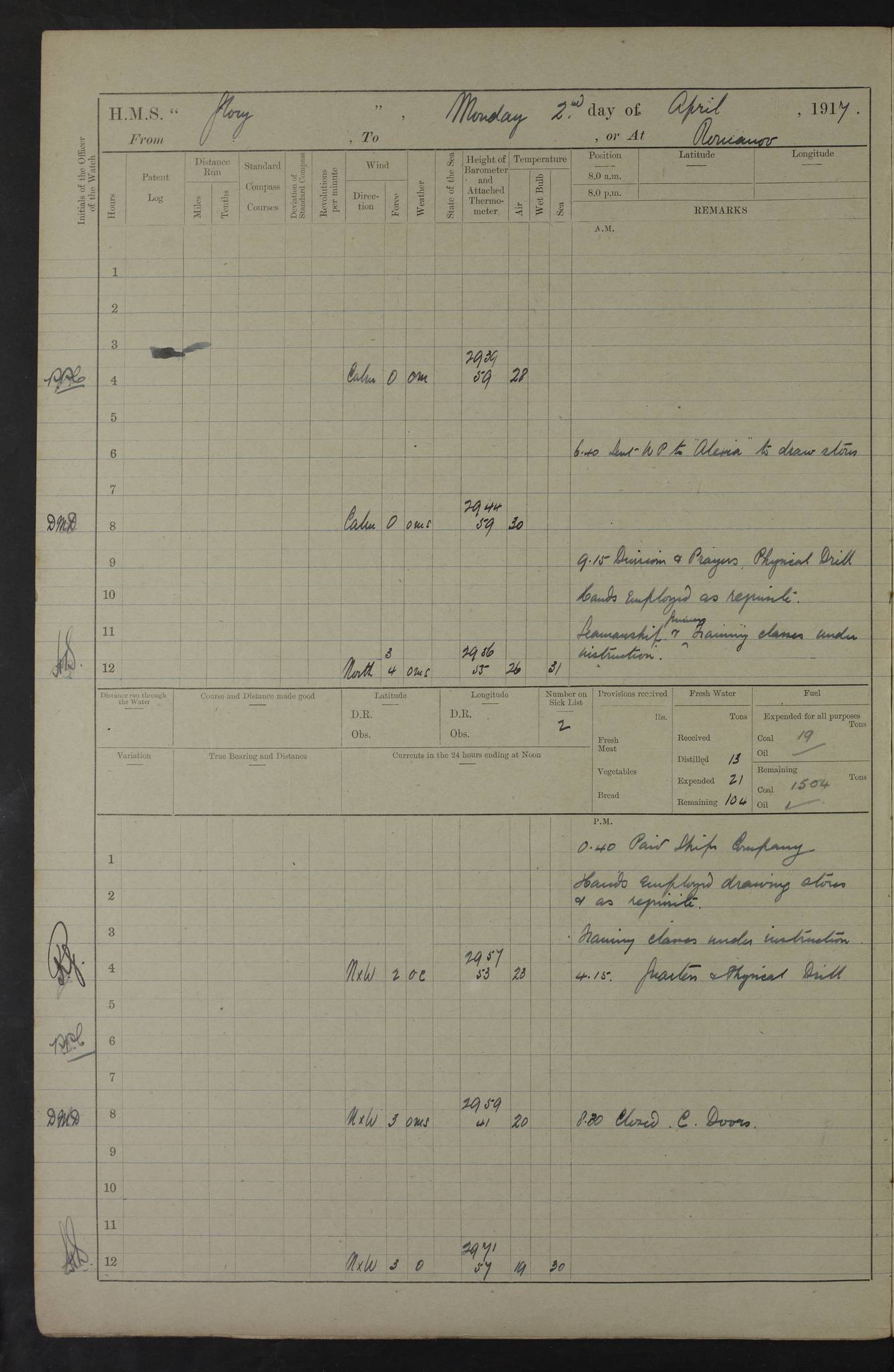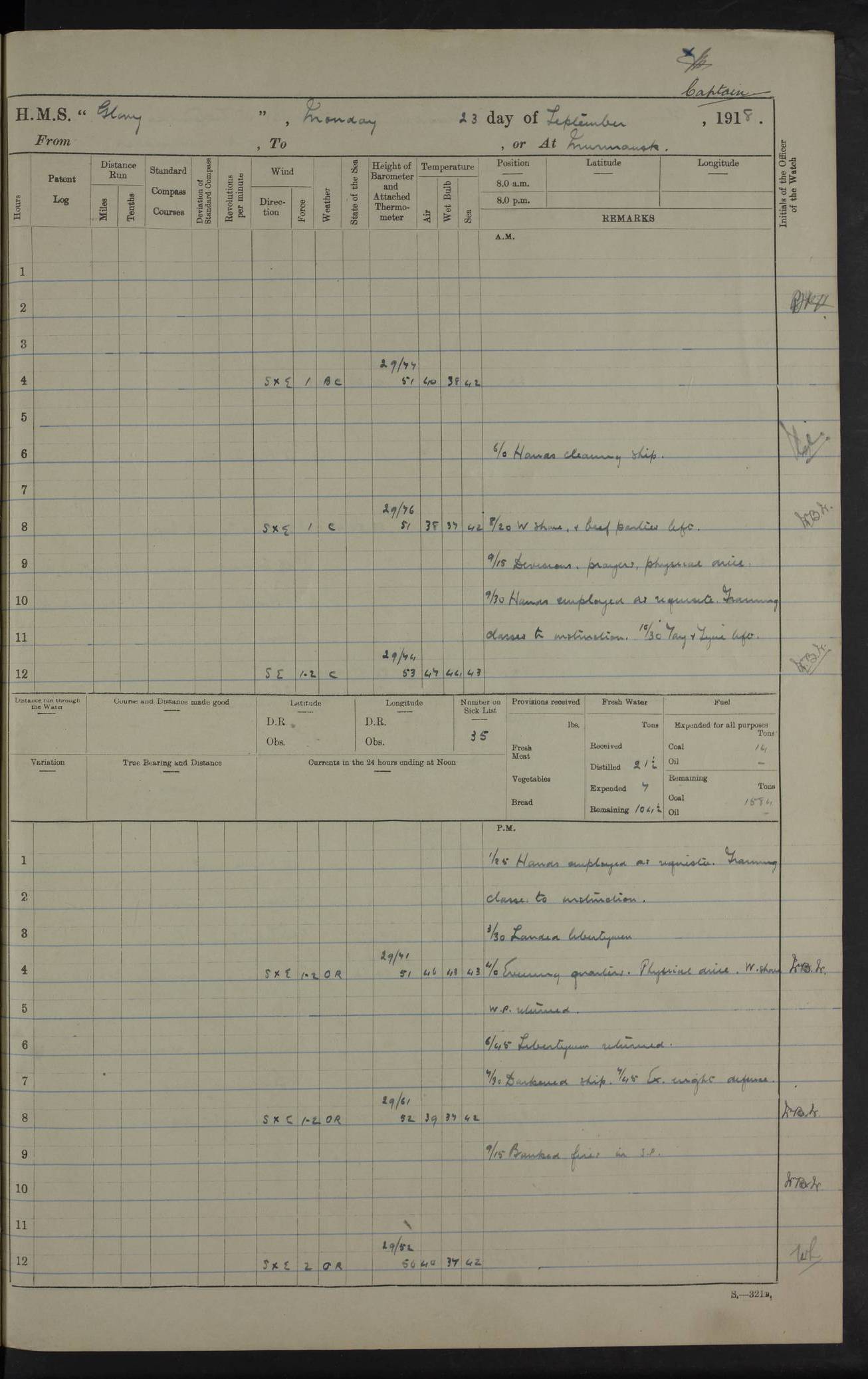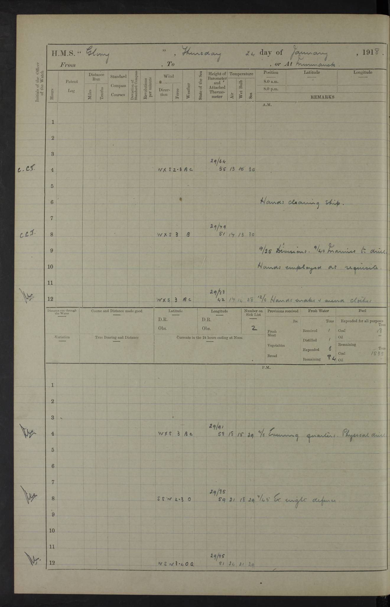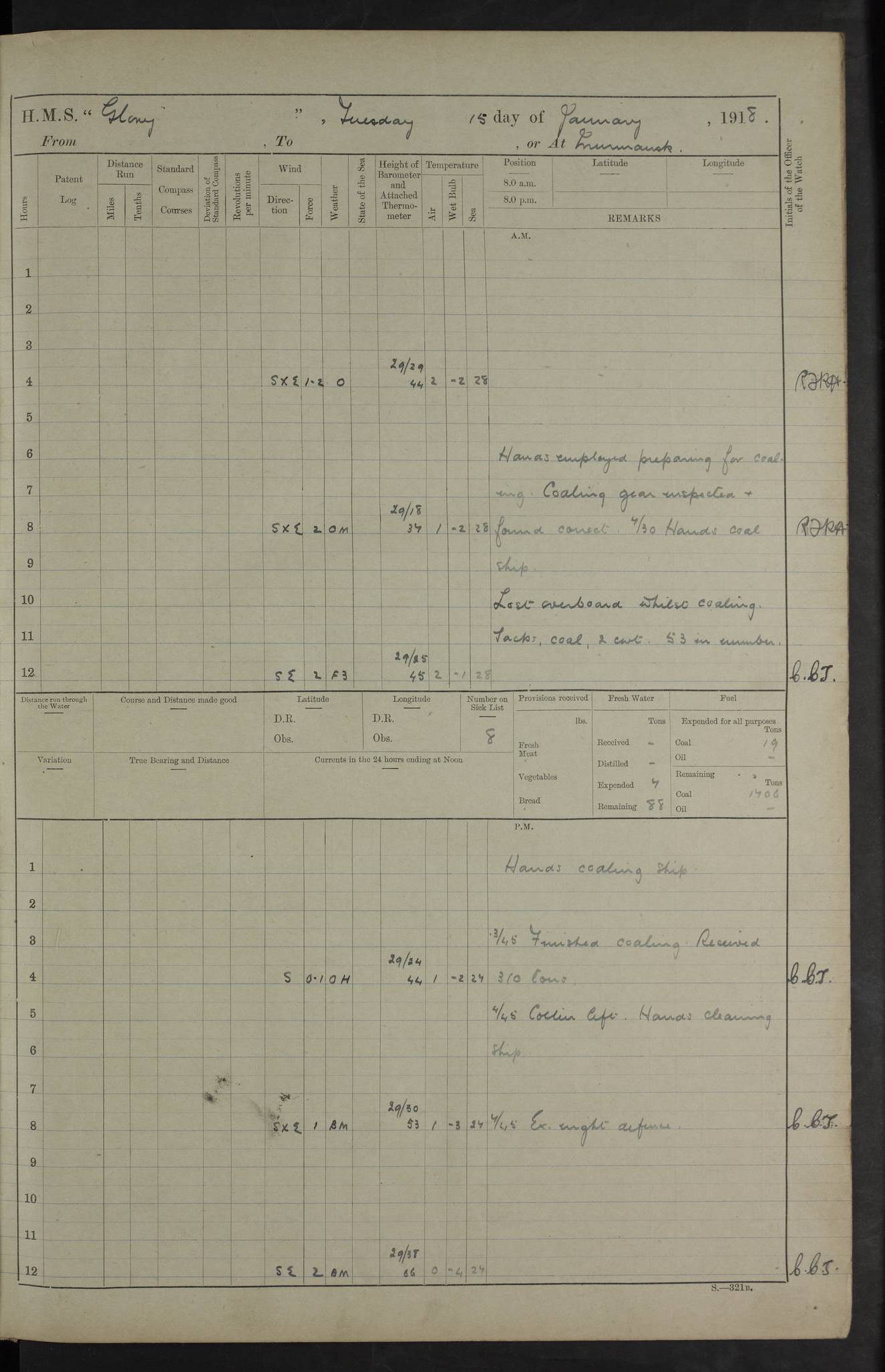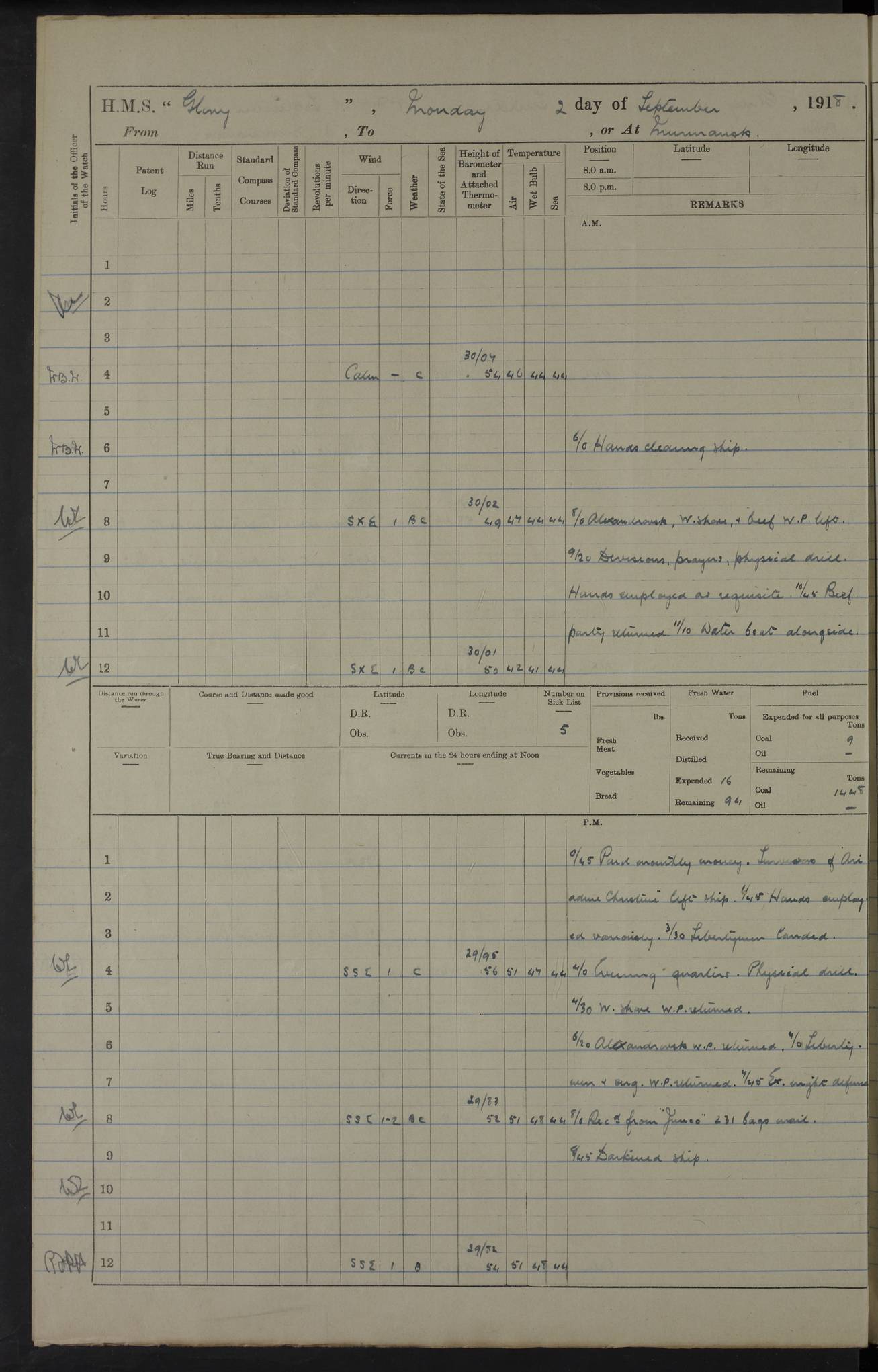 22 June 1915 At sea, Gibraltar to Lemnos Lat 36.1, Long -1.3 4.15am: Sighted land on starboard bow. 10.20am: Stopped port engine for repairs. 11.20am: proceeded with port engine. pm: a/c due to change in deviation. 10.00pm: Cape Tenez Light abeam, 18 miles. 4f73cd61a2fc8ea9030015f6: (https://s3.amazonaws.com:443/oldweather/ADM53-43015/0012_1.jpg) 23 June 1915 At sea, Gibraltar to Lemnos Lat 37.5, Long 4.8 Number on sick list: 4 5.00am: Secured from night defence stations. Placed anti-submarine guns. pm: Life saving appliances served out to men stationed in ? ?at abandon ship. 4f73cd61a2fc8ea9030015f7: (https://s3.amazonaws.com:443/oldweather/ADM53-43015/0013_0.jpg) 24 June 1915 At sea, Gibraltar to Lemnos Lat 37.4, Long 10.8 Position in log clearly bears no resemblance to the location of the ship. Position above is approximate and is based sighting of Zembra Island at 11.55am. 5.00am: Dispersed from night defence stations. Manned anti-submarine guns. am: Sighted two French torpedo boats. am: Torpedo boats passed to ~ No 362, 363. am: Sighted land on starboard beam. 11.55am: Zembra Island abeam, 25 miles. 2.00pm: Sighted Pantellaria S34ºE. 4.45pm: Pantellaria Light House abeam 12 miles. 4f73cd61a2fc8ea9030015f8: (https://s3.amazonaws.com:443/oldweather/ADM53-43015/0013_1.jpg) 25 June 1915 At sea, Gibraltar to Lemnos Lat 35.5, Long 16.7 2.10am: Gozo Light abeam 17 miles. 5.00am: Dispersed from night defence stations. Manned anti-submarine guns. 4f73cd61a2fc8ea9030015f9: (https://s3.amazonaws.com:443/oldweather/ADM53-43015/0014_0.jpg) 26 June 1915 At sea, Gibraltar to Lemnos Lat 35.5, Long 22.6 Number on sick list: 5 5.00am: Dispersed from night defence stations. Manned anti-submarine guns. am: Aired night clothing. am: marines at maxim practice on quarter deck. 2.00pm: Observed land on either bow. 3.00pm: Sighted French patrol destroyer. 4.15pm: Sighted French patrol destroyer. 9.40pm: Milo Peak N63ºW. 10.26pm: Polino Light abeam to port 5.5 miles. 4f73cd62a2fc8ea9030015fa: (https://s3.amazonaws.com:443/oldweather/ADM53-43015/0014_1.jpg) 27 June 1915 At sea and at Lemnos Lat 39.1, Long 24.4 From 0.50 to 3.05am sighting of multiple light houses. 3.50am: a/c to N39ºW and commenced to zig-zag. 5.00am: Dispersed from night defence stations and placed anti-submarine guns and look-outs. am: Lost overboard by accident Hazlewood fender, pat. 311, one in number. 10.30am: Held Divine Service onboard. pm: Met and signalled HMS Minerva on patrol duty. pm: Courses and speeds as requisite while waiting orders to approach Mudros. 3.00pm: Proceeded. 5.16pm: Increased to 90 revs, commenced to zig-zag. Course as requisite for Mudros. 7.00pm: Entered Mudros Bay. 7.47pm: Stopped. Let go port anchor in ‘M3’. 8.30pm: Darkened ship. pm: Manned one 6” and one 12 pdr. 4f73cd62a2fc8ea9030015fb: (https://s3.amazonaws.com:443/oldweather/ADM53-43015/0015_0.jpg) 28 June 1915 Mudros Bay, Lemnos Lat 39.89, Long 25.24 5,00am: HMS Vengeance entered harbour. HMS Vengeance was a pre-dreadnought of the Canopus class, launched in 1899 at Vickers, Barrow, and sold for scrapping in 1921. Details at http://en.wikipedia.org/wiki/HMS_Vengeance_(1899) . am/pm/: hands preparing for coaling and about ship’s work. pm: Collier Wabana secured alongside. 4f73cd62a2fc8ea9030015fc: (https://s3.amazonaws.com:443/oldweather/ADM53-43015/0015_1.jpg) 29 June 1915 Mudros Bay, Lemnos Lat 39.89, Long 25.24 5.15am: Commenced coaling. 2.00pm: Finished coaling. Collier left. 4f73cd62a2fc8ea9030015fd: (https://s3.amazonaws.com:443/oldweather/ADM53-43015/0016_0.jpg) 30 June 1915 Mudros Bay, Lemnos Lat 39.89, Long 25.24 am: Parties away sanding, and with fire engines onshore. am: Boats away disembarking troops. am: French Flagship Patrie sailed. The Patrie was a French pre-dreadnought, launched at La Seyne shipyard in 1903, and stricken in 1921. Details at http://en.wikipedia.org/wiki/French_battleship_Patrie . 6.30pm: Hands to bathe. 4f73cd63a2fc8ea9030015fe: (https://s3.amazonaws.com:443/oldweather/ADM53-43015/0016_1.jpg) 4f73cd63a2fc8ea9030015ff: (https://s3.amazonaws.com:443/oldweather/ADM53-43015/0017_0.jpg) 4f73cd63a2fc8ea903001600: (https://s3.amazonaws.com:443/oldweather/ADM53-43015/0017_1.jpg) 4f73cd63a2fc8ea903001601: (https://s3.amazonaws.com:443/oldweather/ADM53-43015/0018_0.jpg) 4f73cd64a2fc8ea903001602: (https://s3.amazonaws.com:443/oldweather/ADM53-43015/0018_1.jpg) LOGS FOR JULY 1915 From July to October 1915, HMS Glory spent her time at Port Mudros. Certain activities typically took place daily and are not generally noted in the pages below. These activities include: Lighting fires in the picket boat around 4am and drawing the fires in the late evening; Divisions at around 9–9.30am and Evening Quarters at 4pm; Darken ship at around 8.30pm; Daily ‘cleaning ship’, with variations thereof; SBC (for ‘Signal Books Correct’) at the watch changes. 4f73cd64a2fc8ea903001603: (https://s3.amazonaws.com:443/oldweather/ADM53-43016/0000_0.jpg) 4f73cd64a2fc8ea903001604: (https://s3.amazonaws.com:443/oldweather/ADM53-43016/0000_1.jpg) 4f73cd65a2fc8ea903001605: (https://s3.amazonaws.com:443/oldweather/ADM53-43016/0001_0.jpg) 4f73cd65a2fc8ea903001606: (https://s3.amazonaws.com:443/oldweather/ADM53-43016/0001_1.jpg) 1 July 1915 Port Mudros Lat 39.89, Long 25.24 6.30am: Landed working parties preparing boom defence ships. am: Discharged Acting Commander Rayne to Hector. Hector was a kite balloon ship. No further details readily available. 5.00pm: Tug T.10 made fast astern. 7.15pm: HMS Venerable went out. 7.30pm: HMS Chatham went out. HMS Chatham was a ‘Town’ cruiser and lead ship of her class. She was launched in 1911 at Chatham Dockyard and sold in 1926. Details at http://en.wikipedia.org/wiki/HMS_Chatham_(1911) . 4f73cd65a2fc8ea903001607: (https://s3.amazonaws.com:443/oldweather/ADM53-43016/0002_0.jpg) 2 July 1915 Port Mudros Lat 39.89, Long 25.24 5.35am: Landed working parties preparing boom defence ships. am/pm: Boom defence par