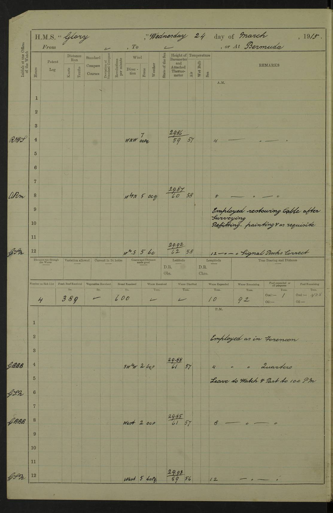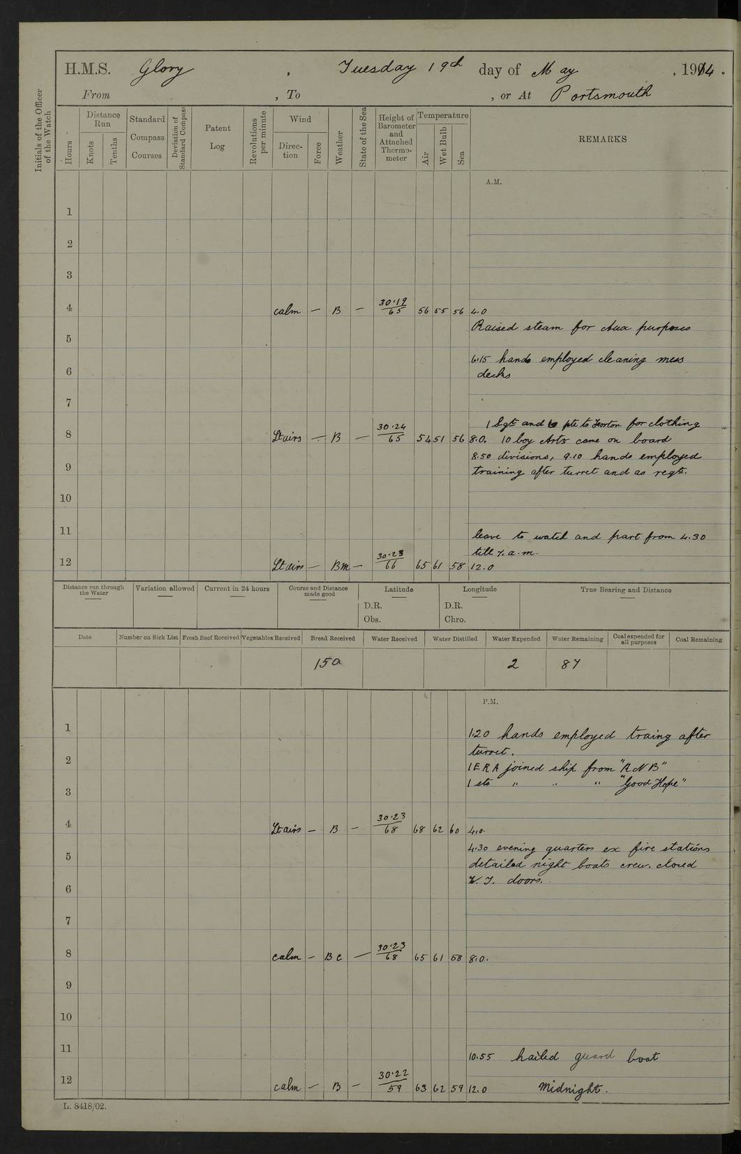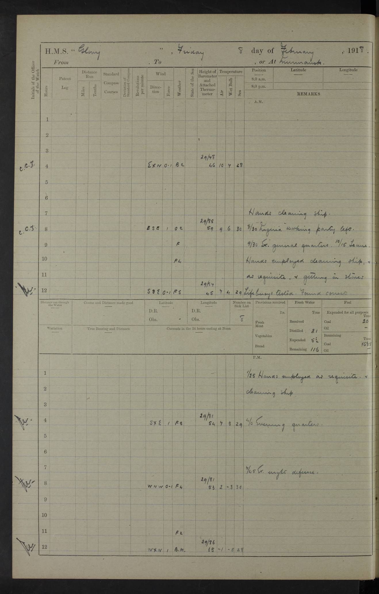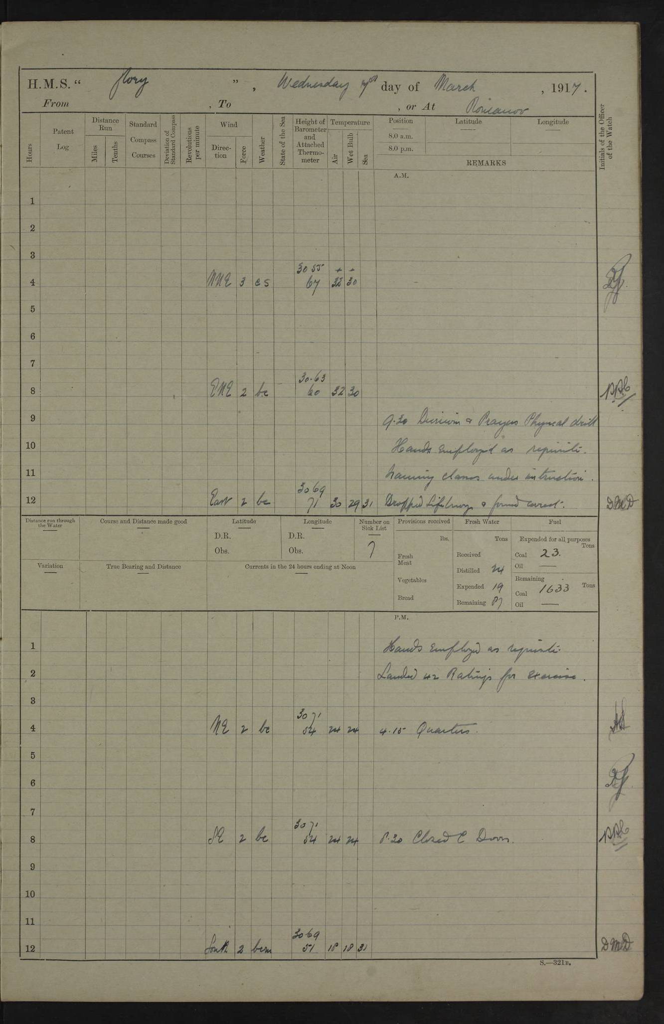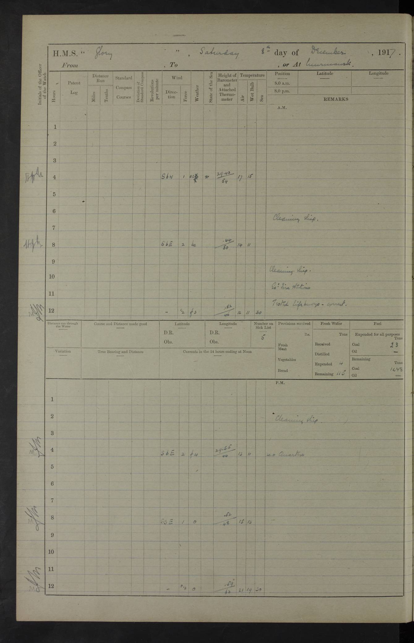 22 June 1915 At sea, Gibraltar to Lemnos Lat 36.1, Long -1.3 4.15am: Sighted land on starboard bow. 10.20am: Stopped port engine for repairs. 11.20am: proceeded with port engine. pm: a/c due to change in deviation. 10.00pm: Cape Tenez Light abeam, 18 miles. 4f73cd61a2fc8ea9030015f6: (https://s3.amazonaws.com:443/oldweather/ADM53-43015/0012_1.jpg) 23 June 1915 At sea, Gibraltar to Lemnos Lat 37.5, Long 4.8 Number on sick list: 4 5.00am: Secured from night defence stations. Placed anti-submarine guns. pm: Life saving appliances served out to men stationed in ? ?at abandon ship. 4f73cd61a2fc8ea9030015f7: (https://s3.amazonaws.com:443/oldweather/ADM53-43015/0013_0.jpg) 24 June 1915 At sea, Gibraltar to Lemnos Lat 37.4, Long 10.8 Position in log clearly bears no resemblance to the location of the ship. Position above is approximate and is based sighting of Zembra Island at 11.55am. 5.00am: Dispersed from night defence stations. Manned anti-submarine guns. am: Sighted two French torpedo boats. am: Torpedo boats passed to ~ No 362, 363. am: Sighted land on starboard beam. 11.55am: Zembra Island abeam, 25 miles. 2.00pm: Sighted Pantellaria S34ºE. 4.45pm: Pantellaria Light House abeam 12 miles. 4f73cd61a2fc8ea9030015f8: (https://s3.amazonaws.com:443/oldweather/ADM53-43015/0013_1.jpg) 25 June 1915 At sea, Gibraltar to Lemnos Lat 35.5, Long 16.7 2.10am: Gozo Light abeam 17 miles. 5.00am: Dispersed from night defence stations. Manned anti-submarine guns. 4f73cd61a2fc8ea9030015f9: (https://s3.amazonaws.com:443/oldweather/ADM53-43015/0014_0.jpg) 26 June 1915 At sea, Gibraltar to Lemnos Lat 35.5, Long 22.6 Number on sick list: 5 5.00am: Dispersed from night defence stations. Manned anti-submarine guns. am: Aired night clothing. am: marines at maxim practice on quarter deck. 2.00pm: Observed land on either bow. 3.00pm: Sighted French patrol destroyer. 4.15pm: Sighted French patrol destroyer. 9.40pm: Milo Peak N63ºW. 10.26pm: Polino Light abeam to port 5.5 miles. 4f73cd62a2fc8ea9030015fa: (https://s3.amazonaws.com:443/oldweather/ADM53-43015/0014_1.jpg) 27 June 1915 At sea and at Lemnos Lat 39.1, Long 24.4 From 0.50 to 3.05am sighting of multiple light houses. 3.50am: a/c to N39ºW and commenced to zig-zag. 5.00am: Dispersed from night defence stations and placed anti-submarine guns and look-outs. am: Lost overboard by accident Hazlewood fender, pat. 311, one in number. 10.30am: Held Divine Service onboard. pm: Met and signalled HMS Minerva on patrol duty. pm: Courses and speeds as requisite while waiting orders to approach Mudros. 3.00pm: Proceeded. 5.16pm: Increased to 90 revs, commenced to zig-zag. Course as requisite for Mudros. 7.00pm: Entered Mudros Bay. 7.47pm: Stopped. Let go port anchor in ‘M3’. 8.30pm: Darkened ship. pm: Manned one 6” and one 12 pdr. 4f73cd62a2fc8ea9030015fb: (https://s3.amazonaws.com:443/oldweather/ADM53-43015/0015_0.jpg) 28 June 1915 Mudros Bay, Lemnos Lat 39.89, Long 25.24 5,00am: HMS Vengeance entered harbour. HMS Vengeance was a pre-dreadnought of the Canopus class, launched in 1899 at Vickers, Barrow, and sold for scrapping in 1921. Details at http://en.wikipedia.org/wiki/HMS_Vengeance_(1899) . am/pm/: hands preparing for coaling and about ship’s work. pm: Collier Wabana secured alongside. 4f73cd62a2fc8ea9030015fc: (https://s3.amazonaws.com:443/oldweather/ADM53-43015/0015_1.jpg) 29 June 1915 Mudros Bay, Lemnos Lat 39.89, Long 25.24 5.15am: Commenced coaling. 2.00pm: Finished coaling. Collier left. 4f73cd62a2fc8ea9030015fd: (https://s3.amazonaws.com:443/oldweather/ADM53-43015/0016_0.jpg) 30 June 1915 Mudros Bay, Lemnos Lat 39.89, Long 25.24 am: Parties away sanding, and with fire engines onshore. am: Boats away disembarking troops. am: French Flagship Patrie sailed. The Patrie was a French pre-dreadnought, launched at La Seyne shipyard in 1903, and stricken in 1921. Details at http://en.wikipedia.org/wiki/French_battleship_Patrie . 6.30pm: Hands to bathe. 4f73cd63a2fc8ea9030015fe: (https://s3.amazonaws.com:443/oldweather/ADM53-43015/0016_1.jpg) 4f73cd63a2fc8ea9030015ff: (https://s3.amazonaws.com:443/oldweather/ADM53-43015/0017_0.jpg) 4f73cd63a2fc8ea903001600: (https://s3.amazonaws.com:443/oldweather/ADM53-43015/0017_1.jpg) 4f73cd63a2fc8ea903001601: (https://s3.amazonaws.com:443/oldweather/ADM53-43015/0018_0.jpg) 4f73cd64a2fc8ea903001602: (https://s3.amazonaws.com:443/oldweather/ADM53-43015/0018_1.jpg) LOGS FOR JULY 1915 From July to October 1915, HMS Glory spent her time at Port Mudros. Certain activities typically took place daily and are not generally noted in the pages below. These activities include: Lighting fires in the picket boat around 4am and drawing the fires in the late evening; Divisions at around 9–9.30am and Evening Quarters at 4pm; Darken ship at around 8.30pm; Daily ‘cleaning ship’, with variations thereof; SBC (for ‘Signal Books Correct’) at the watch changes. 4f73cd64a2fc8ea903001603: (https://s3.amazonaws.com:443/oldweather/ADM53-43016/0000_0.jpg) 4f73cd64a2fc8ea903001604: (https://s3.amazonaws.com:443/oldweather/ADM53-43016/0000_1.jpg) 4f73cd65a2fc8ea903001605: (https://s3.amazonaws.com:443/oldweather/ADM53-43016/0001_0.jpg) 4f73cd65a2fc8ea903001606: (https://s3.amazonaws.com:443/oldweather/ADM53-43016/0001_1.jpg) 1 July 1915 Port Mudros Lat 39.89, Long 25.24 6.30am: Landed working parties preparing boom defence ships. am: Discharged Acting Commander Rayne to Hector. Hector was a kite balloon ship. No further details readily available. 5.00pm: Tug T.10 made fast astern. 7.15pm: HMS Venerable went out. 7.30pm: HMS Chatham went out. HMS Chatham was a ‘Town’ cruiser and lead ship of her class. She was launched in 1911 at Chatham Dockyard and sold in 1926. Details at http://en.wikipedia.org/wiki/HMS_Chatham_(1911) . 4f73cd65a2fc8ea903001607: (https://s3.amazonaws.com:443/oldweather/ADM53-43016/0002_0.jpg) 2 July 1915 Port Mudros Lat 39.89, Long 25.24 5.35am: Landed working parties preparing boom defence ships. am/pm: Boom defence par
