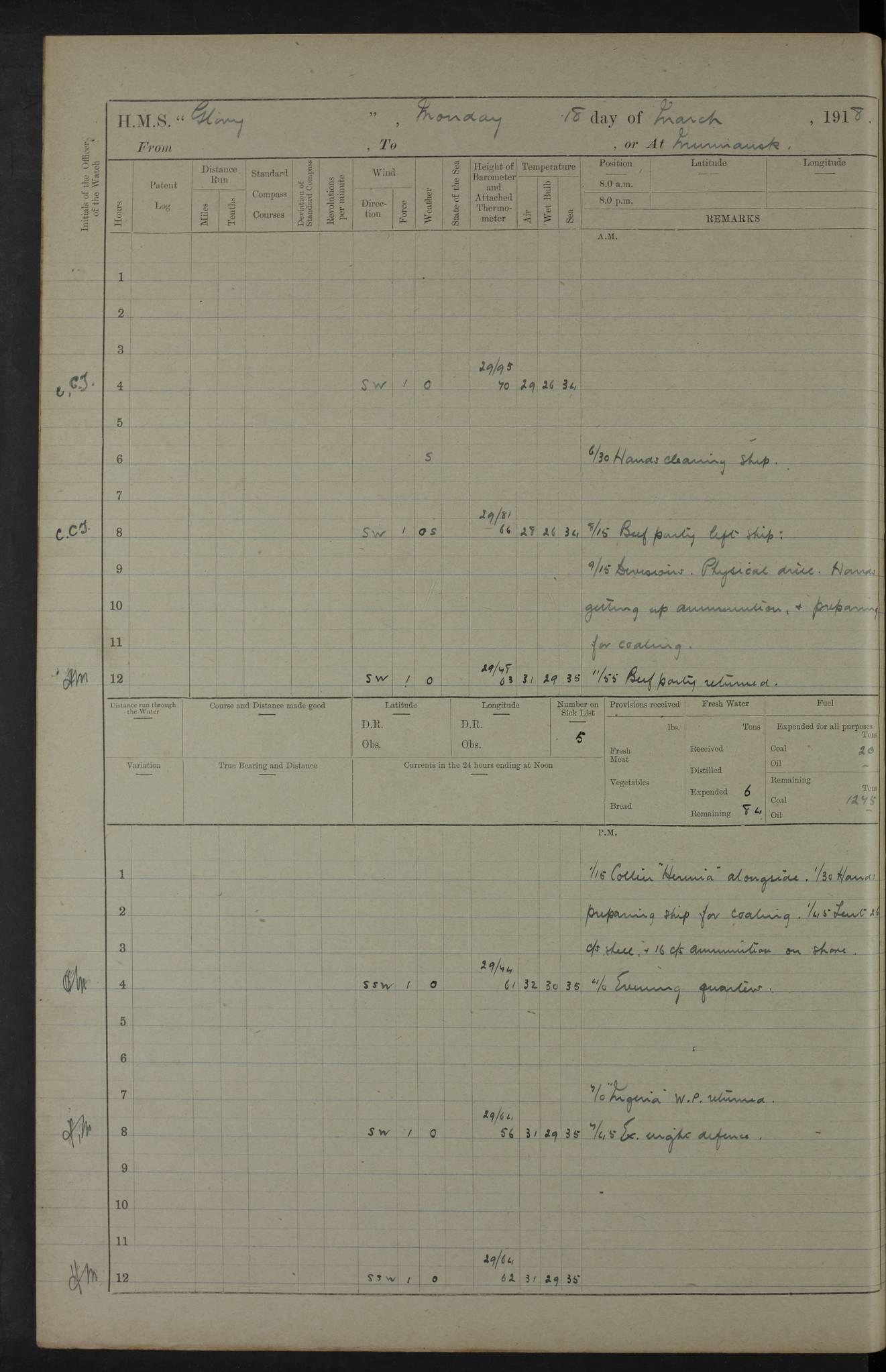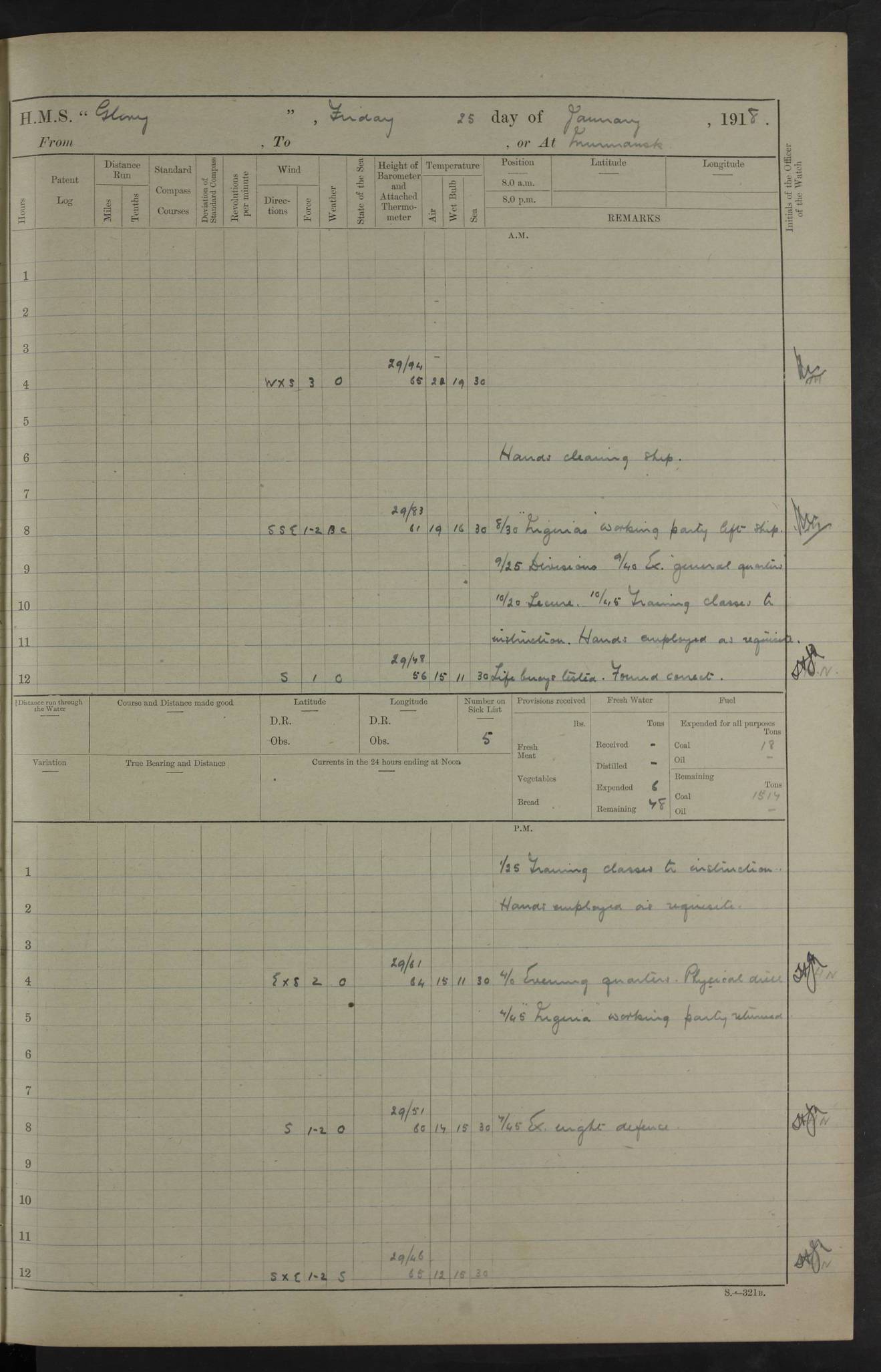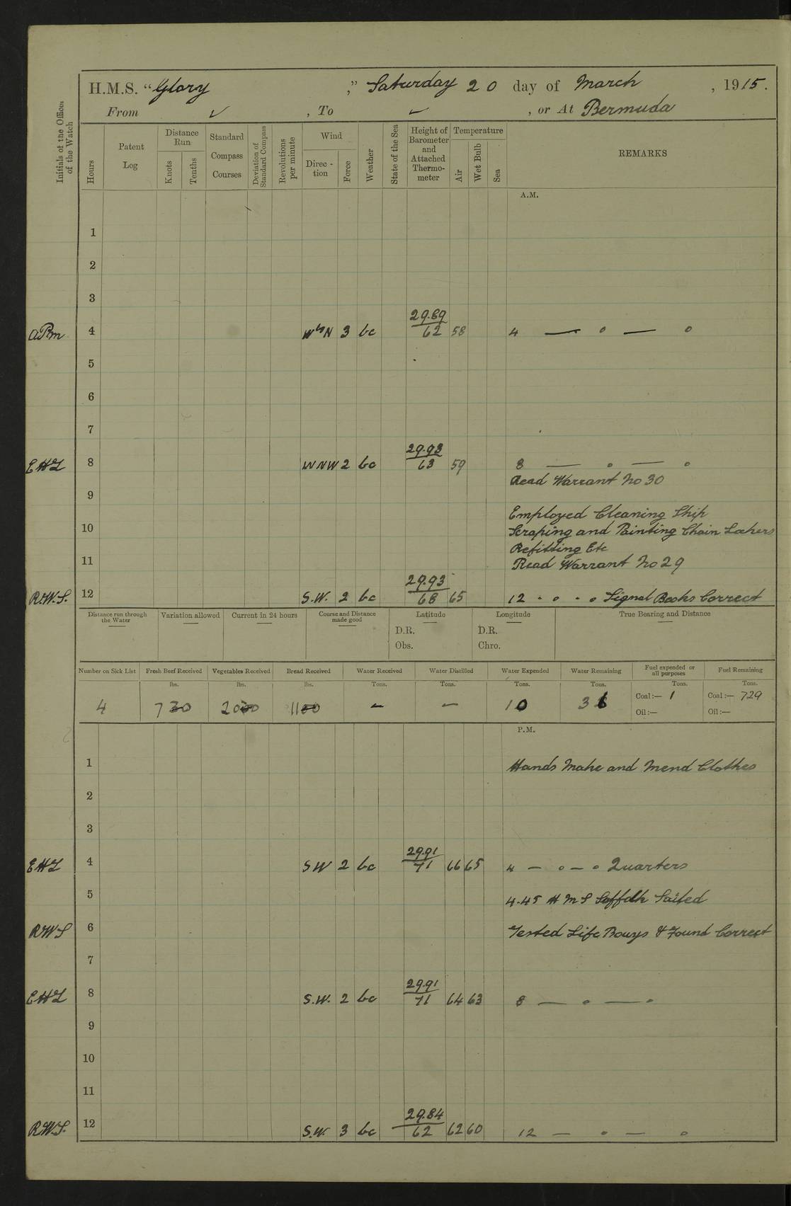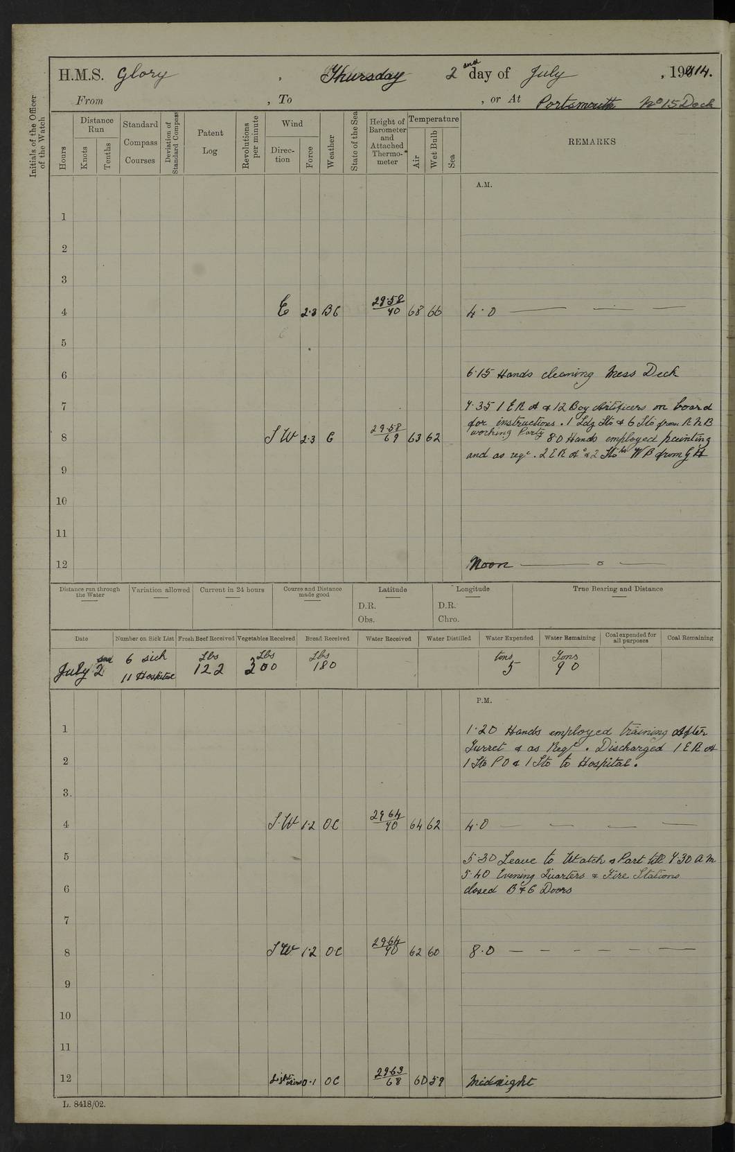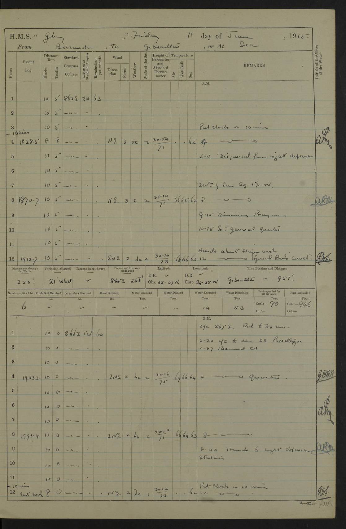 22 June 1915 At sea, Gibraltar to Lemnos Lat 36.1, Long -1.3 4.15am: Sighted land on starboard bow. 10.20am: Stopped port engine for repairs. 11.20am: proceeded with port engine. pm: a/c due to change in deviation. 10.00pm: Cape Tenez Light abeam, 18 miles. 4f73cd61a2fc8ea9030015f6: (https://s3.amazonaws.com:443/oldweather/ADM53-43015/0012_1.jpg) 23 June 1915 At sea, Gibraltar to Lemnos Lat 37.5, Long 4.8 Number on sick list: 4 5.00am: Secured from night defence stations. Placed anti-submarine guns. pm: Life saving appliances served out to men stationed in ? ?at abandon ship. 4f73cd61a2fc8ea9030015f7: (https://s3.amazonaws.com:443/oldweather/ADM53-43015/0013_0.jpg) 24 June 1915 At sea, Gibraltar to Lemnos Lat 37.4, Long 10.8 Position in log clearly bears no resemblance to the location of the ship. Position above is approximate and is based sighting of Zembra Island at 11.55am. 5.00am: Dispersed from night defence stations. Manned anti-submarine guns. am: Sighted two French torpedo boats. am: Torpedo boats passed to ~ No 362, 363. am: Sighted land on starboard beam. 11.55am: Zembra Island abeam, 25 miles. 2.00pm: Sighted Pantellaria S34ºE. 4.45pm: Pantellaria Light House abeam 12 miles. 4f73cd61a2fc8ea9030015f8: (https://s3.amazonaws.com:443/oldweather/ADM53-43015/0013_1.jpg) 25 June 1915 At sea, Gibraltar to Lemnos Lat 35.5, Long 16.7 2.10am: Gozo Light abeam 17 miles. 5.00am: Dispersed from night defence stations. Manned anti-submarine guns. 4f73cd61a2fc8ea9030015f9: (https://s3.amazonaws.com:443/oldweather/ADM53-43015/0014_0.jpg) 26 June 1915 At sea, Gibraltar to Lemnos Lat 35.5, Long 22.6 Number on sick list: 5 5.00am: Dispersed from night defence stations. Manned anti-submarine guns. am: Aired night clothing. am: marines at maxim practice on quarter deck. 2.00pm: Observed land on either bow. 3.00pm: Sighted French patrol destroyer. 4.15pm: Sighted French patrol destroyer. 9.40pm: Milo Peak N63ºW. 10.26pm: Polino Light abeam to port 5.5 miles. 4f73cd62a2fc8ea9030015fa: (https://s3.amazonaws.com:443/oldweather/ADM53-43015/0014_1.jpg) 27 June 1915 At sea and at Lemnos Lat 39.1, Long 24.4 From 0.50 to 3.05am sighting of multiple light houses. 3.50am: a/c to N39ºW and commenced to zig-zag. 5.00am: Dispersed from night defence stations and placed anti-submarine guns and look-outs. am: Lost overboard by accident Hazlewood fender, pat. 311, one in number. 10.30am: Held Divine Service onboard. pm: Met and signalled HMS Minerva on patrol duty. pm: Courses and speeds as requisite while waiting orders to approach Mudros. 3.00pm: Proceeded. 5.16pm: Increased to 90 revs, commenced to zig-zag. Course as requisite for Mudros. 7.00pm: Entered Mudros Bay. 7.47pm: Stopped. Let go port anchor in ‘M3’. 8.30pm: Darkened ship. pm: Manned one 6” and one 12 pdr. 4f73cd62a2fc8ea9030015fb: (https://s3.amazonaws.com:443/oldweather/ADM53-43015/0015_0.jpg) 28 June 1915 Mudros Bay, Lemnos Lat 39.89, Long 25.24 5,00am: HMS Vengeance entered harbour. HMS Vengeance was a pre-dreadnought of the Canopus class, launched in 1899 at Vickers, Barrow, and sold for scrapping in 1921. Details at http://en.wikipedia.org/wiki/HMS_Vengeance_(1899) . am/pm/: hands preparing for coaling and about ship’s work. pm: Collier Wabana secured alongside. 4f73cd62a2fc8ea9030015fc: (https://s3.amazonaws.com:443/oldweather/ADM53-43015/0015_1.jpg) 29 June 1915 Mudros Bay, Lemnos Lat 39.89, Long 25.24 5.15am: Commenced coaling. 2.00pm: Finished coaling. Collier left. 4f73cd62a2fc8ea9030015fd: (https://s3.amazonaws.com:443/oldweather/ADM53-43015/0016_0.jpg) 30 June 1915 Mudros Bay, Lemnos Lat 39.89, Long 25.24 am: Parties away sanding, and with fire engines onshore. am: Boats away disembarking troops. am: French Flagship Patrie sailed. The Patrie was a French pre-dreadnought, launched at La Seyne shipyard in 1903, and stricken in 1921. Details at http://en.wikipedia.org/wiki/French_battleship_Patrie . 6.30pm: Hands to bathe. 4f73cd63a2fc8ea9030015fe: (https://s3.amazonaws.com:443/oldweather/ADM53-43015/0016_1.jpg) 4f73cd63a2fc8ea9030015ff: (https://s3.amazonaws.com:443/oldweather/ADM53-43015/0017_0.jpg) 4f73cd63a2fc8ea903001600: (https://s3.amazonaws.com:443/oldweather/ADM53-43015/0017_1.jpg) 4f73cd63a2fc8ea903001601: (https://s3.amazonaws.com:443/oldweather/ADM53-43015/0018_0.jpg) 4f73cd64a2fc8ea903001602: (https://s3.amazonaws.com:443/oldweather/ADM53-43015/0018_1.jpg) LOGS FOR JULY 1915 From July to October 1915, HMS Glory spent her time at Port Mudros. Certain activities typically took place daily and are not generally noted in the pages below. These activities include: Lighting fires in the picket boat around 4am and drawing the fires in the late evening; Divisions at around 9–9.30am and Evening Quarters at 4pm; Darken ship at around 8.30pm; Daily ‘cleaning ship’, with variations thereof; SBC (for ‘Signal Books Correct’) at the watch changes. 4f73cd64a2fc8ea903001603: (https://s3.amazonaws.com:443/oldweather/ADM53-43016/0000_0.jpg) 4f73cd64a2fc8ea903001604: (https://s3.amazonaws.com:443/oldweather/ADM53-43016/0000_1.jpg) 4f73cd65a2fc8ea903001605: (https://s3.amazonaws.com:443/oldweather/ADM53-43016/0001_0.jpg) 4f73cd65a2fc8ea903001606: (https://s3.amazonaws.com:443/oldweather/ADM53-43016/0001_1.jpg) 1 July 1915 Port Mudros Lat 39.89, Long 25.24 6.30am: Landed working parties preparing boom defence ships. am: Discharged Acting Commander Rayne to Hector. Hector was a kite balloon ship. No further details readily available. 5.00pm: Tug T.10 made fast astern. 7.15pm: HMS Venerable went out. 7.30pm: HMS Chatham went out. HMS Chatham was a ‘Town’ cruiser and lead ship of her class. She was launched in 1911 at Chatham Dockyard and sold in 1926. Details at http://en.wikipedia.org/wiki/HMS_Chatham_(1911) . 4f73cd65a2fc8ea903001607: (https://s3.amazonaws.com:443/oldweather/ADM53-43016/0002_0.jpg) 2 July 1915 Port Mudros Lat 39.89, Long 25.24 5.35am: Landed working parties preparing boom defence ships. am/pm: Boom defence par