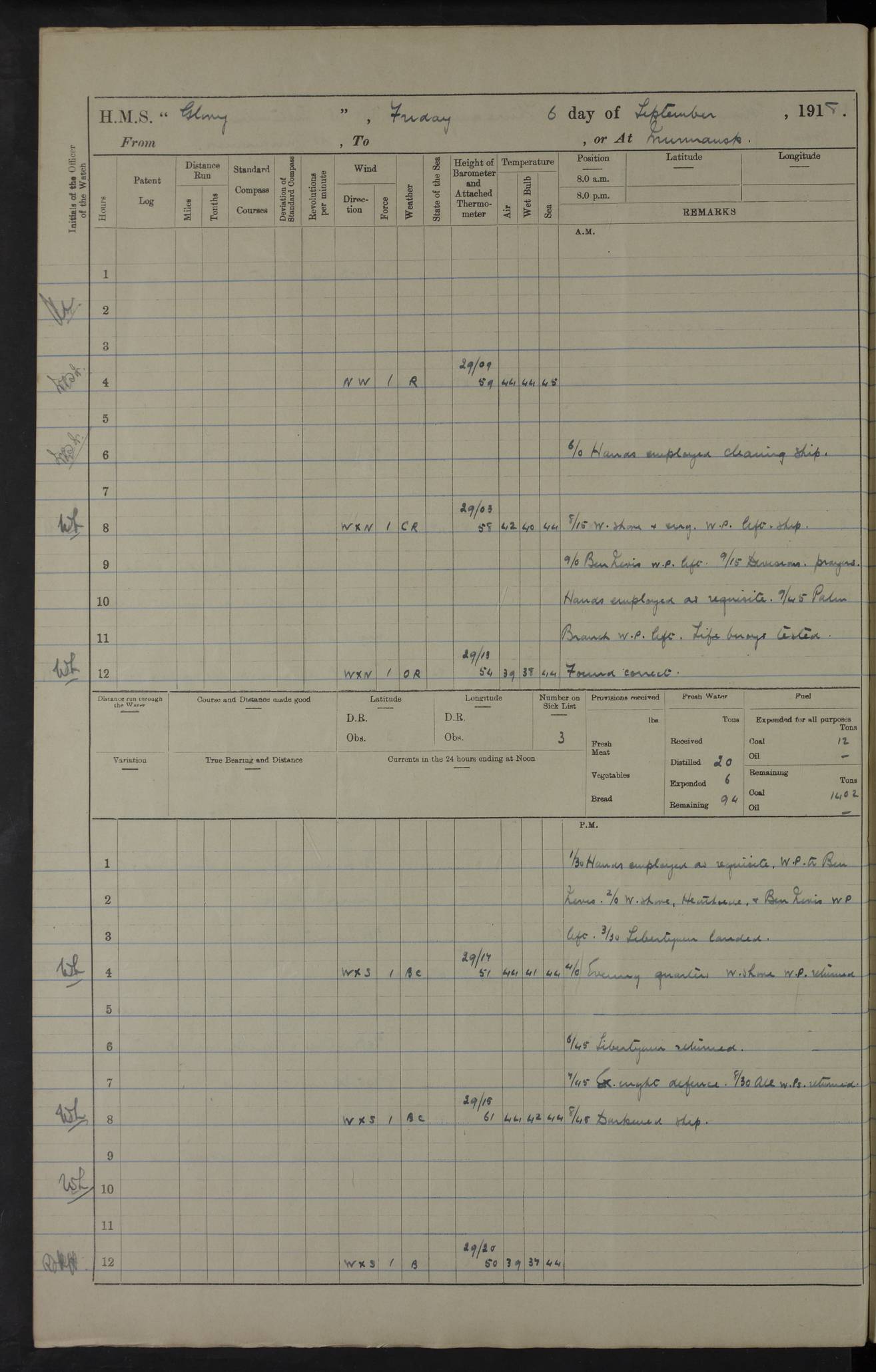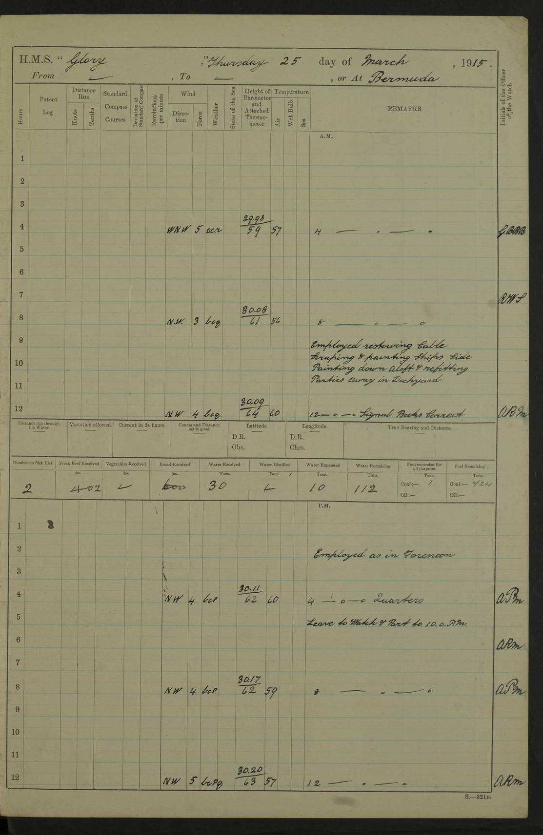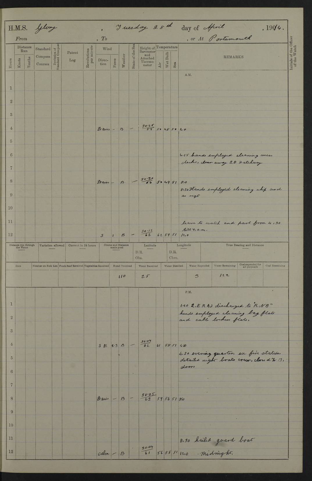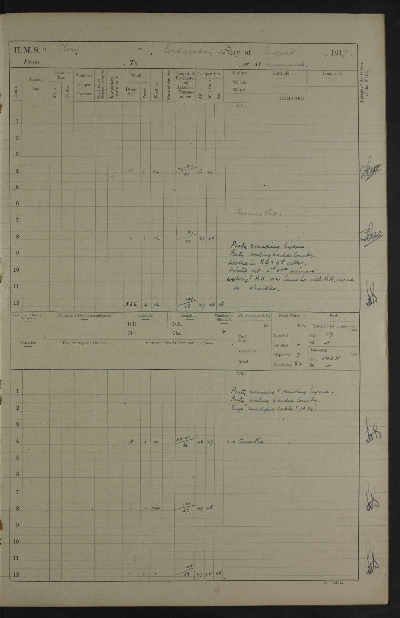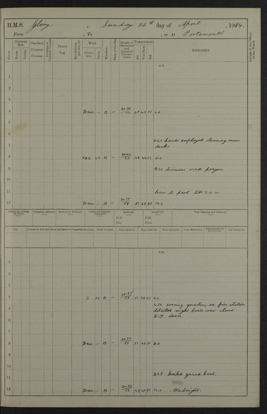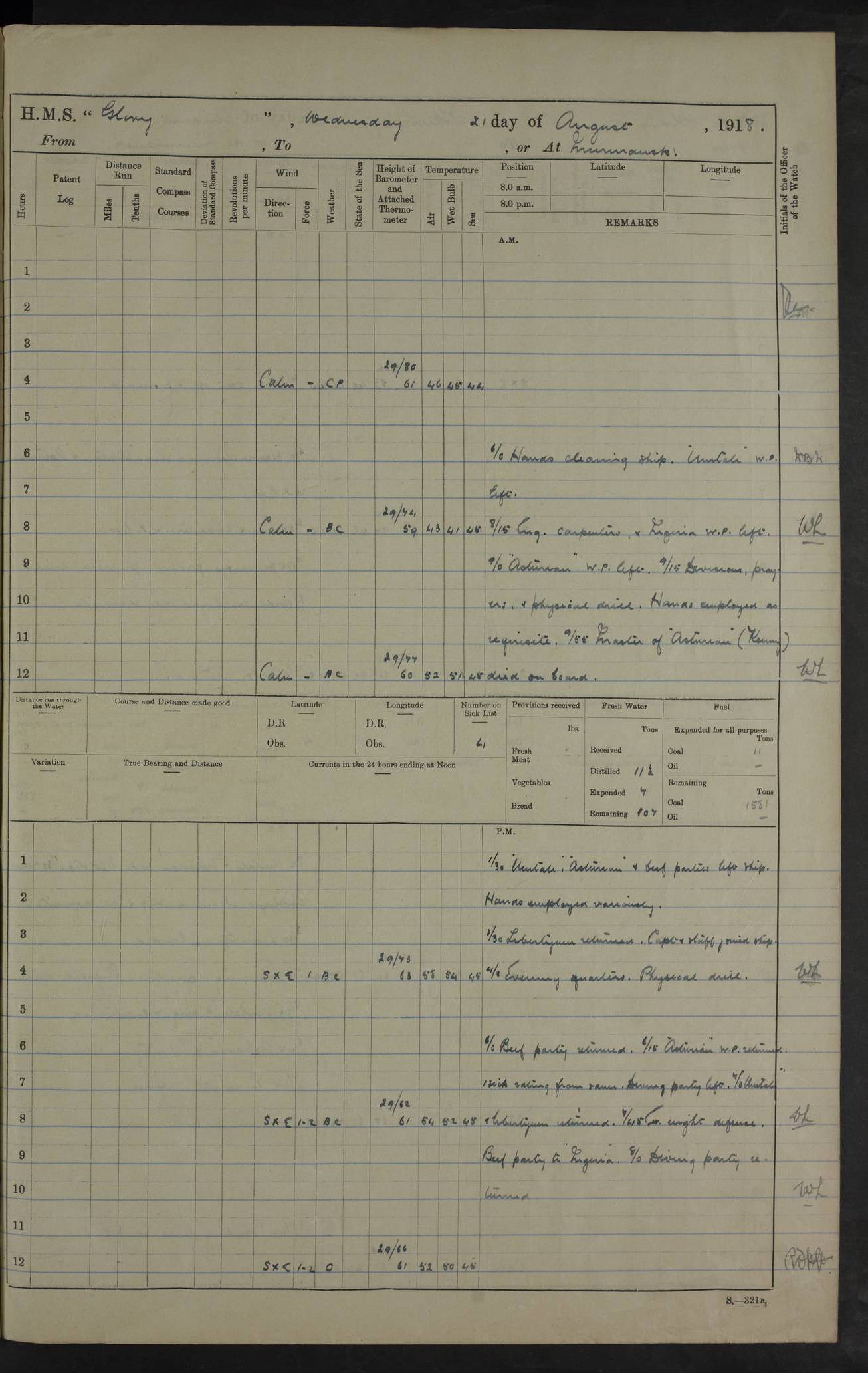 22 June 1915 At sea, Gibraltar to Lemnos Lat 36.1, Long -1.3 4.15am: Sighted land on starboard bow. 10.20am: Stopped port engine for repairs. 11.20am: proceeded with port engine. pm: a/c due to change in deviation. 10.00pm: Cape Tenez Light abeam, 18 miles. 4f73cd61a2fc8ea9030015f6: (https://s3.amazonaws.com:443/oldweather/ADM53-43015/0012_1.jpg) 23 June 1915 At sea, Gibraltar to Lemnos Lat 37.5, Long 4.8 Number on sick list: 4 5.00am: Secured from night defence stations. Placed anti-submarine guns. pm: Life saving appliances served out to men stationed in ? ?at abandon ship. 4f73cd61a2fc8ea9030015f7: (https://s3.amazonaws.com:443/oldweather/ADM53-43015/0013_0.jpg) 24 June 1915 At sea, Gibraltar to Lemnos Lat 37.4, Long 10.8 Position in log clearly bears no resemblance to the location of the ship. Position above is approximate and is based sighting of Zembra Island at 11.55am. 5.00am: Dispersed from night defence stations. Manned anti-submarine guns. am: Sighted two French torpedo boats. am: Torpedo boats passed to ~ No 362, 363. am: Sighted land on starboard beam. 11.55am: Zembra Island abeam, 25 miles. 2.00pm: Sighted Pantellaria S34ºE. 4.45pm: Pantellaria Light House abeam 12 miles. 4f73cd61a2fc8ea9030015f8: (https://s3.amazonaws.com:443/oldweather/ADM53-43015/0013_1.jpg) 25 June 1915 At sea, Gibraltar to Lemnos Lat 35.5, Long 16.7 2.10am: Gozo Light abeam 17 miles. 5.00am: Dispersed from night defence stations. Manned anti-submarine guns. 4f73cd61a2fc8ea9030015f9: (https://s3.amazonaws.com:443/oldweather/ADM53-43015/0014_0.jpg) 26 June 1915 At sea, Gibraltar to Lemnos Lat 35.5, Long 22.6 Number on sick list: 5 5.00am: Dispersed from night defence stations. Manned anti-submarine guns. am: Aired night clothing. am: marines at maxim practice on quarter deck. 2.00pm: Observed land on either bow. 3.00pm: Sighted French patrol destroyer. 4.15pm: Sighted French patrol destroyer. 9.40pm: Milo Peak N63ºW. 10.26pm: Polino Light abeam to port 5.5 miles. 4f73cd62a2fc8ea9030015fa: (https://s3.amazonaws.com:443/oldweather/ADM53-43015/0014_1.jpg) 27 June 1915 At sea and at Lemnos Lat 39.1, Long 24.4 From 0.50 to 3.05am sighting of multiple light houses. 3.50am: a/c to N39ºW and commenced to zig-zag. 5.00am: Dispersed from night defence stations and placed anti-submarine guns and look-outs. am: Lost overboard by accident Hazlewood fender, pat. 311, one in number. 10.30am: Held Divine Service onboard. pm: Met and signalled HMS Minerva on patrol duty. pm: Courses and speeds as requisite while waiting orders to approach Mudros. 3.00pm: Proceeded. 5.16pm: Increased to 90 revs, commenced to zig-zag. Course as requisite for Mudros. 7.00pm: Entered Mudros Bay. 7.47pm: Stopped. Let go port anchor in ‘M3’. 8.30pm: Darkened ship. pm: Manned one 6” and one 12 pdr. 4f73cd62a2fc8ea9030015fb: (https://s3.amazonaws.com:443/oldweather/ADM53-43015/0015_0.jpg) 28 June 1915 Mudros Bay, Lemnos Lat 39.89, Long 25.24 5,00am: HMS Vengeance entered harbour. HMS Vengeance was a pre-dreadnought of the Canopus class, launched in 1899 at Vickers, Barrow, and sold for scrapping in 1921. Details at http://en.wikipedia.org/wiki/HMS_Vengeance_(1899) . am/pm/: hands preparing for coaling and about ship’s work. pm: Collier Wabana secured alongside. 4f73cd62a2fc8ea9030015fc: (https://s3.amazonaws.com:443/oldweather/ADM53-43015/0015_1.jpg) 29 June 1915 Mudros Bay, Lemnos Lat 39.89, Long 25.24 5.15am: Commenced coaling. 2.00pm: Finished coaling. Collier left. 4f73cd62a2fc8ea9030015fd: (https://s3.amazonaws.com:443/oldweather/ADM53-43015/0016_0.jpg) 30 June 1915 Mudros Bay, Lemnos Lat 39.89, Long 25.24 am: Parties away sanding, and with fire engines onshore. am: Boats away disembarking troops. am: French Flagship Patrie sailed. The Patrie was a French pre-dreadnought, launched at La Seyne shipyard in 1903, and stricken in 1921. Details at http://en.wikipedia.org/wiki/French_battleship_Patrie . 6.30pm: Hands to bathe. 4f73cd63a2fc8ea9030015fe: (https://s3.amazonaws.com:443/oldweather/ADM53-43015/0016_1.jpg) 4f73cd63a2fc8ea9030015ff: (https://s3.amazonaws.com:443/oldweather/ADM53-43015/0017_0.jpg) 4f73cd63a2fc8ea903001600: (https://s3.amazonaws.com:443/oldweather/ADM53-43015/0017_1.jpg) 4f73cd63a2fc8ea903001601: (https://s3.amazonaws.com:443/oldweather/ADM53-43015/0018_0.jpg) 4f73cd64a2fc8ea903001602: (https://s3.amazonaws.com:443/oldweather/ADM53-43015/0018_1.jpg) LOGS FOR JULY 1915 From July to October 1915, HMS Glory spent her time at Port Mudros. Certain activities typically took place daily and are not generally noted in the pages below. These activities include: Lighting fires in the picket boat around 4am and drawing the fires in the late evening; Divisions at around 9–9.30am and Evening Quarters at 4pm; Darken ship at around 8.30pm; Daily ‘cleaning ship’, with variations thereof; SBC (for ‘Signal Books Correct’) at the watch changes. 4f73cd64a2fc8ea903001603: (https://s3.amazonaws.com:443/oldweather/ADM53-43016/0000_0.jpg) 4f73cd64a2fc8ea903001604: (https://s3.amazonaws.com:443/oldweather/ADM53-43016/0000_1.jpg) 4f73cd65a2fc8ea903001605: (https://s3.amazonaws.com:443/oldweather/ADM53-43016/0001_0.jpg) 4f73cd65a2fc8ea903001606: (https://s3.amazonaws.com:443/oldweather/ADM53-43016/0001_1.jpg) 1 July 1915 Port Mudros Lat 39.89, Long 25.24 6.30am: Landed working parties preparing boom defence ships. am: Discharged Acting Commander Rayne to Hector. Hector was a kite balloon ship. No further details readily available. 5.00pm: Tug T.10 made fast astern. 7.15pm: HMS Venerable went out. 7.30pm: HMS Chatham went out. HMS Chatham was a ‘Town’ cruiser and lead ship of her class. She was launched in 1911 at Chatham Dockyard and sold in 1926. Details at http://en.wikipedia.org/wiki/HMS_Chatham_(1911) . 4f73cd65a2fc8ea903001607: (https://s3.amazonaws.com:443/oldweather/ADM53-43016/0002_0.jpg) 2 July 1915 Port Mudros Lat 39.89, Long 25.24 5.35am: Landed working parties preparing boom defence ships. am/pm: Boom defence par