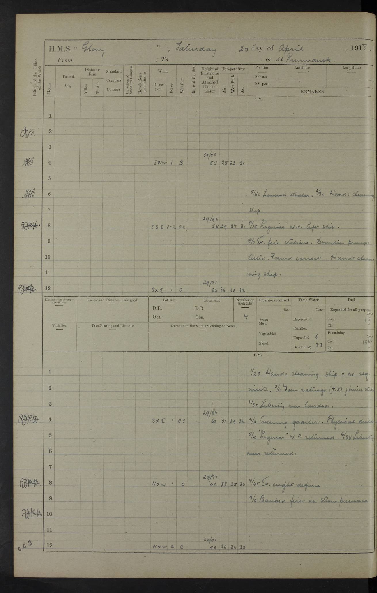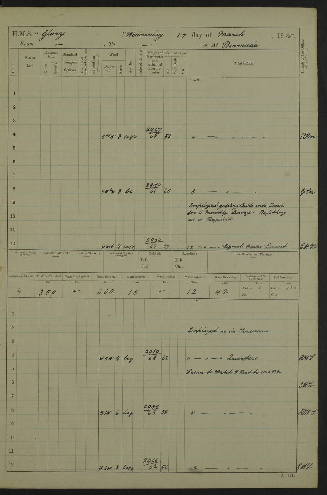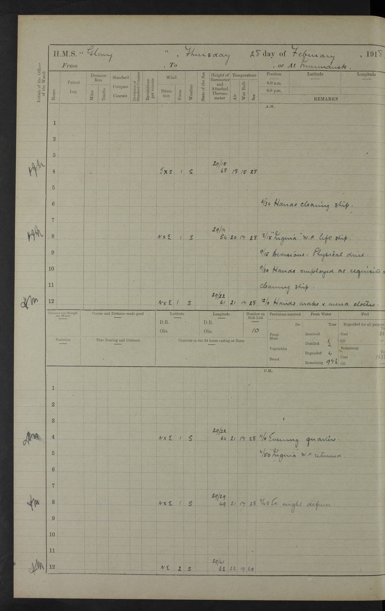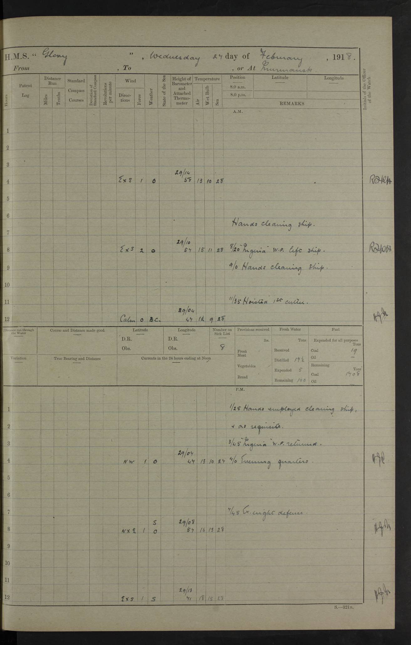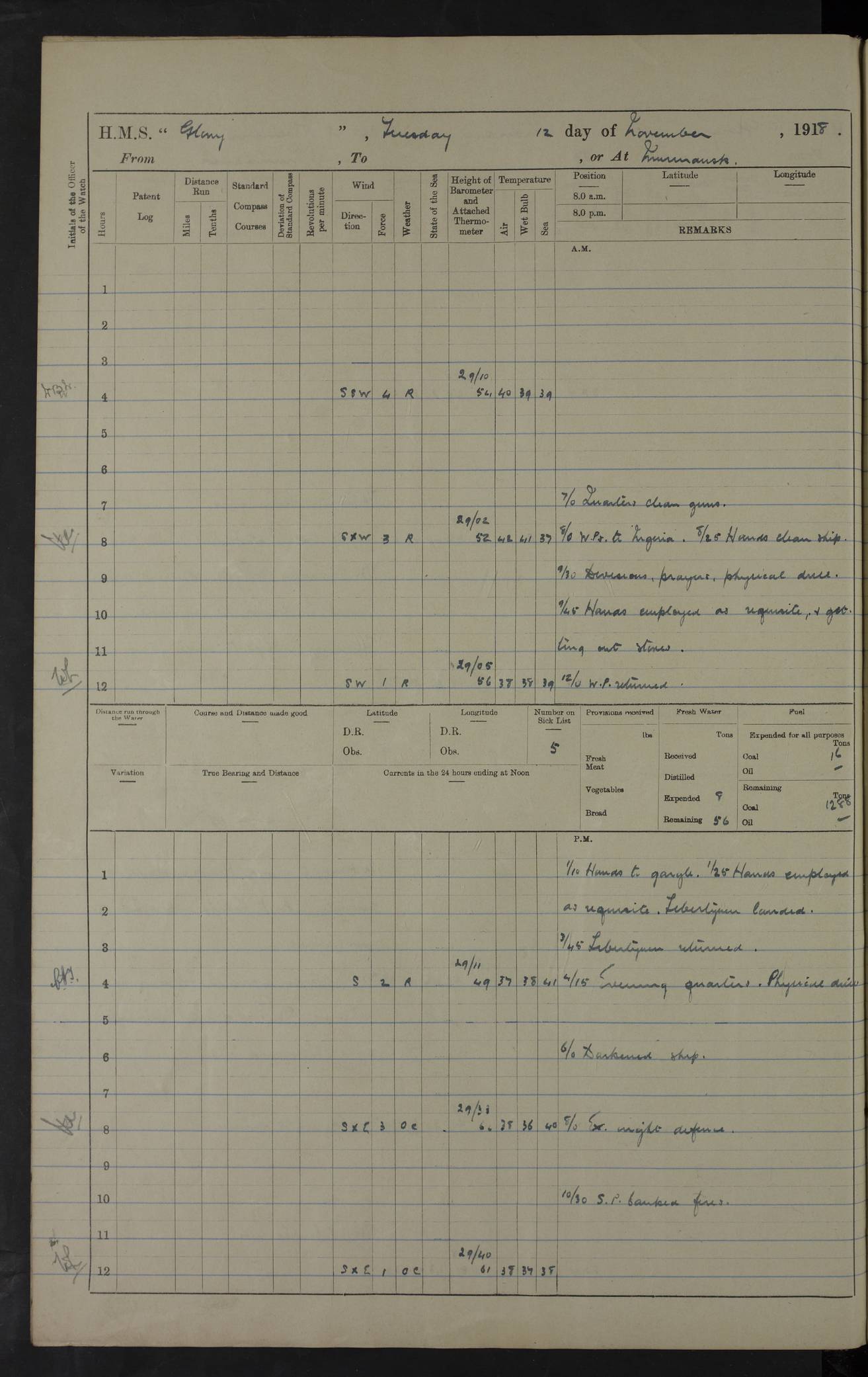 22 June 1915 At sea, Gibraltar to Lemnos Lat 36.1, Long -1.3 4.15am: Sighted land on starboard bow. 10.20am: Stopped port engine for repairs. 11.20am: proceeded with port engine. pm: a/c due to change in deviation. 10.00pm: Cape Tenez Light abeam, 18 miles. 4f73cd61a2fc8ea9030015f6: (https://s3.amazonaws.com:443/oldweather/ADM53-43015/0012_1.jpg) 23 June 1915 At sea, Gibraltar to Lemnos Lat 37.5, Long 4.8 Number on sick list: 4 5.00am: Secured from night defence stations. Placed anti-submarine guns. pm: Life saving appliances served out to men stationed in ? ?at abandon ship. 4f73cd61a2fc8ea9030015f7: (https://s3.amazonaws.com:443/oldweather/ADM53-43015/0013_0.jpg) 24 June 1915 At sea, Gibraltar to Lemnos Lat 37.4, Long 10.8 Position in log clearly bears no resemblance to the location of the ship. Position above is approximate and is based sighting of Zembra Island at 11.55am. 5.00am: Dispersed from night defence stations. Manned anti-submarine guns. am: Sighted two French torpedo boats. am: Torpedo boats passed to ~ No 362, 363. am: Sighted land on starboard beam. 11.55am: Zembra Island abeam, 25 miles. 2.00pm: Sighted Pantellaria S34ºE. 4.45pm: Pantellaria Light House abeam 12 miles. 4f73cd61a2fc8ea9030015f8: (https://s3.amazonaws.com:443/oldweather/ADM53-43015/0013_1.jpg) 25 June 1915 At sea, Gibraltar to Lemnos Lat 35.5, Long 16.7 2.10am: Gozo Light abeam 17 miles. 5.00am: Dispersed from night defence stations. Manned anti-submarine guns. 4f73cd61a2fc8ea9030015f9: (https://s3.amazonaws.com:443/oldweather/ADM53-43015/0014_0.jpg) 26 June 1915 At sea, Gibraltar to Lemnos Lat 35.5, Long 22.6 Number on sick list: 5 5.00am: Dispersed from night defence stations. Manned anti-submarine guns. am: Aired night clothing. am: marines at maxim practice on quarter deck. 2.00pm: Observed land on either bow. 3.00pm: Sighted French patrol destroyer. 4.15pm: Sighted French patrol destroyer. 9.40pm: Milo Peak N63ºW. 10.26pm: Polino Light abeam to port 5.5 miles. 4f73cd62a2fc8ea9030015fa: (https://s3.amazonaws.com:443/oldweather/ADM53-43015/0014_1.jpg) 27 June 1915 At sea and at Lemnos Lat 39.1, Long 24.4 From 0.50 to 3.05am sighting of multiple light houses. 3.50am: a/c to N39ºW and commenced to zig-zag. 5.00am: Dispersed from night defence stations and placed anti-submarine guns and look-outs. am: Lost overboard by accident Hazlewood fender, pat. 311, one in number. 10.30am: Held Divine Service onboard. pm: Met and signalled HMS Minerva on patrol duty. pm: Courses and speeds as requisite while waiting orders to approach Mudros. 3.00pm: Proceeded. 5.16pm: Increased to 90 revs, commenced to zig-zag. Course as requisite for Mudros. 7.00pm: Entered Mudros Bay. 7.47pm: Stopped. Let go port anchor in ‘M3’. 8.30pm: Darkened ship. pm: Manned one 6” and one 12 pdr. 4f73cd62a2fc8ea9030015fb: (https://s3.amazonaws.com:443/oldweather/ADM53-43015/0015_0.jpg) 28 June 1915 Mudros Bay, Lemnos Lat 39.89, Long 25.24 5,00am: HMS Vengeance entered harbour. HMS Vengeance was a pre-dreadnought of the Canopus class, launched in 1899 at Vickers, Barrow, and sold for scrapping in 1921. Details at http://en.wikipedia.org/wiki/HMS_Vengeance_(1899) . am/pm/: hands preparing for coaling and about ship’s work. pm: Collier Wabana secured alongside. 4f73cd62a2fc8ea9030015fc: (https://s3.amazonaws.com:443/oldweather/ADM53-43015/0015_1.jpg) 29 June 1915 Mudros Bay, Lemnos Lat 39.89, Long 25.24 5.15am: Commenced coaling. 2.00pm: Finished coaling. Collier left. 4f73cd62a2fc8ea9030015fd: (https://s3.amazonaws.com:443/oldweather/ADM53-43015/0016_0.jpg) 30 June 1915 Mudros Bay, Lemnos Lat 39.89, Long 25.24 am: Parties away sanding, and with fire engines onshore. am: Boats away disembarking troops. am: French Flagship Patrie sailed. The Patrie was a French pre-dreadnought, launched at La Seyne shipyard in 1903, and stricken in 1921. Details at http://en.wikipedia.org/wiki/French_battleship_Patrie . 6.30pm: Hands to bathe. 4f73cd63a2fc8ea9030015fe: (https://s3.amazonaws.com:443/oldweather/ADM53-43015/0016_1.jpg) 4f73cd63a2fc8ea9030015ff: (https://s3.amazonaws.com:443/oldweather/ADM53-43015/0017_0.jpg) 4f73cd63a2fc8ea903001600: (https://s3.amazonaws.com:443/oldweather/ADM53-43015/0017_1.jpg) 4f73cd63a2fc8ea903001601: (https://s3.amazonaws.com:443/oldweather/ADM53-43015/0018_0.jpg) 4f73cd64a2fc8ea903001602: (https://s3.amazonaws.com:443/oldweather/ADM53-43015/0018_1.jpg) LOGS FOR JULY 1915 From July to October 1915, HMS Glory spent her time at Port Mudros. Certain activities typically took place daily and are not generally noted in the pages below. These activities include: Lighting fires in the picket boat around 4am and drawing the fires in the late evening; Divisions at around 9–9.30am and Evening Quarters at 4pm; Darken ship at around 8.30pm; Daily ‘cleaning ship’, with variations thereof; SBC (for ‘Signal Books Correct’) at the watch changes. 4f73cd64a2fc8ea903001603: (https://s3.amazonaws.com:443/oldweather/ADM53-43016/0000_0.jpg) 4f73cd64a2fc8ea903001604: (https://s3.amazonaws.com:443/oldweather/ADM53-43016/0000_1.jpg) 4f73cd65a2fc8ea903001605: (https://s3.amazonaws.com:443/oldweather/ADM53-43016/0001_0.jpg) 4f73cd65a2fc8ea903001606: (https://s3.amazonaws.com:443/oldweather/ADM53-43016/0001_1.jpg) 1 July 1915 Port Mudros Lat 39.89, Long 25.24 6.30am: Landed working parties preparing boom defence ships. am: Discharged Acting Commander Rayne to Hector. Hector was a kite balloon ship. No further details readily available. 5.00pm: Tug T.10 made fast astern. 7.15pm: HMS Venerable went out. 7.30pm: HMS Chatham went out. HMS Chatham was a ‘Town’ cruiser and lead ship of her class. She was launched in 1911 at Chatham Dockyard and sold in 1926. Details at http://en.wikipedia.org/wiki/HMS_Chatham_(1911) . 4f73cd65a2fc8ea903001607: (https://s3.amazonaws.com:443/oldweather/ADM53-43016/0002_0.jpg) 2 July 1915 Port Mudros Lat 39.89, Long 25.24 5.35am: Landed working parties preparing boom defence ships. am/pm: Boom defence par