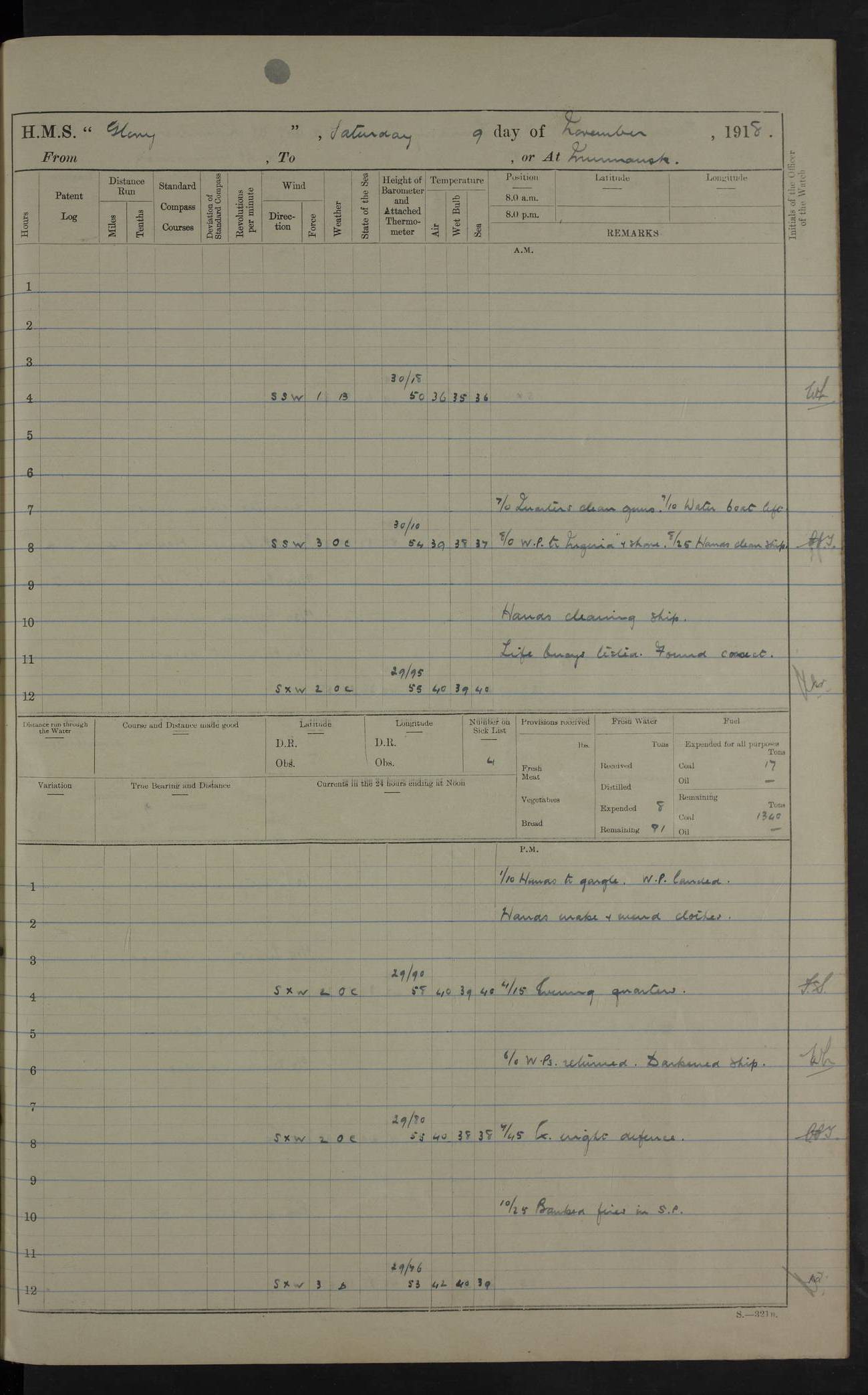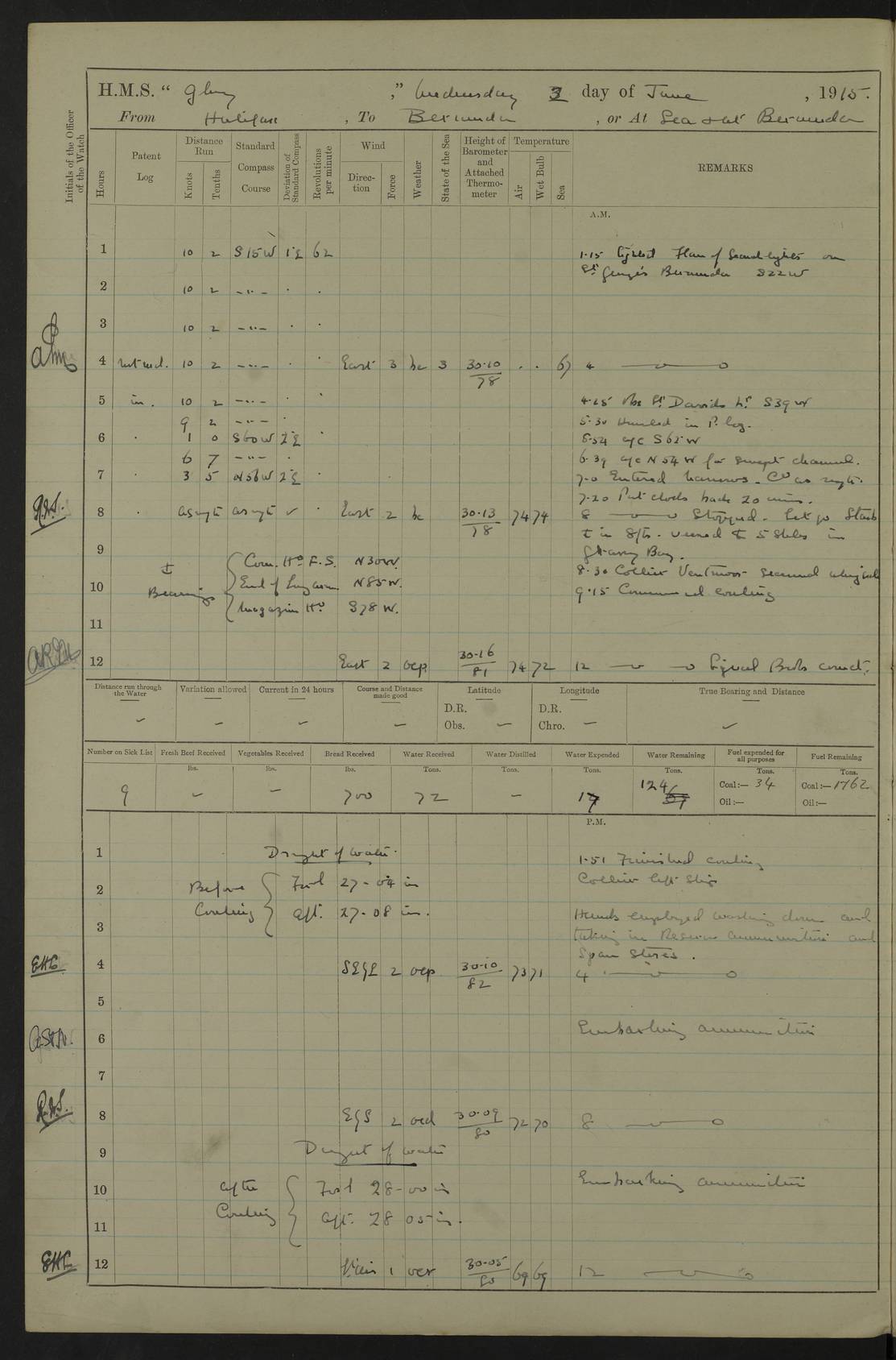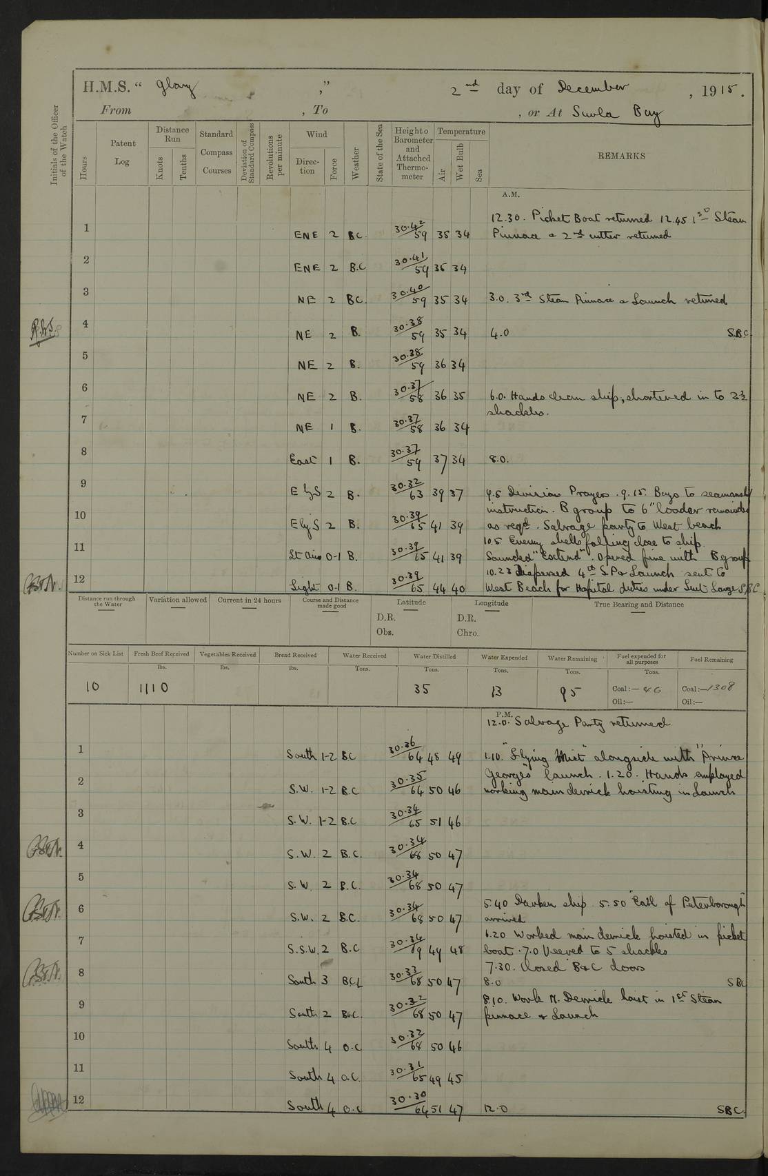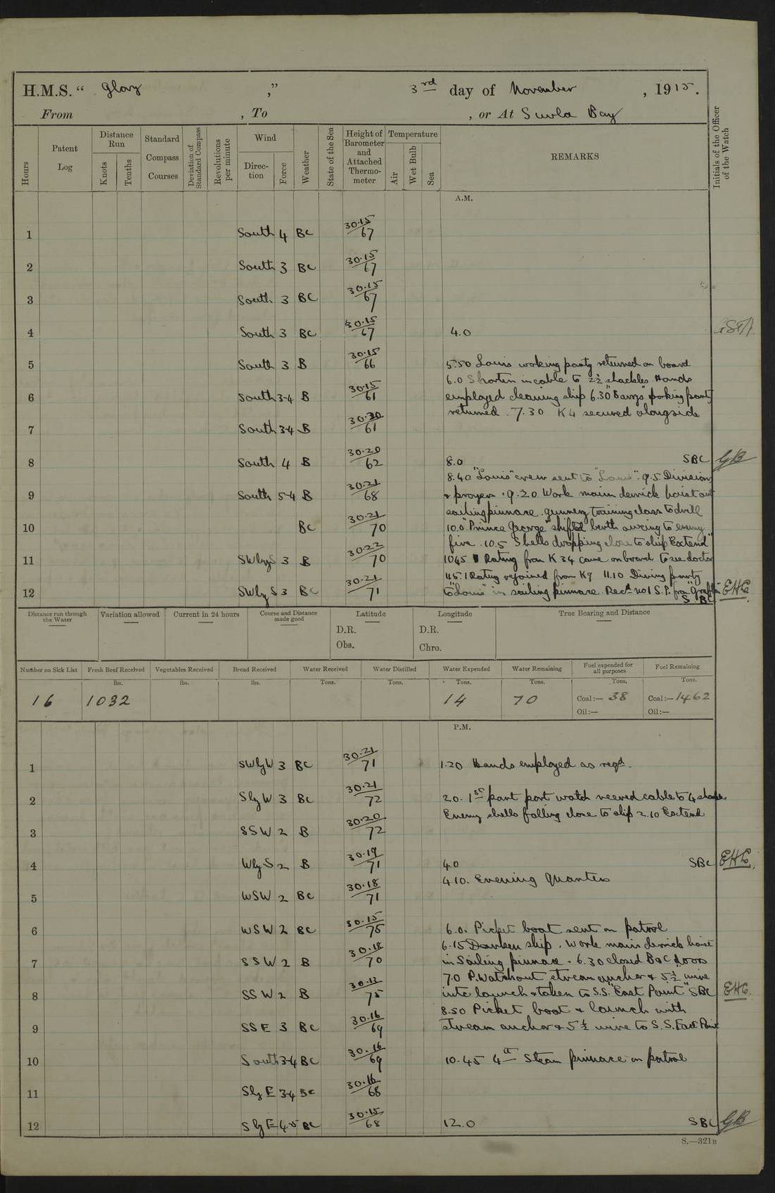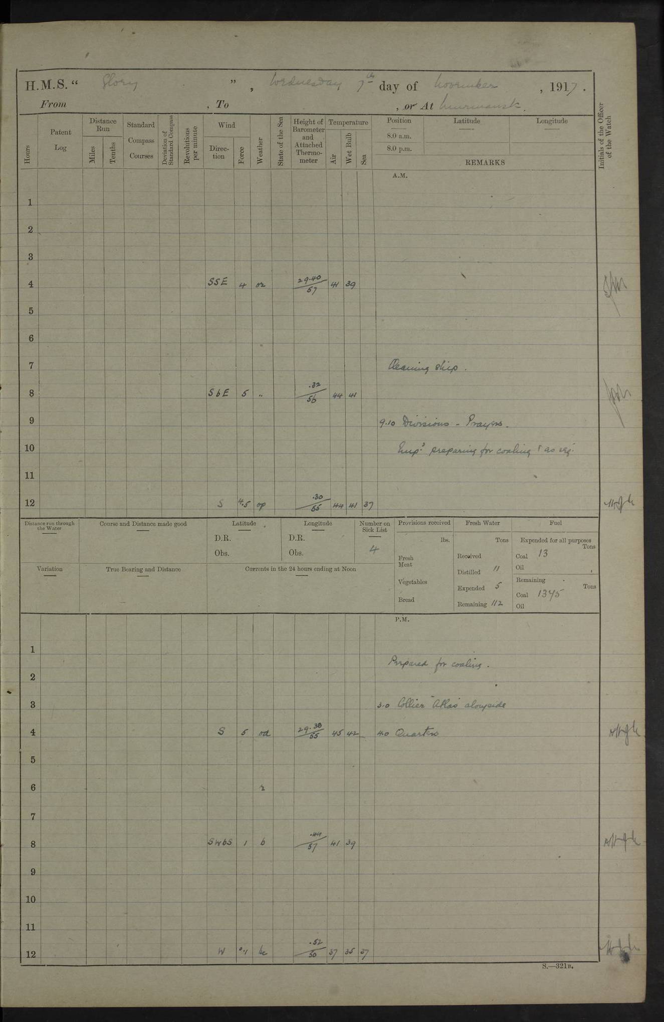 22 June 1915 At sea, Gibraltar to Lemnos Lat 36.1, Long -1.3 4.15am: Sighted land on starboard bow. 10.20am: Stopped port engine for repairs. 11.20am: proceeded with port engine. pm: a/c due to change in deviation. 10.00pm: Cape Tenez Light abeam, 18 miles. 4f73cd61a2fc8ea9030015f6: (https://s3.amazonaws.com:443/oldweather/ADM53-43015/0012_1.jpg) 23 June 1915 At sea, Gibraltar to Lemnos Lat 37.5, Long 4.8 Number on sick list: 4 5.00am: Secured from night defence stations. Placed anti-submarine guns. pm: Life saving appliances served out to men stationed in ? ?at abandon ship. 4f73cd61a2fc8ea9030015f7: (https://s3.amazonaws.com:443/oldweather/ADM53-43015/0013_0.jpg) 24 June 1915 At sea, Gibraltar to Lemnos Lat 37.4, Long 10.8 Position in log clearly bears no resemblance to the location of the ship. Position above is approximate and is based sighting of Zembra Island at 11.55am. 5.00am: Dispersed from night defence stations. Manned anti-submarine guns. am: Sighted two French torpedo boats. am: Torpedo boats passed to ~ No 362, 363. am: Sighted land on starboard beam. 11.55am: Zembra Island abeam, 25 miles. 2.00pm: Sighted Pantellaria S34ºE. 4.45pm: Pantellaria Light House abeam 12 miles. 4f73cd61a2fc8ea9030015f8: (https://s3.amazonaws.com:443/oldweather/ADM53-43015/0013_1.jpg) 25 June 1915 At sea, Gibraltar to Lemnos Lat 35.5, Long 16.7 2.10am: Gozo Light abeam 17 miles. 5.00am: Dispersed from night defence stations. Manned anti-submarine guns. 4f73cd61a2fc8ea9030015f9: (https://s3.amazonaws.com:443/oldweather/ADM53-43015/0014_0.jpg) 26 June 1915 At sea, Gibraltar to Lemnos Lat 35.5, Long 22.6 Number on sick list: 5 5.00am: Dispersed from night defence stations. Manned anti-submarine guns. am: Aired night clothing. am: marines at maxim practice on quarter deck. 2.00pm: Observed land on either bow. 3.00pm: Sighted French patrol destroyer. 4.15pm: Sighted French patrol destroyer. 9.40pm: Milo Peak N63ºW. 10.26pm: Polino Light abeam to port 5.5 miles. 4f73cd62a2fc8ea9030015fa: (https://s3.amazonaws.com:443/oldweather/ADM53-43015/0014_1.jpg) 27 June 1915 At sea and at Lemnos Lat 39.1, Long 24.4 From 0.50 to 3.05am sighting of multiple light houses. 3.50am: a/c to N39ºW and commenced to zig-zag. 5.00am: Dispersed from night defence stations and placed anti-submarine guns and look-outs. am: Lost overboard by accident Hazlewood fender, pat. 311, one in number. 10.30am: Held Divine Service onboard. pm: Met and signalled HMS Minerva on patrol duty. pm: Courses and speeds as requisite while waiting orders to approach Mudros. 3.00pm: Proceeded. 5.16pm: Increased to 90 revs, commenced to zig-zag. Course as requisite for Mudros. 7.00pm: Entered Mudros Bay. 7.47pm: Stopped. Let go port anchor in ‘M3’. 8.30pm: Darkened ship. pm: Manned one 6” and one 12 pdr. 4f73cd62a2fc8ea9030015fb: (https://s3.amazonaws.com:443/oldweather/ADM53-43015/0015_0.jpg) 28 June 1915 Mudros Bay, Lemnos Lat 39.89, Long 25.24 5,00am: HMS Vengeance entered harbour. HMS Vengeance was a pre-dreadnought of the Canopus class, launched in 1899 at Vickers, Barrow, and sold for scrapping in 1921. Details at http://en.wikipedia.org/wiki/HMS_Vengeance_(1899) . am/pm/: hands preparing for coaling and about ship’s work. pm: Collier Wabana secured alongside. 4f73cd62a2fc8ea9030015fc: (https://s3.amazonaws.com:443/oldweather/ADM53-43015/0015_1.jpg) 29 June 1915 Mudros Bay, Lemnos Lat 39.89, Long 25.24 5.15am: Commenced coaling. 2.00pm: Finished coaling. Collier left. 4f73cd62a2fc8ea9030015fd: (https://s3.amazonaws.com:443/oldweather/ADM53-43015/0016_0.jpg) 30 June 1915 Mudros Bay, Lemnos Lat 39.89, Long 25.24 am: Parties away sanding, and with fire engines onshore. am: Boats away disembarking troops. am: French Flagship Patrie sailed. The Patrie was a French pre-dreadnought, launched at La Seyne shipyard in 1903, and stricken in 1921. Details at http://en.wikipedia.org/wiki/French_battleship_Patrie . 6.30pm: Hands to bathe. 4f73cd63a2fc8ea9030015fe: (https://s3.amazonaws.com:443/oldweather/ADM53-43015/0016_1.jpg) 4f73cd63a2fc8ea9030015ff: (https://s3.amazonaws.com:443/oldweather/ADM53-43015/0017_0.jpg) 4f73cd63a2fc8ea903001600: (https://s3.amazonaws.com:443/oldweather/ADM53-43015/0017_1.jpg) 4f73cd63a2fc8ea903001601: (https://s3.amazonaws.com:443/oldweather/ADM53-43015/0018_0.jpg) 4f73cd64a2fc8ea903001602: (https://s3.amazonaws.com:443/oldweather/ADM53-43015/0018_1.jpg) LOGS FOR JULY 1915 From July to October 1915, HMS Glory spent her time at Port Mudros. Certain activities typically took place daily and are not generally noted in the pages below. These activities include: Lighting fires in the picket boat around 4am and drawing the fires in the late evening; Divisions at around 9–9.30am and Evening Quarters at 4pm; Darken ship at around 8.30pm; Daily ‘cleaning ship’, with variations thereof; SBC (for ‘Signal Books Correct’) at the watch changes. 4f73cd64a2fc8ea903001603: (https://s3.amazonaws.com:443/oldweather/ADM53-43016/0000_0.jpg) 4f73cd64a2fc8ea903001604: (https://s3.amazonaws.com:443/oldweather/ADM53-43016/0000_1.jpg) 4f73cd65a2fc8ea903001605: (https://s3.amazonaws.com:443/oldweather/ADM53-43016/0001_0.jpg) 4f73cd65a2fc8ea903001606: (https://s3.amazonaws.com:443/oldweather/ADM53-43016/0001_1.jpg) 1 July 1915 Port Mudros Lat 39.89, Long 25.24 6.30am: Landed working parties preparing boom defence ships. am: Discharged Acting Commander Rayne to Hector. Hector was a kite balloon ship. No further details readily available. 5.00pm: Tug T.10 made fast astern. 7.15pm: HMS Venerable went out. 7.30pm: HMS Chatham went out. HMS Chatham was a ‘Town’ cruiser and lead ship of her class. She was launched in 1911 at Chatham Dockyard and sold in 1926. Details at http://en.wikipedia.org/wiki/HMS_Chatham_(1911) . 4f73cd65a2fc8ea903001607: (https://s3.amazonaws.com:443/oldweather/ADM53-43016/0002_0.jpg) 2 July 1915 Port Mudros Lat 39.89, Long 25.24 5.35am: Landed working parties preparing boom defence ships. am/pm: Boom defence par