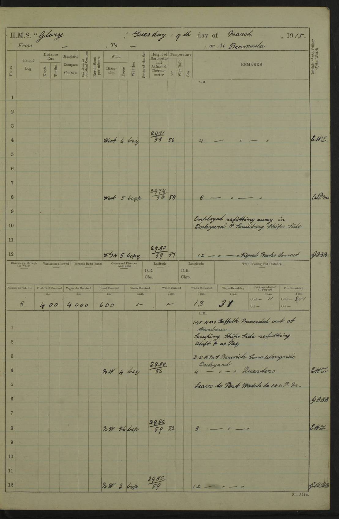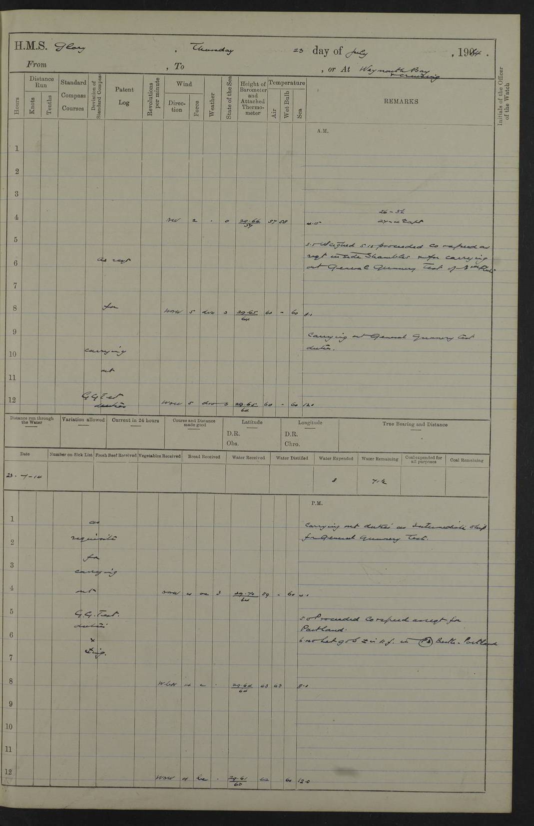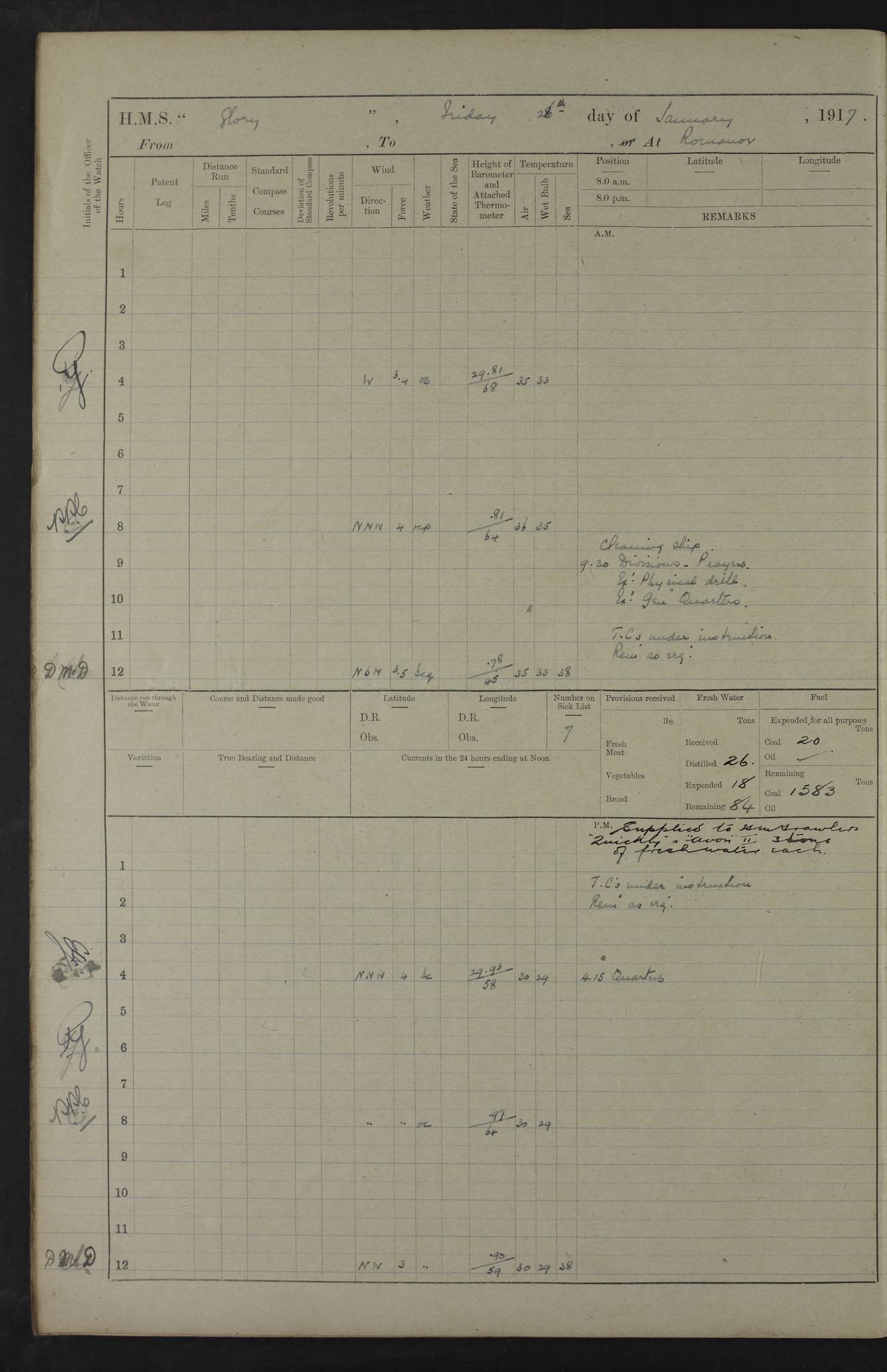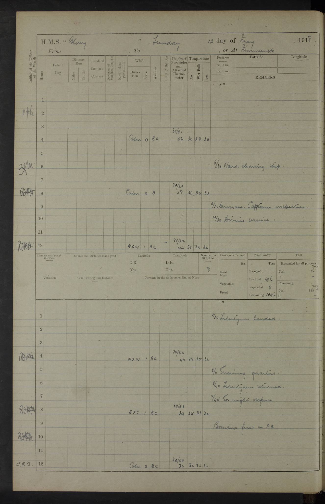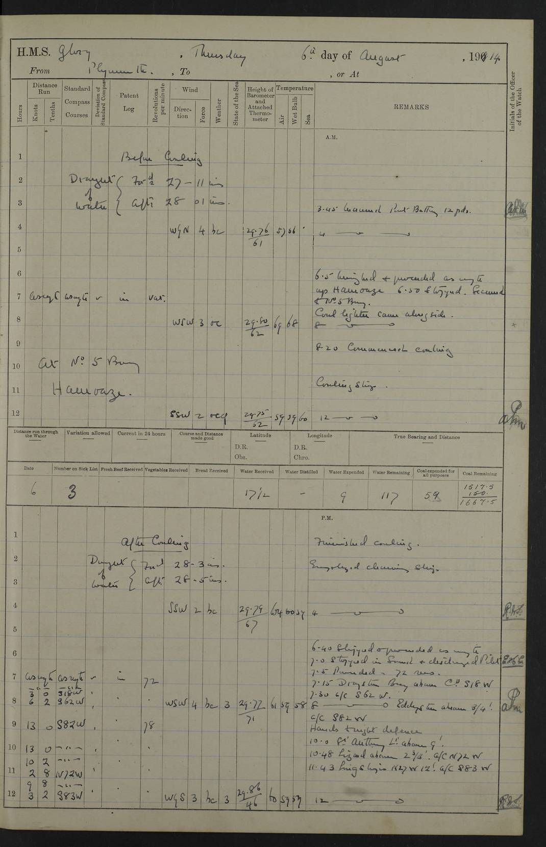 22 June 1915 At sea, Gibraltar to Lemnos Lat 36.1, Long -1.3 4.15am: Sighted land on starboard bow. 10.20am: Stopped port engine for repairs. 11.20am: proceeded with port engine. pm: a/c due to change in deviation. 10.00pm: Cape Tenez Light abeam, 18 miles. 4f73cd61a2fc8ea9030015f6: (https://s3.amazonaws.com:443/oldweather/ADM53-43015/0012_1.jpg) 23 June 1915 At sea, Gibraltar to Lemnos Lat 37.5, Long 4.8 Number on sick list: 4 5.00am: Secured from night defence stations. Placed anti-submarine guns. pm: Life saving appliances served out to men stationed in ? ?at abandon ship. 4f73cd61a2fc8ea9030015f7: (https://s3.amazonaws.com:443/oldweather/ADM53-43015/0013_0.jpg) 24 June 1915 At sea, Gibraltar to Lemnos Lat 37.4, Long 10.8 Position in log clearly bears no resemblance to the location of the ship. Position above is approximate and is based sighting of Zembra Island at 11.55am. 5.00am: Dispersed from night defence stations. Manned anti-submarine guns. am: Sighted two French torpedo boats. am: Torpedo boats passed to ~ No 362, 363. am: Sighted land on starboard beam. 11.55am: Zembra Island abeam, 25 miles. 2.00pm: Sighted Pantellaria S34ºE. 4.45pm: Pantellaria Light House abeam 12 miles. 4f73cd61a2fc8ea9030015f8: (https://s3.amazonaws.com:443/oldweather/ADM53-43015/0013_1.jpg) 25 June 1915 At sea, Gibraltar to Lemnos Lat 35.5, Long 16.7 2.10am: Gozo Light abeam 17 miles. 5.00am: Dispersed from night defence stations. Manned anti-submarine guns. 4f73cd61a2fc8ea9030015f9: (https://s3.amazonaws.com:443/oldweather/ADM53-43015/0014_0.jpg) 26 June 1915 At sea, Gibraltar to Lemnos Lat 35.5, Long 22.6 Number on sick list: 5 5.00am: Dispersed from night defence stations. Manned anti-submarine guns. am: Aired night clothing. am: marines at maxim practice on quarter deck. 2.00pm: Observed land on either bow. 3.00pm: Sighted French patrol destroyer. 4.15pm: Sighted French patrol destroyer. 9.40pm: Milo Peak N63ºW. 10.26pm: Polino Light abeam to port 5.5 miles. 4f73cd62a2fc8ea9030015fa: (https://s3.amazonaws.com:443/oldweather/ADM53-43015/0014_1.jpg) 27 June 1915 At sea and at Lemnos Lat 39.1, Long 24.4 From 0.50 to 3.05am sighting of multiple light houses. 3.50am: a/c to N39ºW and commenced to zig-zag. 5.00am: Dispersed from night defence stations and placed anti-submarine guns and look-outs. am: Lost overboard by accident Hazlewood fender, pat. 311, one in number. 10.30am: Held Divine Service onboard. pm: Met and signalled HMS Minerva on patrol duty. pm: Courses and speeds as requisite while waiting orders to approach Mudros. 3.00pm: Proceeded. 5.16pm: Increased to 90 revs, commenced to zig-zag. Course as requisite for Mudros. 7.00pm: Entered Mudros Bay. 7.47pm: Stopped. Let go port anchor in ‘M3’. 8.30pm: Darkened ship. pm: Manned one 6” and one 12 pdr. 4f73cd62a2fc8ea9030015fb: (https://s3.amazonaws.com:443/oldweather/ADM53-43015/0015_0.jpg) 28 June 1915 Mudros Bay, Lemnos Lat 39.89, Long 25.24 5,00am: HMS Vengeance entered harbour. HMS Vengeance was a pre-dreadnought of the Canopus class, launched in 1899 at Vickers, Barrow, and sold for scrapping in 1921. Details at http://en.wikipedia.org/wiki/HMS_Vengeance_(1899) . am/pm/: hands preparing for coaling and about ship’s work. pm: Collier Wabana secured alongside. 4f73cd62a2fc8ea9030015fc: (https://s3.amazonaws.com:443/oldweather/ADM53-43015/0015_1.jpg) 29 June 1915 Mudros Bay, Lemnos Lat 39.89, Long 25.24 5.15am: Commenced coaling. 2.00pm: Finished coaling. Collier left. 4f73cd62a2fc8ea9030015fd: (https://s3.amazonaws.com:443/oldweather/ADM53-43015/0016_0.jpg) 30 June 1915 Mudros Bay, Lemnos Lat 39.89, Long 25.24 am: Parties away sanding, and with fire engines onshore. am: Boats away disembarking troops. am: French Flagship Patrie sailed. The Patrie was a French pre-dreadnought, launched at La Seyne shipyard in 1903, and stricken in 1921. Details at http://en.wikipedia.org/wiki/French_battleship_Patrie . 6.30pm: Hands to bathe. 4f73cd63a2fc8ea9030015fe: (https://s3.amazonaws.com:443/oldweather/ADM53-43015/0016_1.jpg) 4f73cd63a2fc8ea9030015ff: (https://s3.amazonaws.com:443/oldweather/ADM53-43015/0017_0.jpg) 4f73cd63a2fc8ea903001600: (https://s3.amazonaws.com:443/oldweather/ADM53-43015/0017_1.jpg) 4f73cd63a2fc8ea903001601: (https://s3.amazonaws.com:443/oldweather/ADM53-43015/0018_0.jpg) 4f73cd64a2fc8ea903001602: (https://s3.amazonaws.com:443/oldweather/ADM53-43015/0018_1.jpg) LOGS FOR JULY 1915 From July to October 1915, HMS Glory spent her time at Port Mudros. Certain activities typically took place daily and are not generally noted in the pages below. These activities include: Lighting fires in the picket boat around 4am and drawing the fires in the late evening; Divisions at around 9–9.30am and Evening Quarters at 4pm; Darken ship at around 8.30pm; Daily ‘cleaning ship’, with variations thereof; SBC (for ‘Signal Books Correct’) at the watch changes. 4f73cd64a2fc8ea903001603: (https://s3.amazonaws.com:443/oldweather/ADM53-43016/0000_0.jpg) 4f73cd64a2fc8ea903001604: (https://s3.amazonaws.com:443/oldweather/ADM53-43016/0000_1.jpg) 4f73cd65a2fc8ea903001605: (https://s3.amazonaws.com:443/oldweather/ADM53-43016/0001_0.jpg) 4f73cd65a2fc8ea903001606: (https://s3.amazonaws.com:443/oldweather/ADM53-43016/0001_1.jpg) 1 July 1915 Port Mudros Lat 39.89, Long 25.24 6.30am: Landed working parties preparing boom defence ships. am: Discharged Acting Commander Rayne to Hector. Hector was a kite balloon ship. No further details readily available. 5.00pm: Tug T.10 made fast astern. 7.15pm: HMS Venerable went out. 7.30pm: HMS Chatham went out. HMS Chatham was a ‘Town’ cruiser and lead ship of her class. She was launched in 1911 at Chatham Dockyard and sold in 1926. Details at http://en.wikipedia.org/wiki/HMS_Chatham_(1911) . 4f73cd65a2fc8ea903001607: (https://s3.amazonaws.com:443/oldweather/ADM53-43016/0002_0.jpg) 2 July 1915 Port Mudros Lat 39.89, Long 25.24 5.35am: Landed working parties preparing boom defence ships. am/pm: Boom defence par