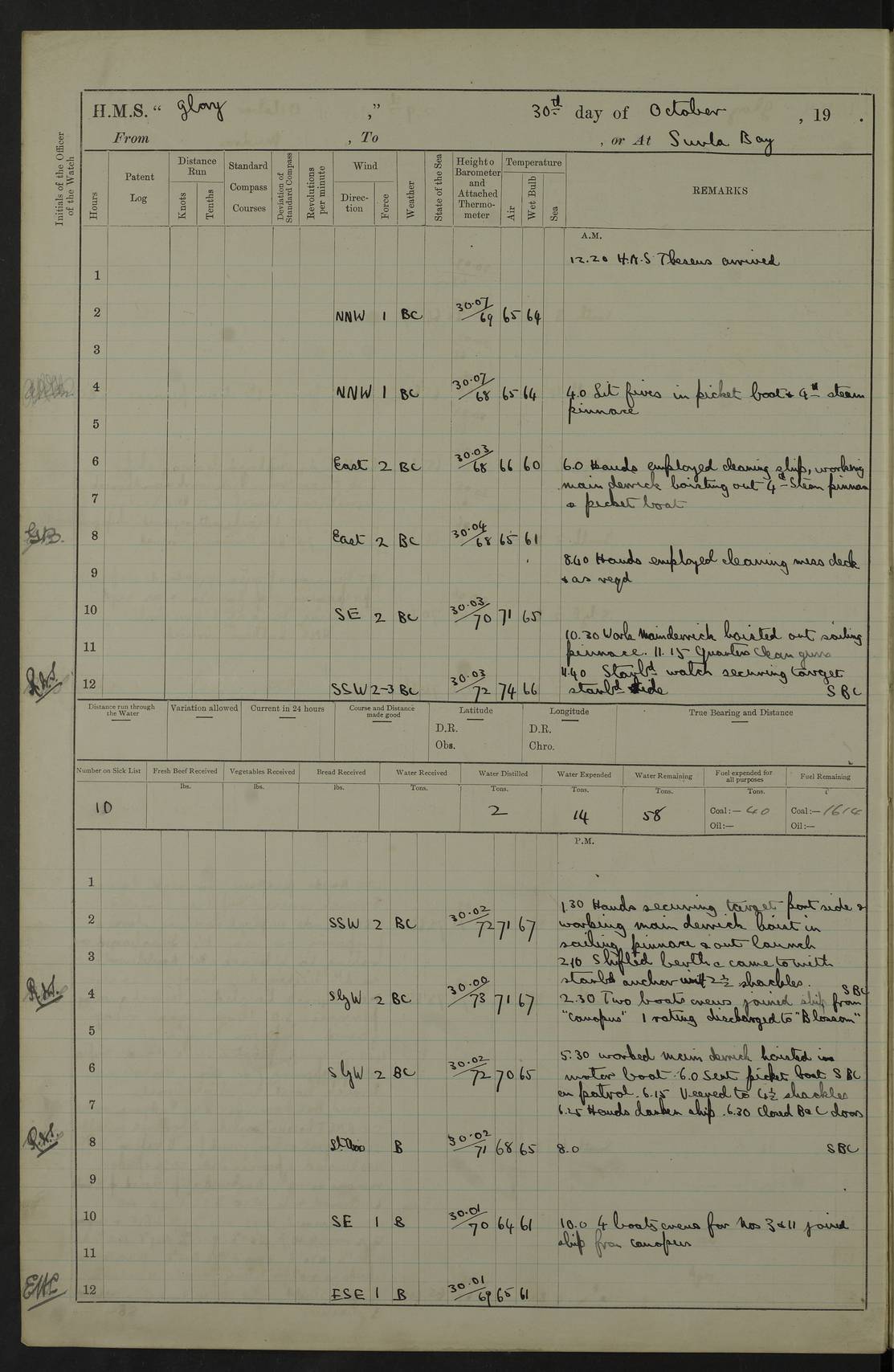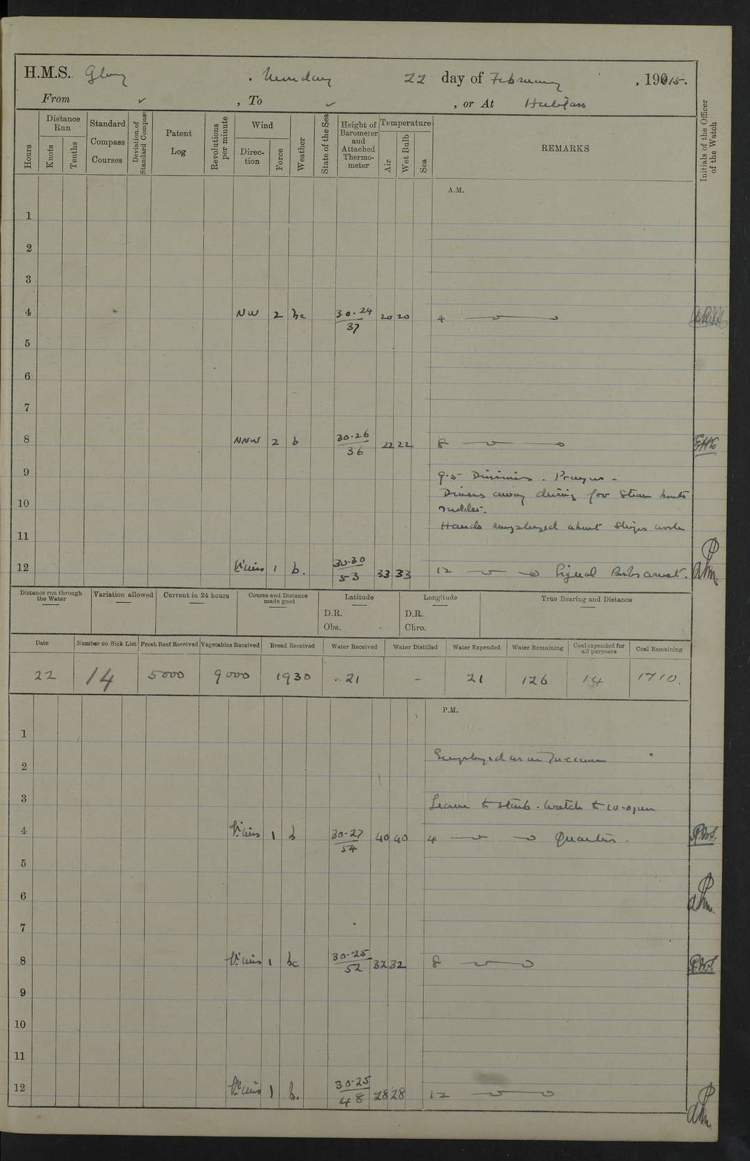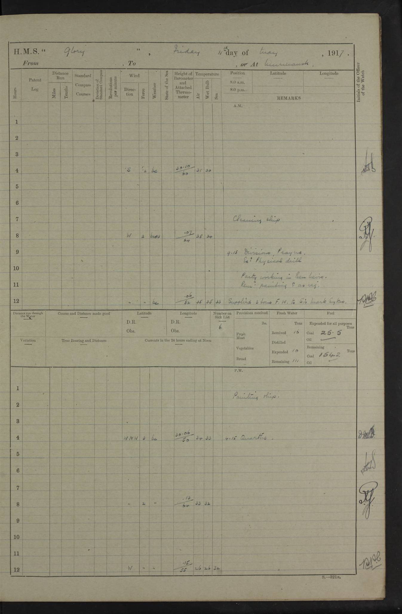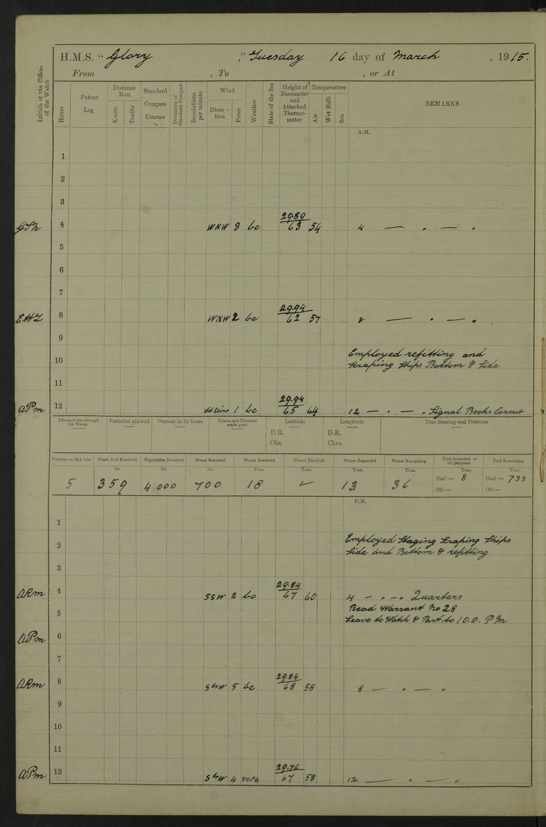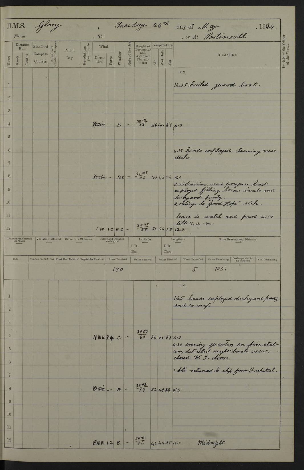 22 June 1915 At sea, Gibraltar to Lemnos Lat 36.1, Long -1.3 4.15am: Sighted land on starboard bow. 10.20am: Stopped port engine for repairs. 11.20am: proceeded with port engine. pm: a/c due to change in deviation. 10.00pm: Cape Tenez Light abeam, 18 miles. 4f73cd61a2fc8ea9030015f6: (https://s3.amazonaws.com:443/oldweather/ADM53-43015/0012_1.jpg) 23 June 1915 At sea, Gibraltar to Lemnos Lat 37.5, Long 4.8 Number on sick list: 4 5.00am: Secured from night defence stations. Placed anti-submarine guns. pm: Life saving appliances served out to men stationed in ? ?at abandon ship. 4f73cd61a2fc8ea9030015f7: (https://s3.amazonaws.com:443/oldweather/ADM53-43015/0013_0.jpg) 24 June 1915 At sea, Gibraltar to Lemnos Lat 37.4, Long 10.8 Position in log clearly bears no resemblance to the location of the ship. Position above is approximate and is based sighting of Zembra Island at 11.55am. 5.00am: Dispersed from night defence stations. Manned anti-submarine guns. am: Sighted two French torpedo boats. am: Torpedo boats passed to ~ No 362, 363. am: Sighted land on starboard beam. 11.55am: Zembra Island abeam, 25 miles. 2.00pm: Sighted Pantellaria S34ºE. 4.45pm: Pantellaria Light House abeam 12 miles. 4f73cd61a2fc8ea9030015f8: (https://s3.amazonaws.com:443/oldweather/ADM53-43015/0013_1.jpg) 25 June 1915 At sea, Gibraltar to Lemnos Lat 35.5, Long 16.7 2.10am: Gozo Light abeam 17 miles. 5.00am: Dispersed from night defence stations. Manned anti-submarine guns. 4f73cd61a2fc8ea9030015f9: (https://s3.amazonaws.com:443/oldweather/ADM53-43015/0014_0.jpg) 26 June 1915 At sea, Gibraltar to Lemnos Lat 35.5, Long 22.6 Number on sick list: 5 5.00am: Dispersed from night defence stations. Manned anti-submarine guns. am: Aired night clothing. am: marines at maxim practice on quarter deck. 2.00pm: Observed land on either bow. 3.00pm: Sighted French patrol destroyer. 4.15pm: Sighted French patrol destroyer. 9.40pm: Milo Peak N63ºW. 10.26pm: Polino Light abeam to port 5.5 miles. 4f73cd62a2fc8ea9030015fa: (https://s3.amazonaws.com:443/oldweather/ADM53-43015/0014_1.jpg) 27 June 1915 At sea and at Lemnos Lat 39.1, Long 24.4 From 0.50 to 3.05am sighting of multiple light houses. 3.50am: a/c to N39ºW and commenced to zig-zag. 5.00am: Dispersed from night defence stations and placed anti-submarine guns and look-outs. am: Lost overboard by accident Hazlewood fender, pat. 311, one in number. 10.30am: Held Divine Service onboard. pm: Met and signalled HMS Minerva on patrol duty. pm: Courses and speeds as requisite while waiting orders to approach Mudros. 3.00pm: Proceeded. 5.16pm: Increased to 90 revs, commenced to zig-zag. Course as requisite for Mudros. 7.00pm: Entered Mudros Bay. 7.47pm: Stopped. Let go port anchor in ‘M3’. 8.30pm: Darkened ship. pm: Manned one 6” and one 12 pdr. 4f73cd62a2fc8ea9030015fb: (https://s3.amazonaws.com:443/oldweather/ADM53-43015/0015_0.jpg) 28 June 1915 Mudros Bay, Lemnos Lat 39.89, Long 25.24 5,00am: HMS Vengeance entered harbour. HMS Vengeance was a pre-dreadnought of the Canopus class, launched in 1899 at Vickers, Barrow, and sold for scrapping in 1921. Details at http://en.wikipedia.org/wiki/HMS_Vengeance_(1899) . am/pm/: hands preparing for coaling and about ship’s work. pm: Collier Wabana secured alongside. 4f73cd62a2fc8ea9030015fc: (https://s3.amazonaws.com:443/oldweather/ADM53-43015/0015_1.jpg) 29 June 1915 Mudros Bay, Lemnos Lat 39.89, Long 25.24 5.15am: Commenced coaling. 2.00pm: Finished coaling. Collier left. 4f73cd62a2fc8ea9030015fd: (https://s3.amazonaws.com:443/oldweather/ADM53-43015/0016_0.jpg) 30 June 1915 Mudros Bay, Lemnos Lat 39.89, Long 25.24 am: Parties away sanding, and with fire engines onshore. am: Boats away disembarking troops. am: French Flagship Patrie sailed. The Patrie was a French pre-dreadnought, launched at La Seyne shipyard in 1903, and stricken in 1921. Details at http://en.wikipedia.org/wiki/French_battleship_Patrie . 6.30pm: Hands to bathe. 4f73cd63a2fc8ea9030015fe: (https://s3.amazonaws.com:443/oldweather/ADM53-43015/0016_1.jpg) 4f73cd63a2fc8ea9030015ff: (https://s3.amazonaws.com:443/oldweather/ADM53-43015/0017_0.jpg) 4f73cd63a2fc8ea903001600: (https://s3.amazonaws.com:443/oldweather/ADM53-43015/0017_1.jpg) 4f73cd63a2fc8ea903001601: (https://s3.amazonaws.com:443/oldweather/ADM53-43015/0018_0.jpg) 4f73cd64a2fc8ea903001602: (https://s3.amazonaws.com:443/oldweather/ADM53-43015/0018_1.jpg) LOGS FOR JULY 1915 From July to October 1915, HMS Glory spent her time at Port Mudros. Certain activities typically took place daily and are not generally noted in the pages below. These activities include: Lighting fires in the picket boat around 4am and drawing the fires in the late evening; Divisions at around 9–9.30am and Evening Quarters at 4pm; Darken ship at around 8.30pm; Daily ‘cleaning ship’, with variations thereof; SBC (for ‘Signal Books Correct’) at the watch changes. 4f73cd64a2fc8ea903001603: (https://s3.amazonaws.com:443/oldweather/ADM53-43016/0000_0.jpg) 4f73cd64a2fc8ea903001604: (https://s3.amazonaws.com:443/oldweather/ADM53-43016/0000_1.jpg) 4f73cd65a2fc8ea903001605: (https://s3.amazonaws.com:443/oldweather/ADM53-43016/0001_0.jpg) 4f73cd65a2fc8ea903001606: (https://s3.amazonaws.com:443/oldweather/ADM53-43016/0001_1.jpg) 1 July 1915 Port Mudros Lat 39.89, Long 25.24 6.30am: Landed working parties preparing boom defence ships. am: Discharged Acting Commander Rayne to Hector. Hector was a kite balloon ship. No further details readily available. 5.00pm: Tug T.10 made fast astern. 7.15pm: HMS Venerable went out. 7.30pm: HMS Chatham went out. HMS Chatham was a ‘Town’ cruiser and lead ship of her class. She was launched in 1911 at Chatham Dockyard and sold in 1926. Details at http://en.wikipedia.org/wiki/HMS_Chatham_(1911) . 4f73cd65a2fc8ea903001607: (https://s3.amazonaws.com:443/oldweather/ADM53-43016/0002_0.jpg) 2 July 1915 Port Mudros Lat 39.89, Long 25.24 5.35am: Landed working parties preparing boom defence ships. am/pm: Boom defence par