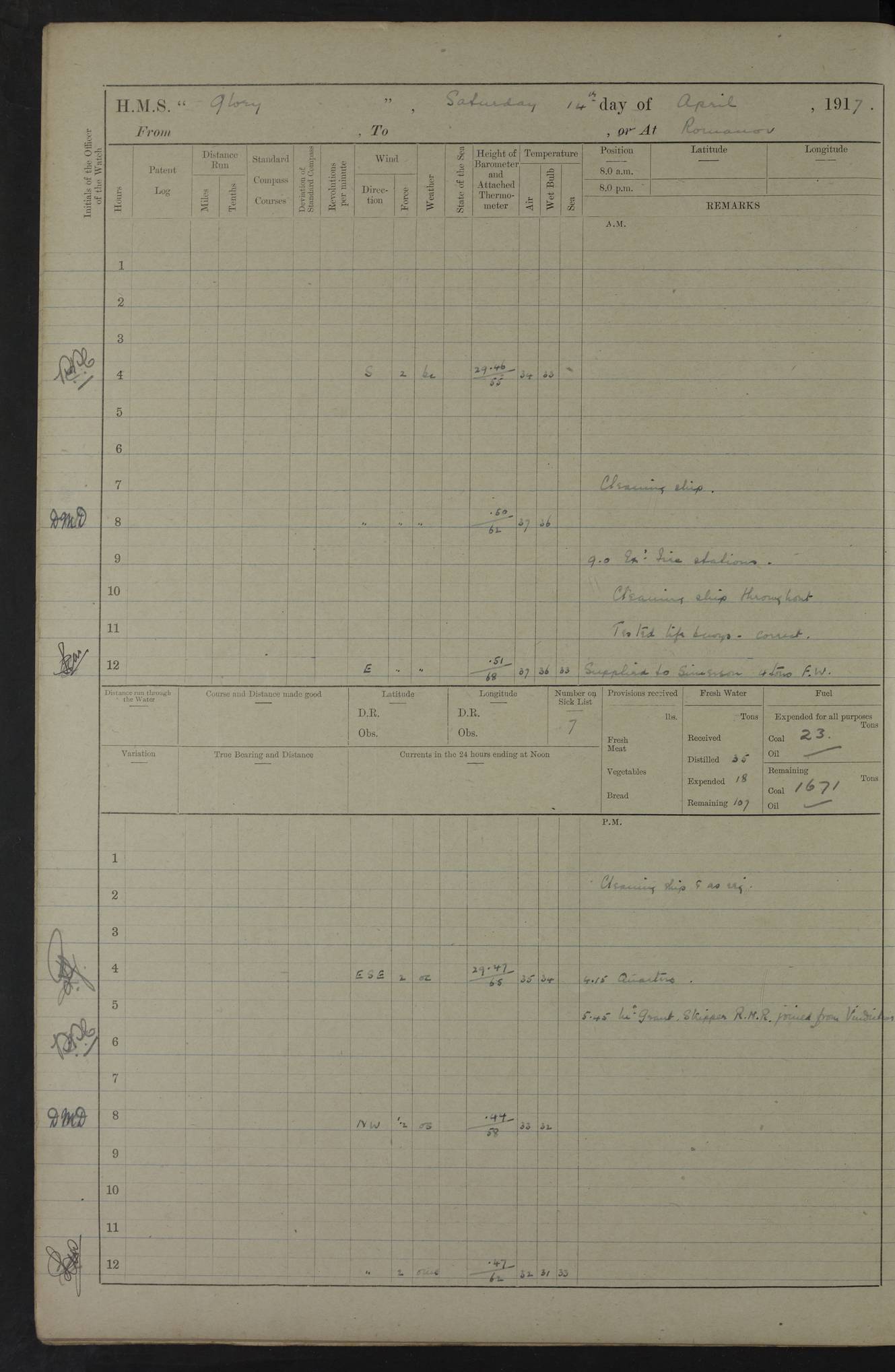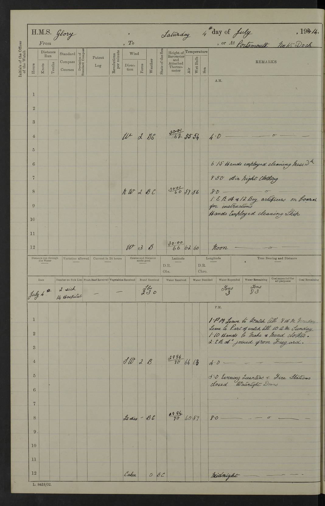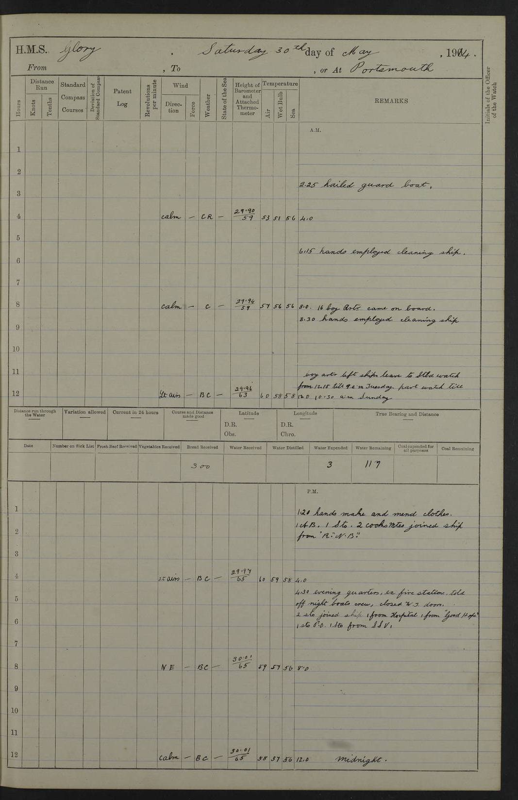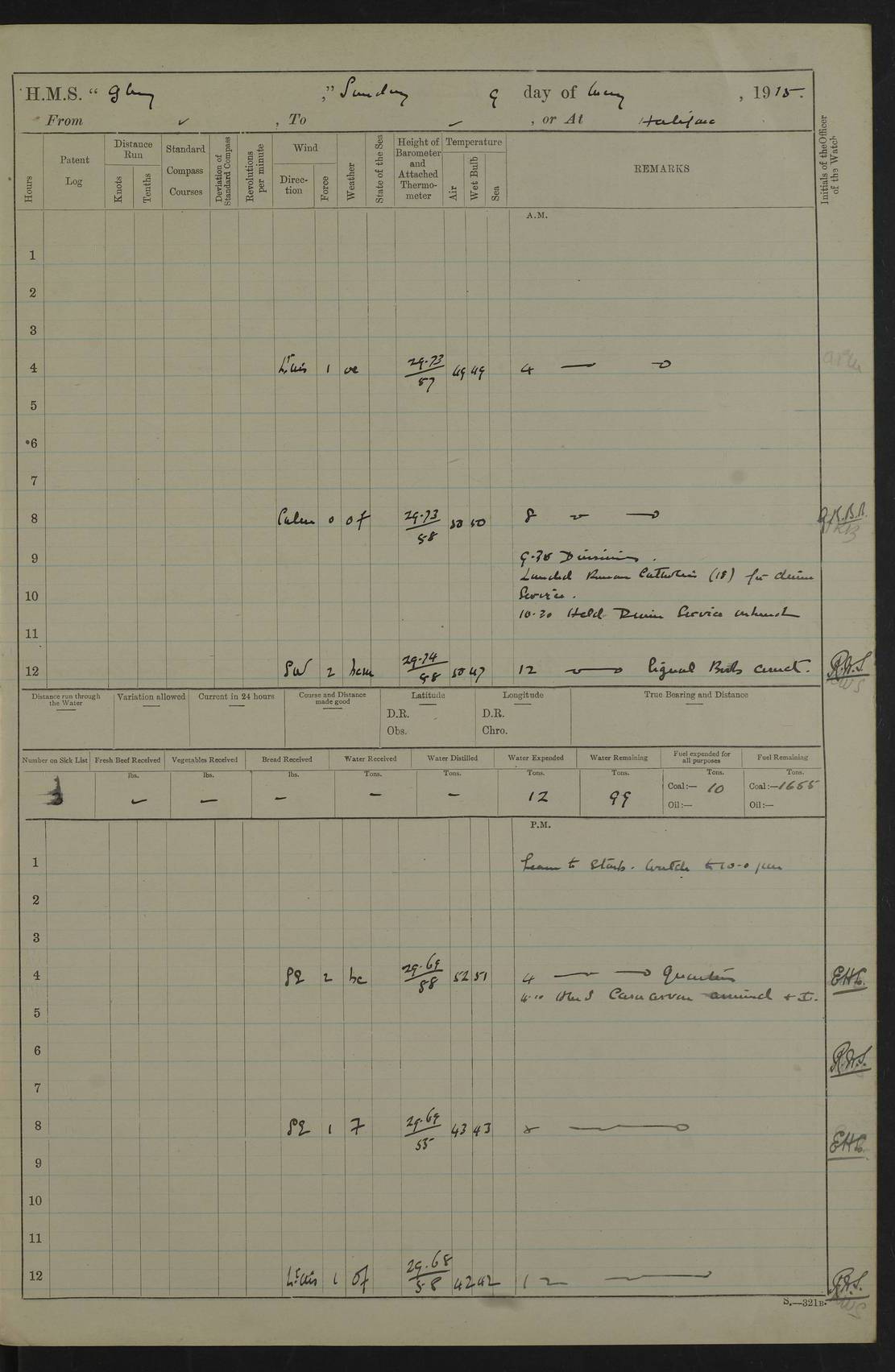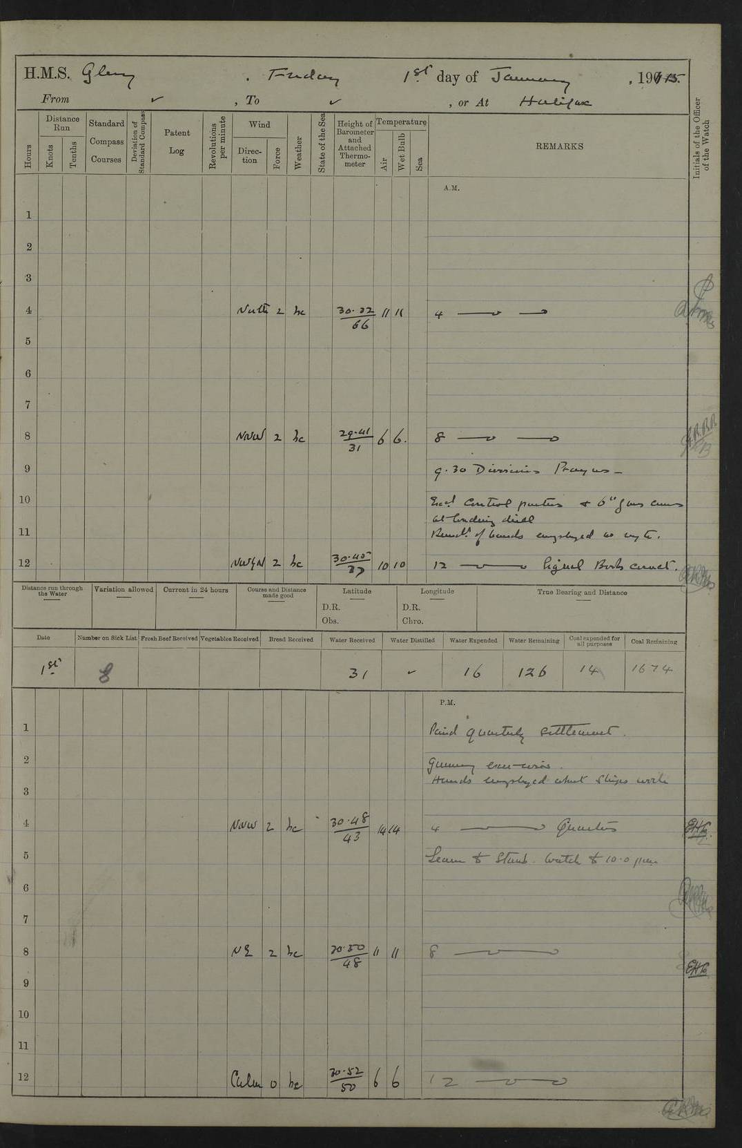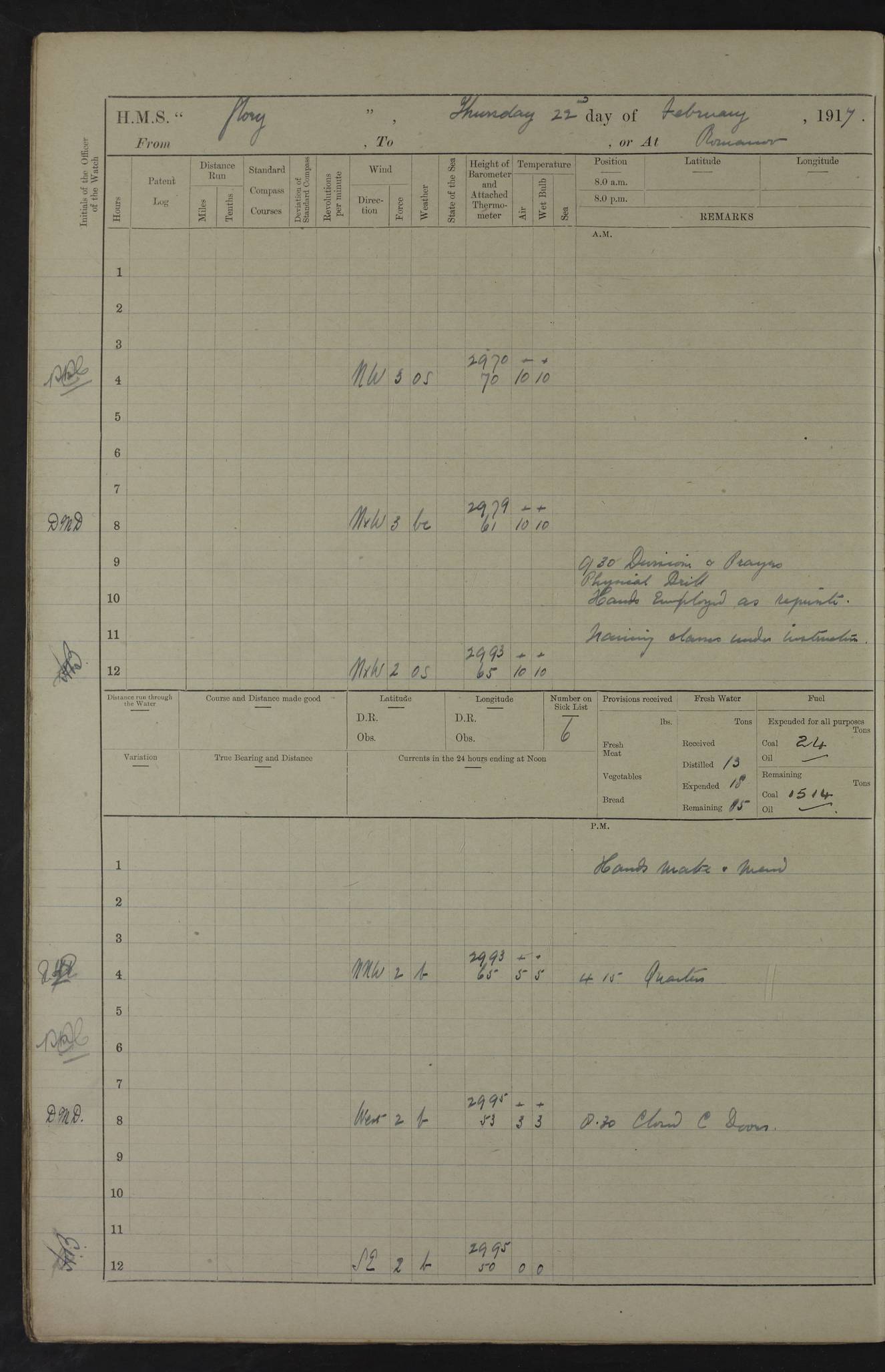22 June 1915 At sea, Gibraltar to Lemnos Lat 36.1, Long -1.3 4.15am: Sighted land on starboard bow. 10.20am: Stopped port engine for repairs. 11.20am: proceeded with port engine. pm: a/c due to change in deviation. 10.00pm: Cape Tenez Light abeam, 18 miles. 4f73cd61a2fc8ea9030015f6: (https://s3.amazonaws.com:443/oldweather/ADM53-43015/0012_1.jpg) 23 June 1915 At sea, Gibraltar to Lemnos Lat 37.5, Long 4.8 Number on sick list: 4 5.00am: Secured from night defence stations. Placed anti-submarine guns. pm: Life saving appliances served out to men stationed in ? ?at abandon ship. 4f73cd61a2fc8ea9030015f7: (https://s3.amazonaws.com:443/oldweather/ADM53-43015/0013_0.jpg) 24 June 1915 At sea, Gibraltar to Lemnos Lat 37.4, Long 10.8 Position in log clearly bears no resemblance to the location of the ship. Position above is approximate and is based sighting of Zembra Island at 11.55am. 5.00am: Dispersed from night defence stations. Manned anti-submarine guns. am: Sighted two French torpedo boats. am: Torpedo boats passed to ~ No 362, 363. am: Sighted land on starboard beam. 11.55am: Zembra Island abeam, 25 miles. 2.00pm: Sighted Pantellaria S34ºE. 4.45pm: Pantellaria Light House abeam 12 miles. 4f73cd61a2fc8ea9030015f8: (https://s3.amazonaws.com:443/oldweather/ADM53-43015/0013_1.jpg) 25 June 1915 At sea, Gibraltar to Lemnos Lat 35.5, Long 16.7 2.10am: Gozo Light abeam 17 miles. 5.00am: Dispersed from night defence stations. Manned anti-submarine guns. 4f73cd61a2fc8ea9030015f9: (https://s3.amazonaws.com:443/oldweather/ADM53-43015/0014_0.jpg) 26 June 1915 At sea, Gibraltar to Lemnos Lat 35.5, Long 22.6 Number on sick list: 5 5.00am: Dispersed from night defence stations. Manned anti-submarine guns. am: Aired night clothing. am: marines at maxim practice on quarter deck. 2.00pm: Observed land on either bow. 3.00pm: Sighted French patrol destroyer. 4.15pm: Sighted French patrol destroyer. 9.40pm: Milo Peak N63ºW. 10.26pm: Polino Light abeam to port 5.5 miles. 4f73cd62a2fc8ea9030015fa: (https://s3.amazonaws.com:443/oldweather/ADM53-43015/0014_1.jpg) 27 June 1915 At sea and at Lemnos Lat 39.1, Long 24.4 From 0.50 to 3.05am sighting of multiple light houses. 3.50am: a/c to N39ºW and commenced to zig-zag. 5.00am: Dispersed from night defence stations and placed anti-submarine guns and look-outs. am: Lost overboard by accident Hazlewood fender, pat. 311, one in number. 10.30am: Held Divine Service onboard. pm: Met and signalled HMS Minerva on patrol duty. pm: Courses and speeds as requisite while waiting orders to approach Mudros. 3.00pm: Proceeded. 5.16pm: Increased to 90 revs, commenced to zig-zag. Course as requisite for Mudros. 7.00pm: Entered Mudros Bay. 7.47pm: Stopped. Let go port anchor in ‘M3’. 8.30pm: Darkened ship. pm: Manned one 6” and one 12 pdr. 4f73cd62a2fc8ea9030015fb: (https://s3.amazonaws.com:443/oldweather/ADM53-43015/0015_0.jpg) 28 June 1915 Mudros Bay, Lemnos Lat 39.89, Long 25.24 5,00am: HMS Vengeance entered harbour. HMS Vengeance was a pre-dreadnought of the Canopus class, launched in 1899 at Vickers, Barrow, and sold for scrapping in 1921. Details at http://en.wikipedia.org/wiki/HMS_Vengeance_(1899) . am/pm/: hands preparing for coaling and about ship’s work. pm: Collier Wabana secured alongside. 4f73cd62a2fc8ea9030015fc: (https://s3.amazonaws.com:443/oldweather/ADM53-43015/0015_1.jpg) 29 June 1915 Mudros Bay, Lemnos Lat 39.89, Long 25.24 5.15am: Commenced coaling. 2.00pm: Finished coaling. Collier left. 4f73cd62a2fc8ea9030015fd: (https://s3.amazonaws.com:443/oldweather/ADM53-43015/0016_0.jpg) 30 June 1915 Mudros Bay, Lemnos Lat 39.89, Long 25.24 am: Parties away sanding, and with fire engines onshore. am: Boats away disembarking troops. am: French Flagship Patrie sailed. The Patrie was a French pre-dreadnought, launched at La Seyne shipyard in 1903, and stricken in 1921. Details at http://en.wikipedia.org/wiki/French_battleship_Patrie . 6.30pm: Hands to bathe. 4f73cd63a2fc8ea9030015fe: (https://s3.amazonaws.com:443/oldweather/ADM53-43015/0016_1.jpg) 4f73cd63a2fc8ea9030015ff: (https://s3.amazonaws.com:443/oldweather/ADM53-43015/0017_0.jpg) 4f73cd63a2fc8ea903001600: (https://s3.amazonaws.com:443/oldweather/ADM53-43015/0017_1.jpg) 4f73cd63a2fc8ea903001601: (https://s3.amazonaws.com:443/oldweather/ADM53-43015/0018_0.jpg) 4f73cd64a2fc8ea903001602: (https://s3.amazonaws.com:443/oldweather/ADM53-43015/0018_1.jpg) LOGS FOR JULY 1915 From July to October 1915, HMS Glory spent her time at Port Mudros. Certain activities typically took place daily and are not generally noted in the pages below. These activities include: Lighting fires in the picket boat around 4am and drawing the fires in the late evening; Divisions at around 9–9.30am and Evening Quarters at 4pm; Darken ship at around 8.30pm; Daily ‘cleaning ship’, with variations thereof; SBC (for ‘Signal Books Correct’) at the watch changes. 4f73cd64a2fc8ea903001603: (https://s3.amazonaws.com:443/oldweather/ADM53-43016/0000_0.jpg) 4f73cd64a2fc8ea903001604: (https://s3.amazonaws.com:443/oldweather/ADM53-43016/0000_1.jpg) 4f73cd65a2fc8ea903001605: (https://s3.amazonaws.com:443/oldweather/ADM53-43016/0001_0.jpg) 4f73cd65a2fc8ea903001606: (https://s3.amazonaws.com:443/oldweather/ADM53-43016/0001_1.jpg) 1 July 1915 Port Mudros Lat 39.89, Long 25.24 6.30am: Landed working parties preparing boom defence ships. am: Discharged Acting Commander Rayne to Hector. Hector was a kite balloon ship. No further details readily available. 5.00pm: Tug T.10 made fast astern. 7.15pm: HMS Venerable went out. 7.30pm: HMS Chatham went out. HMS Chatham was a ‘Town’ cruiser and lead ship of her class. She was launched in 1911 at Chatham Dockyard and sold in 1926. Details at http://en.wikipedia.org/wiki/HMS_Chatham_(1911) . 4f73cd65a2fc8ea903001607: (https://s3.amazonaws.com:443/oldweather/ADM53-43016/0002_0.jpg) 2 July 1915 Port Mudros Lat 39.89, Long 25.24 5.35am: Landed working parties preparing boom defence ships. am/pm: Boom defence par