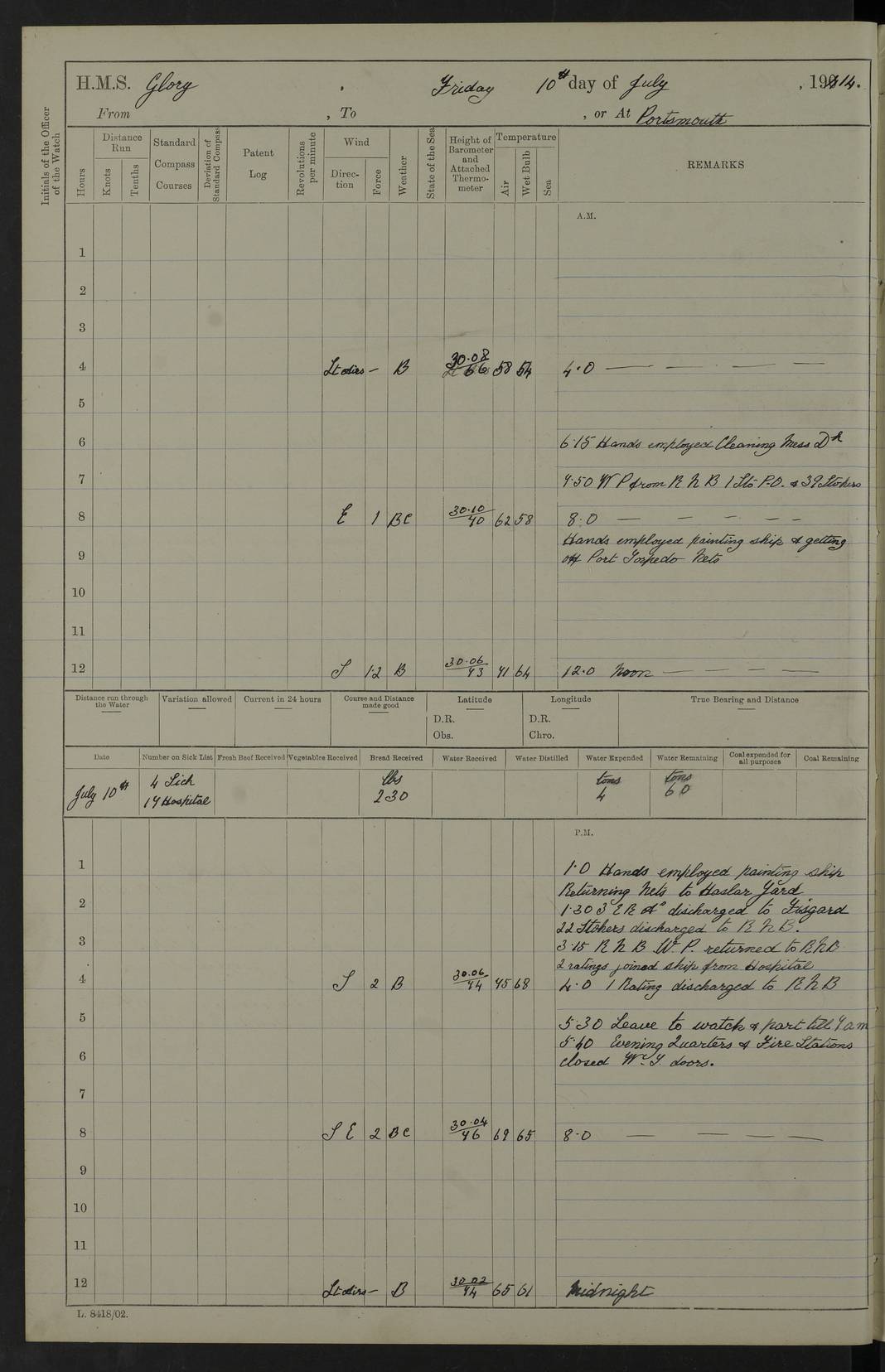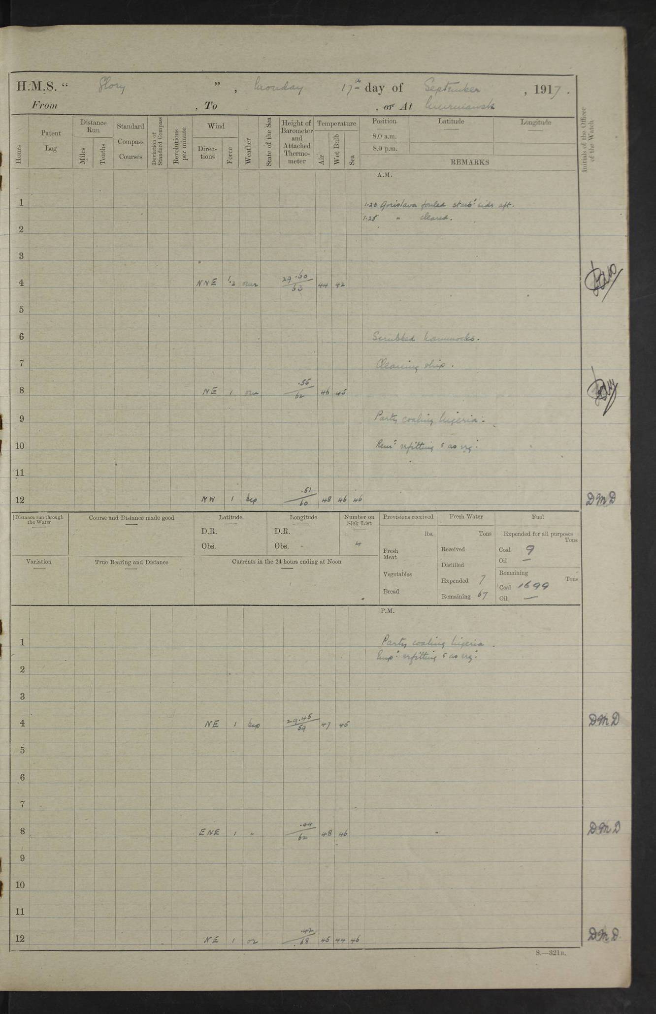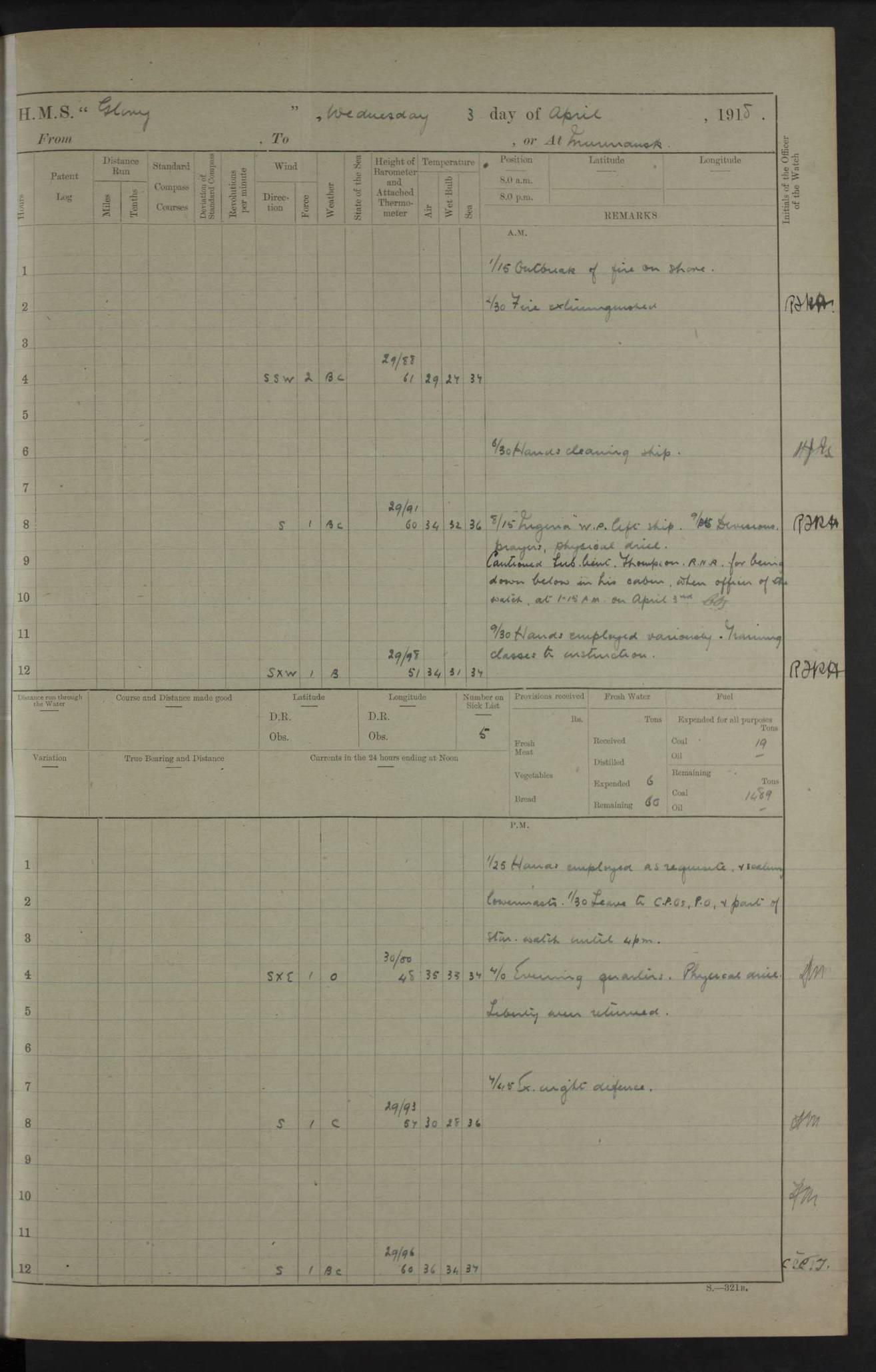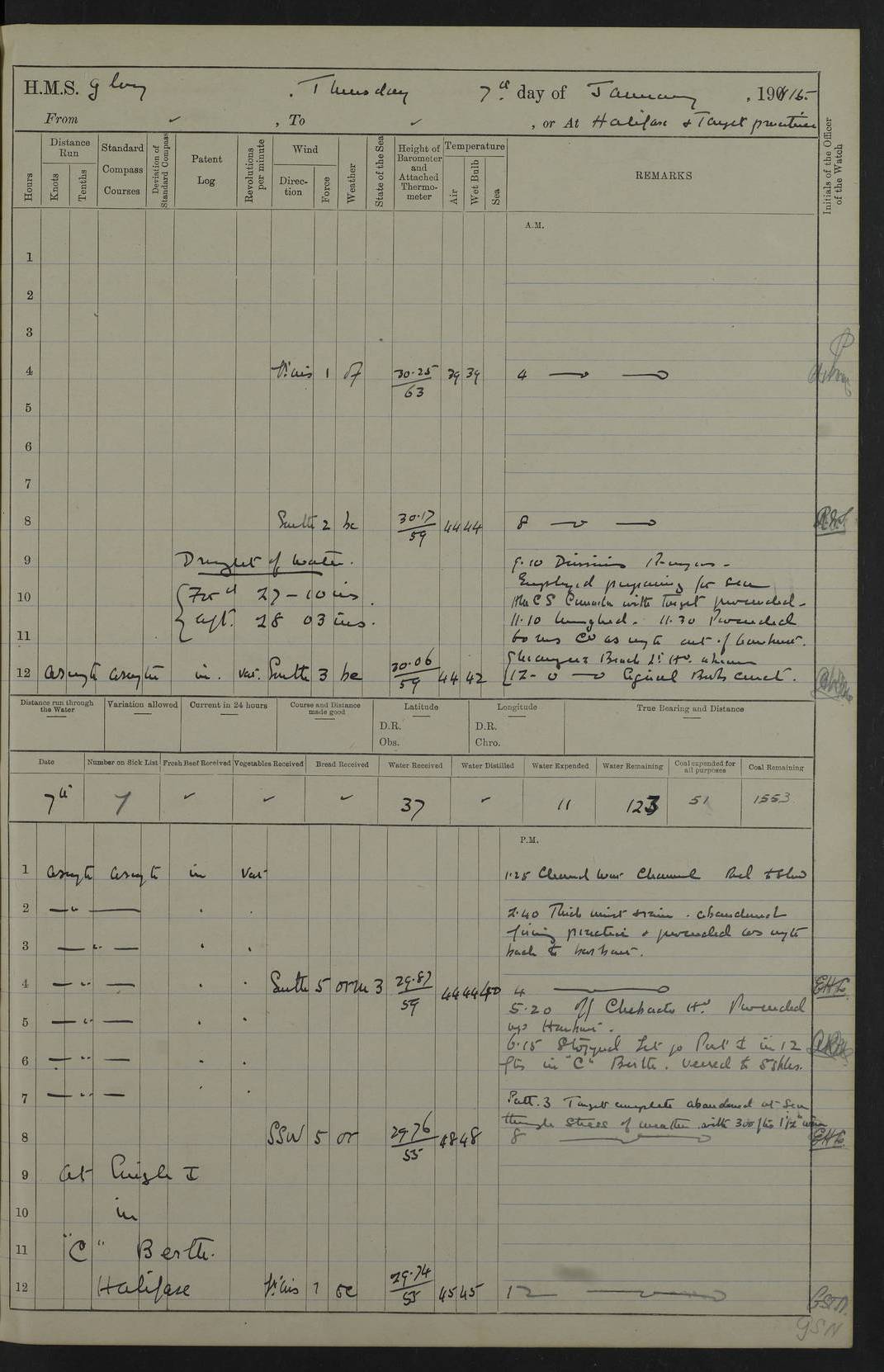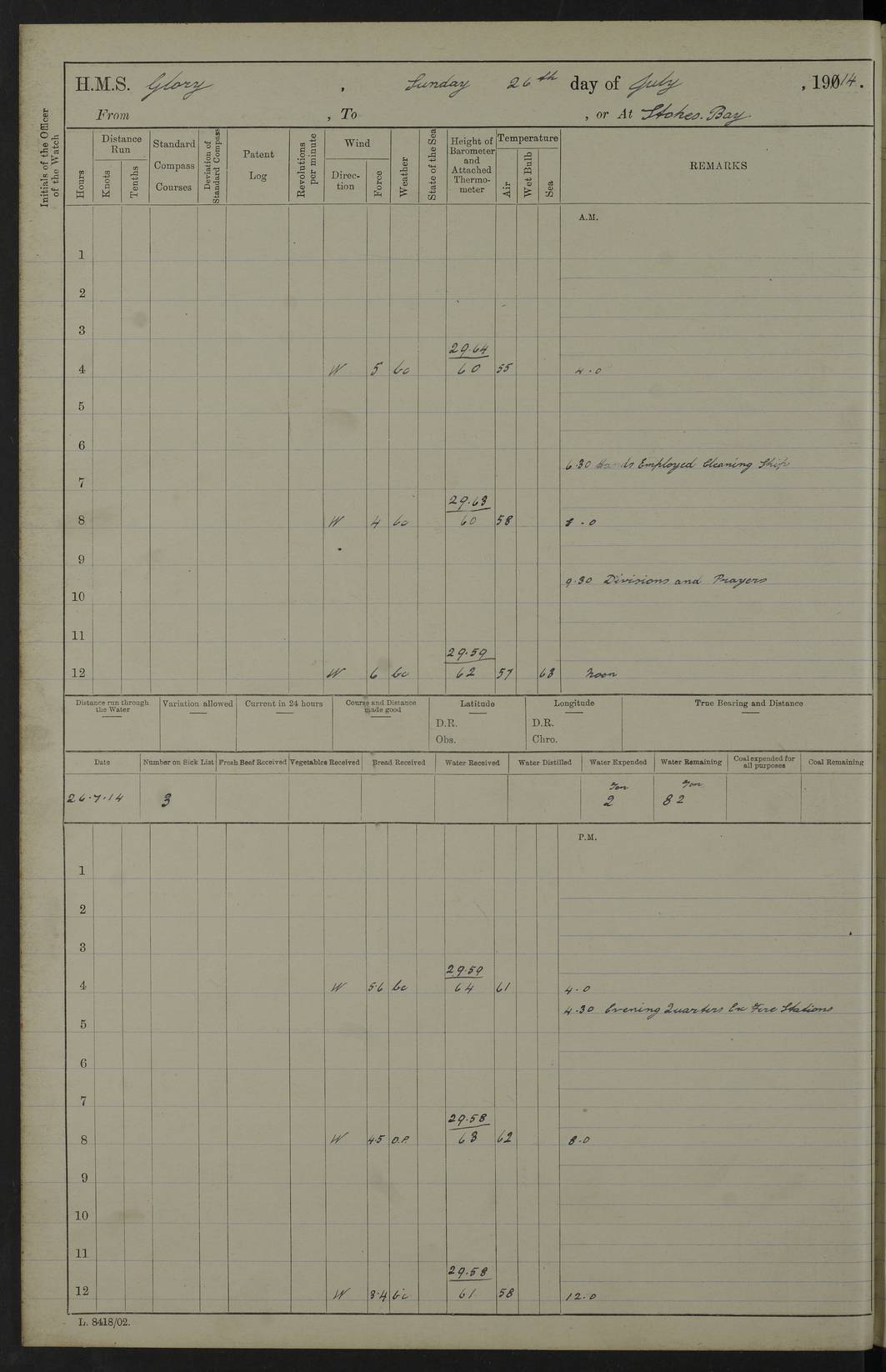 22 June 1915 At sea, Gibraltar to Lemnos Lat 36.1, Long -1.3 4.15am: Sighted land on starboard bow. 10.20am: Stopped port engine for repairs. 11.20am: proceeded with port engine. pm: a/c due to change in deviation. 10.00pm: Cape Tenez Light abeam, 18 miles. 4f73cd61a2fc8ea9030015f6: (https://s3.amazonaws.com:443/oldweather/ADM53-43015/0012_1.jpg) 23 June 1915 At sea, Gibraltar to Lemnos Lat 37.5, Long 4.8 Number on sick list: 4 5.00am: Secured from night defence stations. Placed anti-submarine guns. pm: Life saving appliances served out to men stationed in ? ?at abandon ship. 4f73cd61a2fc8ea9030015f7: (https://s3.amazonaws.com:443/oldweather/ADM53-43015/0013_0.jpg) 24 June 1915 At sea, Gibraltar to Lemnos Lat 37.4, Long 10.8 Position in log clearly bears no resemblance to the location of the ship. Position above is approximate and is based sighting of Zembra Island at 11.55am. 5.00am: Dispersed from night defence stations. Manned anti-submarine guns. am: Sighted two French torpedo boats. am: Torpedo boats passed to ~ No 362, 363. am: Sighted land on starboard beam. 11.55am: Zembra Island abeam, 25 miles. 2.00pm: Sighted Pantellaria S34ºE. 4.45pm: Pantellaria Light House abeam 12 miles. 4f73cd61a2fc8ea9030015f8: (https://s3.amazonaws.com:443/oldweather/ADM53-43015/0013_1.jpg) 25 June 1915 At sea, Gibraltar to Lemnos Lat 35.5, Long 16.7 2.10am: Gozo Light abeam 17 miles. 5.00am: Dispersed from night defence stations. Manned anti-submarine guns. 4f73cd61a2fc8ea9030015f9: (https://s3.amazonaws.com:443/oldweather/ADM53-43015/0014_0.jpg) 26 June 1915 At sea, Gibraltar to Lemnos Lat 35.5, Long 22.6 Number on sick list: 5 5.00am: Dispersed from night defence stations. Manned anti-submarine guns. am: Aired night clothing. am: marines at maxim practice on quarter deck. 2.00pm: Observed land on either bow. 3.00pm: Sighted French patrol destroyer. 4.15pm: Sighted French patrol destroyer. 9.40pm: Milo Peak N63ºW. 10.26pm: Polino Light abeam to port 5.5 miles. 4f73cd62a2fc8ea9030015fa: (https://s3.amazonaws.com:443/oldweather/ADM53-43015/0014_1.jpg) 27 June 1915 At sea and at Lemnos Lat 39.1, Long 24.4 From 0.50 to 3.05am sighting of multiple light houses. 3.50am: a/c to N39ºW and commenced to zig-zag. 5.00am: Dispersed from night defence stations and placed anti-submarine guns and look-outs. am: Lost overboard by accident Hazlewood fender, pat. 311, one in number. 10.30am: Held Divine Service onboard. pm: Met and signalled HMS Minerva on patrol duty. pm: Courses and speeds as requisite while waiting orders to approach Mudros. 3.00pm: Proceeded. 5.16pm: Increased to 90 revs, commenced to zig-zag. Course as requisite for Mudros. 7.00pm: Entered Mudros Bay. 7.47pm: Stopped. Let go port anchor in ‘M3’. 8.30pm: Darkened ship. pm: Manned one 6” and one 12 pdr. 4f73cd62a2fc8ea9030015fb: (https://s3.amazonaws.com:443/oldweather/ADM53-43015/0015_0.jpg) 28 June 1915 Mudros Bay, Lemnos Lat 39.89, Long 25.24 5,00am: HMS Vengeance entered harbour. HMS Vengeance was a pre-dreadnought of the Canopus class, launched in 1899 at Vickers, Barrow, and sold for scrapping in 1921. Details at http://en.wikipedia.org/wiki/HMS_Vengeance_(1899) . am/pm/: hands preparing for coaling and about ship’s work. pm: Collier Wabana secured alongside. 4f73cd62a2fc8ea9030015fc: (https://s3.amazonaws.com:443/oldweather/ADM53-43015/0015_1.jpg) 29 June 1915 Mudros Bay, Lemnos Lat 39.89, Long 25.24 5.15am: Commenced coaling. 2.00pm: Finished coaling. Collier left. 4f73cd62a2fc8ea9030015fd: (https://s3.amazonaws.com:443/oldweather/ADM53-43015/0016_0.jpg) 30 June 1915 Mudros Bay, Lemnos Lat 39.89, Long 25.24 am: Parties away sanding, and with fire engines onshore. am: Boats away disembarking troops. am: French Flagship Patrie sailed. The Patrie was a French pre-dreadnought, launched at La Seyne shipyard in 1903, and stricken in 1921. Details at http://en.wikipedia.org/wiki/French_battleship_Patrie . 6.30pm: Hands to bathe. 4f73cd63a2fc8ea9030015fe: (https://s3.amazonaws.com:443/oldweather/ADM53-43015/0016_1.jpg) 4f73cd63a2fc8ea9030015ff: (https://s3.amazonaws.com:443/oldweather/ADM53-43015/0017_0.jpg) 4f73cd63a2fc8ea903001600: (https://s3.amazonaws.com:443/oldweather/ADM53-43015/0017_1.jpg) 4f73cd63a2fc8ea903001601: (https://s3.amazonaws.com:443/oldweather/ADM53-43015/0018_0.jpg) 4f73cd64a2fc8ea903001602: (https://s3.amazonaws.com:443/oldweather/ADM53-43015/0018_1.jpg) LOGS FOR JULY 1915 From July to October 1915, HMS Glory spent her time at Port Mudros. Certain activities typically took place daily and are not generally noted in the pages below. These activities include: Lighting fires in the picket boat around 4am and drawing the fires in the late evening; Divisions at around 9–9.30am and Evening Quarters at 4pm; Darken ship at around 8.30pm; Daily ‘cleaning ship’, with variations thereof; SBC (for ‘Signal Books Correct’) at the watch changes. 4f73cd64a2fc8ea903001603: (https://s3.amazonaws.com:443/oldweather/ADM53-43016/0000_0.jpg) 4f73cd64a2fc8ea903001604: (https://s3.amazonaws.com:443/oldweather/ADM53-43016/0000_1.jpg) 4f73cd65a2fc8ea903001605: (https://s3.amazonaws.com:443/oldweather/ADM53-43016/0001_0.jpg) 4f73cd65a2fc8ea903001606: (https://s3.amazonaws.com:443/oldweather/ADM53-43016/0001_1.jpg) 1 July 1915 Port Mudros Lat 39.89, Long 25.24 6.30am: Landed working parties preparing boom defence ships. am: Discharged Acting Commander Rayne to Hector. Hector was a kite balloon ship. No further details readily available. 5.00pm: Tug T.10 made fast astern. 7.15pm: HMS Venerable went out. 7.30pm: HMS Chatham went out. HMS Chatham was a ‘Town’ cruiser and lead ship of her class. She was launched in 1911 at Chatham Dockyard and sold in 1926. Details at http://en.wikipedia.org/wiki/HMS_Chatham_(1911) . 4f73cd65a2fc8ea903001607: (https://s3.amazonaws.com:443/oldweather/ADM53-43016/0002_0.jpg) 2 July 1915 Port Mudros Lat 39.89, Long 25.24 5.35am: Landed working parties preparing boom defence ships. am/pm: Boom defence par