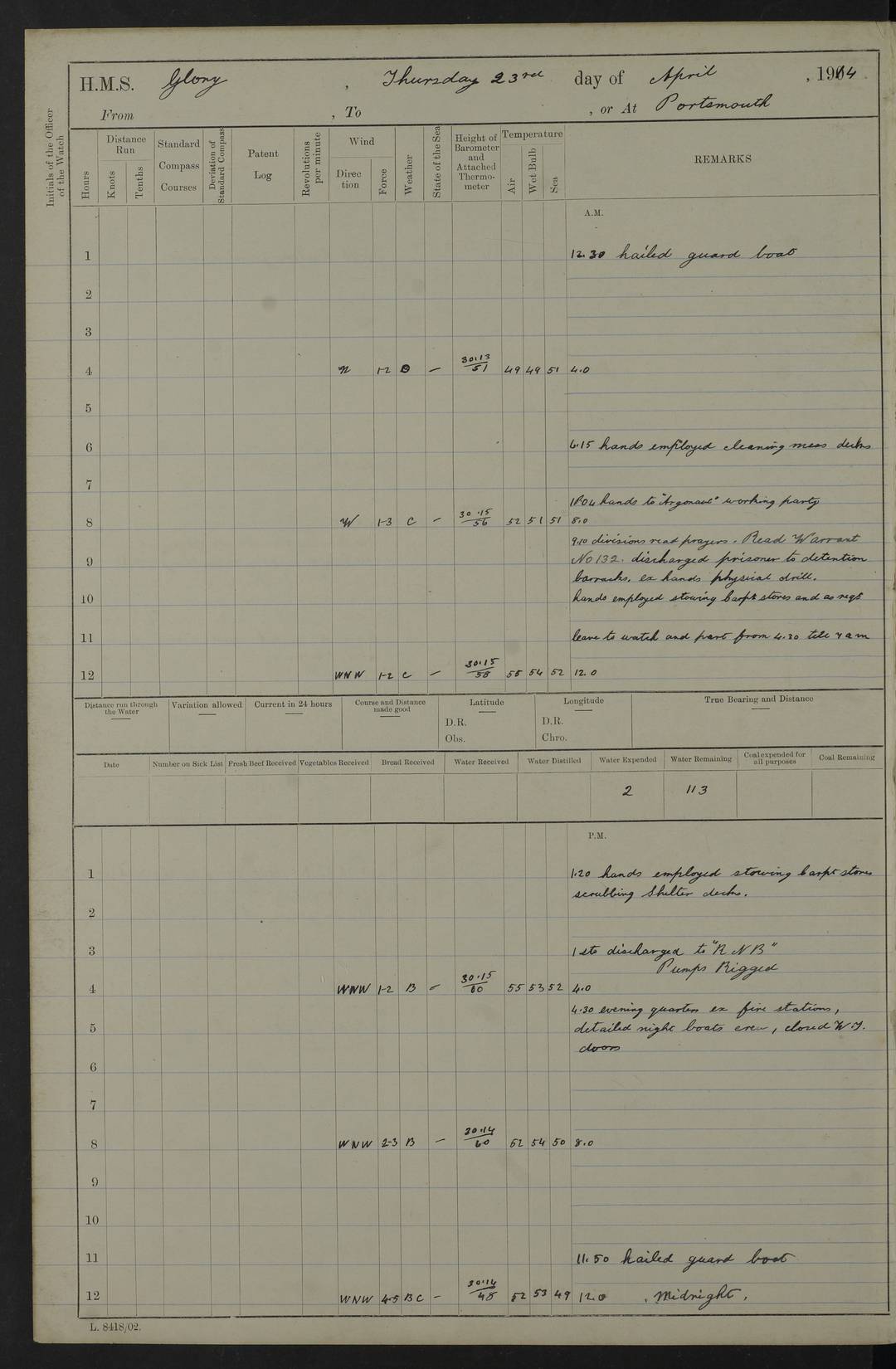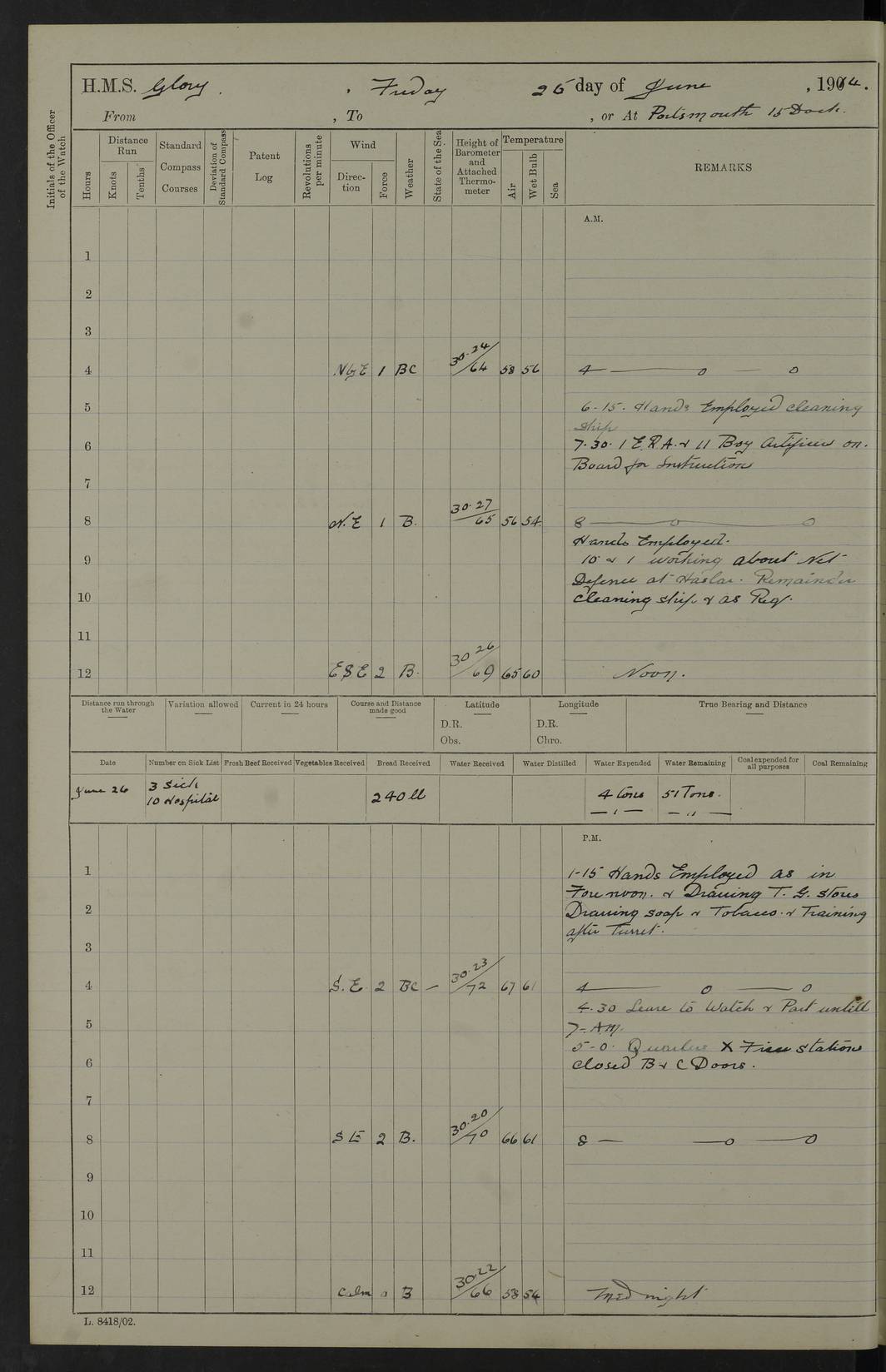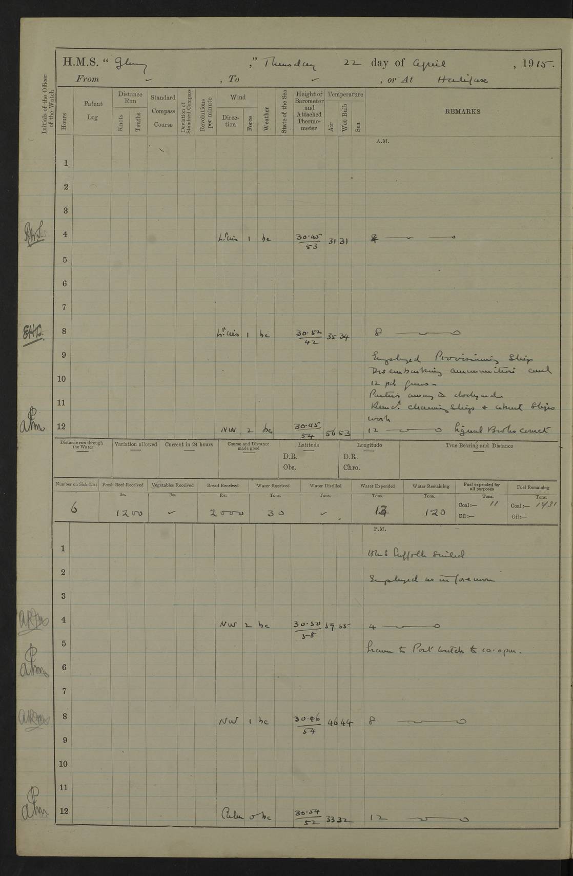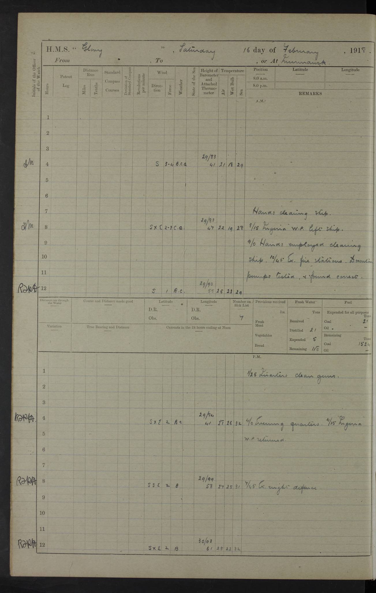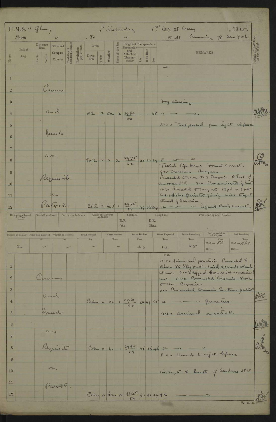 22 June 1915 At sea, Gibraltar to Lemnos Lat 36.1, Long -1.3 4.15am: Sighted land on starboard bow. 10.20am: Stopped port engine for repairs. 11.20am: proceeded with port engine. pm: a/c due to change in deviation. 10.00pm: Cape Tenez Light abeam, 18 miles. 4f73cd61a2fc8ea9030015f6: (https://s3.amazonaws.com:443/oldweather/ADM53-43015/0012_1.jpg) 23 June 1915 At sea, Gibraltar to Lemnos Lat 37.5, Long 4.8 Number on sick list: 4 5.00am: Secured from night defence stations. Placed anti-submarine guns. pm: Life saving appliances served out to men stationed in ? ?at abandon ship. 4f73cd61a2fc8ea9030015f7: (https://s3.amazonaws.com:443/oldweather/ADM53-43015/0013_0.jpg) 24 June 1915 At sea, Gibraltar to Lemnos Lat 37.4, Long 10.8 Position in log clearly bears no resemblance to the location of the ship. Position above is approximate and is based sighting of Zembra Island at 11.55am. 5.00am: Dispersed from night defence stations. Manned anti-submarine guns. am: Sighted two French torpedo boats. am: Torpedo boats passed to ~ No 362, 363. am: Sighted land on starboard beam. 11.55am: Zembra Island abeam, 25 miles. 2.00pm: Sighted Pantellaria S34ºE. 4.45pm: Pantellaria Light House abeam 12 miles. 4f73cd61a2fc8ea9030015f8: (https://s3.amazonaws.com:443/oldweather/ADM53-43015/0013_1.jpg) 25 June 1915 At sea, Gibraltar to Lemnos Lat 35.5, Long 16.7 2.10am: Gozo Light abeam 17 miles. 5.00am: Dispersed from night defence stations. Manned anti-submarine guns. 4f73cd61a2fc8ea9030015f9: (https://s3.amazonaws.com:443/oldweather/ADM53-43015/0014_0.jpg) 26 June 1915 At sea, Gibraltar to Lemnos Lat 35.5, Long 22.6 Number on sick list: 5 5.00am: Dispersed from night defence stations. Manned anti-submarine guns. am: Aired night clothing. am: marines at maxim practice on quarter deck. 2.00pm: Observed land on either bow. 3.00pm: Sighted French patrol destroyer. 4.15pm: Sighted French patrol destroyer. 9.40pm: Milo Peak N63ºW. 10.26pm: Polino Light abeam to port 5.5 miles. 4f73cd62a2fc8ea9030015fa: (https://s3.amazonaws.com:443/oldweather/ADM53-43015/0014_1.jpg) 27 June 1915 At sea and at Lemnos Lat 39.1, Long 24.4 From 0.50 to 3.05am sighting of multiple light houses. 3.50am: a/c to N39ºW and commenced to zig-zag. 5.00am: Dispersed from night defence stations and placed anti-submarine guns and look-outs. am: Lost overboard by accident Hazlewood fender, pat. 311, one in number. 10.30am: Held Divine Service onboard. pm: Met and signalled HMS Minerva on patrol duty. pm: Courses and speeds as requisite while waiting orders to approach Mudros. 3.00pm: Proceeded. 5.16pm: Increased to 90 revs, commenced to zig-zag. Course as requisite for Mudros. 7.00pm: Entered Mudros Bay. 7.47pm: Stopped. Let go port anchor in ‘M3’. 8.30pm: Darkened ship. pm: Manned one 6” and one 12 pdr. 4f73cd62a2fc8ea9030015fb: (https://s3.amazonaws.com:443/oldweather/ADM53-43015/0015_0.jpg) 28 June 1915 Mudros Bay, Lemnos Lat 39.89, Long 25.24 5,00am: HMS Vengeance entered harbour. HMS Vengeance was a pre-dreadnought of the Canopus class, launched in 1899 at Vickers, Barrow, and sold for scrapping in 1921. Details at http://en.wikipedia.org/wiki/HMS_Vengeance_(1899) . am/pm/: hands preparing for coaling and about ship’s work. pm: Collier Wabana secured alongside. 4f73cd62a2fc8ea9030015fc: (https://s3.amazonaws.com:443/oldweather/ADM53-43015/0015_1.jpg) 29 June 1915 Mudros Bay, Lemnos Lat 39.89, Long 25.24 5.15am: Commenced coaling. 2.00pm: Finished coaling. Collier left. 4f73cd62a2fc8ea9030015fd: (https://s3.amazonaws.com:443/oldweather/ADM53-43015/0016_0.jpg) 30 June 1915 Mudros Bay, Lemnos Lat 39.89, Long 25.24 am: Parties away sanding, and with fire engines onshore. am: Boats away disembarking troops. am: French Flagship Patrie sailed. The Patrie was a French pre-dreadnought, launched at La Seyne shipyard in 1903, and stricken in 1921. Details at http://en.wikipedia.org/wiki/French_battleship_Patrie . 6.30pm: Hands to bathe. 4f73cd63a2fc8ea9030015fe: (https://s3.amazonaws.com:443/oldweather/ADM53-43015/0016_1.jpg) 4f73cd63a2fc8ea9030015ff: (https://s3.amazonaws.com:443/oldweather/ADM53-43015/0017_0.jpg) 4f73cd63a2fc8ea903001600: (https://s3.amazonaws.com:443/oldweather/ADM53-43015/0017_1.jpg) 4f73cd63a2fc8ea903001601: (https://s3.amazonaws.com:443/oldweather/ADM53-43015/0018_0.jpg) 4f73cd64a2fc8ea903001602: (https://s3.amazonaws.com:443/oldweather/ADM53-43015/0018_1.jpg) LOGS FOR JULY 1915 From July to October 1915, HMS Glory spent her time at Port Mudros. Certain activities typically took place daily and are not generally noted in the pages below. These activities include: Lighting fires in the picket boat around 4am and drawing the fires in the late evening; Divisions at around 9–9.30am and Evening Quarters at 4pm; Darken ship at around 8.30pm; Daily ‘cleaning ship’, with variations thereof; SBC (for ‘Signal Books Correct’) at the watch changes. 4f73cd64a2fc8ea903001603: (https://s3.amazonaws.com:443/oldweather/ADM53-43016/0000_0.jpg) 4f73cd64a2fc8ea903001604: (https://s3.amazonaws.com:443/oldweather/ADM53-43016/0000_1.jpg) 4f73cd65a2fc8ea903001605: (https://s3.amazonaws.com:443/oldweather/ADM53-43016/0001_0.jpg) 4f73cd65a2fc8ea903001606: (https://s3.amazonaws.com:443/oldweather/ADM53-43016/0001_1.jpg) 1 July 1915 Port Mudros Lat 39.89, Long 25.24 6.30am: Landed working parties preparing boom defence ships. am: Discharged Acting Commander Rayne to Hector. Hector was a kite balloon ship. No further details readily available. 5.00pm: Tug T.10 made fast astern. 7.15pm: HMS Venerable went out. 7.30pm: HMS Chatham went out. HMS Chatham was a ‘Town’ cruiser and lead ship of her class. She was launched in 1911 at Chatham Dockyard and sold in 1926. Details at http://en.wikipedia.org/wiki/HMS_Chatham_(1911) . 4f73cd65a2fc8ea903001607: (https://s3.amazonaws.com:443/oldweather/ADM53-43016/0002_0.jpg) 2 July 1915 Port Mudros Lat 39.89, Long 25.24 5.35am: Landed working parties preparing boom defence ships. am/pm: Boom defence par