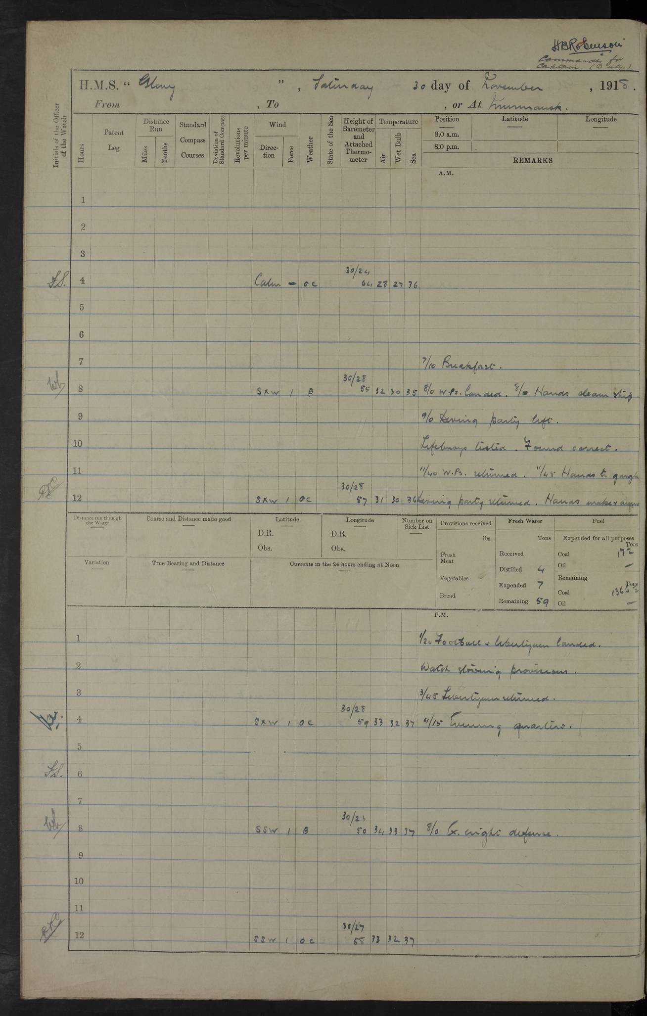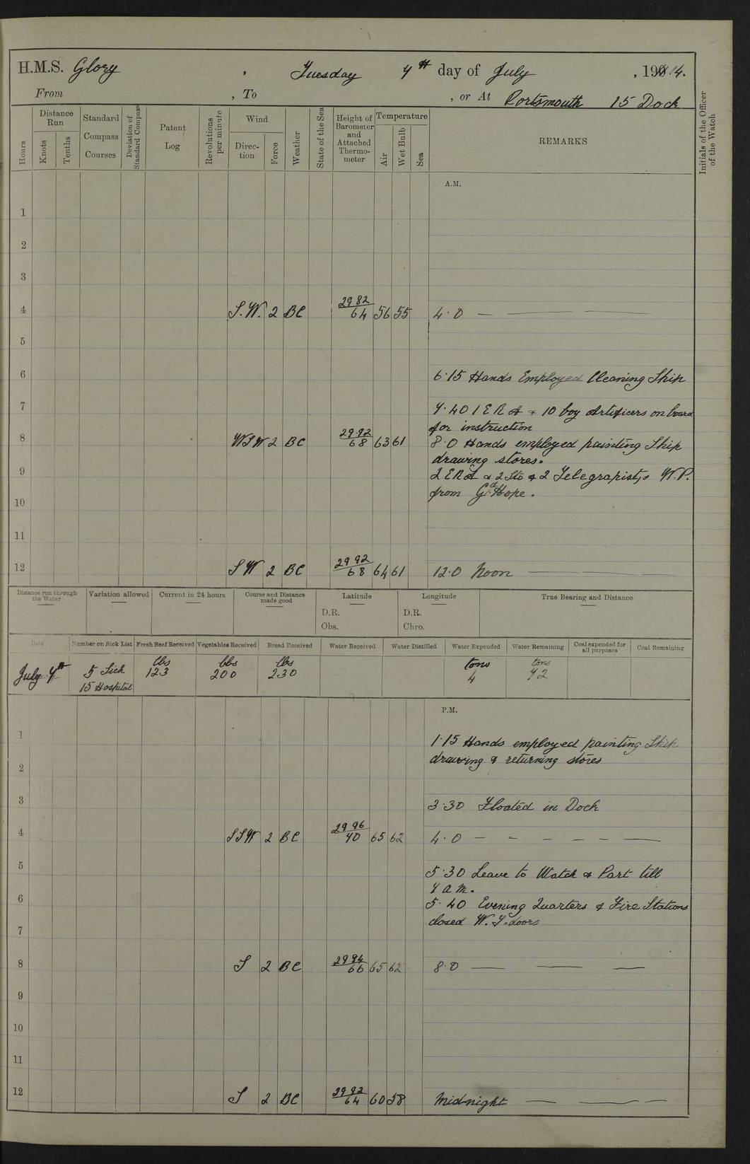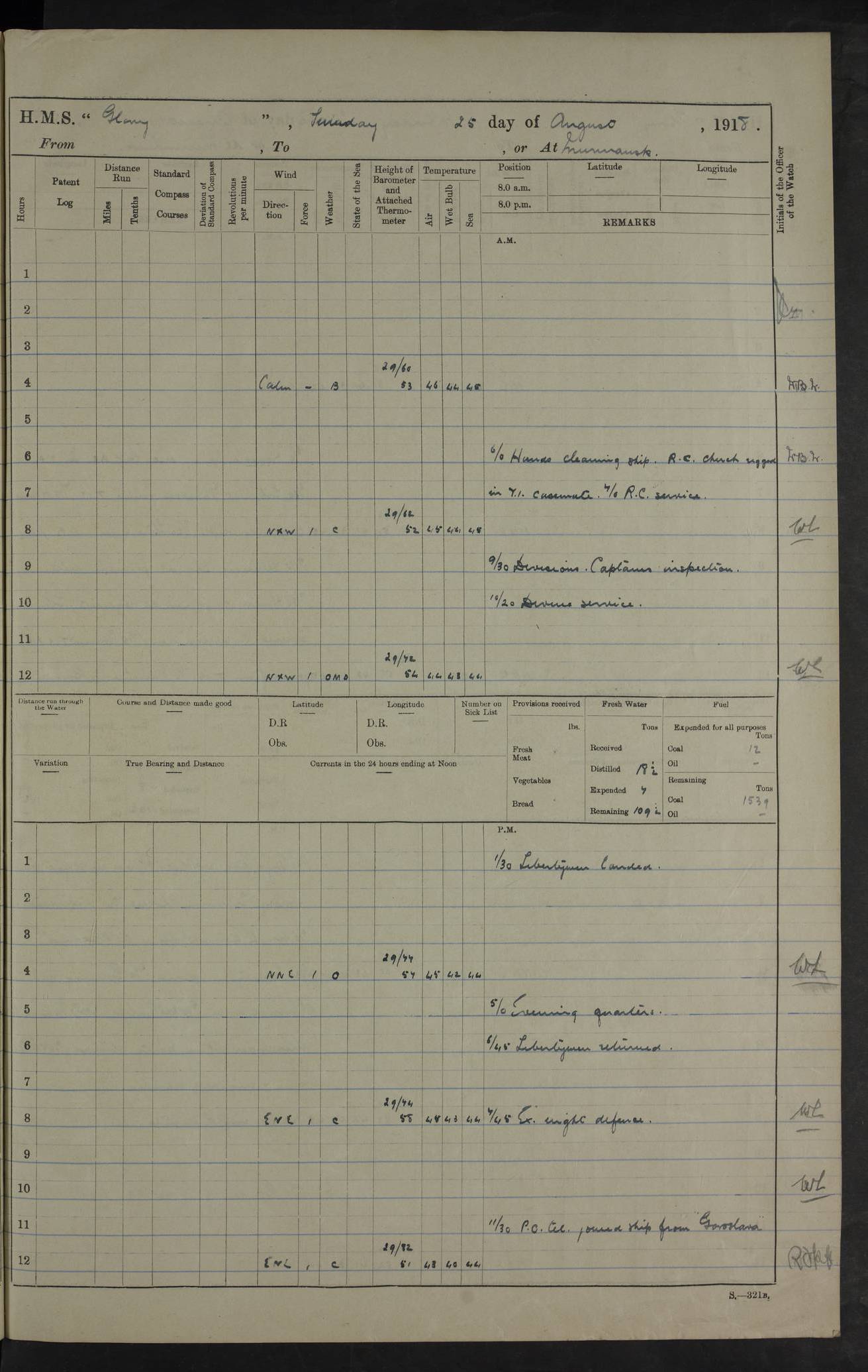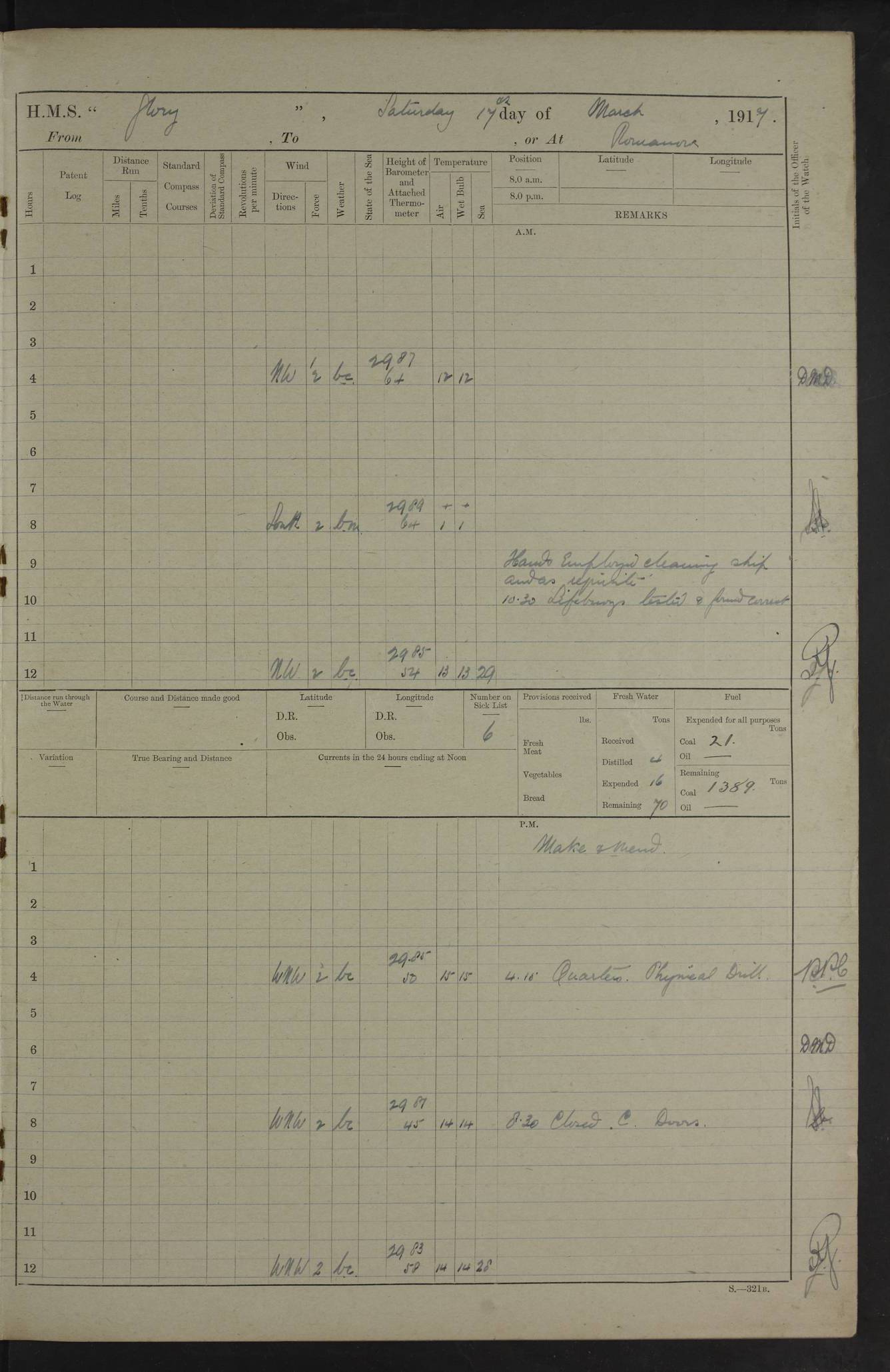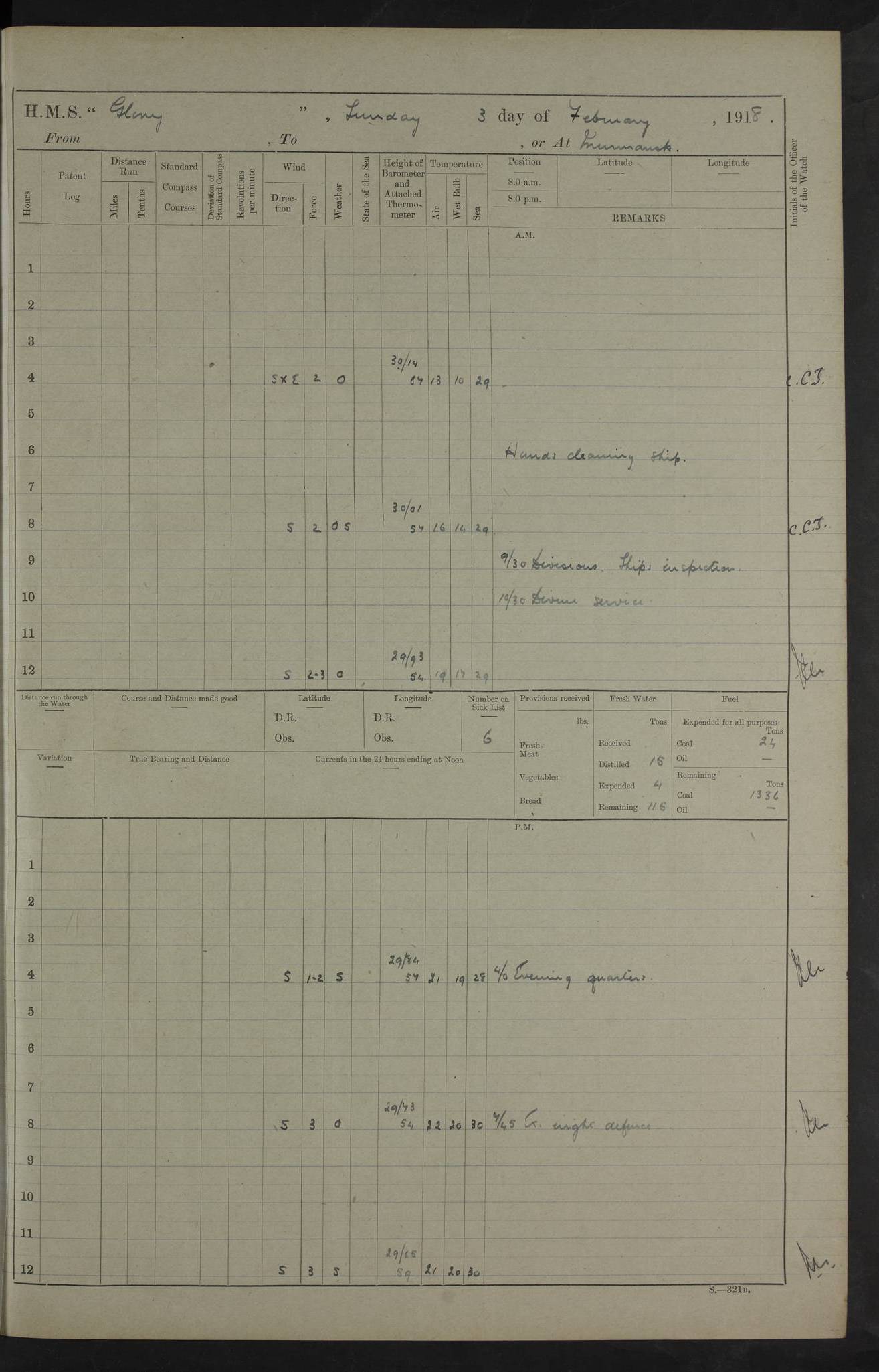 22 June 1915 At sea, Gibraltar to Lemnos Lat 36.1, Long -1.3 4.15am: Sighted land on starboard bow. 10.20am: Stopped port engine for repairs. 11.20am: proceeded with port engine. pm: a/c due to change in deviation. 10.00pm: Cape Tenez Light abeam, 18 miles. 4f73cd61a2fc8ea9030015f6: (https://s3.amazonaws.com:443/oldweather/ADM53-43015/0012_1.jpg) 23 June 1915 At sea, Gibraltar to Lemnos Lat 37.5, Long 4.8 Number on sick list: 4 5.00am: Secured from night defence stations. Placed anti-submarine guns. pm: Life saving appliances served out to men stationed in ? ?at abandon ship. 4f73cd61a2fc8ea9030015f7: (https://s3.amazonaws.com:443/oldweather/ADM53-43015/0013_0.jpg) 24 June 1915 At sea, Gibraltar to Lemnos Lat 37.4, Long 10.8 Position in log clearly bears no resemblance to the location of the ship. Position above is approximate and is based sighting of Zembra Island at 11.55am. 5.00am: Dispersed from night defence stations. Manned anti-submarine guns. am: Sighted two French torpedo boats. am: Torpedo boats passed to ~ No 362, 363. am: Sighted land on starboard beam. 11.55am: Zembra Island abeam, 25 miles. 2.00pm: Sighted Pantellaria S34ºE. 4.45pm: Pantellaria Light House abeam 12 miles. 4f73cd61a2fc8ea9030015f8: (https://s3.amazonaws.com:443/oldweather/ADM53-43015/0013_1.jpg) 25 June 1915 At sea, Gibraltar to Lemnos Lat 35.5, Long 16.7 2.10am: Gozo Light abeam 17 miles. 5.00am: Dispersed from night defence stations. Manned anti-submarine guns. 4f73cd61a2fc8ea9030015f9: (https://s3.amazonaws.com:443/oldweather/ADM53-43015/0014_0.jpg) 26 June 1915 At sea, Gibraltar to Lemnos Lat 35.5, Long 22.6 Number on sick list: 5 5.00am: Dispersed from night defence stations. Manned anti-submarine guns. am: Aired night clothing. am: marines at maxim practice on quarter deck. 2.00pm: Observed land on either bow. 3.00pm: Sighted French patrol destroyer. 4.15pm: Sighted French patrol destroyer. 9.40pm: Milo Peak N63ºW. 10.26pm: Polino Light abeam to port 5.5 miles. 4f73cd62a2fc8ea9030015fa: (https://s3.amazonaws.com:443/oldweather/ADM53-43015/0014_1.jpg) 27 June 1915 At sea and at Lemnos Lat 39.1, Long 24.4 From 0.50 to 3.05am sighting of multiple light houses. 3.50am: a/c to N39ºW and commenced to zig-zag. 5.00am: Dispersed from night defence stations and placed anti-submarine guns and look-outs. am: Lost overboard by accident Hazlewood fender, pat. 311, one in number. 10.30am: Held Divine Service onboard. pm: Met and signalled HMS Minerva on patrol duty. pm: Courses and speeds as requisite while waiting orders to approach Mudros. 3.00pm: Proceeded. 5.16pm: Increased to 90 revs, commenced to zig-zag. Course as requisite for Mudros. 7.00pm: Entered Mudros Bay. 7.47pm: Stopped. Let go port anchor in ‘M3’. 8.30pm: Darkened ship. pm: Manned one 6” and one 12 pdr. 4f73cd62a2fc8ea9030015fb: (https://s3.amazonaws.com:443/oldweather/ADM53-43015/0015_0.jpg) 28 June 1915 Mudros Bay, Lemnos Lat 39.89, Long 25.24 5,00am: HMS Vengeance entered harbour. HMS Vengeance was a pre-dreadnought of the Canopus class, launched in 1899 at Vickers, Barrow, and sold for scrapping in 1921. Details at http://en.wikipedia.org/wiki/HMS_Vengeance_(1899) . am/pm/: hands preparing for coaling and about ship’s work. pm: Collier Wabana secured alongside. 4f73cd62a2fc8ea9030015fc: (https://s3.amazonaws.com:443/oldweather/ADM53-43015/0015_1.jpg) 29 June 1915 Mudros Bay, Lemnos Lat 39.89, Long 25.24 5.15am: Commenced coaling. 2.00pm: Finished coaling. Collier left. 4f73cd62a2fc8ea9030015fd: (https://s3.amazonaws.com:443/oldweather/ADM53-43015/0016_0.jpg) 30 June 1915 Mudros Bay, Lemnos Lat 39.89, Long 25.24 am: Parties away sanding, and with fire engines onshore. am: Boats away disembarking troops. am: French Flagship Patrie sailed. The Patrie was a French pre-dreadnought, launched at La Seyne shipyard in 1903, and stricken in 1921. Details at http://en.wikipedia.org/wiki/French_battleship_Patrie . 6.30pm: Hands to bathe. 4f73cd63a2fc8ea9030015fe: (https://s3.amazonaws.com:443/oldweather/ADM53-43015/0016_1.jpg) 4f73cd63a2fc8ea9030015ff: (https://s3.amazonaws.com:443/oldweather/ADM53-43015/0017_0.jpg) 4f73cd63a2fc8ea903001600: (https://s3.amazonaws.com:443/oldweather/ADM53-43015/0017_1.jpg) 4f73cd63a2fc8ea903001601: (https://s3.amazonaws.com:443/oldweather/ADM53-43015/0018_0.jpg) 4f73cd64a2fc8ea903001602: (https://s3.amazonaws.com:443/oldweather/ADM53-43015/0018_1.jpg) LOGS FOR JULY 1915 From July to October 1915, HMS Glory spent her time at Port Mudros. Certain activities typically took place daily and are not generally noted in the pages below. These activities include: Lighting fires in the picket boat around 4am and drawing the fires in the late evening; Divisions at around 9–9.30am and Evening Quarters at 4pm; Darken ship at around 8.30pm; Daily ‘cleaning ship’, with variations thereof; SBC (for ‘Signal Books Correct’) at the watch changes. 4f73cd64a2fc8ea903001603: (https://s3.amazonaws.com:443/oldweather/ADM53-43016/0000_0.jpg) 4f73cd64a2fc8ea903001604: (https://s3.amazonaws.com:443/oldweather/ADM53-43016/0000_1.jpg) 4f73cd65a2fc8ea903001605: (https://s3.amazonaws.com:443/oldweather/ADM53-43016/0001_0.jpg) 4f73cd65a2fc8ea903001606: (https://s3.amazonaws.com:443/oldweather/ADM53-43016/0001_1.jpg) 1 July 1915 Port Mudros Lat 39.89, Long 25.24 6.30am: Landed working parties preparing boom defence ships. am: Discharged Acting Commander Rayne to Hector. Hector was a kite balloon ship. No further details readily available. 5.00pm: Tug T.10 made fast astern. 7.15pm: HMS Venerable went out. 7.30pm: HMS Chatham went out. HMS Chatham was a ‘Town’ cruiser and lead ship of her class. She was launched in 1911 at Chatham Dockyard and sold in 1926. Details at http://en.wikipedia.org/wiki/HMS_Chatham_(1911) . 4f73cd65a2fc8ea903001607: (https://s3.amazonaws.com:443/oldweather/ADM53-43016/0002_0.jpg) 2 July 1915 Port Mudros Lat 39.89, Long 25.24 5.35am: Landed working parties preparing boom defence ships. am/pm: Boom defence par