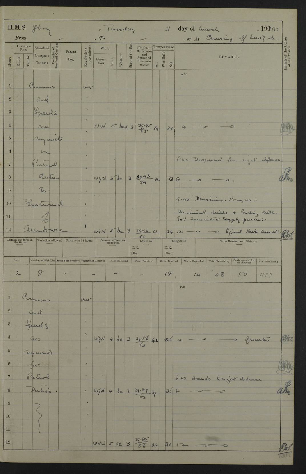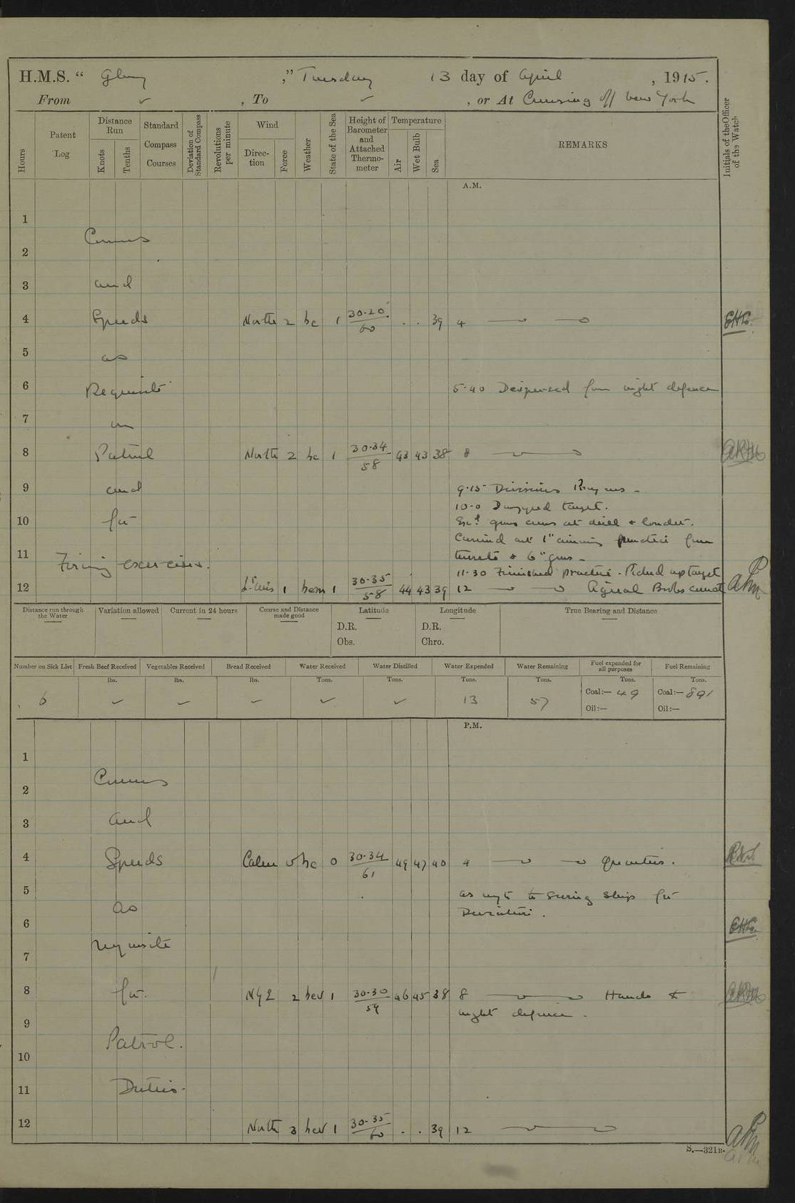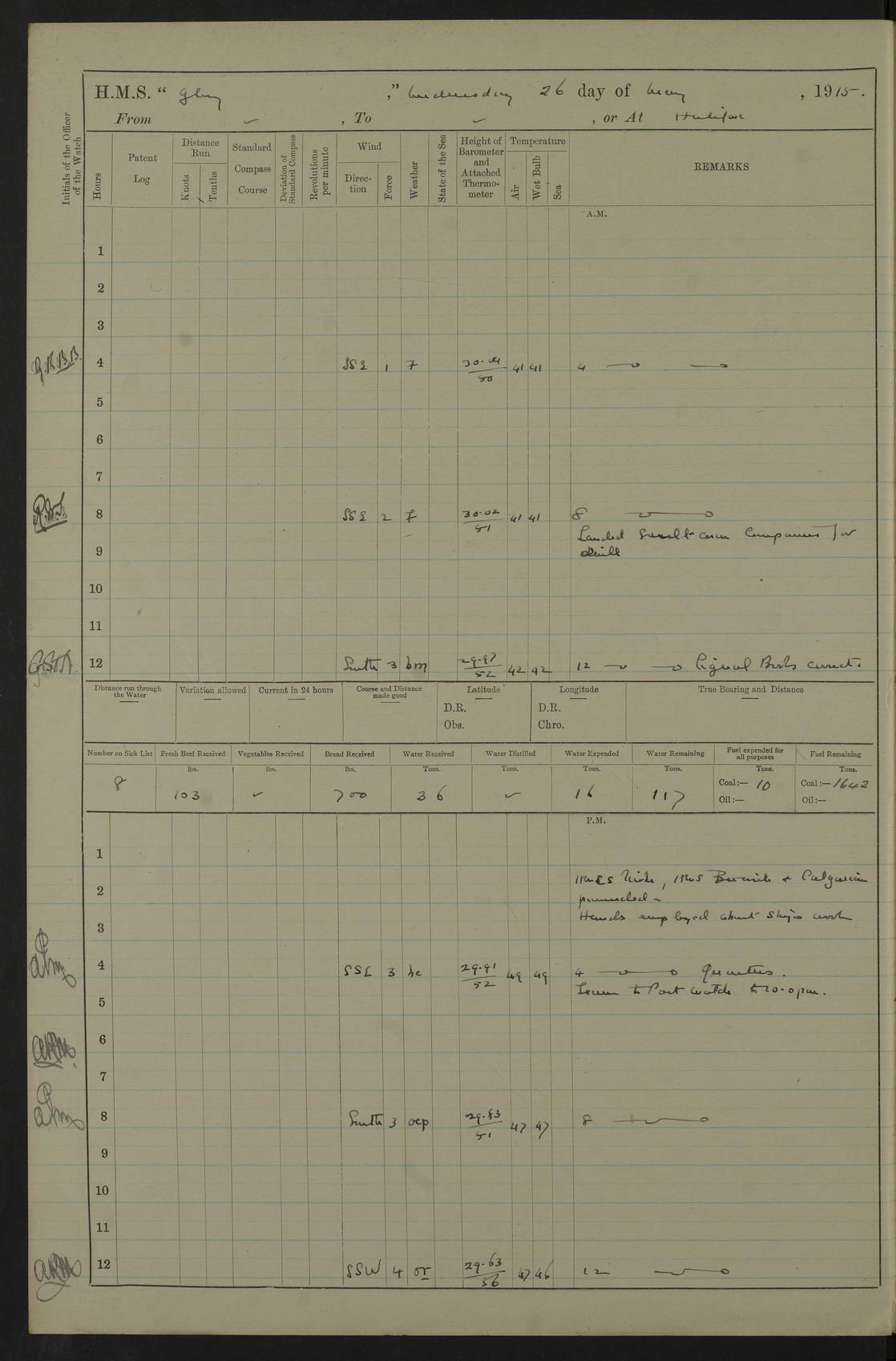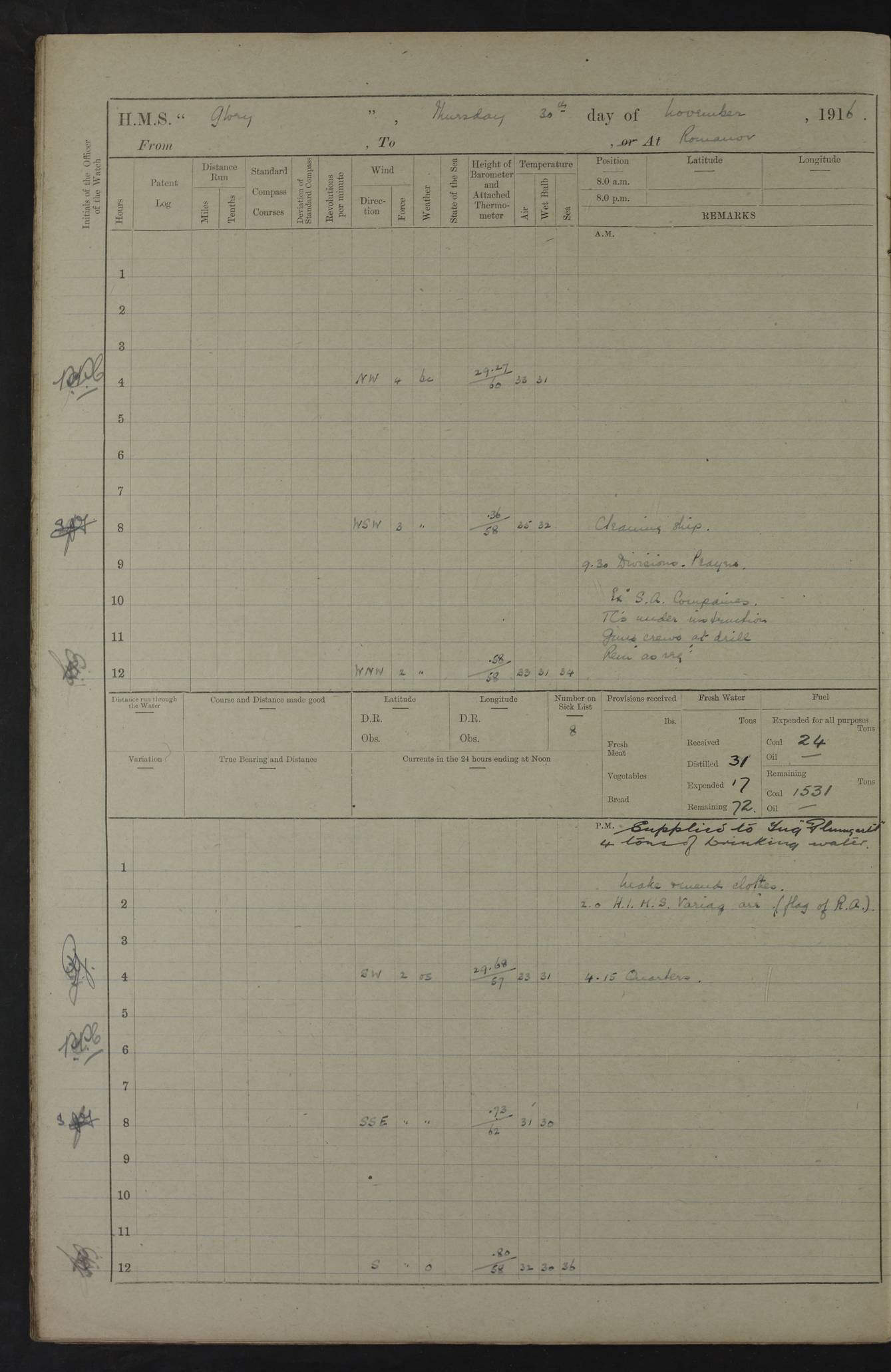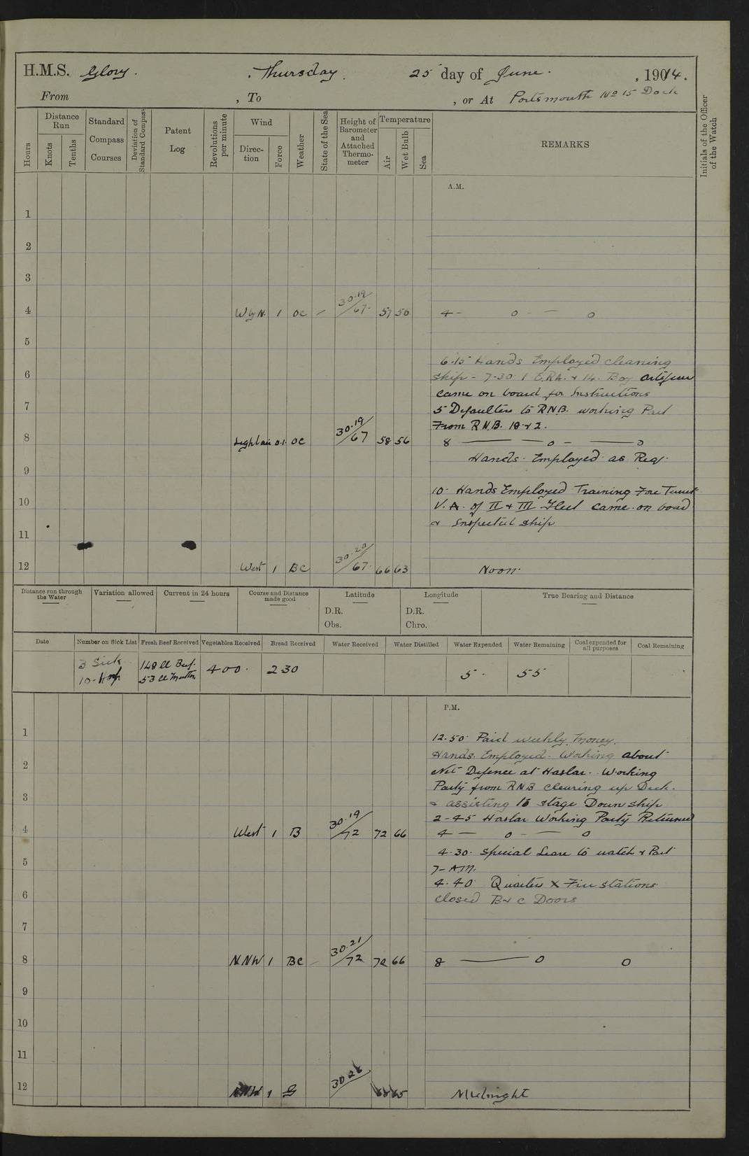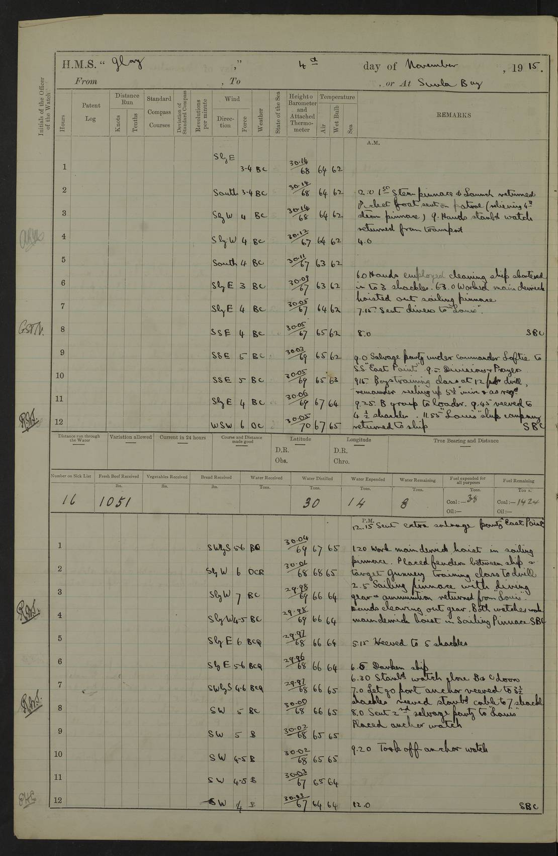 22 June 1915 At sea, Gibraltar to Lemnos Lat 36.1, Long -1.3 4.15am: Sighted land on starboard bow. 10.20am: Stopped port engine for repairs. 11.20am: proceeded with port engine. pm: a/c due to change in deviation. 10.00pm: Cape Tenez Light abeam, 18 miles. 4f73cd61a2fc8ea9030015f6: (https://s3.amazonaws.com:443/oldweather/ADM53-43015/0012_1.jpg) 23 June 1915 At sea, Gibraltar to Lemnos Lat 37.5, Long 4.8 Number on sick list: 4 5.00am: Secured from night defence stations. Placed anti-submarine guns. pm: Life saving appliances served out to men stationed in ? ?at abandon ship. 4f73cd61a2fc8ea9030015f7: (https://s3.amazonaws.com:443/oldweather/ADM53-43015/0013_0.jpg) 24 June 1915 At sea, Gibraltar to Lemnos Lat 37.4, Long 10.8 Position in log clearly bears no resemblance to the location of the ship. Position above is approximate and is based sighting of Zembra Island at 11.55am. 5.00am: Dispersed from night defence stations. Manned anti-submarine guns. am: Sighted two French torpedo boats. am: Torpedo boats passed to ~ No 362, 363. am: Sighted land on starboard beam. 11.55am: Zembra Island abeam, 25 miles. 2.00pm: Sighted Pantellaria S34ºE. 4.45pm: Pantellaria Light House abeam 12 miles. 4f73cd61a2fc8ea9030015f8: (https://s3.amazonaws.com:443/oldweather/ADM53-43015/0013_1.jpg) 25 June 1915 At sea, Gibraltar to Lemnos Lat 35.5, Long 16.7 2.10am: Gozo Light abeam 17 miles. 5.00am: Dispersed from night defence stations. Manned anti-submarine guns. 4f73cd61a2fc8ea9030015f9: (https://s3.amazonaws.com:443/oldweather/ADM53-43015/0014_0.jpg) 26 June 1915 At sea, Gibraltar to Lemnos Lat 35.5, Long 22.6 Number on sick list: 5 5.00am: Dispersed from night defence stations. Manned anti-submarine guns. am: Aired night clothing. am: marines at maxim practice on quarter deck. 2.00pm: Observed land on either bow. 3.00pm: Sighted French patrol destroyer. 4.15pm: Sighted French patrol destroyer. 9.40pm: Milo Peak N63ºW. 10.26pm: Polino Light abeam to port 5.5 miles. 4f73cd62a2fc8ea9030015fa: (https://s3.amazonaws.com:443/oldweather/ADM53-43015/0014_1.jpg) 27 June 1915 At sea and at Lemnos Lat 39.1, Long 24.4 From 0.50 to 3.05am sighting of multiple light houses. 3.50am: a/c to N39ºW and commenced to zig-zag. 5.00am: Dispersed from night defence stations and placed anti-submarine guns and look-outs. am: Lost overboard by accident Hazlewood fender, pat. 311, one in number. 10.30am: Held Divine Service onboard. pm: Met and signalled HMS Minerva on patrol duty. pm: Courses and speeds as requisite while waiting orders to approach Mudros. 3.00pm: Proceeded. 5.16pm: Increased to 90 revs, commenced to zig-zag. Course as requisite for Mudros. 7.00pm: Entered Mudros Bay. 7.47pm: Stopped. Let go port anchor in ‘M3’. 8.30pm: Darkened ship. pm: Manned one 6” and one 12 pdr. 4f73cd62a2fc8ea9030015fb: (https://s3.amazonaws.com:443/oldweather/ADM53-43015/0015_0.jpg) 28 June 1915 Mudros Bay, Lemnos Lat 39.89, Long 25.24 5,00am: HMS Vengeance entered harbour. HMS Vengeance was a pre-dreadnought of the Canopus class, launched in 1899 at Vickers, Barrow, and sold for scrapping in 1921. Details at http://en.wikipedia.org/wiki/HMS_Vengeance_(1899) . am/pm/: hands preparing for coaling and about ship’s work. pm: Collier Wabana secured alongside. 4f73cd62a2fc8ea9030015fc: (https://s3.amazonaws.com:443/oldweather/ADM53-43015/0015_1.jpg) 29 June 1915 Mudros Bay, Lemnos Lat 39.89, Long 25.24 5.15am: Commenced coaling. 2.00pm: Finished coaling. Collier left. 4f73cd62a2fc8ea9030015fd: (https://s3.amazonaws.com:443/oldweather/ADM53-43015/0016_0.jpg) 30 June 1915 Mudros Bay, Lemnos Lat 39.89, Long 25.24 am: Parties away sanding, and with fire engines onshore. am: Boats away disembarking troops. am: French Flagship Patrie sailed. The Patrie was a French pre-dreadnought, launched at La Seyne shipyard in 1903, and stricken in 1921. Details at http://en.wikipedia.org/wiki/French_battleship_Patrie . 6.30pm: Hands to bathe. 4f73cd63a2fc8ea9030015fe: (https://s3.amazonaws.com:443/oldweather/ADM53-43015/0016_1.jpg) 4f73cd63a2fc8ea9030015ff: (https://s3.amazonaws.com:443/oldweather/ADM53-43015/0017_0.jpg) 4f73cd63a2fc8ea903001600: (https://s3.amazonaws.com:443/oldweather/ADM53-43015/0017_1.jpg) 4f73cd63a2fc8ea903001601: (https://s3.amazonaws.com:443/oldweather/ADM53-43015/0018_0.jpg) 4f73cd64a2fc8ea903001602: (https://s3.amazonaws.com:443/oldweather/ADM53-43015/0018_1.jpg) LOGS FOR JULY 1915 From July to October 1915, HMS Glory spent her time at Port Mudros. Certain activities typically took place daily and are not generally noted in the pages below. These activities include: Lighting fires in the picket boat around 4am and drawing the fires in the late evening; Divisions at around 9–9.30am and Evening Quarters at 4pm; Darken ship at around 8.30pm; Daily ‘cleaning ship’, with variations thereof; SBC (for ‘Signal Books Correct’) at the watch changes. 4f73cd64a2fc8ea903001603: (https://s3.amazonaws.com:443/oldweather/ADM53-43016/0000_0.jpg) 4f73cd64a2fc8ea903001604: (https://s3.amazonaws.com:443/oldweather/ADM53-43016/0000_1.jpg) 4f73cd65a2fc8ea903001605: (https://s3.amazonaws.com:443/oldweather/ADM53-43016/0001_0.jpg) 4f73cd65a2fc8ea903001606: (https://s3.amazonaws.com:443/oldweather/ADM53-43016/0001_1.jpg) 1 July 1915 Port Mudros Lat 39.89, Long 25.24 6.30am: Landed working parties preparing boom defence ships. am: Discharged Acting Commander Rayne to Hector. Hector was a kite balloon ship. No further details readily available. 5.00pm: Tug T.10 made fast astern. 7.15pm: HMS Venerable went out. 7.30pm: HMS Chatham went out. HMS Chatham was a ‘Town’ cruiser and lead ship of her class. She was launched in 1911 at Chatham Dockyard and sold in 1926. Details at http://en.wikipedia.org/wiki/HMS_Chatham_(1911) . 4f73cd65a2fc8ea903001607: (https://s3.amazonaws.com:443/oldweather/ADM53-43016/0002_0.jpg) 2 July 1915 Port Mudros Lat 39.89, Long 25.24 5.35am: Landed working parties preparing boom defence ships. am/pm: Boom defence par