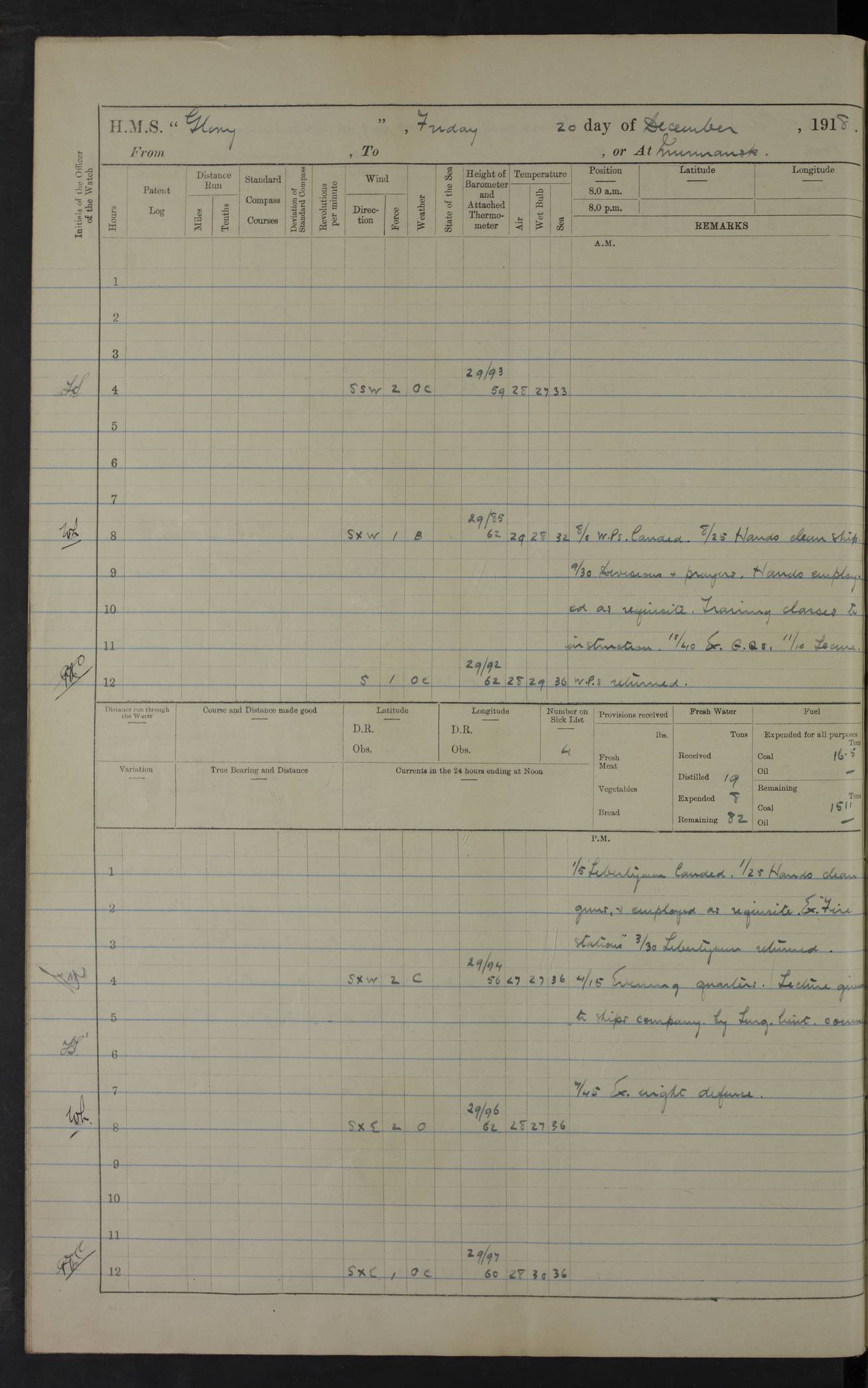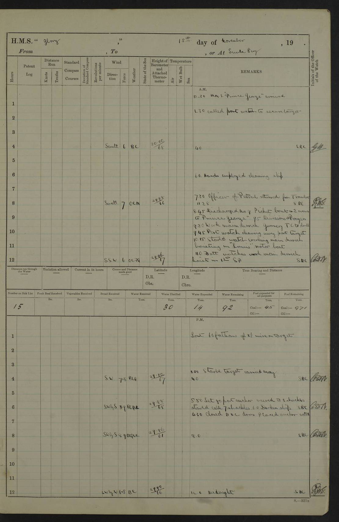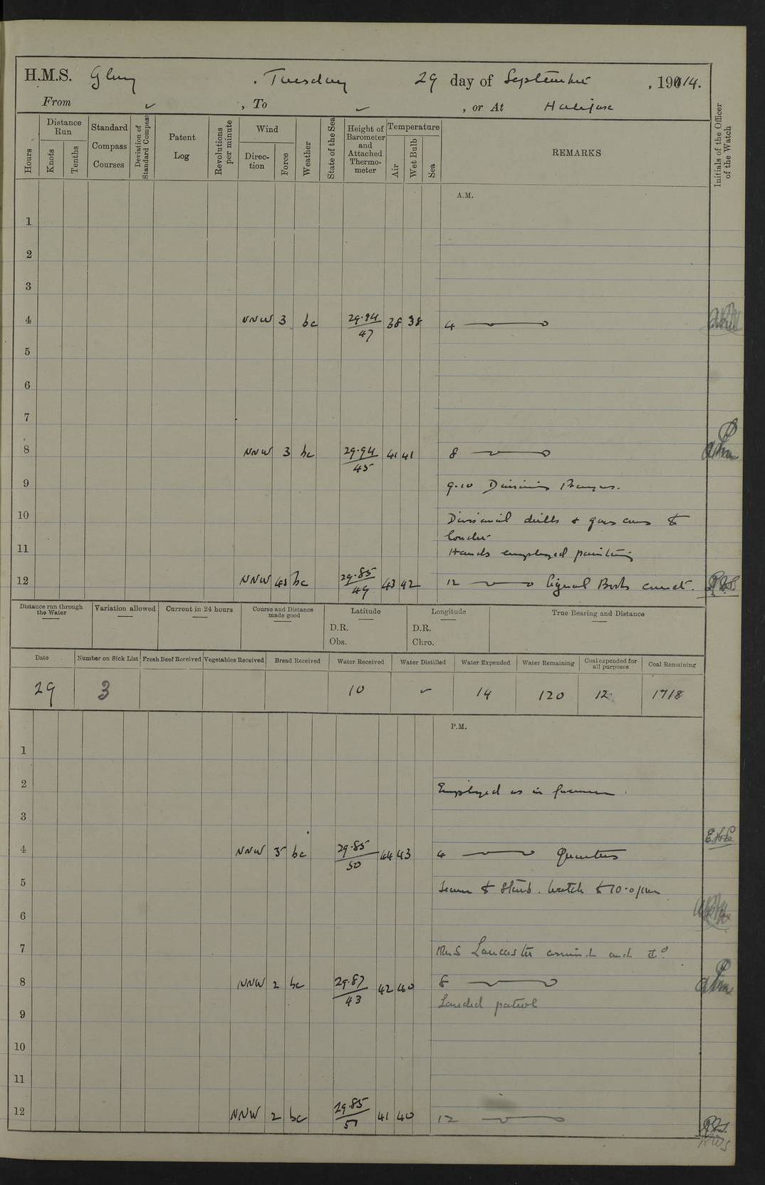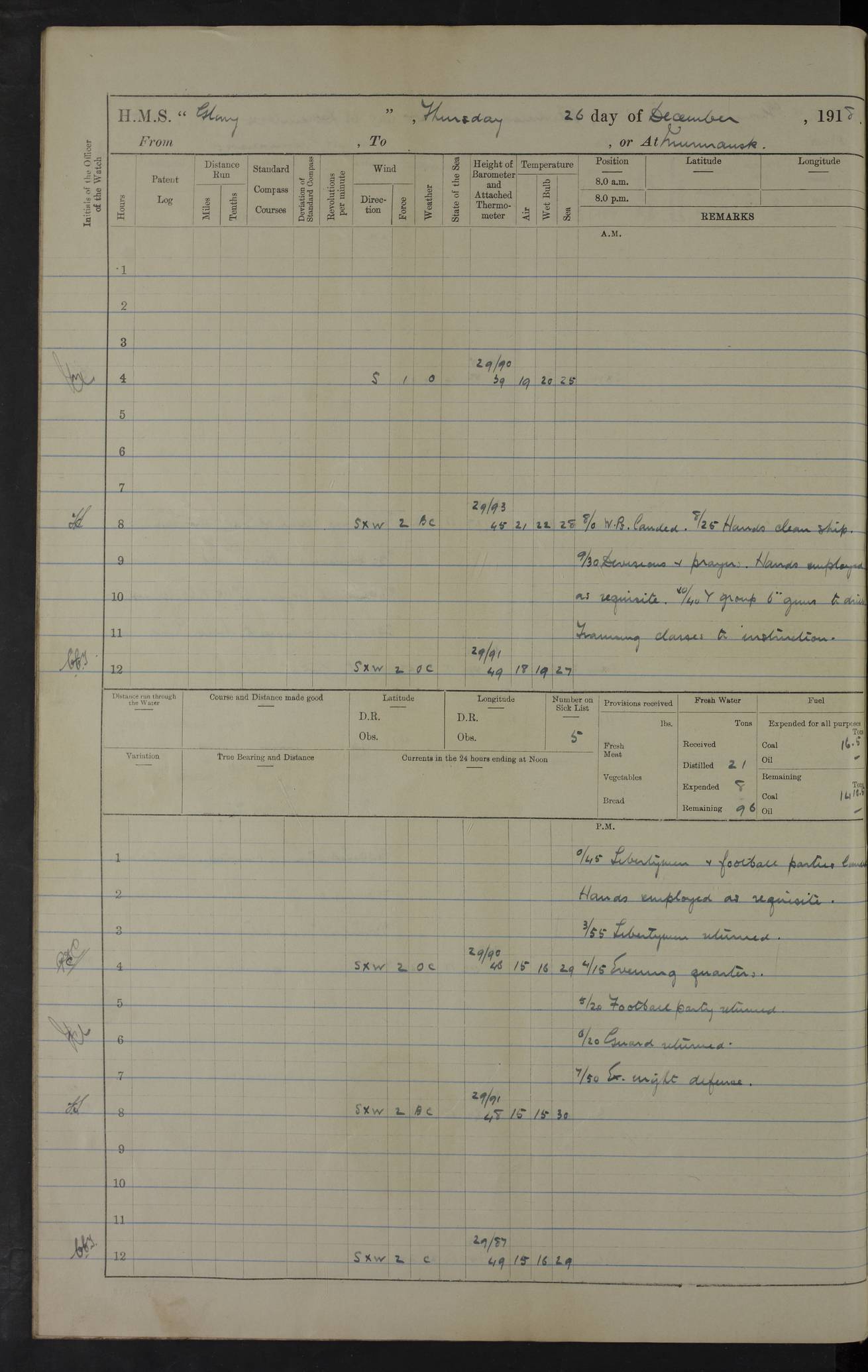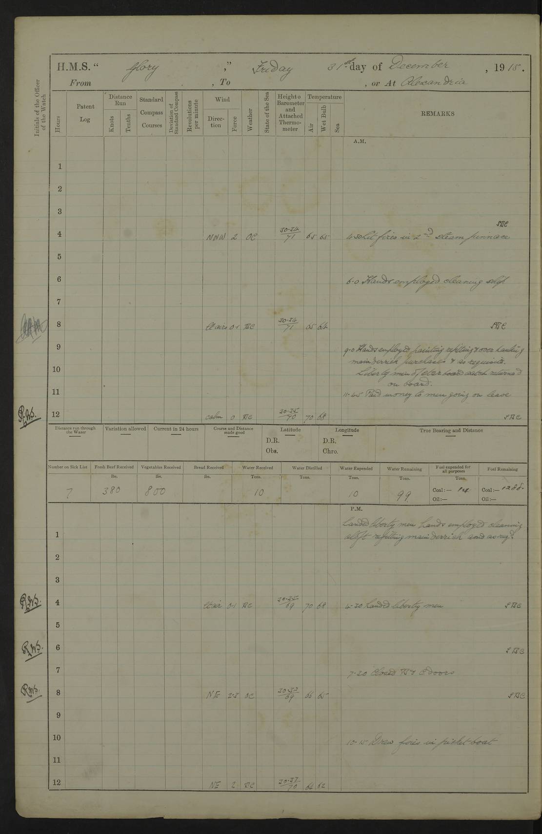 22 June 1915 At sea, Gibraltar to Lemnos Lat 36.1, Long -1.3 4.15am: Sighted land on starboard bow. 10.20am: Stopped port engine for repairs. 11.20am: proceeded with port engine. pm: a/c due to change in deviation. 10.00pm: Cape Tenez Light abeam, 18 miles. 4f73cd61a2fc8ea9030015f6: (https://s3.amazonaws.com:443/oldweather/ADM53-43015/0012_1.jpg) 23 June 1915 At sea, Gibraltar to Lemnos Lat 37.5, Long 4.8 Number on sick list: 4 5.00am: Secured from night defence stations. Placed anti-submarine guns. pm: Life saving appliances served out to men stationed in ? ?at abandon ship. 4f73cd61a2fc8ea9030015f7: (https://s3.amazonaws.com:443/oldweather/ADM53-43015/0013_0.jpg) 24 June 1915 At sea, Gibraltar to Lemnos Lat 37.4, Long 10.8 Position in log clearly bears no resemblance to the location of the ship. Position above is approximate and is based sighting of Zembra Island at 11.55am. 5.00am: Dispersed from night defence stations. Manned anti-submarine guns. am: Sighted two French torpedo boats. am: Torpedo boats passed to ~ No 362, 363. am: Sighted land on starboard beam. 11.55am: Zembra Island abeam, 25 miles. 2.00pm: Sighted Pantellaria S34ºE. 4.45pm: Pantellaria Light House abeam 12 miles. 4f73cd61a2fc8ea9030015f8: (https://s3.amazonaws.com:443/oldweather/ADM53-43015/0013_1.jpg) 25 June 1915 At sea, Gibraltar to Lemnos Lat 35.5, Long 16.7 2.10am: Gozo Light abeam 17 miles. 5.00am: Dispersed from night defence stations. Manned anti-submarine guns. 4f73cd61a2fc8ea9030015f9: (https://s3.amazonaws.com:443/oldweather/ADM53-43015/0014_0.jpg) 26 June 1915 At sea, Gibraltar to Lemnos Lat 35.5, Long 22.6 Number on sick list: 5 5.00am: Dispersed from night defence stations. Manned anti-submarine guns. am: Aired night clothing. am: marines at maxim practice on quarter deck. 2.00pm: Observed land on either bow. 3.00pm: Sighted French patrol destroyer. 4.15pm: Sighted French patrol destroyer. 9.40pm: Milo Peak N63ºW. 10.26pm: Polino Light abeam to port 5.5 miles. 4f73cd62a2fc8ea9030015fa: (https://s3.amazonaws.com:443/oldweather/ADM53-43015/0014_1.jpg) 27 June 1915 At sea and at Lemnos Lat 39.1, Long 24.4 From 0.50 to 3.05am sighting of multiple light houses. 3.50am: a/c to N39ºW and commenced to zig-zag. 5.00am: Dispersed from night defence stations and placed anti-submarine guns and look-outs. am: Lost overboard by accident Hazlewood fender, pat. 311, one in number. 10.30am: Held Divine Service onboard. pm: Met and signalled HMS Minerva on patrol duty. pm: Courses and speeds as requisite while waiting orders to approach Mudros. 3.00pm: Proceeded. 5.16pm: Increased to 90 revs, commenced to zig-zag. Course as requisite for Mudros. 7.00pm: Entered Mudros Bay. 7.47pm: Stopped. Let go port anchor in ‘M3’. 8.30pm: Darkened ship. pm: Manned one 6” and one 12 pdr. 4f73cd62a2fc8ea9030015fb: (https://s3.amazonaws.com:443/oldweather/ADM53-43015/0015_0.jpg) 28 June 1915 Mudros Bay, Lemnos Lat 39.89, Long 25.24 5,00am: HMS Vengeance entered harbour. HMS Vengeance was a pre-dreadnought of the Canopus class, launched in 1899 at Vickers, Barrow, and sold for scrapping in 1921. Details at http://en.wikipedia.org/wiki/HMS_Vengeance_(1899) . am/pm/: hands preparing for coaling and about ship’s work. pm: Collier Wabana secured alongside. 4f73cd62a2fc8ea9030015fc: (https://s3.amazonaws.com:443/oldweather/ADM53-43015/0015_1.jpg) 29 June 1915 Mudros Bay, Lemnos Lat 39.89, Long 25.24 5.15am: Commenced coaling. 2.00pm: Finished coaling. Collier left. 4f73cd62a2fc8ea9030015fd: (https://s3.amazonaws.com:443/oldweather/ADM53-43015/0016_0.jpg) 30 June 1915 Mudros Bay, Lemnos Lat 39.89, Long 25.24 am: Parties away sanding, and with fire engines onshore. am: Boats away disembarking troops. am: French Flagship Patrie sailed. The Patrie was a French pre-dreadnought, launched at La Seyne shipyard in 1903, and stricken in 1921. Details at http://en.wikipedia.org/wiki/French_battleship_Patrie . 6.30pm: Hands to bathe. 4f73cd63a2fc8ea9030015fe: (https://s3.amazonaws.com:443/oldweather/ADM53-43015/0016_1.jpg) 4f73cd63a2fc8ea9030015ff: (https://s3.amazonaws.com:443/oldweather/ADM53-43015/0017_0.jpg) 4f73cd63a2fc8ea903001600: (https://s3.amazonaws.com:443/oldweather/ADM53-43015/0017_1.jpg) 4f73cd63a2fc8ea903001601: (https://s3.amazonaws.com:443/oldweather/ADM53-43015/0018_0.jpg) 4f73cd64a2fc8ea903001602: (https://s3.amazonaws.com:443/oldweather/ADM53-43015/0018_1.jpg) LOGS FOR JULY 1915 From July to October 1915, HMS Glory spent her time at Port Mudros. Certain activities typically took place daily and are not generally noted in the pages below. These activities include: Lighting fires in the picket boat around 4am and drawing the fires in the late evening; Divisions at around 9–9.30am and Evening Quarters at 4pm; Darken ship at around 8.30pm; Daily ‘cleaning ship’, with variations thereof; SBC (for ‘Signal Books Correct’) at the watch changes. 4f73cd64a2fc8ea903001603: (https://s3.amazonaws.com:443/oldweather/ADM53-43016/0000_0.jpg) 4f73cd64a2fc8ea903001604: (https://s3.amazonaws.com:443/oldweather/ADM53-43016/0000_1.jpg) 4f73cd65a2fc8ea903001605: (https://s3.amazonaws.com:443/oldweather/ADM53-43016/0001_0.jpg) 4f73cd65a2fc8ea903001606: (https://s3.amazonaws.com:443/oldweather/ADM53-43016/0001_1.jpg) 1 July 1915 Port Mudros Lat 39.89, Long 25.24 6.30am: Landed working parties preparing boom defence ships. am: Discharged Acting Commander Rayne to Hector. Hector was a kite balloon ship. No further details readily available. 5.00pm: Tug T.10 made fast astern. 7.15pm: HMS Venerable went out. 7.30pm: HMS Chatham went out. HMS Chatham was a ‘Town’ cruiser and lead ship of her class. She was launched in 1911 at Chatham Dockyard and sold in 1926. Details at http://en.wikipedia.org/wiki/HMS_Chatham_(1911) . 4f73cd65a2fc8ea903001607: (https://s3.amazonaws.com:443/oldweather/ADM53-43016/0002_0.jpg) 2 July 1915 Port Mudros Lat 39.89, Long 25.24 5.35am: Landed working parties preparing boom defence ships. am/pm: Boom defence par