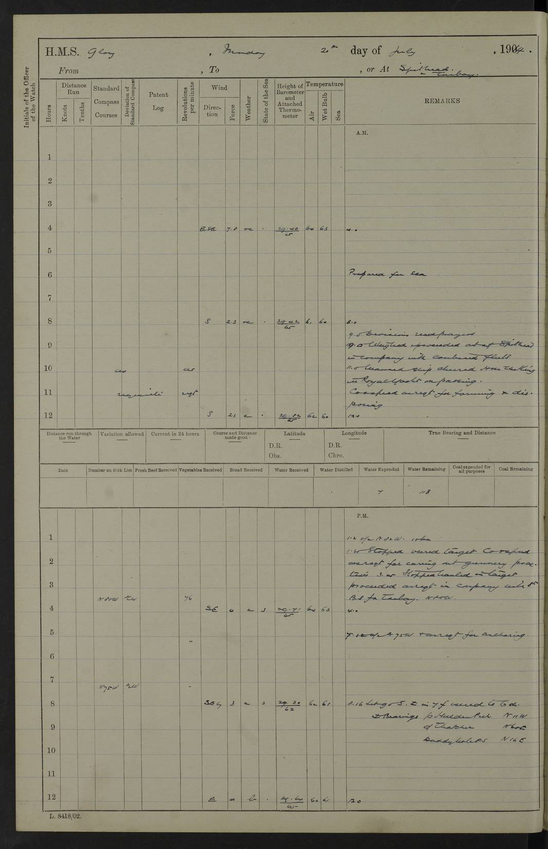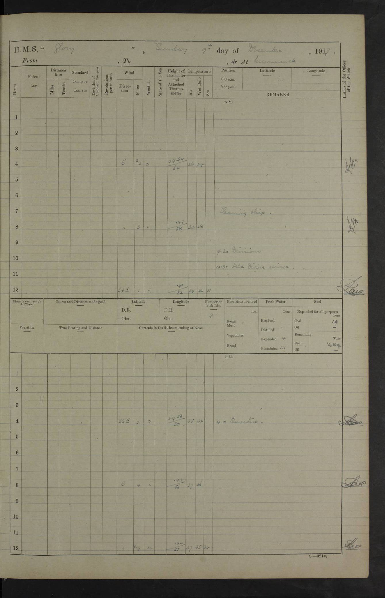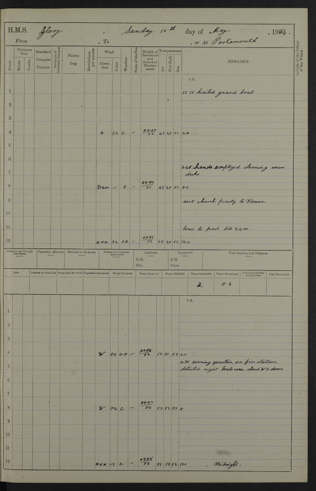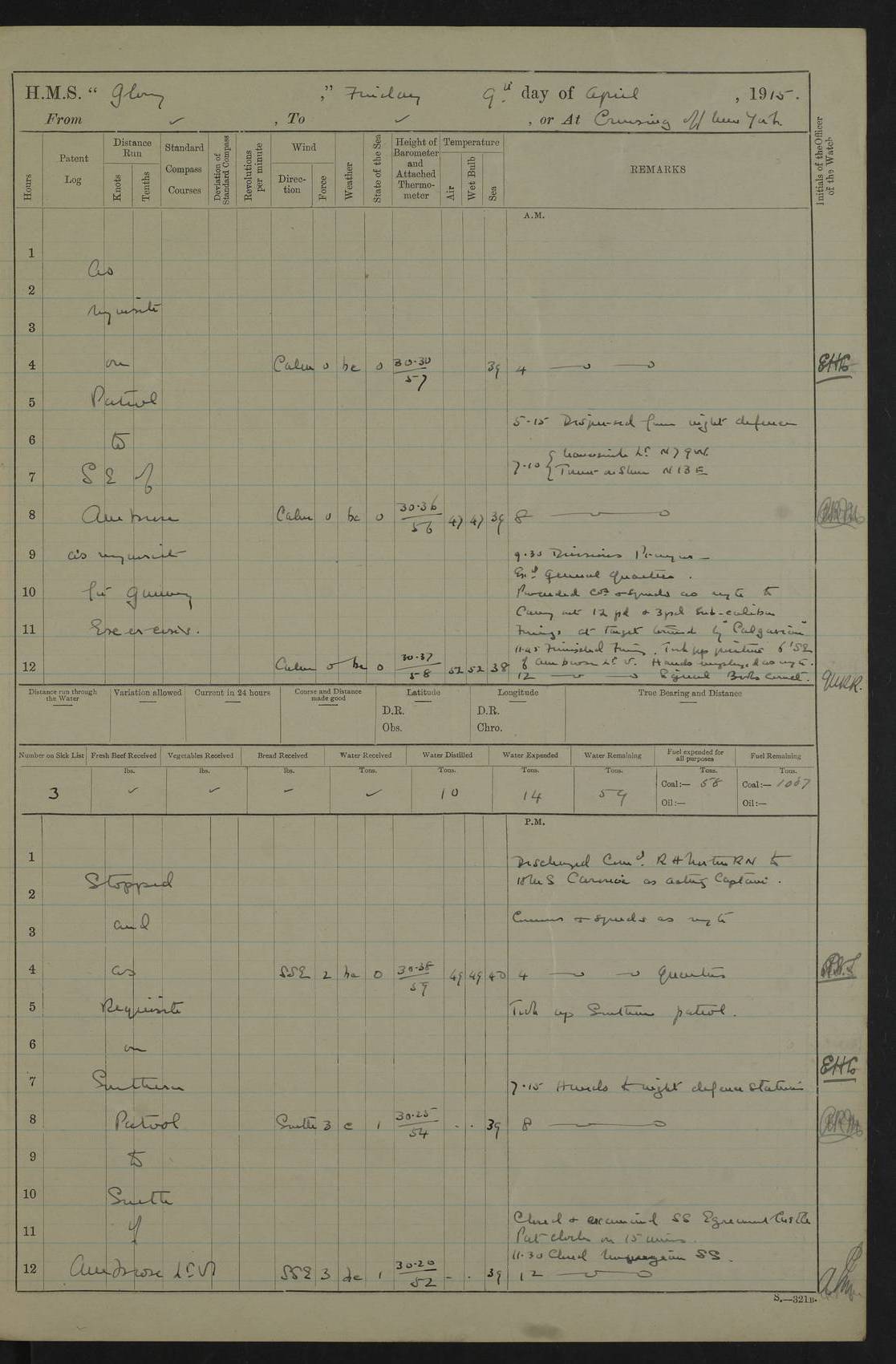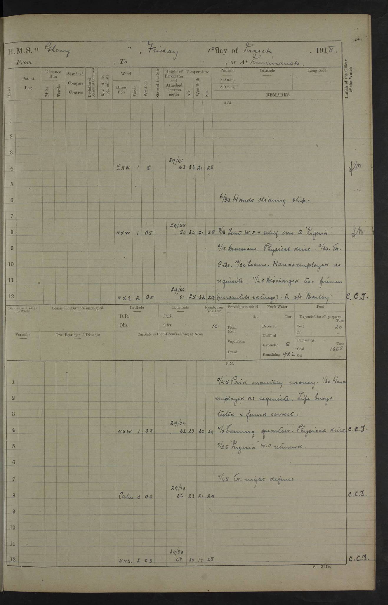 22 June 1915 At sea, Gibraltar to Lemnos Lat 36.1, Long -1.3 4.15am: Sighted land on starboard bow. 10.20am: Stopped port engine for repairs. 11.20am: proceeded with port engine. pm: a/c due to change in deviation. 10.00pm: Cape Tenez Light abeam, 18 miles. 4f73cd61a2fc8ea9030015f6: (https://s3.amazonaws.com:443/oldweather/ADM53-43015/0012_1.jpg) 23 June 1915 At sea, Gibraltar to Lemnos Lat 37.5, Long 4.8 Number on sick list: 4 5.00am: Secured from night defence stations. Placed anti-submarine guns. pm: Life saving appliances served out to men stationed in ? ?at abandon ship. 4f73cd61a2fc8ea9030015f7: (https://s3.amazonaws.com:443/oldweather/ADM53-43015/0013_0.jpg) 24 June 1915 At sea, Gibraltar to Lemnos Lat 37.4, Long 10.8 Position in log clearly bears no resemblance to the location of the ship. Position above is approximate and is based sighting of Zembra Island at 11.55am. 5.00am: Dispersed from night defence stations. Manned anti-submarine guns. am: Sighted two French torpedo boats. am: Torpedo boats passed to ~ No 362, 363. am: Sighted land on starboard beam. 11.55am: Zembra Island abeam, 25 miles. 2.00pm: Sighted Pantellaria S34ºE. 4.45pm: Pantellaria Light House abeam 12 miles. 4f73cd61a2fc8ea9030015f8: (https://s3.amazonaws.com:443/oldweather/ADM53-43015/0013_1.jpg) 25 June 1915 At sea, Gibraltar to Lemnos Lat 35.5, Long 16.7 2.10am: Gozo Light abeam 17 miles. 5.00am: Dispersed from night defence stations. Manned anti-submarine guns. 4f73cd61a2fc8ea9030015f9: (https://s3.amazonaws.com:443/oldweather/ADM53-43015/0014_0.jpg) 26 June 1915 At sea, Gibraltar to Lemnos Lat 35.5, Long 22.6 Number on sick list: 5 5.00am: Dispersed from night defence stations. Manned anti-submarine guns. am: Aired night clothing. am: marines at maxim practice on quarter deck. 2.00pm: Observed land on either bow. 3.00pm: Sighted French patrol destroyer. 4.15pm: Sighted French patrol destroyer. 9.40pm: Milo Peak N63ºW. 10.26pm: Polino Light abeam to port 5.5 miles. 4f73cd62a2fc8ea9030015fa: (https://s3.amazonaws.com:443/oldweather/ADM53-43015/0014_1.jpg) 27 June 1915 At sea and at Lemnos Lat 39.1, Long 24.4 From 0.50 to 3.05am sighting of multiple light houses. 3.50am: a/c to N39ºW and commenced to zig-zag. 5.00am: Dispersed from night defence stations and placed anti-submarine guns and look-outs. am: Lost overboard by accident Hazlewood fender, pat. 311, one in number. 10.30am: Held Divine Service onboard. pm: Met and signalled HMS Minerva on patrol duty. pm: Courses and speeds as requisite while waiting orders to approach Mudros. 3.00pm: Proceeded. 5.16pm: Increased to 90 revs, commenced to zig-zag. Course as requisite for Mudros. 7.00pm: Entered Mudros Bay. 7.47pm: Stopped. Let go port anchor in ‘M3’. 8.30pm: Darkened ship. pm: Manned one 6” and one 12 pdr. 4f73cd62a2fc8ea9030015fb: (https://s3.amazonaws.com:443/oldweather/ADM53-43015/0015_0.jpg) 28 June 1915 Mudros Bay, Lemnos Lat 39.89, Long 25.24 5,00am: HMS Vengeance entered harbour. HMS Vengeance was a pre-dreadnought of the Canopus class, launched in 1899 at Vickers, Barrow, and sold for scrapping in 1921. Details at http://en.wikipedia.org/wiki/HMS_Vengeance_(1899) . am/pm/: hands preparing for coaling and about ship’s work. pm: Collier Wabana secured alongside. 4f73cd62a2fc8ea9030015fc: (https://s3.amazonaws.com:443/oldweather/ADM53-43015/0015_1.jpg) 29 June 1915 Mudros Bay, Lemnos Lat 39.89, Long 25.24 5.15am: Commenced coaling. 2.00pm: Finished coaling. Collier left. 4f73cd62a2fc8ea9030015fd: (https://s3.amazonaws.com:443/oldweather/ADM53-43015/0016_0.jpg) 30 June 1915 Mudros Bay, Lemnos Lat 39.89, Long 25.24 am: Parties away sanding, and with fire engines onshore. am: Boats away disembarking troops. am: French Flagship Patrie sailed. The Patrie was a French pre-dreadnought, launched at La Seyne shipyard in 1903, and stricken in 1921. Details at http://en.wikipedia.org/wiki/French_battleship_Patrie . 6.30pm: Hands to bathe. 4f73cd63a2fc8ea9030015fe: (https://s3.amazonaws.com:443/oldweather/ADM53-43015/0016_1.jpg) 4f73cd63a2fc8ea9030015ff: (https://s3.amazonaws.com:443/oldweather/ADM53-43015/0017_0.jpg) 4f73cd63a2fc8ea903001600: (https://s3.amazonaws.com:443/oldweather/ADM53-43015/0017_1.jpg) 4f73cd63a2fc8ea903001601: (https://s3.amazonaws.com:443/oldweather/ADM53-43015/0018_0.jpg) 4f73cd64a2fc8ea903001602: (https://s3.amazonaws.com:443/oldweather/ADM53-43015/0018_1.jpg) LOGS FOR JULY 1915 From July to October 1915, HMS Glory spent her time at Port Mudros. Certain activities typically took place daily and are not generally noted in the pages below. These activities include: Lighting fires in the picket boat around 4am and drawing the fires in the late evening; Divisions at around 9–9.30am and Evening Quarters at 4pm; Darken ship at around 8.30pm; Daily ‘cleaning ship’, with variations thereof; SBC (for ‘Signal Books Correct’) at the watch changes. 4f73cd64a2fc8ea903001603: (https://s3.amazonaws.com:443/oldweather/ADM53-43016/0000_0.jpg) 4f73cd64a2fc8ea903001604: (https://s3.amazonaws.com:443/oldweather/ADM53-43016/0000_1.jpg) 4f73cd65a2fc8ea903001605: (https://s3.amazonaws.com:443/oldweather/ADM53-43016/0001_0.jpg) 4f73cd65a2fc8ea903001606: (https://s3.amazonaws.com:443/oldweather/ADM53-43016/0001_1.jpg) 1 July 1915 Port Mudros Lat 39.89, Long 25.24 6.30am: Landed working parties preparing boom defence ships. am: Discharged Acting Commander Rayne to Hector. Hector was a kite balloon ship. No further details readily available. 5.00pm: Tug T.10 made fast astern. 7.15pm: HMS Venerable went out. 7.30pm: HMS Chatham went out. HMS Chatham was a ‘Town’ cruiser and lead ship of her class. She was launched in 1911 at Chatham Dockyard and sold in 1926. Details at http://en.wikipedia.org/wiki/HMS_Chatham_(1911) . 4f73cd65a2fc8ea903001607: (https://s3.amazonaws.com:443/oldweather/ADM53-43016/0002_0.jpg) 2 July 1915 Port Mudros Lat 39.89, Long 25.24 5.35am: Landed working parties preparing boom defence ships. am/pm: Boom defence par