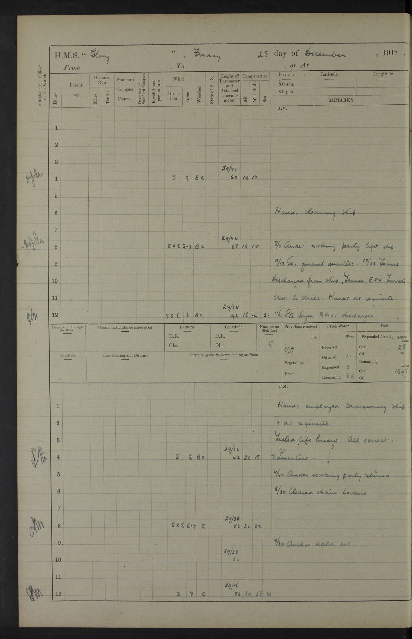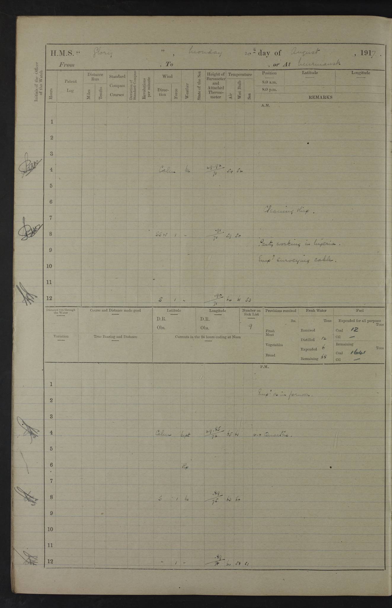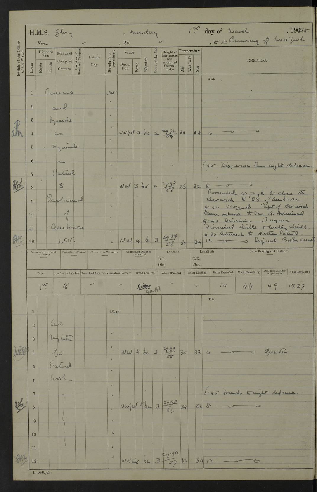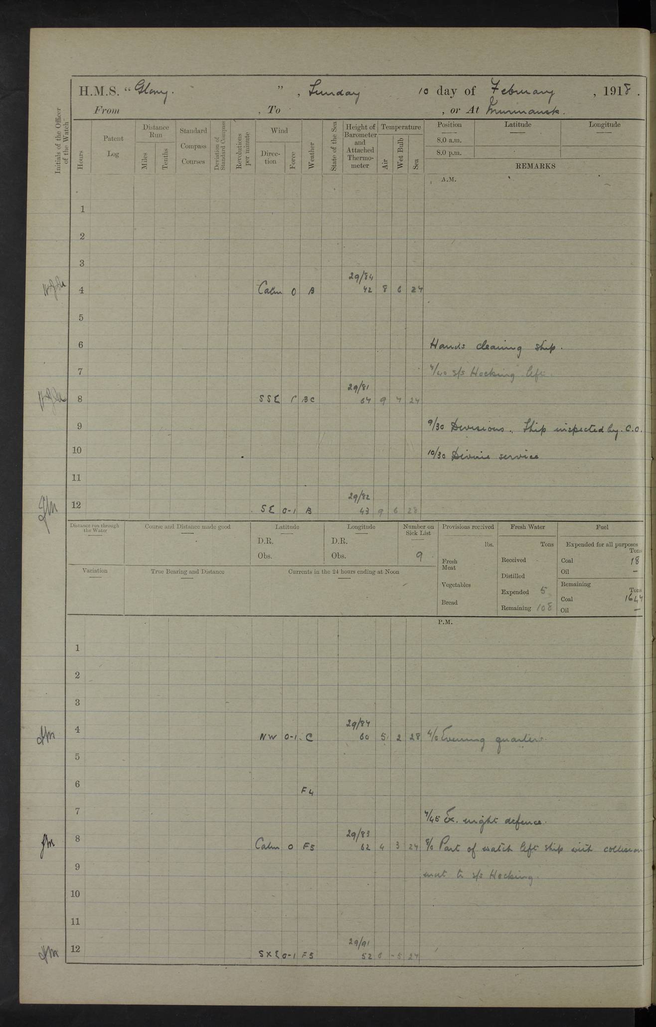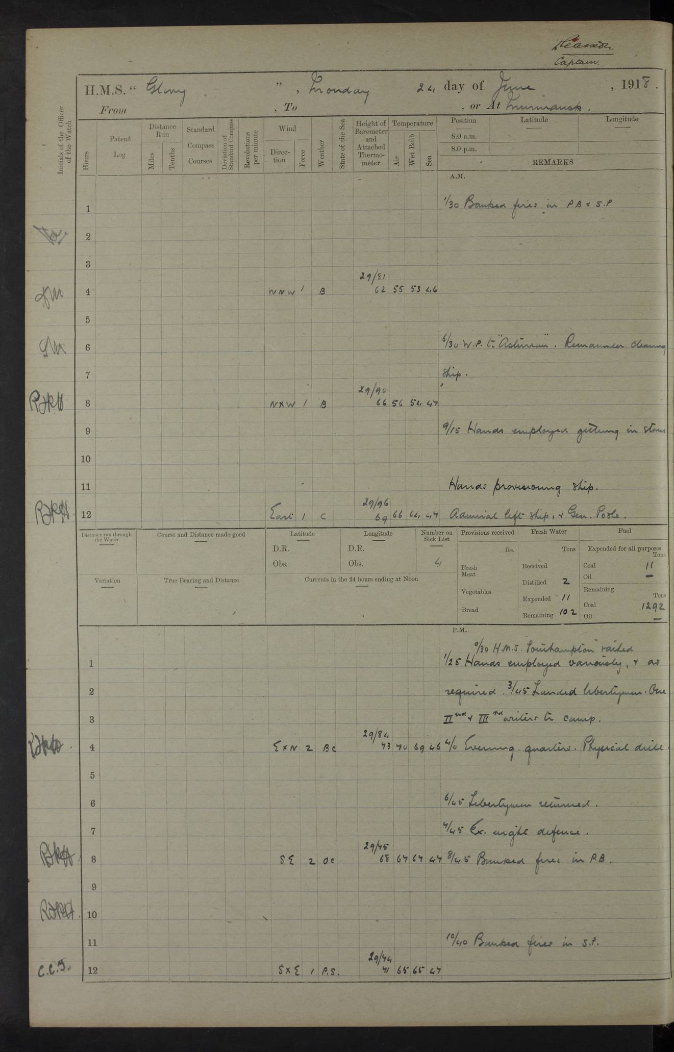 22 June 1915 At sea, Gibraltar to Lemnos Lat 36.1, Long -1.3 4.15am: Sighted land on starboard bow. 10.20am: Stopped port engine for repairs. 11.20am: proceeded with port engine. pm: a/c due to change in deviation. 10.00pm: Cape Tenez Light abeam, 18 miles. 4f73cd61a2fc8ea9030015f6: (https://s3.amazonaws.com:443/oldweather/ADM53-43015/0012_1.jpg) 23 June 1915 At sea, Gibraltar to Lemnos Lat 37.5, Long 4.8 Number on sick list: 4 5.00am: Secured from night defence stations. Placed anti-submarine guns. pm: Life saving appliances served out to men stationed in ? ?at abandon ship. 4f73cd61a2fc8ea9030015f7: (https://s3.amazonaws.com:443/oldweather/ADM53-43015/0013_0.jpg) 24 June 1915 At sea, Gibraltar to Lemnos Lat 37.4, Long 10.8 Position in log clearly bears no resemblance to the location of the ship. Position above is approximate and is based sighting of Zembra Island at 11.55am. 5.00am: Dispersed from night defence stations. Manned anti-submarine guns. am: Sighted two French torpedo boats. am: Torpedo boats passed to ~ No 362, 363. am: Sighted land on starboard beam. 11.55am: Zembra Island abeam, 25 miles. 2.00pm: Sighted Pantellaria S34ºE. 4.45pm: Pantellaria Light House abeam 12 miles. 4f73cd61a2fc8ea9030015f8: (https://s3.amazonaws.com:443/oldweather/ADM53-43015/0013_1.jpg) 25 June 1915 At sea, Gibraltar to Lemnos Lat 35.5, Long 16.7 2.10am: Gozo Light abeam 17 miles. 5.00am: Dispersed from night defence stations. Manned anti-submarine guns. 4f73cd61a2fc8ea9030015f9: (https://s3.amazonaws.com:443/oldweather/ADM53-43015/0014_0.jpg) 26 June 1915 At sea, Gibraltar to Lemnos Lat 35.5, Long 22.6 Number on sick list: 5 5.00am: Dispersed from night defence stations. Manned anti-submarine guns. am: Aired night clothing. am: marines at maxim practice on quarter deck. 2.00pm: Observed land on either bow. 3.00pm: Sighted French patrol destroyer. 4.15pm: Sighted French patrol destroyer. 9.40pm: Milo Peak N63ºW. 10.26pm: Polino Light abeam to port 5.5 miles. 4f73cd62a2fc8ea9030015fa: (https://s3.amazonaws.com:443/oldweather/ADM53-43015/0014_1.jpg) 27 June 1915 At sea and at Lemnos Lat 39.1, Long 24.4 From 0.50 to 3.05am sighting of multiple light houses. 3.50am: a/c to N39ºW and commenced to zig-zag. 5.00am: Dispersed from night defence stations and placed anti-submarine guns and look-outs. am: Lost overboard by accident Hazlewood fender, pat. 311, one in number. 10.30am: Held Divine Service onboard. pm: Met and signalled HMS Minerva on patrol duty. pm: Courses and speeds as requisite while waiting orders to approach Mudros. 3.00pm: Proceeded. 5.16pm: Increased to 90 revs, commenced to zig-zag. Course as requisite for Mudros. 7.00pm: Entered Mudros Bay. 7.47pm: Stopped. Let go port anchor in ‘M3’. 8.30pm: Darkened ship. pm: Manned one 6” and one 12 pdr. 4f73cd62a2fc8ea9030015fb: (https://s3.amazonaws.com:443/oldweather/ADM53-43015/0015_0.jpg) 28 June 1915 Mudros Bay, Lemnos Lat 39.89, Long 25.24 5,00am: HMS Vengeance entered harbour. HMS Vengeance was a pre-dreadnought of the Canopus class, launched in 1899 at Vickers, Barrow, and sold for scrapping in 1921. Details at http://en.wikipedia.org/wiki/HMS_Vengeance_(1899) . am/pm/: hands preparing for coaling and about ship’s work. pm: Collier Wabana secured alongside. 4f73cd62a2fc8ea9030015fc: (https://s3.amazonaws.com:443/oldweather/ADM53-43015/0015_1.jpg) 29 June 1915 Mudros Bay, Lemnos Lat 39.89, Long 25.24 5.15am: Commenced coaling. 2.00pm: Finished coaling. Collier left. 4f73cd62a2fc8ea9030015fd: (https://s3.amazonaws.com:443/oldweather/ADM53-43015/0016_0.jpg) 30 June 1915 Mudros Bay, Lemnos Lat 39.89, Long 25.24 am: Parties away sanding, and with fire engines onshore. am: Boats away disembarking troops. am: French Flagship Patrie sailed. The Patrie was a French pre-dreadnought, launched at La Seyne shipyard in 1903, and stricken in 1921. Details at http://en.wikipedia.org/wiki/French_battleship_Patrie . 6.30pm: Hands to bathe. 4f73cd63a2fc8ea9030015fe: (https://s3.amazonaws.com:443/oldweather/ADM53-43015/0016_1.jpg) 4f73cd63a2fc8ea9030015ff: (https://s3.amazonaws.com:443/oldweather/ADM53-43015/0017_0.jpg) 4f73cd63a2fc8ea903001600: (https://s3.amazonaws.com:443/oldweather/ADM53-43015/0017_1.jpg) 4f73cd63a2fc8ea903001601: (https://s3.amazonaws.com:443/oldweather/ADM53-43015/0018_0.jpg) 4f73cd64a2fc8ea903001602: (https://s3.amazonaws.com:443/oldweather/ADM53-43015/0018_1.jpg) LOGS FOR JULY 1915 From July to October 1915, HMS Glory spent her time at Port Mudros. Certain activities typically took place daily and are not generally noted in the pages below. These activities include: Lighting fires in the picket boat around 4am and drawing the fires in the late evening; Divisions at around 9–9.30am and Evening Quarters at 4pm; Darken ship at around 8.30pm; Daily ‘cleaning ship’, with variations thereof; SBC (for ‘Signal Books Correct’) at the watch changes. 4f73cd64a2fc8ea903001603: (https://s3.amazonaws.com:443/oldweather/ADM53-43016/0000_0.jpg) 4f73cd64a2fc8ea903001604: (https://s3.amazonaws.com:443/oldweather/ADM53-43016/0000_1.jpg) 4f73cd65a2fc8ea903001605: (https://s3.amazonaws.com:443/oldweather/ADM53-43016/0001_0.jpg) 4f73cd65a2fc8ea903001606: (https://s3.amazonaws.com:443/oldweather/ADM53-43016/0001_1.jpg) 1 July 1915 Port Mudros Lat 39.89, Long 25.24 6.30am: Landed working parties preparing boom defence ships. am: Discharged Acting Commander Rayne to Hector. Hector was a kite balloon ship. No further details readily available. 5.00pm: Tug T.10 made fast astern. 7.15pm: HMS Venerable went out. 7.30pm: HMS Chatham went out. HMS Chatham was a ‘Town’ cruiser and lead ship of her class. She was launched in 1911 at Chatham Dockyard and sold in 1926. Details at http://en.wikipedia.org/wiki/HMS_Chatham_(1911) . 4f73cd65a2fc8ea903001607: (https://s3.amazonaws.com:443/oldweather/ADM53-43016/0002_0.jpg) 2 July 1915 Port Mudros Lat 39.89, Long 25.24 5.35am: Landed working parties preparing boom defence ships. am/pm: Boom defence par