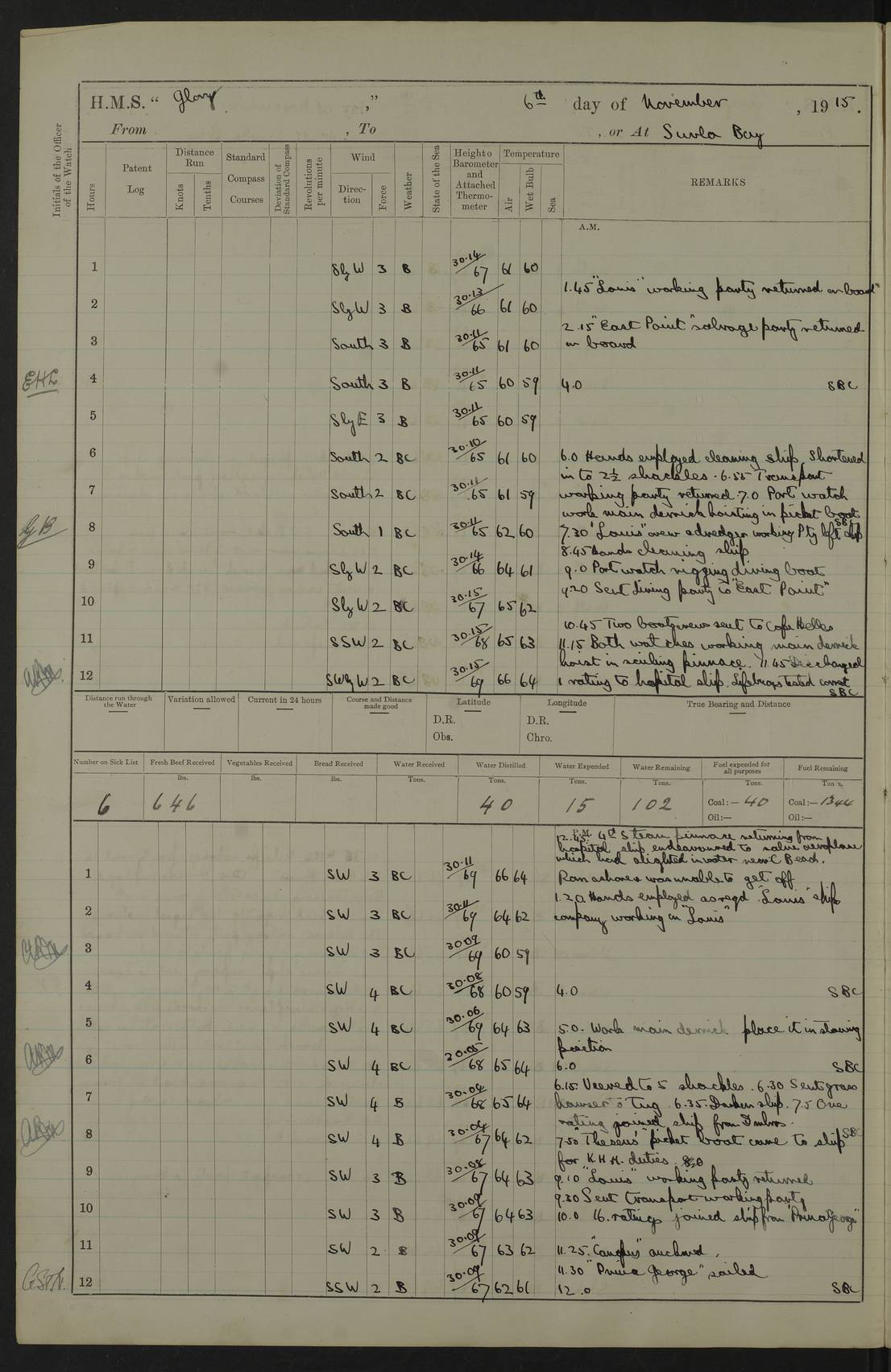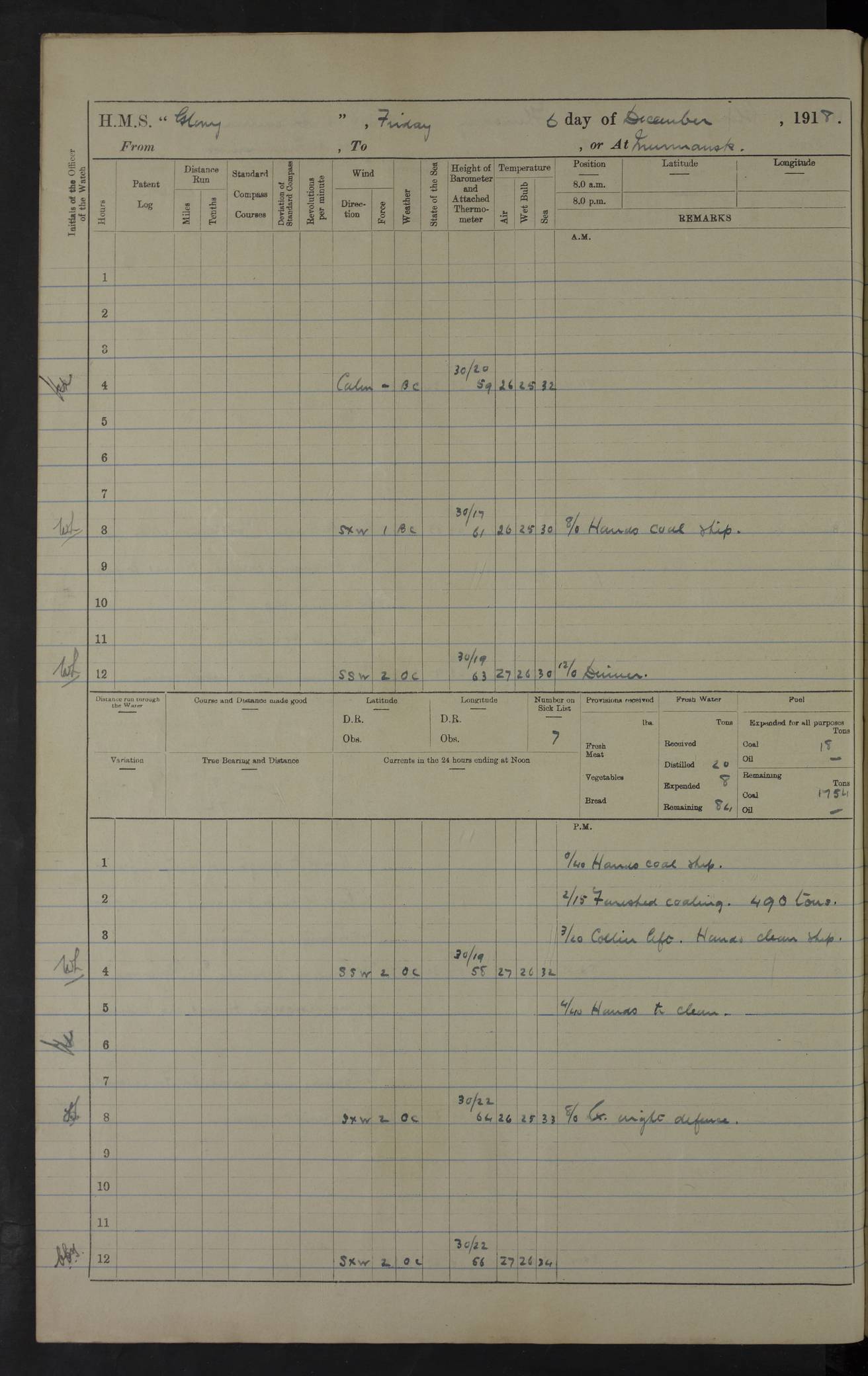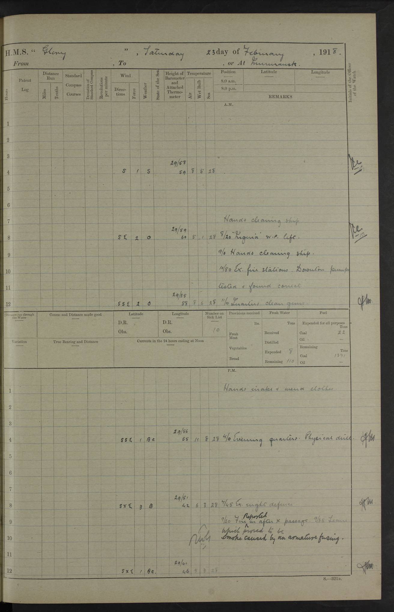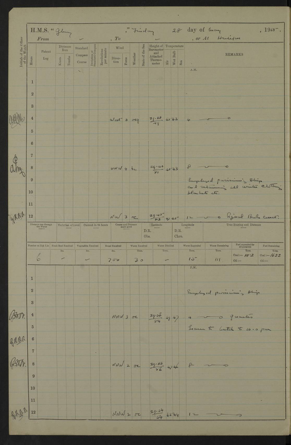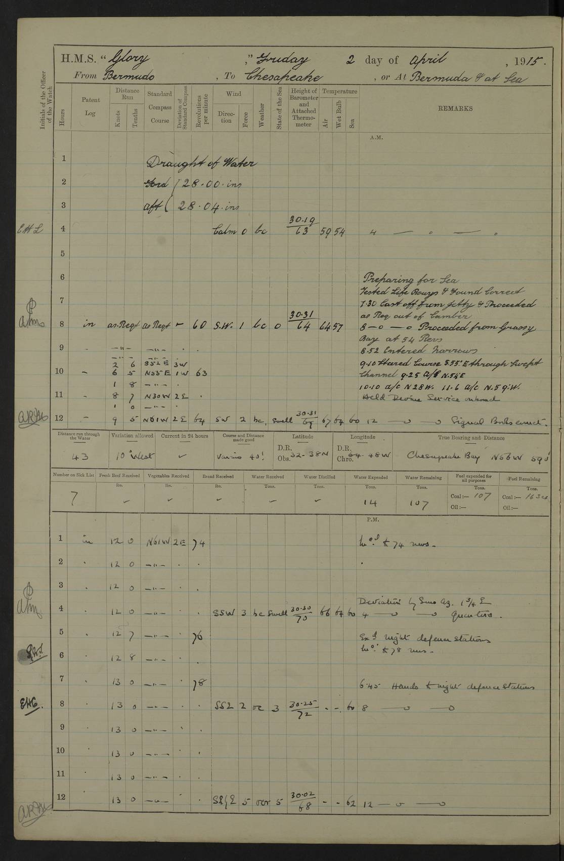 22 June 1915 At sea, Gibraltar to Lemnos Lat 36.1, Long -1.3 4.15am: Sighted land on starboard bow. 10.20am: Stopped port engine for repairs. 11.20am: proceeded with port engine. pm: a/c due to change in deviation. 10.00pm: Cape Tenez Light abeam, 18 miles. 4f73cd61a2fc8ea9030015f6: (https://s3.amazonaws.com:443/oldweather/ADM53-43015/0012_1.jpg) 23 June 1915 At sea, Gibraltar to Lemnos Lat 37.5, Long 4.8 Number on sick list: 4 5.00am: Secured from night defence stations. Placed anti-submarine guns. pm: Life saving appliances served out to men stationed in ? ?at abandon ship. 4f73cd61a2fc8ea9030015f7: (https://s3.amazonaws.com:443/oldweather/ADM53-43015/0013_0.jpg) 24 June 1915 At sea, Gibraltar to Lemnos Lat 37.4, Long 10.8 Position in log clearly bears no resemblance to the location of the ship. Position above is approximate and is based sighting of Zembra Island at 11.55am. 5.00am: Dispersed from night defence stations. Manned anti-submarine guns. am: Sighted two French torpedo boats. am: Torpedo boats passed to ~ No 362, 363. am: Sighted land on starboard beam. 11.55am: Zembra Island abeam, 25 miles. 2.00pm: Sighted Pantellaria S34ºE. 4.45pm: Pantellaria Light House abeam 12 miles. 4f73cd61a2fc8ea9030015f8: (https://s3.amazonaws.com:443/oldweather/ADM53-43015/0013_1.jpg) 25 June 1915 At sea, Gibraltar to Lemnos Lat 35.5, Long 16.7 2.10am: Gozo Light abeam 17 miles. 5.00am: Dispersed from night defence stations. Manned anti-submarine guns. 4f73cd61a2fc8ea9030015f9: (https://s3.amazonaws.com:443/oldweather/ADM53-43015/0014_0.jpg) 26 June 1915 At sea, Gibraltar to Lemnos Lat 35.5, Long 22.6 Number on sick list: 5 5.00am: Dispersed from night defence stations. Manned anti-submarine guns. am: Aired night clothing. am: marines at maxim practice on quarter deck. 2.00pm: Observed land on either bow. 3.00pm: Sighted French patrol destroyer. 4.15pm: Sighted French patrol destroyer. 9.40pm: Milo Peak N63ºW. 10.26pm: Polino Light abeam to port 5.5 miles. 4f73cd62a2fc8ea9030015fa: (https://s3.amazonaws.com:443/oldweather/ADM53-43015/0014_1.jpg) 27 June 1915 At sea and at Lemnos Lat 39.1, Long 24.4 From 0.50 to 3.05am sighting of multiple light houses. 3.50am: a/c to N39ºW and commenced to zig-zag. 5.00am: Dispersed from night defence stations and placed anti-submarine guns and look-outs. am: Lost overboard by accident Hazlewood fender, pat. 311, one in number. 10.30am: Held Divine Service onboard. pm: Met and signalled HMS Minerva on patrol duty. pm: Courses and speeds as requisite while waiting orders to approach Mudros. 3.00pm: Proceeded. 5.16pm: Increased to 90 revs, commenced to zig-zag. Course as requisite for Mudros. 7.00pm: Entered Mudros Bay. 7.47pm: Stopped. Let go port anchor in ‘M3’. 8.30pm: Darkened ship. pm: Manned one 6” and one 12 pdr. 4f73cd62a2fc8ea9030015fb: (https://s3.amazonaws.com:443/oldweather/ADM53-43015/0015_0.jpg) 28 June 1915 Mudros Bay, Lemnos Lat 39.89, Long 25.24 5,00am: HMS Vengeance entered harbour. HMS Vengeance was a pre-dreadnought of the Canopus class, launched in 1899 at Vickers, Barrow, and sold for scrapping in 1921. Details at http://en.wikipedia.org/wiki/HMS_Vengeance_(1899) . am/pm/: hands preparing for coaling and about ship’s work. pm: Collier Wabana secured alongside. 4f73cd62a2fc8ea9030015fc: (https://s3.amazonaws.com:443/oldweather/ADM53-43015/0015_1.jpg) 29 June 1915 Mudros Bay, Lemnos Lat 39.89, Long 25.24 5.15am: Commenced coaling. 2.00pm: Finished coaling. Collier left. 4f73cd62a2fc8ea9030015fd: (https://s3.amazonaws.com:443/oldweather/ADM53-43015/0016_0.jpg) 30 June 1915 Mudros Bay, Lemnos Lat 39.89, Long 25.24 am: Parties away sanding, and with fire engines onshore. am: Boats away disembarking troops. am: French Flagship Patrie sailed. The Patrie was a French pre-dreadnought, launched at La Seyne shipyard in 1903, and stricken in 1921. Details at http://en.wikipedia.org/wiki/French_battleship_Patrie . 6.30pm: Hands to bathe. 4f73cd63a2fc8ea9030015fe: (https://s3.amazonaws.com:443/oldweather/ADM53-43015/0016_1.jpg) 4f73cd63a2fc8ea9030015ff: (https://s3.amazonaws.com:443/oldweather/ADM53-43015/0017_0.jpg) 4f73cd63a2fc8ea903001600: (https://s3.amazonaws.com:443/oldweather/ADM53-43015/0017_1.jpg) 4f73cd63a2fc8ea903001601: (https://s3.amazonaws.com:443/oldweather/ADM53-43015/0018_0.jpg) 4f73cd64a2fc8ea903001602: (https://s3.amazonaws.com:443/oldweather/ADM53-43015/0018_1.jpg) LOGS FOR JULY 1915 From July to October 1915, HMS Glory spent her time at Port Mudros. Certain activities typically took place daily and are not generally noted in the pages below. These activities include: Lighting fires in the picket boat around 4am and drawing the fires in the late evening; Divisions at around 9–9.30am and Evening Quarters at 4pm; Darken ship at around 8.30pm; Daily ‘cleaning ship’, with variations thereof; SBC (for ‘Signal Books Correct’) at the watch changes. 4f73cd64a2fc8ea903001603: (https://s3.amazonaws.com:443/oldweather/ADM53-43016/0000_0.jpg) 4f73cd64a2fc8ea903001604: (https://s3.amazonaws.com:443/oldweather/ADM53-43016/0000_1.jpg) 4f73cd65a2fc8ea903001605: (https://s3.amazonaws.com:443/oldweather/ADM53-43016/0001_0.jpg) 4f73cd65a2fc8ea903001606: (https://s3.amazonaws.com:443/oldweather/ADM53-43016/0001_1.jpg) 1 July 1915 Port Mudros Lat 39.89, Long 25.24 6.30am: Landed working parties preparing boom defence ships. am: Discharged Acting Commander Rayne to Hector. Hector was a kite balloon ship. No further details readily available. 5.00pm: Tug T.10 made fast astern. 7.15pm: HMS Venerable went out. 7.30pm: HMS Chatham went out. HMS Chatham was a ‘Town’ cruiser and lead ship of her class. She was launched in 1911 at Chatham Dockyard and sold in 1926. Details at http://en.wikipedia.org/wiki/HMS_Chatham_(1911) . 4f73cd65a2fc8ea903001607: (https://s3.amazonaws.com:443/oldweather/ADM53-43016/0002_0.jpg) 2 July 1915 Port Mudros Lat 39.89, Long 25.24 5.35am: Landed working parties preparing boom defence ships. am/pm: Boom defence par