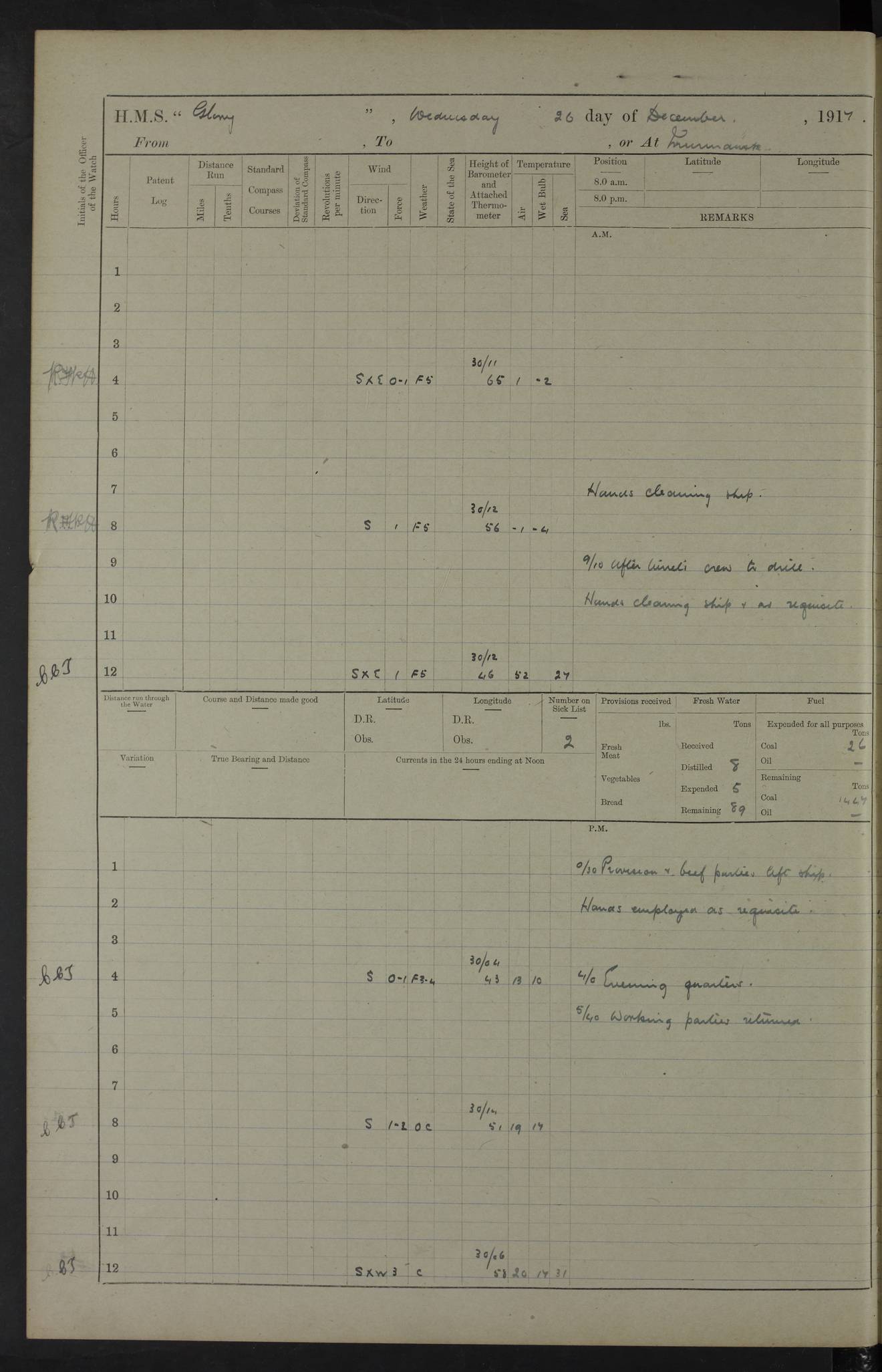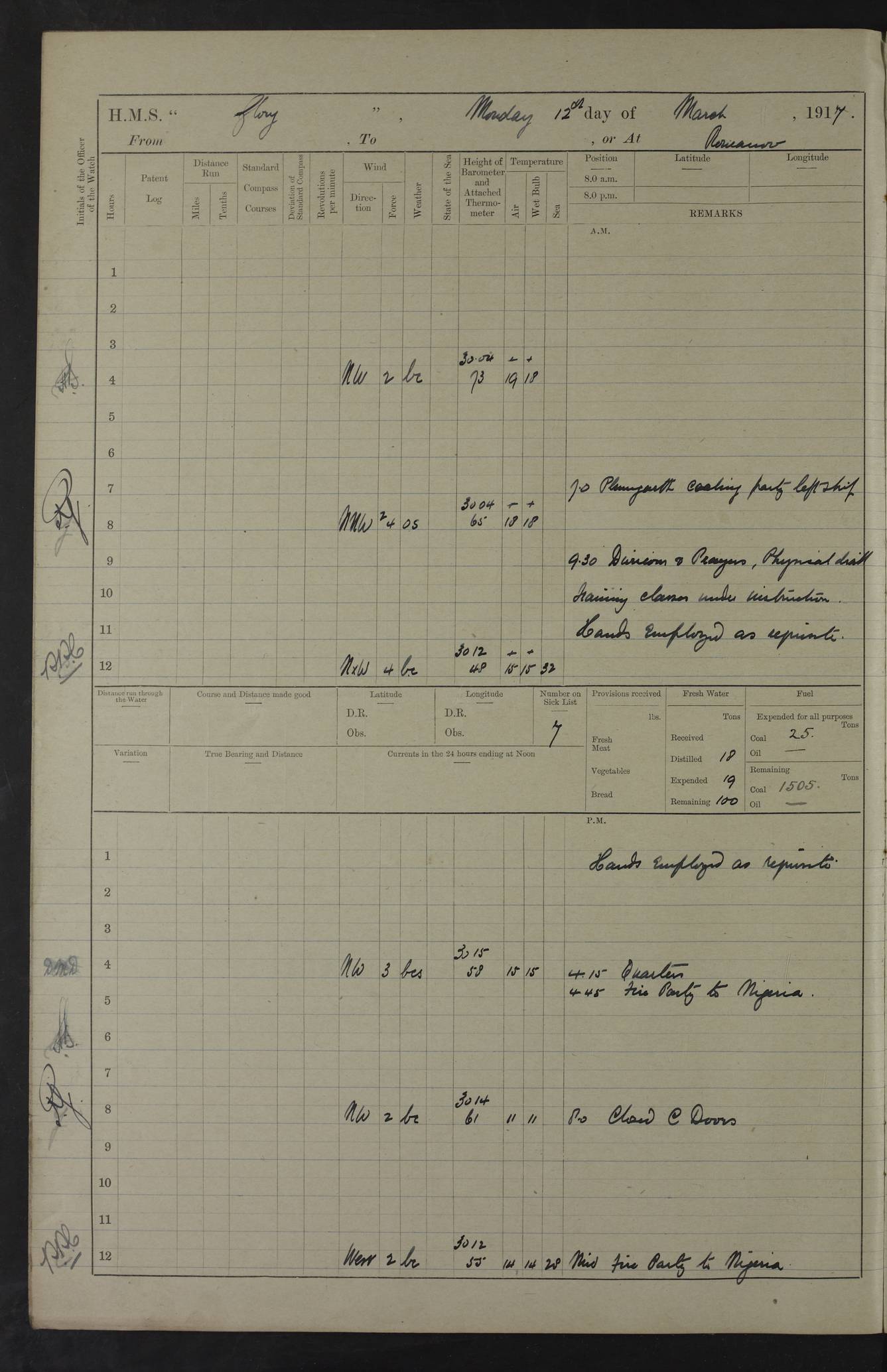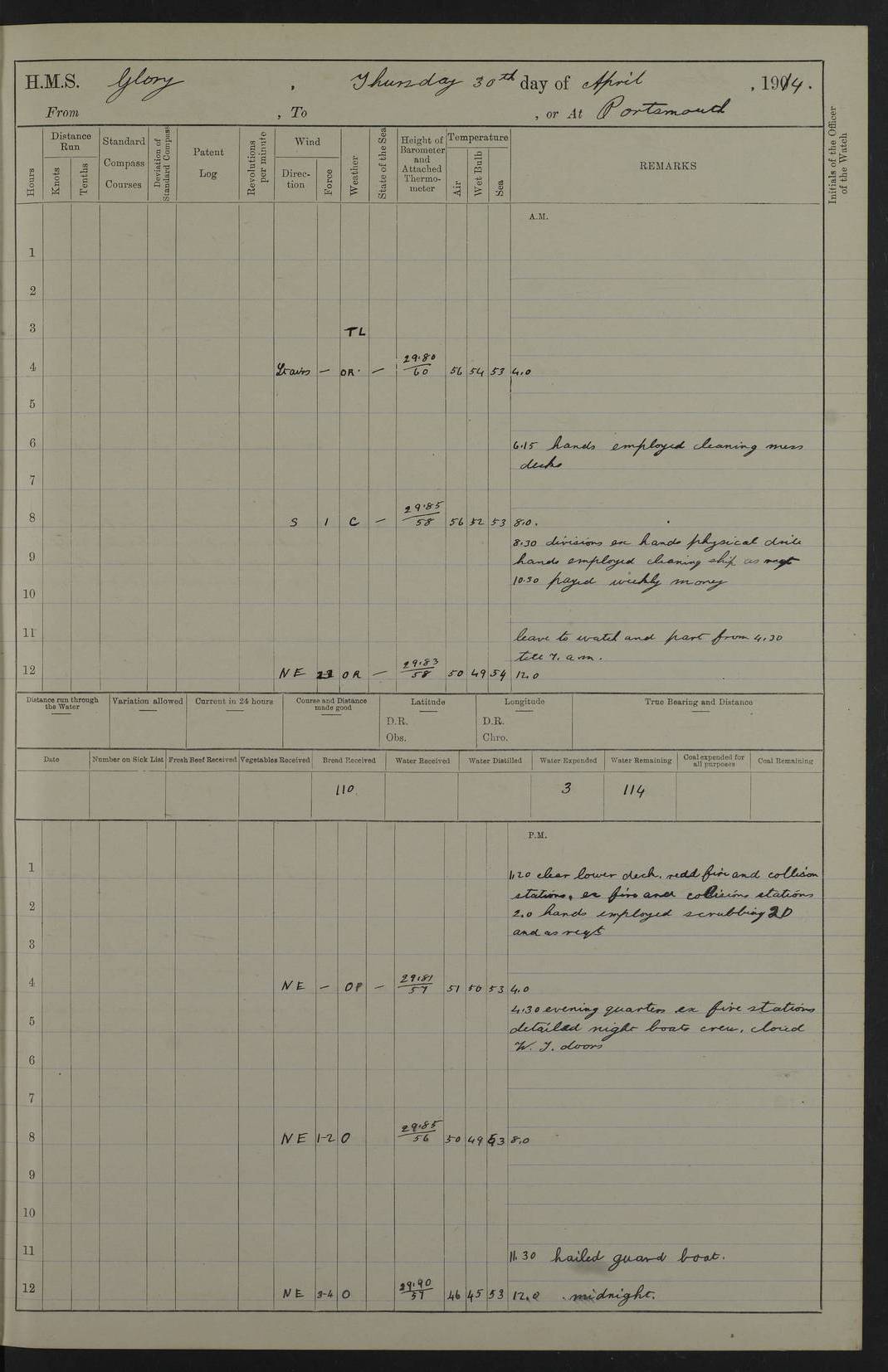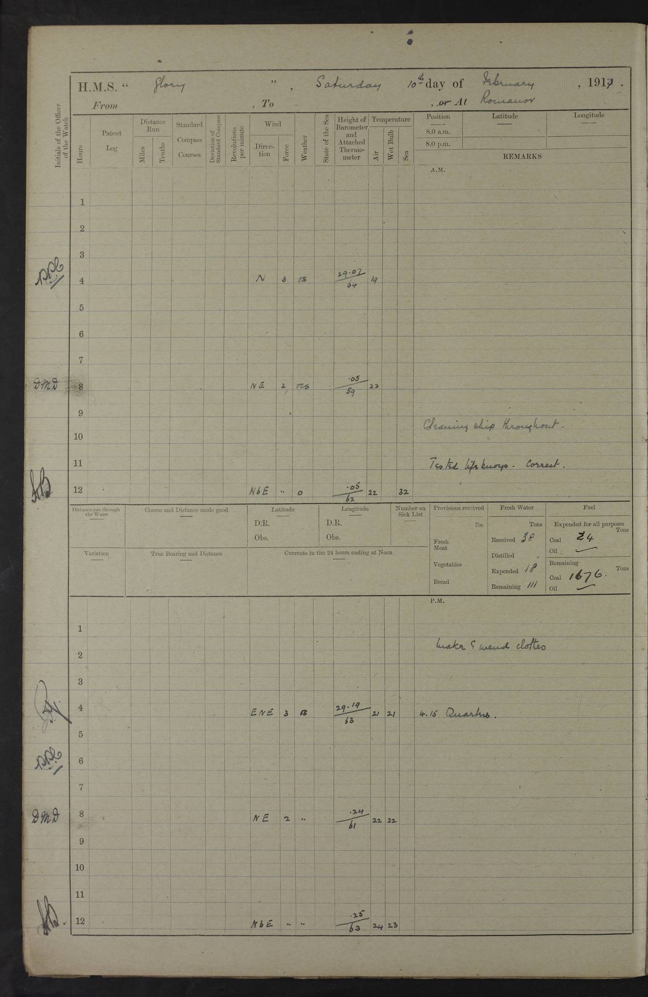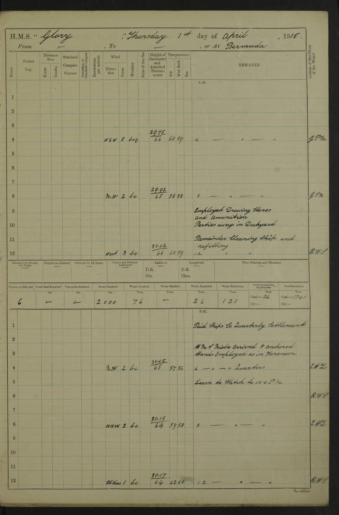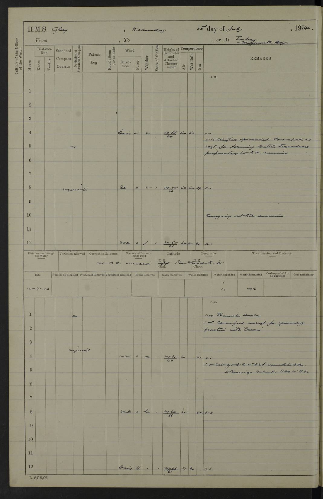 22 June 1915 At sea, Gibraltar to Lemnos Lat 36.1, Long -1.3 4.15am: Sighted land on starboard bow. 10.20am: Stopped port engine for repairs. 11.20am: proceeded with port engine. pm: a/c due to change in deviation. 10.00pm: Cape Tenez Light abeam, 18 miles. 4f73cd61a2fc8ea9030015f6: (https://s3.amazonaws.com:443/oldweather/ADM53-43015/0012_1.jpg) 23 June 1915 At sea, Gibraltar to Lemnos Lat 37.5, Long 4.8 Number on sick list: 4 5.00am: Secured from night defence stations. Placed anti-submarine guns. pm: Life saving appliances served out to men stationed in ? ?at abandon ship. 4f73cd61a2fc8ea9030015f7: (https://s3.amazonaws.com:443/oldweather/ADM53-43015/0013_0.jpg) 24 June 1915 At sea, Gibraltar to Lemnos Lat 37.4, Long 10.8 Position in log clearly bears no resemblance to the location of the ship. Position above is approximate and is based sighting of Zembra Island at 11.55am. 5.00am: Dispersed from night defence stations. Manned anti-submarine guns. am: Sighted two French torpedo boats. am: Torpedo boats passed to ~ No 362, 363. am: Sighted land on starboard beam. 11.55am: Zembra Island abeam, 25 miles. 2.00pm: Sighted Pantellaria S34ºE. 4.45pm: Pantellaria Light House abeam 12 miles. 4f73cd61a2fc8ea9030015f8: (https://s3.amazonaws.com:443/oldweather/ADM53-43015/0013_1.jpg) 25 June 1915 At sea, Gibraltar to Lemnos Lat 35.5, Long 16.7 2.10am: Gozo Light abeam 17 miles. 5.00am: Dispersed from night defence stations. Manned anti-submarine guns. 4f73cd61a2fc8ea9030015f9: (https://s3.amazonaws.com:443/oldweather/ADM53-43015/0014_0.jpg) 26 June 1915 At sea, Gibraltar to Lemnos Lat 35.5, Long 22.6 Number on sick list: 5 5.00am: Dispersed from night defence stations. Manned anti-submarine guns. am: Aired night clothing. am: marines at maxim practice on quarter deck. 2.00pm: Observed land on either bow. 3.00pm: Sighted French patrol destroyer. 4.15pm: Sighted French patrol destroyer. 9.40pm: Milo Peak N63ºW. 10.26pm: Polino Light abeam to port 5.5 miles. 4f73cd62a2fc8ea9030015fa: (https://s3.amazonaws.com:443/oldweather/ADM53-43015/0014_1.jpg) 27 June 1915 At sea and at Lemnos Lat 39.1, Long 24.4 From 0.50 to 3.05am sighting of multiple light houses. 3.50am: a/c to N39ºW and commenced to zig-zag. 5.00am: Dispersed from night defence stations and placed anti-submarine guns and look-outs. am: Lost overboard by accident Hazlewood fender, pat. 311, one in number. 10.30am: Held Divine Service onboard. pm: Met and signalled HMS Minerva on patrol duty. pm: Courses and speeds as requisite while waiting orders to approach Mudros. 3.00pm: Proceeded. 5.16pm: Increased to 90 revs, commenced to zig-zag. Course as requisite for Mudros. 7.00pm: Entered Mudros Bay. 7.47pm: Stopped. Let go port anchor in ‘M3’. 8.30pm: Darkened ship. pm: Manned one 6” and one 12 pdr. 4f73cd62a2fc8ea9030015fb: (https://s3.amazonaws.com:443/oldweather/ADM53-43015/0015_0.jpg) 28 June 1915 Mudros Bay, Lemnos Lat 39.89, Long 25.24 5,00am: HMS Vengeance entered harbour. HMS Vengeance was a pre-dreadnought of the Canopus class, launched in 1899 at Vickers, Barrow, and sold for scrapping in 1921. Details at http://en.wikipedia.org/wiki/HMS_Vengeance_(1899) . am/pm/: hands preparing for coaling and about ship’s work. pm: Collier Wabana secured alongside. 4f73cd62a2fc8ea9030015fc: (https://s3.amazonaws.com:443/oldweather/ADM53-43015/0015_1.jpg) 29 June 1915 Mudros Bay, Lemnos Lat 39.89, Long 25.24 5.15am: Commenced coaling. 2.00pm: Finished coaling. Collier left. 4f73cd62a2fc8ea9030015fd: (https://s3.amazonaws.com:443/oldweather/ADM53-43015/0016_0.jpg) 30 June 1915 Mudros Bay, Lemnos Lat 39.89, Long 25.24 am: Parties away sanding, and with fire engines onshore. am: Boats away disembarking troops. am: French Flagship Patrie sailed. The Patrie was a French pre-dreadnought, launched at La Seyne shipyard in 1903, and stricken in 1921. Details at http://en.wikipedia.org/wiki/French_battleship_Patrie . 6.30pm: Hands to bathe. 4f73cd63a2fc8ea9030015fe: (https://s3.amazonaws.com:443/oldweather/ADM53-43015/0016_1.jpg) 4f73cd63a2fc8ea9030015ff: (https://s3.amazonaws.com:443/oldweather/ADM53-43015/0017_0.jpg) 4f73cd63a2fc8ea903001600: (https://s3.amazonaws.com:443/oldweather/ADM53-43015/0017_1.jpg) 4f73cd63a2fc8ea903001601: (https://s3.amazonaws.com:443/oldweather/ADM53-43015/0018_0.jpg) 4f73cd64a2fc8ea903001602: (https://s3.amazonaws.com:443/oldweather/ADM53-43015/0018_1.jpg) LOGS FOR JULY 1915 From July to October 1915, HMS Glory spent her time at Port Mudros. Certain activities typically took place daily and are not generally noted in the pages below. These activities include: Lighting fires in the picket boat around 4am and drawing the fires in the late evening; Divisions at around 9–9.30am and Evening Quarters at 4pm; Darken ship at around 8.30pm; Daily ‘cleaning ship’, with variations thereof; SBC (for ‘Signal Books Correct’) at the watch changes. 4f73cd64a2fc8ea903001603: (https://s3.amazonaws.com:443/oldweather/ADM53-43016/0000_0.jpg) 4f73cd64a2fc8ea903001604: (https://s3.amazonaws.com:443/oldweather/ADM53-43016/0000_1.jpg) 4f73cd65a2fc8ea903001605: (https://s3.amazonaws.com:443/oldweather/ADM53-43016/0001_0.jpg) 4f73cd65a2fc8ea903001606: (https://s3.amazonaws.com:443/oldweather/ADM53-43016/0001_1.jpg) 1 July 1915 Port Mudros Lat 39.89, Long 25.24 6.30am: Landed working parties preparing boom defence ships. am: Discharged Acting Commander Rayne to Hector. Hector was a kite balloon ship. No further details readily available. 5.00pm: Tug T.10 made fast astern. 7.15pm: HMS Venerable went out. 7.30pm: HMS Chatham went out. HMS Chatham was a ‘Town’ cruiser and lead ship of her class. She was launched in 1911 at Chatham Dockyard and sold in 1926. Details at http://en.wikipedia.org/wiki/HMS_Chatham_(1911) . 4f73cd65a2fc8ea903001607: (https://s3.amazonaws.com:443/oldweather/ADM53-43016/0002_0.jpg) 2 July 1915 Port Mudros Lat 39.89, Long 25.24 5.35am: Landed working parties preparing boom defence ships. am/pm: Boom defence par